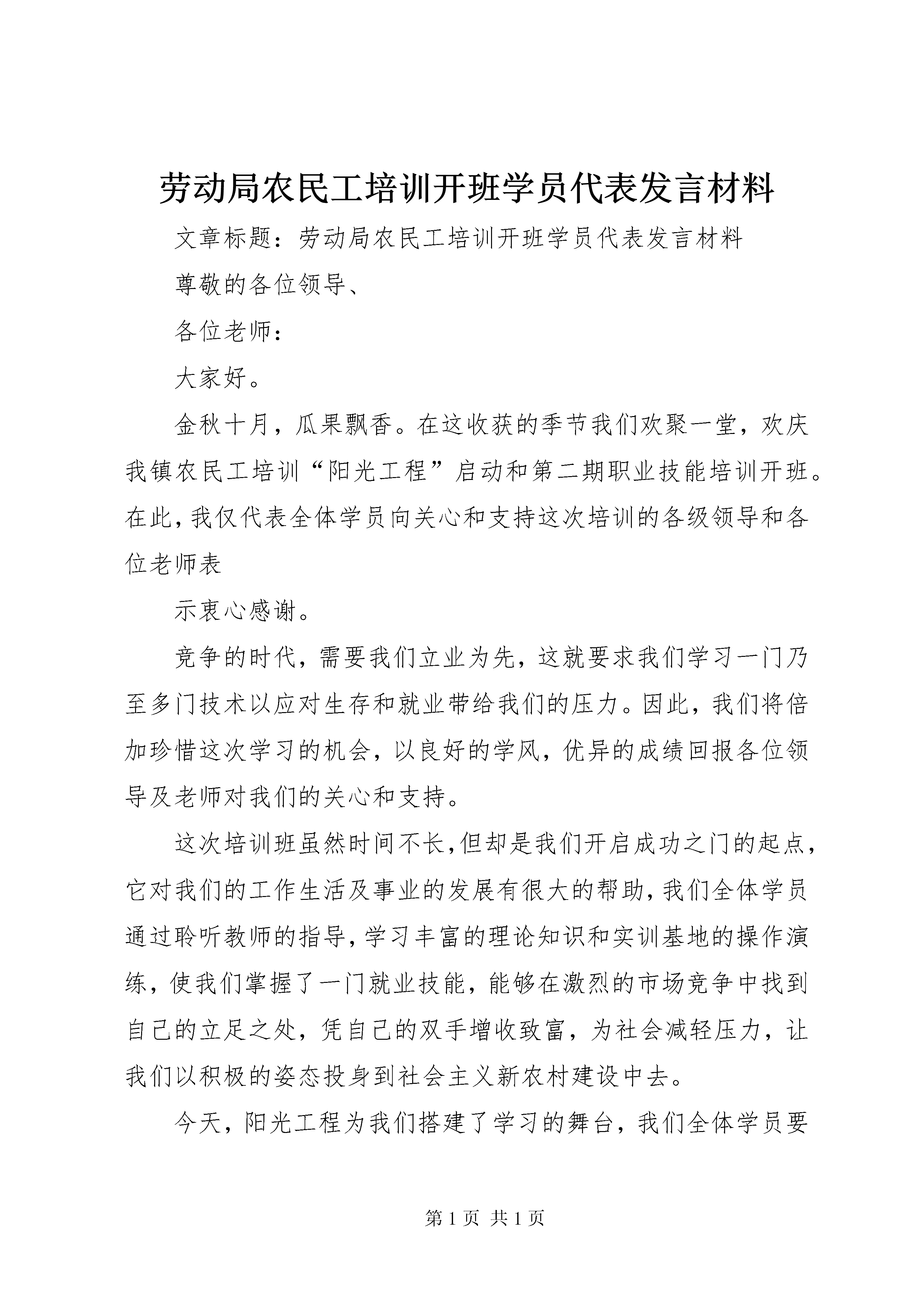 劳动局农民工培训开班学员代表发言材料文章标题:劳动局农民工培训开班学员代表发言材料尊敬的各位领导、各位老师:大家好。金秋十月,瓜果飘香。在这收获的季节我们欢聚一堂,欢庆我镇农民工培训“阳光工程”启动和第二期职业技能培训开班。在此,我仅代表全体学员向关心和支持这次培训的各级领导和各位老师表示衷心感谢。竞争的时代,需要我们立业为先,这就要求我们学习一门乃至多门技术以应对生存和就业带给我们的压力。因此,我们将倍加珍惜这次学习的机会,以良好的学风,优异的成绩回报各位领导及老师对我们的关心和支持。这次培训班虽然时间不长,但却是我们开启成功之门的起点,它对我们的工作生活及事业的发展有很大的帮助,我们全体学员通过聆听教师的指导,学习丰富的理论知识和实训基地的操作演练,使我们掌握了一门就业技能,能够在激烈的市场竞争中找到自己的立足之处,凭自己的双手增收致富,为社会减轻压力,让我们以积极的姿态投身到社会主义新农村建设中去。今天,阳光工程为我们搭建了学习的舞台,我们全体学员要树立终身学习的意识,以这次培训班为契机,真学实干,提升自已的专业技能水平和从业岗位层次。最后,我代表这次培训班的全体学员在此表志,我们一定认真学习,虚心求教,以锲而不舍的精神,圆满完成这次培训的学习任务。谢谢大家。《劳动局农民工培训开班学员代表发言材料》来源于文秘114网,欢迎阅读劳动局农民工培训开班学员代表发言材料。
