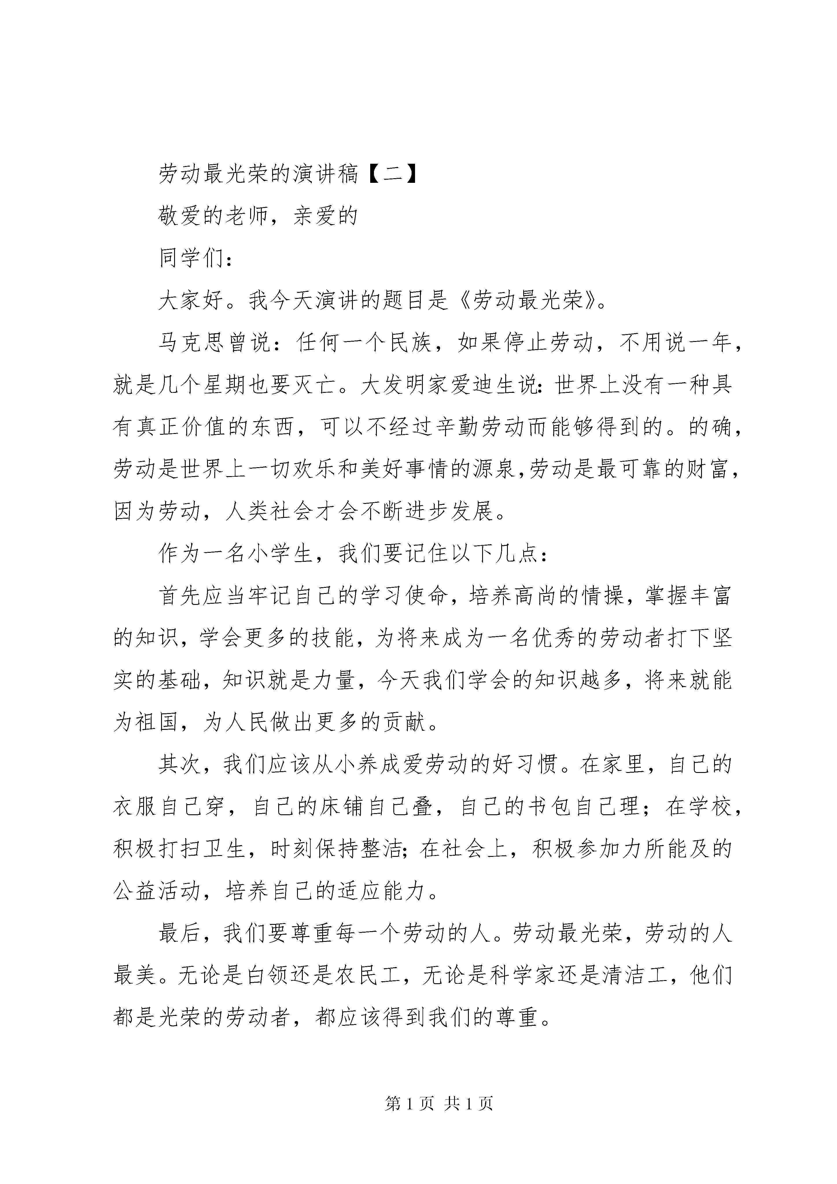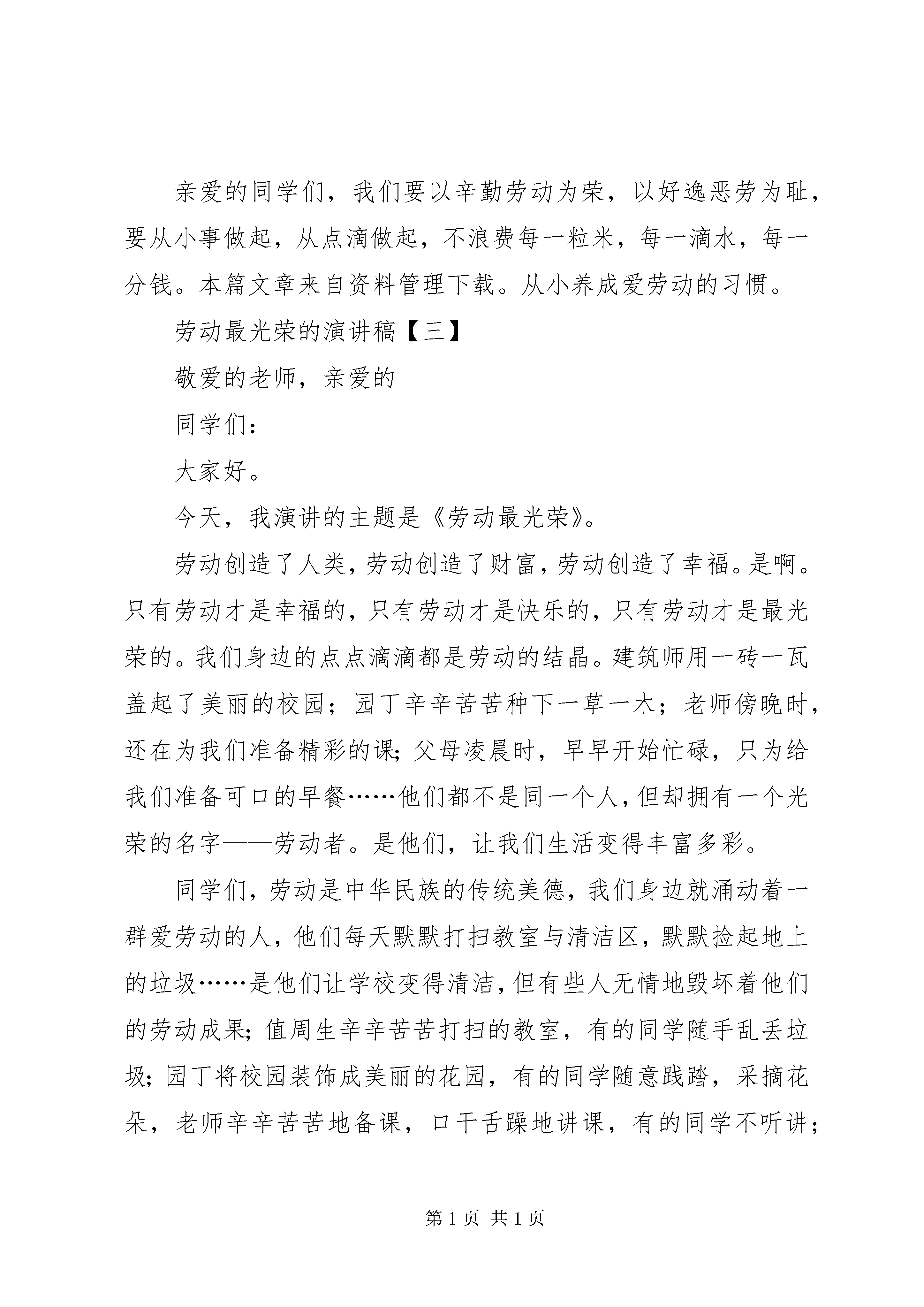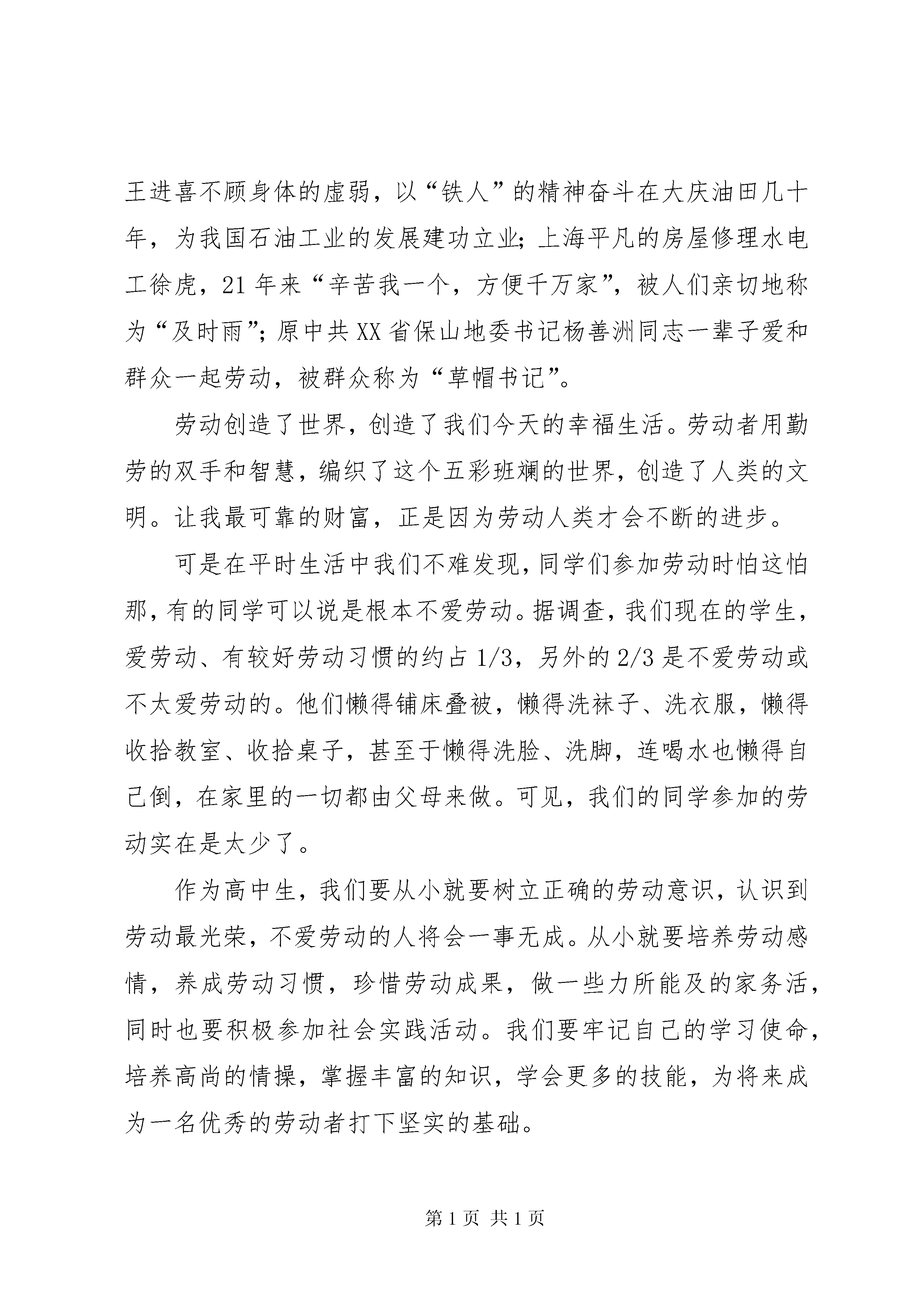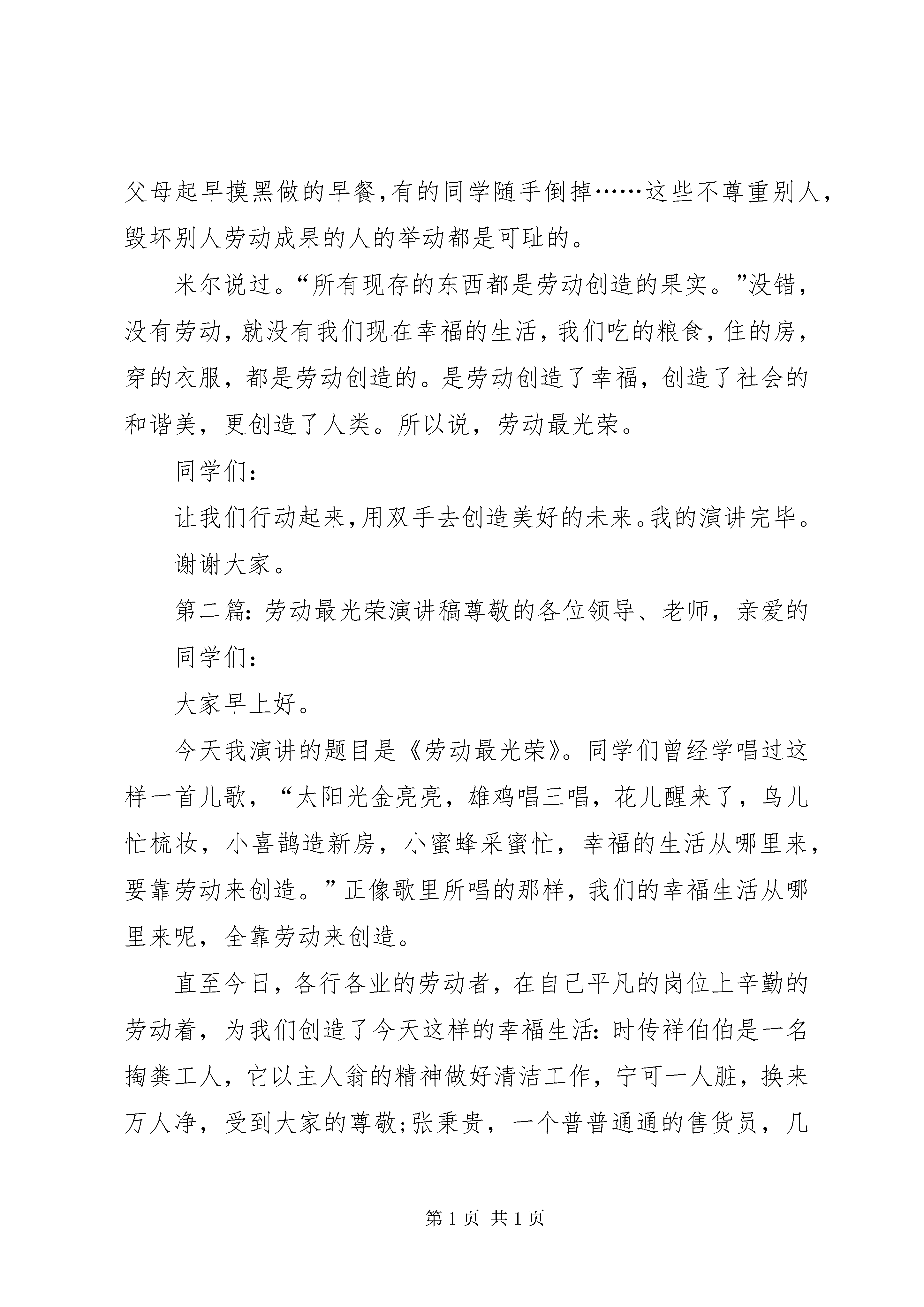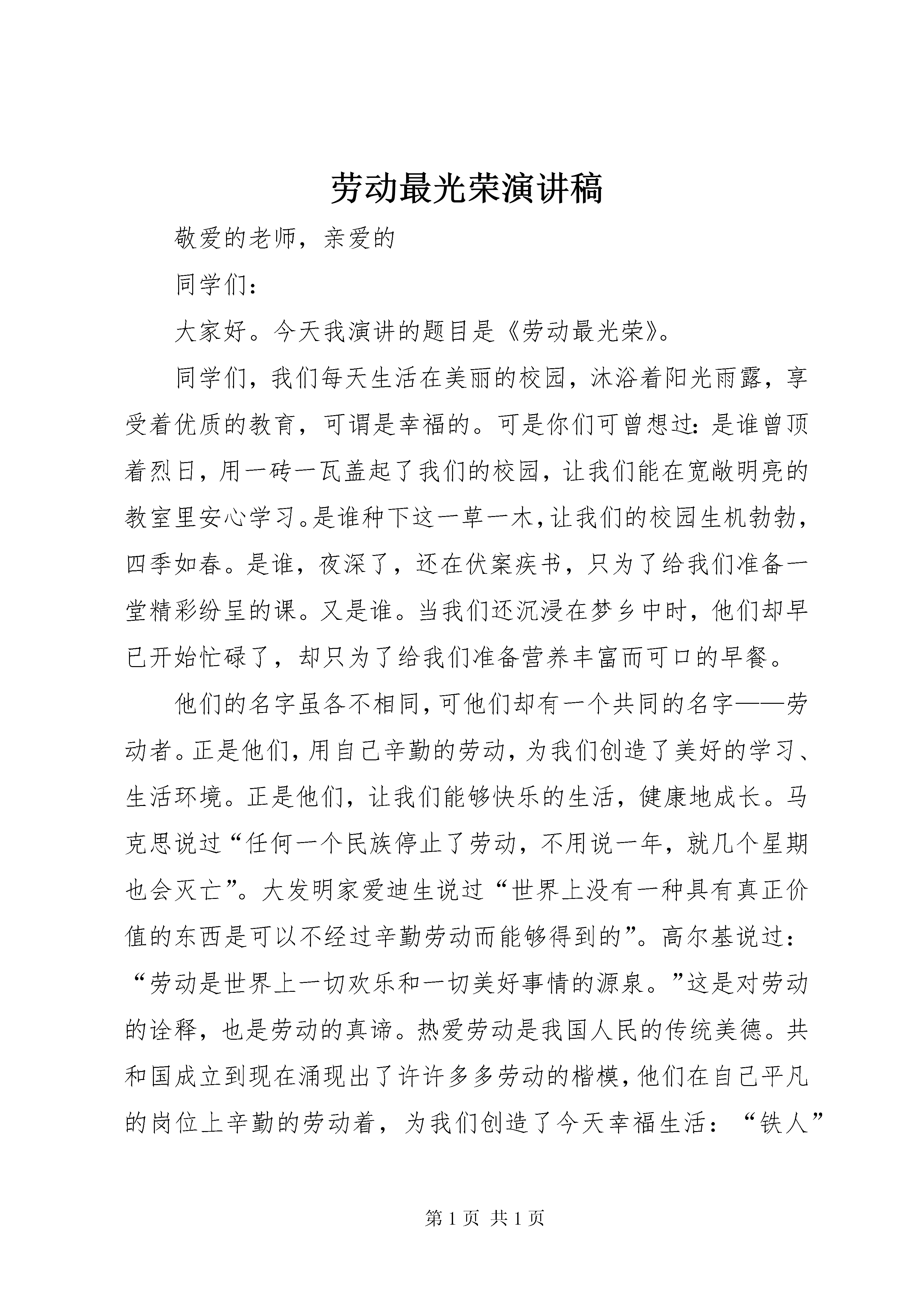 劳动最光荣演讲稿敬爱的老师,亲爱的同学们:大家好。今天我演讲的题目是《劳动最光荣》。同学们,我们每天生活在美丽的校园,沐浴着阳光雨露,享受着优质的教育,可谓是幸福的。可是你们可曾想过:是谁曾顶着烈日,用一砖一瓦盖起了我们的校园,让我们能在宽敞明亮的教室里安心学习。是谁种下这一草一木,让我们的校园生机勃勃,四季如春。是谁,夜深了,还在伏案疾书,只为了给我们准备一堂精彩纷呈的课。又是谁。当我们还沉浸在梦乡中时,他们却早已开始忙碌了,却只为了给我们准备营养丰富而可口的早餐。他们的名字虽各不相同,可他们却有一个共同的名字——劳动者。正是他们,用自己辛勤的劳动,为我们创造了美好的学习、生活环境。正是他们,让我们能够快乐的生活,健康地成长。马克思说过“任何一个民族停止了劳动,不用说一年,就几个星期也会灭亡”。大发明家爱迪生说过“世界上没有一种具有真正价值的东西是可以不经过辛勤劳动而能够得到的”。高尔基说过:“劳动是世界上一切欢乐和一切美好事情的源泉。”这是对劳动的诠释,也是劳动的真谛。热爱劳动是我国人民的传统美德。共和国成立到现在涌现出了许许多多劳动的楷模,他们在自己平凡的岗位上辛勤的劳动着,为我们创造了今天幸福生活:“铁人”王进喜不顾身体的虚弱,以“铁人”的精神奋斗在大庆油田几十年,为我国石油工业的发展建功立业;上海平凡的房屋修理水电工徐虎,21年来“辛苦我一个,方便千万家”,被人们亲切地称为“及时雨”;原中共XX省保山地委书记杨善洲同志一辈子爱和群众一起劳动,被群众称为“草帽书记”。劳动创造了世界,创造了我们今天的幸福生活。劳动者用勤劳的双手和智慧,编织了这个五彩班斓的世界,创造了人类的文明。让我最可靠的财富,正是因为劳动人类才会不断的进步。可是在平时生活中我们不难发现,同学们参加劳动时怕这怕那,有的同学可以说是根本不爱劳动。据调查,我们现在的学生,爱劳动、有较好劳动习惯的约占1/3,另外的2/3是不爱劳动或不太爱劳动的。他们懒得铺床叠被,懒得洗袜子、洗衣服,懒得收拾教室、收拾桌子,甚至于懒得洗脸、洗脚,连喝水也懒得自己倒,在家里的一切都由父母来做。可见,我们的同学参加的劳动实在是太少了。作为高中生,我们要从小就要树立正确的劳动意识,认识到劳动最光荣,不爱劳动的人将会一事无成。从小就要培养劳动感情,养成劳动习惯,珍惜劳动成果,做一些力所能及的家务活,同时也要积极参加社会实践活动。我们要牢记自己的学习使命,培养高尚的情操,掌握丰富的知识,学会更多的技能,为将来成为一名优秀的劳动者打下坚实的基础。劳动最光荣的演讲稿【二】敬爱的老师,亲爱的同学们:大家好。我今天演讲的题目是《劳动最光荣》。马克思曾说:任何一个民族,如果停止劳动,不用说一年,就是几个星期也要灭亡。大发明家爱迪生说:世界上没有一种具有真正价值的东西,可以不经过辛勤劳动而能够得到的。的确,劳动是世界上一切欢乐和美好事情的源泉,劳动是最可靠的财富,因为劳动,人类社会才会不断进步发展。作为一名小学生,我们要记住以下几点:首先应当牢记自己的学习使命,培养高尚的情操,掌握丰富的知识,学会更多的技能,为将来成为一名优秀的劳动者打下坚实的基础,知识就是力量,今天我们学会的知识越多,将来就能为祖国,为人民做出更多的贡献。其次,我们应该从小养成爱劳动的好习惯。在家里,自己的衣服自己穿,自己的床铺自己叠,自己的书包自己理;在学校,积极打扫卫生,时刻保持整洁;在社会上,积极参加力所能及的公益活动,培养自己的适应能力。最后,我们要尊重每一个劳动的人。劳动最光荣,劳动的人最美。无论是白领还是农民工,无论是科学家还是清洁工,他们都是光荣的劳动者,都应该得到我们的尊重。亲爱的同学们,我们要以辛勤劳动为荣,以好逸恶劳为耻,要从小事做起,从点滴做起,不浪费每一粒米,每一滴水,每一分钱。本篇文章来自资料管理下载。从小养成爱劳动的习惯。劳动最光荣的演讲稿【三】敬爱的老师,亲爱的同学们:大家好。今天,我演讲的主题是《劳动最光荣》。劳动创造了人类,劳动创造了财富,劳动创造了幸福。是啊。只有劳动才是幸福的,只有劳动才是快乐的,只有劳动才是最光荣的。我们身边的点点滴滴都是劳动的结晶。建筑师用一砖一瓦盖起了美丽的校园;园丁辛辛苦苦种下一草一木;老师傍晚时,还在为我们准备精彩的课;父母凌晨时,早早开始忙碌,只为给我们准备可口的早餐……他们都不是同一个人,但却拥有一个光荣的名字——劳动者。是他们,让我们生活变得丰富多彩。同学们,劳动是中华民族的传统美德,我们身边就涌动着一群爱劳动的人,他们每天默默打扫教室与清洁区,默默捡起地上的垃圾……是他们让学校变得清洁,但有些人无情地毁坏着他们的劳动成果;值周生辛辛苦苦打扫的教室,有的同学随手乱丢垃圾;园丁将校园装饰成美丽的花园,有的同学随意践踏,采摘花朵,老师辛辛