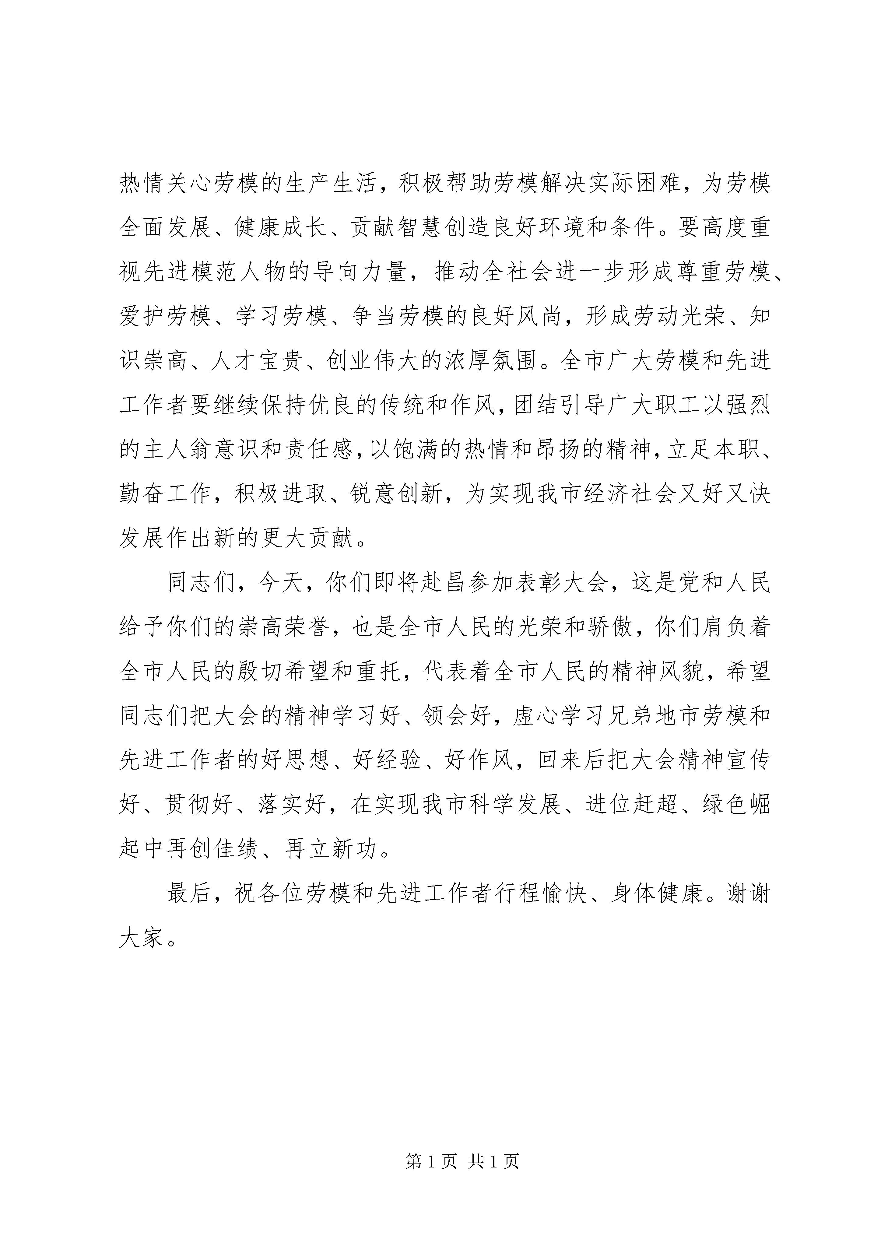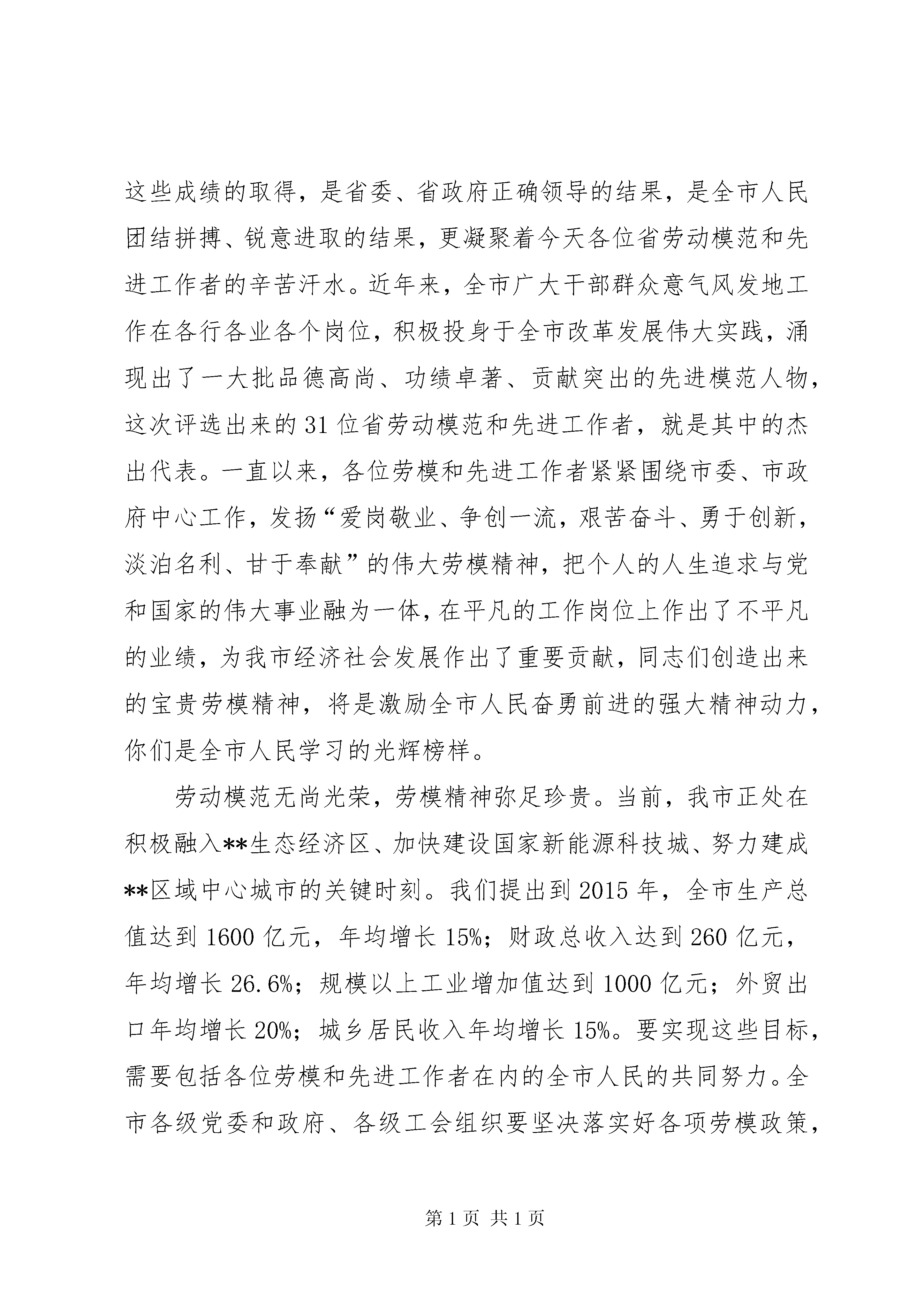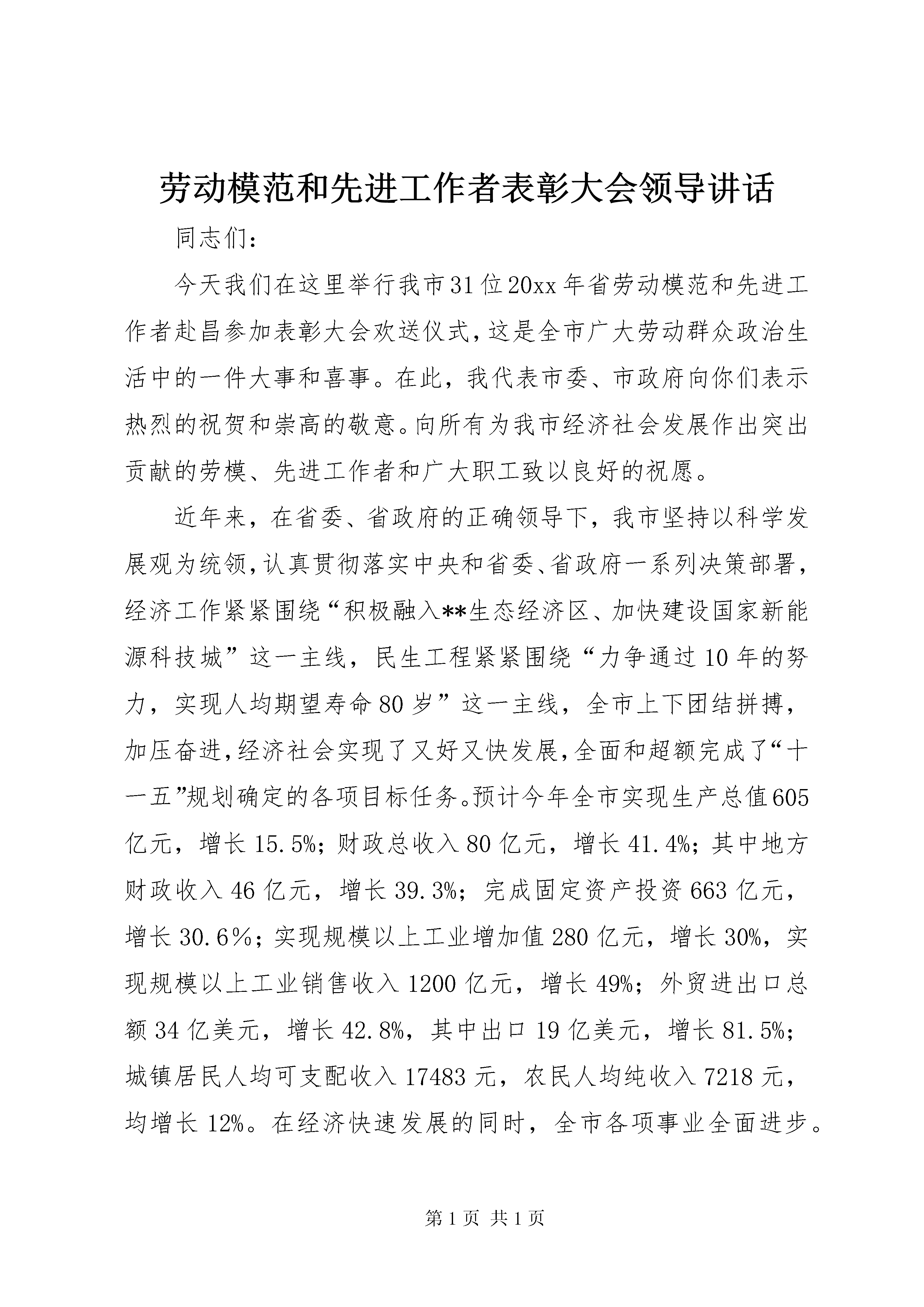 劳动模范和先进工作者表彰大会领导讲话同志们:今天我们在这里举行我市31位20xx年省劳动模范和先进工作者赴昌参加表彰大会欢送仪式,这是全市广大劳动群众政治生活中的一件大事和喜事。在此,我代表市委、市政府向你们表示热烈的祝贺和崇高的敬意。向所有为我市经济社会发展作出突出贡献的劳模、先进工作者和广大职工致以良好的祝愿。近年来,在省委、省政府的正确领导下,我市坚持以科学发展观为统领,认真贯彻落实中央和省委、省政府一系列决策部署,经济工作紧紧围绕“积极融入**生态经济区、加快建设国家新能源科技城”这一主线,民生工程紧紧围绕“力争通过10年的努力,实现人均期望寿命80岁”这一主线,全市上下团结拼搏,加压奋进,经济社会实现了又好又快发展,全面和超额完成了“十一五”规划确定的各项目标任务。预计今年全市实现生产总值605亿元,增长15.5%;财政总收入80亿元,增长41.4%;其中地方财政收入46亿元,增长39.3%;完成固定资产投资663亿元,增长30.6%;实现规模以上工业增加值280亿元,增长30%,实现规模以上工业销售收入1200亿元,增长49%;外贸进出口总额34亿美元,增长42.8%,其中出口19亿美元,增长81.5%;城镇居民人均可支配收入17483元,农民人均纯收入7218元,均增长12%。在经济快速发展的同时,全市各项事业全面进步。这些成绩的取得,是省委、省政府正确领导的结果,是全市人民团结拼搏、锐意进取的结果,更凝聚着今天各位省劳动模范和先进工作者的辛苦汗水。近年来,全市广大干部群众意气风发地工作在各行各业各个岗位,积极投身于全市改革发展伟大实践,涌现出了一大批品德高尚、功绩卓著、贡献突出的先进模范人物,这次评选出来的31位省劳动模范和先进工作者,就是其中的杰出代表。一直以来,各位劳模和先进工作者紧紧围绕市委、市政府中心工作,发扬“爱岗敬业、争创一流,艰苦奋斗、勇于创新,淡泊名利、甘于奉献”的伟大劳模精神,把个人的人生追求与党和国家的伟大事业融为一体,在平凡的工作岗位上作出了不平凡的业绩,为我市经济社会发展作出了重要贡献,同志们创造出来的宝贵劳模精神,将是激励全市人民奋勇前进的强大精神动力,你们是全市人民学习的光辉榜样。劳动模范无尚光荣,劳模精神弥足珍贵。当前,我市正处在积极融入**生态经济区、加快建设国家新能源科技城、努力建成**区域中心城市的关键时刻。我们提出到2015年,全市生产总值达到1600亿元,年均增长15%;财政总收入达到260亿元,年均增长26.6%;规模以上工业增加值达到1000亿元;外贸出口年均增长20%;城乡居民收入年均增长15%。要实现这些目标,需要包括各位劳模和先进工作者在内的全市人民的共同努力。全市各级党委和政府、各级工会组织要坚决落实好各项劳模政策,热情关心劳模的生产生活,积极帮助劳模解决实际困难,为劳模全面发展、健康成长、贡献智慧创造良好环境和条件。要高度重视先进模范人物的导向力量,推动全社会进一步形成尊重劳模、爱护劳模、学习劳模、争当劳模的良好风尚,形成劳动光荣、知识崇高、人才宝贵、创业伟大的浓厚氛围。全市广大劳模和先进工作者要继续保持优良的传统和作风,团结引导广大职工以强烈的主人翁意识和责任感,以饱满的热情和昂扬的精神,立足本职、勤奋工作,积极进取、锐意创新,为实现我市经济社会又好又快发展作出新的更大贡献。同志们,今天,你们即将赴昌参加表彰大会,这是党和人民给予你们的崇高荣誉,也是全市人民的光荣和骄傲,你们肩负着全市人民的殷切希望和重托,代表着全市人民的精神风貌,希望同志们把大会的精神学习好、领会好,虚心学习兄弟地市劳模和先进工作者的好思想、好经验、好作风,回来后把大会精神宣传好、贯彻好、落实好,在实现我市科学发展、进位赶超、绿色崛起中再创佳绩、再立新功。最后,祝各位劳模和先进工作者行程愉快、身体健康。谢谢大家。