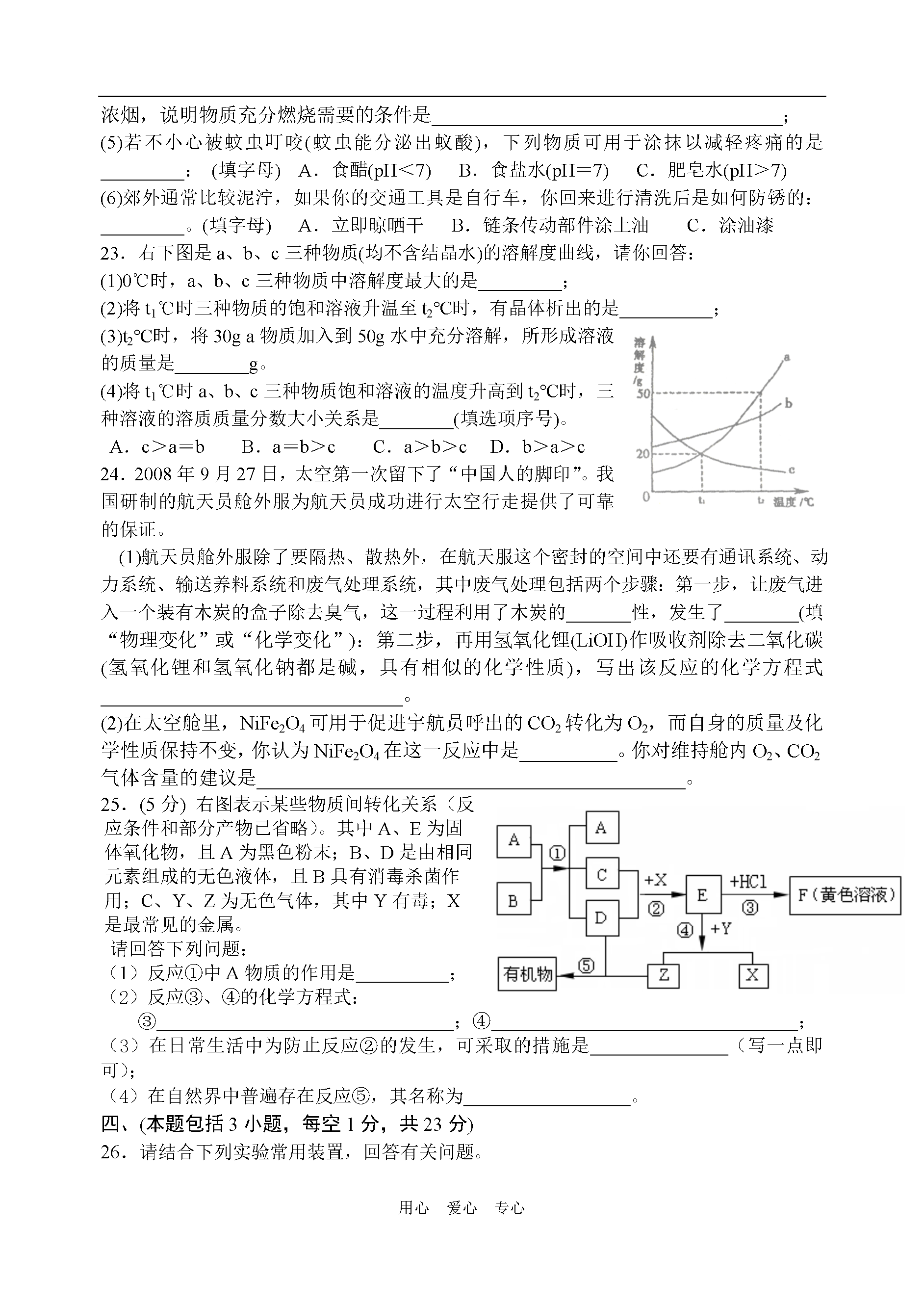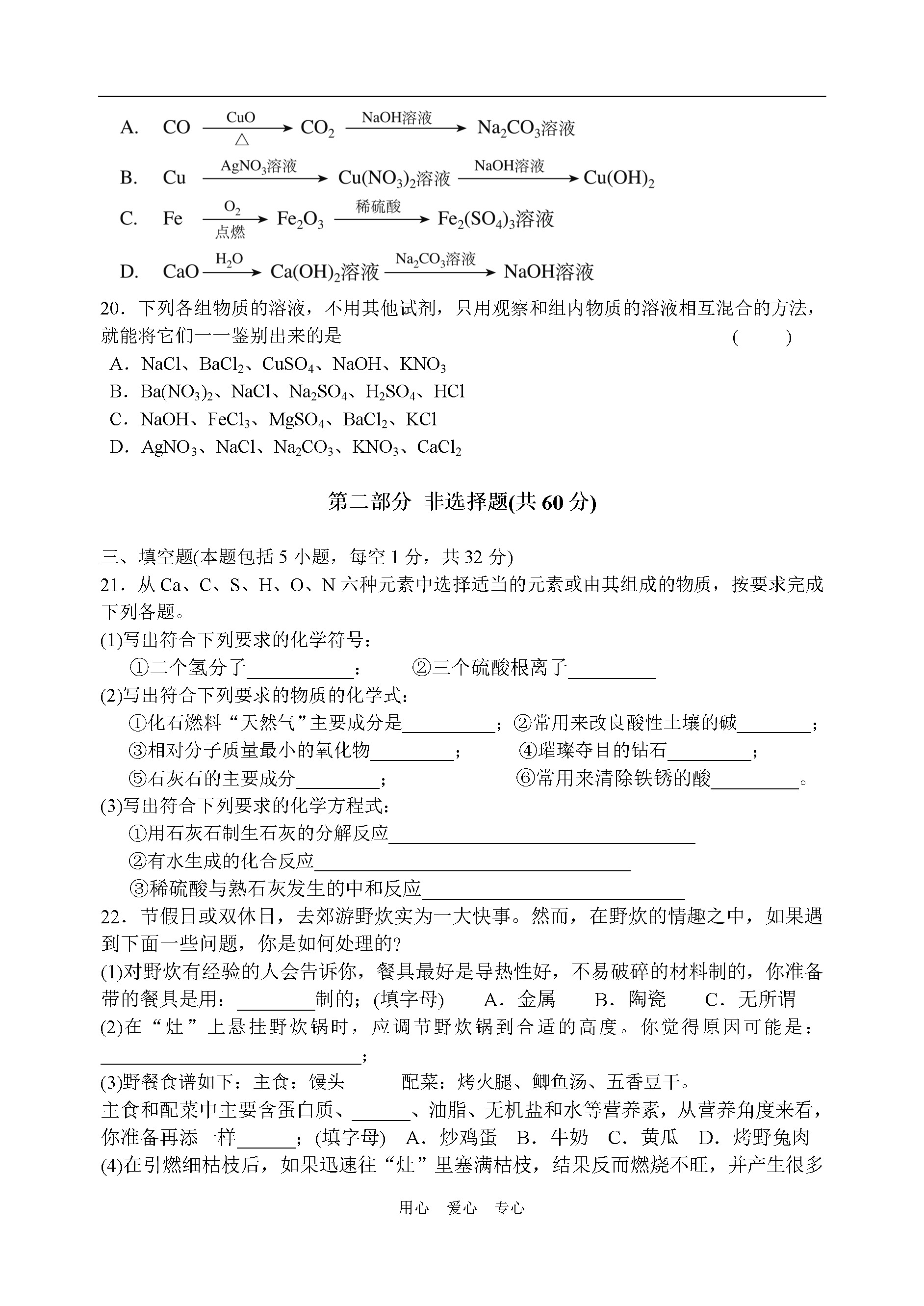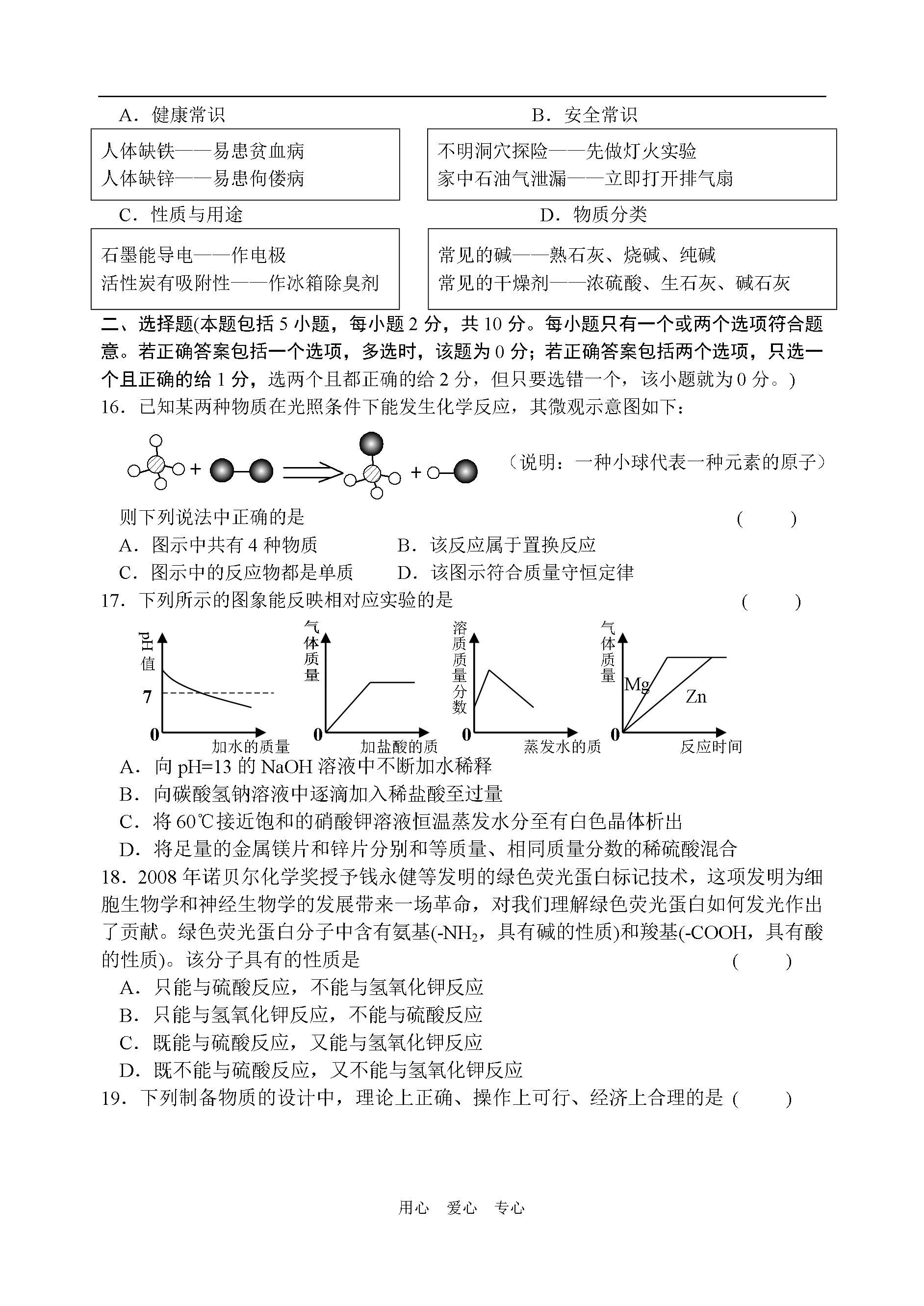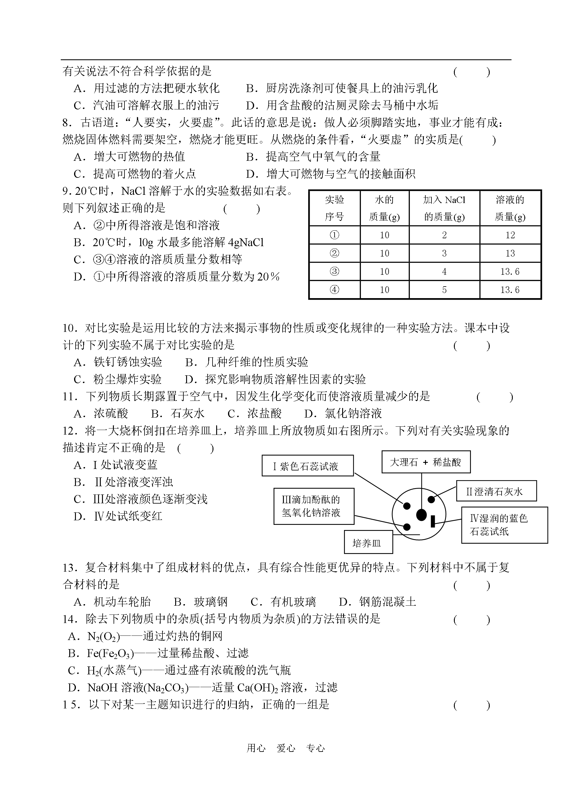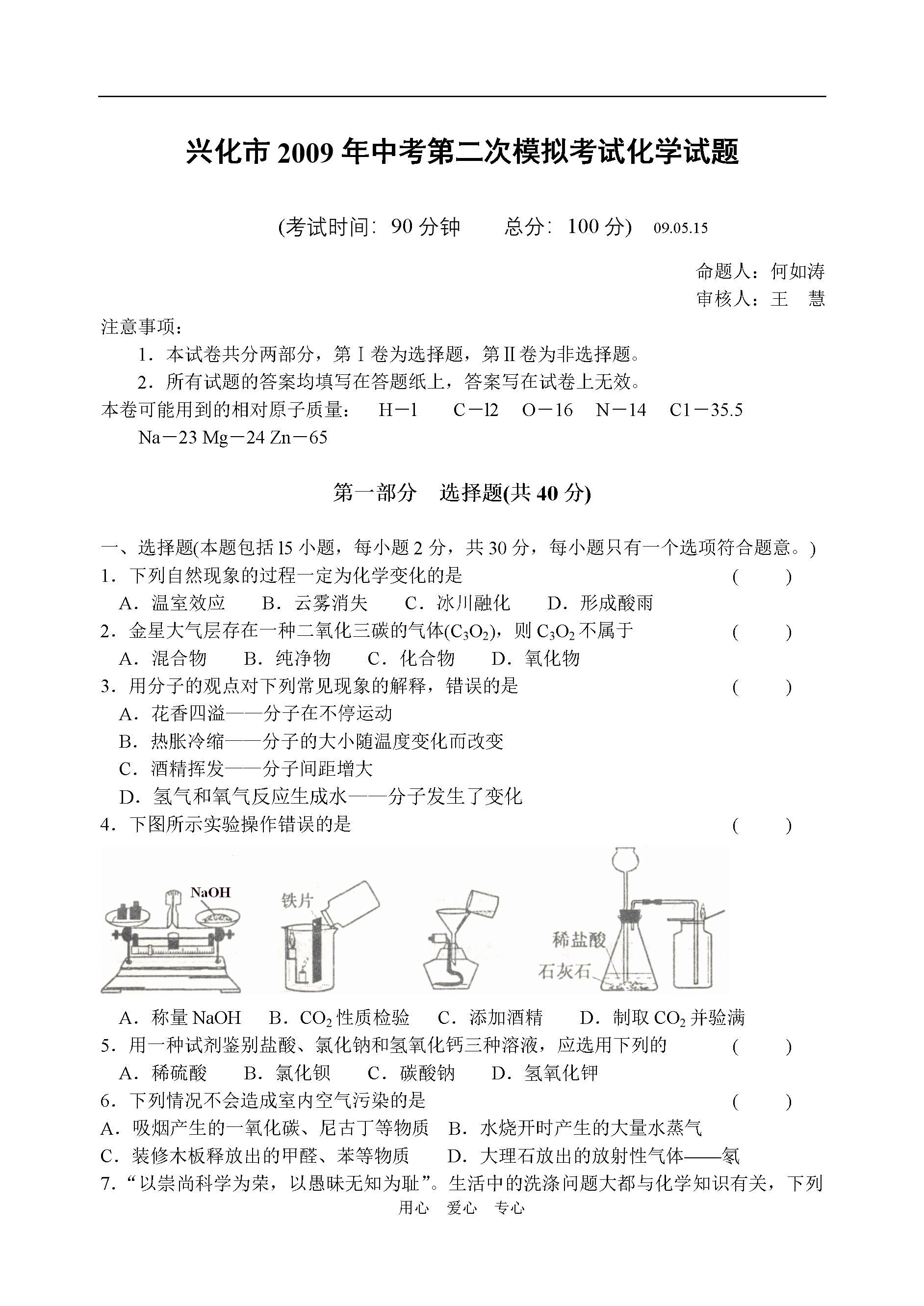 用心爱心专心兴化市2009年中考第二次模拟考试化学试题(考试时间:90分钟总分:100分)09.05.15命题人:何如涛审核人:王慧注意事项:1.本试卷共分两部分,第Ⅰ卷为选择题,第Ⅱ卷为非选择题。2.所有试题的答案均填写在答题纸上,答案写在试卷上无效。本卷可能用到的相对原子质量:H-lC-l2O-16N-14C1-35.5Na-23Mg-24Zn-65第一部分选择题(共40分)一、选择题(本题包括l5小题,每小题2分,共30分,每小题只有一个选项符合题意。)1.下列自然现象的过程一定为化学变化的是()A.温室效应B.云雾消失C.冰川融化D.形成酸雨2.金星大气层存在一种二氧化三碳的气体(C3O2),则C3O2不属于()A.混合物B.纯净物C.化合物D.氧化物3.用分子的观点对下列常见现象的解释,错误的是()A.花香四溢——分子在不停运动B.热胀冷缩——分子的大小随温度变化而改变C.酒精挥发——分子间距增大D.氢气和氧气反应生成水——分子发生了变化4.下图所示实验操作错误的是()A.称量NaOHB.CO2性质检验C.添加酒精D.制取CO2并验满5.用一种试剂鉴别盐酸、氯化钠和氢氧化钙三种溶液,应选用下列的()A.稀硫酸B.氯化钡C.碳酸钠D.氢氧化钾6.下列情况不会造成室内空气污染的是()A.吸烟产生的一氧化碳、尼古丁等物质B.水烧开时产生的大量水蒸气C.装修木板释放出的甲醛、苯等物质D.大理石放出的放射性气体——氡7.“以崇尚科学为荣,以愚昧无知为耻”。生活中的洗涤问题大都与化学知识有关,下列有关说法不符合科学依据的是()A.用过滤的方法把硬水软化B.厨房洗涤剂可使餐具上的油污乳化C.汽油可溶解衣服上的油污D.用含盐酸的沽厕灵除去马桶中水垢8.古语道:“人要实,火要虚”。此话的意思是说:做人必须脚踏实地,事业才能有成:燃烧固体燃料需要架空,燃烧才能更旺。从燃烧的条件看,“火要虚”的实质是()A.增大可燃物的热值B.提高空气中氧气的含量C.提高可燃物的着火点D.增大可燃物与空气的接触面积实验序号水的质量(g)加入NaCl的质量(g)溶液的质量(g)①10212②10313③10413.6④10513.69.20℃时,NaCl溶解于水的实验数据如右表。则下列叙述正确的是()A.②中所得溶液是饱和溶液B.20℃时,l0g水最多能溶解4gNaClC.③④溶液的溶质质量分数相等D.①中所得溶液的溶质质量分数为20%10.对比实验是运用比较的方法来揭示事物的性质或变化规律的一种实验方法。课本中设计的下列实验不属于对比实验的是()A.铁钉锈蚀实验B.几种纤维的性质实验C.粉尘爆炸实验D.探究影响物质溶解性因素的实验11.下列物质长期露置于空气中,因发生化学变化而使溶液质量减少的是()A.浓硫酸B.石灰水C.浓盐酸D.氯化钠溶液Ⅲ滴加酚酞的氢氧化钠溶液Ⅰ紫色石蕊试液培养皿Ⅳ湿润的蓝色石蕊试纸Ⅱ澄清石灰水大理石+稀盐酸12.将一大烧杯倒扣在培养皿上,培养皿上所放物质如右图所示。下列对有关实验现象的描述肯定不正确的是()A.I处试液变蓝B.Ⅱ处溶液变浑浊C.Ⅲ处溶液颜色逐渐变浅D.Ⅳ处试纸变红13.复合材料集中了组成材料的优点,具有综合性能更优异的特点。下列材料中不属于复合材料的是()A.机动车轮胎B.玻璃钢C.有机玻璃D.钢筋混凝土14.除去下列物质中的杂质(括号内物质为杂质)的方法错误的是()A.N2(O2)——通过灼热的铜网B.Fe(Fe2O3)——过量稀盐酸、过滤C.H2(水蒸气)——通过盛有浓硫酸的洗气瓶D.NaOH溶液(Na2CO3)——适量Ca(OH)2溶液,过滤15.以下对某一主题知识进行的归纳,正确的一组是()A.健康常识B.安全常识人体缺铁——易患贫血病人体缺锌——易患佝偻病不明洞穴探险——先做灯火实验家中石油气泄漏——立即打开排气扇C.性质与用途D.物质分类石墨能导电——作电极活性炭有吸附性——作冰箱除臭剂常见的碱——熟石灰、烧碱、纯碱常见的干燥剂——浓硫酸、生石灰、碱石灰二、选择题(本题包括5小题,每小题2分,共10分。每小题只有一个或两个选项符合题意。若正确答案包括一个选项,多选时,该题为0分;若正确答案包括两个选项,只选一个且正确的给1分,选两个且都正确的给2分,但只要选错一个,该小题就为0分。)16.已知某两种物质在光照条件下能发生化学反应,其微观示意图如下:(说明:一种小球代表一种元素的原子)则下列说法中正确的是()A.图示中共有4种物质B.该反应属于置换反应C.图示中的反应物都是单质D.该图示符合质量守恒定律17.下列所示的图象能反映相对应实验的是()MgZn07加水的质量pH值0加盐酸的质量气体质量气体质量0反应时间气体质量0蒸发水的质量溶质质量分数ABCDA.向pH=13的NaOH溶液中不断加水稀释B.向碳