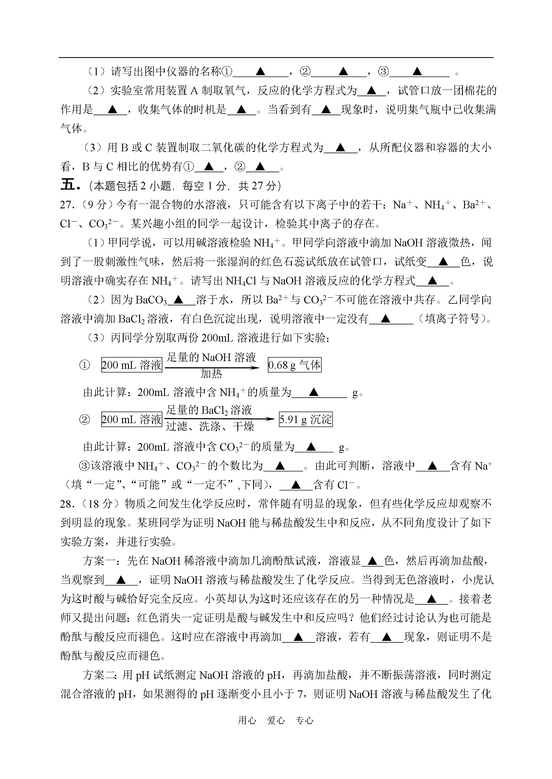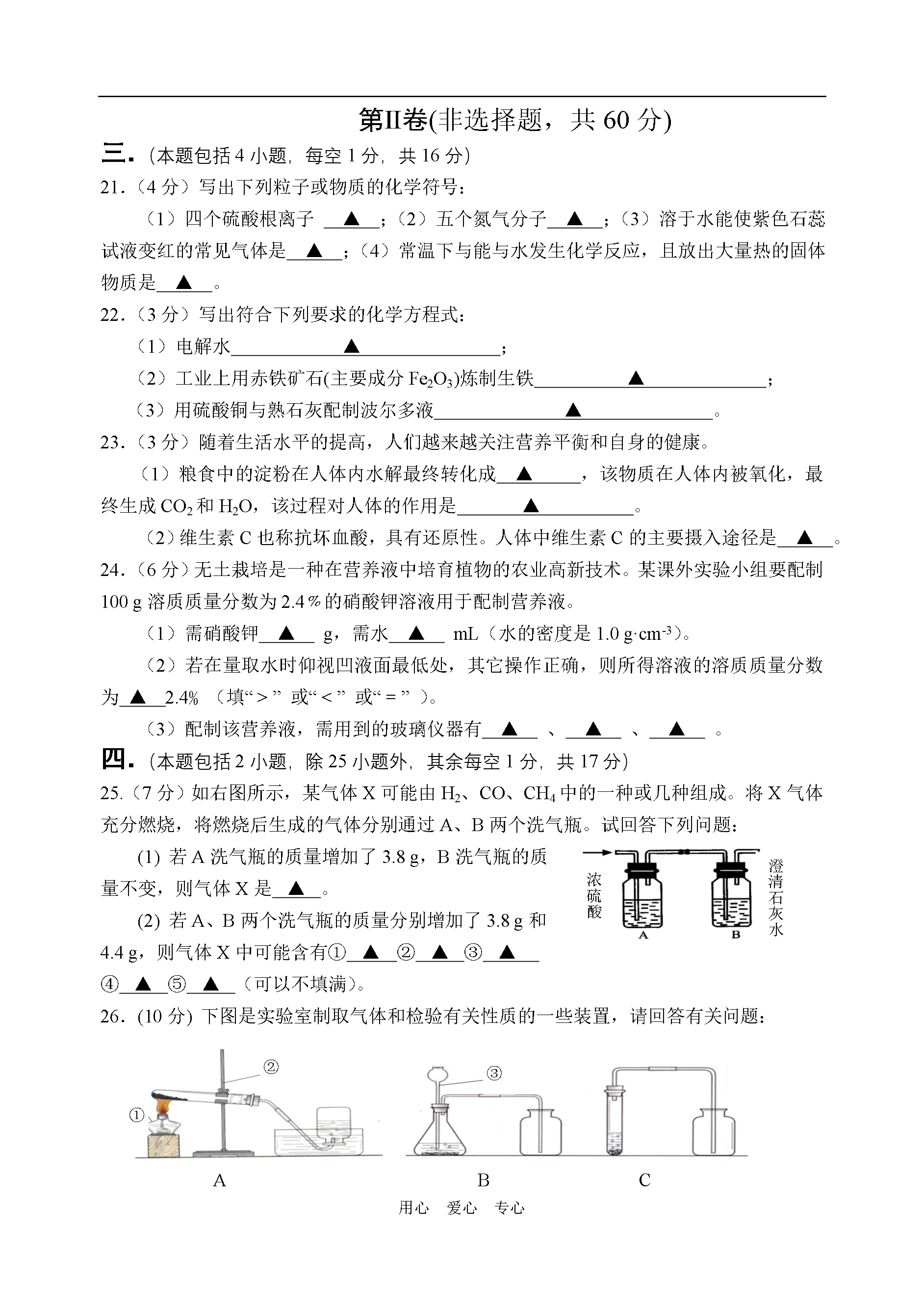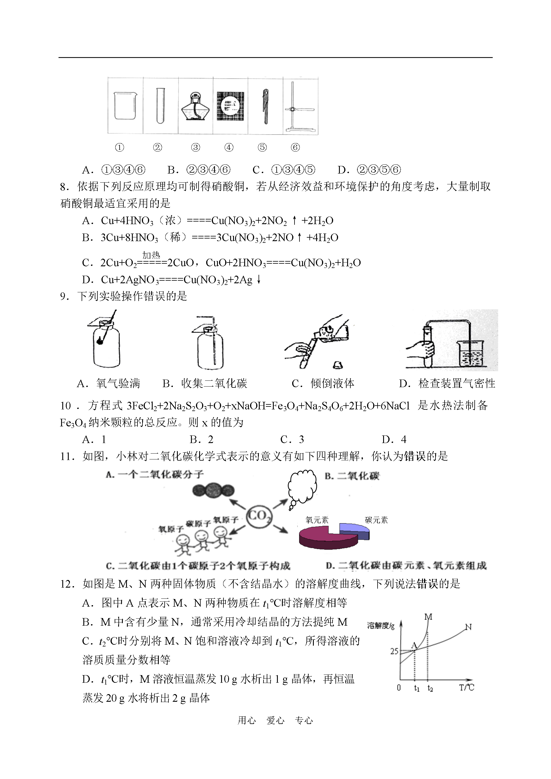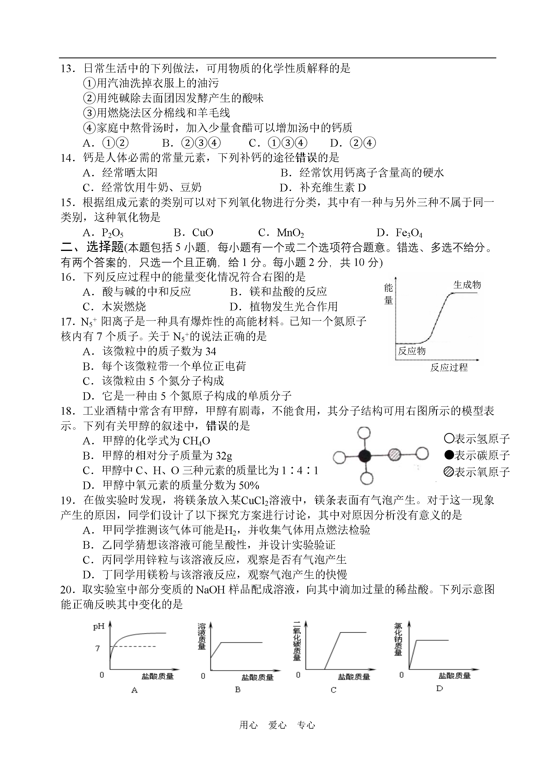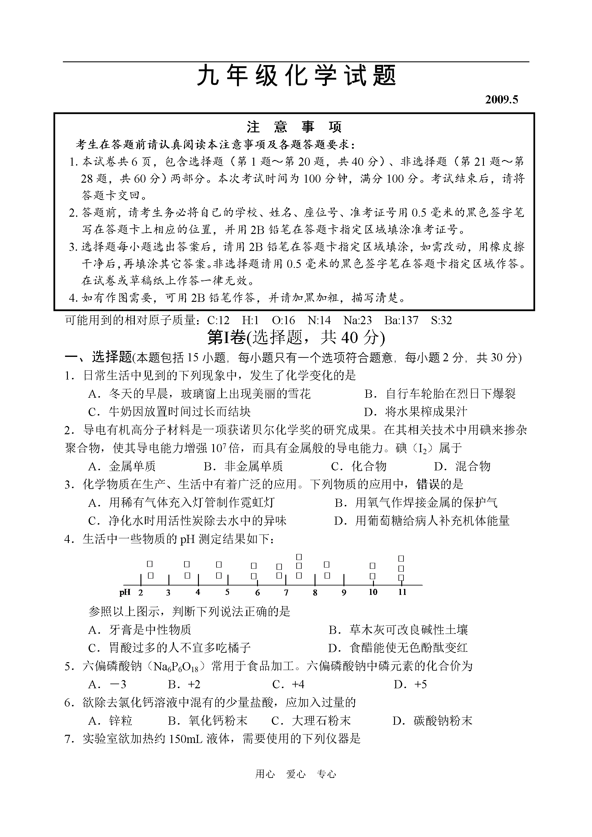 用心爱心专心九年级化学试题2009.5注意事项考生在答题前请认真阅读本注意事项及各题答题要求:1.本试卷,包含选择题(第1题~第20题,共40分)、非选择题(第21题~第28题,共60分)两部分。本次考试时间为100分钟,满分100分。考试结束后,请将答题卡交回。2.答题前,请考生务必将自己的学校、姓名、座位号、准考证号用0.5毫米的黑色签字笔写在答题卡上相应的位置,并用2B铅笔在答题卡指定区域填涂准考证号。3.选择题每小题选出答案后,请用2B铅笔在答题卡指定区域填涂,如需改动,用橡皮擦干净后,再填涂其它答案。非选择题请用0.5毫米的黑色签字笔在答题卡指定区域作答。在试卷或草稿纸上作答一律无效。4.如有作图需要,可用2B铅笔作答,并请加黑加粗,描写清楚。可能用到的相对原子质量:C:12H:1O:16N:14Na:23Ba:137S:32第Ⅰ卷(选择题,共40分)一、选择题(本题包括15小题,每小题只有一个选项符合题意,每小题2分,共30分)1.日常生活中见到的下列现象中,发生了化学变化的是A.冬天的早晨,玻璃窗上出现美丽的雪花B.自行车轮胎在烈日下爆裂C.牛奶因放置时间过长而结块D.将水果榨成果汁2.导电有机高分子材料是一项获诺贝尔化学奖的研究成果。在其相关技术中用碘来掺杂聚合物,使其导电能力增强107倍,而具有金属般的导电能力。碘(I2)属于A.金属单质B.非金属单质C.化合物D.混合物3.化学物质在生产、生活中有着广泛的应用。下列物质的应用中,错误的是A.用稀有气体充入灯管制作霓虹灯B.用氧气作焊接金属的保护气C.净化水时用活性炭除去水中的异味D.用葡萄糖给病人补充机体能量4.生活中一些物质的pH测定结果如下:参照以上图示,判断下列说法正确的是A.牙膏是中性物质B.草木灰可改良碱性土壤C.胃酸过多的人不宜多吃橘子D.食醋能使无色酚酞变红5.六偏磷酸钠(Na6P6O18)常用于食品加工。六偏磷酸钠中磷元素的化合价为A.-3B.+2C.+4D.+56.欲除去氯化钙溶液中混有的少量盐酸,应加入过量的A.锌粒B.氧化钙粉末C.大理石粉末D.碳酸钠粉末7.实验室欲加热约150mL液体,需要使用的下列仪器是①②③④⑤⑥A.①③④⑥B.②③④⑥C.①③④⑤D.②③⑤⑥8.依据下列反应原理均可制得硝酸铜,若从经济效益和环境保护的角度考虑,大量制取硝酸铜最适宜采用的是A.Cu+4HNO3(浓)====Cu(NO3)2+2NO2↑+2H2O加热B.3Cu+8HNO3(稀)====3Cu(NO3)2+2NO↑+4H2OC.2Cu+O2=====2CuO,CuO+2HNO3====Cu(NO3)2+H2OD.Cu+2AgNO3====Cu(NO3)2+2Ag↓9.下列实验操作错误的是A.氧气验满B.收集二氧化碳C.倾倒液体D.检查装置气密性10.方程式3FeCl2+2Na2S2O3+O2+xNaOH=Fe3O4+Na2S4O6+2H2O+6NaCl是水热法制备Fe3O4纳米颗粒的总反应。则x的值为A.1B.2C.3D.4氧元素碳元素11.如图,小林对二氧化碳化学式表示的意义有如下四种理解,你认为错误的是12.如图是M、N两种固体物质(不含结晶水)的溶解度曲线,下列说法错误的是A.图中A点表示M、N两种物质在t1℃时溶解度相等AB.M中含有少量N,通常采用冷却结晶的方法提纯MC.t2℃时分别将M、N饱和溶液冷却到t1℃,所得溶液的溶质质量分数相等D.t1℃时,M溶液恒温蒸发10g水析出1g晶体,再恒温蒸发20g水将析出2g晶体13.日常生活中的下列做法,可用物质的化学性质解释的是①用汽油洗掉衣服上的油污②用纯碱除去面团因发酵产生的酸味③用燃烧法区分棉线和羊毛线④家庭中熬骨汤时,加入少量食醋可以增加汤中的钙质A.①②B.②③④C.①③④D.②④14.钙是人体必需的常量元素,下列补钙的途径错误的是A.经常晒太阳B.经常饮用钙离子含量高的硬水C.经常饮用牛奶、豆奶D.补充维生素D15.根据组成元素的类别可以对下列氧化物进行分类,其中有一种与另外三种不属于同一类别,这种氧化物是A.P2O5B.CuOC.MnO2D.Fe3O4二、选择题(本题包括5小题,每小题有一个或二个选项符合题意。错选、多选不给分。有两个答案的,只选一个且正确,给1分。每小题2分,共10分)反应过程生成物反应物能量16.下列反应过程中的能量变化情况符合右图的是A.酸与碱的中和反应B.镁和盐酸的反应C.木炭燃烧D.植物发生光合作用17.N5+阳离子是一种具有爆炸性的高能材料。已知一个氮原子核内有7个质子。关于N5+的说法正确的是A.该微粒中的质子数为34B.每个该微粒带一个单位正电荷C.该微粒由5个氮分子构成D.它是一种由5个氮原子构成的单质分子表示氢原子表示碳原子表示氧原子18.工业酒精