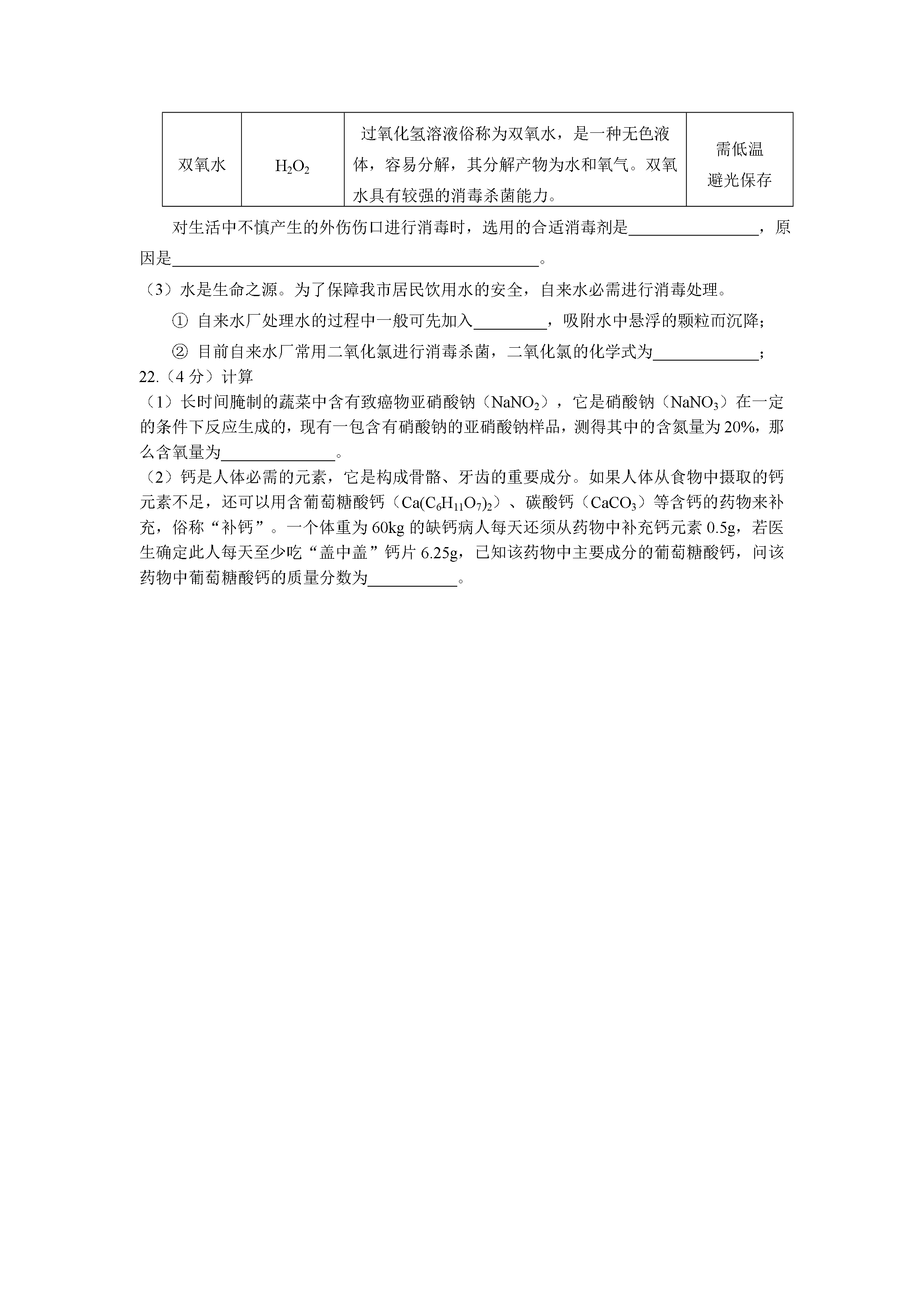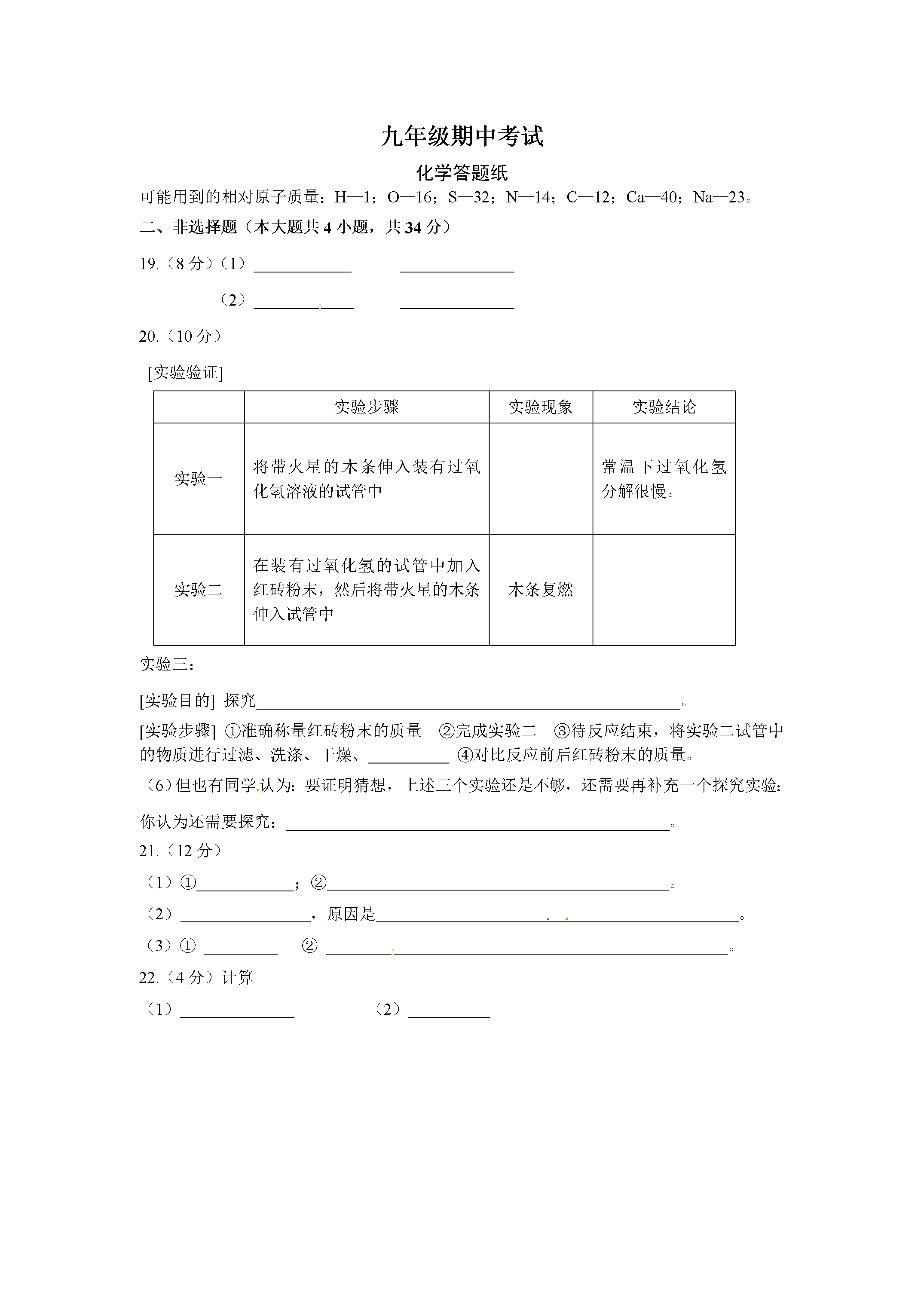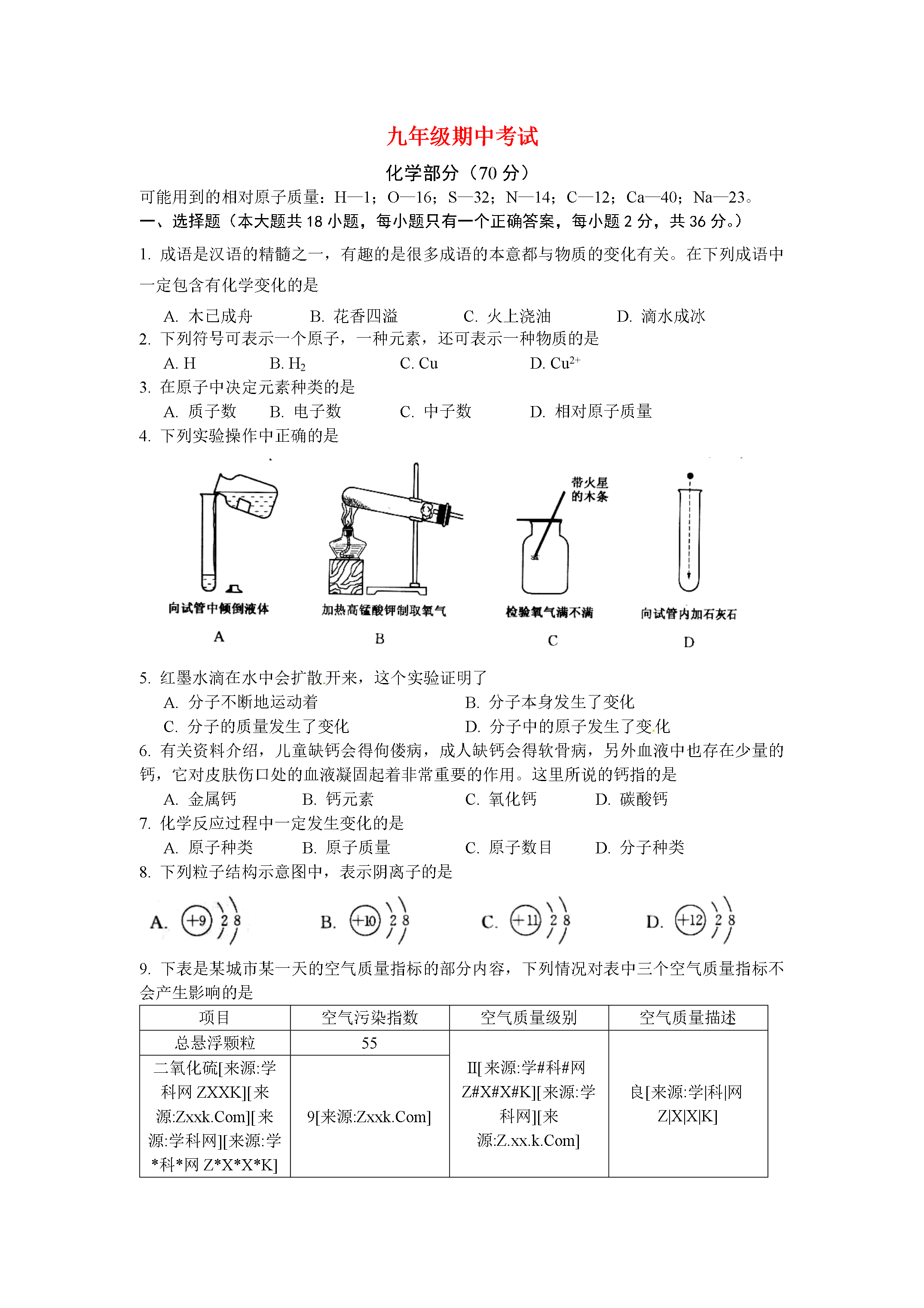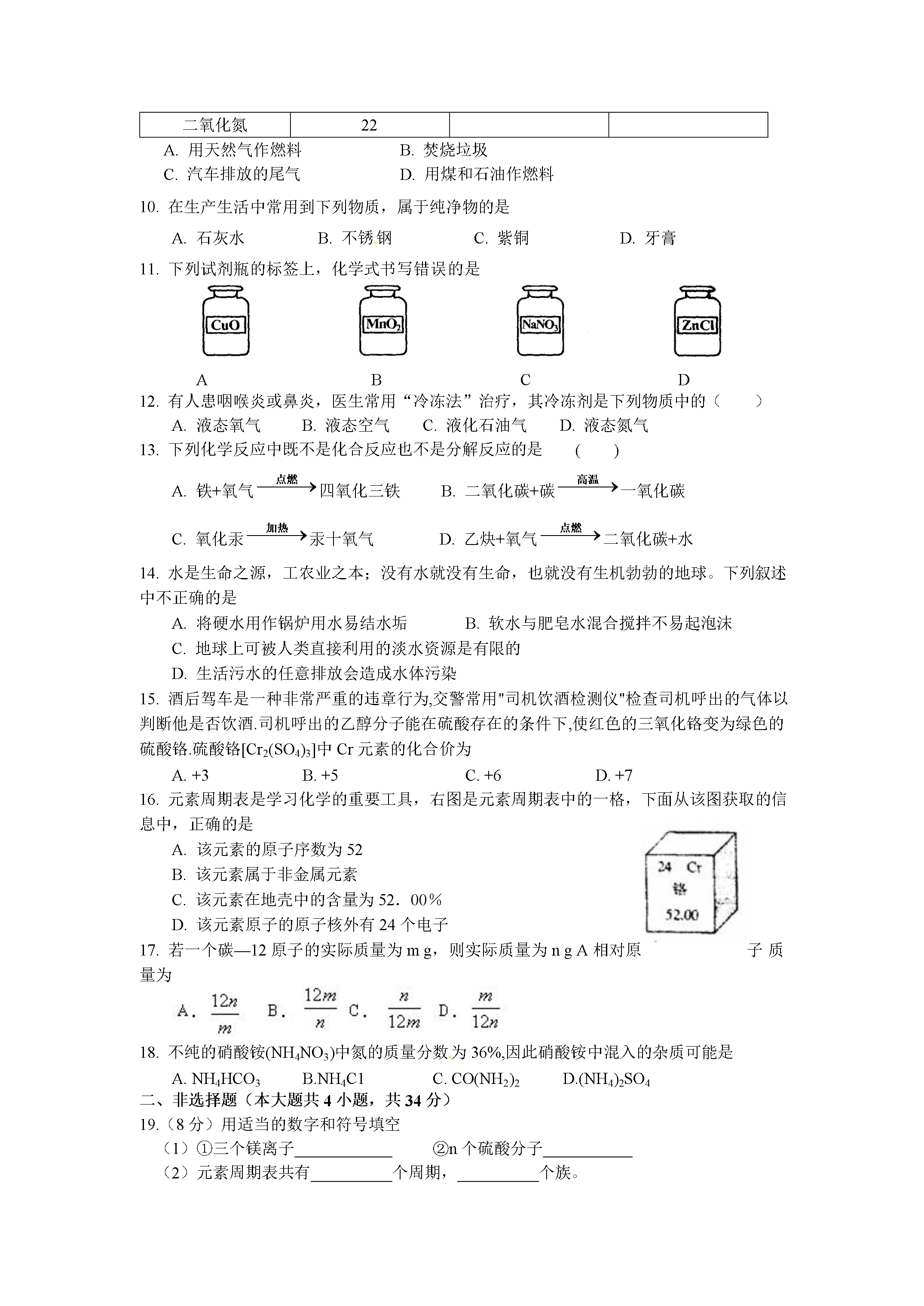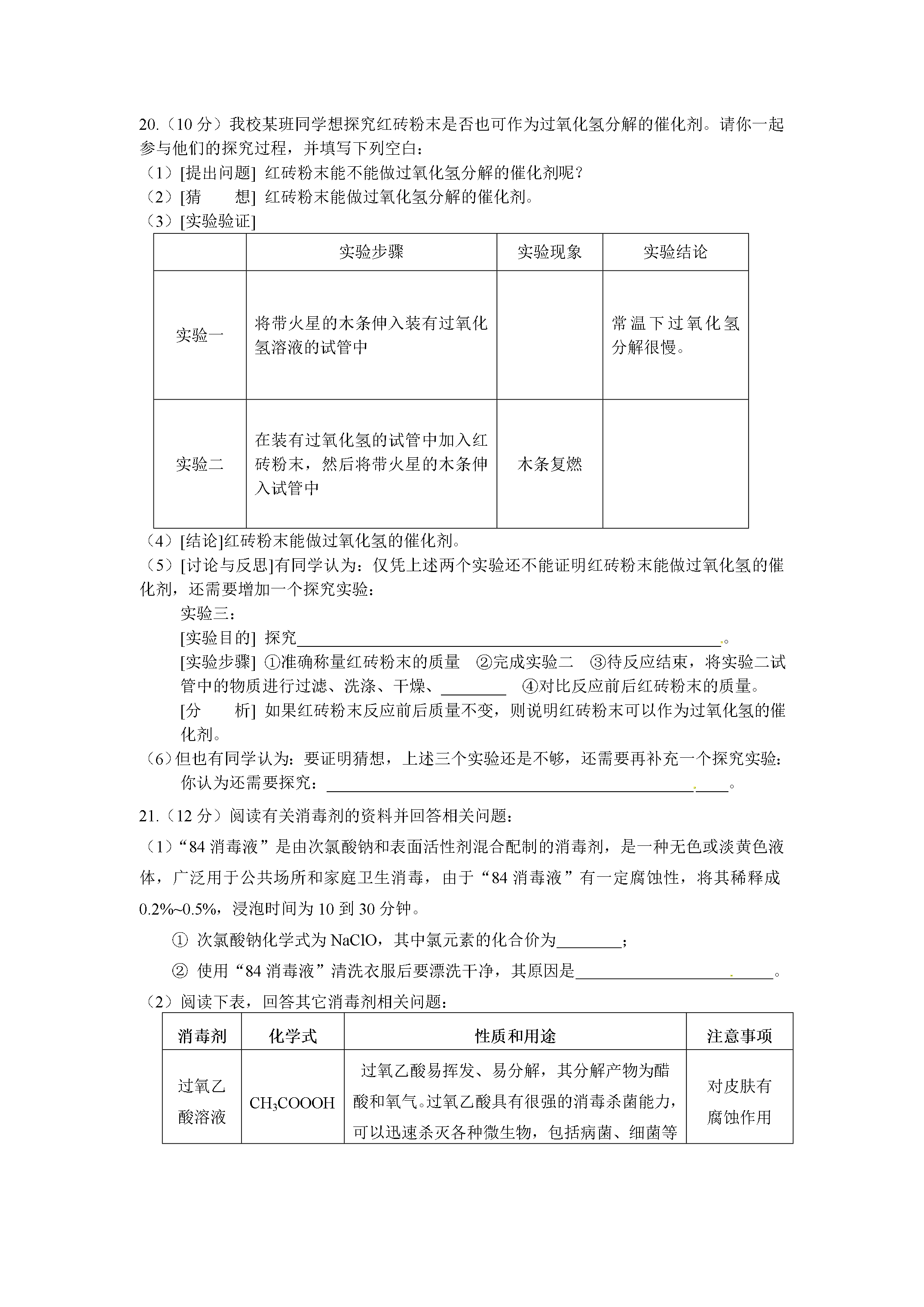 九年级期中考试化学部分(70分)可能用到的相对原子质量:H—1;O—16;S—32;N—14;C—12;Ca—40;Na—23。一、选择题(本大题共18小题,每小题只有一个正确答案,每小题2分,共36分。)1.成语是汉语的精髓之一,有趣的是很多成语的本意都与物质的变化有关。在下列成语中一定包含有化学变化的是A.木已成舟B.花香四溢C.火上浇油D.滴水成冰2.下列符号可表示一个原子,一种元素,还可表示一种物质的是A.HB.H2C.CuD.Cu2+3.在原子中决定元素种类的是A.质子数B.电子数C.中子数D.相对原子质量4.下列实验操作中正确的是5.红墨水滴在水中会扩散开来,这个实验证明了A.分子不断地运动着B.分子本身发生了变化C.分子的质量发生了变化D.分子中的原子发生了变化6.有关资料介绍,儿童缺钙会得佝偻病,成人缺钙会得软骨病,另外血液中也存在少量的钙,它对皮肤伤口处的血液凝固起着非常重要的作用。这里所说的钙指的是A.金属钙B.钙元素C.氧化钙D.碳酸钙7.化学反应过程中一定发生变化的是A.原子种类B.原子质量C.原子数目D.分子种类8.下列粒子结构示意图中,表示阴离子的是9.下表是某城市某一天的空气质量指标的部分内容,下列情况对表中三个空气质量指标不会产生影响的是项目空气污染指数空气质量级别空气质量描述总悬浮颗粒55II[来源:学#科#网Z#X#X#K][来源:学科网][来源:Z.xx.k.Com]良[来源:学|科|网Z|X|X|K]二氧化硫[来源:学科网ZXXK][来源:Zxxk.Com][来源:学科网][来源:学*科*网Z*X*X*K]9[来源:Zxxk.Com]二氧化氮22A.用天然气作燃料B.焚烧垃圾C.汽车排放的尾气D.用煤和石油作燃料10.在生产生活中常用到下列物质,属于纯净物的是A.石灰水B.不锈钢C.紫铜D.牙膏11.下列试剂瓶的标签上,化学式书写错误的是ABCD12.有人患咽喉炎或鼻炎,医生常用“冷冻法”治疗,其冷冻剂是下列物质中的()A.液态氧气B.液态空气C.液化石油气D.液态氮气13.下列化学反应中既不是化合反应也不是分解反应的是()A.铁+氧气四氧化三铁B.二氧化碳+碳一氧化碳C.氧化汞汞十氧气D.乙炔+氧气二氧化碳+水14.水是生命之源,工农业之本;没有水就没有生命,也就没有生机勃勃的地球。下列叙述中不正确的是A.将硬水用作锅炉用水易结水垢B.软水与肥皂水混合搅拌不易起泡沫C.地球上可被人类直接利用的淡水资源是有限的D.生活污水的任意排放会造成水体污染15.酒后驾车是一种非常严重的违章行为,交警常用"司机饮酒检测仪"检查司机呼出的气体以判断他是否饮酒.司机呼出的乙醇分子能在硫酸存在的条件下,使红色的三氧化铬变为绿色的硫酸铬.硫酸铬[Cr2(SO4)3]中Cr元素的化合价为A.+3B.+5C.+6D.+716.元素周期表是学习化学的重要工具,右图是元素周期表中的一格,下面从该图获取的信息中,正确的是A.该元素的原子序数为52B.该元素属于非金属元素C.该元素在地壳中的含量为52.00%D.该元素原子的原子核外有24个电子17.若一个碳—12原子的实际质量为mg,则实际质量为ngA相对原子质量为18.不纯的硝酸铵(NH4NO3)中氮的质量分数为36%,因此硝酸铵中混入的杂质可能是A.NH4HCO3B.NH4C1C.CO(NH2)2D.(NH4)2SO4二、非选择题(本大题共4小题,共34分)19.(8分)用适当的数字和符号填空(1)①三个镁离子____________②n个硫酸分子___________(2)元素周期表共有__________个周期,__________个族。20.(10分)我校某班同学想探究红砖粉末是否也可作为过氧化氢分解的催化剂。请你一起参与他们的探究过程,并填写下列空白:(1)[提出问题]红砖粉末能不能做过氧化氢分解的催化剂呢?(2)[猜想]红砖粉末能做过氧化氢分解的催化剂。(3)[实验验证]实验步骤实验现象实验结论实验一将带火星的木条伸入装有过氧化氢溶液的试管中常温下过氧化氢分解很慢。实验二在装有过氧化氢的试管中加入红砖粉末,然后将带火星的木条伸入试管中木条复燃(4)[结论]红砖粉末能做过氧化氢的催化剂。(5)[讨论与反思]有同学认为:仅凭上述两个实验还不能证明红砖粉末能做过氧化氢的催化剂,还需要增加一个探究实验:实验三:[实验目的]探究____________________________________________________。[实验步骤]①准确称量红砖粉末的质量②完成实验二③待反应结束,将实验二试管中的物质进行过滤、洗涤、干燥、________④对比反应前后红砖粉末的质量。[分析]如果红砖粉末反应前后质量不变,则说明红砖粉末可以作为过氧化氢的催化剂。(6)但