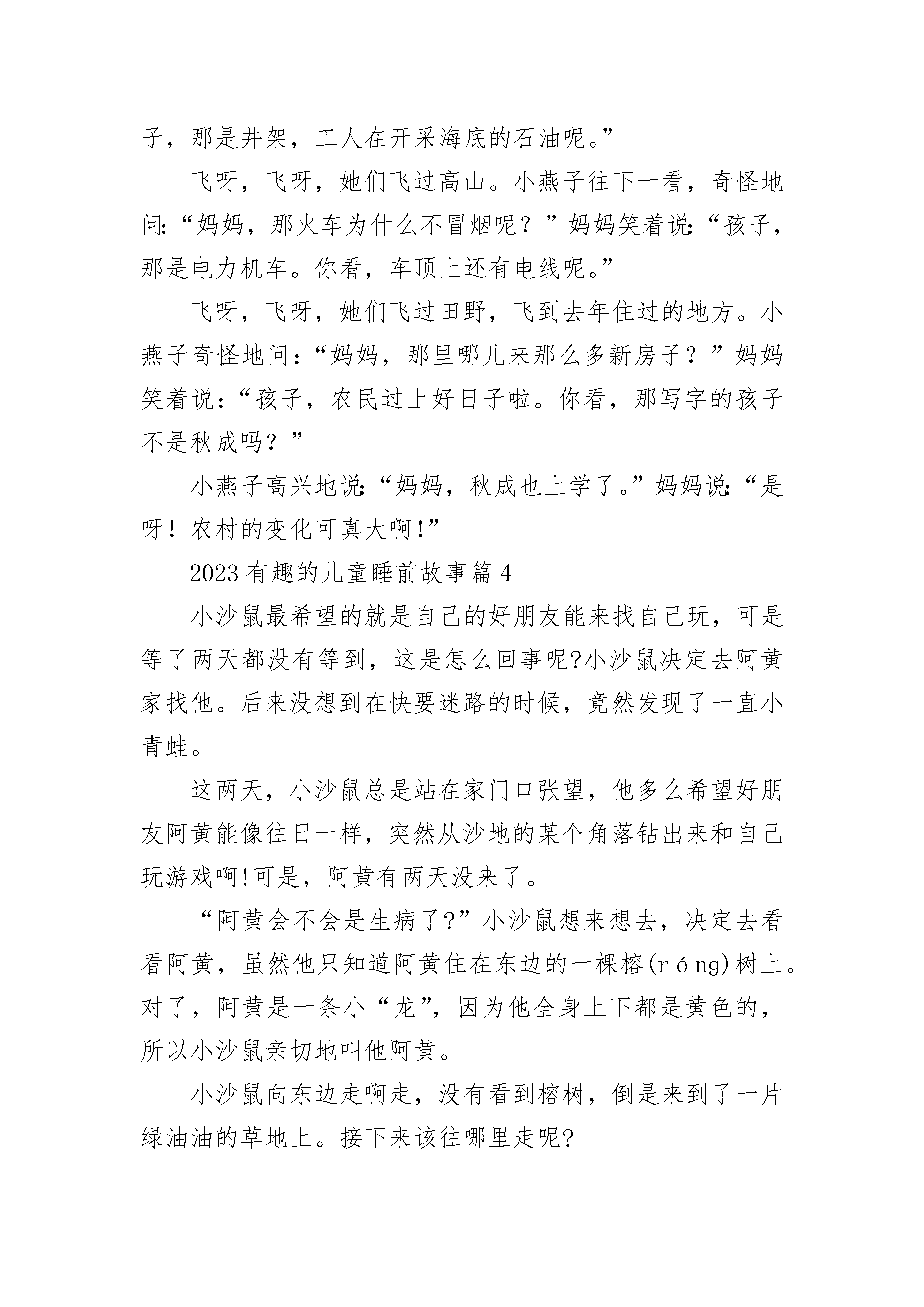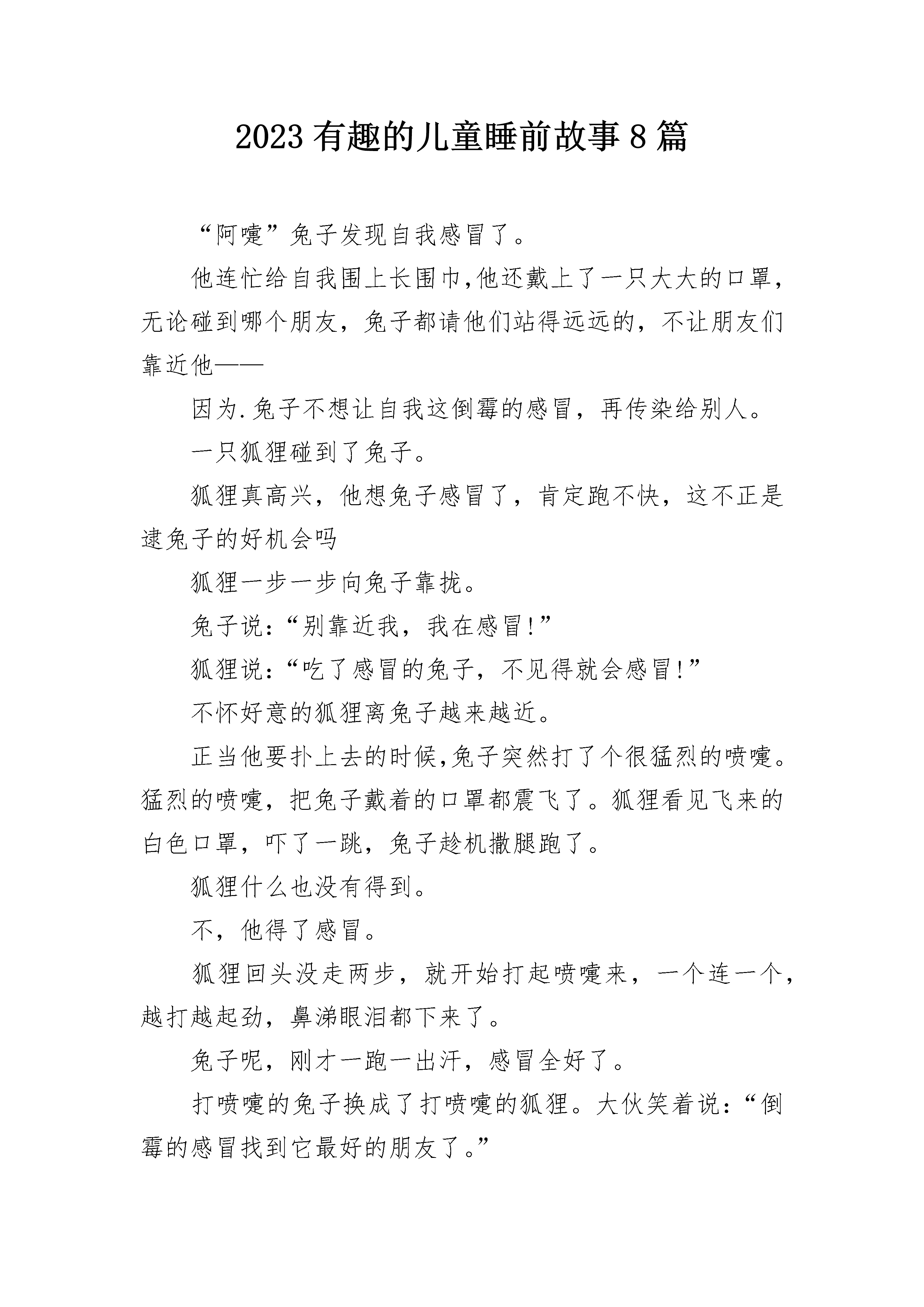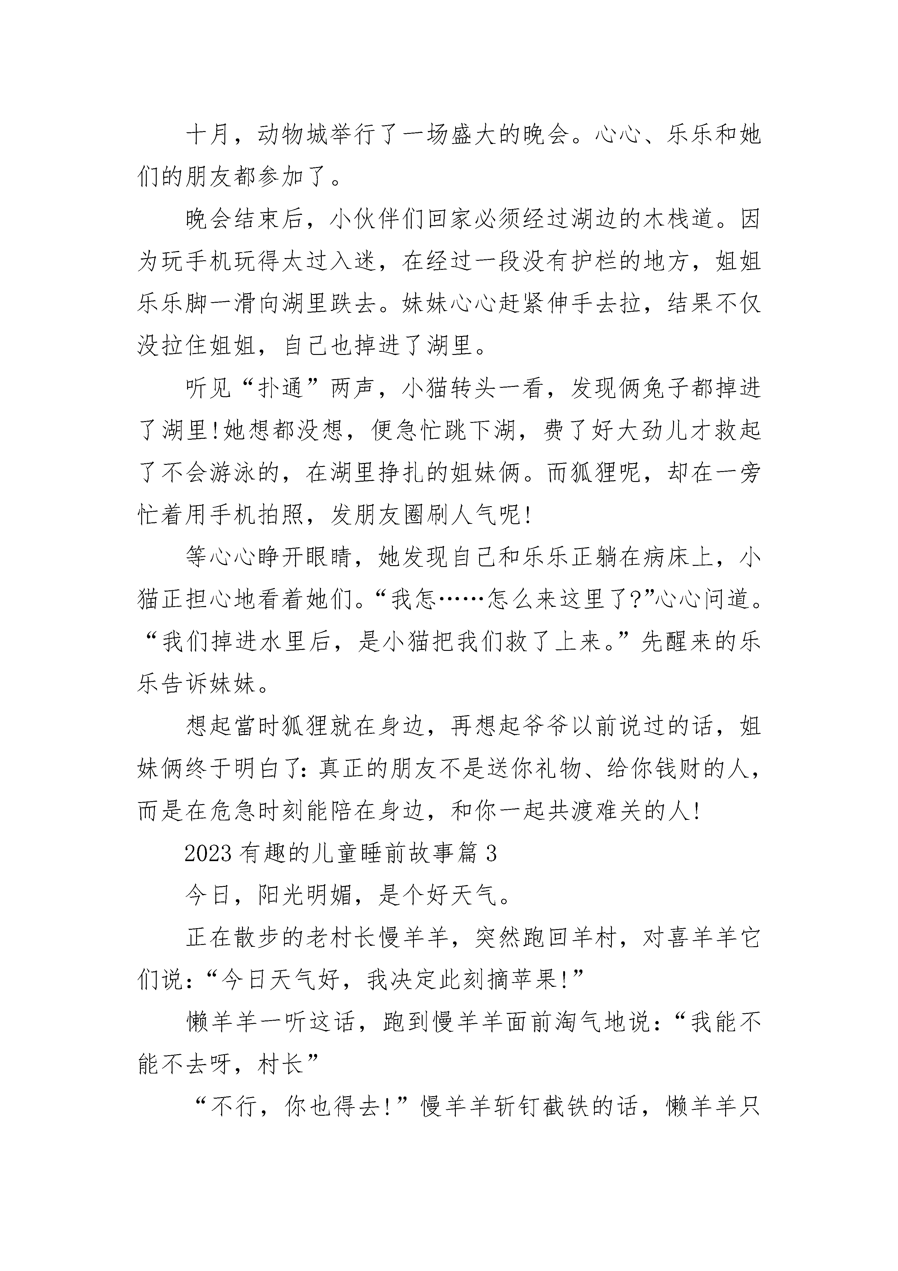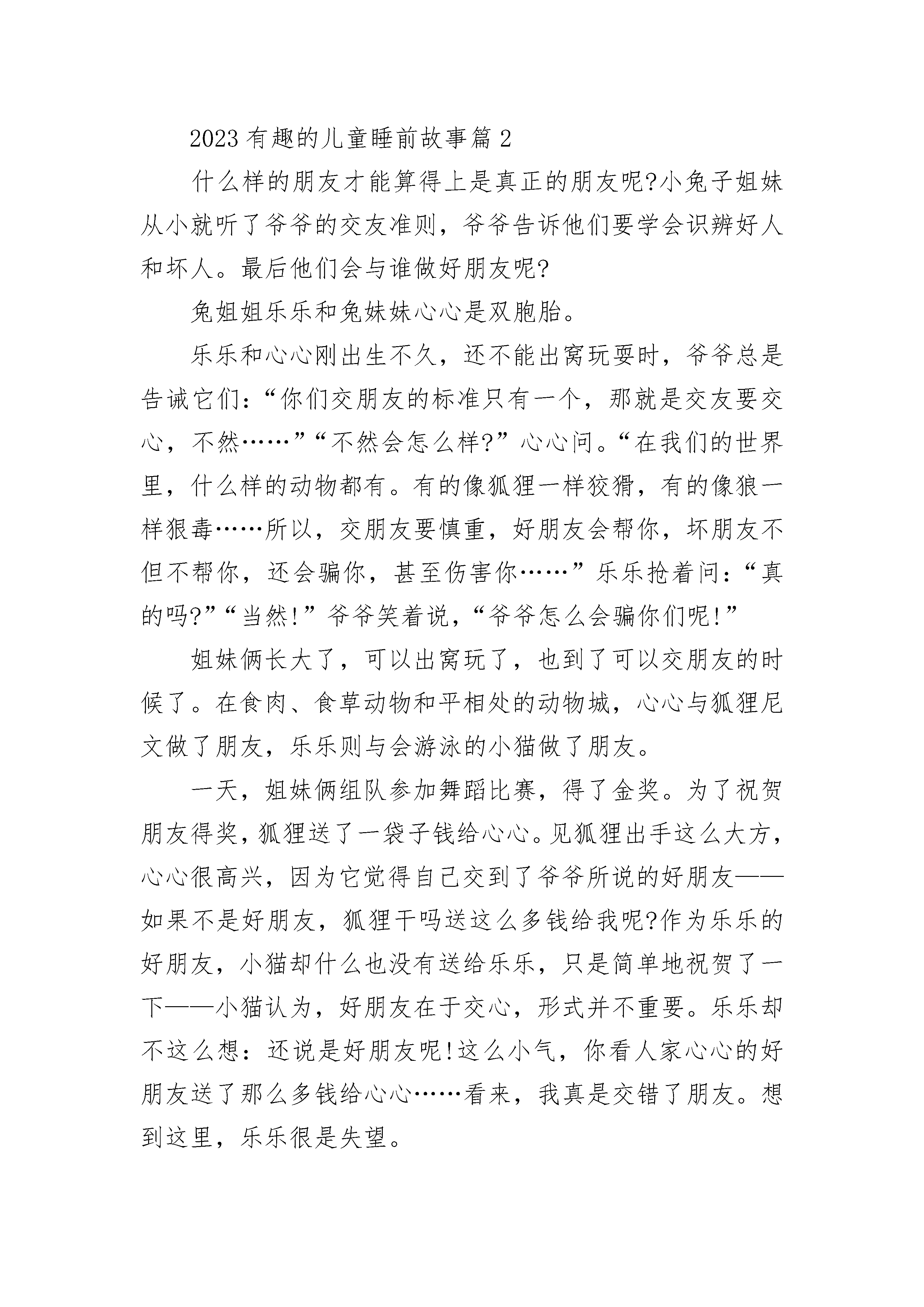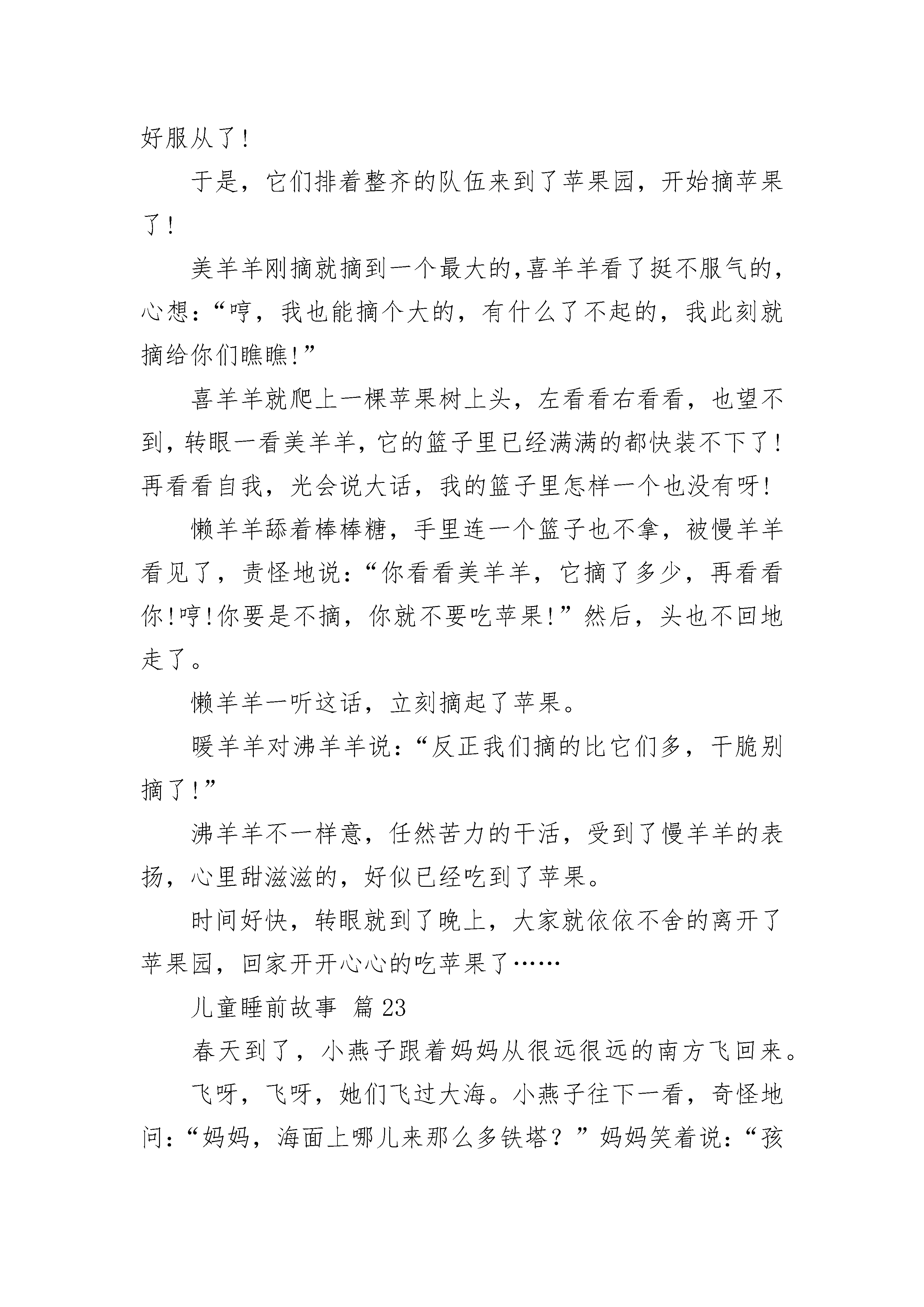 2023有趣的儿童睡前故事8篇“阿嚏”兔子发现自我感冒了。他连忙给自我围上长围巾,他还戴上了一只大大的口罩,无论碰到哪个朋友,兔子都请他们站得远远的,不让朋友们靠近他——因为.兔子不想让自我这倒霉的感冒,再传染给别人。一只狐狸碰到了兔子。狐狸真高兴,他想兔子感冒了,肯定跑不快,这不正是逮兔子的好机会吗狐狸一步一步向兔子靠拢。兔子说:“别靠近我,我在感冒!”狐狸说:“吃了感冒的兔子,不见得就会感冒!”不怀好意的狐狸离兔子越来越近。正当他要扑上去的时候,兔子突然打了个很猛烈的喷嚏。猛烈的喷嚏,把兔子戴着的口罩都震飞了。狐狸看见飞来的白色口罩,吓了一跳,兔子趁机撒腿跑了。狐狸什么也没有得到。不,他得了感冒。狐狸回头没走两步,就开始打起喷嚏来,一个连一个,越打越起劲,鼻涕眼泪都下来了。兔子呢,刚才一跑一出汗,感冒全好了。打喷嚏的兔子换成了打喷嚏的狐狸。大伙笑着说:“倒霉的感冒找到它最好的朋友了。”2023有趣的儿童睡前故事篇2什么样的朋友才能算得上是真正的朋友呢?小兔子姐妹从小就听了爷爷的交友准则,爷爷告诉他们要学会识辨好人和坏人。最后他们会与谁做好朋友呢?兔姐姐乐乐和兔妹妹心心是双胞胎。乐乐和心心刚出生不久,还不能出窝玩耍时,爷爷总是告诫它们:“你们交朋友的标准只有一个,那就是交友要交心,不然……”“不然会怎么样?”心心问。“在我们的世界里,什么样的动物都有。有的像狐狸一样狡猾,有的像狼一样狠毒……所以,交朋友要慎重,好朋友会帮你,坏朋友不但不帮你,还会骗你,甚至伤害你……”乐乐抢着问:“真的吗?”“当然!”爷爷笑着说,“爷爷怎么会骗你们呢!”姐妹俩长大了,可以出窝玩了,也到了可以交朋友的时候了。在食肉、食草动物和平相处的动物城,心心与狐狸尼文做了朋友,乐乐则与会游泳的小猫做了朋友。一天,姐妹俩组队参加舞蹈比赛,得了金奖。为了祝贺朋友得奖,狐狸送了一袋子钱给心心。见狐狸出手这么大方,心心很高兴,因为它觉得自己交到了爷爷所说的好朋友——如果不是好朋友,狐狸干吗送这么多钱给我呢?作为乐乐的好朋友,小猫却什么也没有送给乐乐,只是简单地祝贺了一下——小猫认为,好朋友在于交心,形式并不重要。乐乐却不这么想:还说是好朋友呢!这么小气,你看人家心心的好朋友送了那么多钱给心心……看来,我真是交错了朋友。想到这里,乐乐很是失望。十月,动物城举行了一场盛大的晚会。心心、乐乐和她们的朋友都参加了。晚会结束后,小伙伴们回家必须经过湖边的木栈道。因为玩手机玩得太过入迷,在经过一段没有护栏的地方,姐姐乐乐脚一滑向湖里跌去。妹妹心心赶紧伸手去拉,结果不仅没拉住姐姐,自己也掉进了湖里。听见“扑通”两声,小猫转头一看,发现俩兔子都掉进了湖里!她想都没想,便急忙跳下湖,费了好大劲儿才救起了不会游泳的,在湖里挣扎的姐妹俩。而狐狸呢,却在一旁忙着用手机拍照,发朋友圈刷人气呢!等心心睁开眼睛,她发现自己和乐乐正躺在病床上,小猫正担心地看着她们。“我怎……怎么来这里了?”心心问道。“我们掉进水里后,是小猫把我们救了上来。”先醒来的乐乐告诉妹妹。想起當时狐狸就在身边,再想起爷爷以前说过的话,姐妹俩终于明白了:真正的朋友不是送你礼物、给你钱财的人,而是在危急时刻能陪在身边,和你一起共渡难关的人!2023有趣的儿童睡前故事篇3今日,阳光明媚,是个好天气。正在散步的老村长慢羊羊,突然跑回羊村,对喜羊羊它们说:“今日天气好,我决定此刻摘苹果!”懒羊羊一听这话,跑到慢羊羊面前淘气地说:“我能不能不去呀,村长”“不行,你也得去!”慢羊羊斩钉截铁的话,懒羊羊只好服从了!于是,它们排着整齐的队伍来到了苹果园,开始摘苹果了!美羊羊刚摘就摘到一个最大的,喜羊羊看了挺不服气的,心想:“哼,我也能摘个大的,有什么了不起的,我此刻就摘给你们瞧瞧!”喜羊羊就爬上一棵苹果树上头,左看看右看看,也望不到,转眼一看美羊羊,它的篮子里已经满满的都快装不下了!再看看自我,光会说大话,我的篮子里怎样一个也没有呀!懒羊羊舔着棒棒糖,手里连一个篮子也不拿,被慢羊羊看见了,责怪地说:“你看看美羊羊,它摘了多少,再看看你!哼!你要是不摘,你就不要吃苹果!”然后,头也不回地走了。懒羊羊一听这话,立刻摘起了苹果。暖羊羊对沸羊羊说:“反正我们摘的比它们多,干脆别摘了!”沸羊羊不一样意,任然苦力的干活,受到了慢羊羊的表扬,心里甜滋滋的,好似已经吃到了苹果。时间好快,转眼就到了晚上,大家就依依不舍的离开了苹果园,回家开开心心的吃苹果了……儿童睡前故事篇23春天到了,小燕子跟着妈妈从很远很远的南方飞回来。飞呀,飞呀,她们飞过大海。小燕子往下一看,奇怪地问:“妈妈,海面上哪儿来那么多铁塔?”妈妈笑着说:“孩子,那是井架,工人在开采海底的石油呢。”飞呀,飞呀,她们飞过高山。小燕子往下一看,奇怪地问:“妈妈,那火车为什么不冒烟呢?”妈妈笑