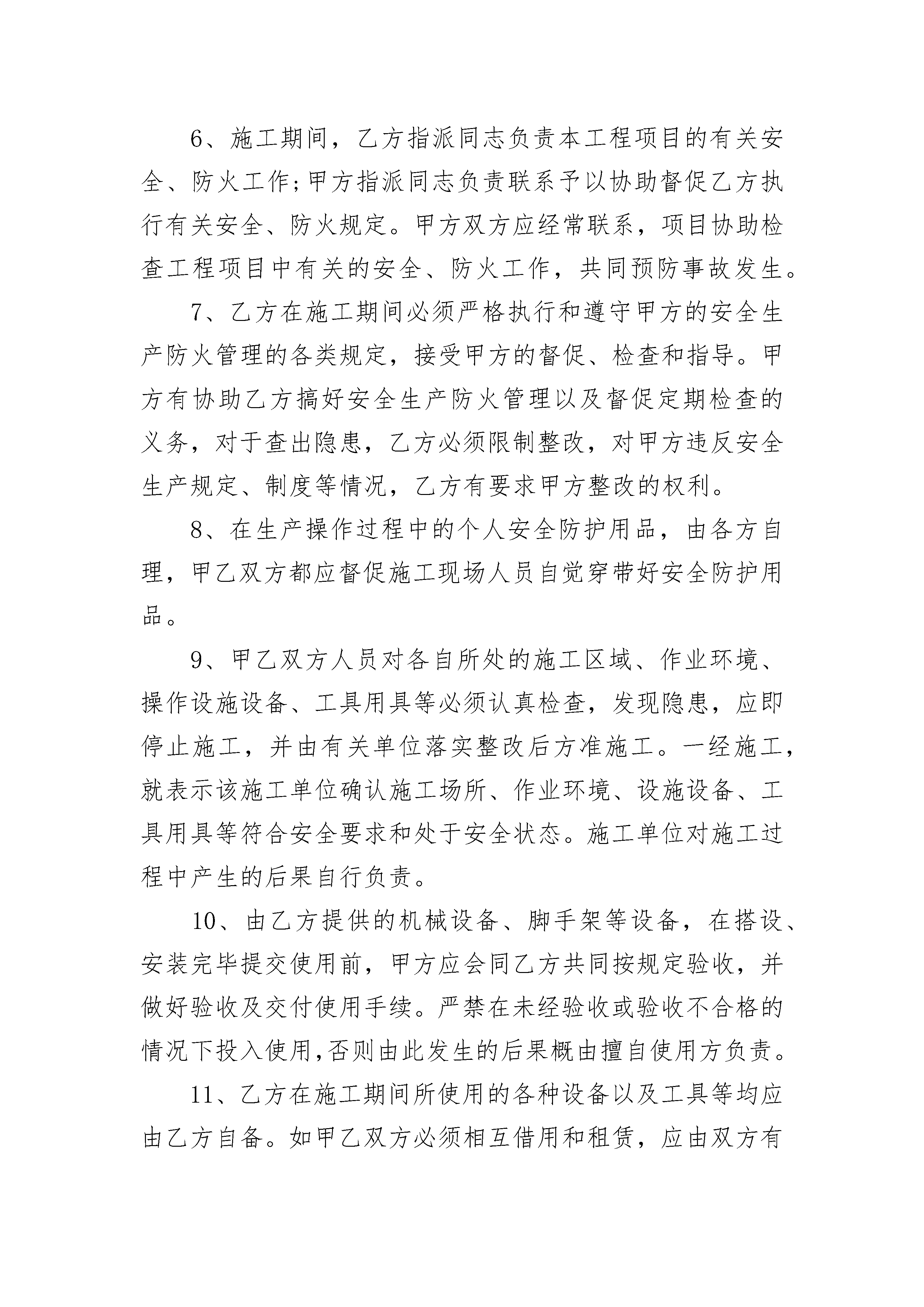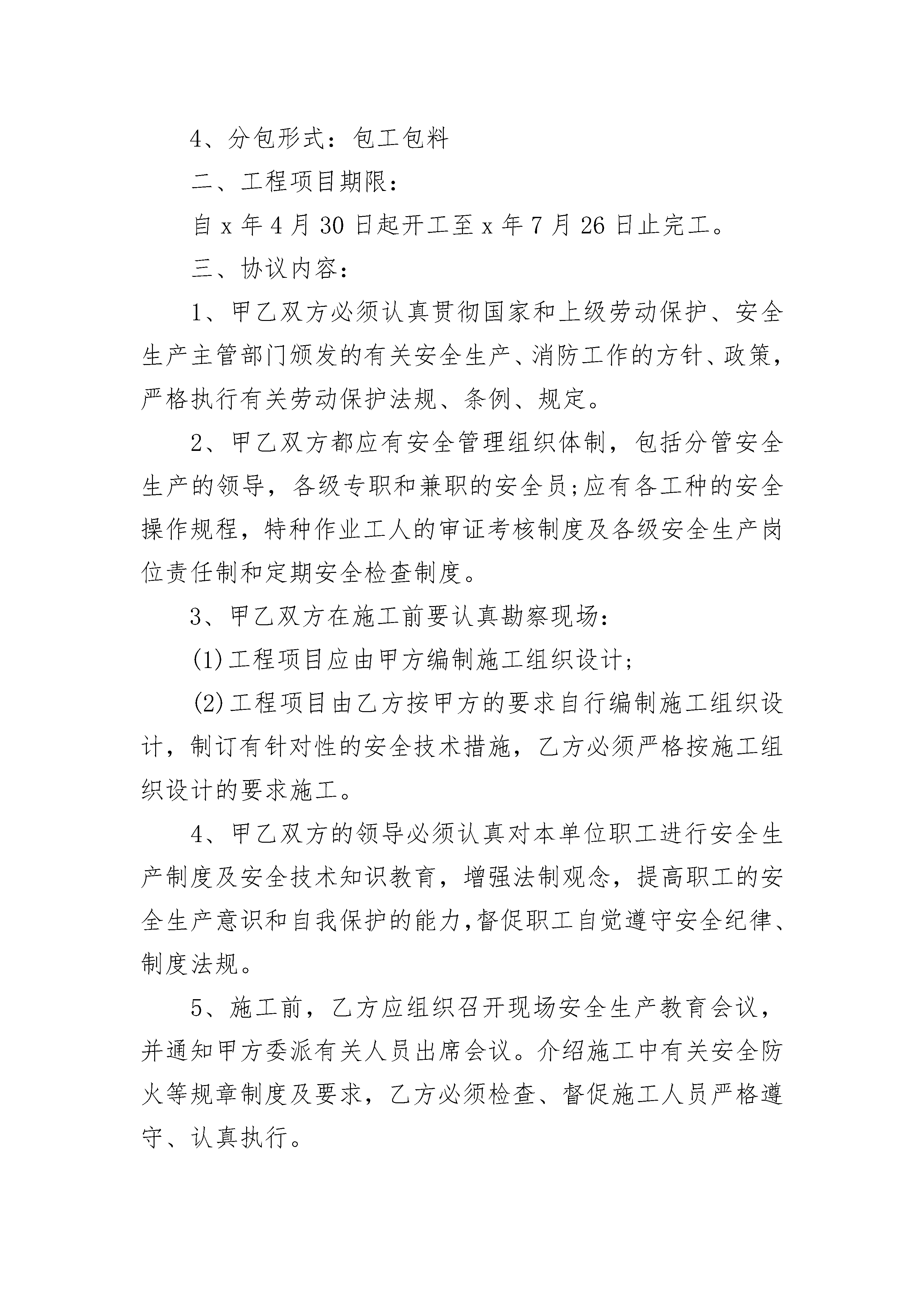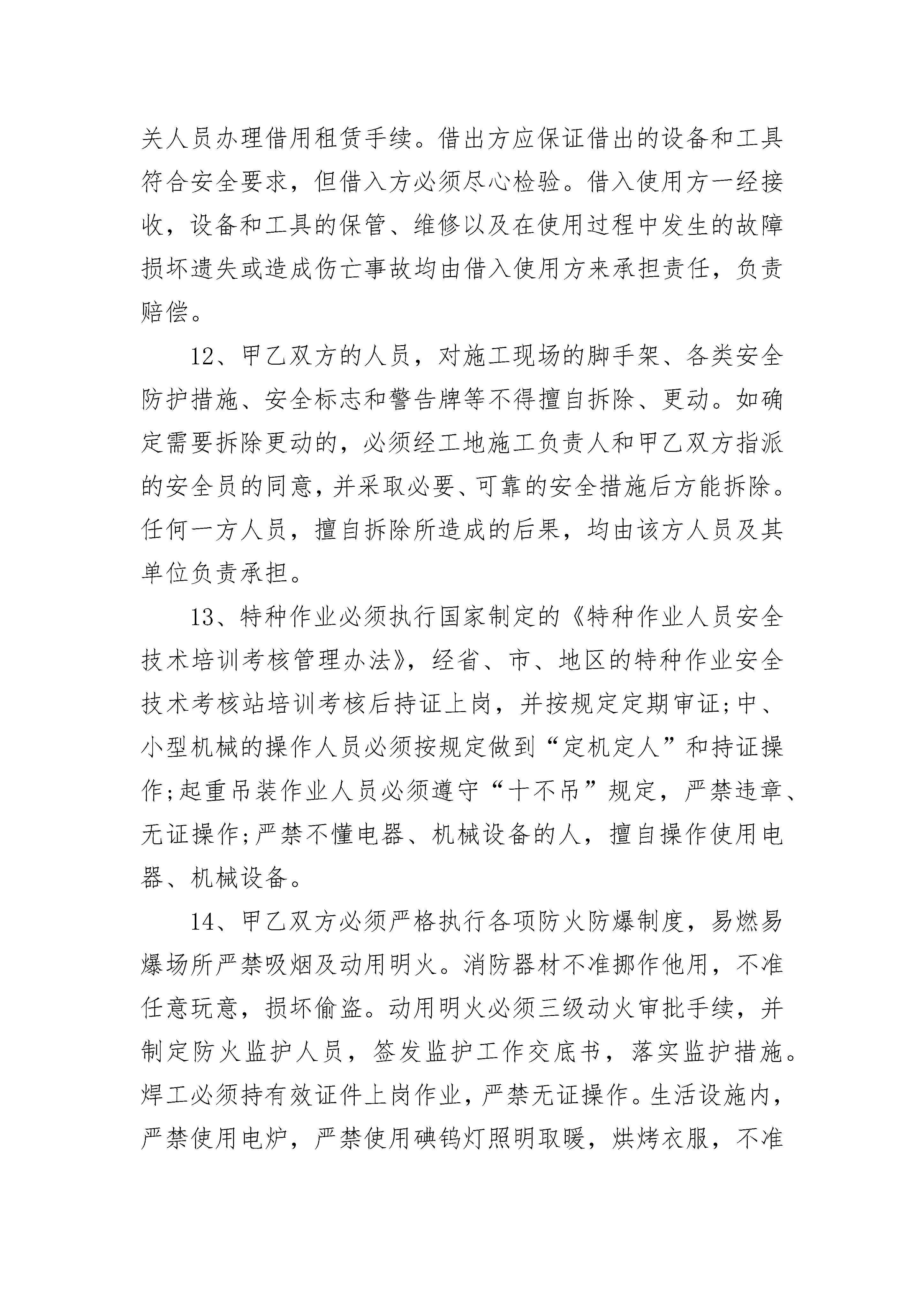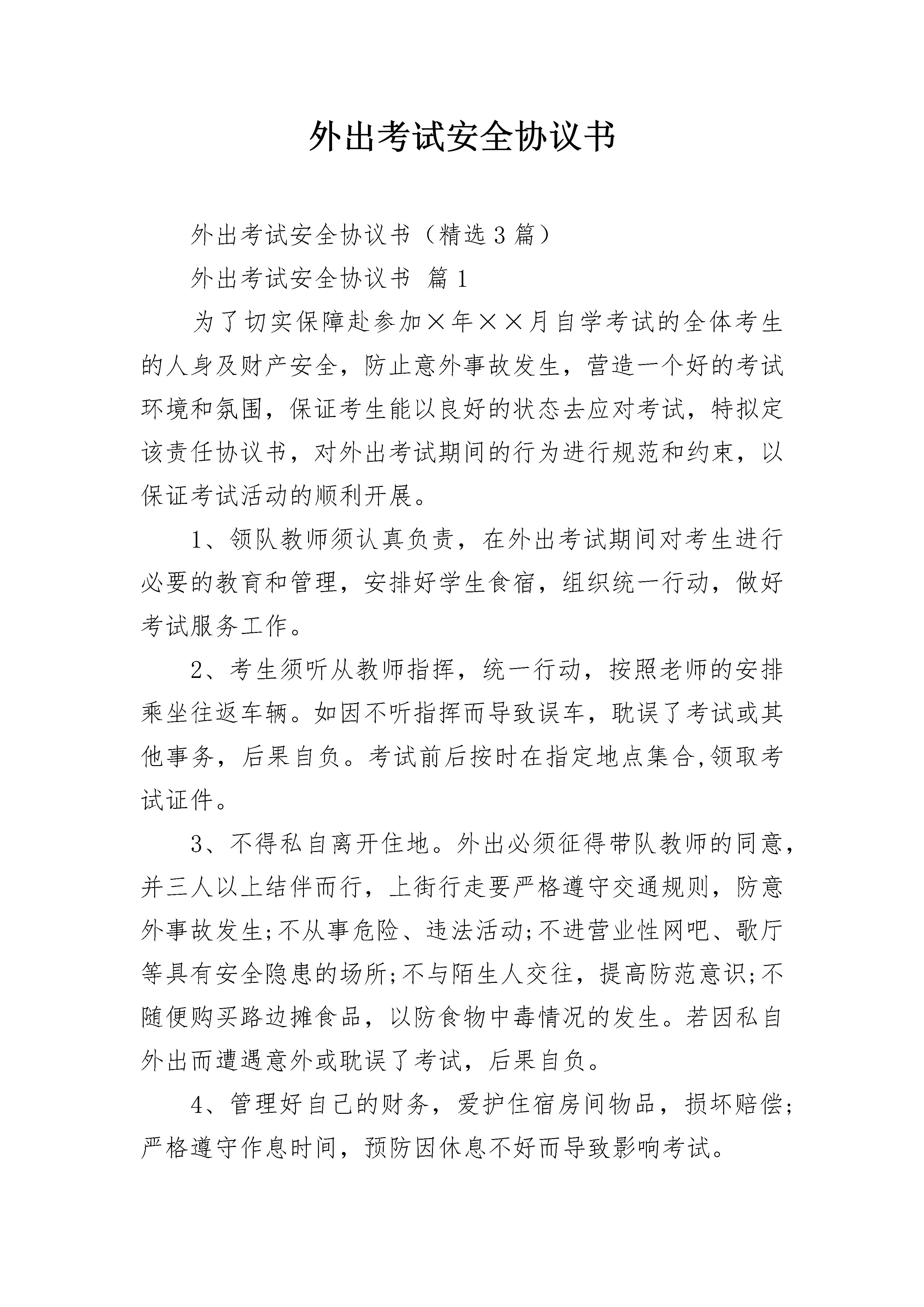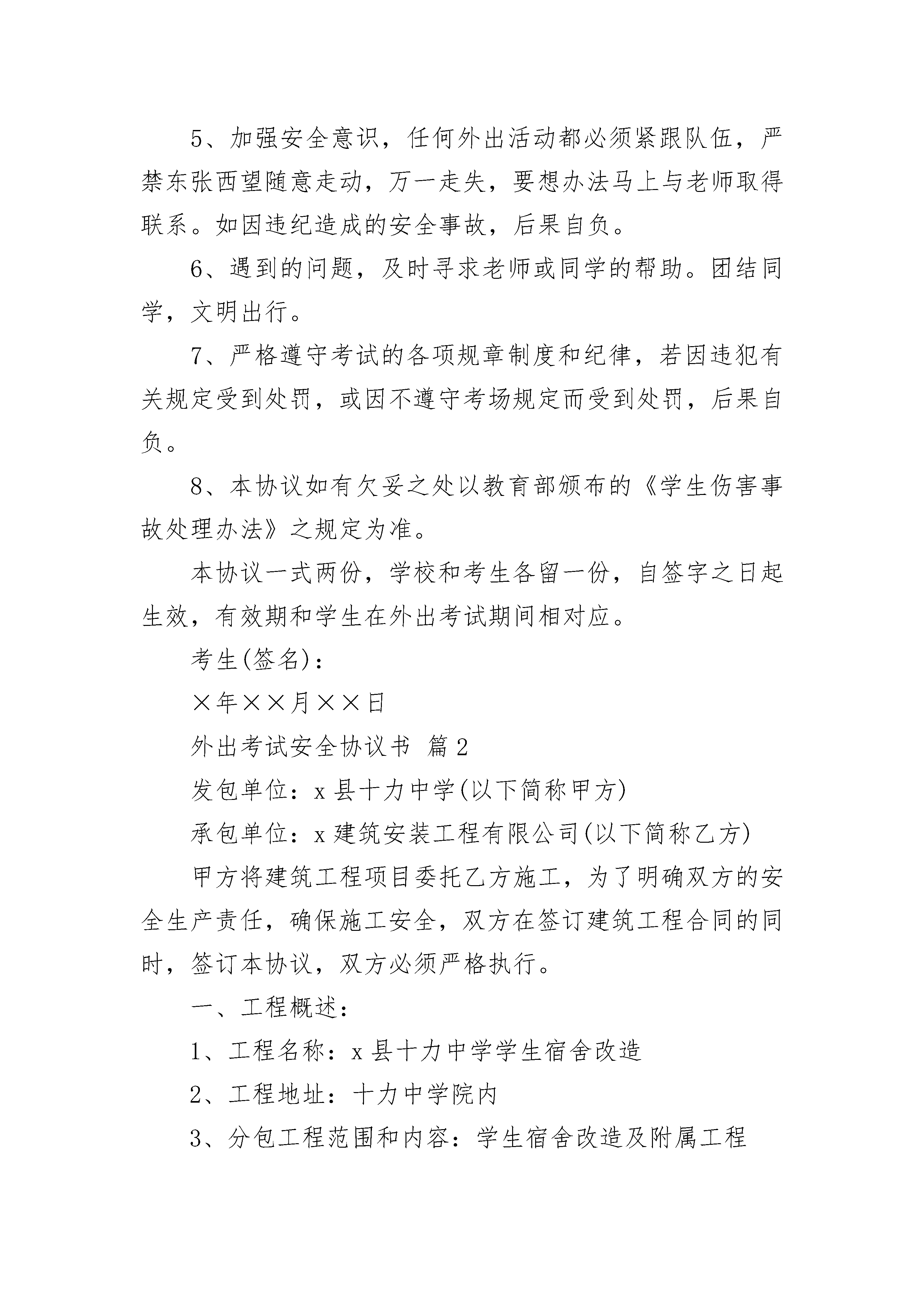 外出考试安全协议书外出考试安全协议书(精选3篇)外出考试安全协议书篇1为了切实保障赴参加×年××月自学考试的全体考生的人身及财产安全,防止意外事故发生,营造一个好的考试环境和氛围,保证考生能以良好的状态去应对考试,特拟定该责任协议书,对外出考试期间的行为进行规范和约束,以保证考试活动的顺利开展。1、领队教师须认真负责,在外出考试期间对考生进行必要的教育和管理,安排好学生食宿,组织统一行动,做好考试服务工作。2、考生须听从教师指挥,统一行动,按照老师的安排乘坐往返车辆。如因不听指挥而导致误车,耽误了考试或其他事务,后果自负。考试前后按时在指定地点集合,领取考试证件。3、不得私自离开住地。外出必须征得带队教师的同意,并三人以上结伴而行,上街行走要严格遵守交通规则,防意外事故发生;不从事危险、违法活动;不进营业性网吧、歌厅等具有安全隐患的场所;不与陌生人交往,提高防范意识;不随便购买路边摊食品,以防食物中毒情况的发生。若因私自外出而遭遇意外或耽误了考试,后果自负。4、管理好自己的财务,爱护住宿房间物品,损坏赔偿;严格遵守作息时间,预防因休息不好而导致影响考试。5、加强安全意识,任何外出活动都必须紧跟队伍,严禁东张西望随意走动,万一走失,要想办法马上与老师取得联系。如因违纪造成的安全事故,后果自负。6、遇到的问题,及时寻求老师或同学的帮助。团结同学,文明出行。7、严格遵守考试的各项规章制度和纪律,若因违犯有关规定受到处罚,或因不遵守考场规定而受到处罚,后果自负。8、本协议如有欠妥之处以教育部颁布的《学生伤害事故处理办法》之规定为准。本协议一式两份,学校和考生各留一份,自签字之日起生效,有效期和学生在外出考试期间相对应。考生(签名):×年××月××日外出考试安全协议书篇2发包单位:x县十力中学(以下简称甲方)承包单位:x建筑安装工程有限公司(以下简称乙方)甲方将建筑工程项目委托乙方施工,为了明确双方的安全生产责任,确保施工安全,双方在签订建筑工程合同的同时,签订本协议,双方必须严格执行。一、工程概述:1、工程名称:x县十力中学学生宿舍改造2、工程地址:十力中学院内3、分包工程范围和内容:学生宿舍改造及附属工程4、分包形式:包工包料二、工程项目期限:自x年4月30日起开工至x年7月26日止完工。三、协议内容:1、甲乙双方必须认真贯彻国家和上级劳动保护、安全生产主管部门颁发的有关安全生产、消防工作的方针、政策,严格执行有关劳动保护法规、条例、规定。2、甲乙双方都应有安全管理组织体制,包括分管安全生产的领导,各级专职和兼职的安全员;应有各工种的安全操作规程,特种作业工人的审证考核制度及各级安全生产岗位责任制和定期安全检查制度。3、甲乙双方在施工前要认真勘察现场:(1)工程项目应由甲方编制施工组织设计;(2)工程项目由乙方按甲方的要求自行编制施工组织设计,制订有针对性的安全技术措施,乙方必须严格按施工组织设计的要求施工。4、甲乙双方的领导必须认真对本单位职工进行安全生产制度及安全技术知识教育,增强法制观念,提高职工的安全生产意识和自我保护的能力,督促职工自觉遵守安全纪律、制度法规。5、施工前,乙方应组织召开现场安全生产教育会议,并通知甲方委派有关人员出席会议。介绍施工中有关安全防火等规章制度及要求,乙方必须检查、督促施工人员严格遵守、认真执行。6、施工期间,乙方指派同志负责本工程项目的有关安全、防火工作;甲方指派同志负责联系予以协助督促乙方执行有关安全、防火规定。甲方双方应经常联系,项目协助检查工程项目中有关的安全、防火工作,共同预防事故发生。7、乙方在施工期间必须严格执行和遵守甲方的安全生产防火管理的各类规定,接受甲方的督促、检查和指导。甲方有协助乙方搞好安全生产防火管理以及督促定期检查的义务,对于查出隐患,乙方必须限制整改,对甲方违反安全生产规定、制度等情况,乙方有要求甲方整改的权利。8、在生产操作过程中的个人安全防护用品,由各方自理,甲乙双方都应督促施工现场人员自觉穿带好安全防护用品。9、甲乙双方人员对各自所处的施工区域、作业环境、操作设施设备、工具用具等必须认真检查,发现隐患,应即停止施工,并由有关单位落实整改后方准施工。一经施工,就表示该施工单位确认施工场所、作业环境、设施设备、工具用具等符合安全要求和处于安全状态。施工单位对施工过程中产生的后果自行负责。10、由乙方提供的机械设备、脚手架等设备,在搭设、安装完毕提交使用前,甲方应会同乙方共同按规定验收,并做好验收及交付使用手续。严禁在未经验收或验收不合格的情况下投入使用,否则由此发生的后果概由擅自使用方负责。11、乙方在施工期间所使用的各种设备以及工具等均应由乙方自备。如甲乙双方必须相互借用和租赁,应由双方有关人员办理借用租赁手续。借出方应保证借出的设备和工具符合安全要求,但借入