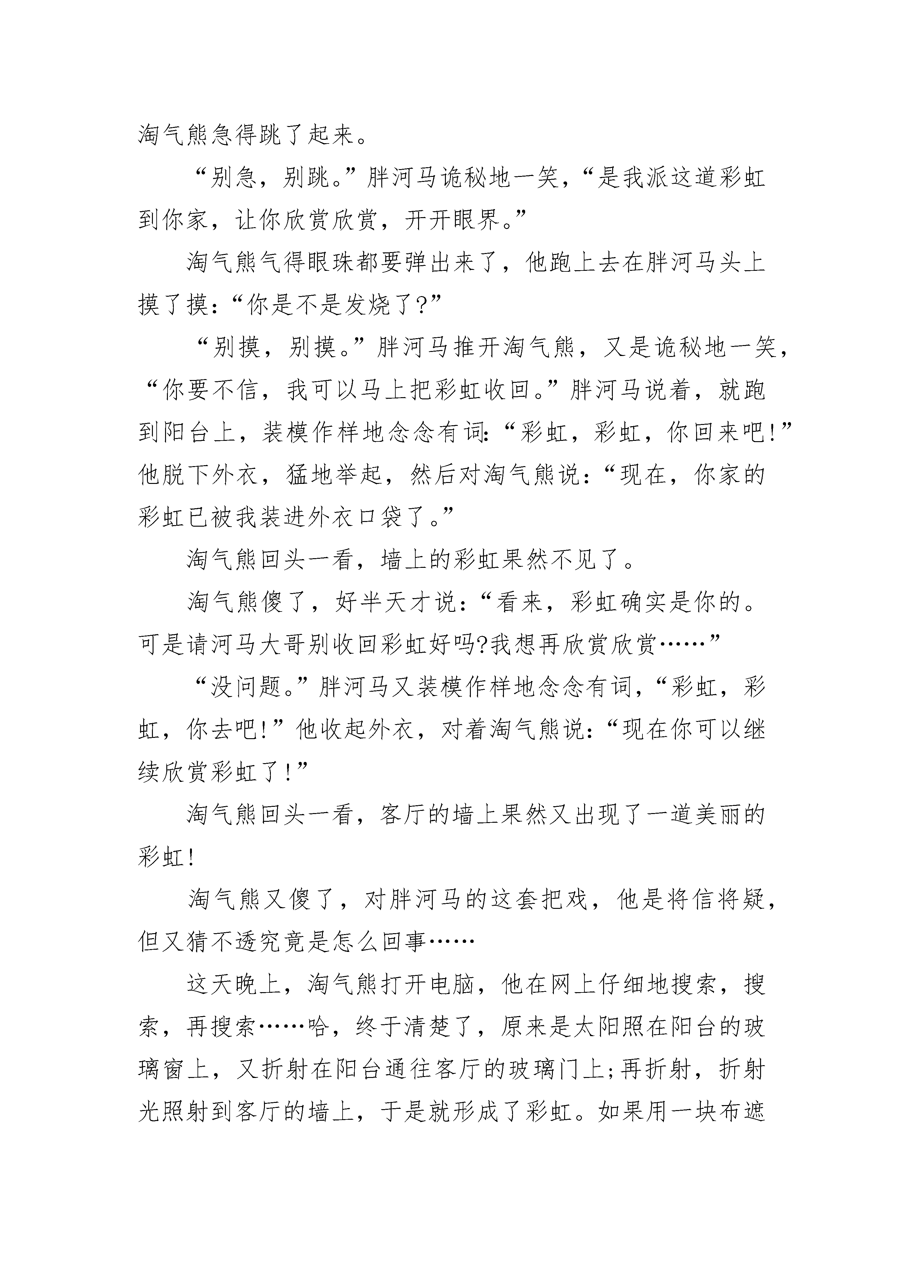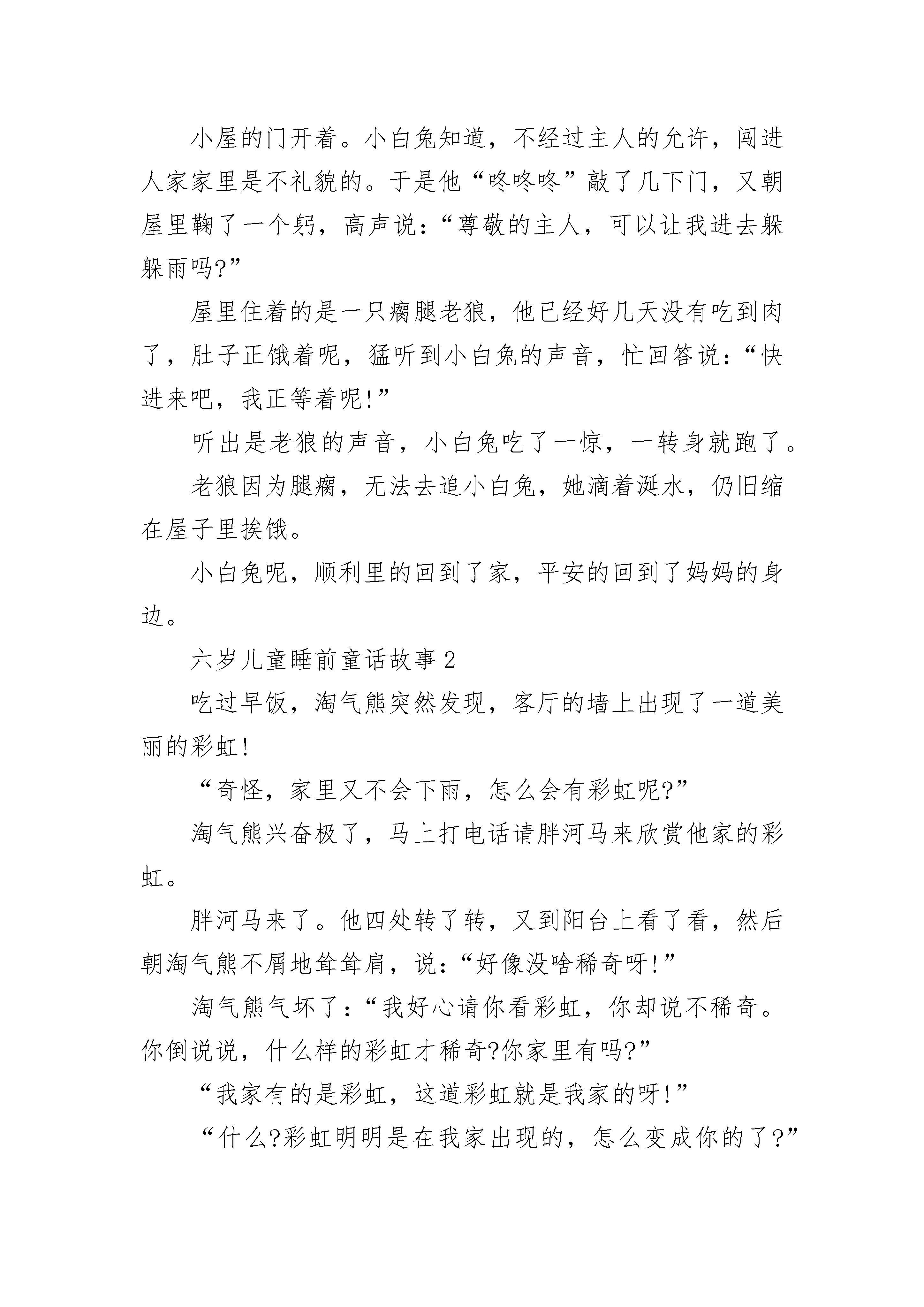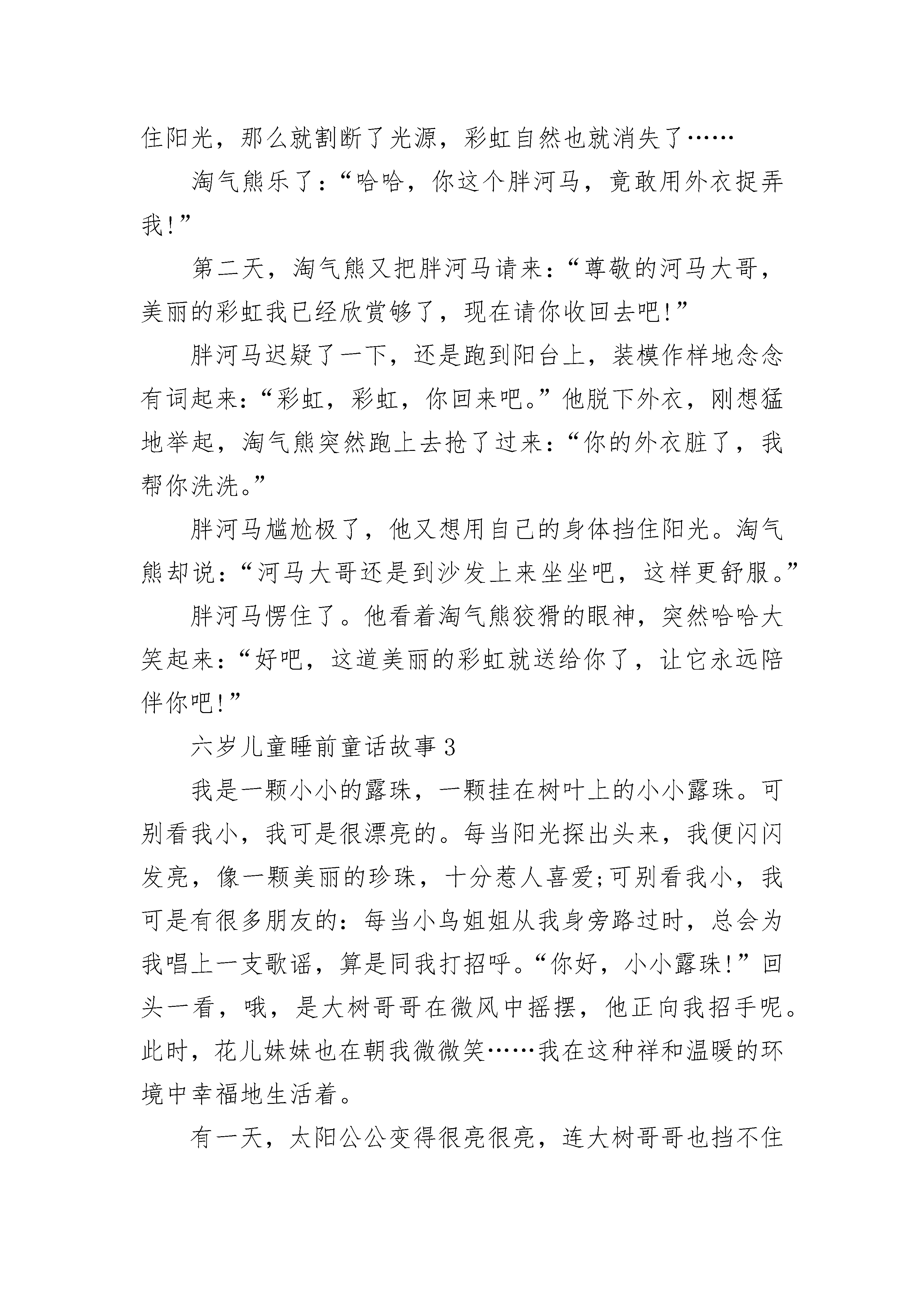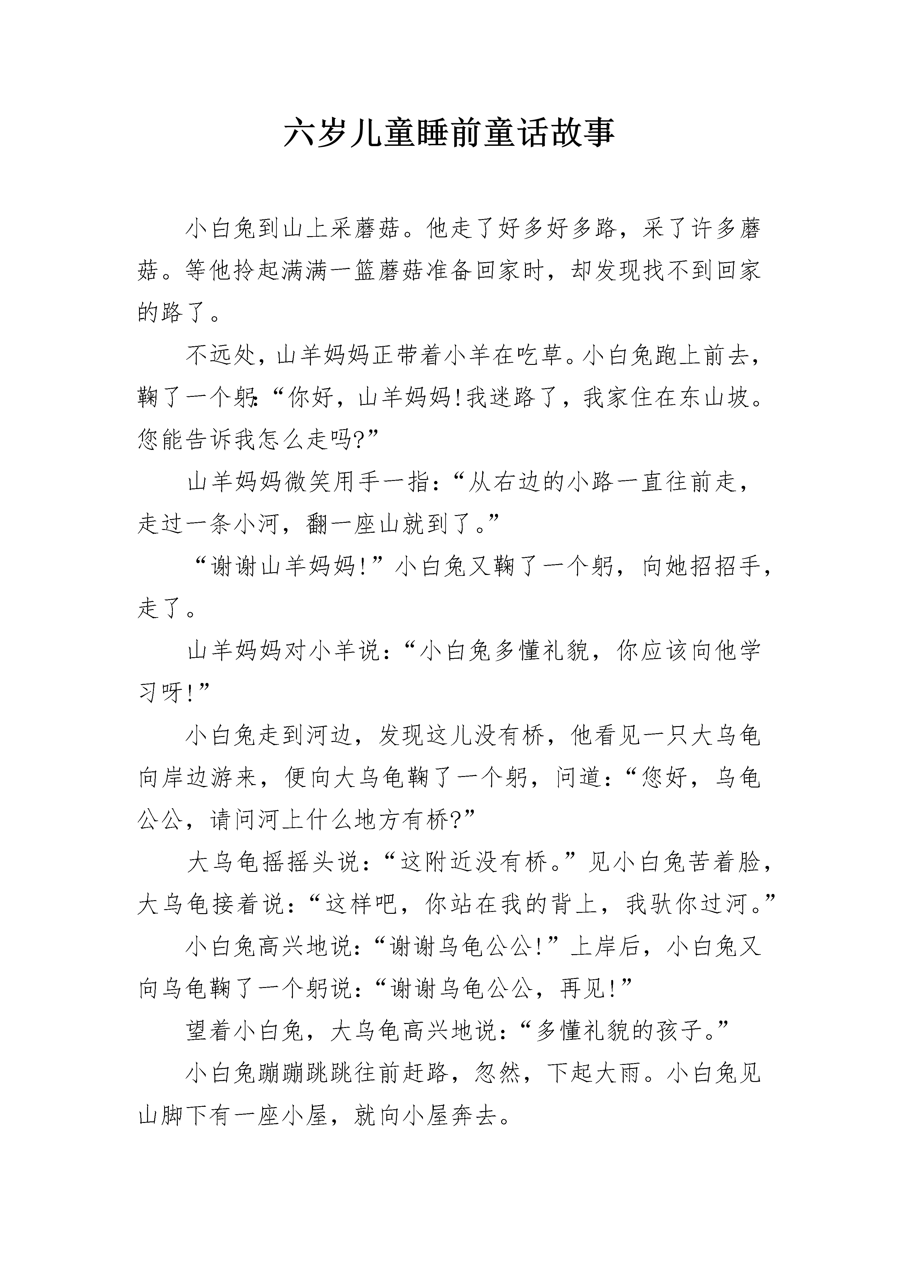 六岁儿童睡前童话故事小白兔到山上采蘑菇。他走了好多好多路,采了许多蘑菇。等他拎起满满一篮蘑菇准备回家时,却发现找不到回家的路了。不远处,山羊妈妈正带着小羊在吃草。小白兔跑上前去,鞠了一个躬:“你好,山羊妈妈!我迷路了,我家住在东山坡。您能告诉我怎么走吗?”山羊妈妈微笑用手一指:“从右边的小路一直往前走,走过一条小河,翻一座山就到了。”“谢谢山羊妈妈!”小白兔又鞠了一个躬,向她招招手,走了。山羊妈妈对小羊说:“小白兔多懂礼貌,你应该向他学习呀!”小白兔走到河边,发现这儿没有桥,他看见一只大乌龟向岸边游来,便向大乌龟鞠了一个躬,问道:“您好,乌龟公公,请问河上什么地方有桥?”大乌龟摇摇头说:“这附近没有桥。”见小白兔苦着脸,大乌龟接着说:“这样吧,你站在我的背上,我驮你过河。”小白兔高兴地说:“谢谢乌龟公公!”上岸后,小白兔又向乌龟鞠了一个躬说:“谢谢乌龟公公,再见!”望着小白兔,大乌龟高兴地说:“多懂礼貌的孩子。”小白兔蹦蹦跳跳往前赶路,忽然,下起大雨。小白兔见山脚下有一座小屋,就向小屋奔去。小屋的门开着。小白兔知道,不经过主人的允许,闯进人家家里是不礼貌的。于是他“咚咚咚”敲了几下门,又朝屋里鞠了一个躬,高声说:“尊敬的主人,可以让我进去躲躲雨吗?”屋里住着的是一只瘸腿老狼,他已经好几天没有吃到肉了,肚子正饿着呢,猛听到小白兔的声音,忙回答说:“快进来吧,我正等着呢!”听出是老狼的声音,小白兔吃了一惊,一转身就跑了。老狼因为腿瘸,无法去追小白兔,她滴着涎水,仍旧缩在屋子里挨饿。小白兔呢,顺利里的回到了家,平安的回到了妈妈的身边。六岁儿童睡前童话故事2吃过早饭,淘气熊突然发现,客厅的墙上出现了一道美丽的彩虹!“奇怪,家里又不会下雨,怎么会有彩虹呢?”淘气熊兴奋极了,马上打电话请胖河马来欣赏他家的彩虹。胖河马来了。他四处转了转,又到阳台上看了看,然后朝淘气熊不屑地耸耸肩,说:“好像没啥稀奇呀!”淘气熊气坏了:“我好心请你看彩虹,你却说不稀奇。你倒说说,什么样的彩虹才稀奇?你家里有吗?”“我家有的是彩虹,这道彩虹就是我家的呀!”“什么?彩虹明明是在我家出现的,怎么变成你的了?”淘气熊急得跳了起来。“别急,别跳。”胖河马诡秘地一笑,“是我派这道彩虹到你家,让你欣赏欣赏,开开眼界。”淘气熊气得眼珠都要弹出来了,他跑上去在胖河马头上摸了摸:“你是不是发烧了?”“别摸,别摸。”胖河马推开淘气熊,又是诡秘地一笑,“你要不信,我可以马上把彩虹收回。”胖河马说着,就跑到阳台上,装模作样地念念有词:“彩虹,彩虹,你回来吧!”他脱下外衣,猛地举起,然后对淘气熊说:“现在,你家的彩虹已被我装进外衣口袋了。”淘气熊回头一看,墙上的彩虹果然不见了。淘气熊傻了,好半天才说:“看来,彩虹确实是你的。可是请河马大哥别收回彩虹好吗?我想再欣赏欣赏……”“没问题。”胖河马又装模作样地念念有词,“彩虹,彩虹,你去吧!”他收起外衣,对着淘气熊说:“现在你可以继续欣赏彩虹了!”淘气熊回头一看,客厅的墙上果然又出现了一道美丽的彩虹!淘气熊又傻了,对胖河马的这套把戏,他是将信将疑,但又猜不透究竟是怎么回事……这天晚上,淘气熊打开电脑,他在网上仔细地搜索,搜索,再搜索……哈,终于清楚了,原来是太阳照在阳台的玻璃窗上,又折射在阳台通往客厅的玻璃门上;再折射,折射光照射到客厅的墙上,于是就形成了彩虹。如果用一块布遮住阳光,那么就割断了光源,彩虹自然也就消失了……淘气熊乐了:“哈哈,你这个胖河马,竟敢用外衣捉弄我!”第二天,淘气熊又把胖河马请来:“尊敬的河马大哥,美丽的彩虹我已经欣赏够了,现在请你收回去吧!”胖河马迟疑了一下,还是跑到阳台上,装模作样地念念有词起来:“彩虹,彩虹,你回来吧。”他脱下外衣,刚想猛地举起,淘气熊突然跑上去抢了过来:“你的外衣脏了,我帮你洗洗。”胖河马尴尬极了,他又想用自己的身体挡住阳光。淘气熊却说:“河马大哥还是到沙发上来坐坐吧,这样更舒服。”胖河马愣住了。他看着淘气熊狡猾的眼神,突然哈哈大笑起来:“好吧,这道美丽的彩虹就送给你了,让它永远陪伴你吧!”六岁儿童睡前童话故事3我是一颗小小的露珠,一颗挂在树叶上的小小露珠。可别看我小,我可是很漂亮的。每当阳光探出头来,我便闪闪发亮,像一颗美丽的珍珠,十分惹人喜爱;可别看我小,我可是有很多朋友的:每当小鸟姐姐从我身旁路过时,总会为我唱上一支歌谣,算是同我打招呼。“你好,小小露珠!”回头一看,哦,是大树哥哥在微风中摇摆,他正向我招手呢。此时,花儿妹妹也在朝我微微笑……我在这种祥和温暖的环境中幸福地生活着。有一天,太阳公公变得很亮很亮,连大树哥哥也挡不住他那灼人的阳光了!我的体温越来越高,身体也变得越来小,越来越轻了。我对着太阳公公大喊一声:“太阳公公,快停下!”可他根本就没有听见!正当我快要绝望的时候,忽然,我