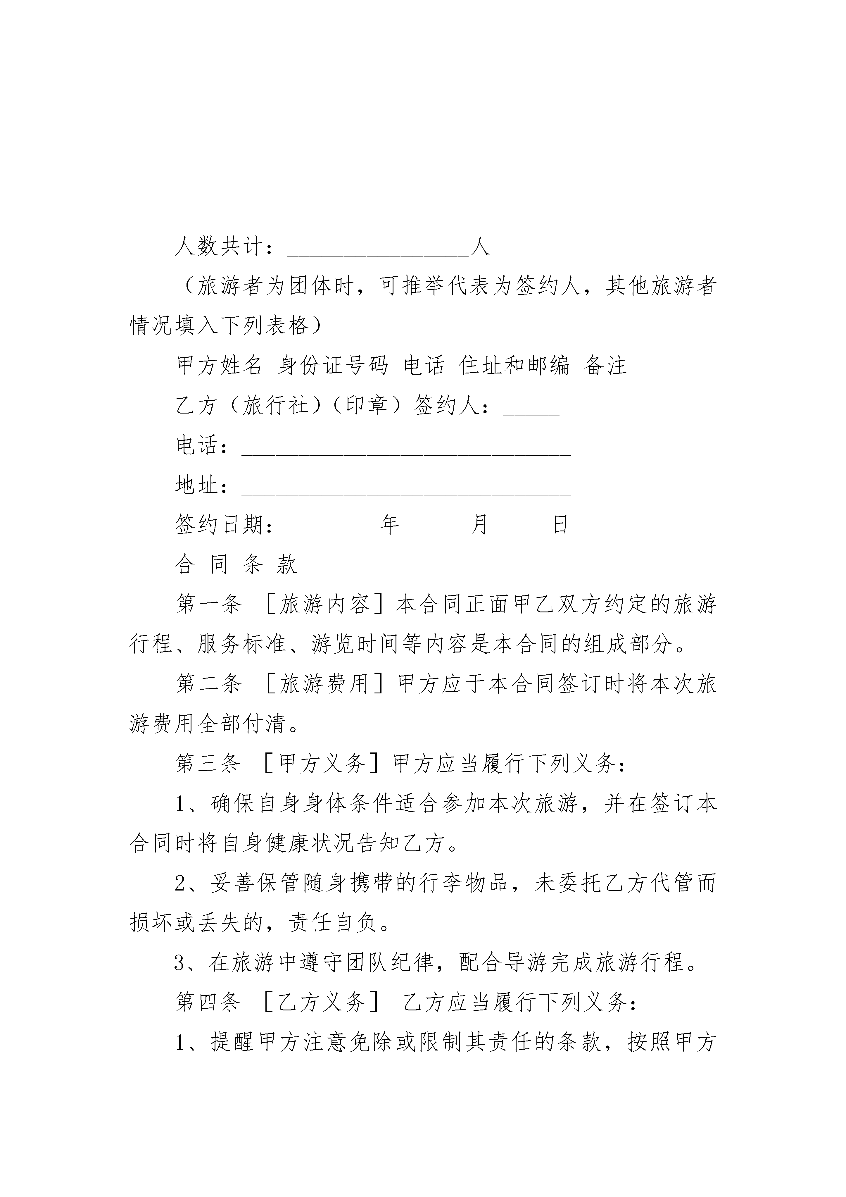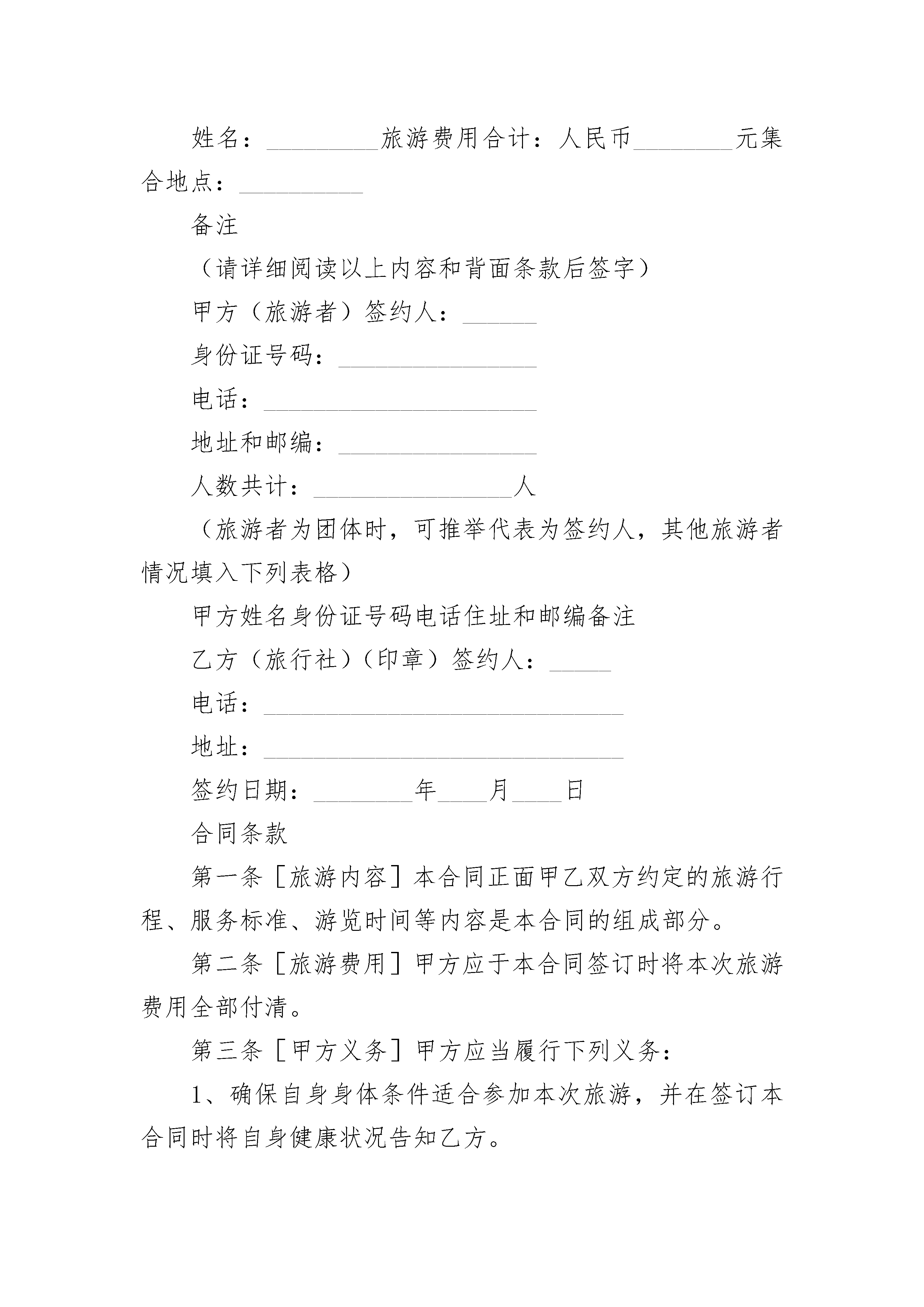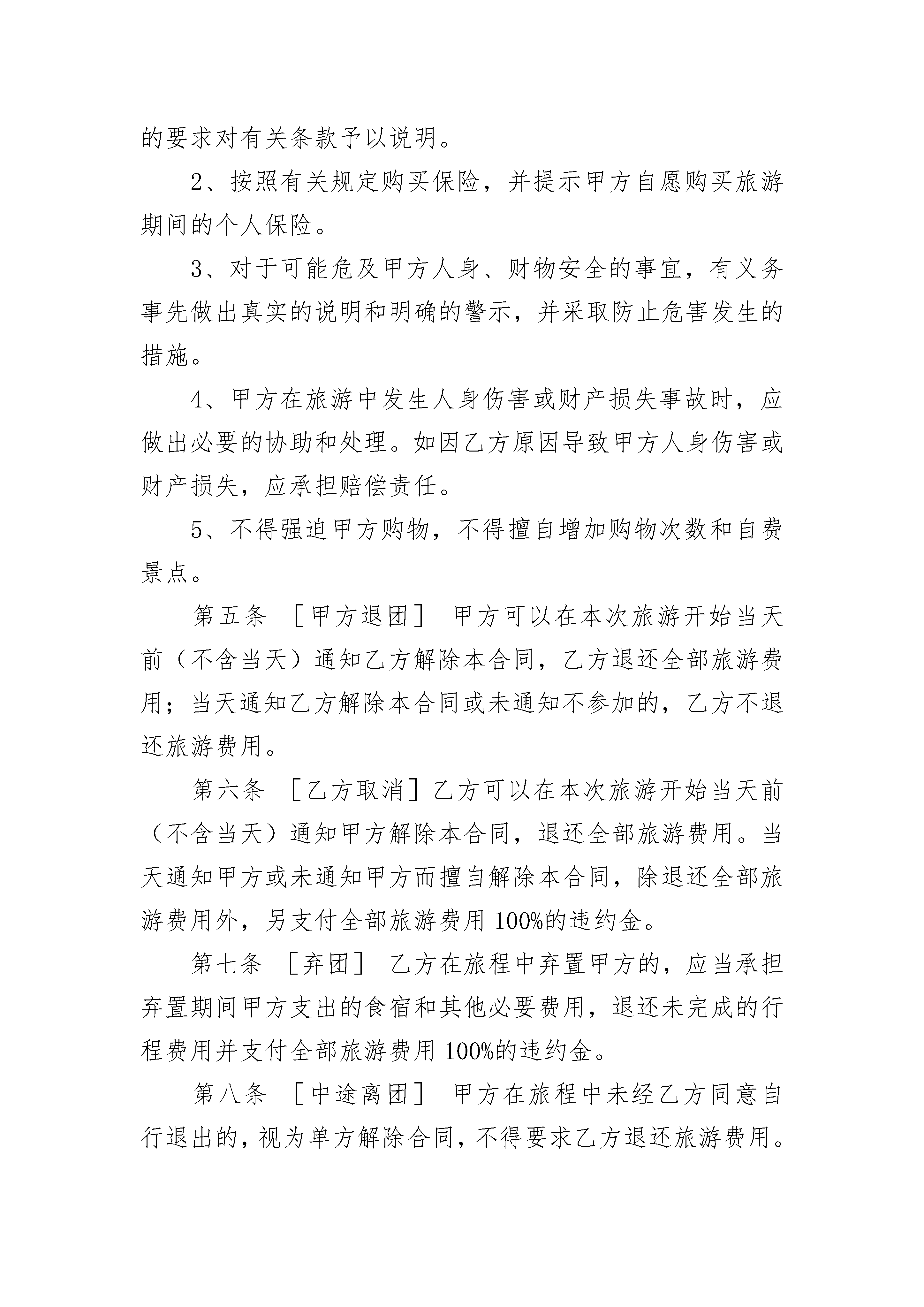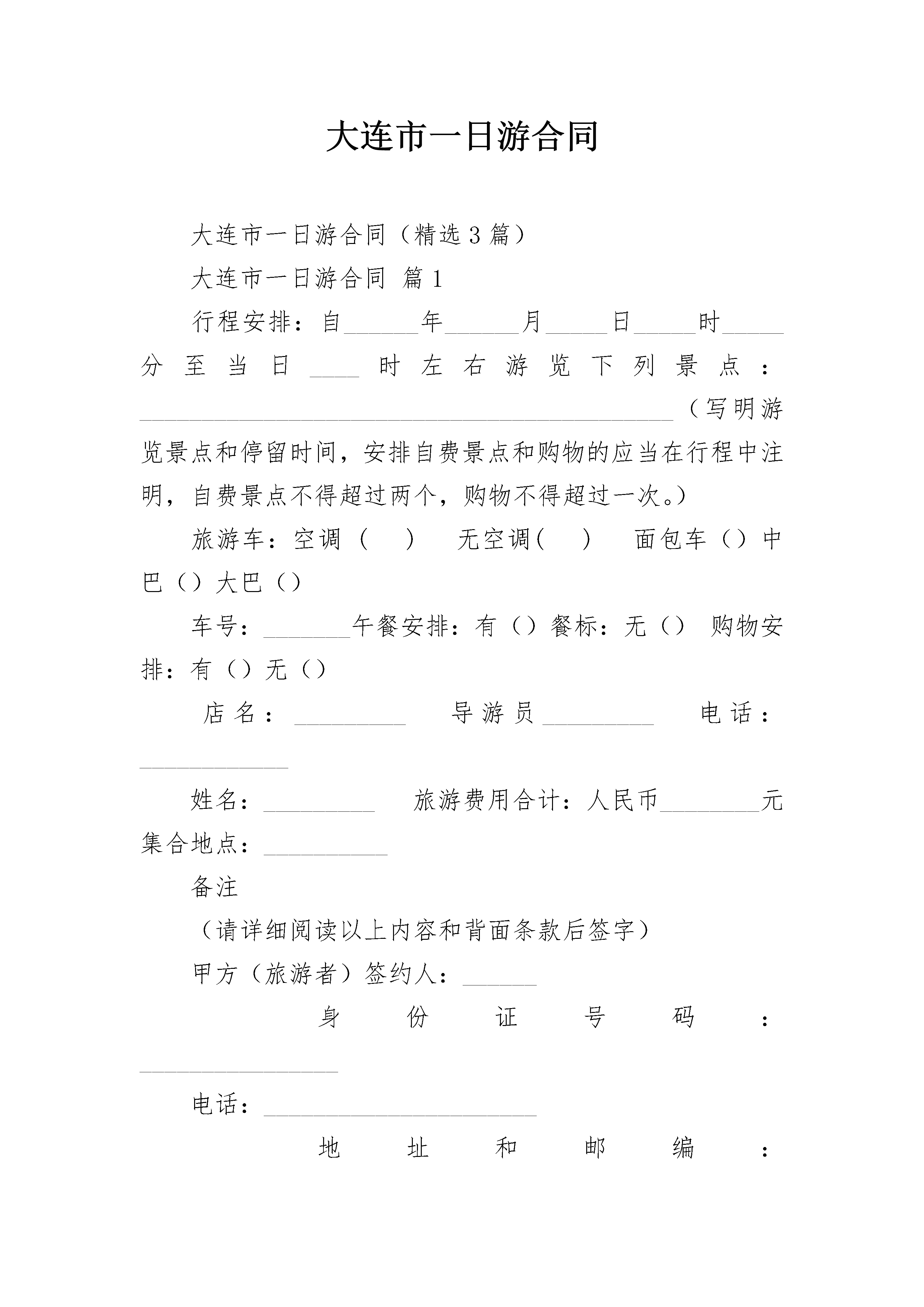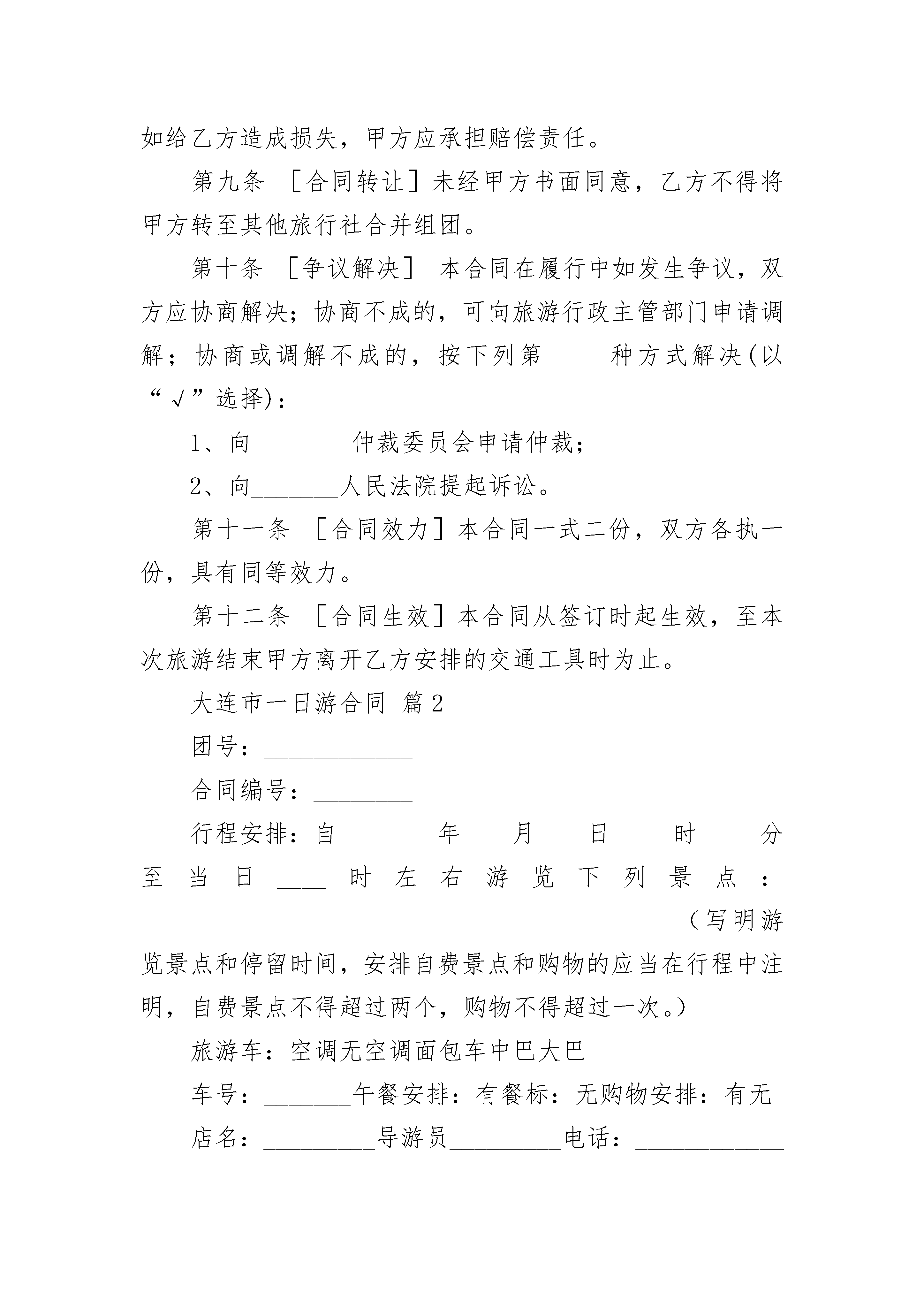 大连市一日游合同大连市一日游合同(精选3篇)大连市一日游合同篇1行程安排:自______年______月_____日_____时_____分至当日____时左右游览下列景点:___________________________________________(写明游览景点和停留时间,安排自费景点和购物的应当在行程中注明,自费景点不得超过两个,购物不得超过一次。)旅游车:空调()无空调()面包车()中巴()大巴()车号:_______午餐安排:有()餐标:无()购物安排:有()无()店名:_________导游员_________电话:____________姓名:_________旅游费用合计:人民币________元集合地点:__________备注(请详细阅读以上内容和背面条款后签字)甲方(旅游者)签约人:______身份证号码:________________电话:______________________地址和邮编:________________人数共计:________________人(旅游者为团体时,可推举代表为签约人,其他旅游者情况填入下列表格)甲方姓名身份证号码电话住址和邮编备注乙方(旅行社)(印章)签约人:_____电话:_____________________________地址:_____________________________签约日期:________年______月_____日合同条款第一条[旅游内容]本合同正面甲乙双方约定的旅游行程、服务标准、游览时间等内容是本合同的组成部分。第二条[旅游费用]甲方应于本合同签订时将本次旅游费用全部付清。第三条[甲方义务]甲方应当履行下列义务:1、确保自身身体条件适合参加本次旅游,并在签订本合同时将自身健康状况告知乙方。2、妥善保管随身携带的行李物品,未委托乙方代管而损坏或丢失的,责任自负。3、在旅游中遵守团队纪律,配合导游完成旅游行程。第四条[乙方义务]乙方应当履行下列义务:1、提醒甲方注意免除或限制其责任的条款,按照甲方的要求对有关条款予以说明。2、按照有关规定购买保险,并提示甲方自愿购买旅游期间的个人保险。3、对于可能危及甲方人身、财物安全的事宜,有义务事先做出真实的说明和明确的警示,并采取防止危害发生的措施。4、甲方在旅游中发生人身伤害或财产损失事故时,应做出必要的协助和处理。如因乙方原因导致甲方人身伤害或财产损失,应承担赔偿责任。5、不得强迫甲方购物,不得擅自增加购物次数和自费景点。第五条[甲方退团]甲方可以在本次旅游开始当天前(不含当天)通知乙方解除本合同,乙方退还全部旅游费用;当天通知乙方解除本合同或未通知不参加的,乙方不退还旅游费用。第六条[乙方取消]乙方可以在本次旅游开始当天前(不含当天)通知甲方解除本合同,退还全部旅游费用。当天通知甲方或未通知甲方而擅自解除本合同,除退还全部旅游费用外,另支付全部旅游费用100%的违约金。第七条[弃团]乙方在旅程中弃置甲方的,应当承担弃置期间甲方支出的食宿和其他必要费用,退还未完成的行程费用并支付全部旅游费用100%的违约金。第八条[中途离团]甲方在旅程中未经乙方同意自行退出的,视为单方解除合同,不得要求乙方退还旅游费用。如给乙方造成损失,甲方应承担赔偿责任。第九条[合同转让]未经甲方书面同意,乙方不得将甲方转至其他旅行社合并组团。第十条[争议解决]本合同在履行中如发生争议,双方应协商解决;协商不成的,可向旅游行政主管部门申请调解;协商或调解不成的,按下列第_____种方式解决(以“√”选择):1、向________仲裁委员会申请仲裁;2、向_______人民法院提起诉讼。第十一条[合同效力]本合同一式二份,双方各执一份,具有同等效力。第十二条[合同生效]本合同从签订时起生效,至本次旅游结束甲方离开乙方安排的交通工具时为止。大连市一日游合同篇2团号:____________合同编号:________行程安排:自________年____月____日_____时_____分至当日____时左右游览下列景点:___________________________________________(写明游览景点和停留时间,安排自费景点和购物的应当在行程中注明,自费景点不得超过两个,购物不得超过一次。)旅游车:空调无空调面包车中巴大巴车号:_______午餐安排:有餐标:无购物安排:有无店名:_________导游员_________电话:____________姓名:_________旅游费用合计:人民币________元集合地点:__________备注(请