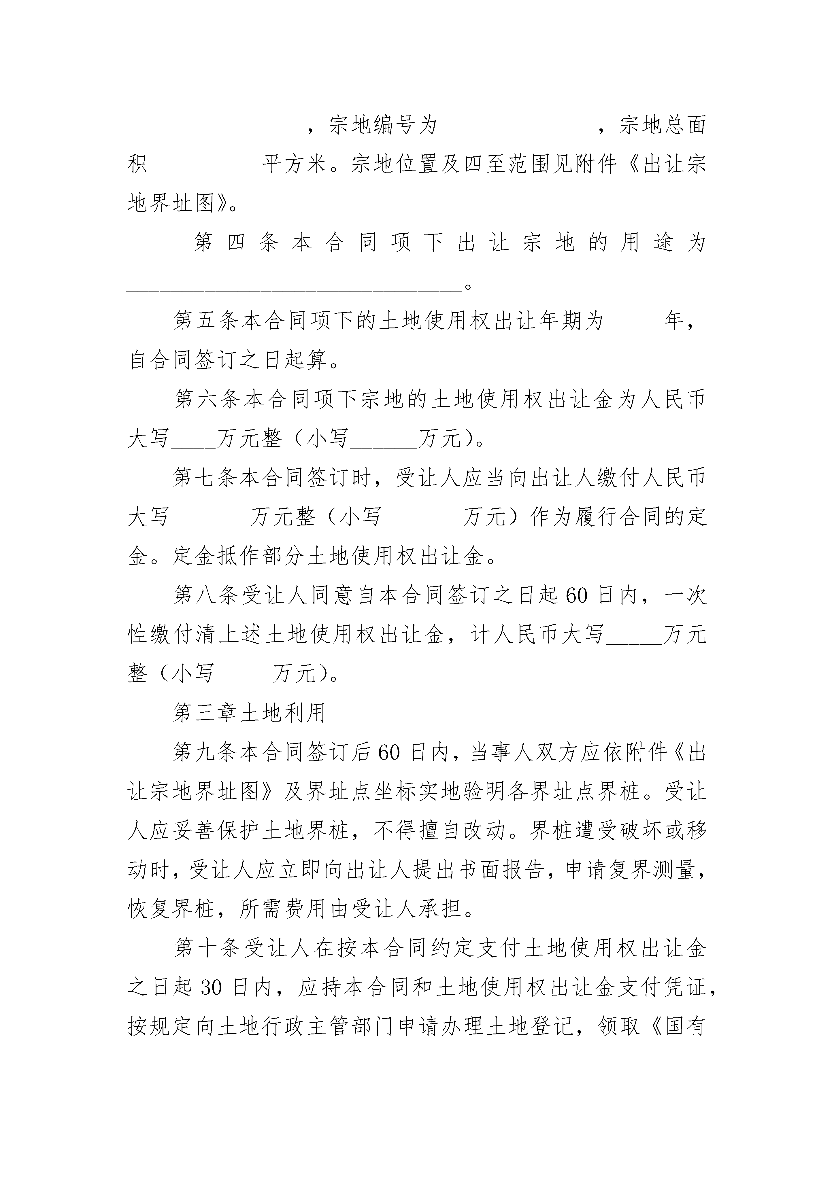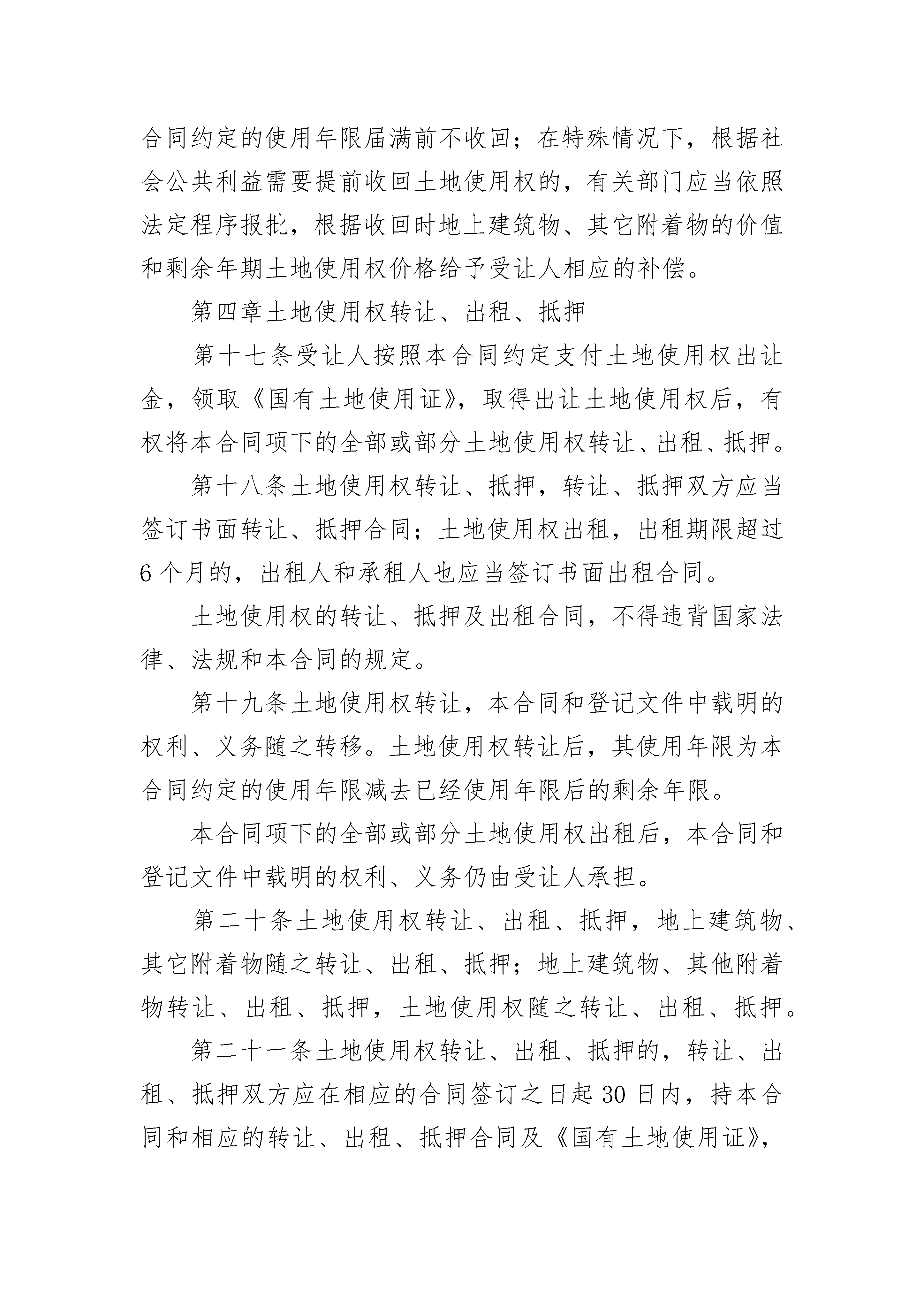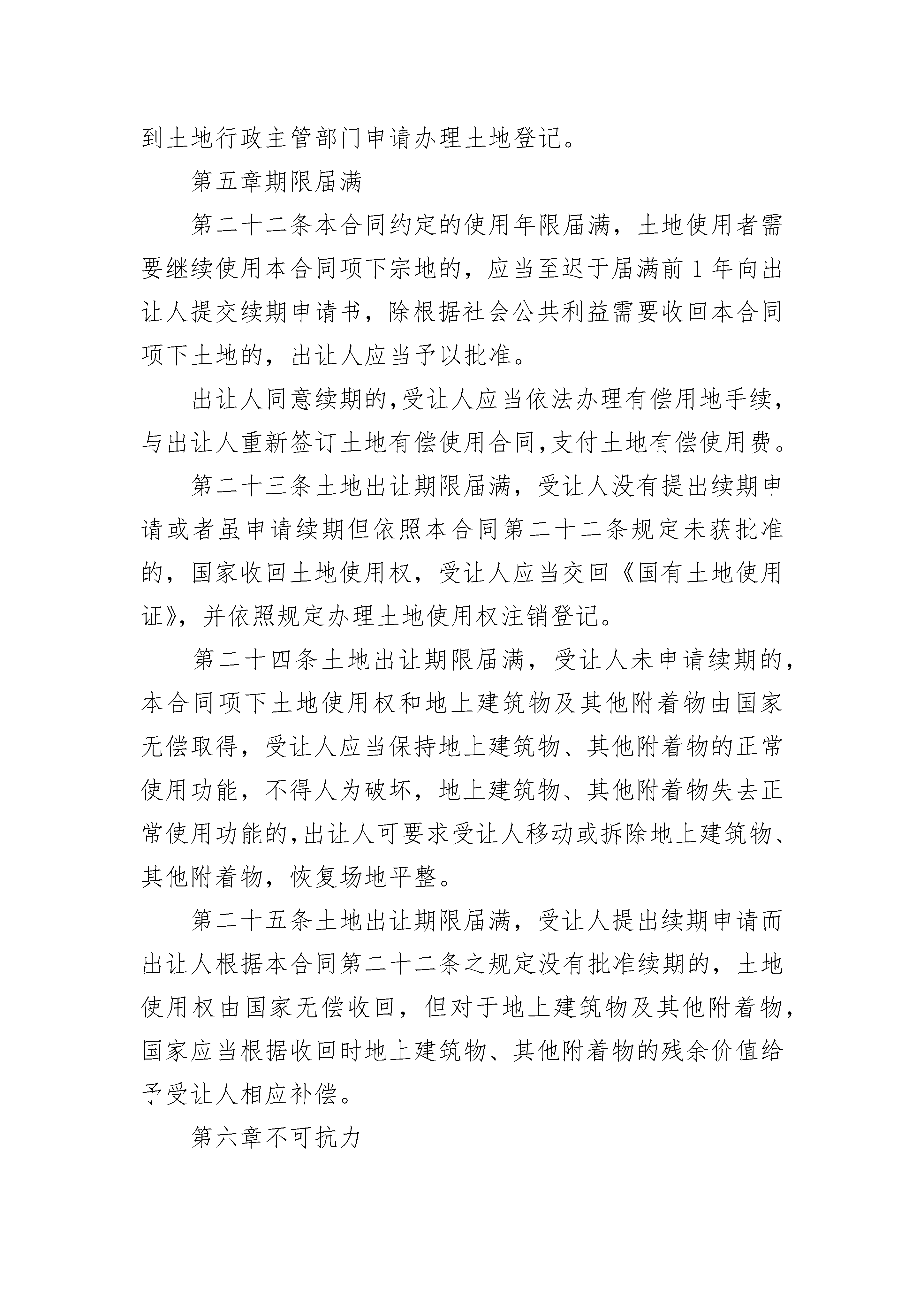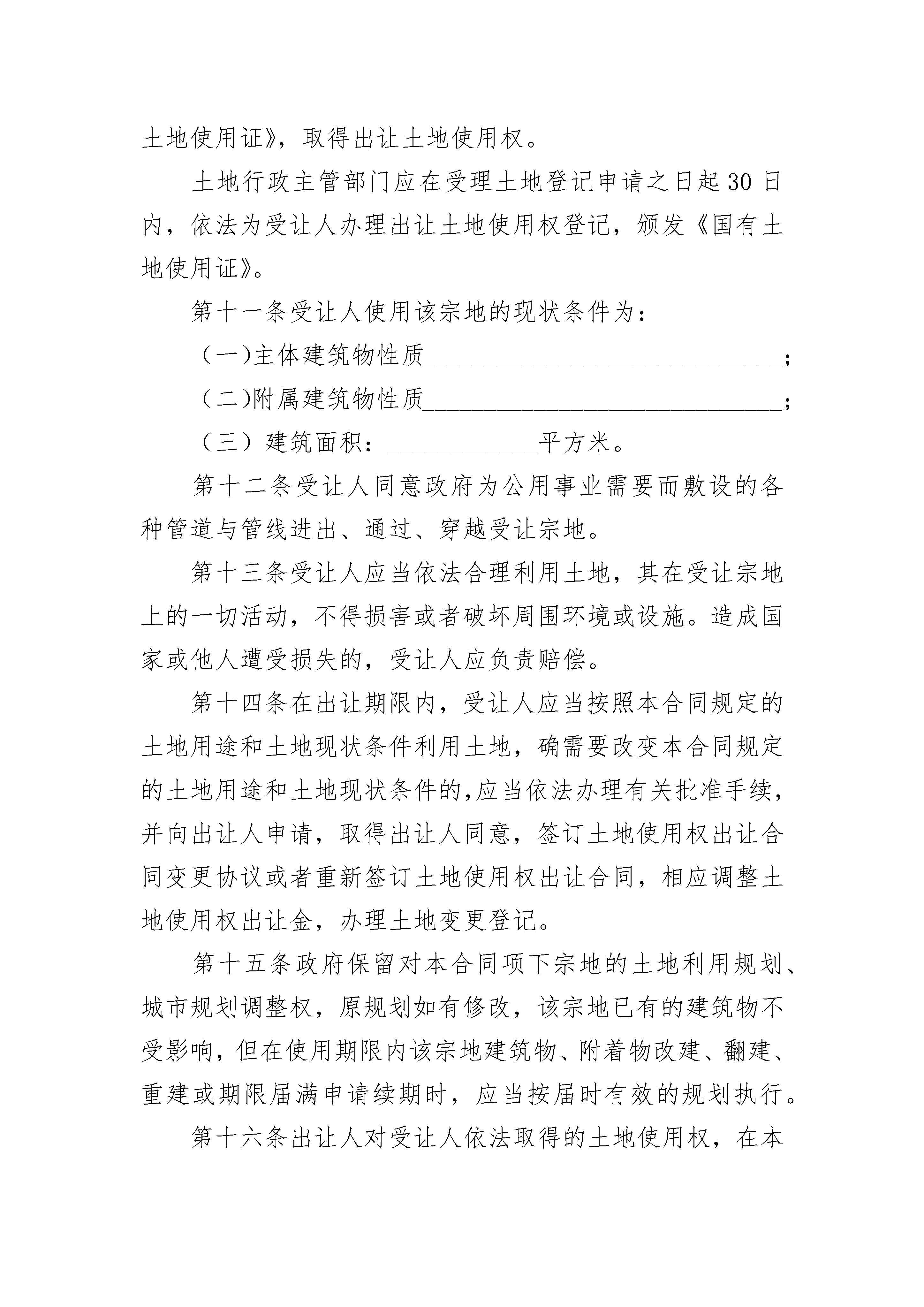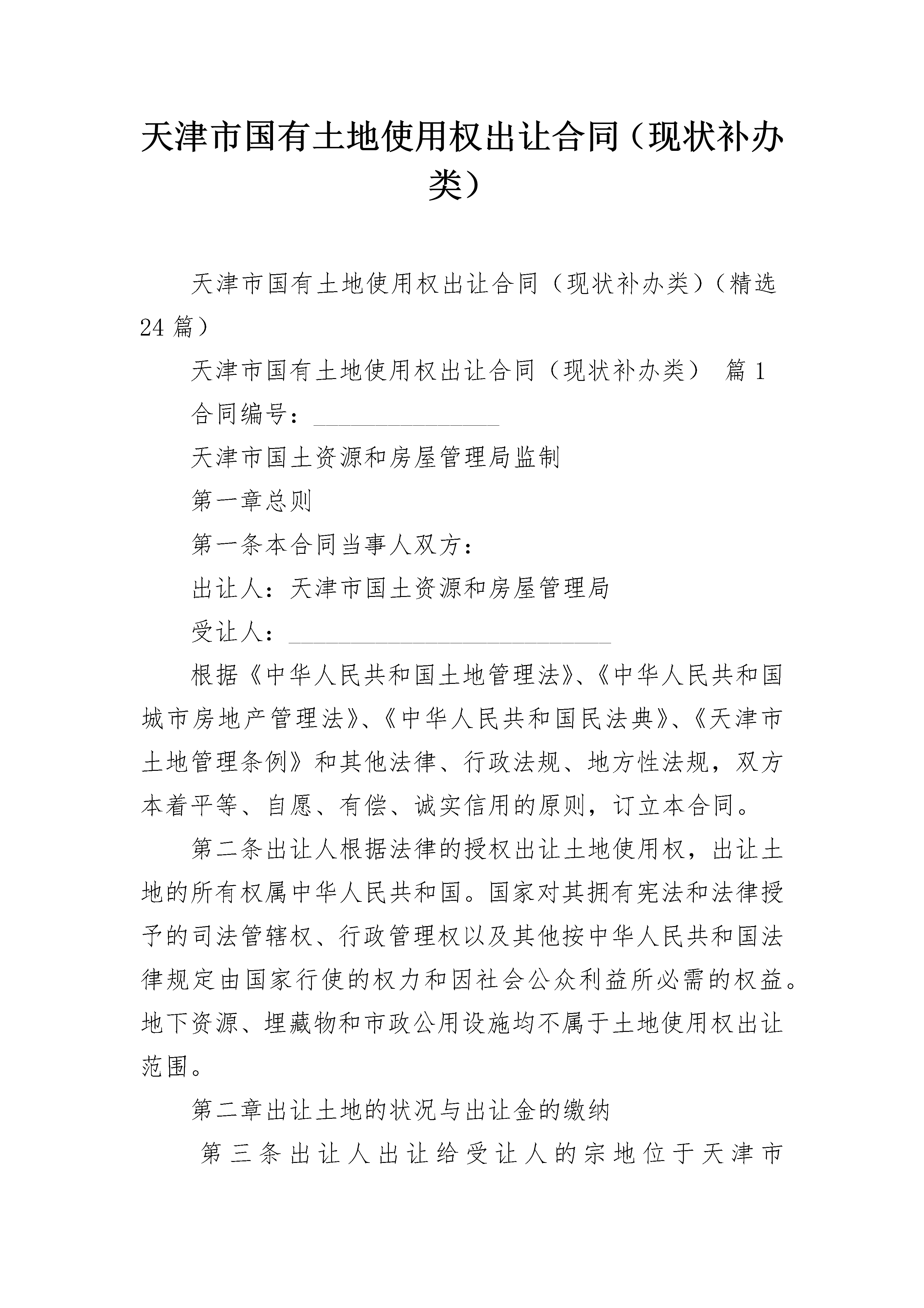 天津市国有土地使用权出让合同(现状补办类)天津市国有土地使用权出让合同(现状补办类)(精选24篇)天津市国有土地使用权出让合同(现状补办类)篇1合同编号:_______________天津市国土资源和房屋管理局监制第一章总则第一条本合同当事人双方:出让人:天津市国土资源和房屋管理局受让人:__________________________根据《中华人民共和国土地管理法》、《中华人民共和国城市房地产管理法》、《中华人民共和国民法典》、《天津市土地管理条例》和其他法律、行政法规、地方性法规,双方本着平等、自愿、有偿、诚实信用的原则,订立本合同。第二条出让人根据法律的授权出让土地使用权,出让土地的所有权属中华人民共和国。国家对其拥有宪法和法律授予的司法管辖权、行政管理权以及其他按中华人民共和国法律规定由国家行使的权力和因社会公众利益所必需的权益。地下资源、埋藏物和市政公用设施均不属于土地使用权出让范围。第二章出让土地的状况与出让金的缴纳第三条出让人出让给受让人的宗地位于天津市________________,宗地编号为______________,宗地总面积__________平方米。宗地位置及四至范围见附件《出让宗地界址图》。第四条本合同项下出让宗地的用途为______________________________。第五条本合同项下的土地使用权出让年期为_____年,自合同签订之日起算。第六条本合同项下宗地的土地使用权出让金为人民币大写____万元整(小写______万元)。第七条本合同签订时,受让人应当向出让人缴付人民币大写_______万元整(小写_______万元)作为履行合同的定金。定金抵作部分土地使用权出让金。第八条受让人同意自本合同签订之日起60日内,一次性缴付清上述土地使用权出让金,计人民币大写_____万元整(小写_____万元)。第三章土地利用第九条本合同签订后60日内,当事人双方应依附件《出让宗地界址图》及界址点坐标实地验明各界址点界桩。受让人应妥善保护土地界桩,不得擅自改动。界桩遭受破坏或移动时,受让人应立即向出让人提出书面报告,申请复界测量,恢复界桩,所需费用由受让人承担。第十条受让人在按本合同约定支付土地使用权出让金之日起30日内,应持本合同和土地使用权出让金支付凭证,按规定向土地行政主管部门申请办理土地登记,领取《国有土地使用证》,取得出让土地使用权。土地行政主管部门应在受理土地登记申请之日起30日内,依法为受让人办理出让土地使用权登记,颁发《国有土地使用证》。第十一条受让人使用该宗地的现状条件为:(一)主体建筑物性质_____________________________;(二)附属建筑物性质_____________________________;(三)建筑面积:____________平方米。第十二条受让人同意政府为公用事业需要而敷设的各种管道与管线进出、通过、穿越受让宗地。第十三条受让人应当依法合理利用土地,其在受让宗地上的一切活动,不得损害或者破坏周围环境或设施。造成国家或他人遭受损失的,受让人应负责赔偿。第十四条在出让期限内,受让人应当按照本合同规定的土地用途和土地现状条件利用土地,确需要改变本合同规定的土地用途和土地现状条件的,应当依法办理有关批准手续,并向出让人申请,取得出让人同意,签订土地使用权出让合同变更协议或者重新签订土地使用权出让合同,相应调整土地使用权出让金,办理土地变更登记。第十五条政府保留对本合同项下宗地的土地利用规划、城市规划调整权,原规划如有修改,该宗地已有的建筑物不受影响,但在使用期限内该宗地建筑物、附着物改建、翻建、重建或期限届满申请续期时,应当按届时有效的规划执行。第十六条出让人对受让人依法取得的土地使用权,在本合同约定的使用年限届满前不收回;在特殊情况下,根据社会公共利益需要提前收回土地使用权的,有关部门应当依照法定程序报批,根据收回时地上建筑物、其它附着物的价值和剩余年期土地使用权价格给予受让人相应的补偿。第四章土地使用权转让、出租、抵押第十七条受让人按照本合同约定支付土地使用权出让金,领取《国有土地使用证》,取得出让土地使用权后,有权将本合同项下的全部或部分土地使用权转让、出租、抵押。第十八条土地使用权转让、抵押,转让、抵押双方应当签订书面转让、抵押合同;土地使用权出租,出租期限超过6个月的,出租人和承租人也应当签订书面出租合同。土地使用权的转让、抵押及出租合同,不得违背国家法律、法规和本合同的规定。第十九条土地使用权转让,本合同和登记文件中载明的权利、义务随之转移。土地使用权转让后,其使用年限为本合同约定的使用年限减去已经使用年限后的剩余年限。本合同项下的全部或部分土地使用权出租后,本合同和登记文件中载明的权利、义务仍由受让人承担。第二十条土地