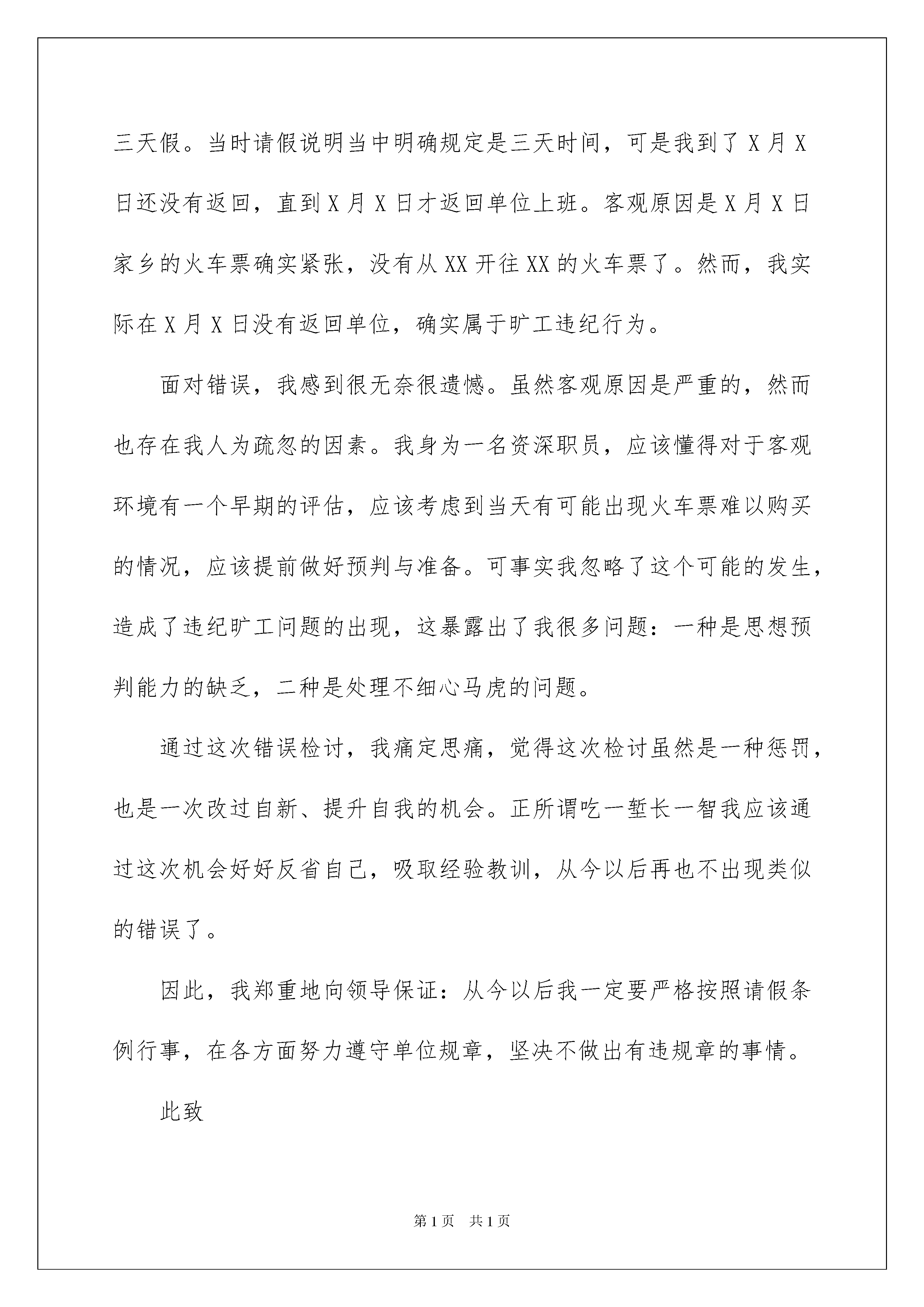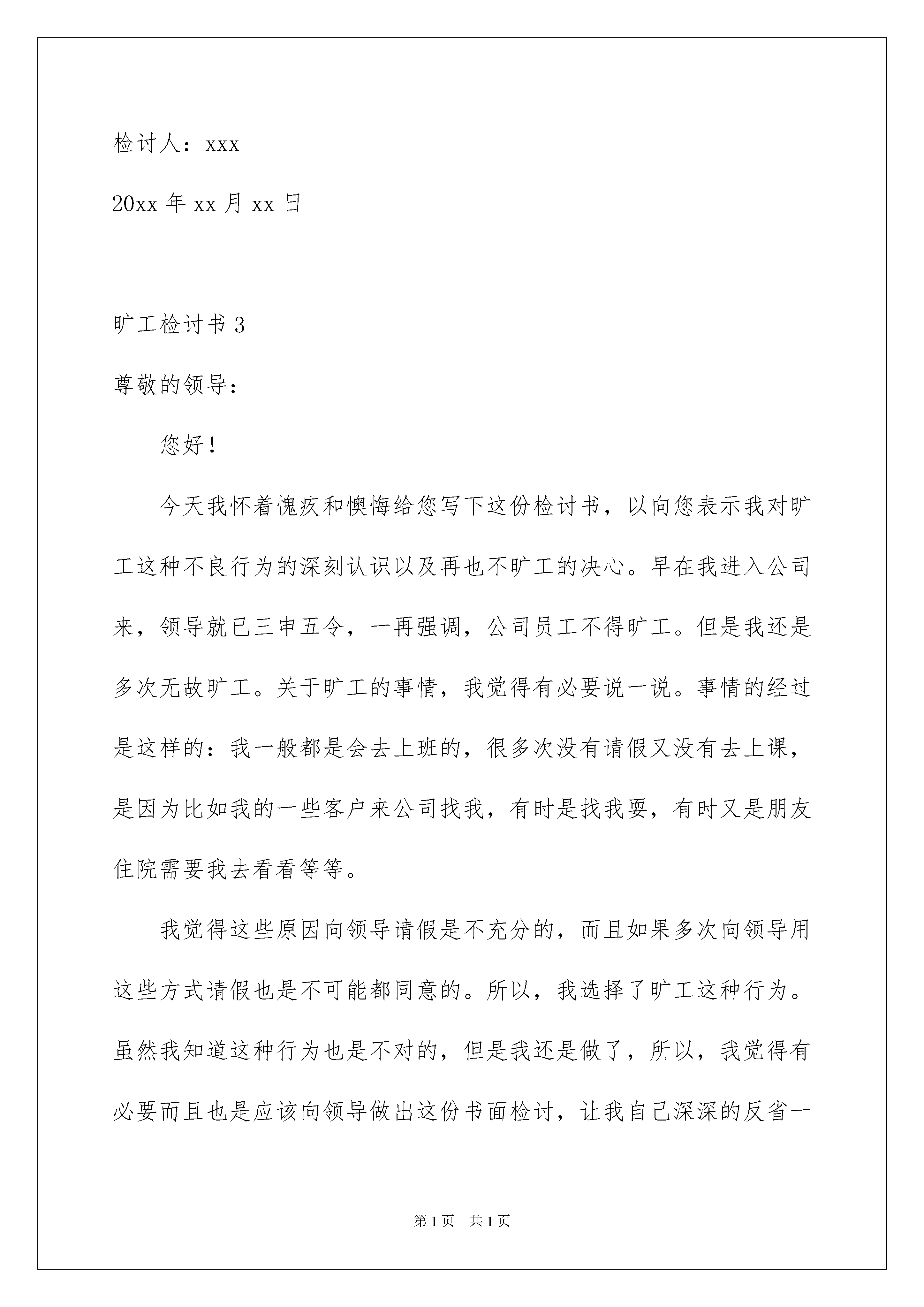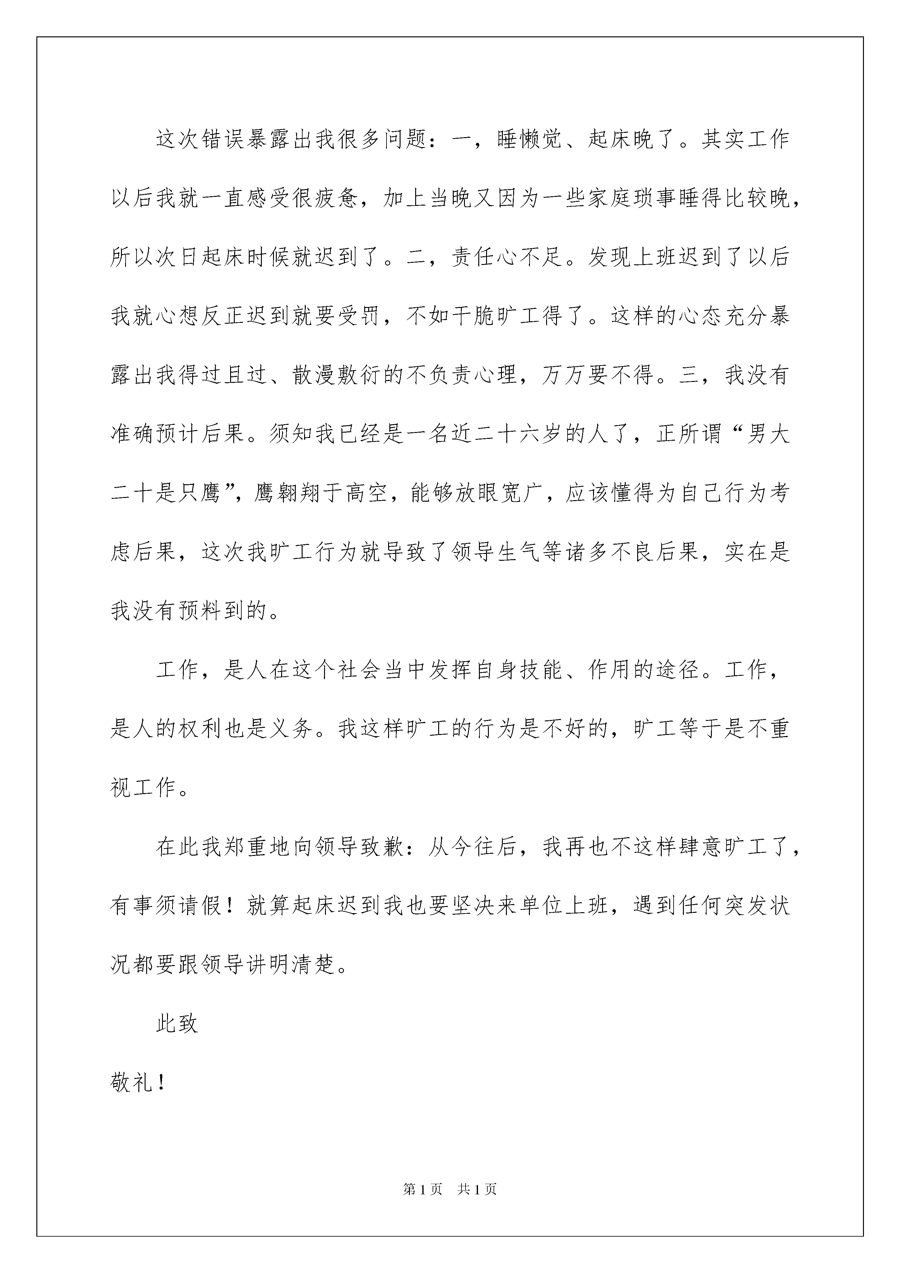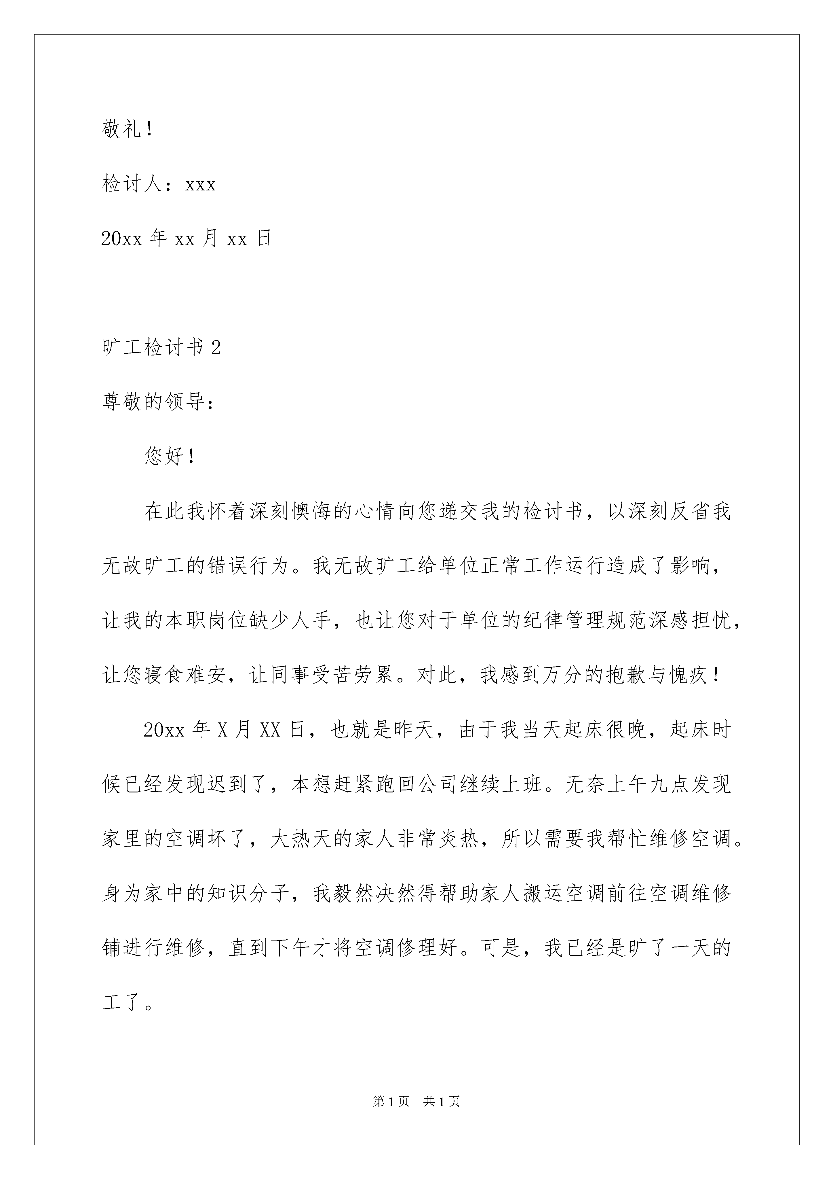 2022旷工检讨书14篇旷工检讨书14篇我们在犯错后,避免再次犯错,往往被要求写检讨书来自我检讨,在写检讨书的时候,我们的用语要非常注意。写检讨书需要注意哪些问题呢?下面是我为大家收集的旷工检讨书,欢迎阅读与收藏。旷工检讨书1尊敬的领导:您好!此次我原本按照请假规定要求,仅仅请假三天返家休息,可是实际上用了四天时间,属于违反规定旷工了一天时间。此时此刻,我深深知道自己的行为是违反了单位规章制度,属于旷工行为。无论我以什么理由狡辩,我的违纪行为是实实在在的发生了,因此我不可以再以什么借口为自己开脱。在此我要认真向您坦白情况:20xx年X月X日我由于闻讯家里亲戚病故的消息,就向领导反映这个事情,得到领导理解并且许可放我三天假。当时请假说明当中明确规定是三天时间,可是我到了X月X日还没有返回,直到X月X日才返回单位上班。客观原因是X月X日家乡的火车票确实紧张,没有从XX开往XX的火车票了。然而,我实际在X月X日没有返回单位,确实属于旷工违纪行为。面对错误,我感到很无奈很遗憾。虽然客观原因是严重的,然而也存在我人为疏忽的因素。我身为一名资深职员,应该懂得对于客观环境有一个早期的评估,应该考虑到当天有可能出现火车票难以购买的情况,应该提前做好预判与准备。可事实我忽略了这个可能的发生,造成了违纪旷工问题的出现,这暴露出了我很多问题:一种是思想预判能力的缺乏,二种是处理不细心马虎的问题。通过这次错误检讨,我痛定思痛,觉得这次检讨虽然是一种惩罚,也是一次改过自新、提升自我的机会。正所谓吃一堑长一智我应该通过这次机会好好反省自己,吸取经验教训,从今以后再也不出现类似的错误了。因此,我郑重地向领导保证:从今以后我一定要严格按照请假条例行事,在各方面努力遵守单位规章,坚决不做出有违规章的事情。此致敬礼!检讨人:xxx20xx年xx月xx日旷工检讨书2尊敬的领导:您好!在此我怀着深刻懊悔的心情向您递交我的检讨书,以深刻反省我无故旷工的错误行为。我无故旷工给单位正常工作运行造成了影响,让我的本职岗位缺少人手,也让您对于单位的纪律管理规范深感担忧,让您寝食难安,让同事受苦劳累。对此,我感到万分的抱歉与愧疚!20xx年X月XX日,也就是昨天,由于我当天起床很晚,起床时候已经发现迟到了,本想赶紧跑回公司继续上班。无奈上午九点发现家里的空调坏了,大热天的家人非常炎热,所以需要我帮忙维修空调。身为家中的知识分子,我毅然决然得帮助家人搬运空调前往空调维修铺进行维修,直到下午才将空调修理好。可是,我已经是旷了一天的工了。这次错误暴露出我很多问题:一,睡懒觉、起床晚了。其实工作以后我就一直感受很疲惫,加上当晚又因为一些家庭琐事睡得比较晚,所以次日起床时候就迟到了。二,责任心不足。发现上班迟到了以后我就心想反正迟到就要受罚,不如干脆旷工得了。这样的心态充分暴露出我得过且过、散漫敷衍的不负责心理,万万要不得。三,我没有准确预计后果。须知我已经是一名近二十六岁的人了,正所谓“男大二十是只鹰”,鹰翱翔于高空,能够放眼宽广,应该懂得为自己行为考虑后果,这次我旷工行为就导致了领导生气等诸多不良后果,实在是我没有预料到的。工作,是人在这个社会当中发挥自身技能、作用的途径。工作,是人的权利也是义务。我这样旷工的行为是不好的,旷工等于是不重视工作。在此我郑重地向领导致歉:从今往后,我再也不这样肆意旷工了,有事须请假!就算起床迟到我也要坚决来单位上班,遇到任何突发状况都要跟领导讲明清楚。此致敬礼!检讨人:xxx20xx年xx月xx日旷工检讨书3尊敬的领导:您好!今天我怀着愧疚和懊悔给您写下这份检讨书,以向您表示我对旷工这种不良行为的深刻认识以及再也不旷工的决心。早在我进入公司来,领导就已三申五令,一再强调,公司员工不得旷工。但是我还是多次无故旷工。关于旷工的事情,我觉得有必要说一说。事情的经过是这样的:我一般都是会去上班的,很多次没有请假又没有去上课,是因为比如我的一些客户来公司找我,有时是找我耍,有时又是朋友住院需要我去看看等等。我觉得这些原因向领导请假是不充分的,而且如果多次向领导用这些方式请假也是不可能都同意的。所以,我选择了旷工这种行为。虽然我知道这种行为也是不对的,但是我还是做了,所以,我觉得有必要而且也是应该向领导做出这份书面检讨,让我自己深深的反省一下自己的错误。对不起,领导!我犯的是一个严重的原则性的问题。我知道,领导对于我的无故旷工也非常的生气。我也知道,对于员工,保证每天按时上班,不早退,不旷工是一项最基本的责任,也是最基本的义务。但是我却连最基本的都没有做到。事后,我冷静的想了很久,我渐渐的认识到自己将要为自己