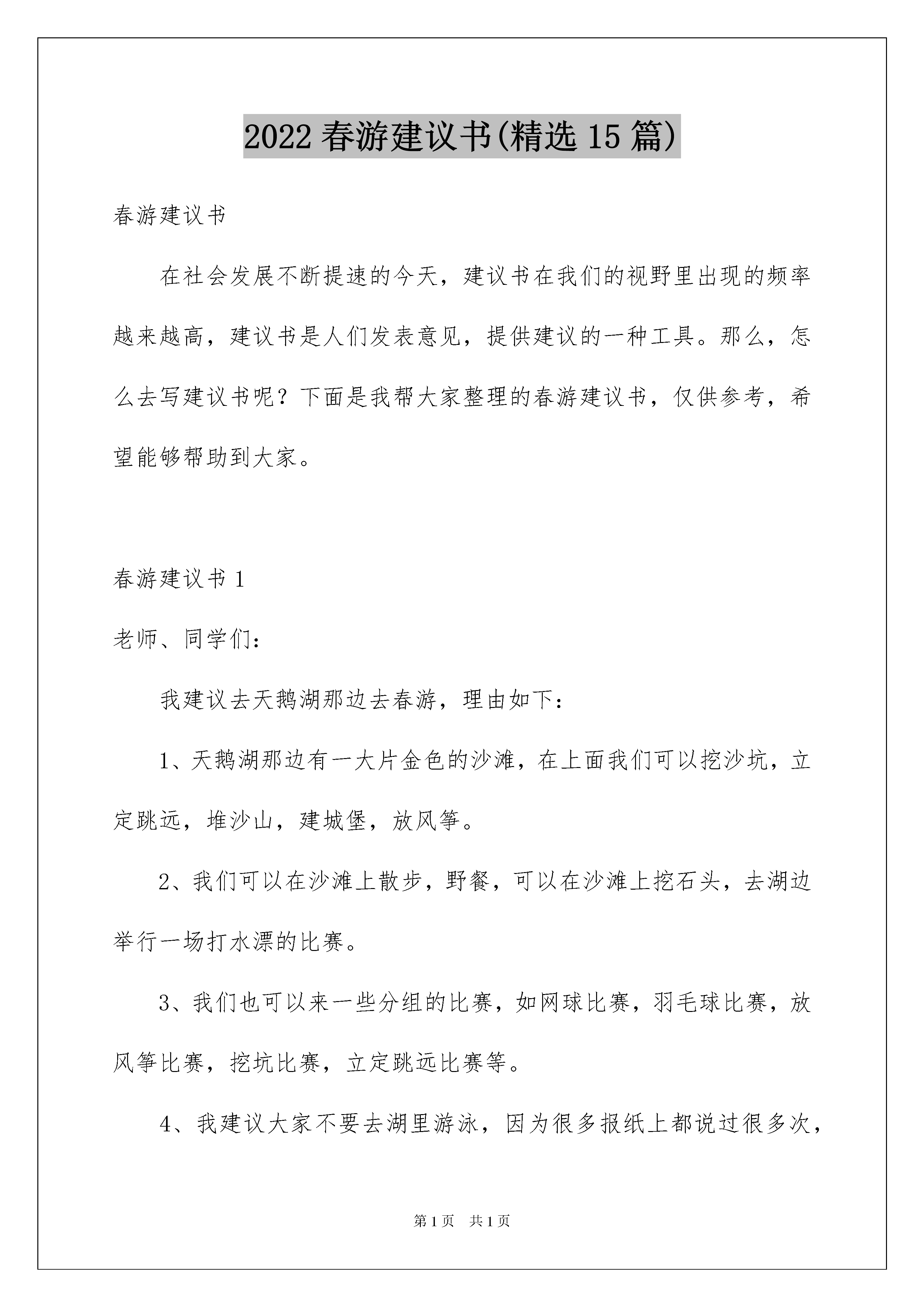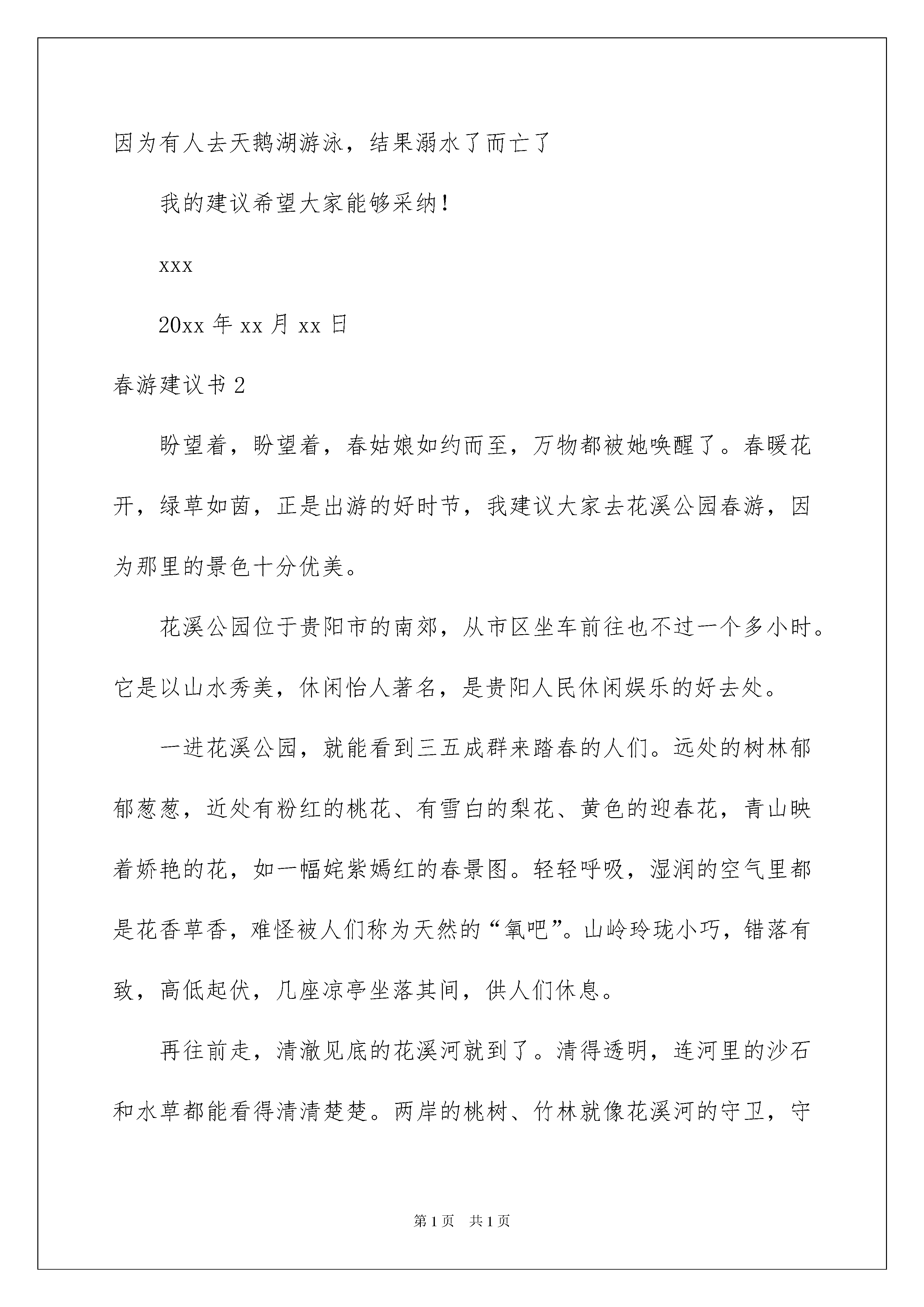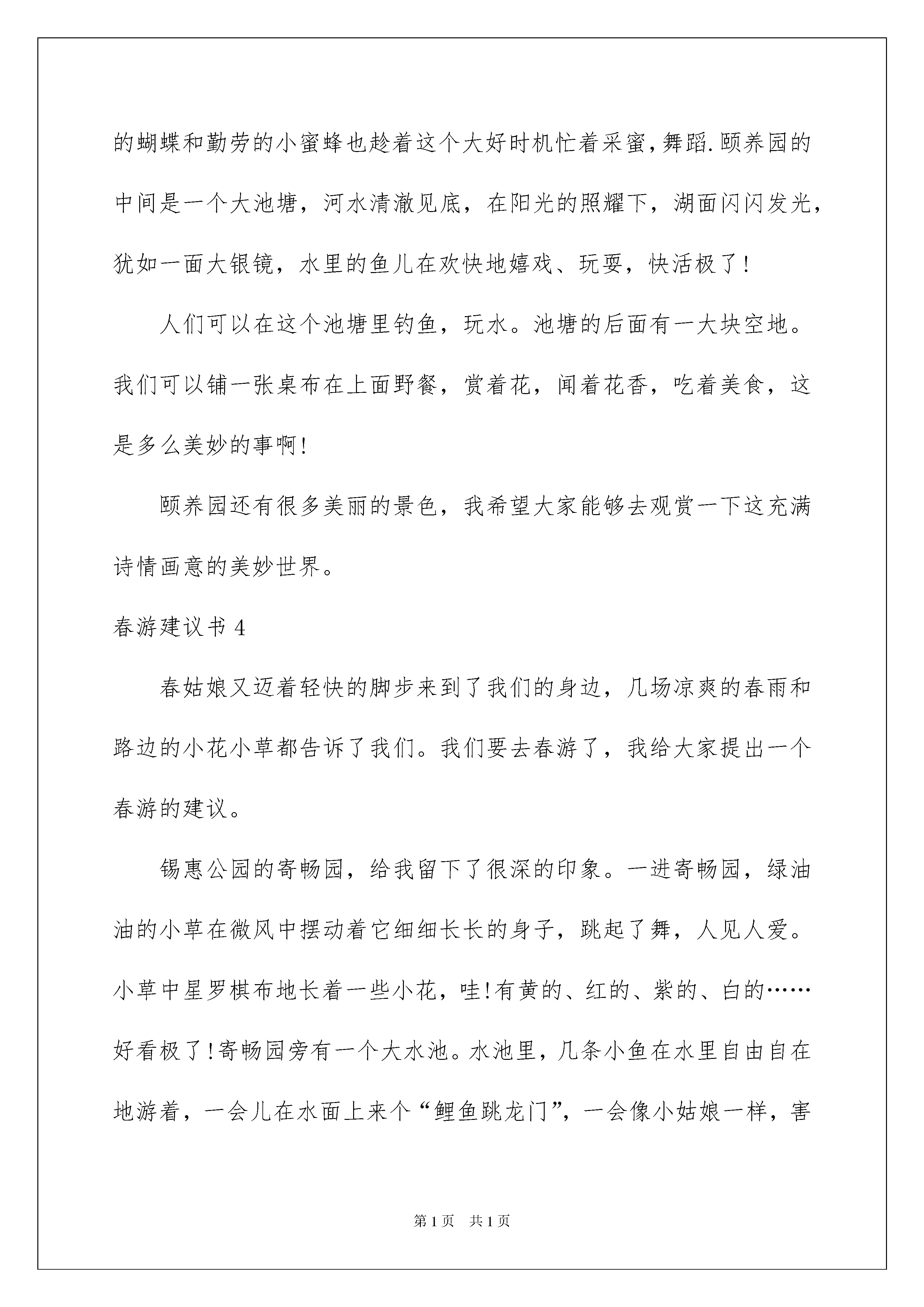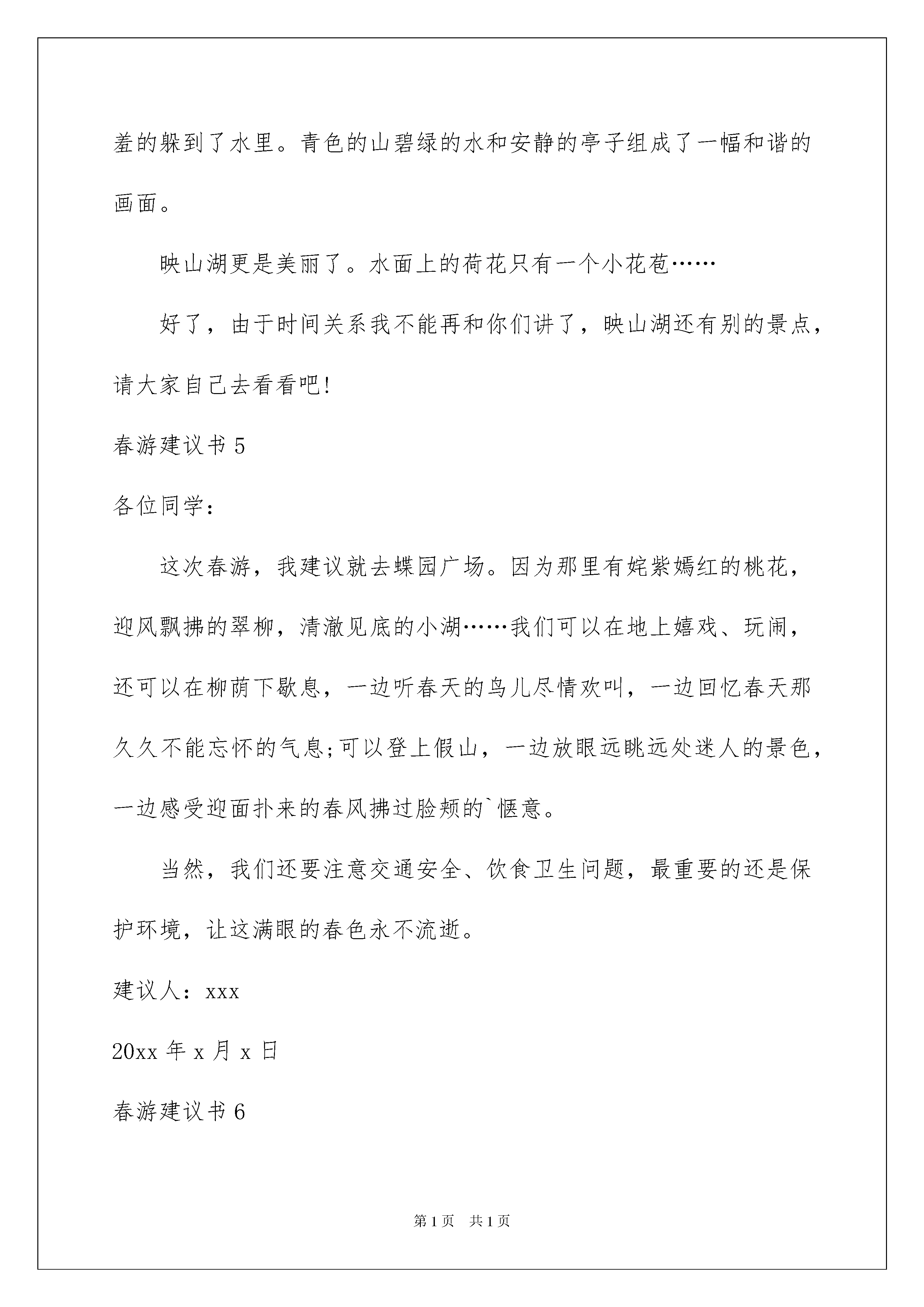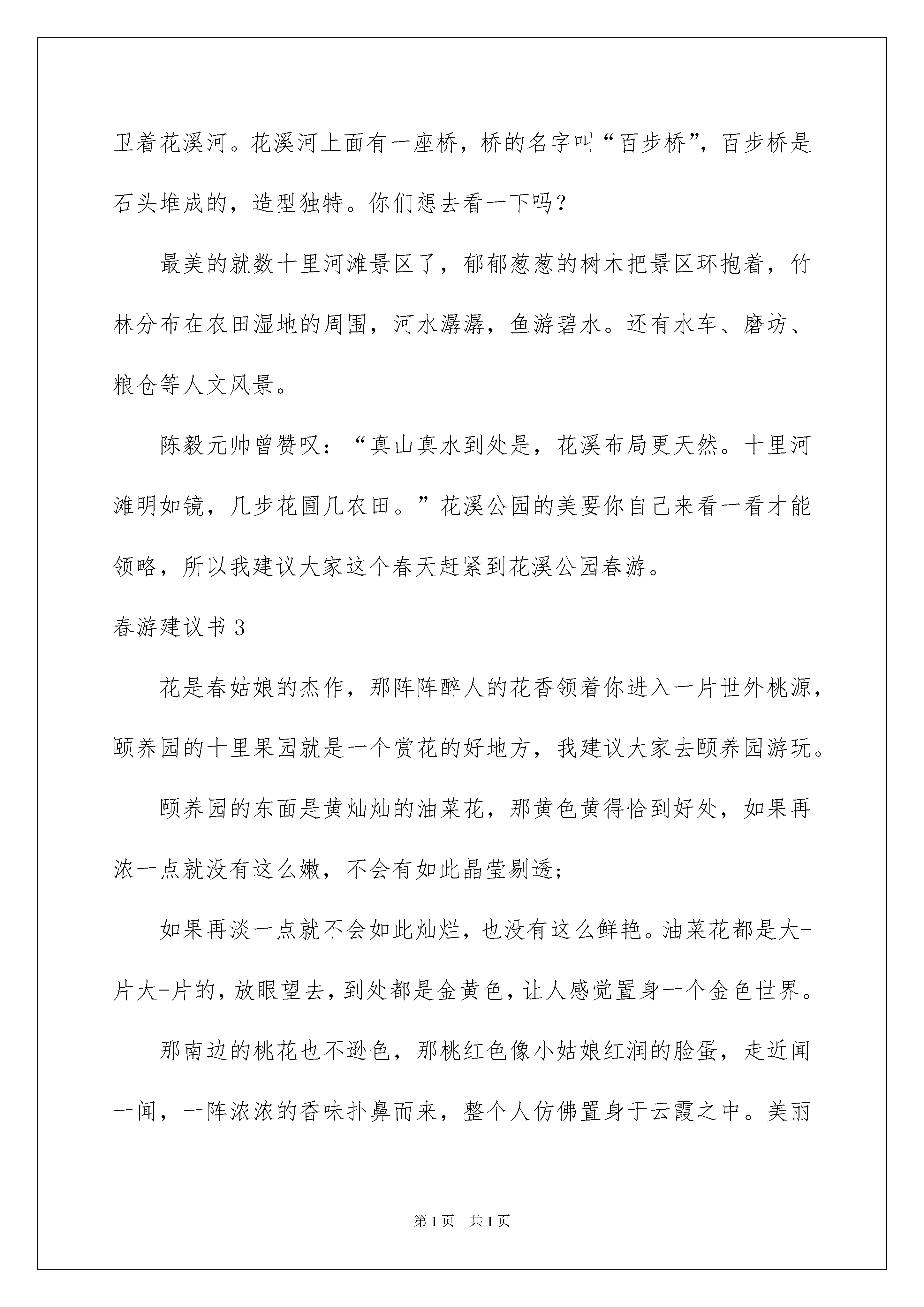 2022春游建议书(精选15篇)春游建议书在社会发展不断提速的今天,建议书在我们的视野里出现的频率越来越高,建议书是人们发表意见,提供建议的一种工具。那么,怎么去写建议书呢?下面是我帮大家整理的春游建议书,仅供参考,希望能够帮助到大家。春游建议书1老师、同学们:我建议去天鹅湖那边去春游,理由如下:1、天鹅湖那边有一大片金色的沙滩,在上面我们可以挖沙坑,立定跳远,堆沙山,建城堡,放风筝。2、我们可以在沙滩上散步,野餐,可以在沙滩上挖石头,去湖边举行一场打水漂的比赛。3、我们也可以来一些分组的比赛,如网球比赛,羽毛球比赛,放风筝比赛,挖坑比赛,立定跳远比赛等。4、我建议大家不要去湖里游泳,因为很多报纸上都说过很多次,因为有人去天鹅湖游泳,结果溺水了而亡了我的建议希望大家能够采纳!xxx20xx年xx月xx日春游建议书2盼望着,盼望着,春姑娘如约而至,万物都被她唤醒了。春暖花开,绿草如茵,正是出游的好时节,我建议大家去花溪公园春游,因为那里的景色十分优美。花溪公园位于贵阳市的南郊,从市区坐车前往也不过一个多小时。它是以山水秀美,休闲怡人著名,是贵阳人民休闲娱乐的好去处。一进花溪公园,就能看到三五成群来踏春的人们。远处的树林郁郁葱葱,近处有粉红的桃花、有雪白的梨花、黄色的迎春花,青山映着娇艳的花,如一幅姹紫嫣红的春景图。轻轻呼吸,湿润的空气里都是花香草香,难怪被人们称为天然的“氧吧”。山岭玲珑小巧,错落有致,高低起伏,几座凉亭坐落其间,供人们休息。再往前走,清澈见底的花溪河就到了。清得透明,连河里的沙石和水草都能看得清清楚楚。两岸的桃树、竹林就像花溪河的守卫,守卫着花溪河。花溪河上面有一座桥,桥的名字叫“百步桥”,百步桥是石头堆成的,造型独特。你们想去看一下吗?最美的就数十里河滩景区了,郁郁葱葱的树木把景区环抱着,竹林分布在农田湿地的周围,河水潺潺,鱼游碧水。还有水车、磨坊、粮仓等人文风景。陈毅元帅曾赞叹:“真山真水到处是,花溪布局更天然。十里河滩明如镜,几步花圃几农田。”花溪公园的美要你自己来看一看才能领略,所以我建议大家这个春天赶紧到花溪公园春游。春游建议书3花是春姑娘的杰作,那阵阵醉人的花香领着你进入一片世外桃源,颐养园的十里果园就是一个赏花的好地方,我建议大家去颐养园游玩。颐养园的东面是黄灿灿的油菜花,那黄色黄得恰到好处,如果再浓一点就没有这么嫩,不会有如此晶莹剔透;如果再淡一点就不会如此灿烂,也没有这么鲜艳。油菜花都是大-片大-片的,放眼望去,到处都是金黄色,让人感觉置身一个金色世界。那南边的桃花也不逊色,那桃红色像小姑娘红润的脸蛋,走近闻一闻,一阵浓浓的香味扑鼻而来,整个人仿佛置身于云霞之中。美丽的蝴蝶和勤劳的小蜜蜂也趁着这个大好时机忙着采蜜,舞蹈.颐养园的中间是一个大池塘,河水清澈见底,在阳光的照耀下,湖面闪闪发光,犹如一面大银镜,水里的鱼儿在欢快地嬉戏、玩耍,快活极了!人们可以在这个池塘里钓鱼,玩水。池塘的后面有一大块空地。我们可以铺一张桌布在上面野餐,赏着花,闻着花香,吃着美食,这是多么美妙的事啊!颐养园还有很多美丽的景色,我希望大家能够去观赏一下这充满诗情画意的美妙世界。春游建议书4春姑娘又迈着轻快的脚步来到了我们的身边,几场凉爽的春雨和路边的小花小草都告诉了我们。我们要去春游了,我给大家提出一个春游的建议。锡惠公园的寄畅园,给我留下了很深的印象。一进寄畅园,绿油油的小草在微风中摆动着它细细长长的身子,跳起了舞,人见人爱。小草中星罗棋布地长着一些小花,哇!有黄的、红的、紫的、白的……好看极了!寄畅园旁有一个大水池。水池里,几条小鱼在水里自由自在地游着,一会儿在水面上来个“鲤鱼跳龙门”,一会像小姑娘一样,害羞的躲到了水里。青色的山碧绿的水和安静的亭子组成了一幅和谐的画面。映山湖更是美丽了。水面上的荷花只有一个小花苞……好了,由于时间关系我不能再和你们讲了,映山湖还有别的景点,请大家自己去看看吧!春游建议书5各位同学:这次春游,我建议就去蝶园广场。因为那里有姹紫嫣红的桃花,迎风飘拂的翠柳,清澈见底的小湖……我们可以在地上嬉戏、玩闹,还可以在柳荫下歇息,一边听春天的鸟儿尽情欢叫,一边回忆春天那久久不能忘怀的气息;可以登上假山,一边放眼远眺远处迷人的景色,一边感受迎面扑来的春风拂过脸颊的`惬意。当然,我们还要注意交通安全、饮食卫生问题,最重要的还是保护环境,让这满眼的春色永不流逝。建议人:xxx20xx年x月x日春游建议书6春天到了,小草脱掉了黄帽子,穿上了绿色大衣。奶奶家小河旁的柳树抽出了新的枝条,枝条上还长出了绿黄色的小芽呢!远远望去,就像柳树上长出了无数个小眼睛