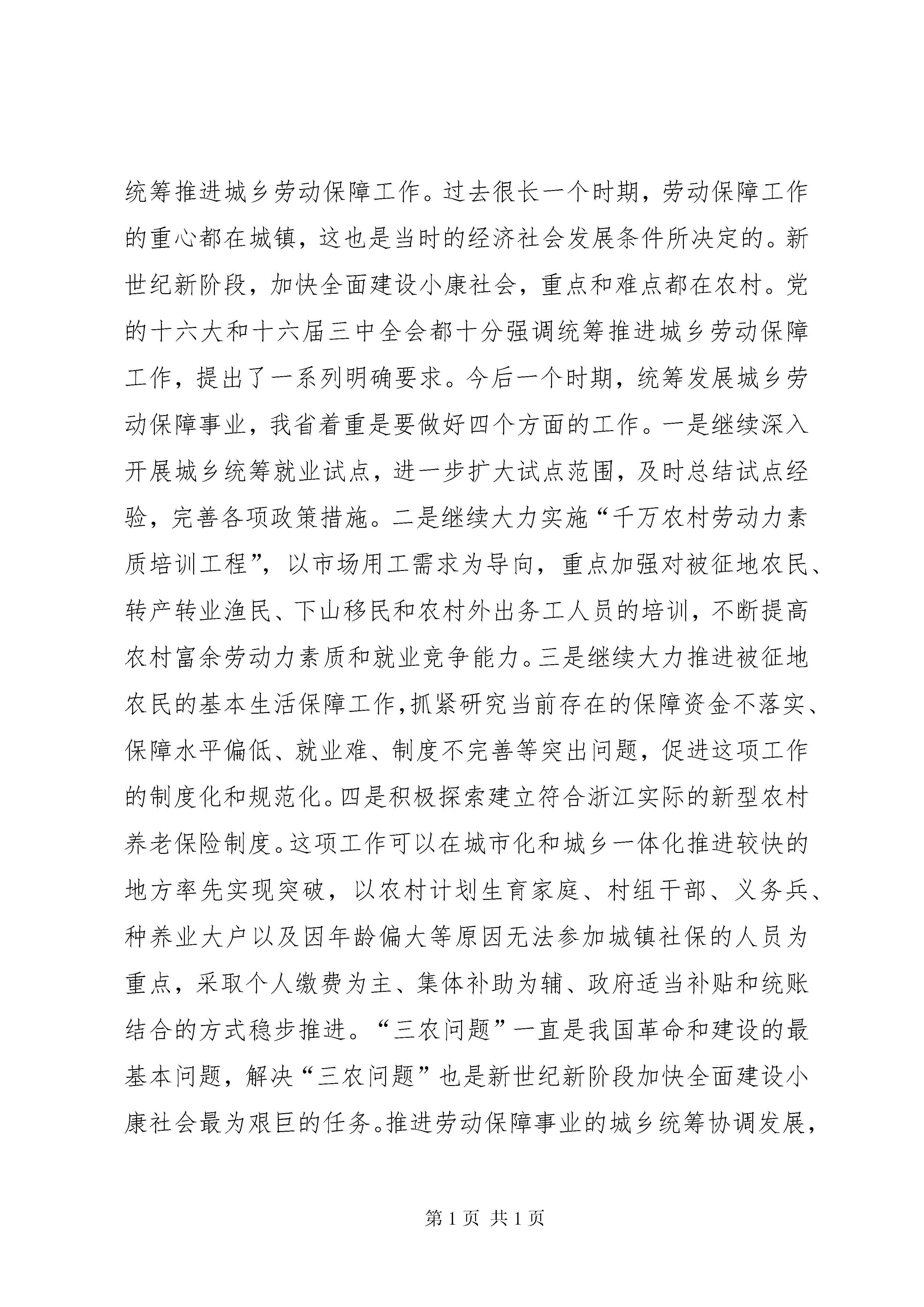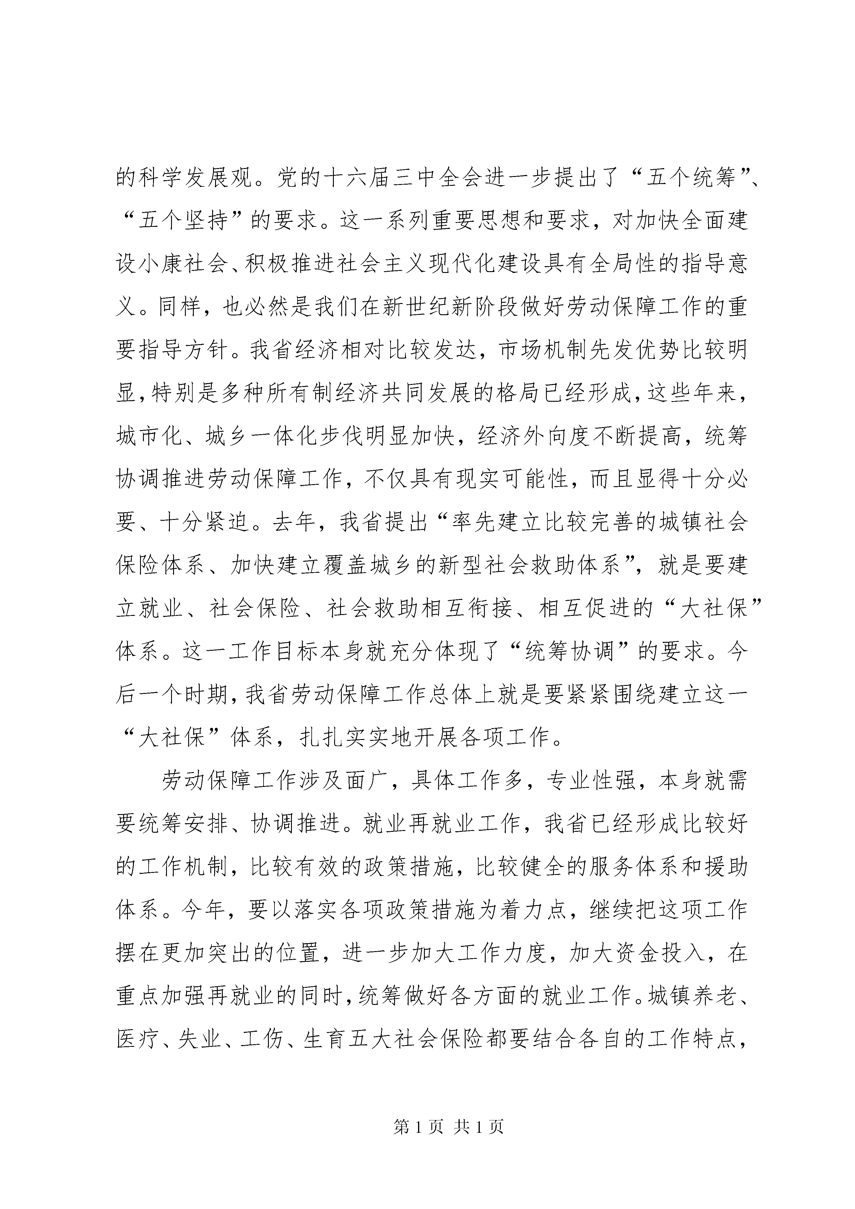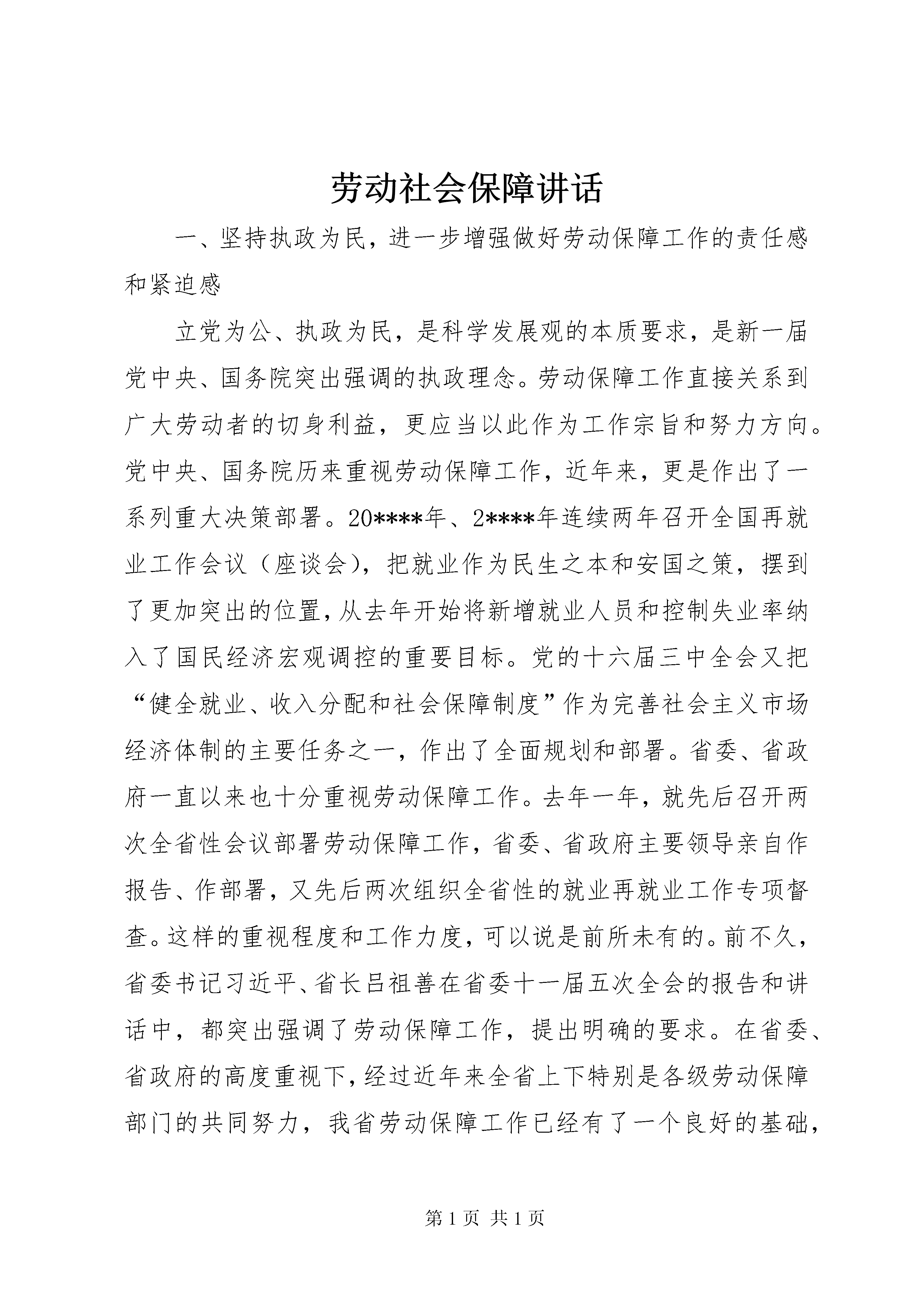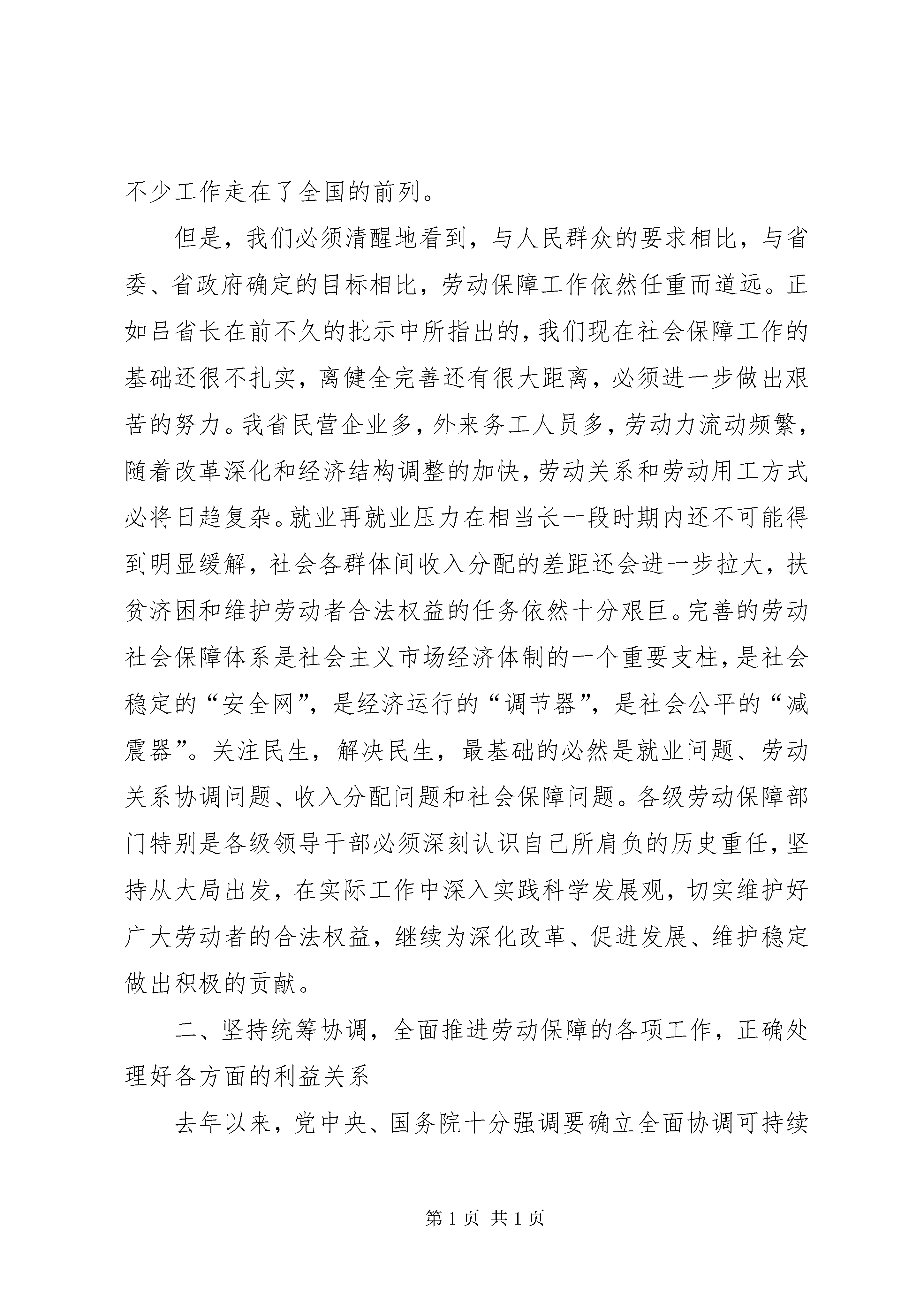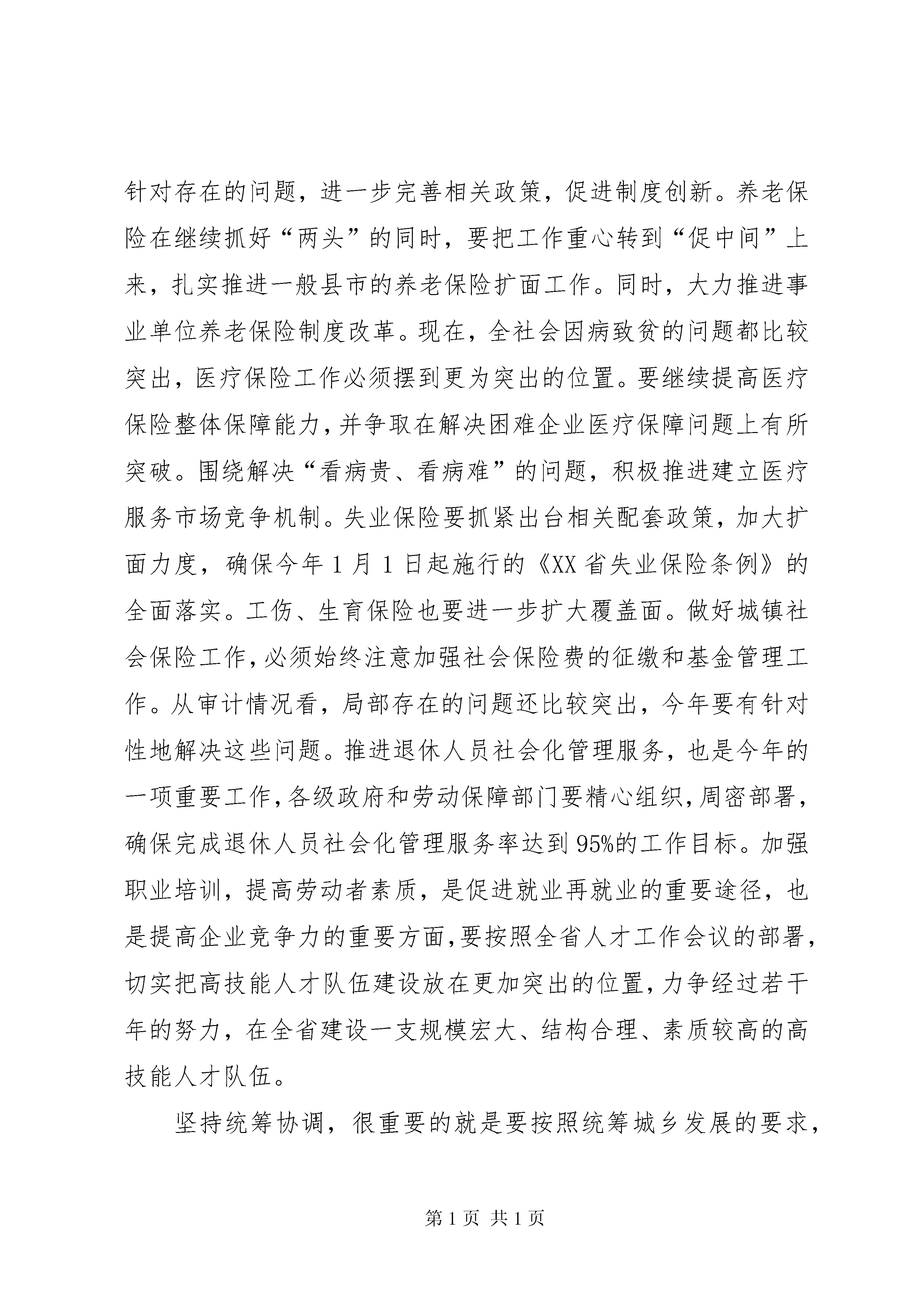 劳动社会保障讲话一、坚持执政为民,进一步增强做好劳动保障工作的责任感和紧迫感立党为公、执政为民,是科学发展观的本质要求,是新一届党中央、国务院突出强调的执政理念。劳动保障工作直接关系到广大劳动者的切身利益,更应当以此作为工作宗旨和努力方向。党中央、国务院历来重视劳动保障工作,近年来,更是作出了一系列重大决策部署。20****年、2****年连续两年召开全国再就业工作会议(座谈会),把就业作为民生之本和安国之策,摆到了更加突出的位置,从去年开始将新增就业人员和控制失业率纳入了国民经济宏观调控的重要目标。党的十六届三中全会又把“健全就业、收入分配和社会保障制度”作为完善社会主义市场经济体制的主要任务之一,作出了全面规划和部署。省委、省政府一直以来也十分重视劳动保障工作。去年一年,就先后召开两次全省性会议部署劳动保障工作,省委、省政府主要领导亲自作报告、作部署,又先后两次组织全省性的就业再就业工作专项督查。这样的重视程度和工作力度,可以说是前所未有的。前不久,省委书记习近平、省长吕祖善在省委十一届五次全会的报告和讲话中,都突出强调了劳动保障工作,提出明确的要求。在省委、省政府的高度重视下,经过近年来全省上下特别是各级劳动保障部门的共同努力,我省劳动保障工作已经有了一个良好的基础,不少工作走在了全国的前列。但是,我们必须清醒地看到,与人民群众的要求相比,与省委、省政府确定的目标相比,劳动保障工作依然任重而道远。正如吕省长在前不久的批示中所指出的,我们现在社会保障工作的基础还很不扎实,离健全完善还有很大距离,必须进一步做出艰苦的努力。我省民营企业多,外来务工人员多,劳动力流动频繁,随着改革深化和经济结构调整的加快,劳动关系和劳动用工方式必将日趋复杂。就业再就业压力在相当长一段时期内还不可能得到明显缓解,社会各群体间收入分配的差距还会进一步拉大,扶贫济困和维护劳动者合法权益的任务依然十分艰巨。完善的劳动社会保障体系是社会主义市场经济体制的一个重要支柱,是社会稳定的“安全网”,是经济运行的“调节器”,是社会公平的“减震器”。关注民生,解决民生,最基础的必然是就业问题、劳动关系协调问题、收入分配问题和社会保障问题。各级劳动保障部门特别是各级领导干部必须深刻认识自己所肩负的历史重任,坚持从大局出发,在实际工作中深入实践科学发展观,切实维护好广大劳动者的合法权益,继续为深化改革、促进发展、维护稳定做出积极的贡献。二、坚持统筹协调,全面推进劳动保障的各项工作,正确处理好各方面的利益关系去年以来,党中央、国务院十分强调要确立全面协调可持续的科学发展观。党的十六届三中全会进一步提出了“五个统筹”、“五个坚持”的要求。这一系列重要思想和要求,对加快全面建设小康社会、积极推进社会主义现代化建设具有全局性的指导意义。同样,也必然是我们在新世纪新阶段做好劳动保障工作的重要指导方针。我省经济相对比较发达,市场机制先发优势比较明显,特别是多种所有制经济共同发展的格局已经形成,这些年来,城市化、城乡一体化步伐明显加快,经济外向度不断提高,统筹协调推进劳动保障工作,不仅具有现实可能性,而且显得十分必要、十分紧迫。去年,我省提出“率先建立比较完善的城镇社会保险体系、加快建立覆盖城乡的新型社会救助体系”,就是要建立就业、社会保险、社会救助相互衔接、相互促进的“大社保”体系。这一工作目标本身就充分体现了“统筹协调”的要求。今后一个时期,我省劳动保障工作总体上就是要紧紧围绕建立这一“大社保”体系,扎扎实实地开展各项工作。劳动保障工作涉及面广,具体工作多,专业性强,本身就需要统筹安排、协调推进。就业再就业工作,我省已经形成比较好的工作机制,比较有效的政策措施,比较健全的服务体系和援助体系。今年,要以落实各项政策措施为着力点,继续把这项工作摆在更加突出的位置,进一步加大工作力度,加大资金投入,在重点加强再就业的同时,统筹做好各方面的就业工作。城镇养老、医疗、失业、工伤、生育五大社会保险都要结合各自的工作特点,针对存在的问题,进一步完善相关政策,促进制度创新。养老保险在继续抓好“两头”的同时,要把工作重心转到“促中间”上来,扎实推进一般县市的养老保险扩面工作。同时,大力推进事业单位养老保险制度改革。现在,全社会因病致贫的问题都比较突出,医疗保险工作必须摆到更为突出的位置。要继续提高医疗保险整体保障能力,并争取在解决困难企业医疗保障问题上有所突破。围绕解决“看病贵、看病难”的问题,积极推进建立医疗服务市场竞争机制。失业保险要抓紧出台相关配套政策,加大扩面力度,确保今年1月1日起施行的《XX省失业保险条例》的全面落实。工伤、生育保险也要进一步扩大覆盖面。做好城镇社会保险工作,必须始终注意加强社会保险费的征缴和基金管理工作。从审计情况看,局部存在的问题还比较突出