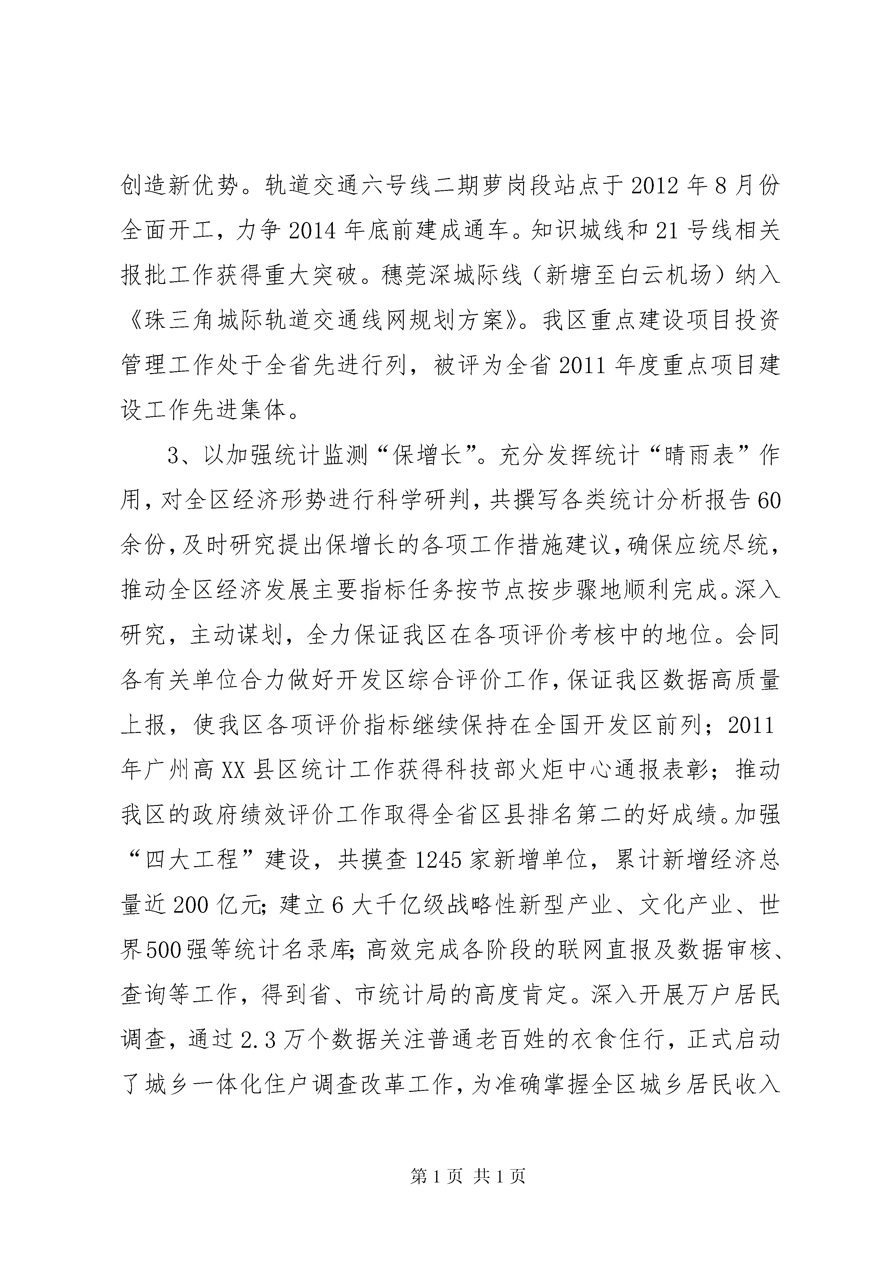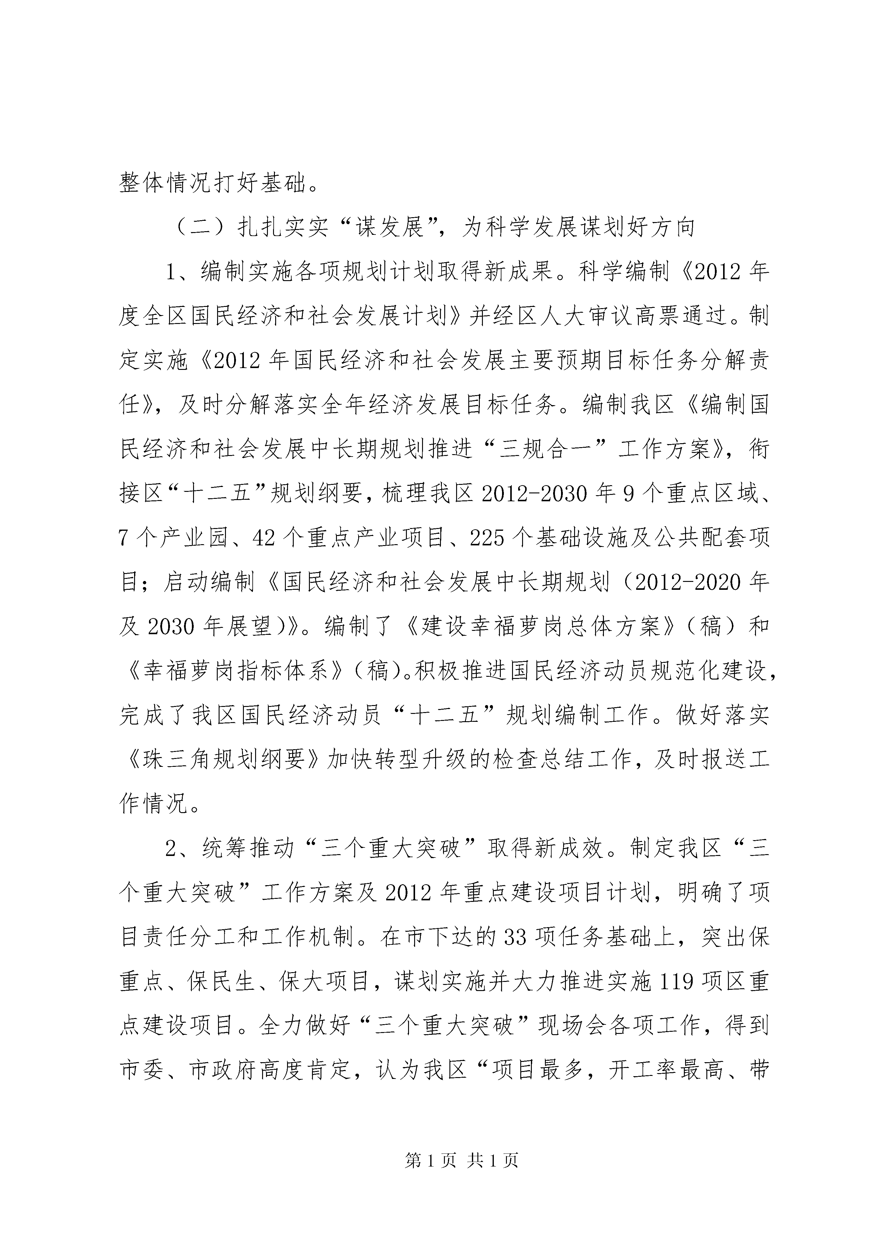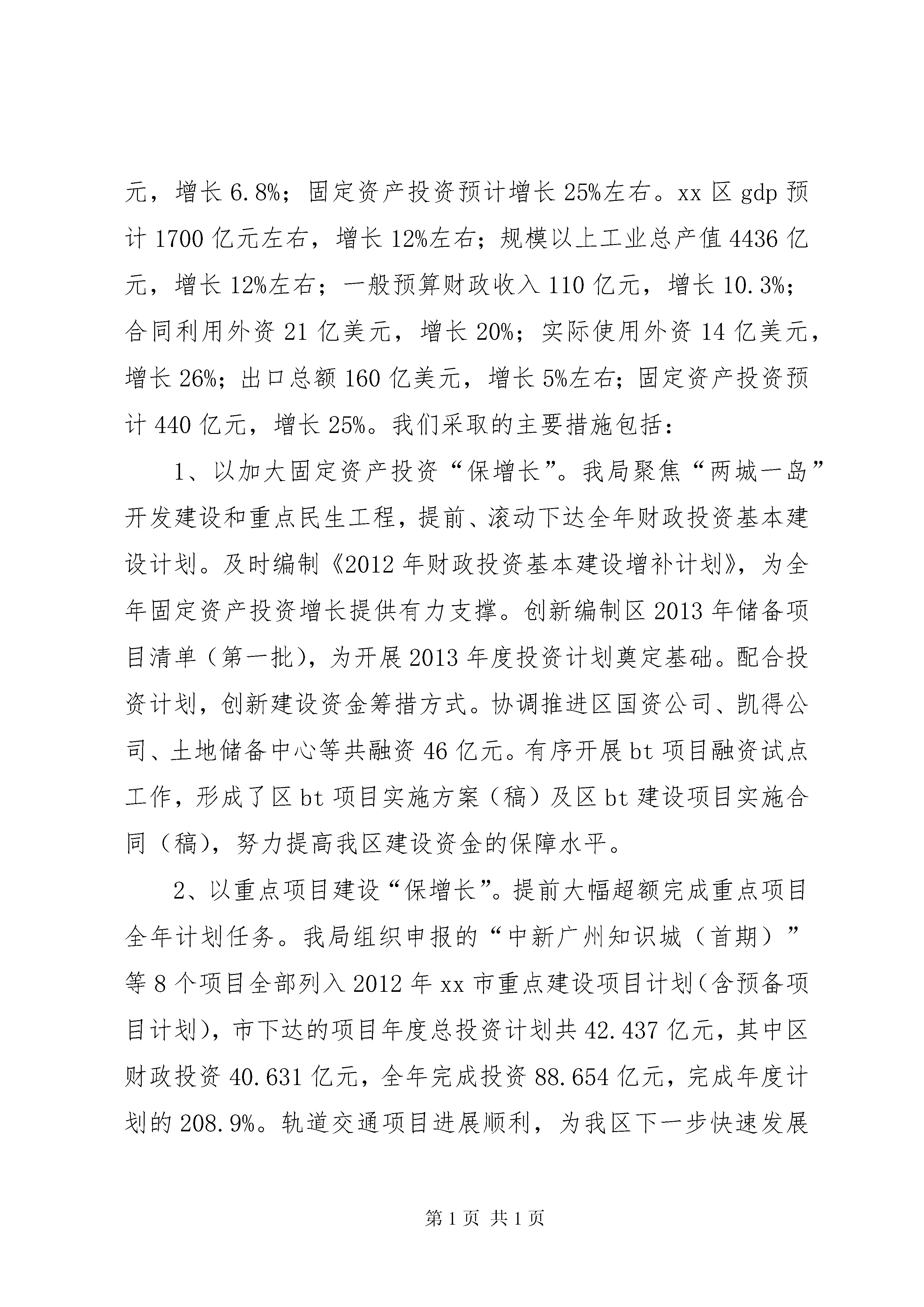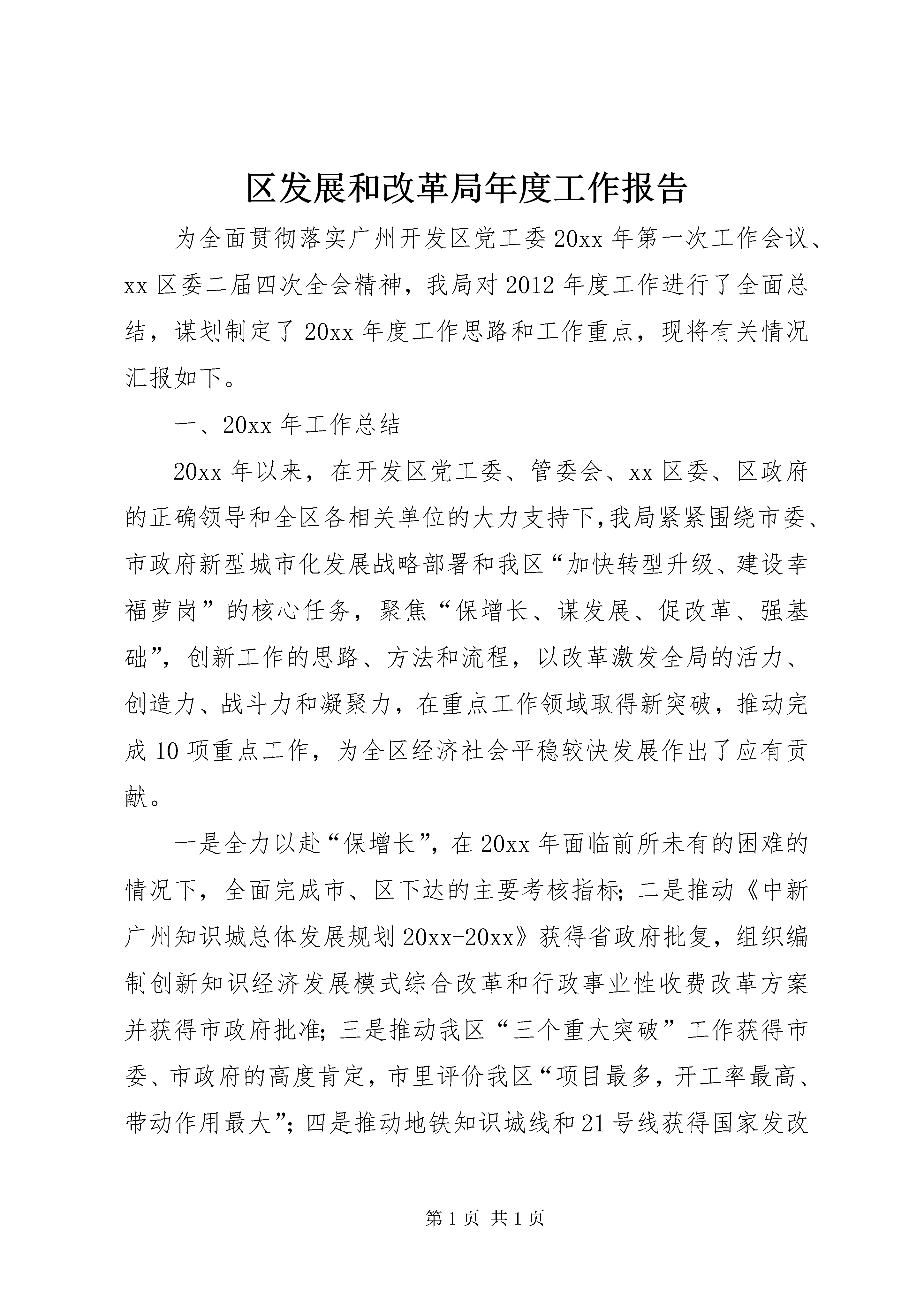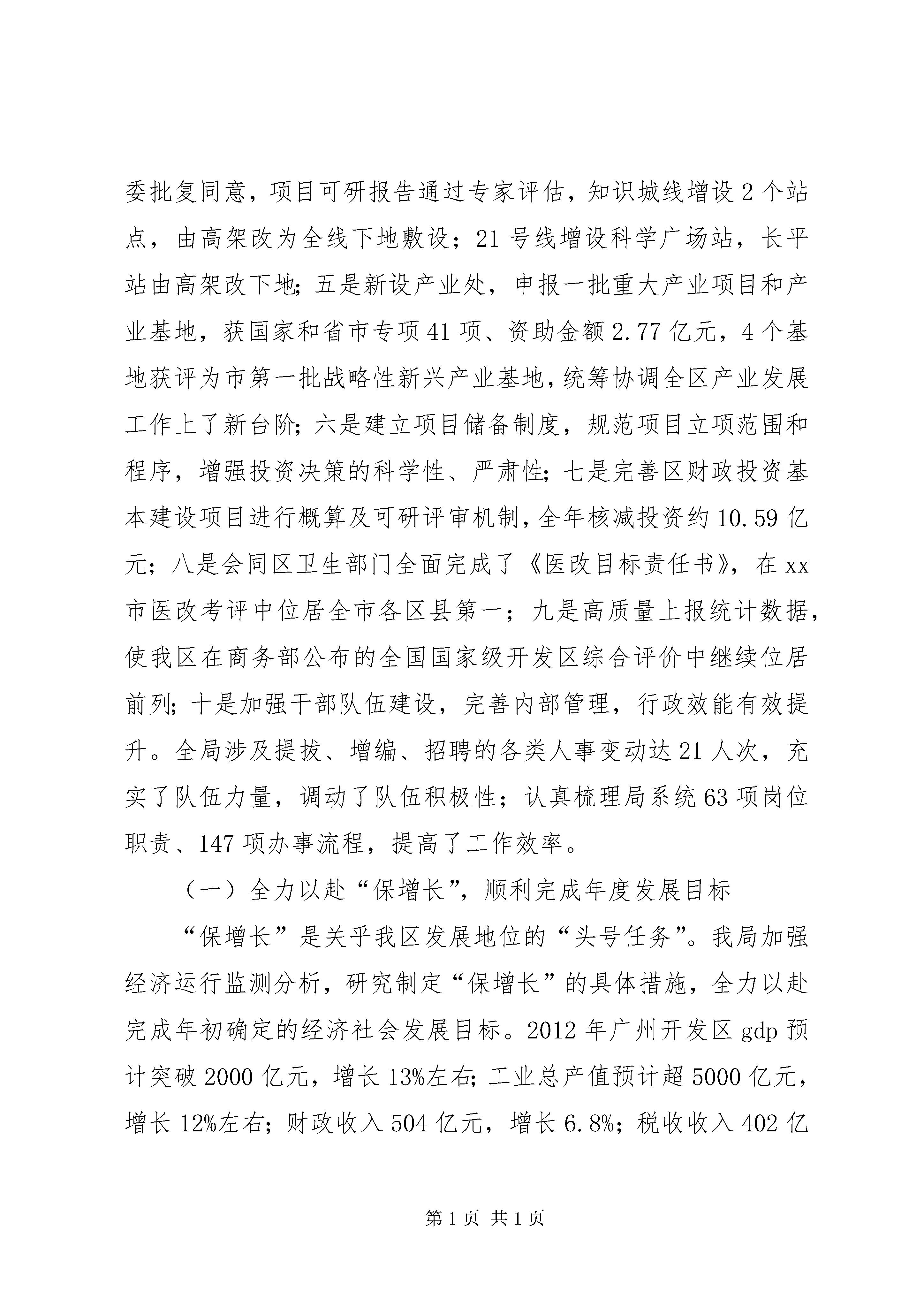 区发展和改革局年度工作报告为全面贯彻落实广州开发区党工委20xx年第一次工作会议、xx区委二届四次全会精神,我局对2012年度工作进行了全面总结,谋划制定了20xx年度工作思路和工作重点,现将有关情况汇报如下。一、20xx年工作总结20xx年以来,在开发区党工委、管委会、xx区委、区政府的正确领导和全区各相关单位的大力支持下,我局紧紧围绕市委、市政府新型城市化发展战略部署和我区“加快转型升级、建设幸福萝岗”的核心任务,聚焦“保增长、谋发展、促改革、强基础”,创新工作的思路、方法和流程,以改革激发全局的活力、创造力、战斗力和凝聚力,在重点工作领域取得新突破,推动完成10项重点工作,为全区经济社会平稳较快发展作出了应有贡献。一是全力以赴“保增长”,在20xx年面临前所未有的困难的情况下,全面完成市、区下达的主要考核指标;二是推动《中新广州知识城总体发展规划20xx-20xx》获得省政府批复,组织编制创新知识经济发展模式综合改革和行政事业性收费改革方案并获得市政府批准;三是推动我区“三个重大突破”工作获得市委、市政府的高度肯定,市里评价我区“项目最多,开工率最高、带动作用最大”;四是推动地铁知识城线和21号线获得国家发改委批复同意,项目可研报告通过专家评估,知识城线增设2个站点,由高架改为全线下地敷设;21号线增设科学广场站,长平站由高架改下地;五是新设产业处,申报一批重大产业项目和产业基地,获国家和省市专项41项、资助金额2.77亿元,4个基地获评为市第一批战略性新兴产业基地,统筹协调全区产业发展工作上了新台阶;六是建立项目储备制度,规范项目立项范围和程序,增强投资决策的科学性、严肃性;七是完善区财政投资基本建设项目进行概算及可研评审机制,全年核减投资约10.59亿元;八是会同区卫生部门全面完成了《医改目标责任书》,在xx市医改考评中位居全市各区县第一;九是高质量上报统计数据,使我区在商务部公布的全国国家级开发区综合评价中继续位居前列;十是加强干部队伍建设,完善内部管理,行政效能有效提升。全局涉及提拔、增编、招聘的各类人事变动达21人次,充实了队伍力量,调动了队伍积极性;认真梳理局系统63项岗位职责、147项办事流程,提高了工作效率。(一)全力以赴“保增长”,顺利完成年度发展目标“保增长”是关乎我区发展地位的“头号任务”。我局加强经济运行监测分析,研究制定“保增长”的具体措施,全力以赴完成年初确定的经济社会发展目标。2012年广州开发区gdp预计突破2000亿元,增长13%左右;工业总产值预计超5000亿元,增长12%左右;财政收入504亿元,增长6.8%;税收收入402亿元,增长6.8%;固定资产投资预计增长25%左右。xx区gdp预计1700亿元左右,增长12%左右;规模以上工业总产值4436亿元,增长12%左右;一般预算财政收入110亿元,增长10.3%;合同利用外资21亿美元,增长20%;实际使用外资14亿美元,增长26%;出口总额160亿美元,增长5%左右;固定资产投资预计440亿元,增长25%。我们采取的主要措施包括:1、以加大固定资产投资“保增长”。我局聚焦“两城一岛”开发建设和重点民生工程,提前、滚动下达全年财政投资基本建设计划。及时编制《2012年财政投资基本建设增补计划》,为全年固定资产投资增长提供有力支撑。创新编制区2013年储备项目清单(第一批),为开展2013年度投资计划奠定基础。配合投资计划,创新建设资金筹措方式。协调推进区国资公司、凯得公司、土地储备中心等共融资46亿元。有序开展bt项目融资试点工作,形成了区bt项目实施方案(稿)及区bt建设项目实施合同(稿),努力提高我区建设资金的保障水平。2、以重点项目建设“保增长”。提前大幅超额完成重点项目全年计划任务。我局组织申报的“中新广州知识城(首期)”等8个项目全部列入2012年xx市重点建设项目计划(含预备项目计划),市下达的项目年度总投资计划共42.437亿元,其中区财政投资40.631亿元,全年完成投资88.654亿元,完成年度计划的208.9%。轨道交通项目进展顺利,为我区下一步快速发展创造新优势。轨道交通六号线二期萝岗段站点于2012年8月份全面开工,力争2014年底前建成通车。知识城线和21号线相关报批工作获得重大突破。穗莞深城际线(新塘至白云机场)纳入《珠三角城际轨道交通线网规划方案》。我区重点建设项目投资管理工作处于全省先进行列,被评为全省2011年度重点项目建设工作先进集体。3、以加强统计监测“保增长”。充分发挥统计“晴雨表”作用,对全区经济形势进行科学研判,共撰写各类统计分析报告60余份,及时研究提出保增长的各项工作措施建议,确保应统尽统,推动全区经济发展主要指标任务按节点按步骤地顺利完成。深入研究,主动谋划
