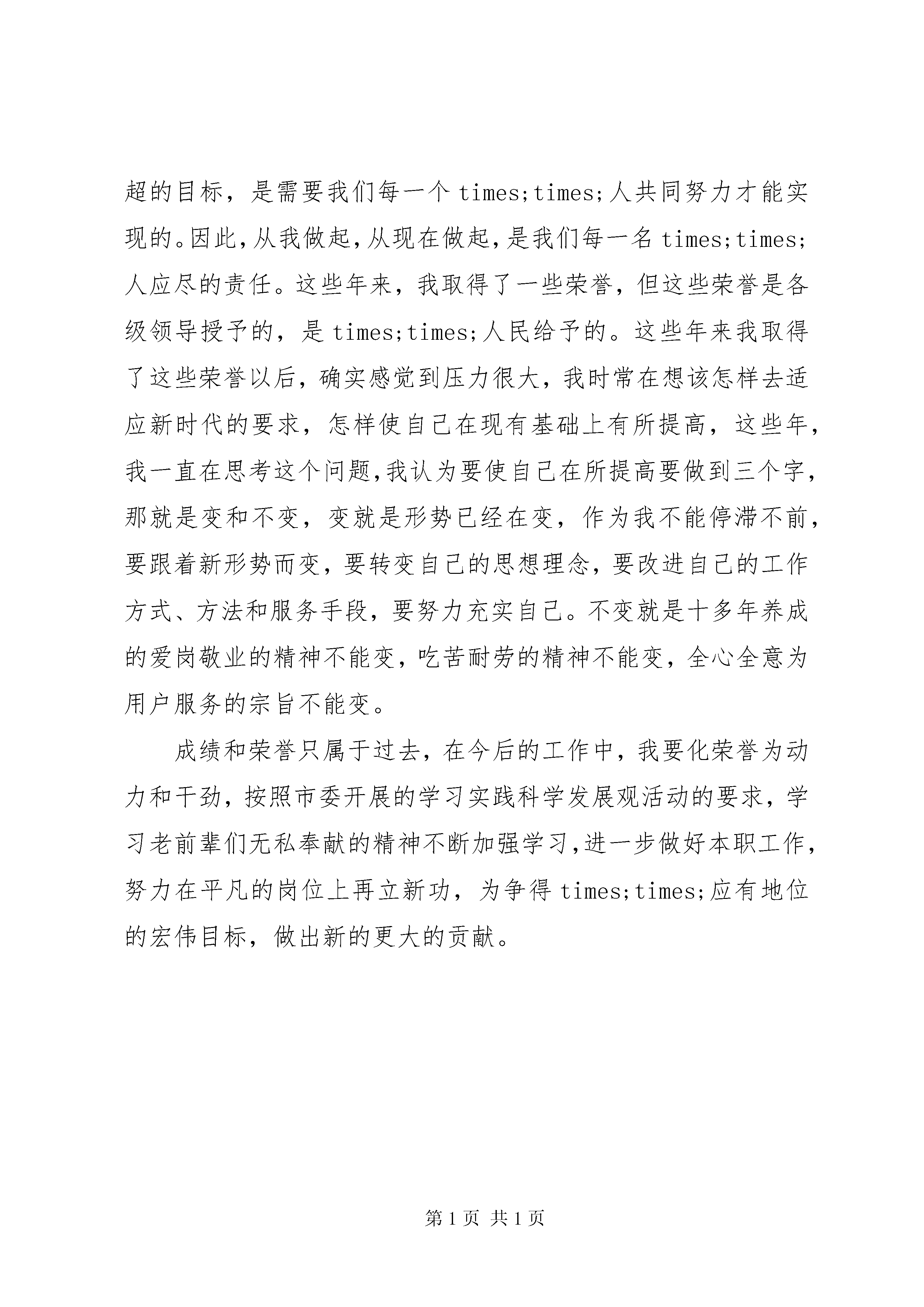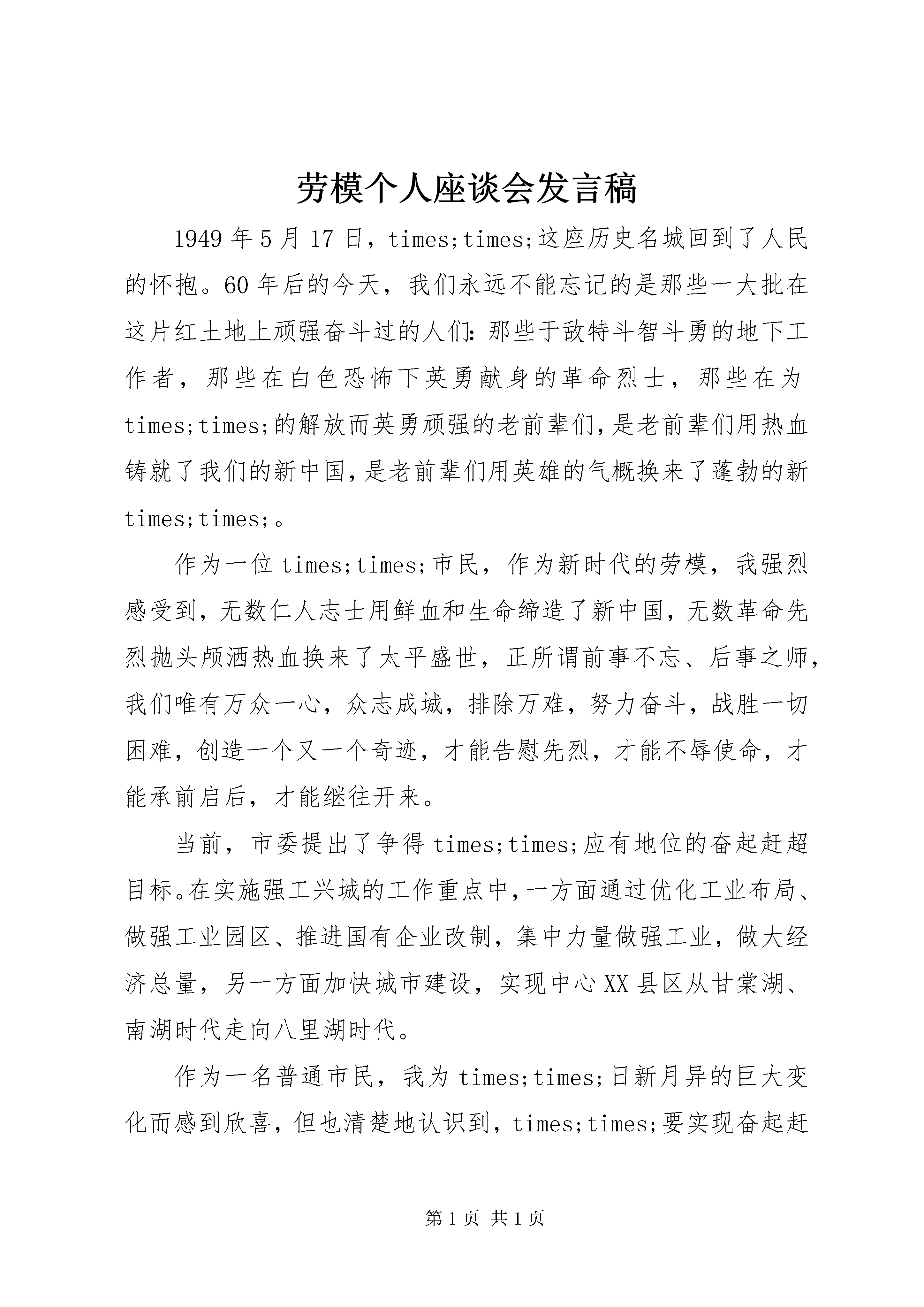 劳模个人座谈会发言稿1949年5月17日,times;times;这座历史名城回到了人民的怀抱。60年后的今天,我们永远不能忘记的是那些一大批在这片红土地上顽强奋斗过的人们:那些于敌特斗智斗勇的地下工作者,那些在白色恐怖下英勇献身的革命烈士,那些在为times;times;的解放而英勇顽强的老前辈们,是老前辈们用热血铸就了我们的新中国,是老前辈们用英雄的气概换来了蓬勃的新times;times;。作为一位times;times;市民,作为新时代的劳模,我强烈感受到,无数仁人志士用鲜血和生命缔造了新中国,无数革命先烈抛头颅洒热血换来了太平盛世,正所谓前事不忘、后事之师,我们唯有万众一心,众志成城,排除万难,努力奋斗,战胜一切困难,创造一个又一个奇迹,才能告慰先烈,才能不辱使命,才能承前启后,才能继往开来。当前,市委提出了争得times;times;应有地位的奋起赶超目标。在实施强工兴城的工作重点中,一方面通过优化工业布局、做强工业园区、推进国有企业改制,集中力量做强工业,做大经济总量,另一方面加快城市建设,实现中心XX县区从甘棠湖、南湖时代走向八里湖时代。作为一名普通市民,我为times;times;日新月异的巨大变化而感到欣喜,但也清楚地认识到,times;times;要实现奋起赶超的目标,是需要我们每一个times;times;人共同努力才能实现的。因此,从我做起,从现在做起,是我们每一名times;times;人应尽的责任。这些年来,我取得了一些荣誉,但这些荣誉是各级领导授予的,是times;times;人民给予的。这些年来我取得了这些荣誉以后,确实感觉到压力很大,我时常在想该怎样去适应新时代的要求,怎样使自己在现有基础上有所提高,这些年,我一直在思考这个问题,我认为要使自己在所提高要做到三个字,那就是变和不变,变就是形势已经在变,作为我不能停滞不前,要跟着新形势而变,要转变自己的思想理念,要改进自己的工作方式、方法和服务手段,要努力充实自己。不变就是十多年养成的爱岗敬业的精神不能变,吃苦耐劳的精神不能变,全心全意为用户服务的宗旨不能变。成绩和荣誉只属于过去,在今后的工作中,我要化荣誉为动力和干劲,按照市委开展的学习实践科学发展观活动的要求,学习老前辈们无私奉献的精神不断加强学习,进一步做好本职工作,努力在平凡的岗位上再立新功,为争得times;times;应有地位的宏伟目标,做出新的更大的贡献。