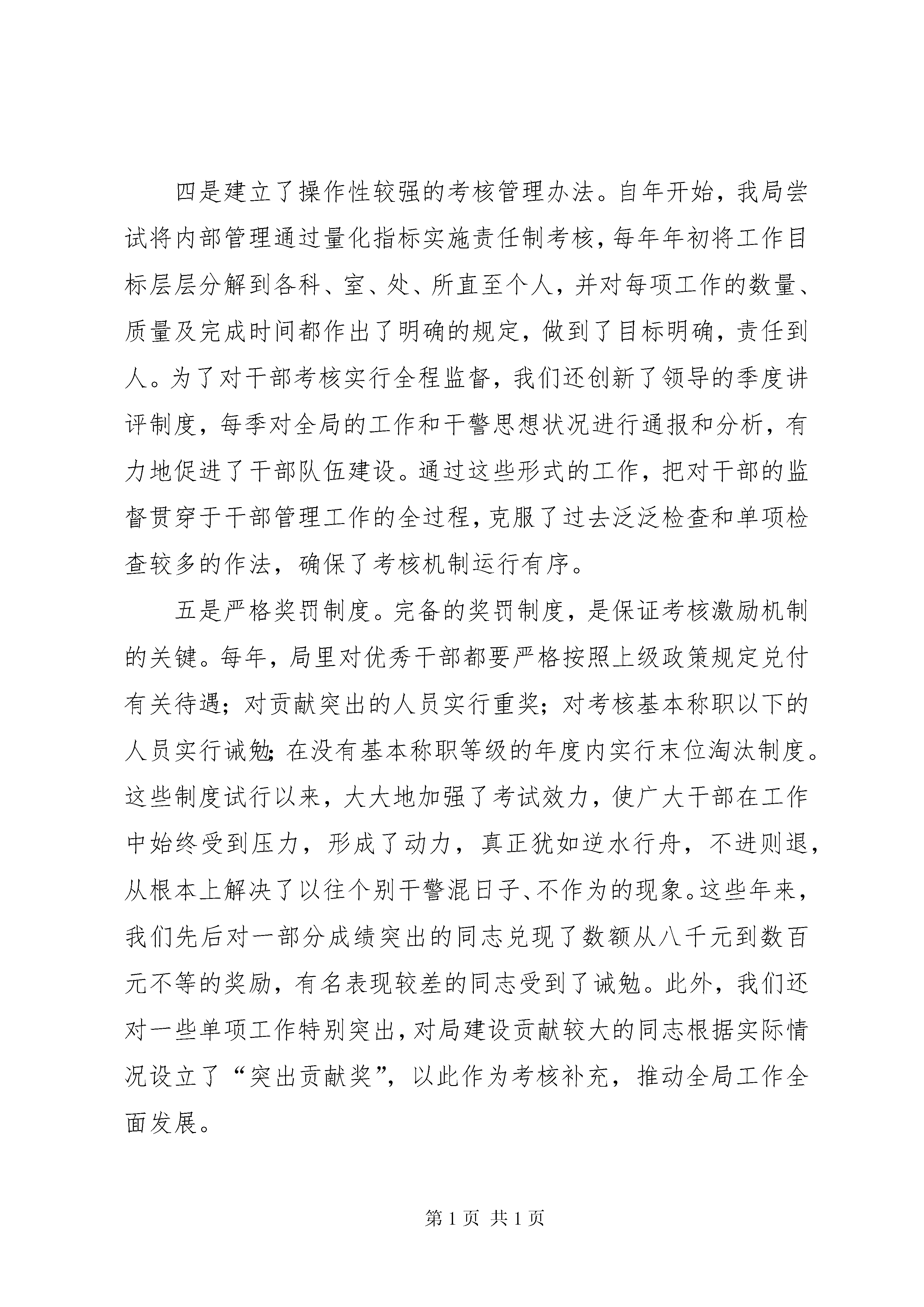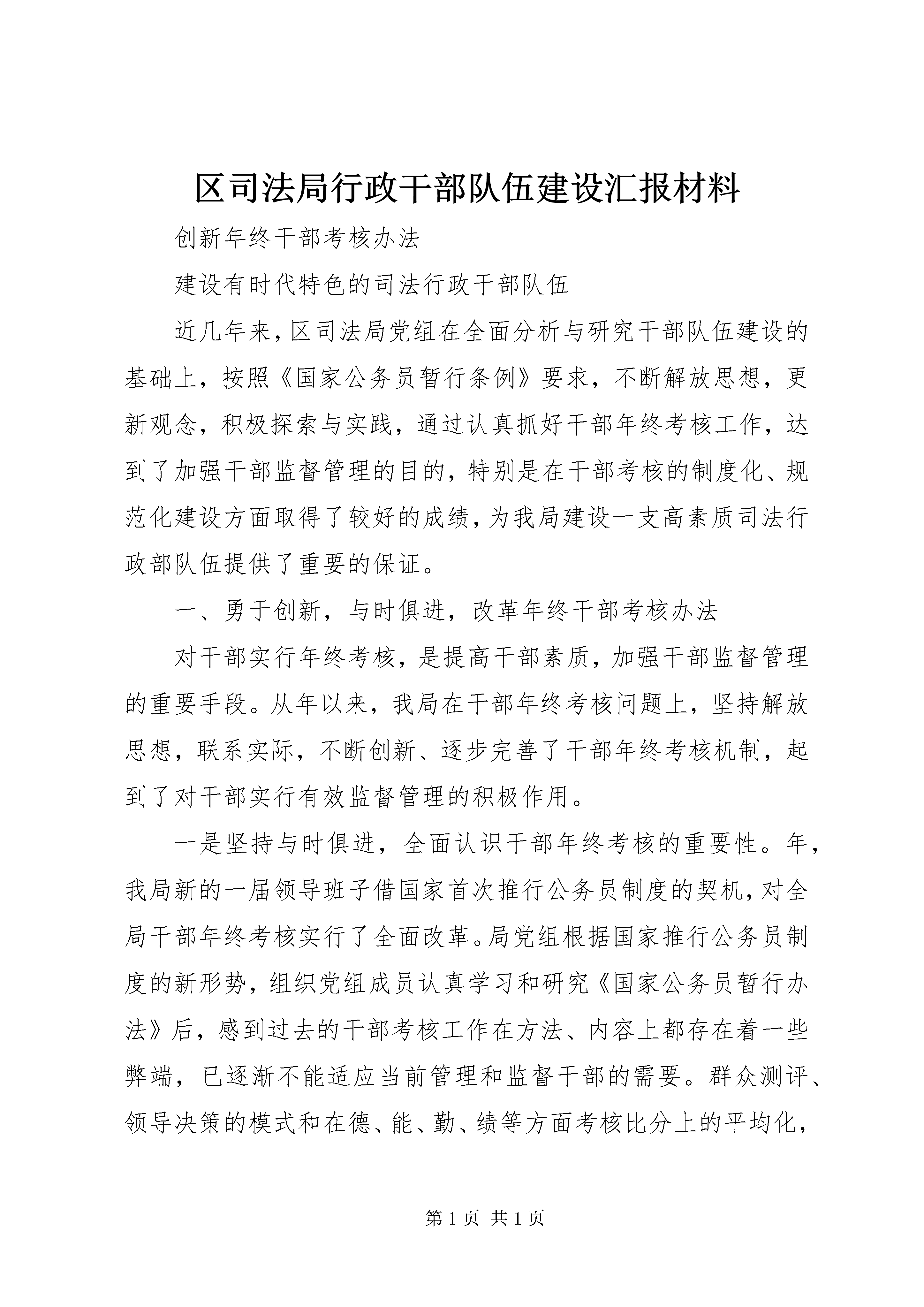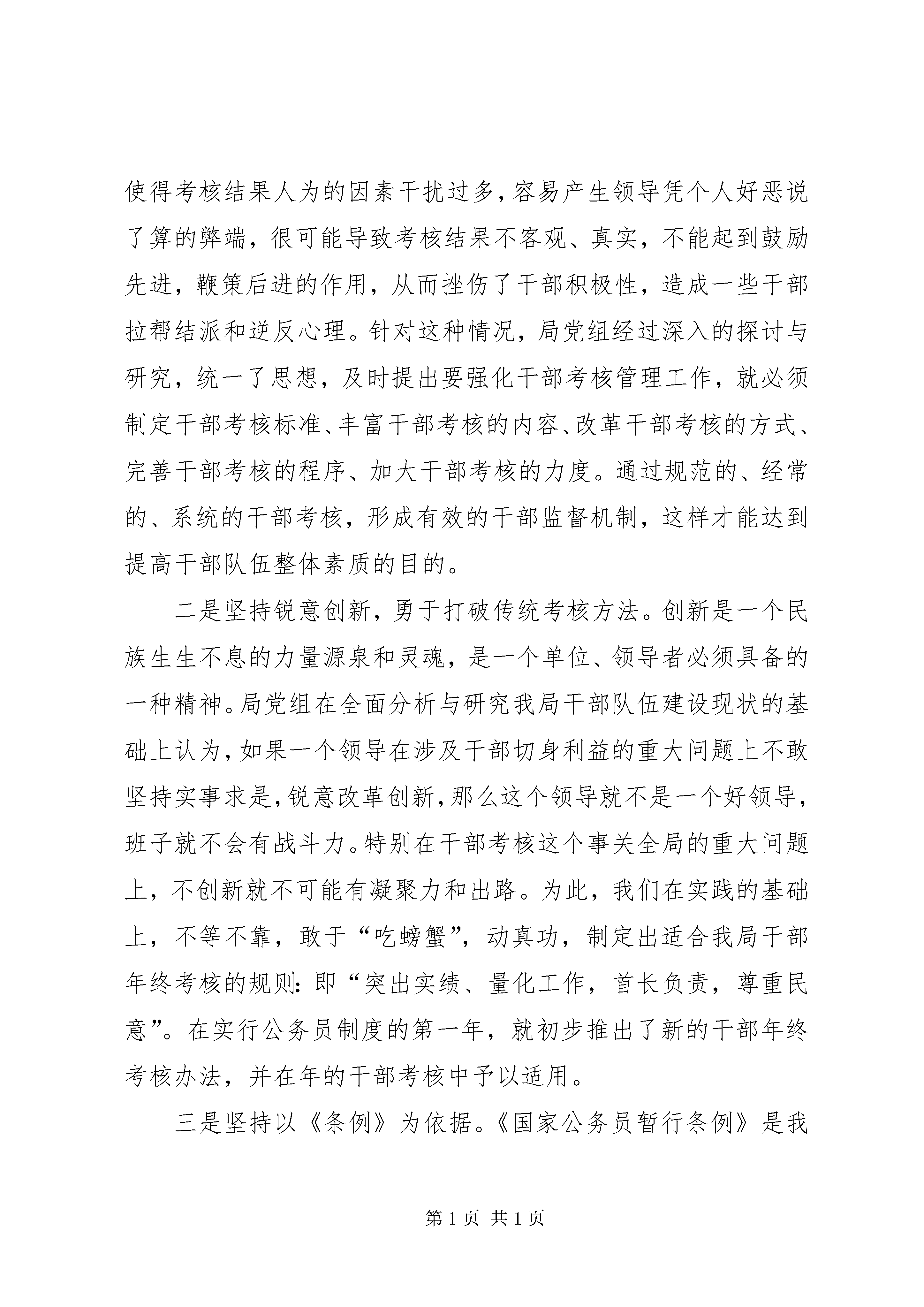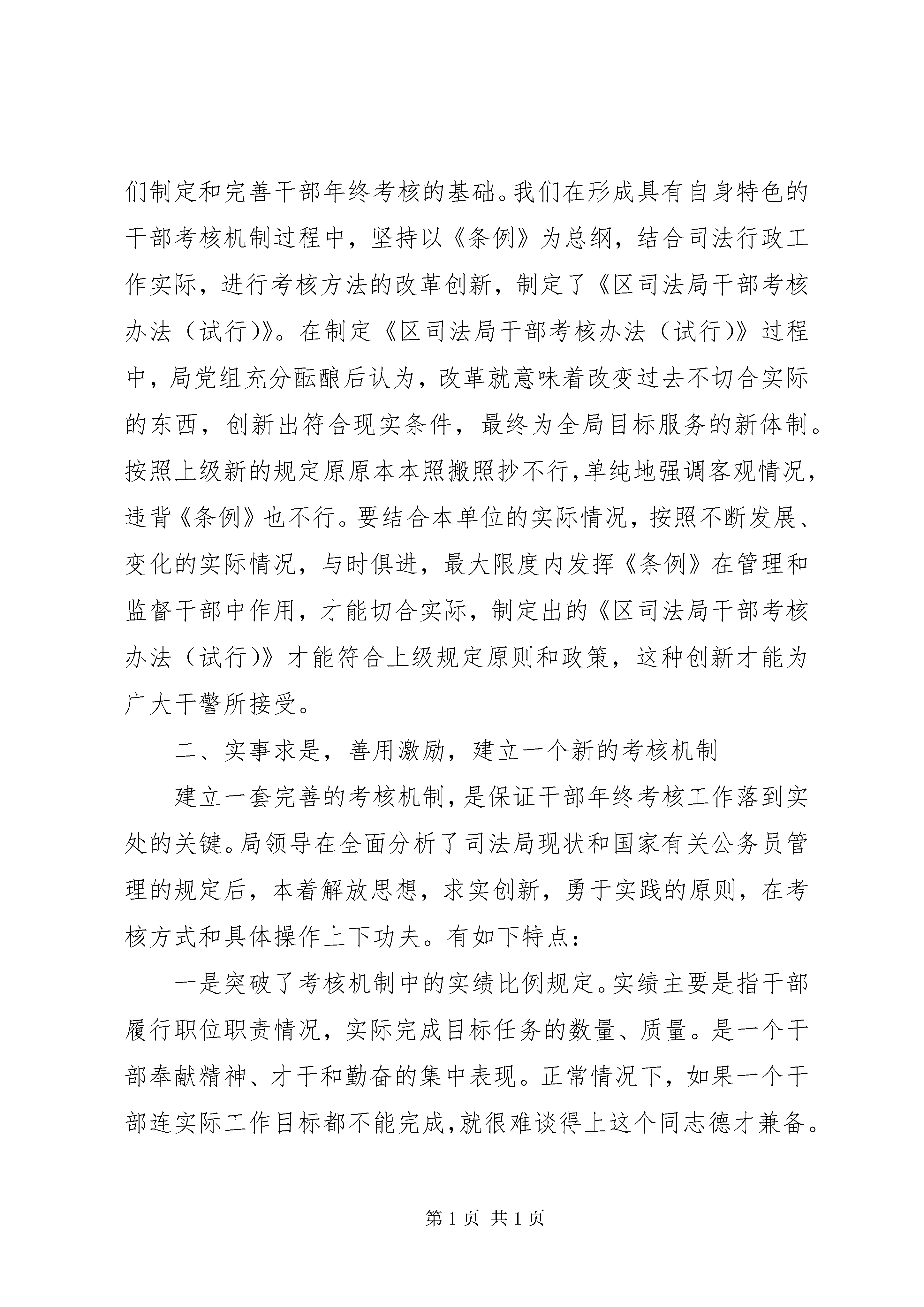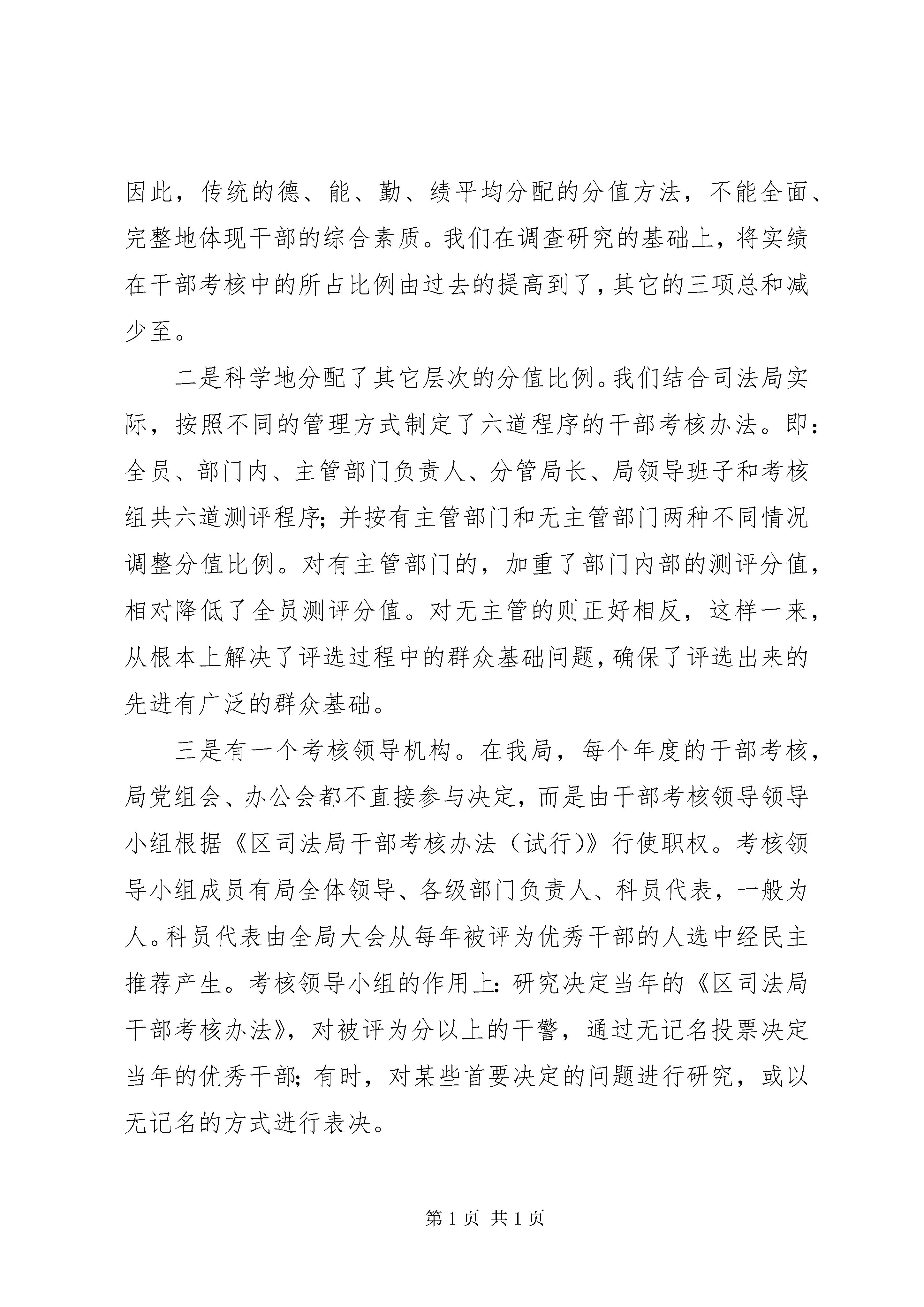 区司法局行政干部队伍建设汇报材料创新年终干部考核办法建设有时代特色的司法行政干部队伍近几年来,区司法局党组在全面分析与研究干部队伍建设的基础上,按照《国家公务员暂行条例》要求,不断解放思想,更新观念,积极探索与实践,通过认真抓好干部年终考核工作,达到了加强干部监督管理的目的,特别是在干部考核的制度化、规范化建设方面取得了较好的成绩,为我局建设一支高素质司法行政部队伍提供了重要的保证。一、勇于创新,与时俱进,改革年终干部考核办法对干部实行年终考核,是提高干部素质,加强干部监督管理的重要手段。从年以来,我局在干部年终考核问题上,坚持解放思想,联系实际,不断创新、逐步完善了干部年终考核机制,起到了对干部实行有效监督管理的积极作用。一是坚持与时俱进,全面认识干部年终考核的重要性。年,我局新的一届领导班子借国家首次推行公务员制度的契机,对全局干部年终考核实行了全面改革。局党组根据国家推行公务员制度的新形势,组织党组成员认真学习和研究《国家公务员暂行办法》后,感到过去的干部考核工作在方法、内容上都存在着一些弊端,已逐渐不能适应当前管理和监督干部的需要。群众测评、领导决策的模式和在德、能、勤、绩等方面考核比分上的平均化,使得考核结果人为的因素干扰过多,容易产生领导凭个人好恶说了算的弊端,很可能导致考核结果不客观、真实,不能起到鼓励先进,鞭策后进的作用,从而挫伤了干部积极性,造成一些干部拉帮结派和逆反心理。针对这种情况,局党组经过深入的探讨与研究,统一了思想,及时提出要强化干部考核管理工作,就必须制定干部考核标准、丰富干部考核的内容、改革干部考核的方式、完善干部考核的程序、加大干部考核的力度。通过规范的、经常的、系统的干部考核,形成有效的干部监督机制,这样才能达到提高干部队伍整体素质的目的。二是坚持锐意创新,勇于打破传统考核方法。创新是一个民族生生不息的力量源泉和灵魂,是一个单位、领导者必须具备的一种精神。局党组在全面分析与研究我局干部队伍建设现状的基础上认为,如果一个领导在涉及干部切身利益的重大问题上不敢坚持实事求是,锐意改革创新,那么这个领导就不是一个好领导,班子就不会有战斗力。特别在干部考核这个事关全局的重大问题上,不创新就不可能有凝聚力和出路。为此,我们在实践的基础上,不等不靠,敢于“吃螃蟹”,动真功,制定出适合我局干部年终考核的规则:即“突出实绩、量化工作,首长负责,尊重民意”。在实行公务员制度的第一年,就初步推出了新的干部年终考核办法,并在年的干部考核中予以适用。三是坚持以《条例》为依据。《国家公务员暂行条例》是我们制定和完善干部年终考核的基础。我们在形成具有自身特色的干部考核机制过程中,坚持以《条例》为总纲,结合司法行政工作实际,进行考核方法的改革创新,制定了《区司法局干部考核办法(试行)》。在制定《区司法局干部考核办法(试行)》过程中,局党组充分酝酿后认为,改革就意味着改变过去不切合实际的东西,创新出符合现实条件,最终为全局目标服务的新体制。按照上级新的规定原原本本照搬照抄不行,单纯地强调客观情况,违背《条例》也不行。要结合本单位的实际情况,按照不断发展、变化的实际情况,与时俱进,最大限度内发挥《条例》在管理和监督干部中作用,才能切合实际,制定出的《区司法局干部考核办法(试行)》才能符合上级规定原则和政策,这种创新才能为广大干警所接受。二、实事求是,善用激励,建立一个新的考核机制建立一套完善的考核机制,是保证干部年终考核工作落到实处的关键。局领导在全面分析了司法局现状和国家有关公务员管理的规定后,本着解放思想,求实创新,勇于实践的原则,在考核方式和具体操作上下功夫。有如下特点:一是突破了考核机制中的实绩比例规定。实绩主要是指干部履行职位职责情况,实际完成目标任务的数量、质量。是一个干部奉献精神、才干和勤奋的集中表现。正常情况下,如果一个干部连实际工作目标都不能完成,就很难谈得上这个同志德才兼备。因此,传统的德、能、勤、绩平均分配的分值方法,不能全面、完整地体现干部的综合素质。我们在调查研究的基础上,将实绩在干部考核中的所占比例由过去的提高到了,其它的三项总和减少至。二是科学地分配了其它层次的分值比例。我们结合司法局实际,按照不同的管理方式制定了六道程序的干部考核办法。即:全员、部门内、主管部门负责人、分管局长、局领导班子和考核组共六道测评程序;并按有主管部门和无主管部门两种不同情况调整分值比例。对有主管部门的,加重了部门内部的测评分值,相对降低了全员测评分值。对无主管的则正好相反,这样一来,从根本上解决了评选过程中的群众基础问题,确保了评选出来的先进有广泛的群众基础。三是有一个考核领导机构。在我局,每个年度的干部考核,局党组会、办公会都不直接参与决定,而是由干部考核领导领导小组根据《区司法局干部考核办