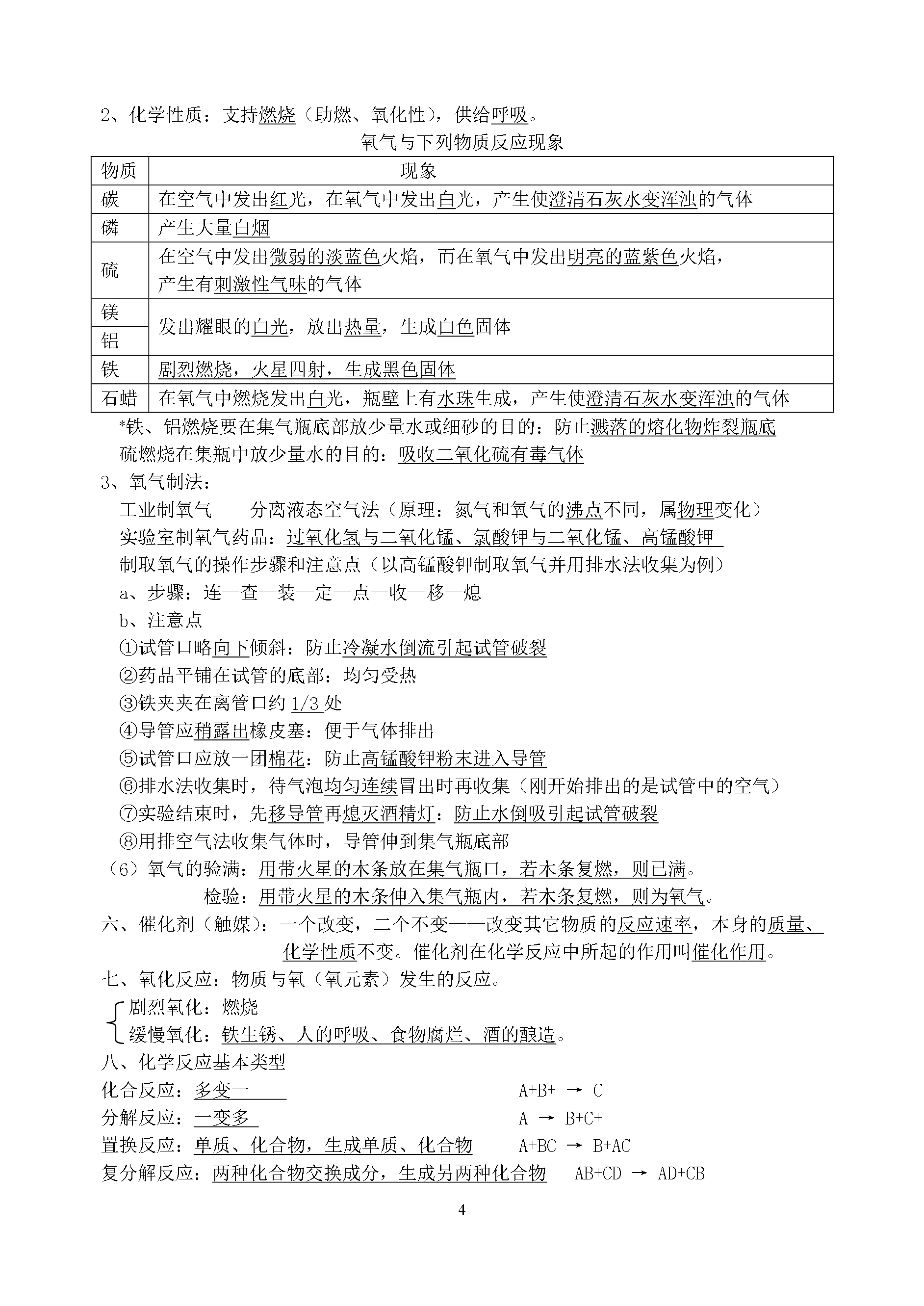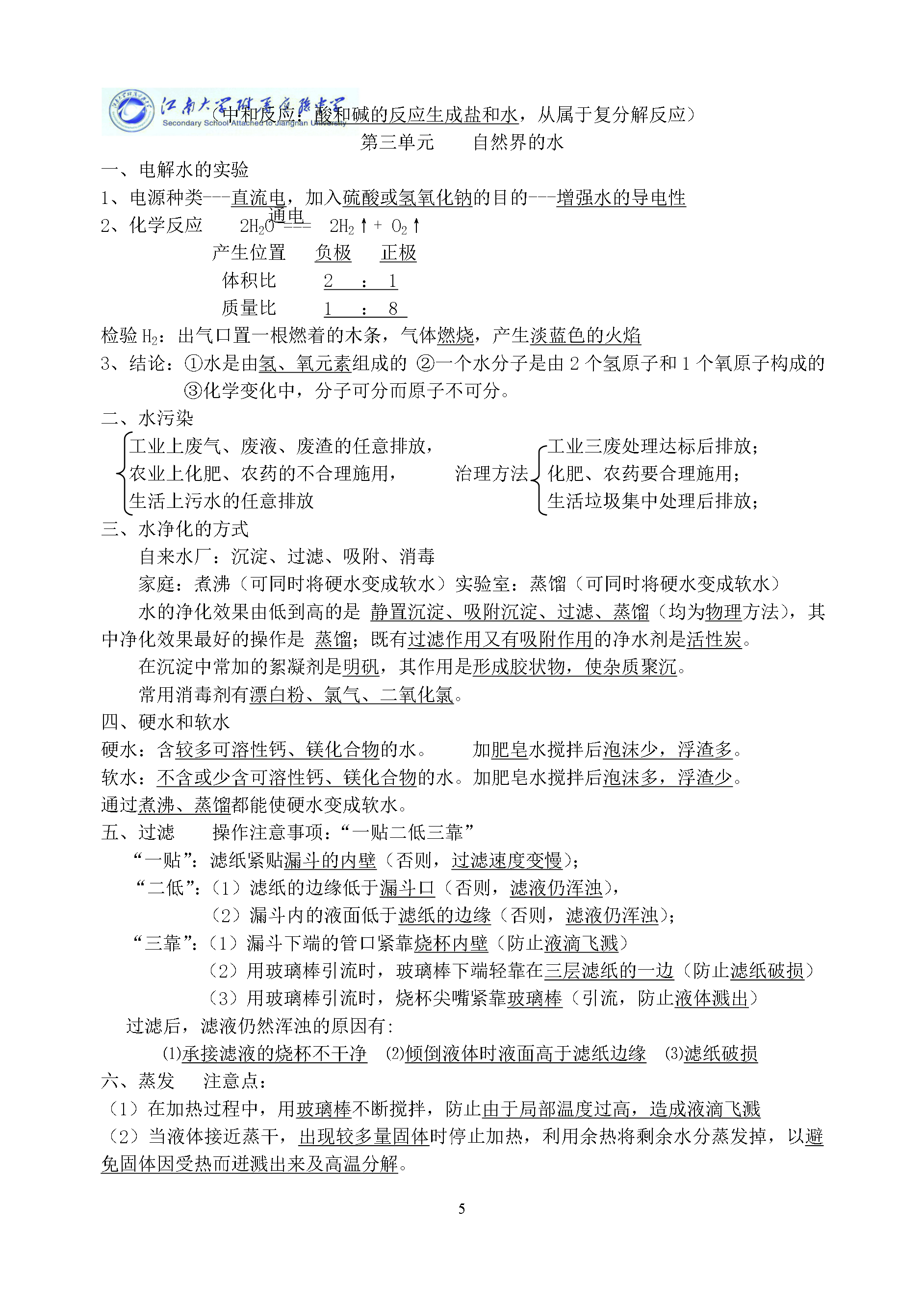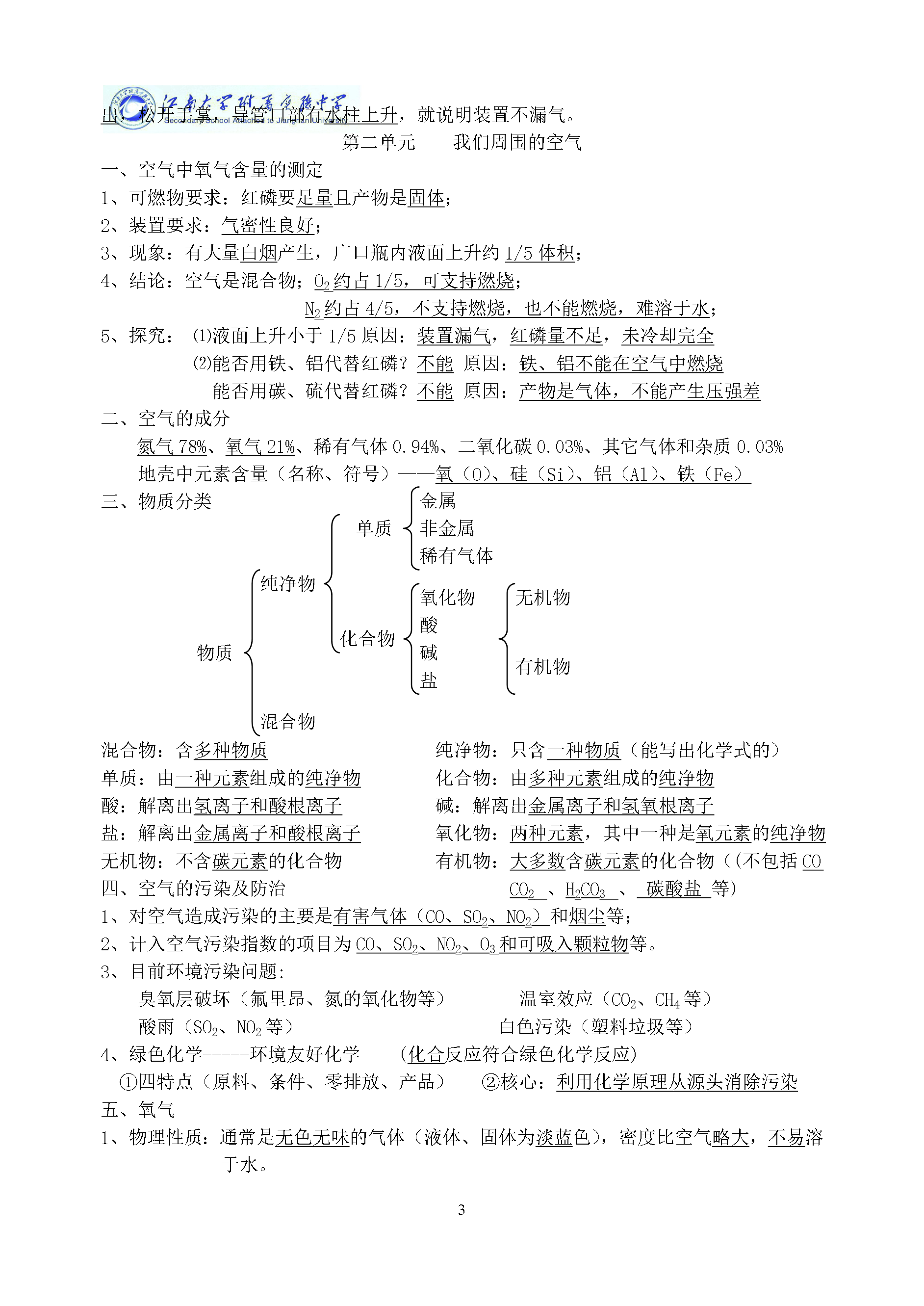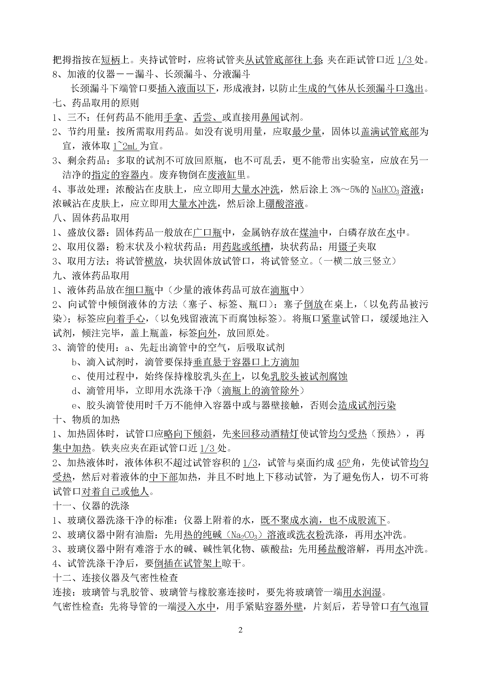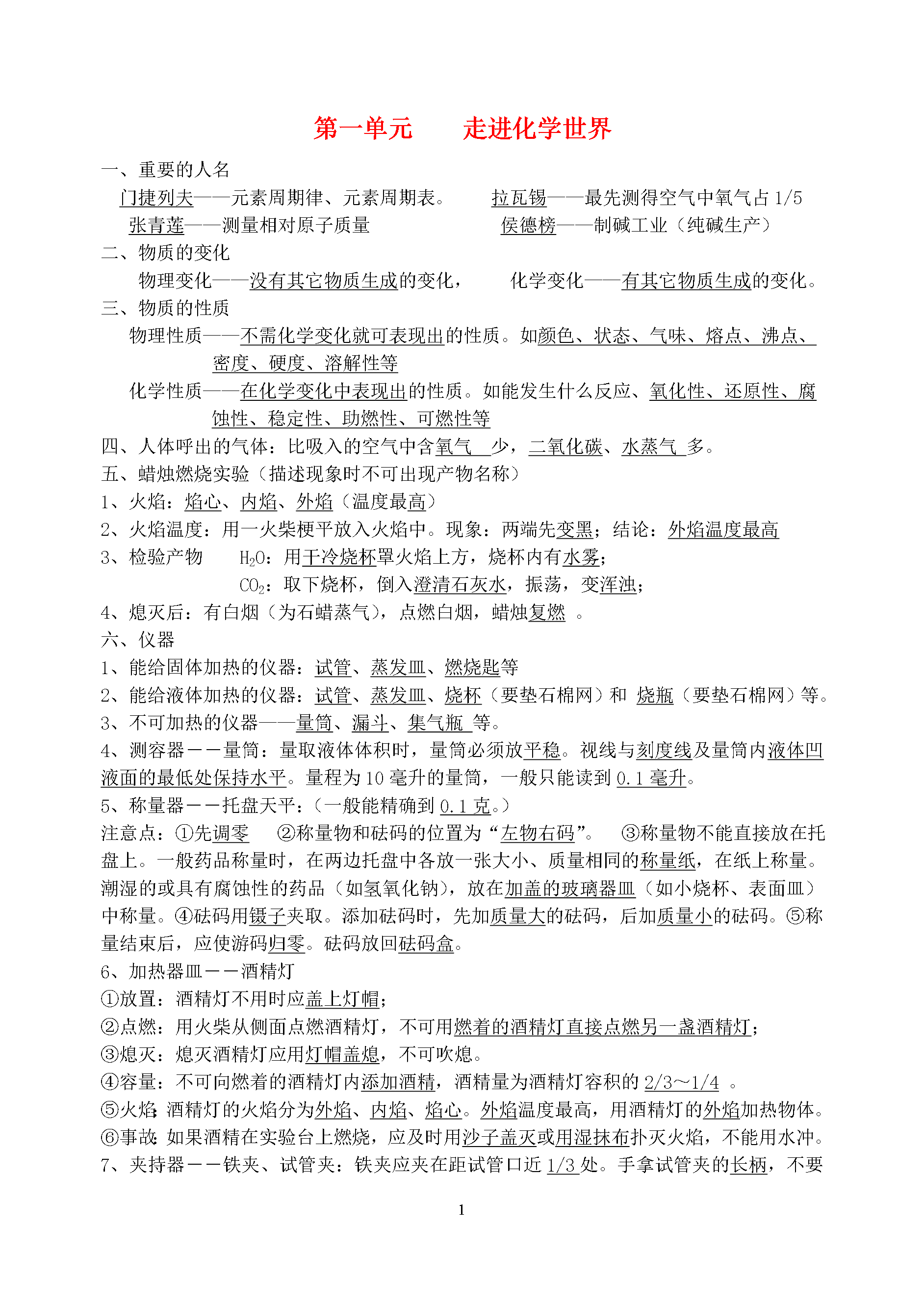 17第一单元走进化学世界一、重要的人名门捷列夫——元素周期律、元素周期表。拉瓦锡——最先测得空气中氧气占1/5张青莲——测量相对原子质量侯德榜——制碱工业(纯碱生产)二、物质的变化物理变化——没有其它物质生成的变化,化学变化——有其它物质生成的变化。三、物质的性质物理性质——不需化学变化就可表现出的性质。如颜色、状态、气味、熔点、沸点、密度、硬度、溶解性等化学性质——在化学变化中表现出的性质。如能发生什么反应、氧化性、还原性、腐蚀性、稳定性、助燃性、可燃性等四、人体呼出的气体:比吸入的空气中含氧气少,二氧化碳、水蒸气多。五、蜡烛燃烧实验(描述现象时不可出现产物名称)1、火焰:焰心、内焰、外焰(温度最高)2、火焰温度:用一火柴梗平放入火焰中。现象:两端先变黑;结论:外焰温度最高3、检验产物H2O:用干冷烧杯罩火焰上方,烧杯内有水雾;CO2:取下烧杯,倒入澄清石灰水,振荡,变浑浊;4、熄灭后:有白烟(为石蜡蒸气),点燃白烟,蜡烛复燃。六、仪器1、能给固体加热的仪器:试管、蒸发皿、燃烧匙等2、能给液体加热的仪器:试管、蒸发皿、烧杯(要垫石棉网)和烧瓶(要垫石棉网)等。3、不可加热的仪器——量筒、漏斗、集气瓶等。4、测容器--量筒:量取液体体积时,量筒必须放平稳。视线与刻度线及量筒内液体凹液面的最低处保持水平。量程为10毫升的量筒,一般只能读到0.1毫升。5、称量器--托盘天平:(一般能精确到0.1克。)注意点:①先调零②称量物和砝码的位置为“左物右码”。③称量物不能直接放在托盘上。一般药品称量时,在两边托盘中各放一张大小、质量相同的称量纸,在纸上称量。潮湿的或具有腐蚀性的药品(如氢氧化钠),放在加盖的玻璃器皿(如小烧杯、表面皿)中称量。④砝码用镊子夹取。添加砝码时,先加质量大的砝码,后加质量小的砝码。⑤称量结束后,应使游码归零。砝码放回砝码盒。6、加热器皿--酒精灯①放置:酒精灯不用时应盖上灯帽;②点燃:用火柴从侧面点燃酒精灯,不可用燃着的酒精灯直接点燃另一盏酒精灯;③熄灭:熄灭酒精灯应用灯帽盖熄,不可吹熄。④容量:不可向燃着的酒精灯内添加酒精,酒精量为酒精灯容积的2/3~1/4。⑤火焰:酒精灯的火焰分为外焰、内焰、焰心。外焰温度最高,用酒精灯的外焰加热物体。⑥事故:如果酒精在实验台上燃烧,应及时用沙子盖灭或用湿抹布扑灭火焰,不能用水冲。7、夹持器--铁夹、试管夹:铁夹应夹在距试管口近1/3处。手拿试管夹的长柄,不要把拇指按在短柄上。夹持试管时,应将试管夹从试管底部往上套;夹在距试管口近1/3处。8、加液的仪器--漏斗、长颈漏斗、分液漏斗长颈漏斗下端管口要插入液面以下,形成液封,以防止生成的气体从长颈漏斗口逸出。七、药品取用的原则1、三不:任何药品不能用手拿、舌尝、或直接用鼻闻试剂。2、节约用量:按所需取用药品。如没有说明用量,应取最少量,固体以盖满试管底部为宜,液体取1~2mL为宜。3、剩余药品:多取的试剂不可放回原瓶,也不可乱丢,更不能带出实验室,应放在另一洁净的指定的容器内。废弃物倒在废液缸里。4、事故处理:浓酸沾在皮肤上,应立即用大量水冲洗,然后涂上3%~5%的NaHCO3溶液;浓碱沾在皮肤上,应立即用大量水冲洗,然后涂上硼酸溶液。八、固体药品取用1、盛放仪器:固体药品一般放在广口瓶中,金属钠存放在煤油中,白磷存放在水中。2、取用仪器:粉末状及小粒状药品:用药匙或纸槽,块状药品:用镊子夹取3、取用方法:将试管横放,块状固体放试管口,将试管竖立。(一横二放三竖立)九、液体药品取用1、液体药品放在细口瓶中(少量的液体药品可放在滴瓶中)2、向试管中倾倒液体的方法(塞子、标签、瓶口):塞子倒放在桌上,(以免药品被污染);标签应向着手心,(以免残留液流下而腐蚀标签)。将瓶口紧靠试管口,缓缓地注入试剂,倾注完毕,盖上瓶盖,标签向外,放回原处。3、滴管的使用:a、先赶出滴管中的空气,后吸取试剂b、滴入试剂时,滴管要保持垂直悬于容器口上方滴加c、使用过程中,始终保持橡胶乳头在上,以免乳胶头被试剂腐蚀d、滴管用毕,立即用水洗涤干净(滴瓶上的滴管除外)e、胶头滴管使用时千万不能伸入容器中或与器壁接触,否则会造成试剂污染十、物质的加热1、加热固体时,试管口应略向下倾斜,先来回移动酒精灯使试管均匀受热(预热),再集中加热。铁夹应夹在距试管口近1/3处。2、加热液体时,液体体积不超过试管容积的1/3,试管与桌面约成450角,先使试管均匀受热,然后对着液体的中下部加热,并且不时地上下移动试管,为了避免伤人,切不可将试管口对着自己或他人。十一、仪器的洗涤1、玻璃仪器洗涤干净的标准:仪器上附着的水,既不聚成水滴,也不成股流下。2、玻璃仪器中附有油脂:先用热的纯碱(Na2CO3)溶液或洗衣粉洗涤,再用水冲洗。3、玻璃仪器中附有难溶于水的碱、碱性氧化物、碳酸盐
