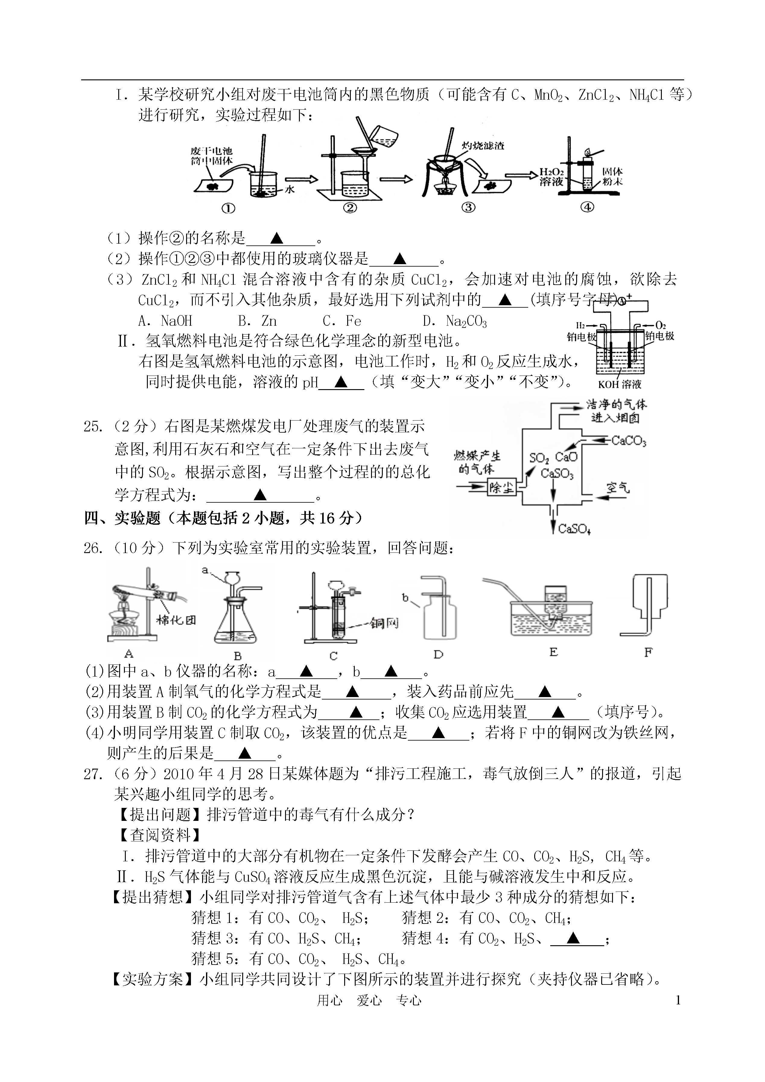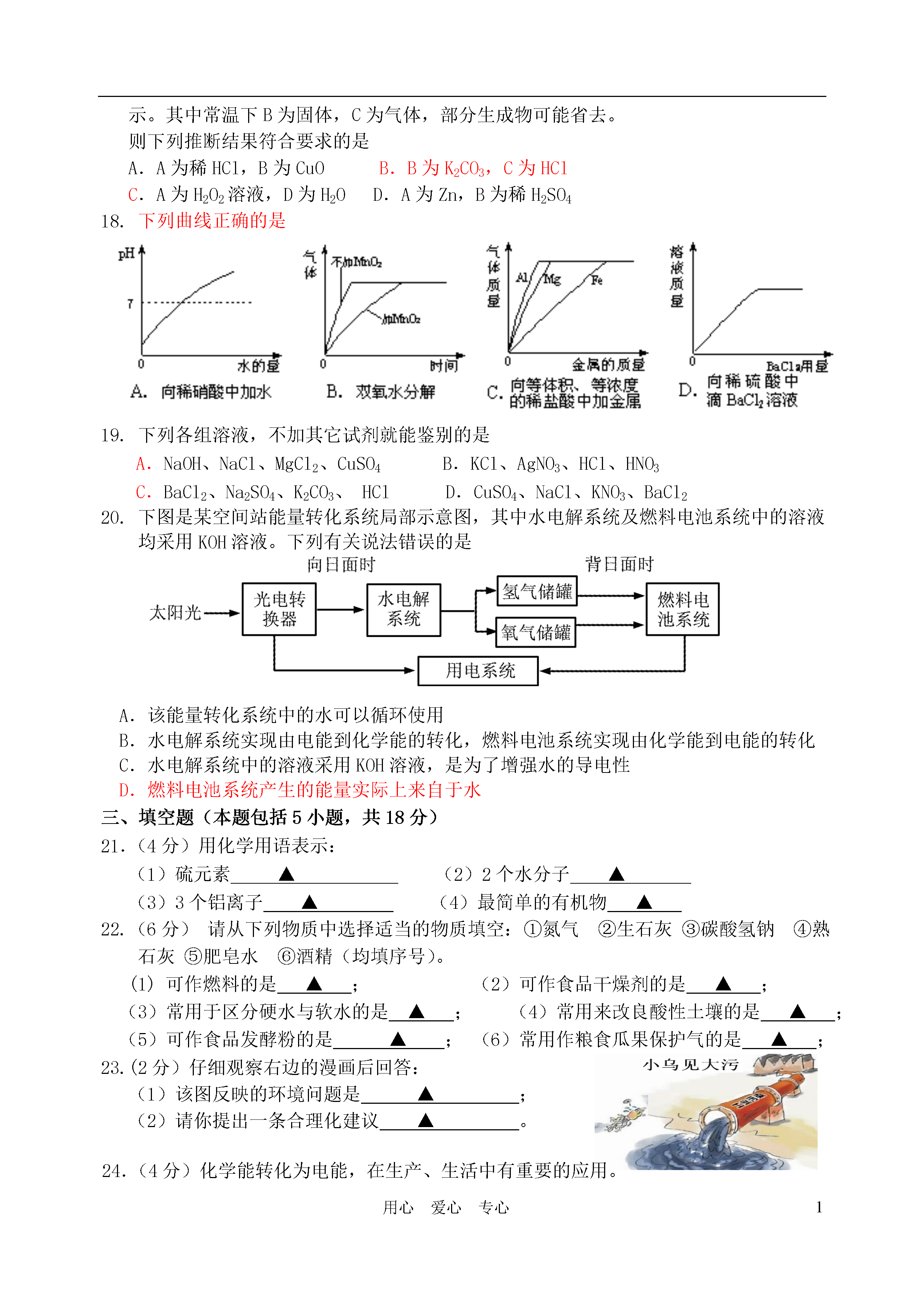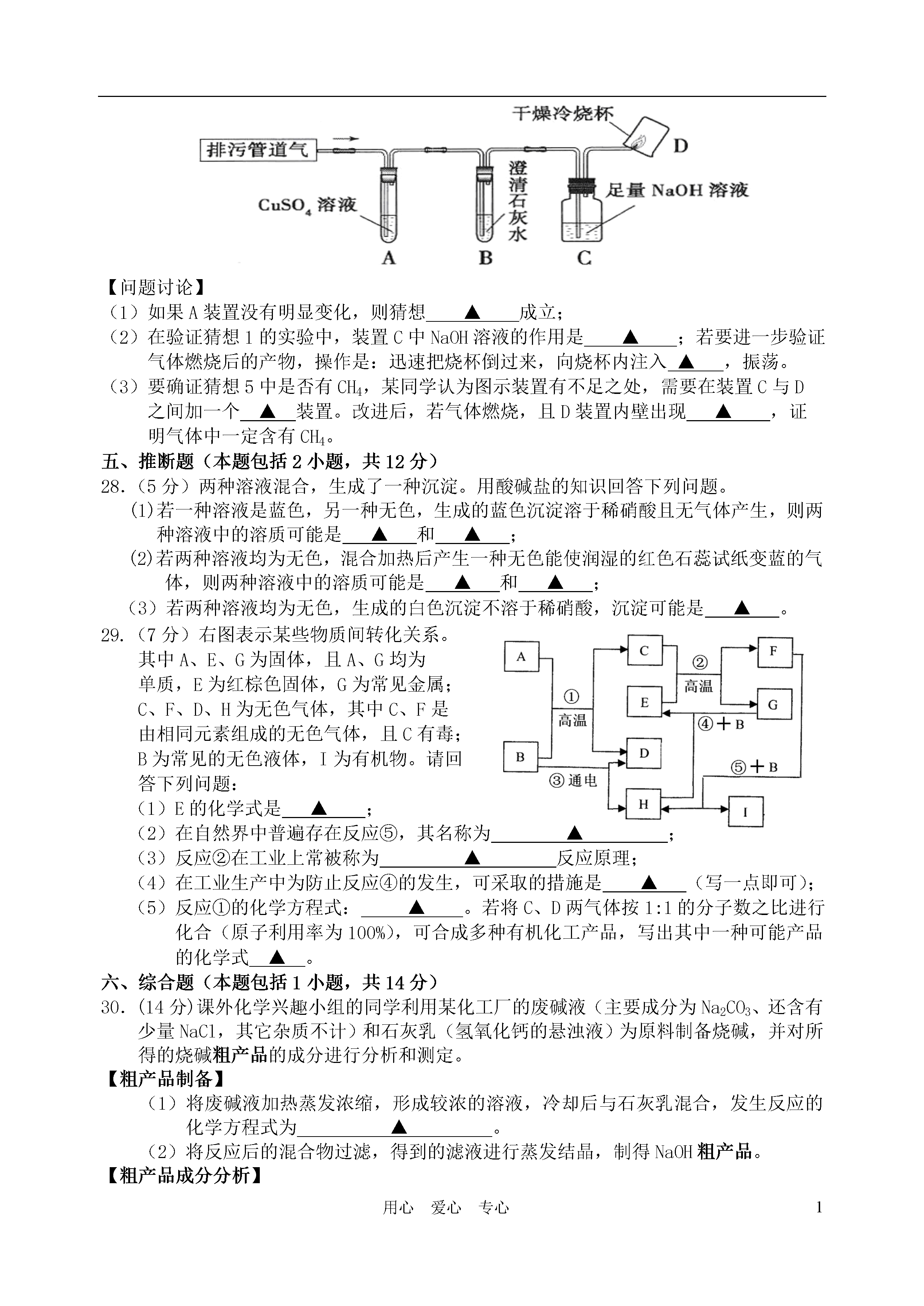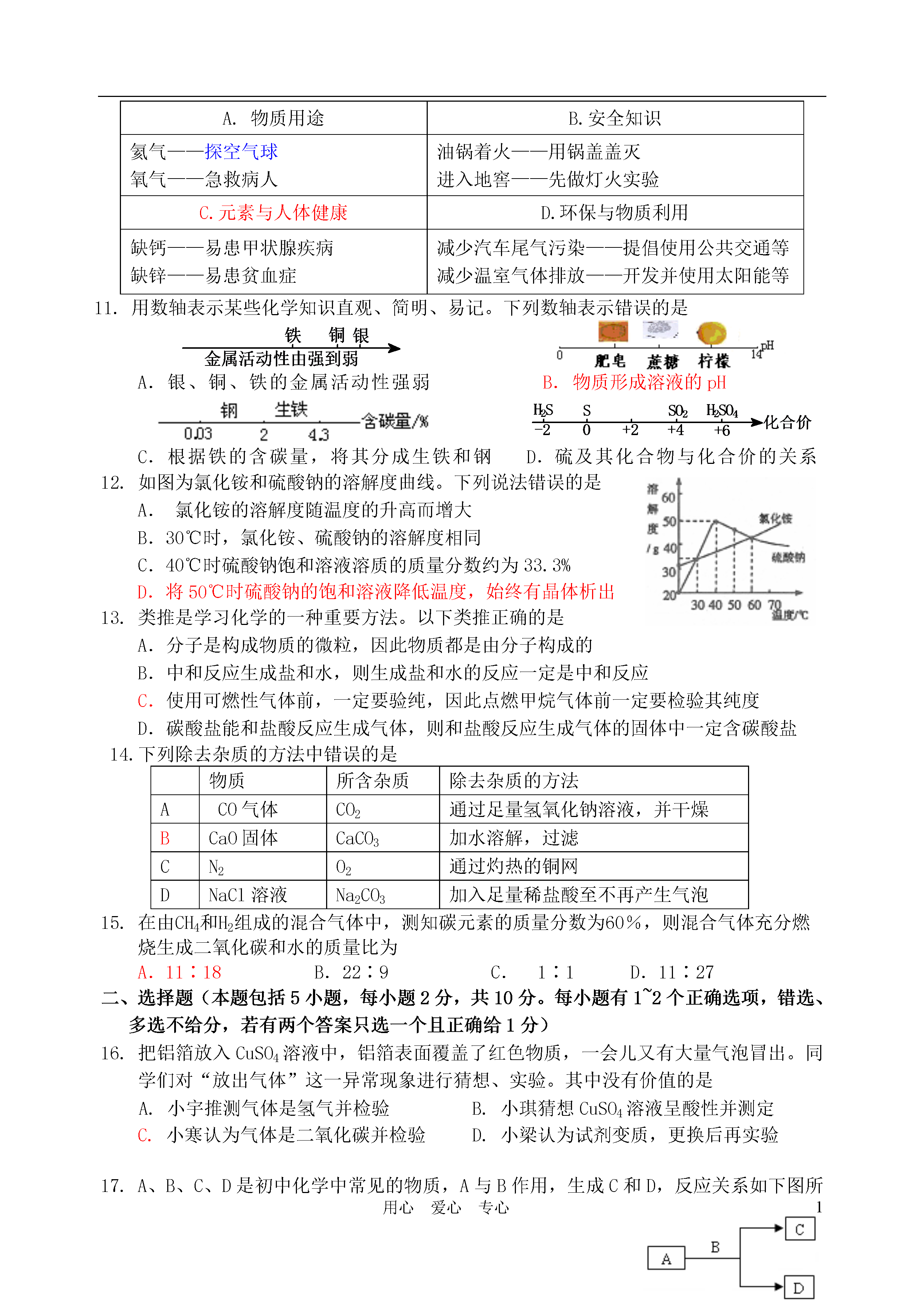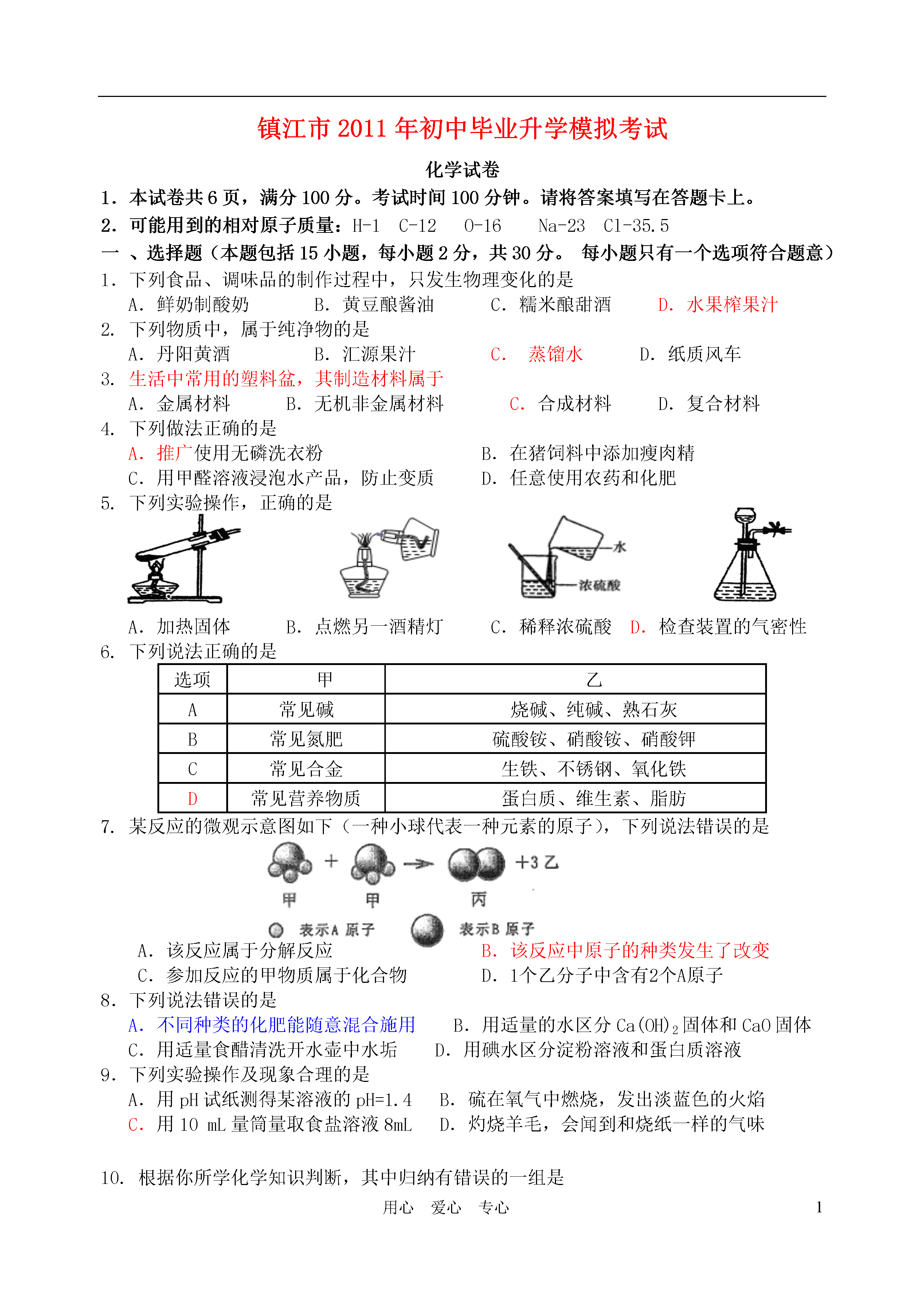 1用心爱心专心镇江市2011年初中毕业升学模拟考试化学试卷1.本试卷,满分100分。考试时间100分钟。请将答案填写在答题卡上。2.可能用到的相对原子质量:H-1C-12O-16Na-23Cl-35.5一、选择题(本题包括15小题,每小题2分,共30分。每小题只有一个选项符合题意)1.下列食品、调味品的制作过程中,只发生物理变化的是A.鲜奶制酸奶B.黄豆酿酱油C.糯米酿甜酒D.水果榨果汁2.下列物质中,属于纯净物的是A.丹阳黄酒B.汇源果汁C.蒸馏水D.纸质风车3.生活中常用的塑料盆,其制造材料属于A.金属材料B.无机非金属材料C.合成材料D.复合材料4.下列做法正确的是A.推广使用无磷洗衣粉B.在猪饲料中添加瘦肉精C.用甲醛溶液浸泡水产品,防止变质D.任意使用农药和化肥5.下列实验操作,正确的是A.加热固体B.点燃另一酒精灯C.稀释浓硫酸D.检查装置的气密性6.下列说法正确的是选项甲乙A常见碱烧碱、纯碱、熟石灰B常见氮肥硫酸铵、硝酸铵、硝酸钾C常见合金生铁、不锈钢、氧化铁D常见营养物质蛋白质、维生素、脂肪7.某反应的微观示意图如下(一种小球代表一种元素的原子),下列说法错误的是A.该反应属于分解反应B.该反应中原子的种类发生了改变C.参加反应的甲物质属于化合物D.1个乙分子中含有2个A原子8.下列说法错误的是A.不同种类的化肥能随意混合施用B.用适量的水区分Ca(OH)2固体和CaO固体C.用适量食醋清洗开水壶中水垢D.用碘水区分淀粉溶液和蛋白质溶液9.下列实验操作及现象合理的是A.用pH试纸测得某溶液的pH=1.4B.硫在氧气中燃烧,发出淡蓝色的火焰C.用10mL量筒量取食盐溶液8mLD.灼烧羊毛,会闻到和烧纸一样的气味10.根据你所学化学知识判断,其中归纳有错误的一组是A.物质用途B.安全知识氦气——探空气球氧气——急救病人油锅着火——用锅盖盖灭进入地窖——先做灯火实验C.元素与人体健康D.环保与物质利用缺钙——易患甲状腺疾病缺锌——易患贫血症减少汽车尾气污染——提倡使用公共交通等减少温室气体排放——开发并使用太阳能等11.用数轴表示某些化学知识直观、简明、易记。下列数轴表示错误的是A.银、铜、铁的金属活动性强弱B.物质形成溶液的pHC.根据铁的含碳量,将其分成生铁和钢D.硫及其化合物与化合价的关系12.如图为氯化铵和硫酸钠的溶解度曲线。下列说法错误的是A.氯化铵的溶解度随温度的升高而增大B.30℃时,氯化铵、硫酸钠的溶解度相同C.40℃时硫酸钠饱和溶液溶质的质量分数约为33.3%D.将50℃时硫酸钠的饱和溶液降低温度,始终有晶体析出13.类推是学习化学的一种重要方法。以下类推正确的是A.分子是构成物质的微粒,因此物质都是由分子构成的B.中和反应生成盐和水,则生成盐和水的反应一定是中和反应C.使用可燃性气体前,一定要验纯,因此点燃甲烷气体前一定要检验其纯度D.碳酸盐能和盐酸反应生成气体,则和盐酸反应生成气体的固体中一定含碳酸盐14.下列除去杂质的方法中错误的是物质所含杂质除去杂质的方法ACO气体CO2通过足量氢氧化钠溶液,并干燥BCaO固体CaCO3加水溶解,过滤CN2O2通过灼热的铜网DNaCl溶液Na2CO3加入足量稀盐酸至不再产生气泡15.在由CH4和H2组成的混合气体中,测知碳元素的质量分数为60%,则混合气体充分燃烧生成二氧化碳和水的质量比为A.11∶18B.22∶9C.1∶1D.11∶27二、选择题(本题包括5小题,每小题2分,共10分。每小题有1~2个正确选项,错选、多选不给分,若有两个答案只选一个且正确给1分)16.把铝箔放入CuSO4溶液中,铝箔表面覆盖了红色物质,一会儿又有大量气泡冒出。同学们对“放出气体”这一异常现象进行猜想、实验。其中没有价值的是A.小宇推测气体是氢气并检验B.小琪猜想CuSO4溶液呈酸性并测定C.小寒认为气体是二氧化碳并检验D.小梁认为试剂变质,更换后再实验17.A、B、C、D是初中化学中常见的物质,A与B作用,生成C和D,反应关系如下图所示。其中常温下B为固体,C为气体,部分生成物可能省去。则下列推断结果符合要求的是A.A为稀HCl,B为CuOB.B为K2CO3,C为HClC.A为H2O2溶液,D为H2OD.A为Zn,B为稀H2SO418.下列曲线正确的是19.下列各组溶液,不加其它试剂就能鉴别的是A.NaOH、NaCl、MgCl2、CuSO4B.KCl、AgNO3、HCl、HNO3C.BaCl2、Na2SO4、K2CO3、HClD.CuSO4、NaCl、KNO3、BaCl220.下图是某空间站能量