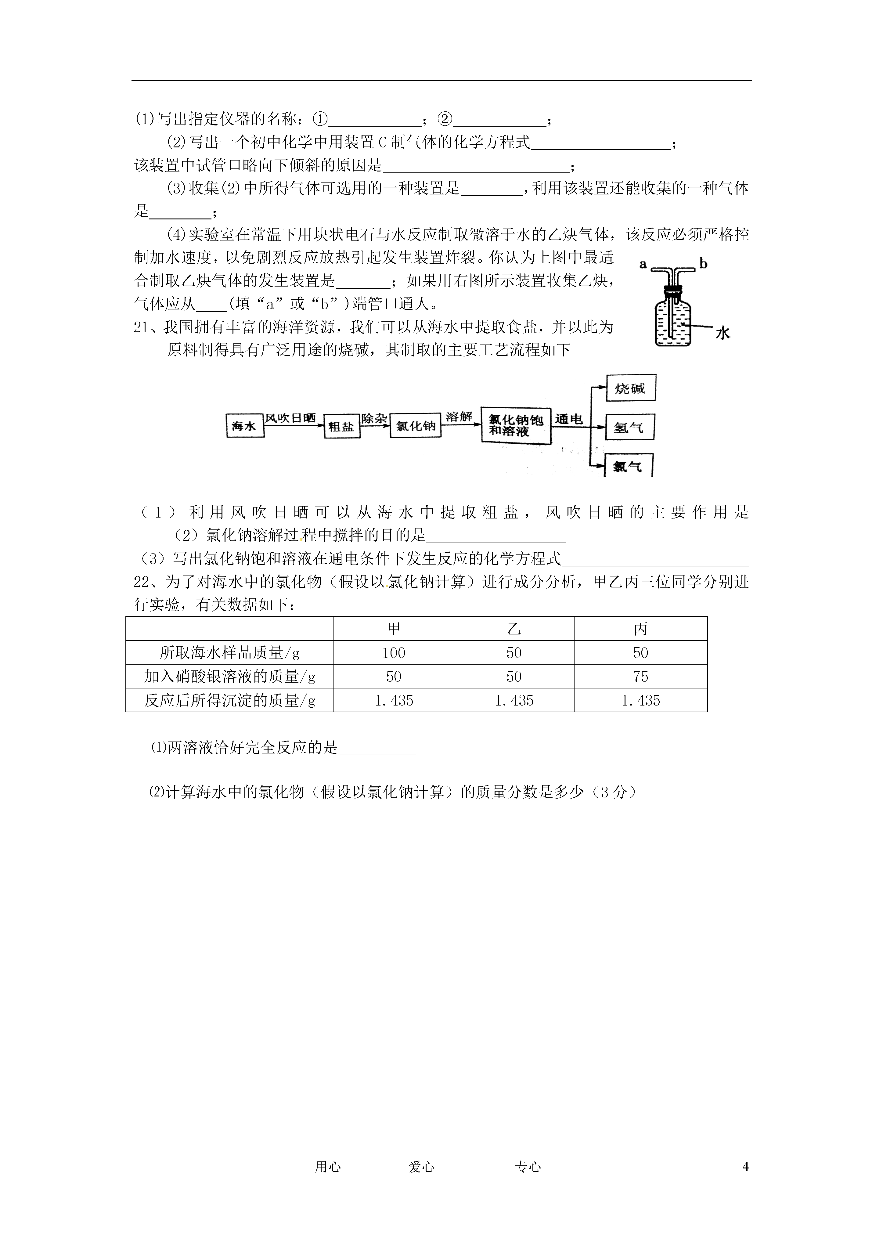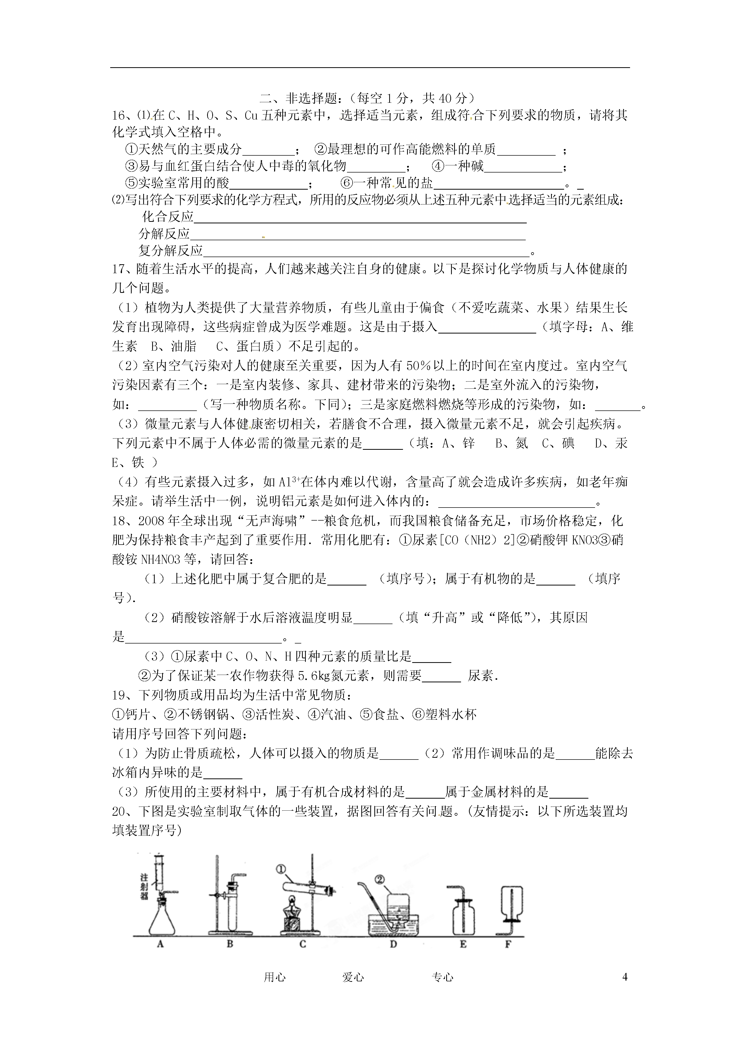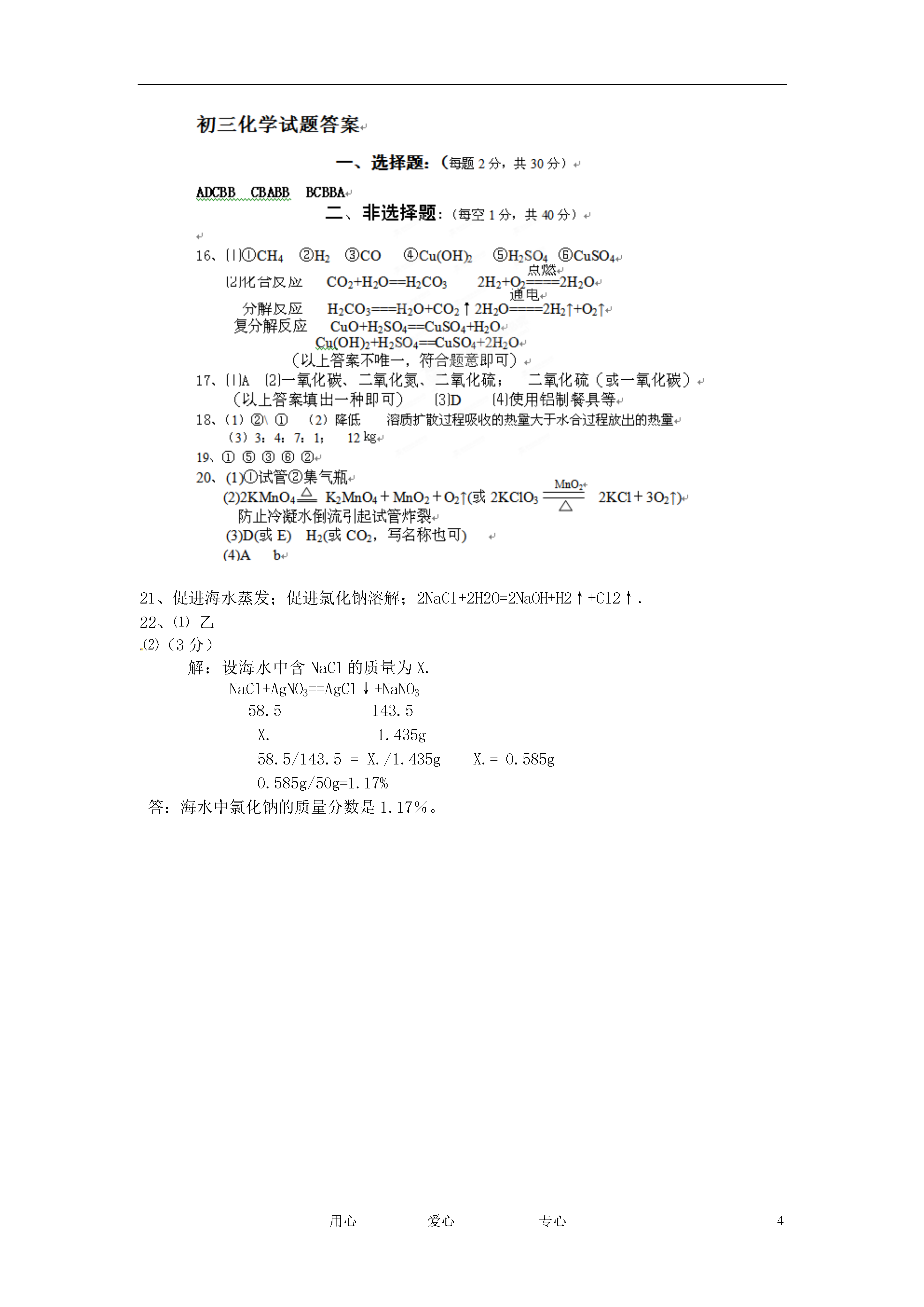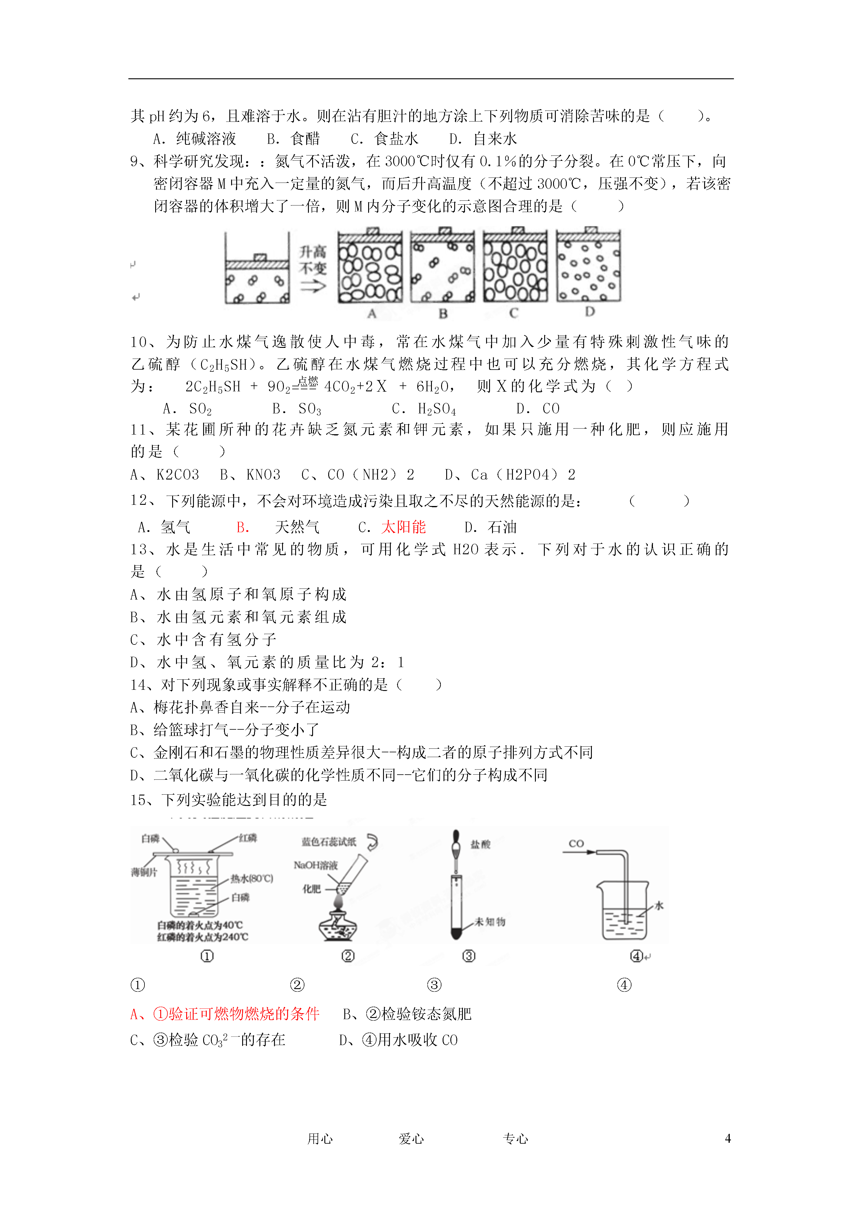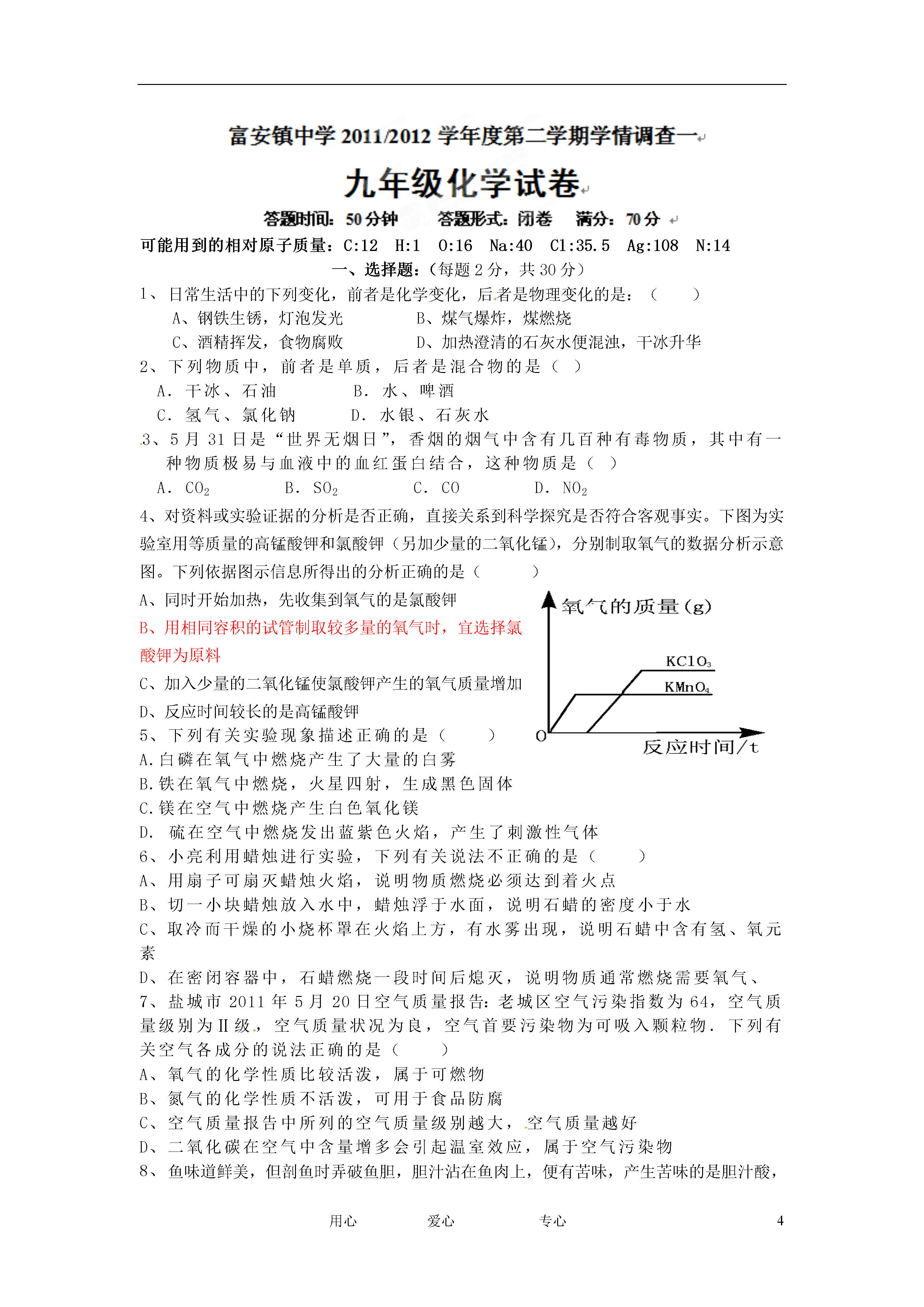 4用心爱心专心可能用到的相对原子质量:C:12H:1O:16Na:40Cl:35.5Ag:108N:14一、选择题:(每题2分,共30分)1、日常生活中的下列变化,前者是化学变化,后者是物理变化的是:()A、钢铁生锈,灯泡发光B、煤气爆炸,煤燃烧C、酒精挥发,食物腐败D、加热澄清的石灰水便混浊,干冰升华2、下列物质中,前者是单质,后者是混合物的是()A.干冰、石油B.水、啤酒C.氢气、氯化钠D.水银、石灰水3、5月31日是“世界无烟日”,香烟的烟气中含有几百种有毒物质,其中有一种物质极易与血液中的血红蛋白结合,这种物质是()A.CO2B.SO2C.COD.NO24、对资料或实验证据的分析是否正确,直接关系到科学探究是否符合客观事实。下图为实验室用等质量的高锰酸钾和氯酸钾(另加少量的二氧化锰),分别制取氧气的数据分析示意图。下列依据图示信息所得出的分析正确的是()A、同时开始加热,先收集到氧气的是氯酸钾B、用相同容积的试管制取较多量的氧气时,宜选择氯酸钾为原料C、加入少量的二氧化锰使氯酸钾产生的氧气质量增加D、反应时间较长的是高锰酸钾5、下列有关实验现象描述正确的是()A.白磷在氧气中燃烧产生了大量的白雾B.铁在氧气中燃烧,火星四射,生成黑色固体C.镁在空气中燃烧产生白色氧化镁D.硫在空气中燃烧发出蓝紫色火焰,产生了刺激性气体6、小亮利用蜡烛进行实验,下列有关说法不正确的是()A、用扇子可扇灭蜡烛火焰,说明物质燃烧必须达到着火点B、切一小块蜡烛放入水中,蜡烛浮于水面,说明石蜡的密度小于水C、取冷而干燥的小烧杯罩在火焰上方,有水雾出现,说明石蜡中含有氢、氧元素D、在密闭容器中,石蜡燃烧一段时间后熄灭,说明物质通常燃烧需要氧气、7、盐城市2011年5月20日空气质量报告:老城区空气污染指数为64,空气质量级别为Ⅱ级,空气质量状况为良,空气首要污染物为可吸入颗粒物.下列有关空气各成分的说法正确的是()A、氧气的化学性质比较活泼,属于可燃物B、氮气的化学性质不活泼,可用于食品防腐C、空气质量报告中所列的空气质量级别越大,空气质量越好D、二氧化碳在空气中含量增多会引起温室效应,属于空气污染物8、鱼味道鲜美,但剖鱼时弄破鱼胆,胆汁沾在鱼肉上,便有苦味,产生苦味的是胆汁酸,其pH约为6,且难溶于水。则在沾有胆汁的地方涂上下列物质可消除苦味的是()。A.纯碱溶液B.食醋C.食盐水D.自来水9、科学研究发现::氮气不活泼,在3000℃时仅有0.1%的分子分裂。在0℃常压下,向密闭容器M中充入一定量的氮气,而后升高温度(不超过3000℃,压强不变),若该密闭容器的体积增大了一倍,则M内分子变化的示意图合理的是()点燃10、为防止水煤气逸散使人中毒,常在水煤气中加入少量有特殊刺激性气味的乙硫醇(C2H5SH)。乙硫醇在水煤气燃烧过程中也可以充分燃烧,其化学方程式为:2C2H5SH+9O2===4CO2+2Ⅹ+6H2O,则Ⅹ的化学式为()A.SO2B.SO3C.H2SO4D.CO11、某花圃所种的花卉缺乏氮元素和钾元素,如果只施用一种化肥,则应施用的是()A、K2CO3B、KNO3C、CO(NH2)2D、Ca(H2PO4)212、下列能源中,不会对环境造成污染且取之不尽的天然能源的是:()A.氢气B.天然气C.太阳能D.石油13、水是生活中常见的物质,可用化学式H2O表示.下列对于水的认识正确的是()A、水由氢原子和氧原子构成B、水由氢元素和氧元素组成C、水中含有氢分子D、水中氢、氧元素的质量比为2:114、对下列现象或事实解释不正确的是()A、梅花扑鼻香自来--分子在运动B、给篮球打气--分子变小了C、金刚石和石墨的物理性质差异很大--构成二者的原子排列方式不同D、二氧化碳与一氧化碳的化学性质不同--它们的分子构成不同15、下列实验能达到目的的是①②③④A、①验证可燃物燃烧的条件B、②检验铵态氮肥C、③检验CO32一的存在D、④用水吸收CO二、非选择题:(每空1分,共40分)16、⑴在C、H、O、S、Cu五种元素中,选择适当元素,组成符合下列要求的物质,请将其化学式填入空格中。①天然气的主要成分;②最理想的可作高能燃料的单质;③易与血红蛋白结合使人中毒的氧化物;④一种碱;⑤实验室常用的酸;⑥一种常见的盐。⑵写出符合下列要求的化学方程式,所用的反应物必须从上述五种元素中选择适当的元素组成:化合反应分解反应复分解反应。17、随着生活水平的提高,人们越来越关注自身的健康。以下是探讨化学物质与人体健康的几个问题。(1)植物为人类提供了大量营养物质,有些儿童由于偏食(不爱吃蔬菜、水果)结果生长发育出现障碍,这些