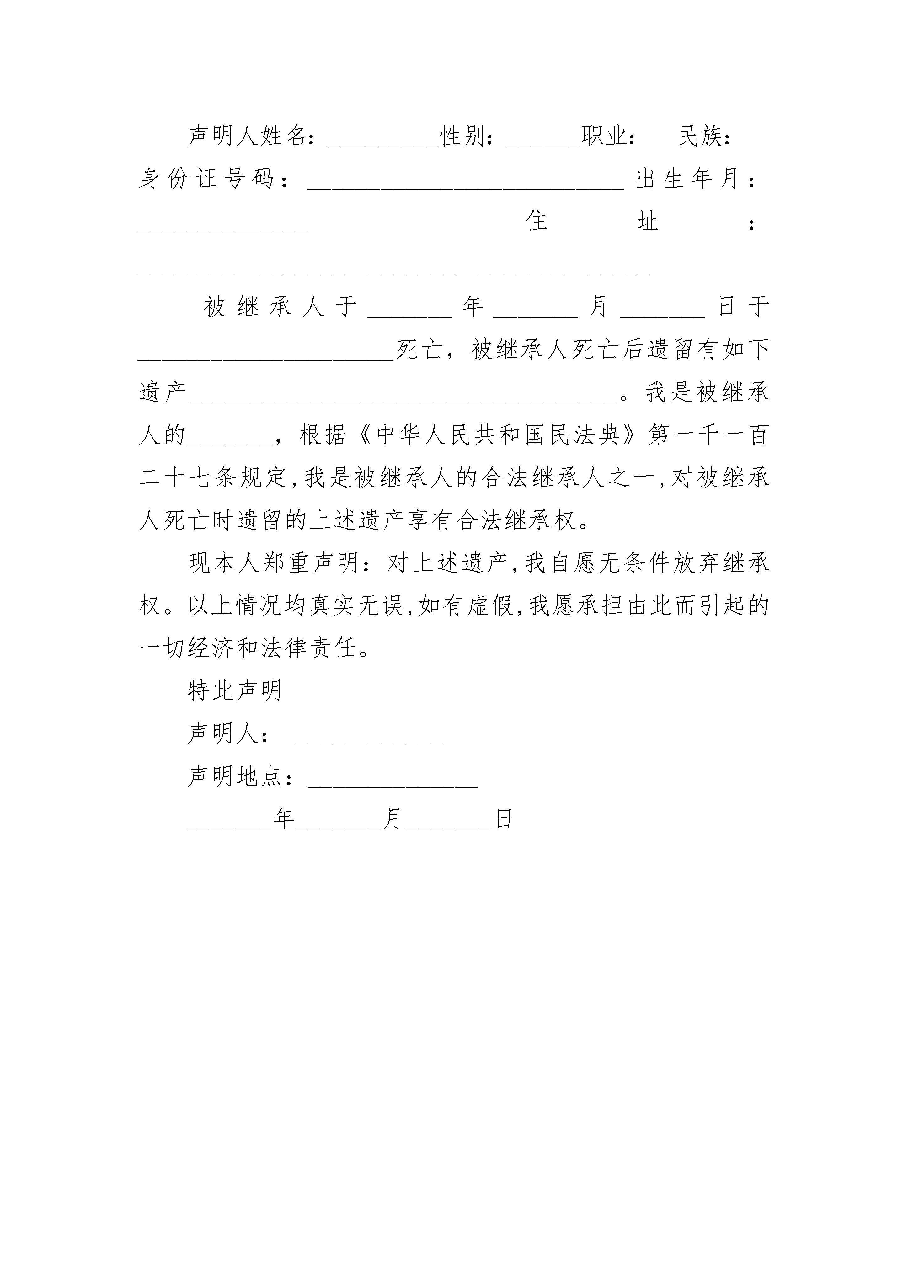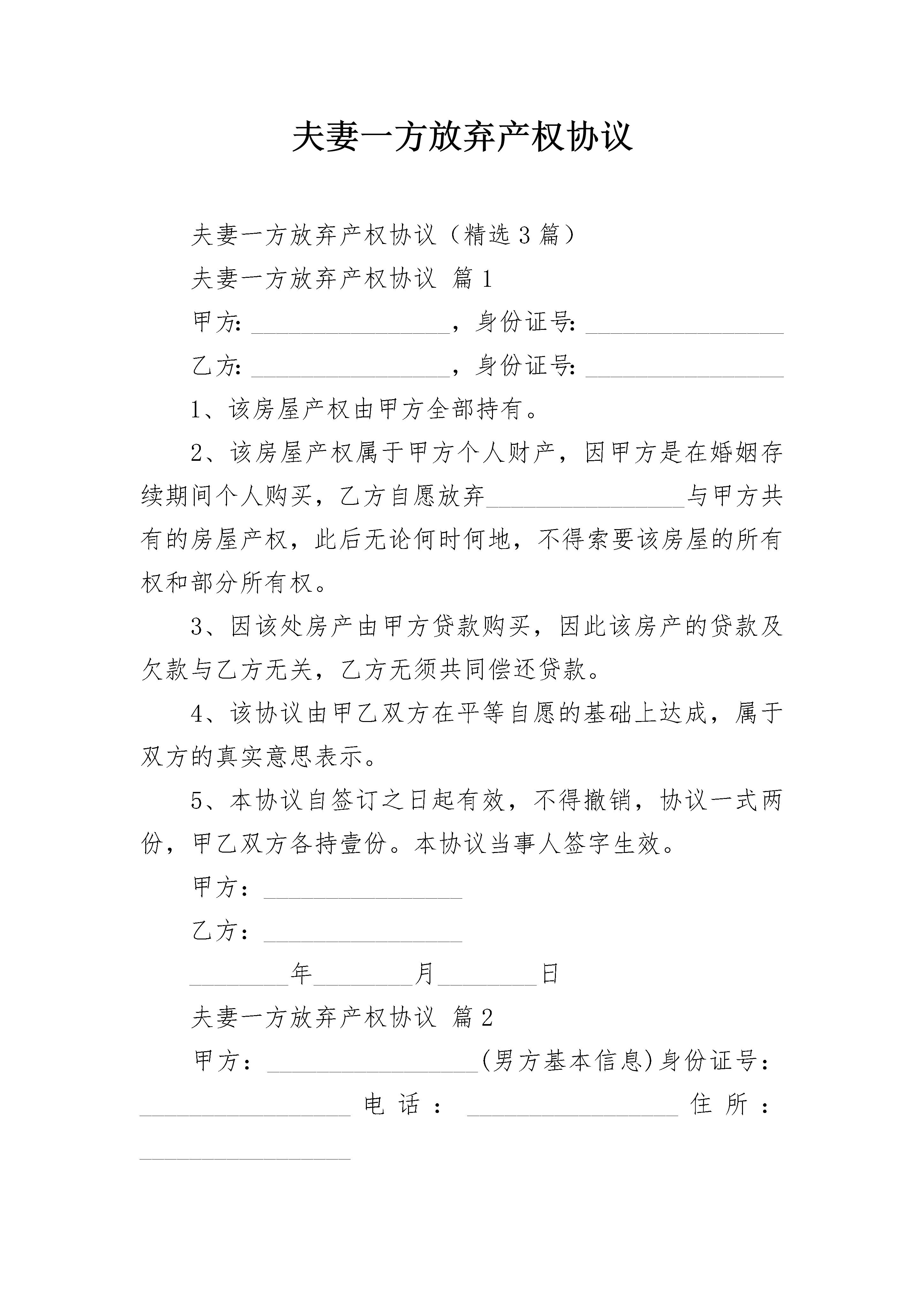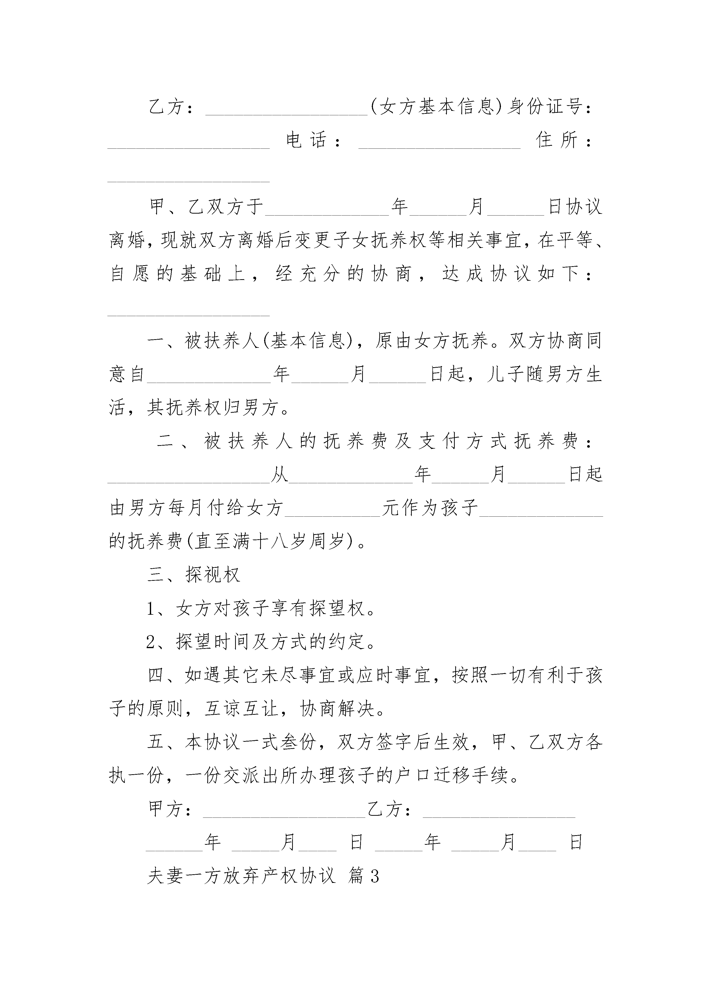 夫妻一方放弃产权协议夫妻一方放弃产权协议(精选3篇)夫妻一方放弃产权协议篇1甲方:________________,身份证号:________________乙方:________________,身份证号:________________1、该房屋产权由甲方全部持有。2、该房屋产权属于甲方个人财产,因甲方是在婚姻存续期间个人购买,乙方自愿放弃________________与甲方共有的房屋产权,此后无论何时何地,不得索要该房屋的所有权和部分所有权。3、因该处房产由甲方贷款购买,因此该房产的贷款及欠款与乙方无关,乙方无须共同偿还贷款。4、该协议由甲乙双方在平等自愿的基础上达成,属于双方的真实意思表示。5、本协议自签订之日起有效,不得撤销,协议一式两份,甲乙双方各持壹份。本协议当事人签字生效。甲方:________________乙方:________________________年________月________日夫妻一方放弃产权协议篇2甲方:_________________(男方基本信息)身份证号:_________________电话:_________________住所:_________________乙方:_________________(女方基本信息)身份证号:_________________电话:_________________住所:_________________甲、乙双方于_____________年______月______日协议离婚,现就双方离婚后变更子女抚养权等相关事宜,在平等、自愿的基础上,经充分的协商,达成协议如下:_________________一、被扶养人(基本信息),原由女方抚养。双方协商同意自_____________年______月______日起,儿子随男方生活,其抚养权归男方。二、被扶养人的抚养费及支付方式抚养费:_________________从_____________年______月______日起由男方每月付给女方__________元作为孩子_____________的抚养费(直至满十八岁周岁)。三、探视权1、女方对孩子享有探望权。2、探望时间及方式的约定。四、如遇其它未尽事宜或应时事宜,按照一切有利于孩子的原则,互谅互让,协商解决。五、本协议一式叁份,双方签字后生效,甲、乙双方各执一份,一份交派出所办理孩子的户口迁移手续。甲方:_________________乙方:______________________年_____月____日_____年_____月____日夫妻一方放弃产权协议篇3声明人姓名:_________性别:______职业:民族:身份证号码:__________________________出生年月:______________住址:__________________________________________被继承人于_______年_______月_______日于_____________________死亡,被继承人死亡后遗留有如下遗产___________________________________。我是被继承人的_______,根据《中华人民共和国民法典》第一千一百二十七条规定,我是被继承人的合法继承人之一,对被继承人死亡时遗留的上述遗产享有合法继承权。现本人郑重声明:对上述遗产,我自愿无条件放弃继承权。以上情况均真实无误,如有虚假,我愿承担由此而引起的一切经济和法律责任。特此声明声明人:______________声明地点:_____________________年_______月_______日
