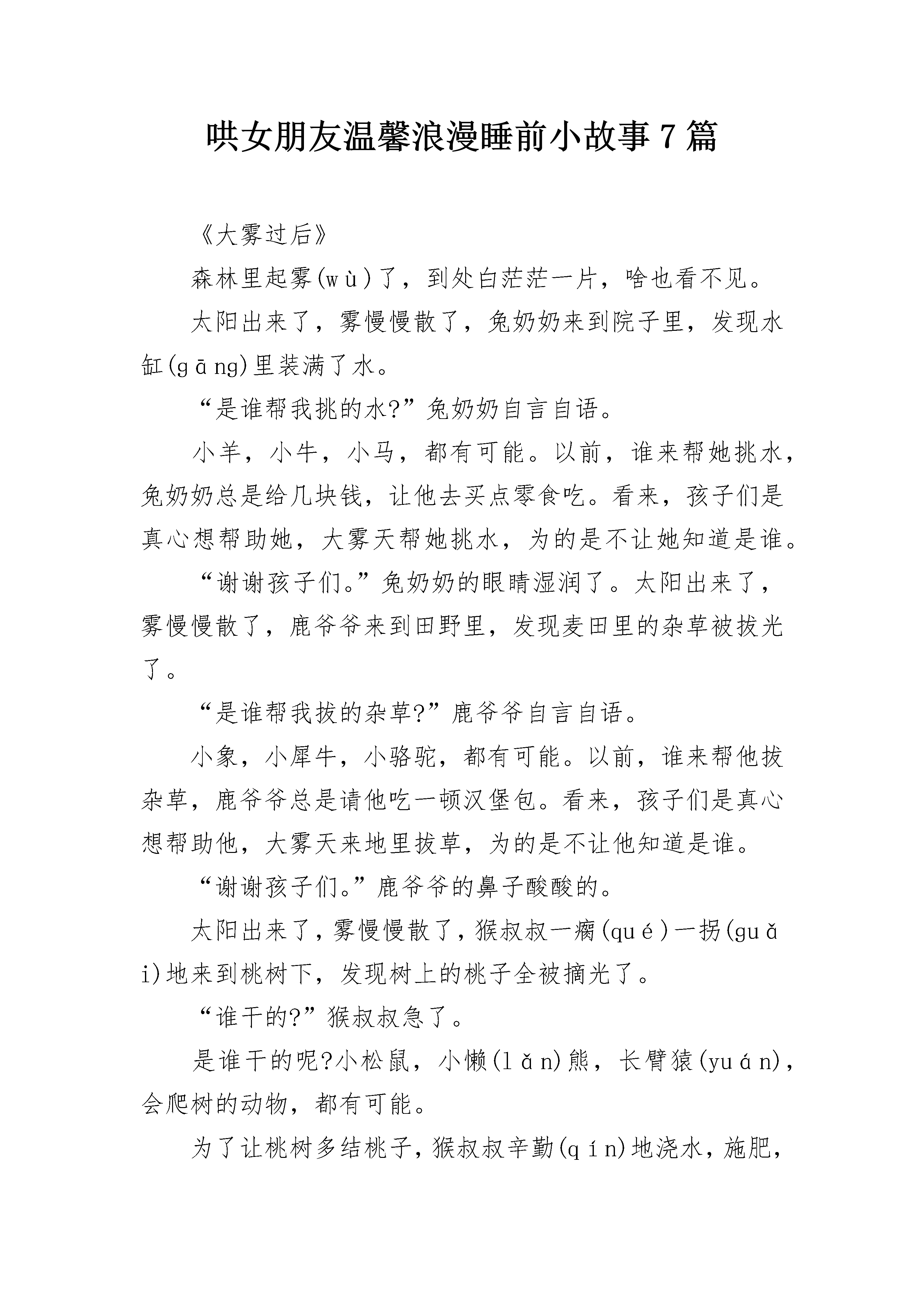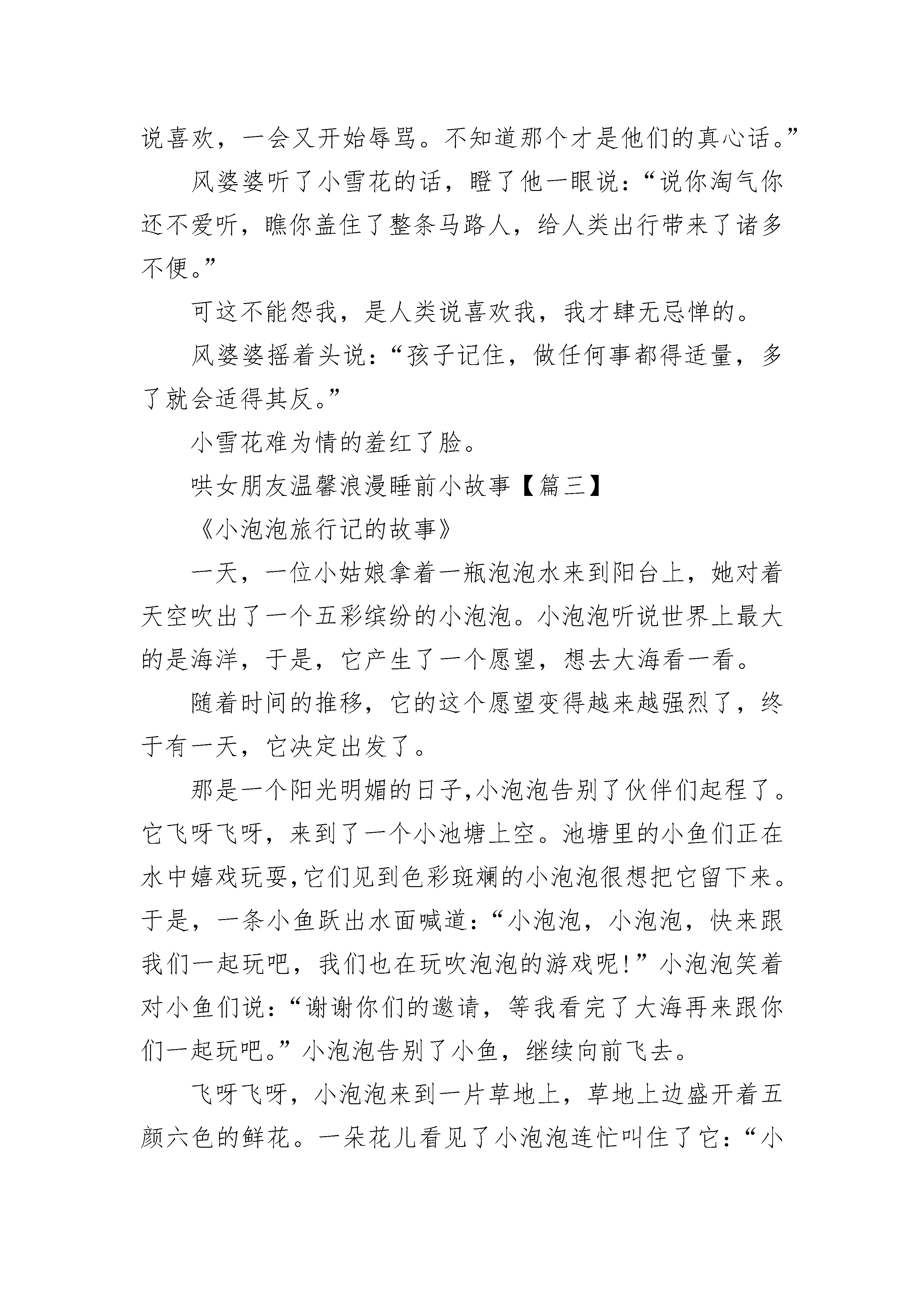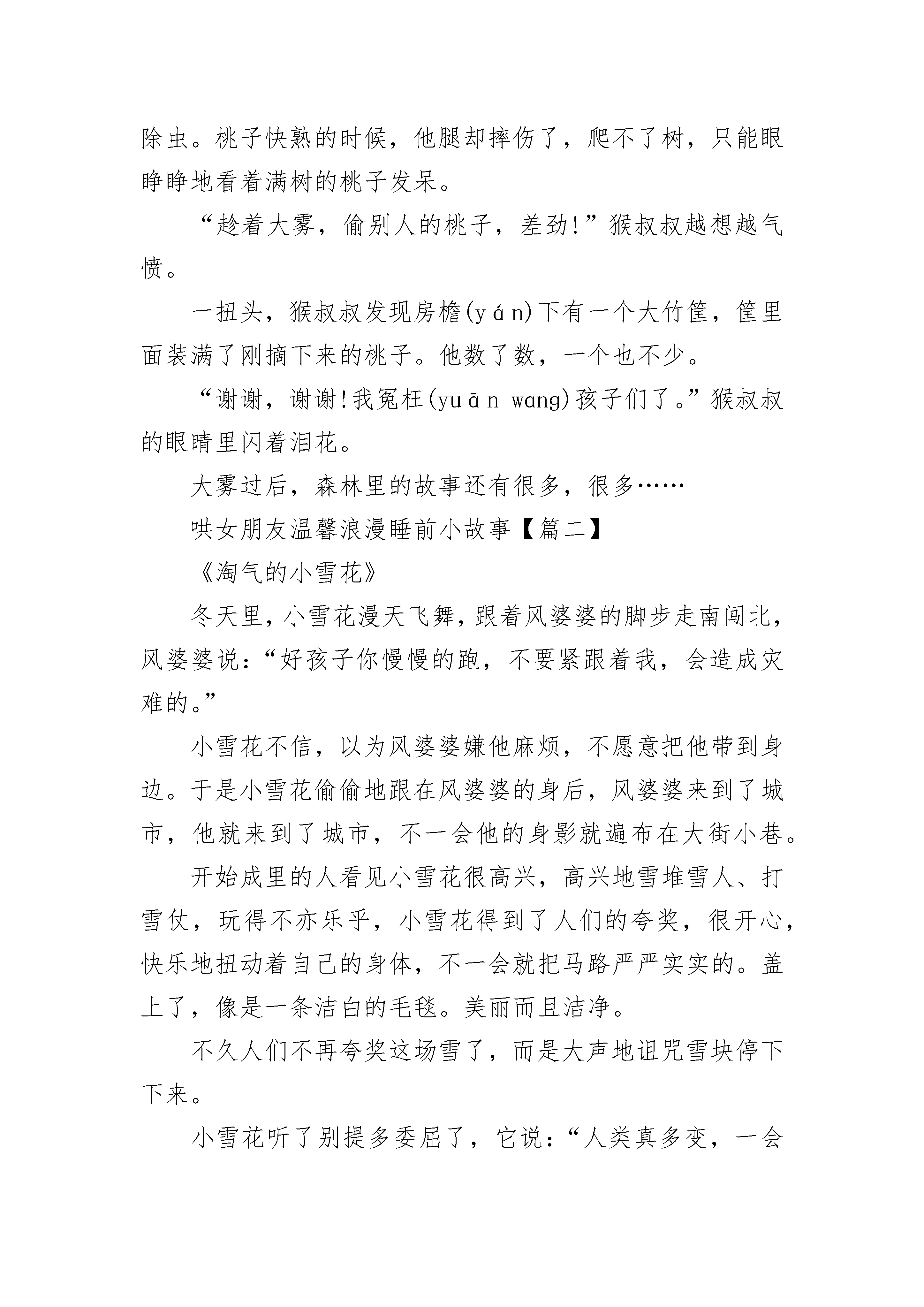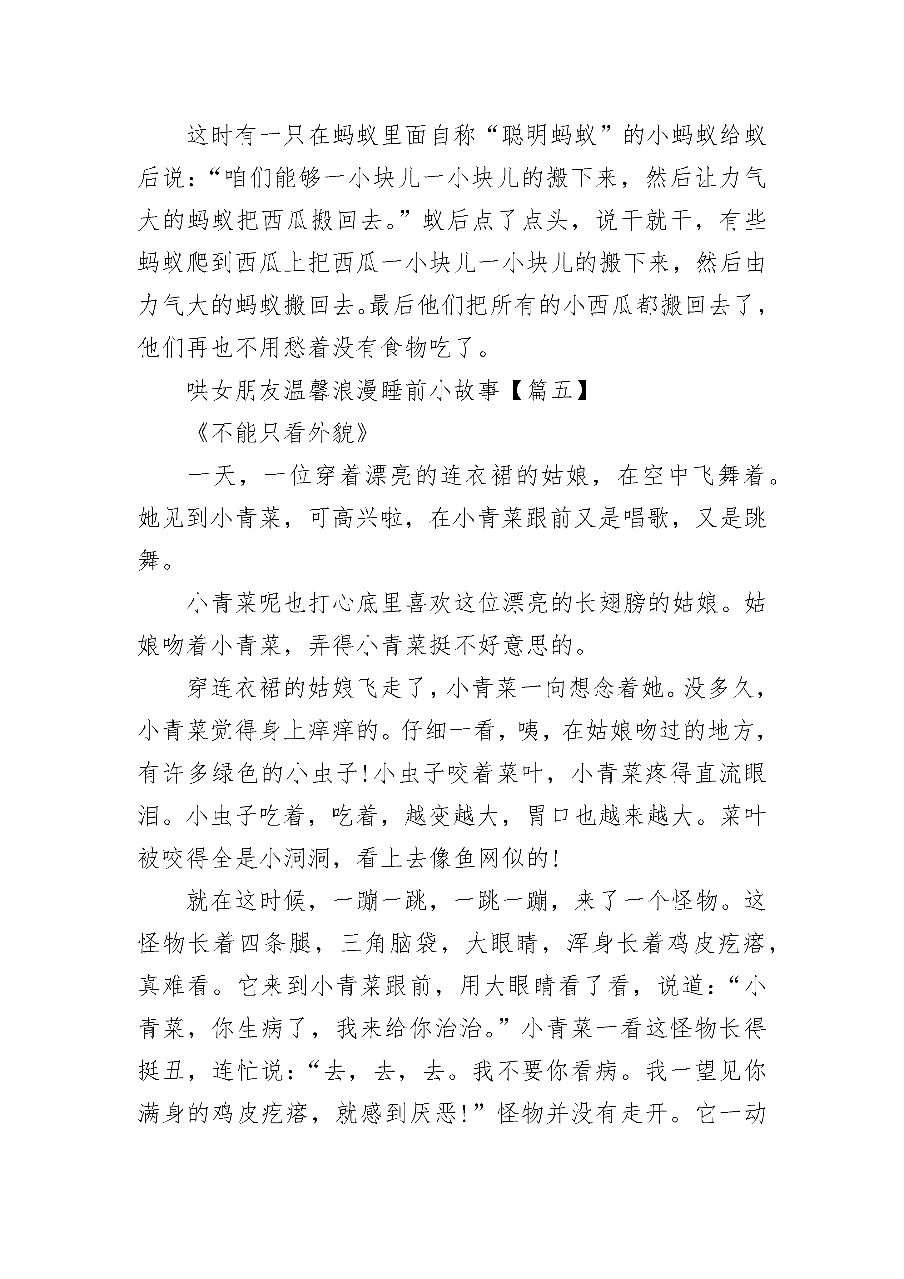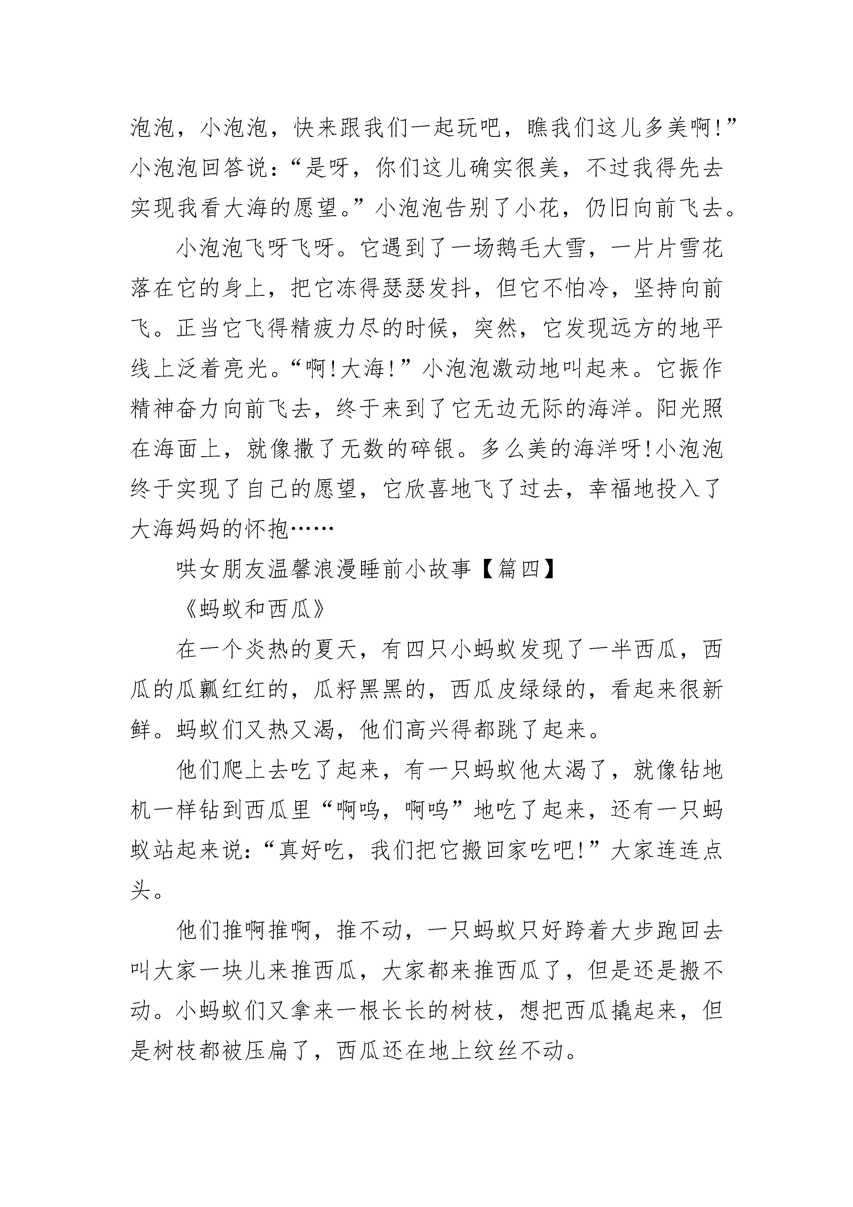 哄女朋友温馨浪漫睡前小故事7篇《大雾过后》森林里起雾(wù)了,到处白茫茫一片,啥也看不见。太阳出来了,雾慢慢散了,兔奶奶来到院子里,发现水缸(ɡānɡ)里装满了水。“是谁帮我挑的水?”兔奶奶自言自语。小羊,小牛,小马,都有可能。以前,谁来帮她挑水,兔奶奶总是给几块钱,让他去买点零食吃。看来,孩子们是真心想帮助她,大雾天帮她挑水,为的是不让她知道是谁。“谢谢孩子们。”兔奶奶的眼睛湿润了。太阳出来了,雾慢慢散了,鹿爷爷来到田野里,发现麦田里的杂草被拔光了。“是谁帮我拔的杂草?”鹿爷爷自言自语。小象,小犀牛,小骆驼,都有可能。以前,谁来帮他拔杂草,鹿爷爷总是请他吃一顿汉堡包。看来,孩子们是真心想帮助他,大雾天来地里拔草,为的是不让他知道是谁。“谢谢孩子们。”鹿爷爷的鼻子酸酸的。太阳出来了,雾慢慢散了,猴叔叔一瘸(qué)一拐(ɡuǎi)地来到桃树下,发现树上的桃子全被摘光了。“谁干的?”猴叔叔急了。是谁干的呢?小松鼠,小懒(lǎn)熊,长臂猿(yuán),会爬树的动物,都有可能。为了让桃树多结桃子,猴叔叔辛勤(qín)地浇水,施肥,除虫。桃子快熟的时候,他腿却摔伤了,爬不了树,只能眼睁睁地看着满树的桃子发呆。“趁着大雾,偷别人的桃子,差劲!”猴叔叔越想越气愤。一扭头,猴叔叔发现房檐(yán)下有一个大竹筐,筐里面装满了刚摘下来的桃子。他数了数,一个也不少。“谢谢,谢谢!我冤枉(yuānwɑnɡ)孩子们了。”猴叔叔的眼睛里闪着泪花。大雾过后,森林里的故事还有很多,很多……哄女朋友温馨浪漫睡前小故事【篇二】《淘气的小雪花》冬天里,小雪花漫天飞舞,跟着风婆婆的脚步走南闯北,风婆婆说:“好孩子你慢慢的跑,不要紧跟着我,会造成灾难的。”小雪花不信,以为风婆婆嫌他麻烦,不愿意把他带到身边。于是小雪花偷偷地跟在风婆婆的身后,风婆婆来到了城市,他就来到了城市,不一会他的身影就遍布在大街小巷。开始成里的人看见小雪花很高兴,高兴地雪堆雪人、打雪仗,玩得不亦乐乎,小雪花得到了人们的夸奖,很开心,快乐地扭动着自己的身体,不一会就把马路严严实实的。盖上了,像是一条洁白的毛毯。美丽而且洁净。不久人们不再夸奖这场雪了,而是大声地诅咒雪块停下下来。小雪花听了别提多委屈了,它说:“人类真多变,一会说喜欢,一会又开始辱骂。不知道那个才是他们的真心话。”风婆婆听了小雪花的话,瞪了他一眼说:“说你淘气你还不爱听,瞧你盖住了整条马路人,给人类出行带来了诸多不便。”可这不能怨我,是人类说喜欢我,我才肆无忌惮的。风婆婆摇着头说:“孩子记住,做任何事都得适量,多了就会适得其反。”小雪花难为情的羞红了脸。哄女朋友温馨浪漫睡前小故事【篇三】《小泡泡旅行记的故事》一天,一位小姑娘拿着一瓶泡泡水来到阳台上,她对着天空吹出了一个五彩缤纷的小泡泡。小泡泡听说世界上最大的是海洋,于是,它产生了一个愿望,想去大海看一看。随着时间的推移,它的这个愿望变得越来越强烈了,终于有一天,它决定出发了。那是一个阳光明媚的日子,小泡泡告别了伙伴们起程了。它飞呀飞呀,来到了一个小池塘上空。池塘里的小鱼们正在水中嬉戏玩耍,它们见到色彩斑斓的小泡泡很想把它留下来。于是,一条小鱼跃出水面喊道:“小泡泡,小泡泡,快来跟我们一起玩吧,我们也在玩吹泡泡的游戏呢!”小泡泡笑着对小鱼们说:“谢谢你们的邀请,等我看完了大海再来跟你们一起玩吧。”小泡泡告别了小鱼,继续向前飞去。飞呀飞呀,小泡泡来到一片草地上,草地上边盛开着五颜六色的鲜花。一朵花儿看见了小泡泡连忙叫住了它:“小泡泡,小泡泡,快来跟我们一起玩吧,瞧我们这儿多美啊!”小泡泡回答说:“是呀,你们这儿确实很美,不过我得先去实现我看大海的愿望。”小泡泡告别了小花,仍旧向前飞去。小泡泡飞呀飞呀。它遇到了一场鹅毛大雪,一片片雪花落在它的身上,把它冻得瑟瑟发抖,但它不怕冷,坚持向前飞。正当它飞得精疲力尽的时候,突然,它发现远方的地平线上泛着亮光。“啊!大海!”小泡泡激动地叫起来。它振作精神奋力向前飞去,终于来到了它无边无际的海洋。阳光照在海面上,就像撒了无数的碎银。多么美的海洋呀!小泡泡终于实现了自己的愿望,它欣喜地飞了过去,幸福地投入了大海妈妈的怀抱……哄女朋友温馨浪漫睡前小故事【篇四】《蚂蚁和西瓜》在一个炎热的夏天,有四只小蚂蚁发现了一半西瓜,西瓜的瓜瓤红红的,瓜籽黑黑的,西瓜皮绿绿的,看起来很新鲜。蚂蚁们又热又渴,他们高兴得都跳了起来。他们爬上去吃了起来,有一只蚂蚁他太渴了,就像钻地机一样钻到西瓜里“啊呜,啊呜”地吃了起来,还有一只蚂蚁站起来说:“真好吃,我们把它搬回家吃吧!”大家连连点头。他们推啊推啊,推不动,一只蚂蚁只好跨着大步跑回去叫大家一块儿来推西瓜,大家都来推西瓜了,但是还是搬不动。小蚂蚁们又拿来一根长长的树枝,想把西瓜撬起来,但是树枝都被压扁了,西瓜还在地上