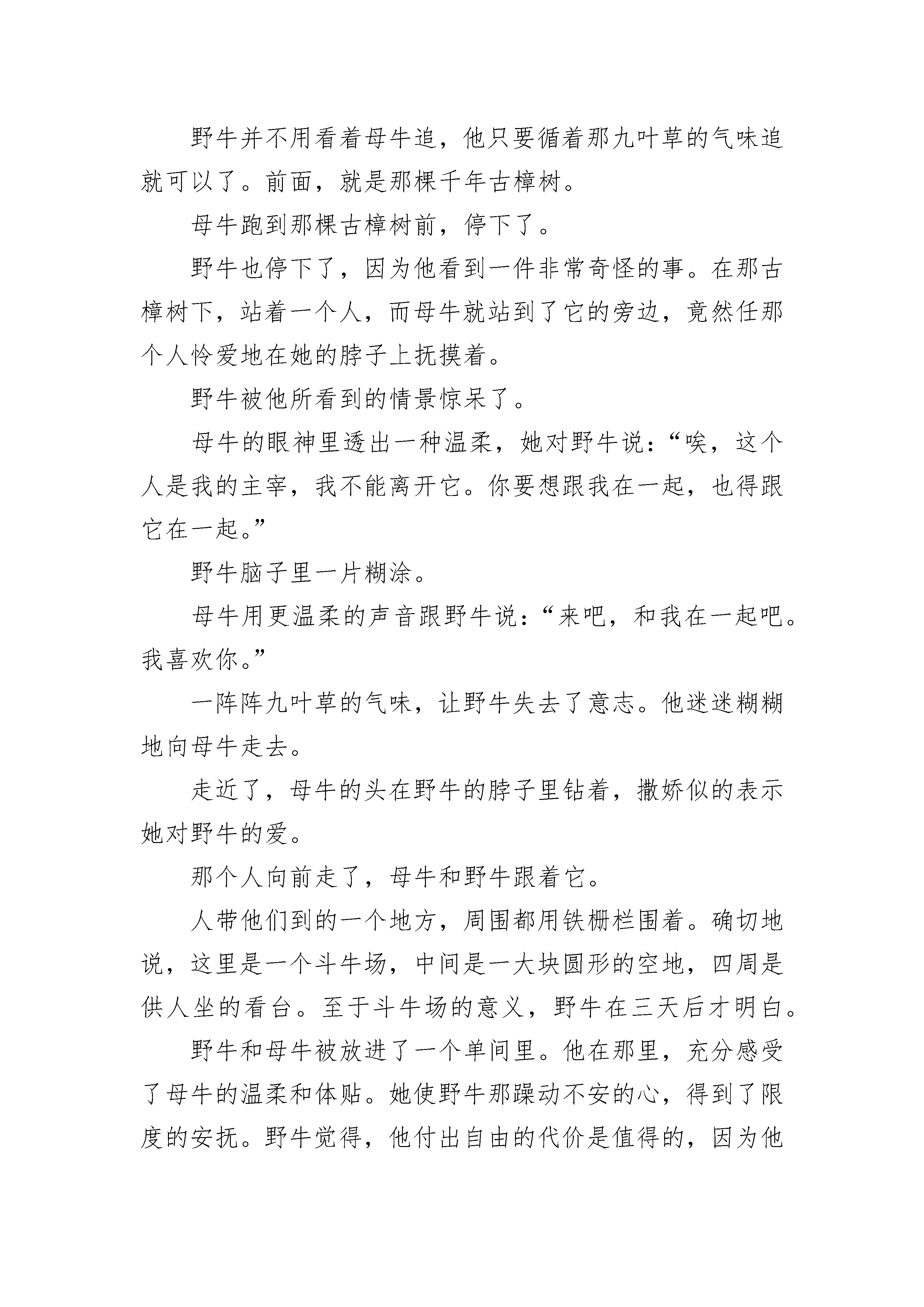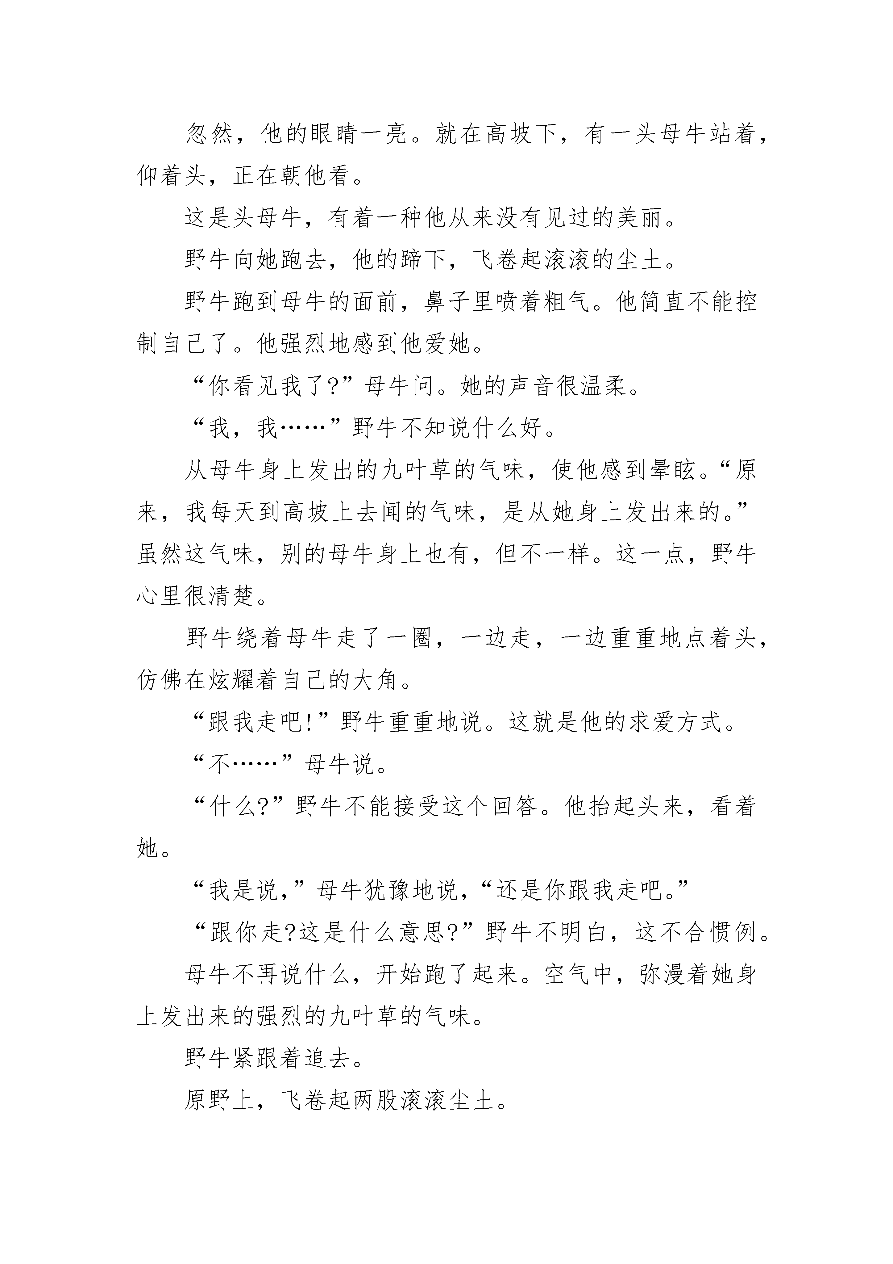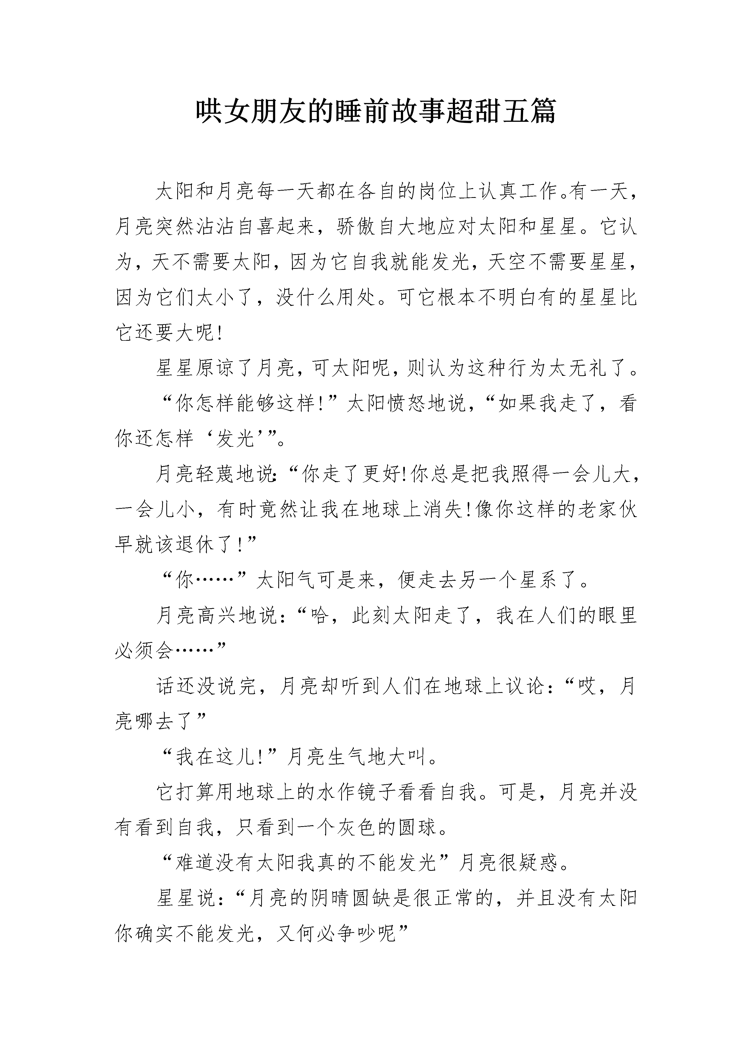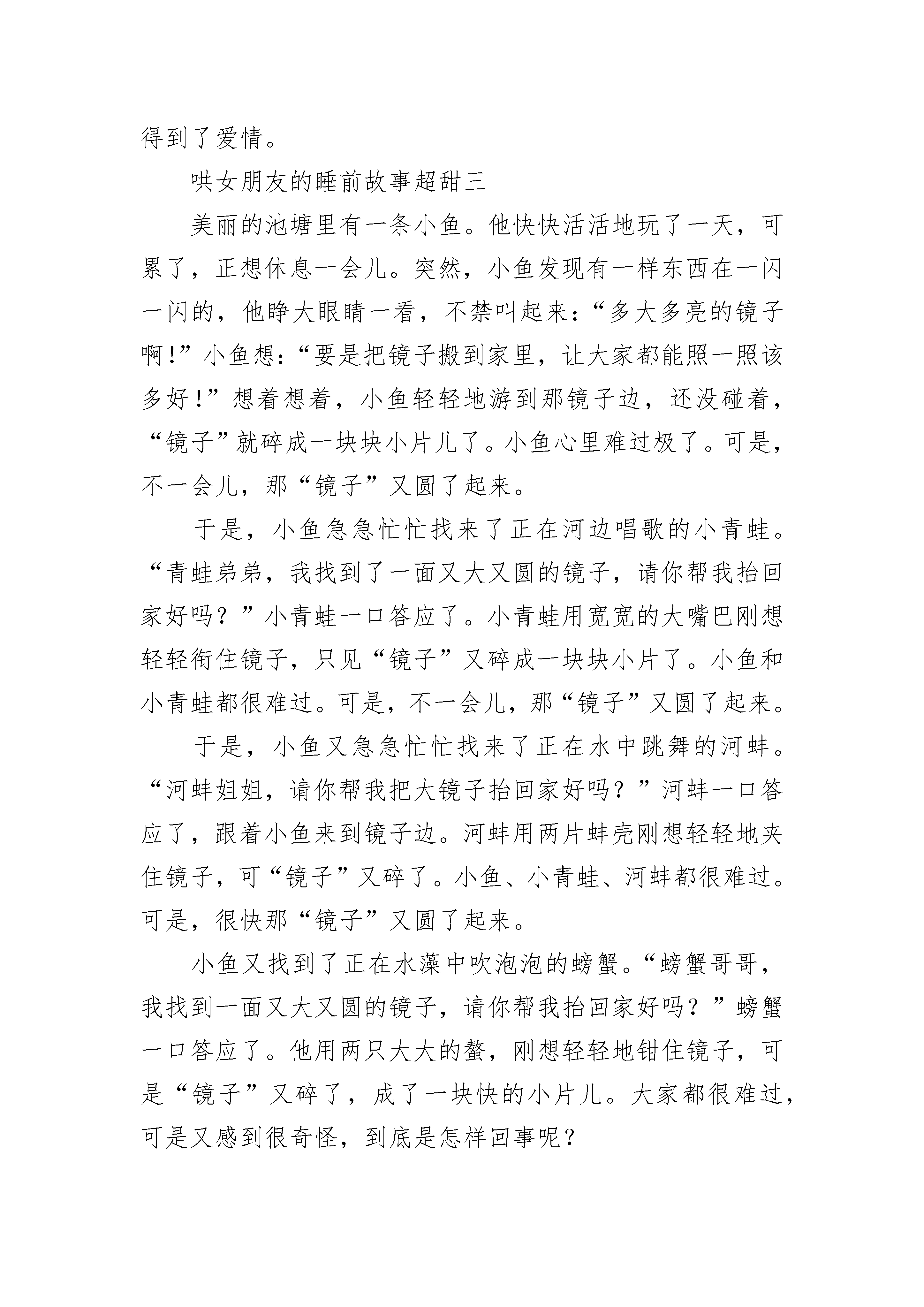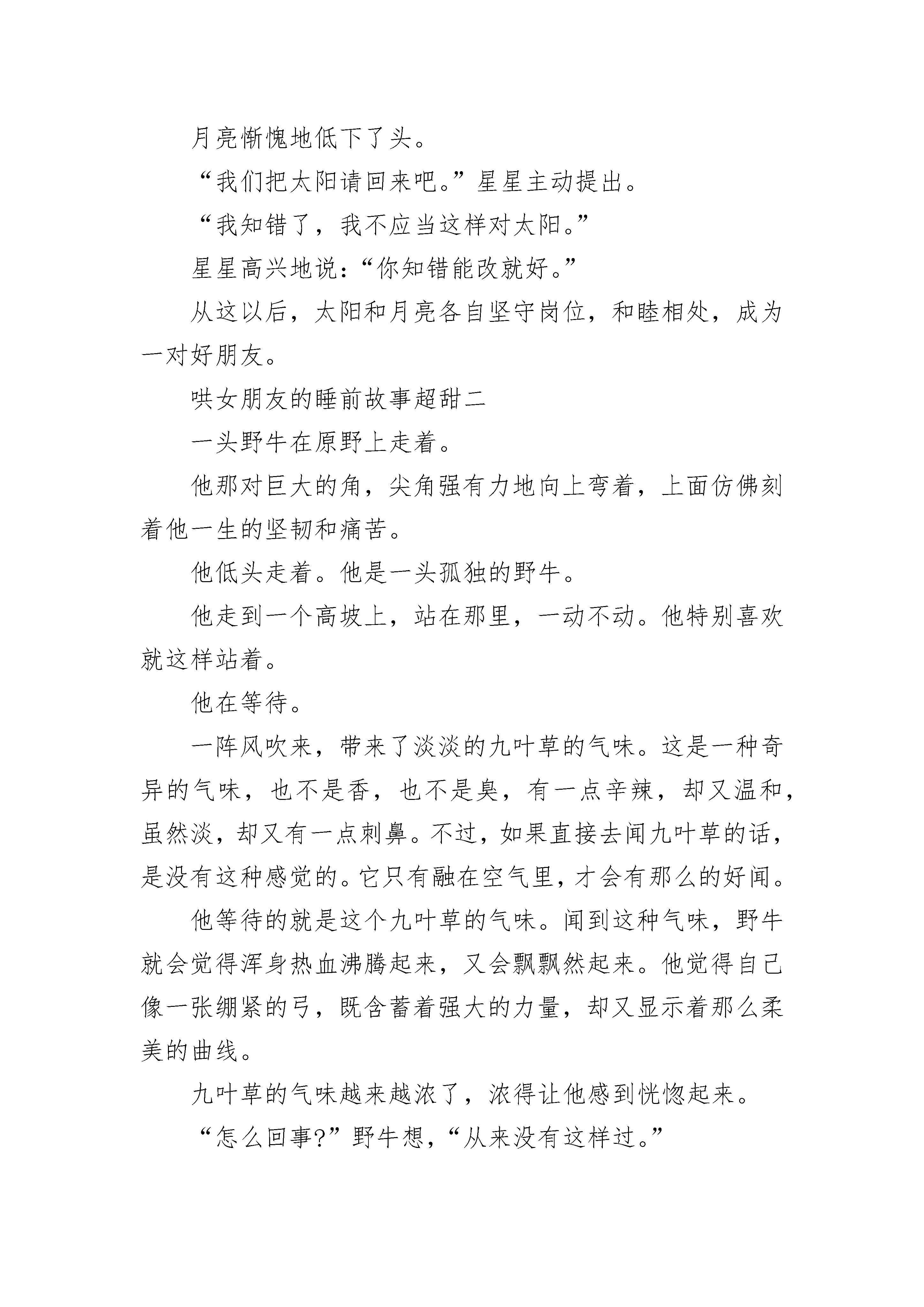 哄女朋友的睡前故事超甜五篇太阳和月亮每一天都在各自的岗位上认真工作。有一天,月亮突然沾沾自喜起来,骄傲自大地应对太阳和星星。它认为,天不需要太阳,因为它自我就能发光,天空不需要星星,因为它们太小了,没什么用处。可它根本不明白有的星星比它还要大呢!星星原谅了月亮,可太阳呢,则认为这种行为太无礼了。“你怎样能够这样!”太阳愤怒地说,“如果我走了,看你还怎样‘发光’”。月亮轻蔑地说:“你走了更好!你总是把我照得一会儿大,一会儿小,有时竟然让我在地球上消失!像你这样的老家伙早就该退休了!”“你……”太阳气可是来,便走去另一个星系了。月亮高兴地说:“哈,此刻太阳走了,我在人们的眼里必须会……”话还没说完,月亮却听到人们在地球上议论:“哎,月亮哪去了”“我在这儿!”月亮生气地大叫。它打算用地球上的水作镜子看看自我。可是,月亮并没有看到自我,只看到一个灰色的圆球。“难道没有太阳我真的不能发光”月亮很疑惑。星星说:“月亮的阴晴圆缺是很正常的,并且没有太阳你确实不能发光,又何必争吵呢”月亮惭愧地低下了头。“我们把太阳请回来吧。”星星主动提出。“我知错了,我不应当这样对太阳。”星星高兴地说:“你知错能改就好。”从这以后,太阳和月亮各自坚守岗位,和睦相处,成为一对好朋友。哄女朋友的睡前故事超甜二一头野牛在原野上走着。他那对巨大的角,尖角强有力地向上弯着,上面仿佛刻着他一生的坚韧和痛苦。他低头走着。他是一头孤独的野牛。他走到一个高坡上,站在那里,一动不动。他特别喜欢就这样站着。他在等待。一阵风吹来,带来了淡淡的九叶草的气味。这是一种奇异的气味,也不是香,也不是臭,有一点辛辣,却又温和,虽然淡,却又有一点刺鼻。不过,如果直接去闻九叶草的话,是没有这种感觉的。它只有融在空气里,才会有那么的好闻。他等待的就是这个九叶草的气味。闻到这种气味,野牛就会觉得浑身热血沸腾起来,又会飘飘然起来。他觉得自己像一张绷紧的弓,既含蓄着强大的力量,却又显示着那么柔美的曲线。九叶草的气味越来越浓了,浓得让他感到恍惚起来。“怎么回事?”野牛想,“从来没有这样过。”忽然,他的眼睛一亮。就在高坡下,有一头母牛站着,仰着头,正在朝他看。这是头母牛,有着一种他从来没有见过的美丽。野牛向她跑去,他的蹄下,飞卷起滚滚的尘土。野牛跑到母牛的面前,鼻子里喷着粗气。他简直不能控制自己了。他强烈地感到他爱她。“你看见我了?”母牛问。她的声音很温柔。“我,我……”野牛不知说什么好。从母牛身上发出的九叶草的气味,使他感到晕眩。“原来,我每天到高坡上去闻的气味,是从她身上发出来的。”虽然这气味,别的母牛身上也有,但不一样。这一点,野牛心里很清楚。野牛绕着母牛走了一圈,一边走,一边重重地点着头,仿佛在炫耀着自己的大角。“跟我走吧!”野牛重重地说。这就是他的求爱方式。“不……”母牛说。“什么?”野牛不能接受这个回答。他抬起头来,看着她。“我是说,”母牛犹豫地说,“还是你跟我走吧。”“跟你走?这是什么意思?”野牛不明白,这不合惯例。母牛不再说什么,开始跑了起来。空气中,弥漫着她身上发出来的强烈的九叶草的气味。野牛紧跟着追去。原野上,飞卷起两股滚滚尘土。野牛并不用看着母牛追,他只要循着那九叶草的气味追就可以了。前面,就是那棵千年古樟树。母牛跑到那棵古樟树前,停下了。野牛也停下了,因为他看到一件非常奇怪的事。在那古樟树下,站着一个人,而母牛就站到了它的旁边,竟然任那个人怜爱地在她的脖子上抚摸着。野牛被他所看到的情景惊呆了。母牛的眼神里透出一种温柔,她对野牛说:“唉,这个人是我的主宰,我不能离开它。你要想跟我在一起,也得跟它在一起。”野牛脑子里一片糊涂。母牛用更温柔的声音跟野牛说:“来吧,和我在一起吧。我喜欢你。”一阵阵九叶草的气味,让野牛失去了意志。他迷迷糊糊地向母牛走去。走近了,母牛的头在野牛的脖子里钻着,撒娇似的表示她对野牛的爱。那个人向前走了,母牛和野牛跟着它。人带他们到的一个地方,周围都用铁栅栏围着。确切地说,这里是一个斗牛场,中间是一大块圆形的空地,四周是供人坐的看台。至于斗牛场的意义,野牛在三天后才明白。野牛和母牛被放进了一个单间里。他在那里,充分感受了母牛的温柔和体贴。她使野牛那躁动不安的心,得到了限度的安抚。野牛觉得,他付出自由的代价是值得的,因为他得到了爱情。哄女朋友的睡前故事超甜三美丽的池塘里有一条小鱼。他快快活活地玩了一天,可累了,正想休息一会儿。突然,小鱼发现有一样东西在一闪一闪的,他睁大眼睛一看,不禁叫起来:“多大多亮的镜子啊!”小鱼想:“要是把镜子搬到家里,让大家都能照一照该多好!”想着想着,小鱼轻轻地游到那镜子边,还没碰着,“镜子”就碎成一块块小片儿了。小鱼心里难过极了。可是,不一会儿,那“镜子”又圆了起来。于是,小鱼急急忙忙找来了正在河边唱歌的小青蛙。“青蛙弟弟,我找到了一面又
