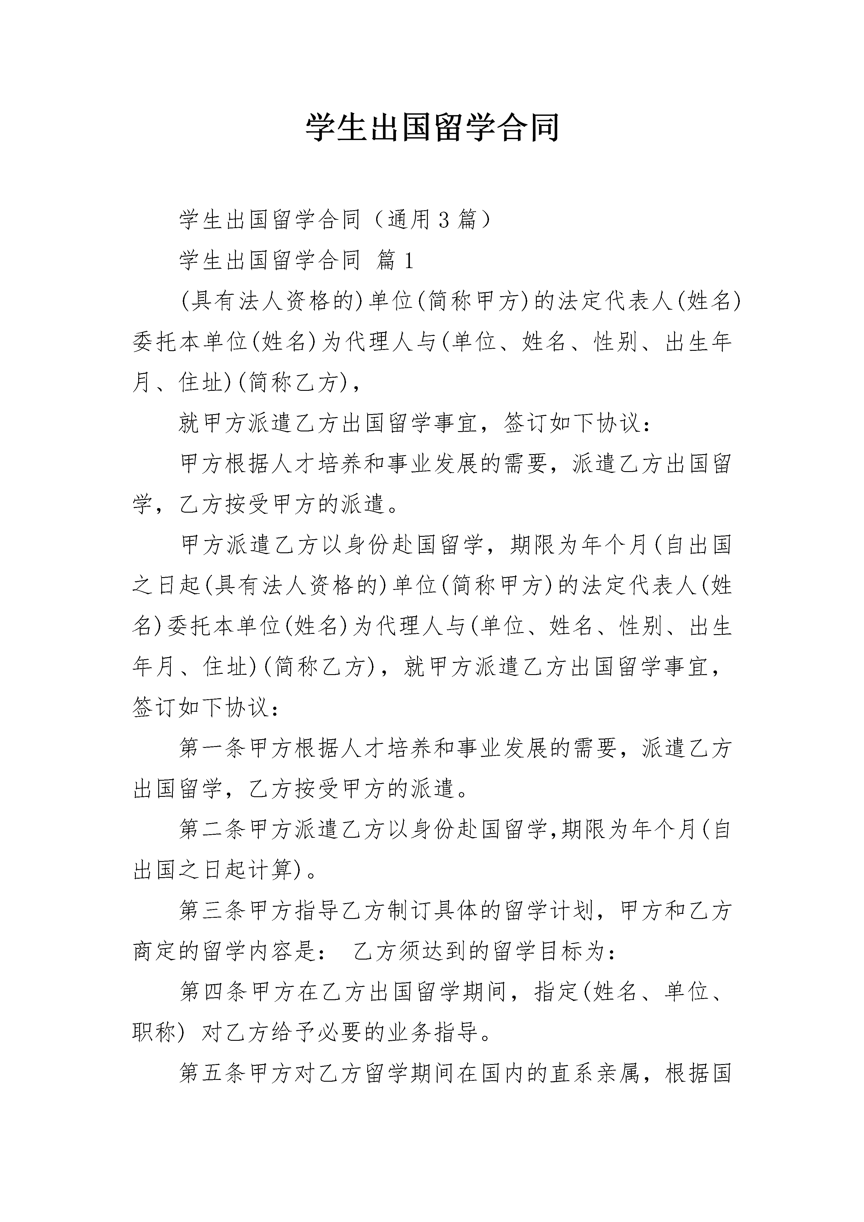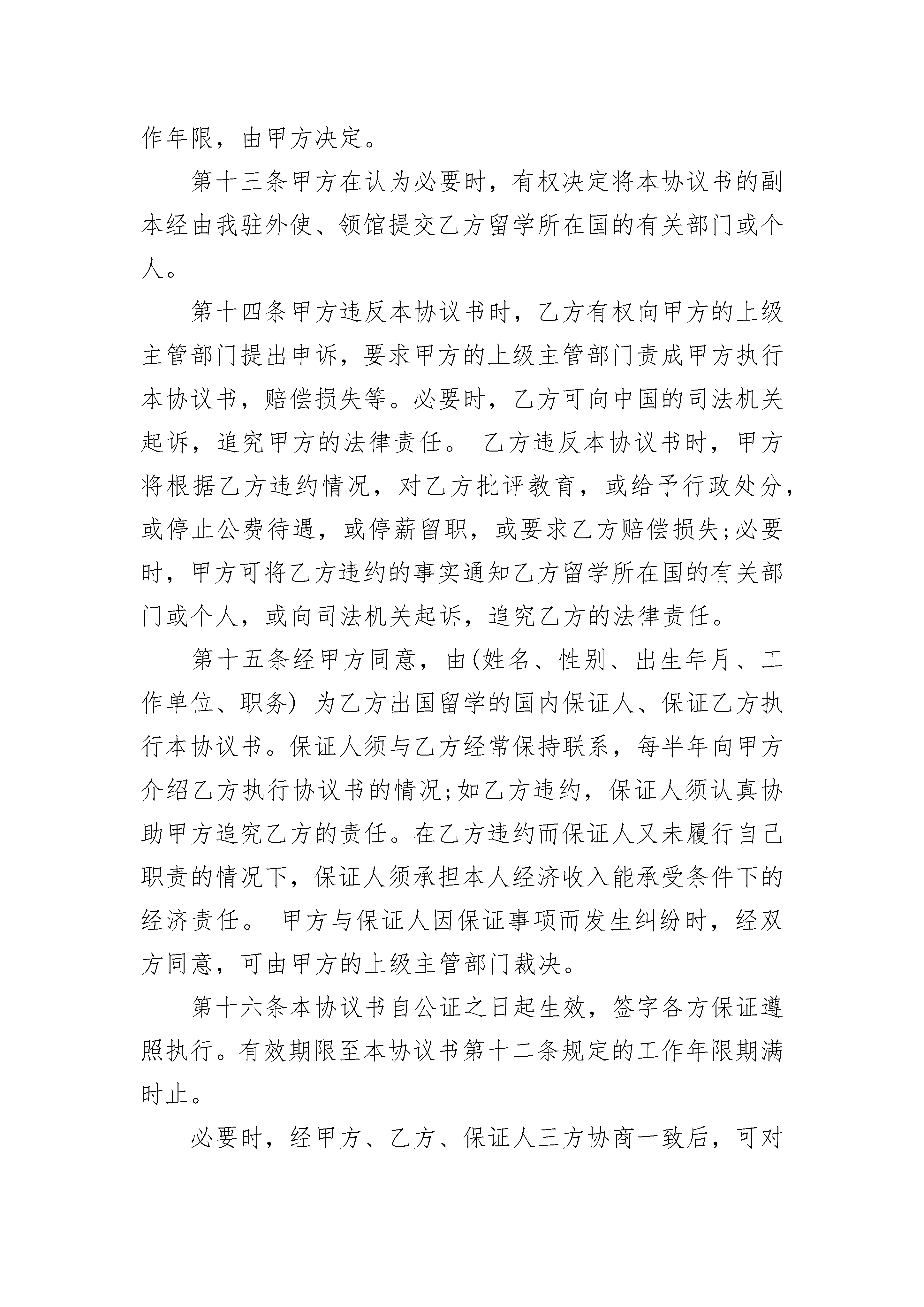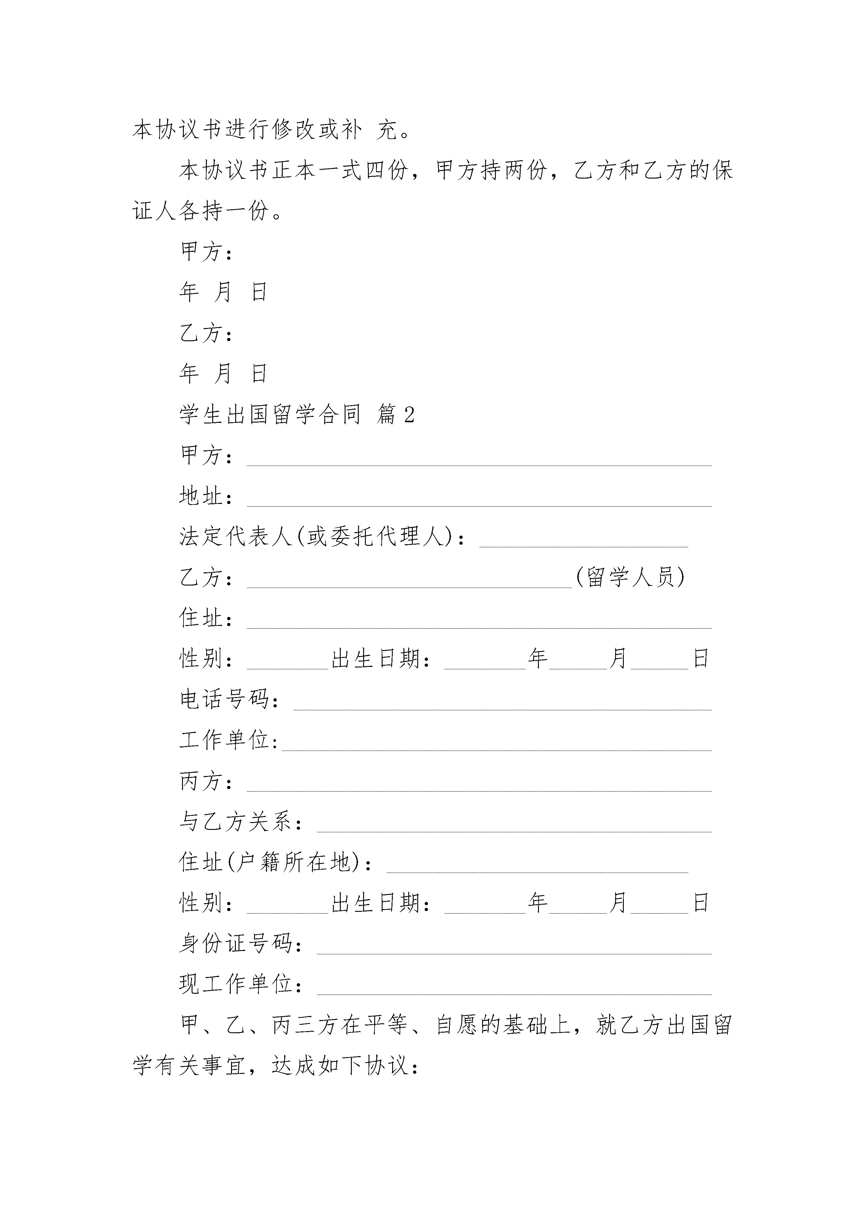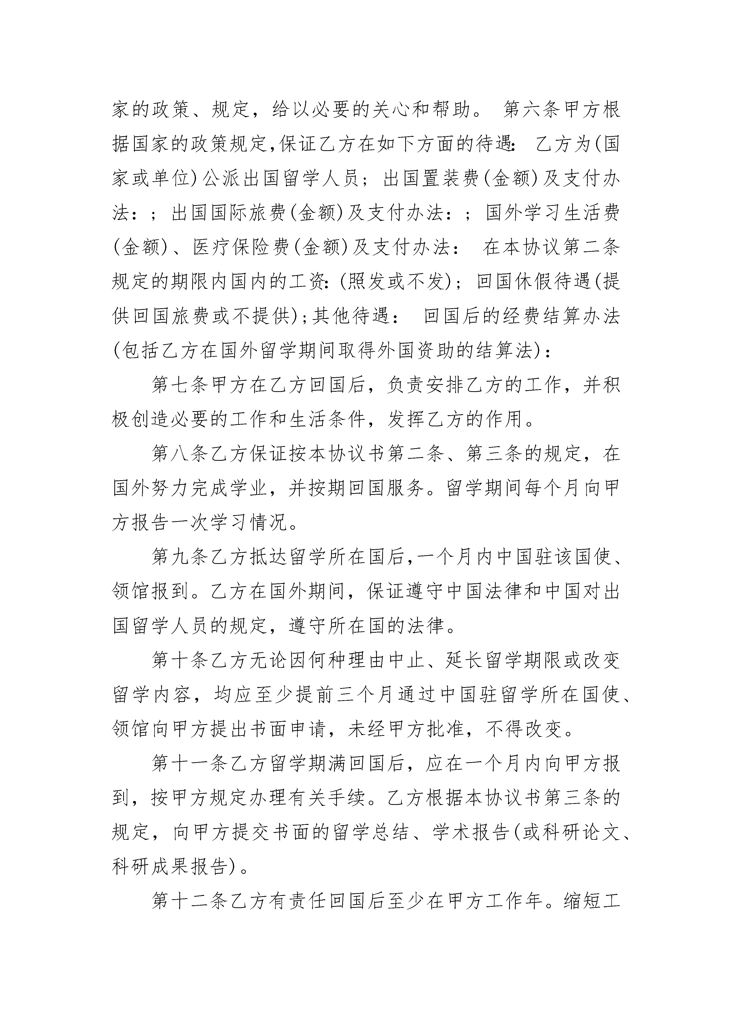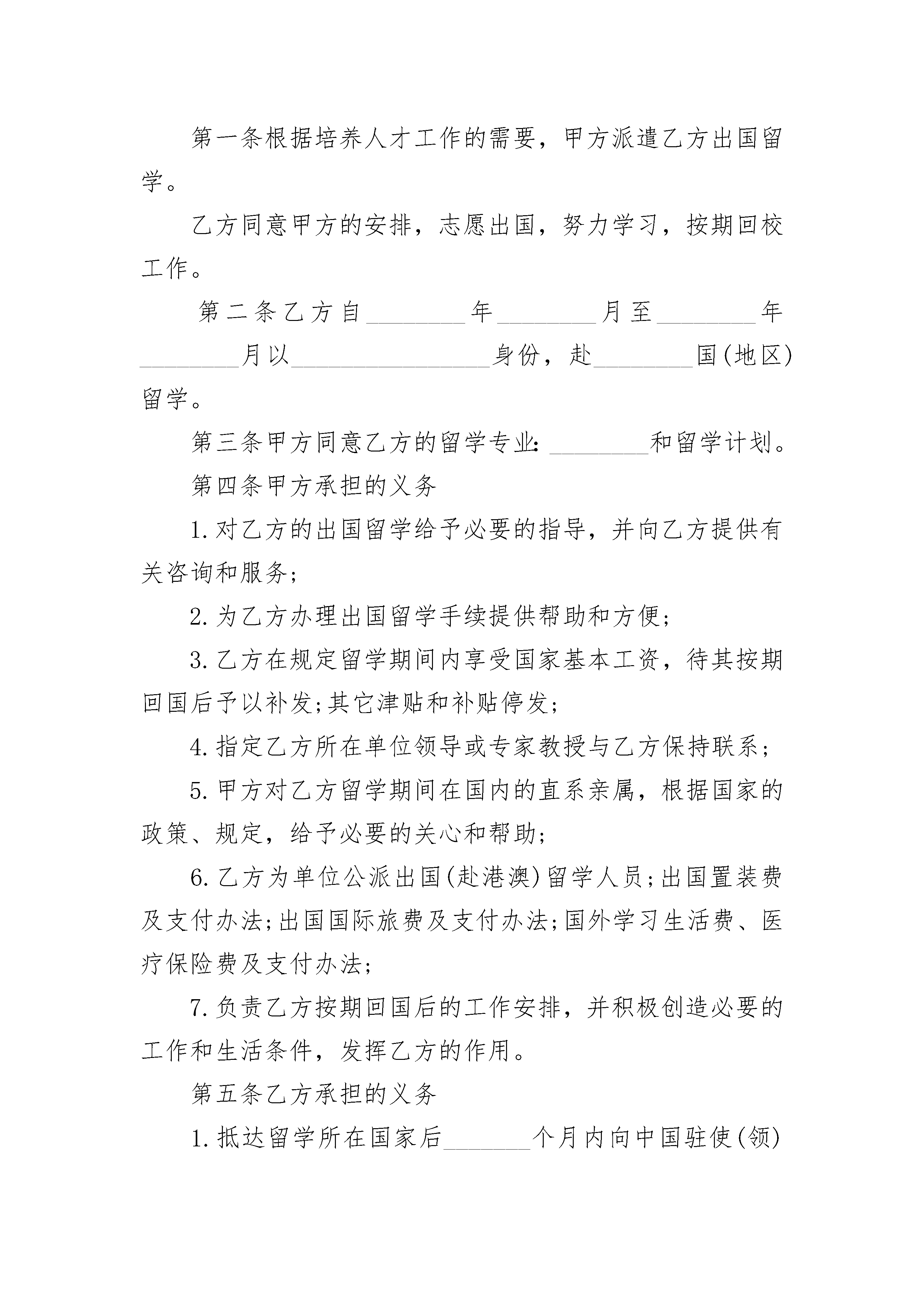 学生出国留学合同学生出国留学合同(通用3篇)学生出国留学合同篇1(具有法人资格的)单位(简称甲方)的法定代表人(姓名)委托本单位(姓名)为代理人与(单位、姓名、性别、出生年月、住址)(简称乙方),就甲方派遣乙方出国留学事宜,签订如下协议:甲方根据人才培养和事业发展的需要,派遣乙方出国留学,乙方按受甲方的派遣。甲方派遣乙方以身份赴国留学,期限为年个月(自出国之日起(具有法人资格的)单位(简称甲方)的法定代表人(姓名)委托本单位(姓名)为代理人与(单位、姓名、性别、出生年月、住址)(简称乙方),就甲方派遣乙方出国留学事宜,签订如下协议:第一条甲方根据人才培养和事业发展的需要,派遣乙方出国留学,乙方按受甲方的派遣。第二条甲方派遣乙方以身份赴国留学,期限为年个月(自出国之日起计算)。第三条甲方指导乙方制订具体的留学计划,甲方和乙方商定的留学内容是:乙方须达到的留学目标为:第四条甲方在乙方出国留学期间,指定(姓名、单位、职称)对乙方给予必要的业务指导。第五条甲方对乙方留学期间在国内的直系亲属,根据国家的政策、规定,给以必要的关心和帮助。第六条甲方根据国家的政策规定,保证乙方在如下方面的待遇:乙方为(国家或单位)公派出国留学人员;出国置装费(金额)及支付办法:;出国国际旅费(金额)及支付办法:;国外学习生活费(金额)、医疗保险费(金额)及支付办法:在本协议第二条规定的期限内国内的工资:(照发或不发);回国休假待遇(提供回国旅费或不提供);其他待遇:回国后的经费结算办法(包括乙方在国外留学期间取得外国资助的结算法):第七条甲方在乙方回国后,负责安排乙方的工作,并积极创造必要的工作和生活条件,发挥乙方的作用。第八条乙方保证按本协议书第二条、第三条的规定,在国外努力完成学业,并按期回国服务。留学期间每个月向甲方报告一次学习情况。第九条乙方抵达留学所在国后,一个月内中国驻该国使、领馆报到。乙方在国外期间,保证遵守中国法律和中国对出国留学人员的规定,遵守所在国的法律。第十条乙方无论因何种理由中止、延长留学期限或改变留学内容,均应至少提前三个月通过中国驻留学所在国使、领馆向甲方提出书面申请,未经甲方批准,不得改变。第十一条乙方留学期满回国后,应在一个月内向甲方报到,按甲方规定办理有关手续。乙方根据本协议书第三条的规定,向甲方提交书面的留学总结、学术报告(或科研论文、科研成果报告)。第十二条乙方有责任回国后至少在甲方工作年。缩短工作年限,由甲方决定。第十三条甲方在认为必要时,有权决定将本协议书的副本经由我驻外使、领馆提交乙方留学所在国的有关部门或个人。第十四条甲方违反本协议书时,乙方有权向甲方的上级主管部门提出申诉,要求甲方的上级主管部门责成甲方执行本协议书,赔偿损失等。必要时,乙方可向中国的司法机关起诉,追究甲方的法律责任。乙方违反本协议书时,甲方将根据乙方违约情况,对乙方批评教育,或给予行政处分,或停止公费待遇,或停薪留职,或要求乙方赔偿损失;必要时,甲方可将乙方违约的事实通知乙方留学所在国的有关部门或个人,或向司法机关起诉,追究乙方的法律责任。第十五条经甲方同意,由(姓名、性别、出生年月、工作单位、职务)为乙方出国留学的国内保证人、保证乙方执行本协议书。保证人须与乙方经常保持联系,每半年向甲方介绍乙方执行协议书的情况;如乙方违约,保证人须认真协助甲方追究乙方的责任。在乙方违约而保证人又未履行自己职责的情况下,保证人须承担本人经济收入能承受条件下的经济责任。甲方与保证人因保证事项而发生纠纷时,经双方同意,可由甲方的上级主管部门裁决。第十六条本协议书自公证之日起生效,签字各方保证遵照执行。有效期限至本协议书第十二条规定的工作年限期满时止。必要时,经甲方、乙方、保证人三方协商一致后,可对本协议书进行修改或补充。本协议书正本一式四份,甲方持两份,乙方和乙方的保证人各持一份。甲方:年月日乙方:年月日学生出国留学合同篇2甲方:________________________________________地址:________________________________________法定代表人(或委托代理人):__________________乙方:____________________________(留学人员)住址:________________________________________性别:_______出生日期:_______年_____月_____日电话号码:____________________________________工作单位:_____________________________________丙方:________________________________________与乙方关系:_________