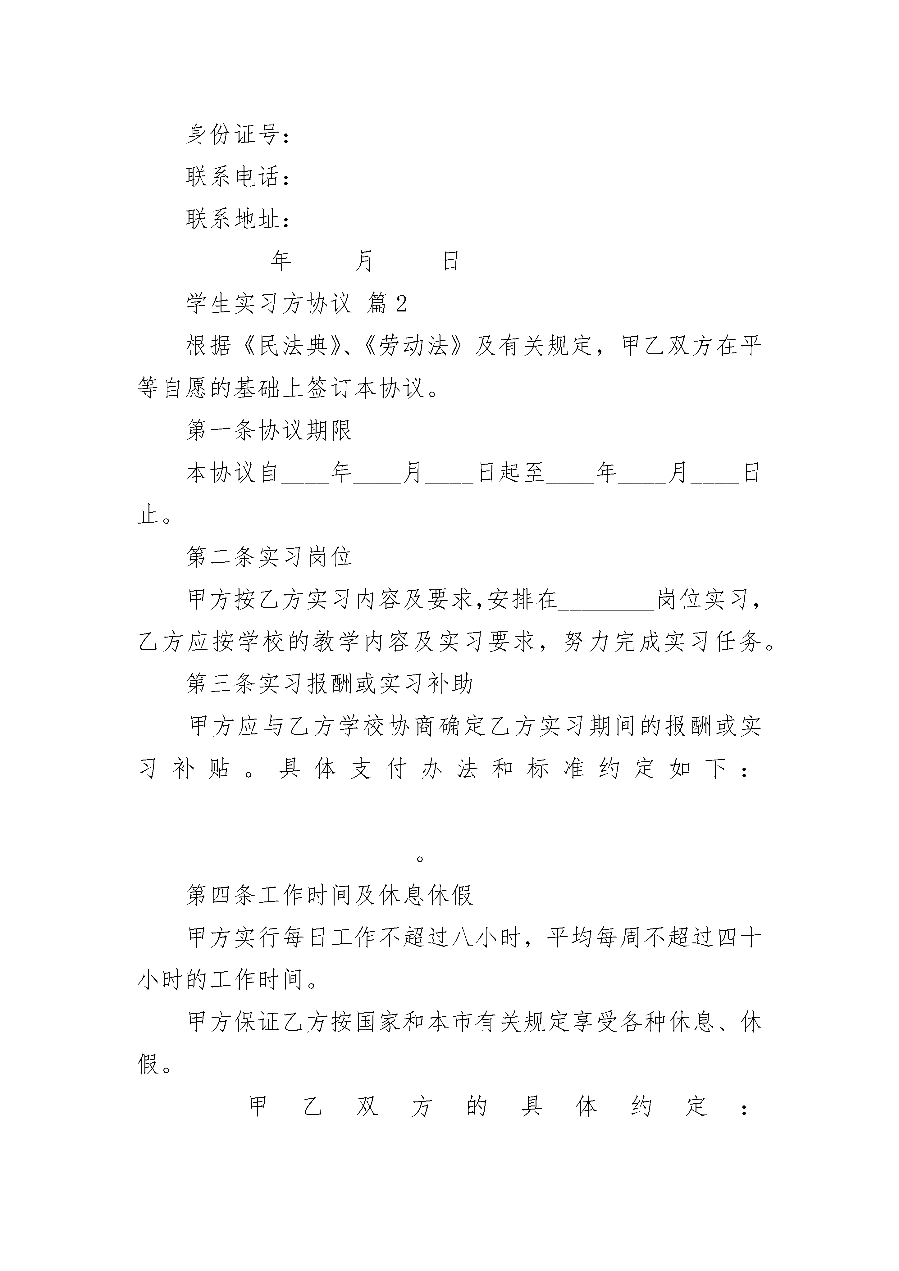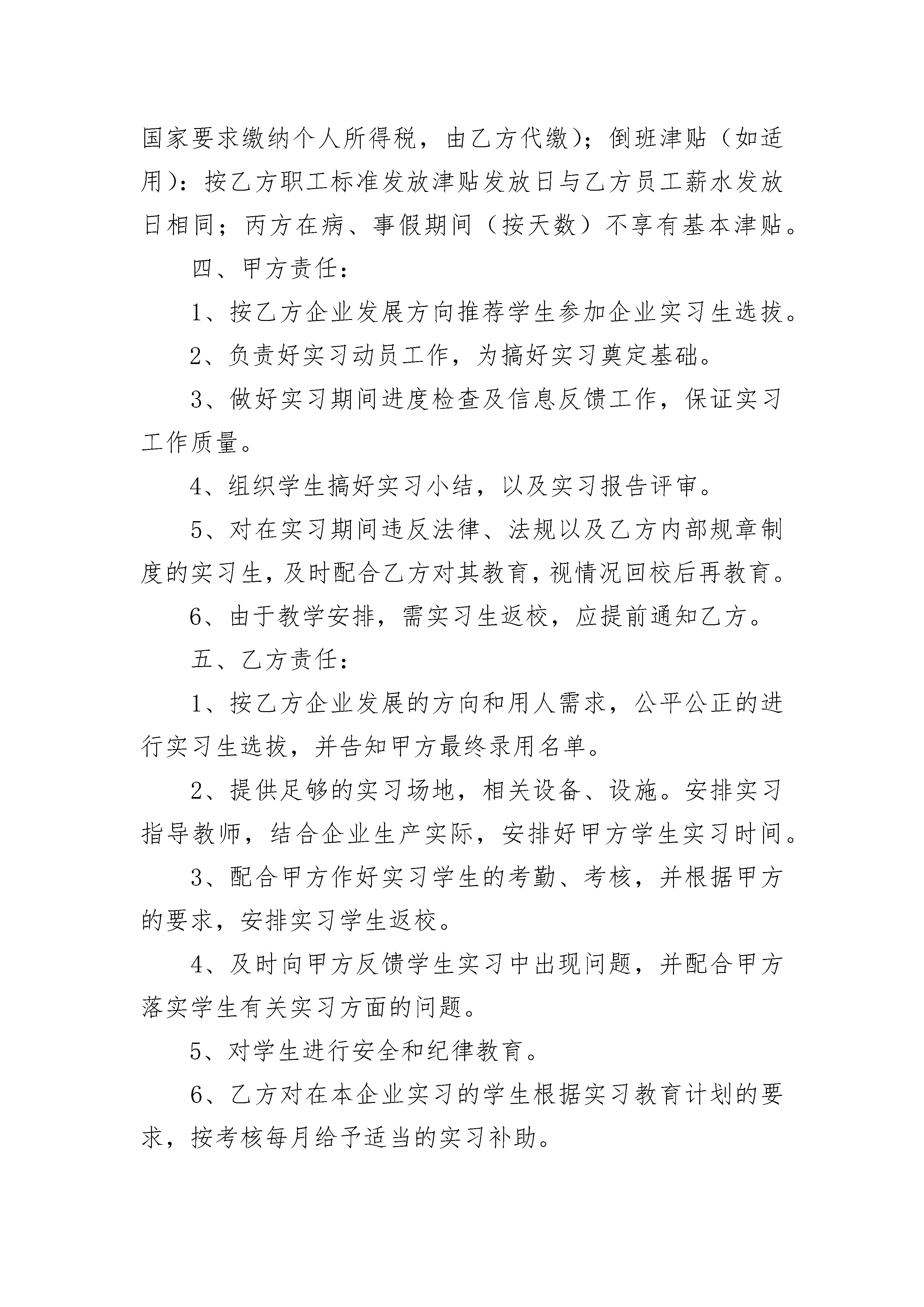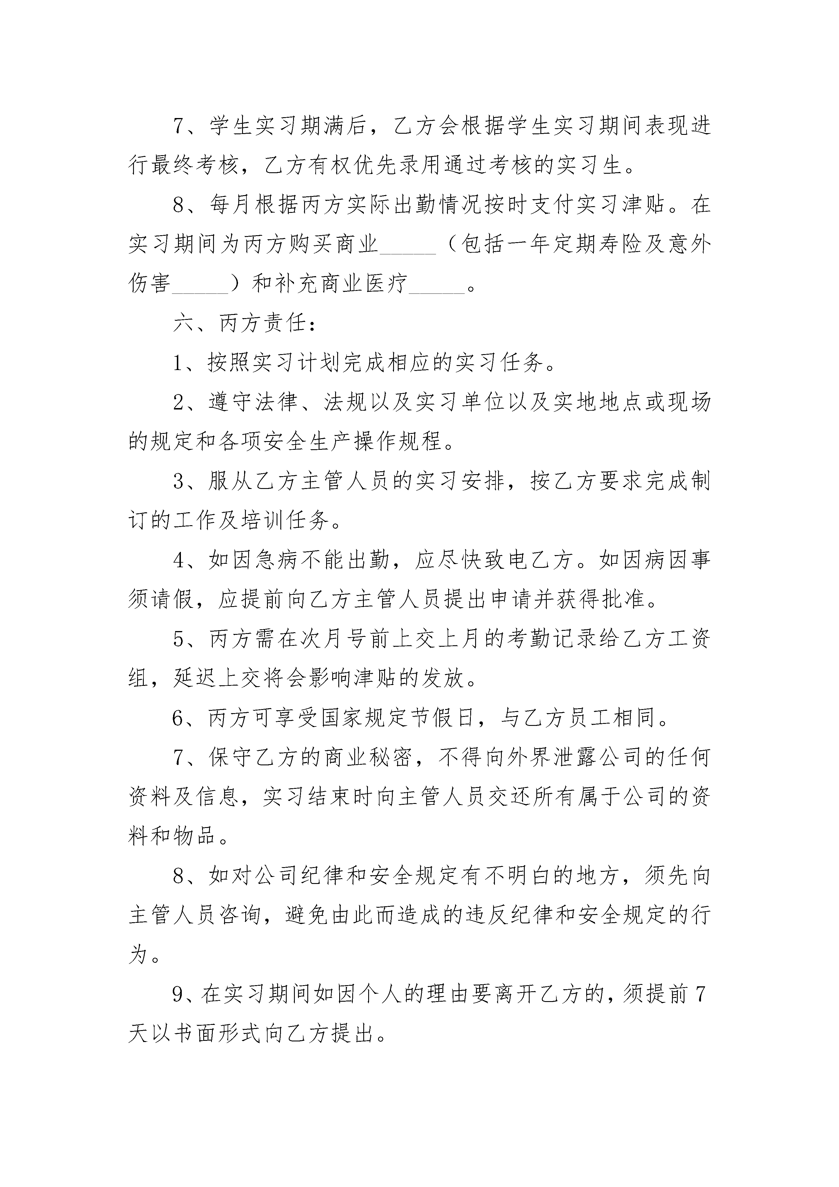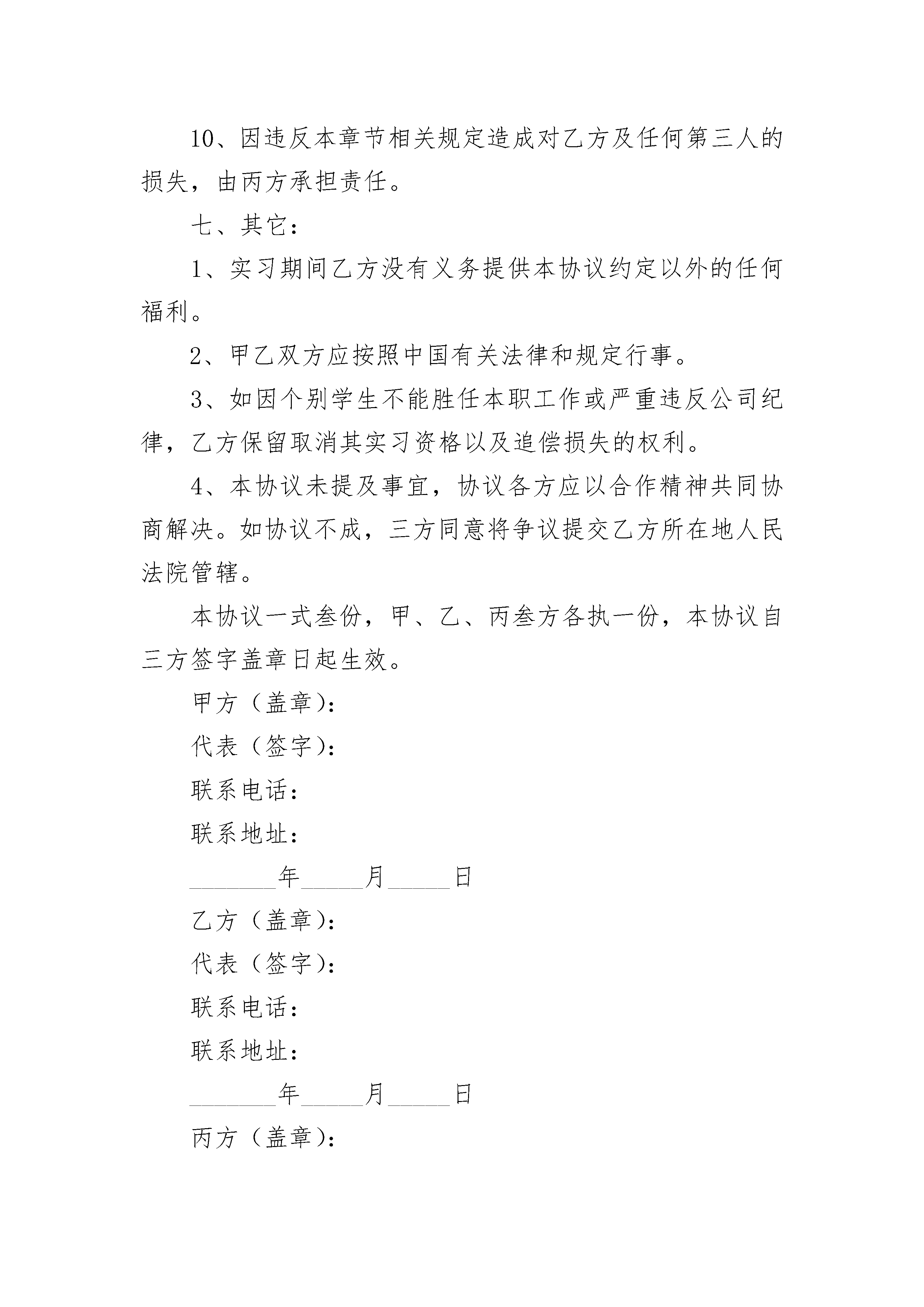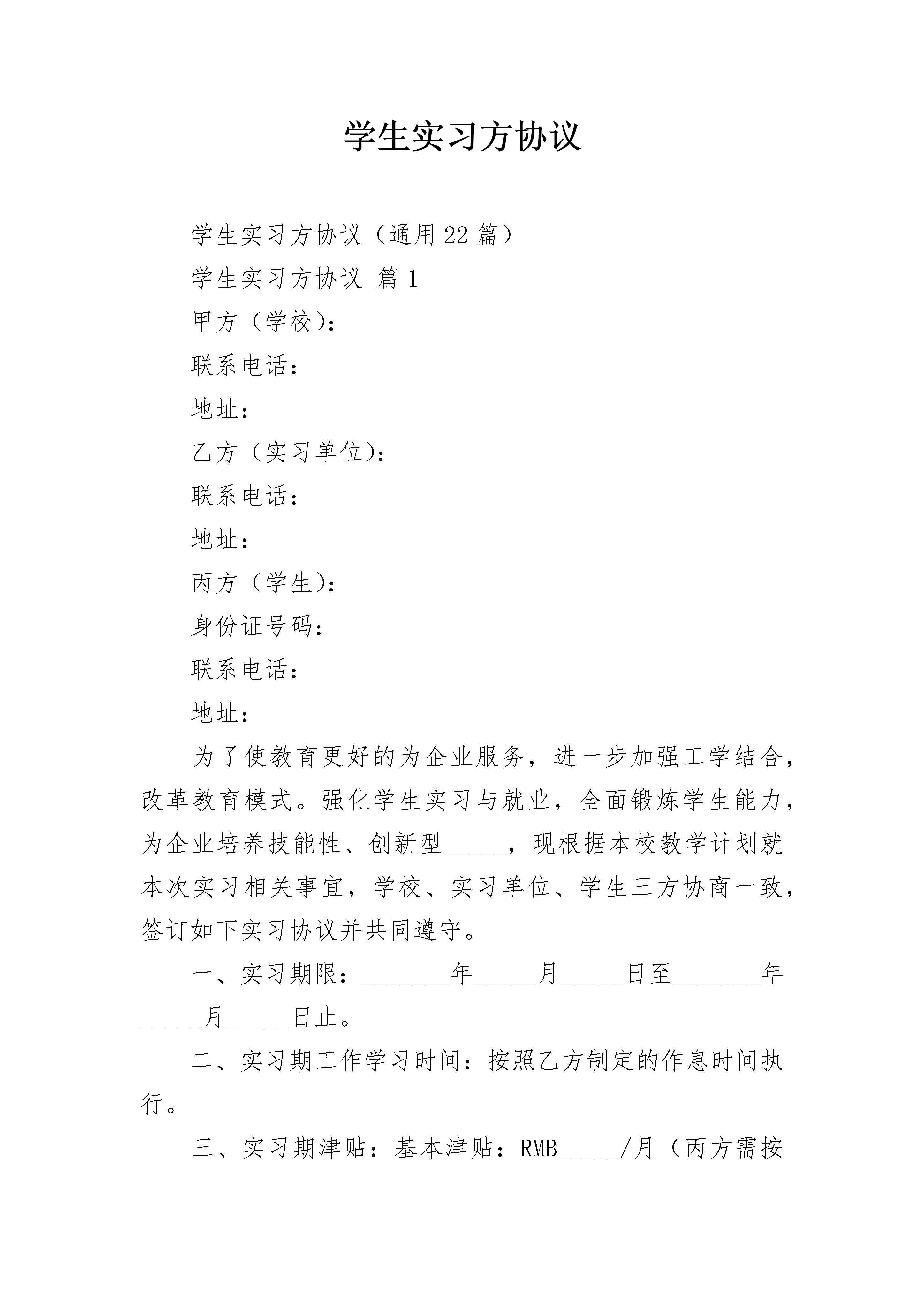 学生实习方协议学生实习方协议(通用22篇)学生实习方协议篇1甲方(学校):联系电话:地址:乙方(实习单位):联系电话:地址:丙方(学生):身份证号码:联系电话:地址:为了使教育更好的为企业服务,进一步加强工学结合,改革教育模式。强化学生实习与就业,全面锻炼学生能力,为企业培养技能性、创新型_____,现根据本校教学计划就本次实习相关事宜,学校、实习单位、学生三方协商一致,签订如下实习协议并共同遵守。一、实习期限:_______年_____月_____日至_______年_____月_____日止。二、实习期工作学习时间:按照乙方制定的作息时间执行。三、实习期津贴:基本津贴:RMB_____/月(丙方需按国家要求缴纳个人所得税,由乙方代缴);倒班津贴(如适用):按乙方职工标准发放津贴发放日与乙方员工薪水发放日相同;丙方在病、事假期间(按天数)不享有基本津贴。四、甲方责任:1、按乙方企业发展方向推荐学生参加企业实习生选拔。2、负责好实习动员工作,为搞好实习奠定基础。3、做好实习期间进度检查及信息反馈工作,保证实习工作质量。4、组织学生搞好实习小结,以及实习报告评审。5、对在实习期间违反法律、法规以及乙方内部规章制度的实习生,及时配合乙方对其教育,视情况回校后再教育。6、由于教学安排,需实习生返校,应提前通知乙方。五、乙方责任:1、按乙方企业发展的方向和用人需求,公平公正的进行实习生选拔,并告知甲方最终录用名单。2、提供足够的实习场地,相关设备、设施。安排实习指导教师,结合企业生产实际,安排好甲方学生实习时间。3、配合甲方作好实习学生的考勤、考核,并根据甲方的要求,安排实习学生返校。4、及时向甲方反馈学生实习中出现问题,并配合甲方落实学生有关实习方面的问题。5、对学生进行安全和纪律教育。6、乙方对在本企业实习的学生根据实习教育计划的要求,按考核每月给予适当的实习补助。7、学生实习期满后,乙方会根据学生实习期间表现进行最终考核,乙方有权优先录用通过考核的实习生。8、每月根据丙方实际出勤情况按时支付实习津贴。在实习期间为丙方购买商业_____(包括一年定期寿险及意外伤害_____)和补充商业医疗_____。六、丙方责任:1、按照实习计划完成相应的实习任务。2、遵守法律、法规以及实习单位以及实地地点或现场的规定和各项安全生产操作规程。3、服从乙方主管人员的实习安排,按乙方要求完成制订的工作及培训任务。4、如因急病不能出勤,应尽快致电乙方。如因病因事须请假,应提前向乙方主管人员提出申请并获得批准。5、丙方需在次月号前上交上月的考勤记录给乙方工资组,延迟上交将会影响津贴的发放。6、丙方可享受国家规定节假日,与乙方员工相同。7、保守乙方的商业秘密,不得向外界泄露公司的任何资料及信息,实习结束时向主管人员交还所有属于公司的资料和物品。8、如对公司纪律和安全规定有不明白的地方,须先向主管人员咨询,避免由此而造成的违反纪律和安全规定的行为。9、在实习期间如因个人的理由要离开乙方的,须提前7天以书面形式向乙方提出。10、因违反本章节相关规定造成对乙方及任何第三人的损失,由丙方承担责任。七、其它:1、实习期间乙方没有义务提供本协议约定以外的任何福利。2、甲乙双方应按照中国有关法律和规定行事。3、如因个别学生不能胜任本职工作或严重违反公司纪律,乙方保留取消其实习资格以及追偿损失的权利。4、本协议未提及事宜,协议各方应以合作精神共同协商解决。如协议不成,三方同意将争议提交乙方所在地人民法院管辖。本协议一式叁份,甲、乙、丙叁方各执一份,本协议自三方签字盖章日起生效。甲方(盖章):代表(签字):联系电话:联系地址:_______年_____月_____日乙方(盖章):代表(签字):联系电话:联系地址:_______年_____月_____日丙方(盖章):身份证号:联系电话:联系地址:_______年_____月_____日学生实习方协议篇2根据《民法典》、《劳动法》及有关规定,甲乙双方在平等自愿的基础上签订本协议。第一条协议期限本协议自____年____月____日起至____年____月____日止。第二条实习岗位甲方按乙方实习内容及要求,安排在________岗位实习,乙方应按学校的教学内容及实习要求,努力完成实习任务。第三条实习报酬或实习补助甲方应与乙方学校协商确定乙方实习期间的报酬或实习补贴。具体支付办法和标准约定如下:__________________________________________________________________________。第四条工作时间及休息休假甲方实行每日工作不超过八小时,平均每周不超过四十小时的工作时间。甲方保证乙方按国家和本市有关规定享受各种休息、休假。甲乙双方的具体约定:_____________