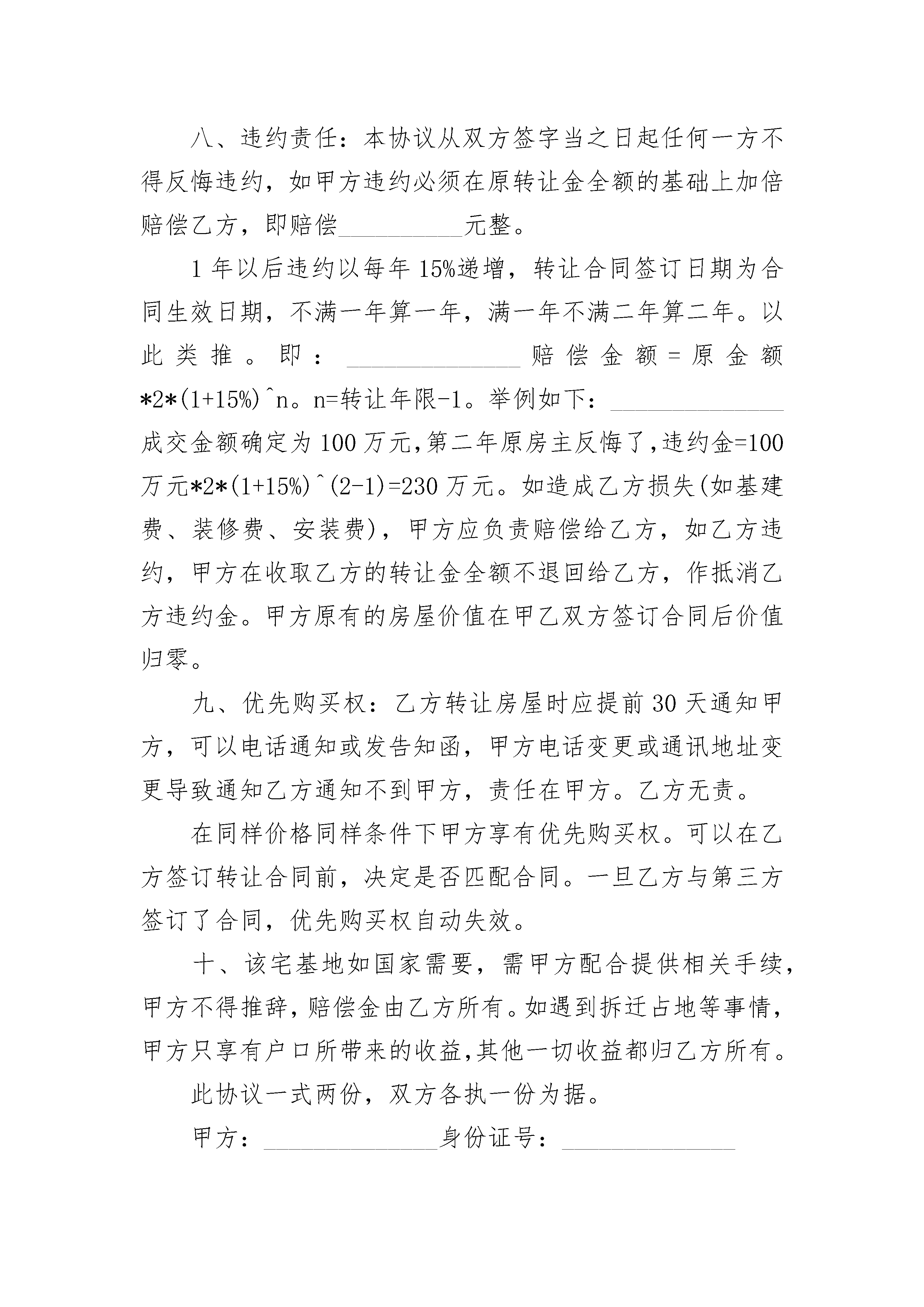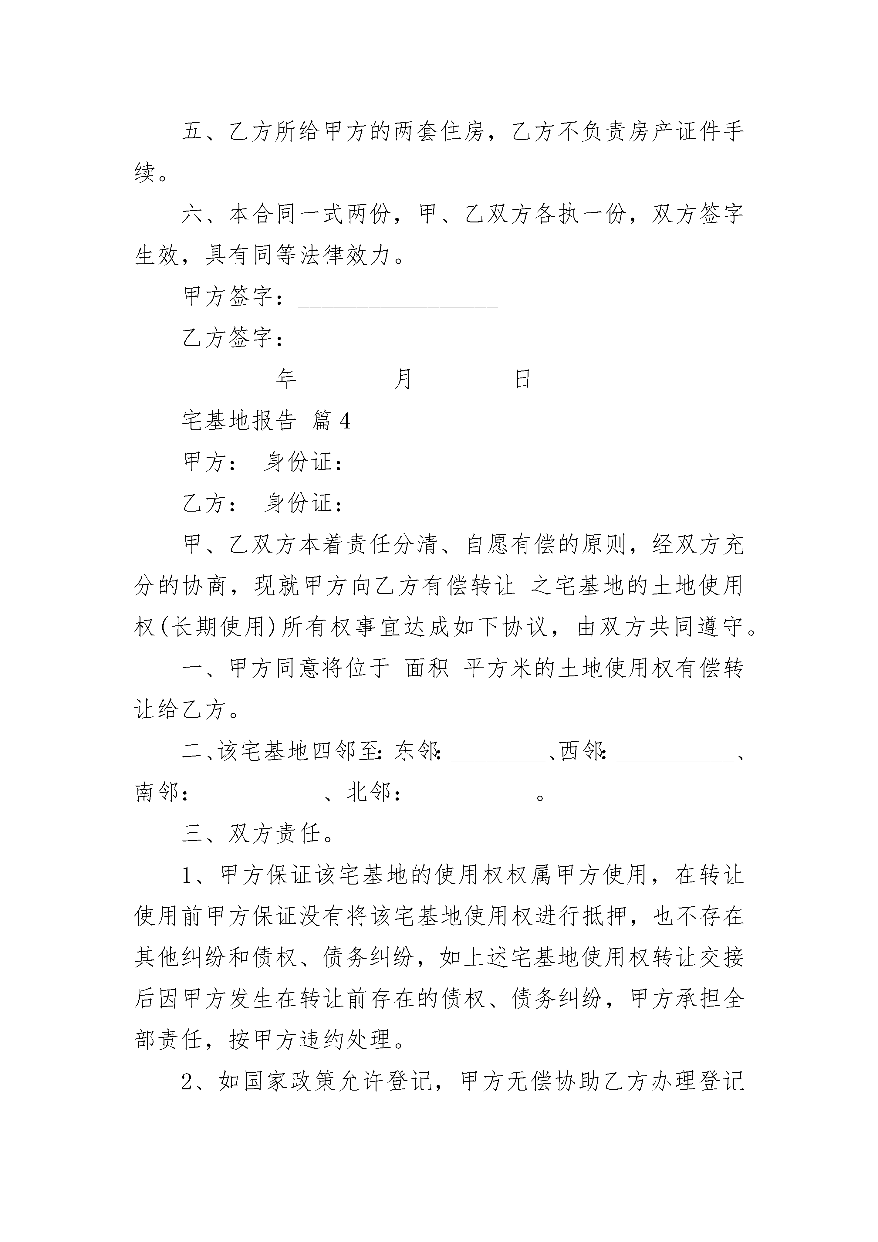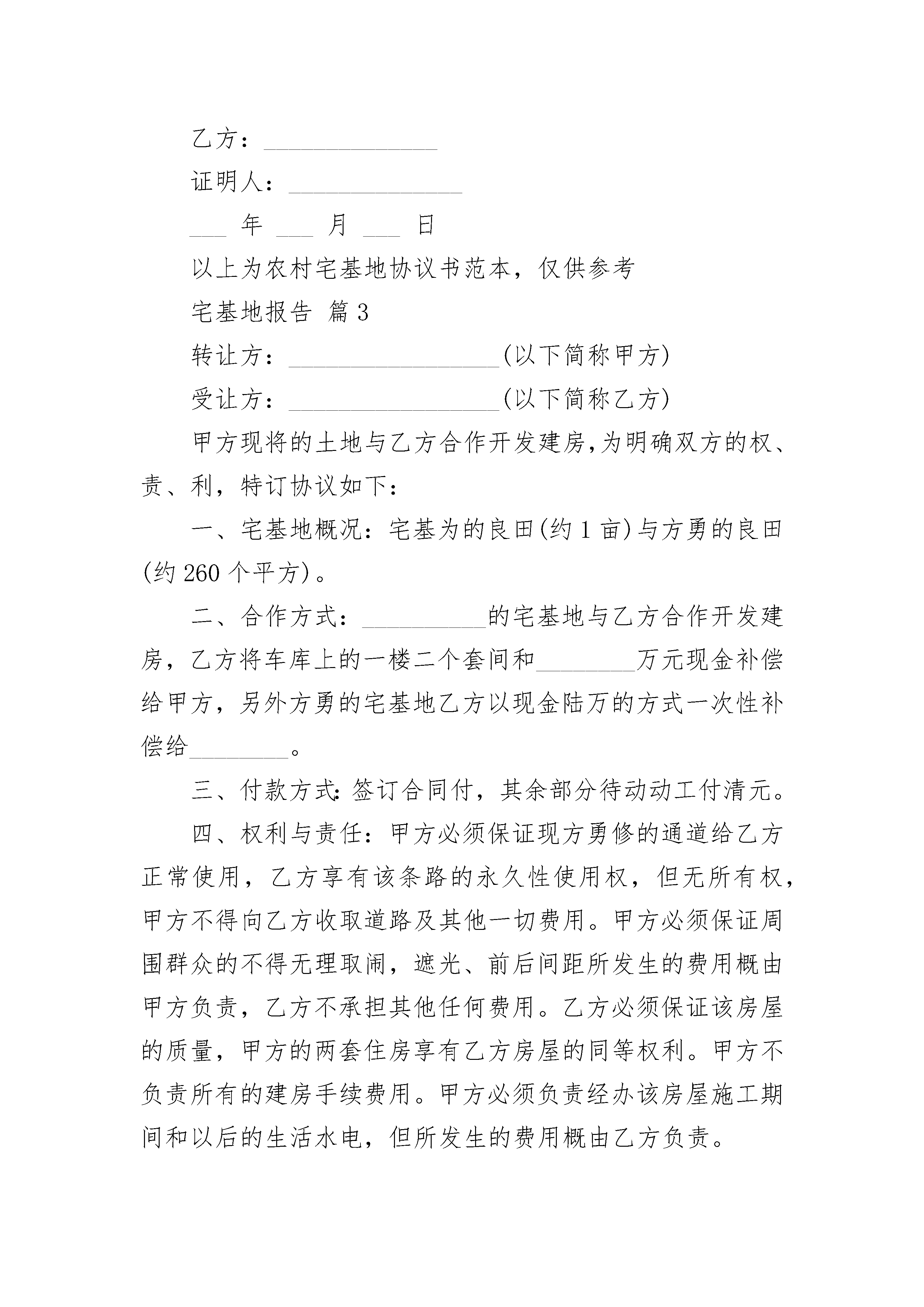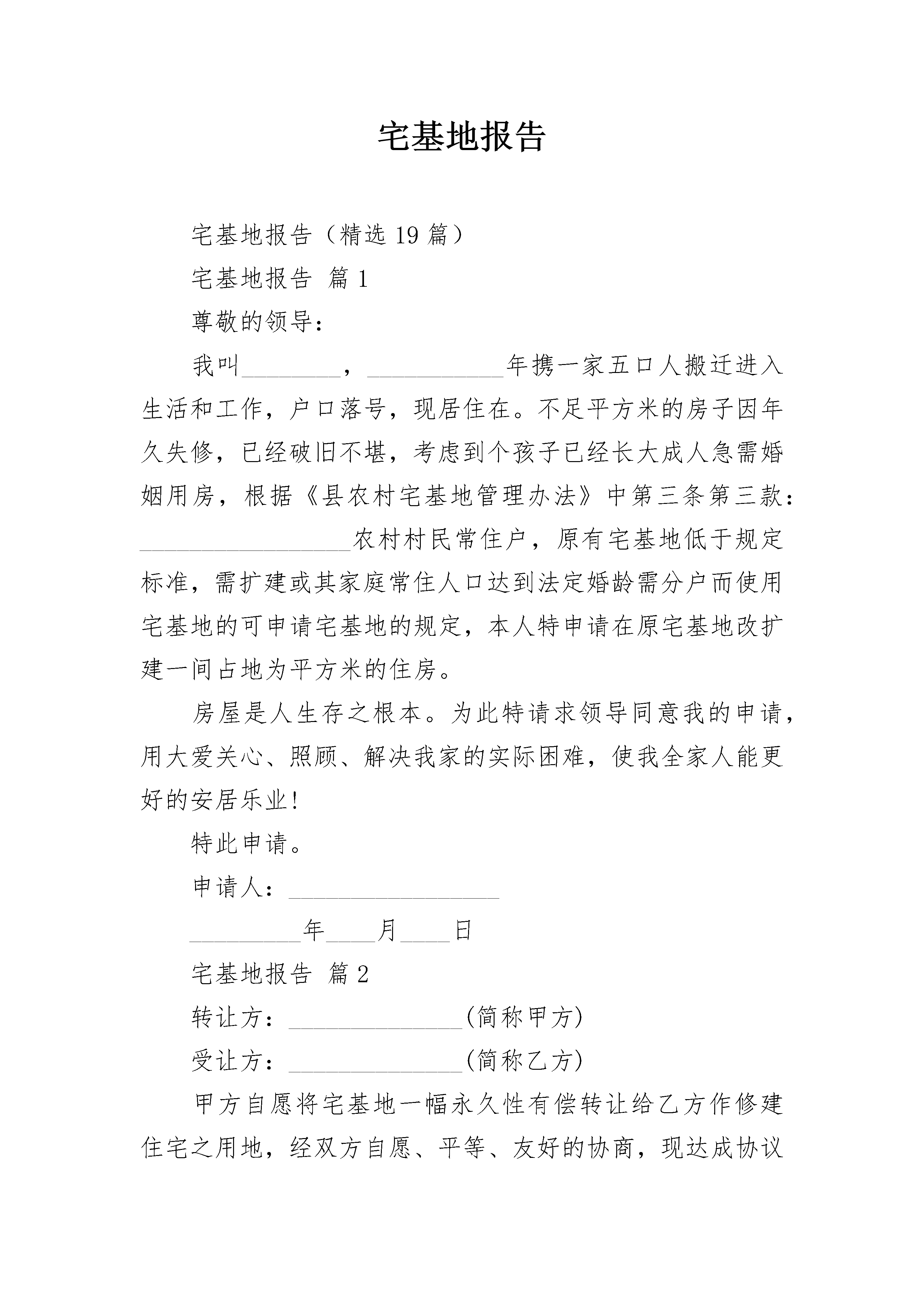宅基地报告宅基地报告(精选19篇)宅基地报告篇1尊敬的领导:我叫________,___________年携一家五口人搬迁进入生活和工作,户口落号,现居住在。不足平方米的房子因年久失修,已经破旧不堪,考虑到个孩子已经长大成人急需婚姻用房,根据《县农村宅基地管理办法》中第三条第三款:_________________农村村民常住户,原有宅基地低于规定标准,需扩建或其家庭常住人口达到法定婚龄需分户而使用宅基地的可申请宅基地的规定,本人特申请在原宅基地改扩建一间占地为平方米的住房。房屋是人生存之根本。为此特请求领导同意我的申请,用大爱关心、照顾、解决我家的实际困难,使我全家人能更好的安居乐业!特此申请。申请人:__________________________年____月____日宅基地报告篇2转让方:______________(简称甲方)受让方:______________(简称乙方)甲方自愿将宅基地一幅永久性有偿转让给乙方作修建住宅之用地,经双方自愿、平等、友好的协商,现达成协议如下:一、宅基地坐落于______号。四边分明为______界,面积______平方米。二、甲方知晓国家宅基地转让的规定,愿意按此合同约定赔偿由此造成乙方的损失,并保障乙方的权益不受侵犯。包括使用权、收益权、处置权。甲方不得干涉。三、乙方不得改变此幅地块的使用性质,改扩建不得影响附近居民的权益。如采光等。由此产生的纠纷,乙方责任自负。四、转让金额:双方议定此幅宅基地现价为人民币______整。五、付款方式:双方在协议签字之日,乙方一次性付给甲方人民币______元整。六、产权归属:协议双方签字付款之日起,该幅宅基地所有权属归于乙方所有,乙方有权在此宅基地上修建、改建房屋,本族及异姓人等无权干涉、争议。在乙方修建房屋过程中,所需水、电由甲方负责办理,所有费用由乙方承担。道路有人干涉,甲方全部负责。乙方在房屋建成后,甲方必须无条件配合乙方办理,土地使用证、房屋产权证过户等手续到乙方手中,所需费用由乙方承担。七、协调和处理:乙方在建房施工中,如若发生土地产权纠纷等出现,由甲方负责出面协调处理,如有协调处理不好,甲方应负相关的责任。甲乙双方如产生矛盾,应协调解决,协调地点由乙方确定,如诉讼由乙方确定诉讼法院地址。八、违约责任:本协议从双方签字当之日起任何一方不得反悔违约,如甲方违约必须在原转让金全额的基础上加倍赔偿乙方,即赔偿__________元整。1年以后违约以每年15%递增,转让合同签订日期为合同生效日期,不满一年算一年,满一年不满二年算二年。以此类推。即:______________赔偿金额=原金额*2*(1+15%)^n。n=转让年限-1。举例如下:______________成交金额确定为100万元,第二年原房主反悔了,违约金=100万元*2*(1+15%)^(2-1)=230万元。如造成乙方损失(如基建费、装修费、安装费),甲方应负责赔偿给乙方,如乙方违约,甲方在收取乙方的转让金全额不退回给乙方,作抵消乙方违约金。甲方原有的房屋价值在甲乙双方签订合同后价值归零。九、优先购买权:乙方转让房屋时应提前30天通知甲方,可以电话通知或发告知函,甲方电话变更或通讯地址变更导致通知乙方通知不到甲方,责任在甲方。乙方无责。在同样价格同样条件下甲方享有优先购买权。可以在乙方签订转让合同前,决定是否匹配合同。一旦乙方与第三方签订了合同,优先购买权自动失效。十、该宅基地如国家需要,需甲方配合提供相关手续,甲方不得推辞,赔偿金由乙方所有。如遇到拆迁占地等事情,甲方只享有户口所带来的收益,其他一切收益都归乙方所有。此协议一式两份,双方各执一份为据。甲方:______________身份证号:______________乙方:______________证明人:_________________年___月___日以上为农村宅基地协议书范本,仅供参考宅基地报告篇3转让方:_________________(以下简称甲方)受让方:_________________(以下简称乙方)甲方现将的土地与乙方合作开发建房,为明确双方的权、责、利,特订协议如下:一、宅基地概况:宅基为的良田(约1亩)与方勇的良田(约260个平方)。二、合作方式:__________的宅基地与乙方合作开发建房,乙方将车库上的一楼二个套间和________万元现金补偿给甲方,另外方勇的宅基地乙方以现金陆万的方式一次性补偿给________。三、付款方式:签订合同付,其余部分待动动工付清元。四、权利与责任:甲方必须保证现方勇修的通道给乙方正常使用,乙方享有该条路的永久性使用权,但无所有权,甲方不得向乙方收取道路及其他一切费用。甲方必须保证周围群众的不得无理取闹,遮光、前后间距所发生的费用概由甲方负责,乙方