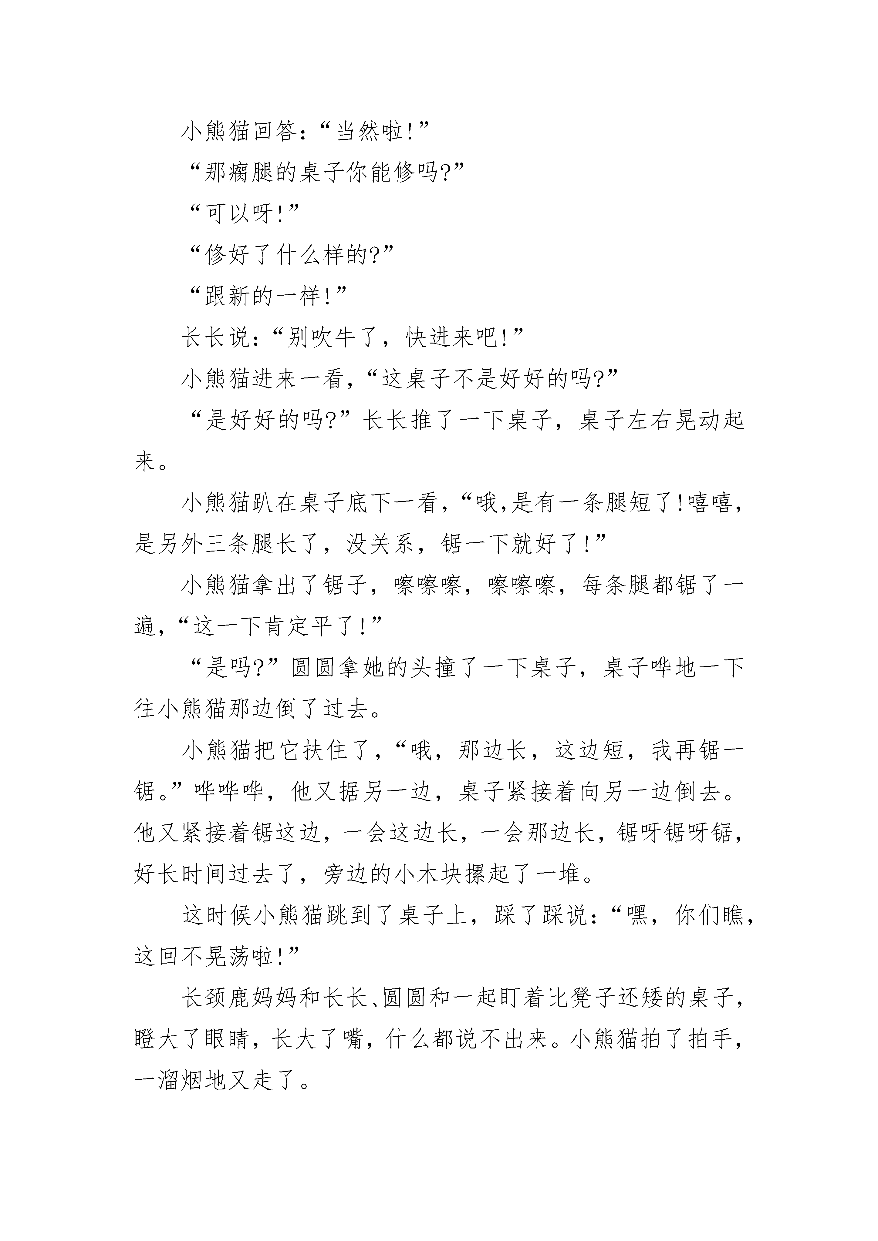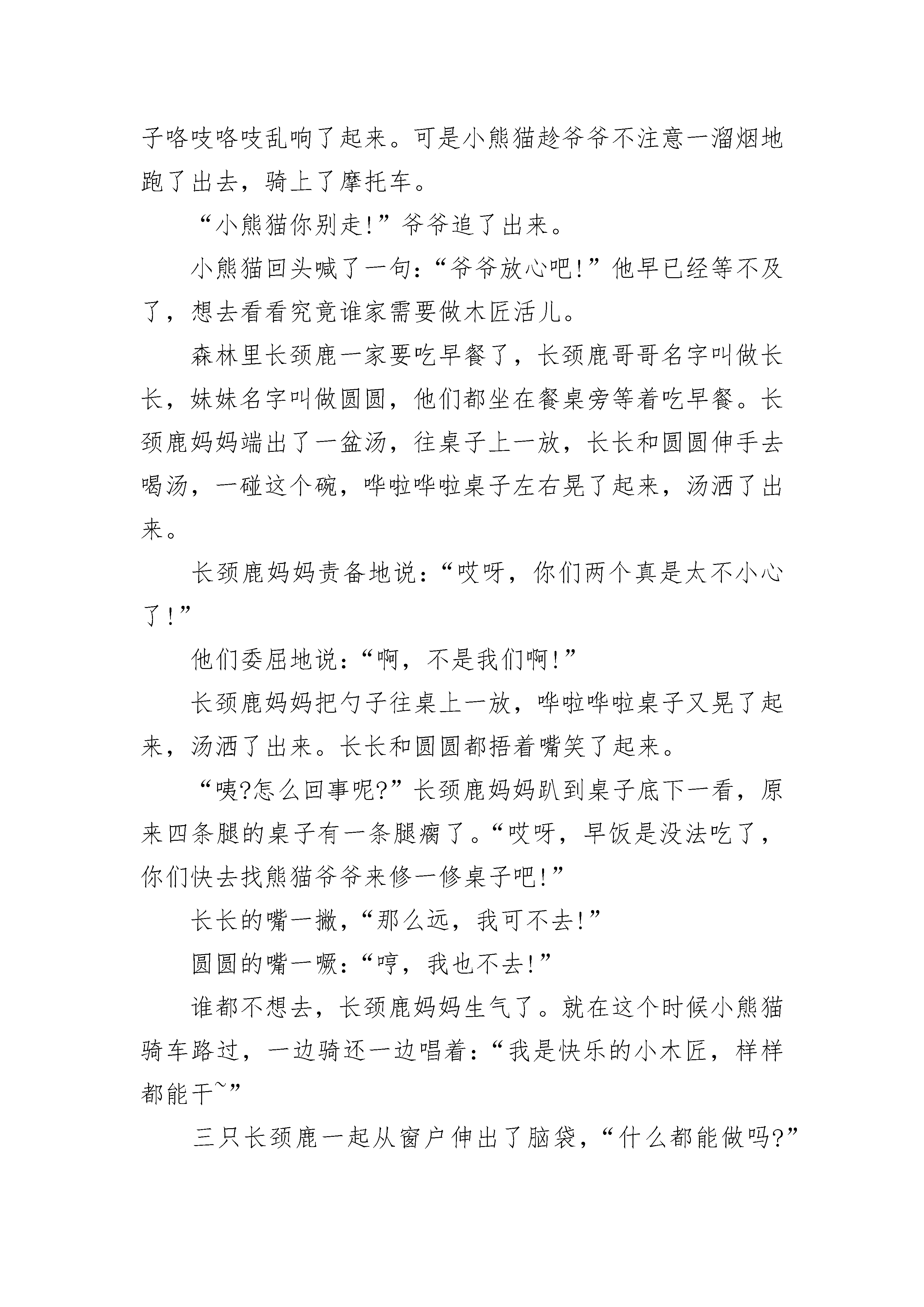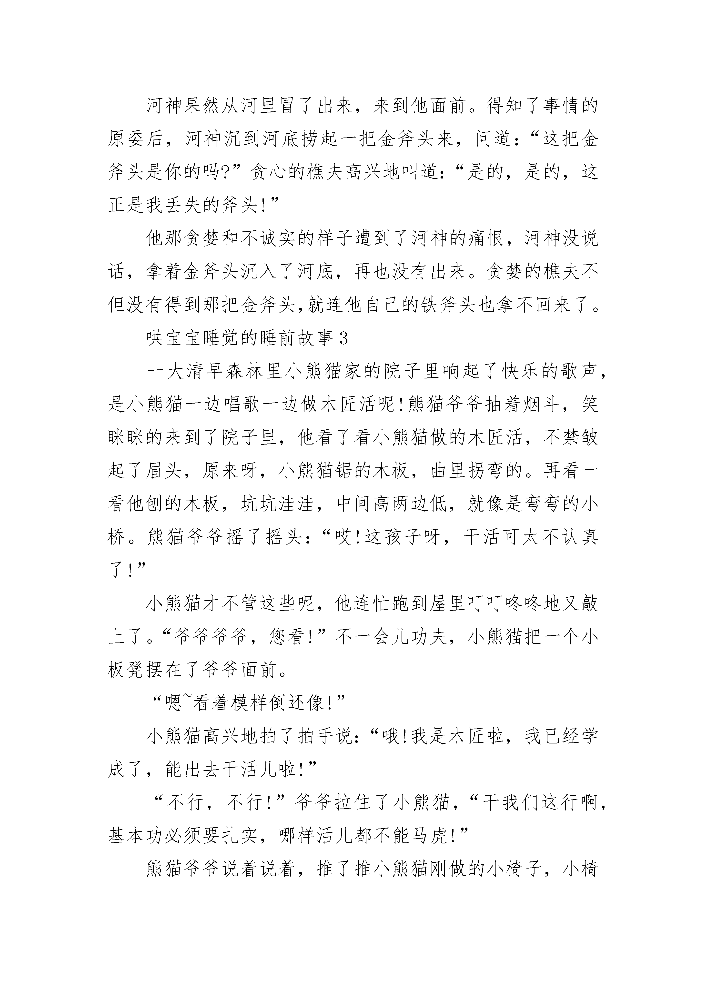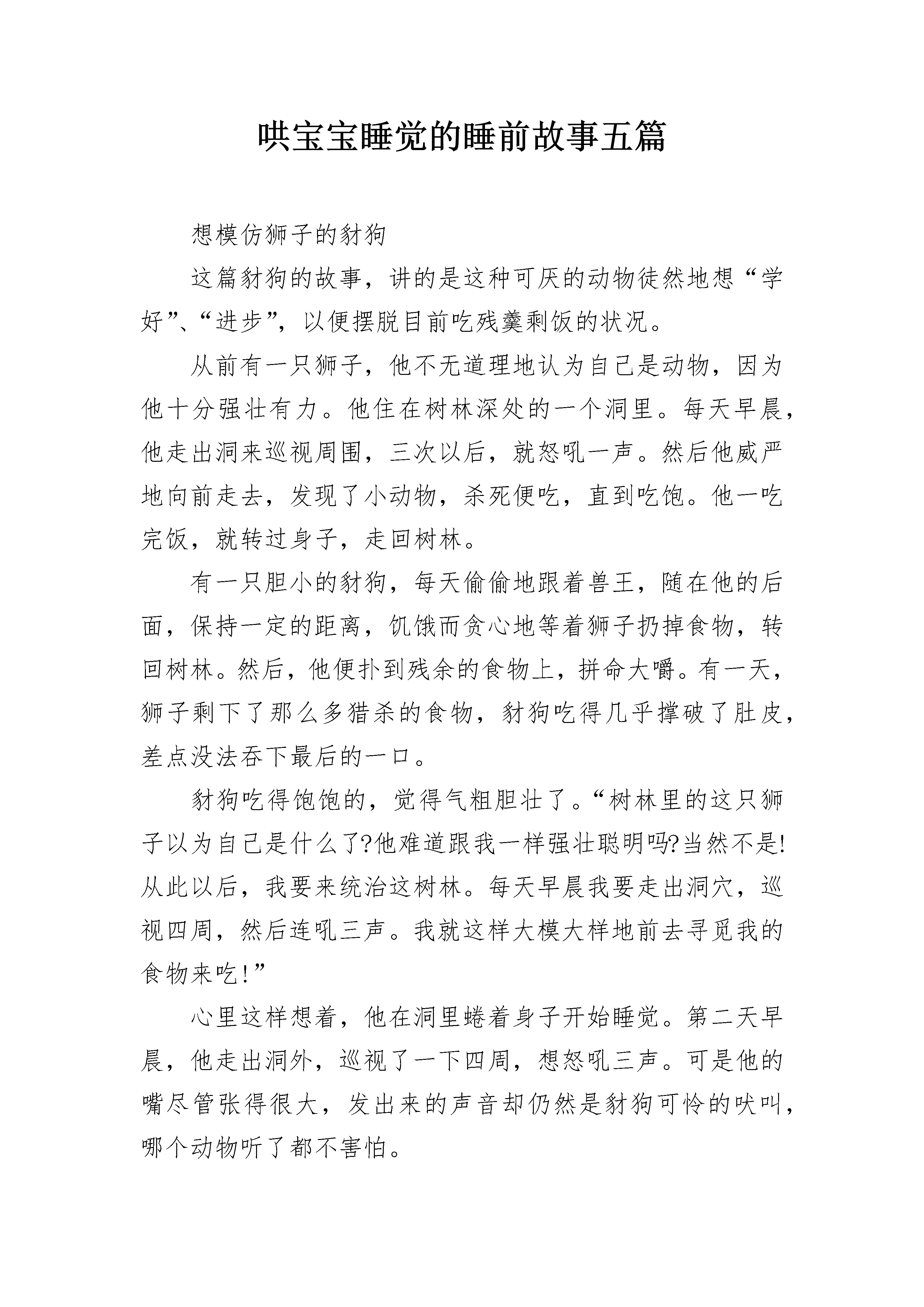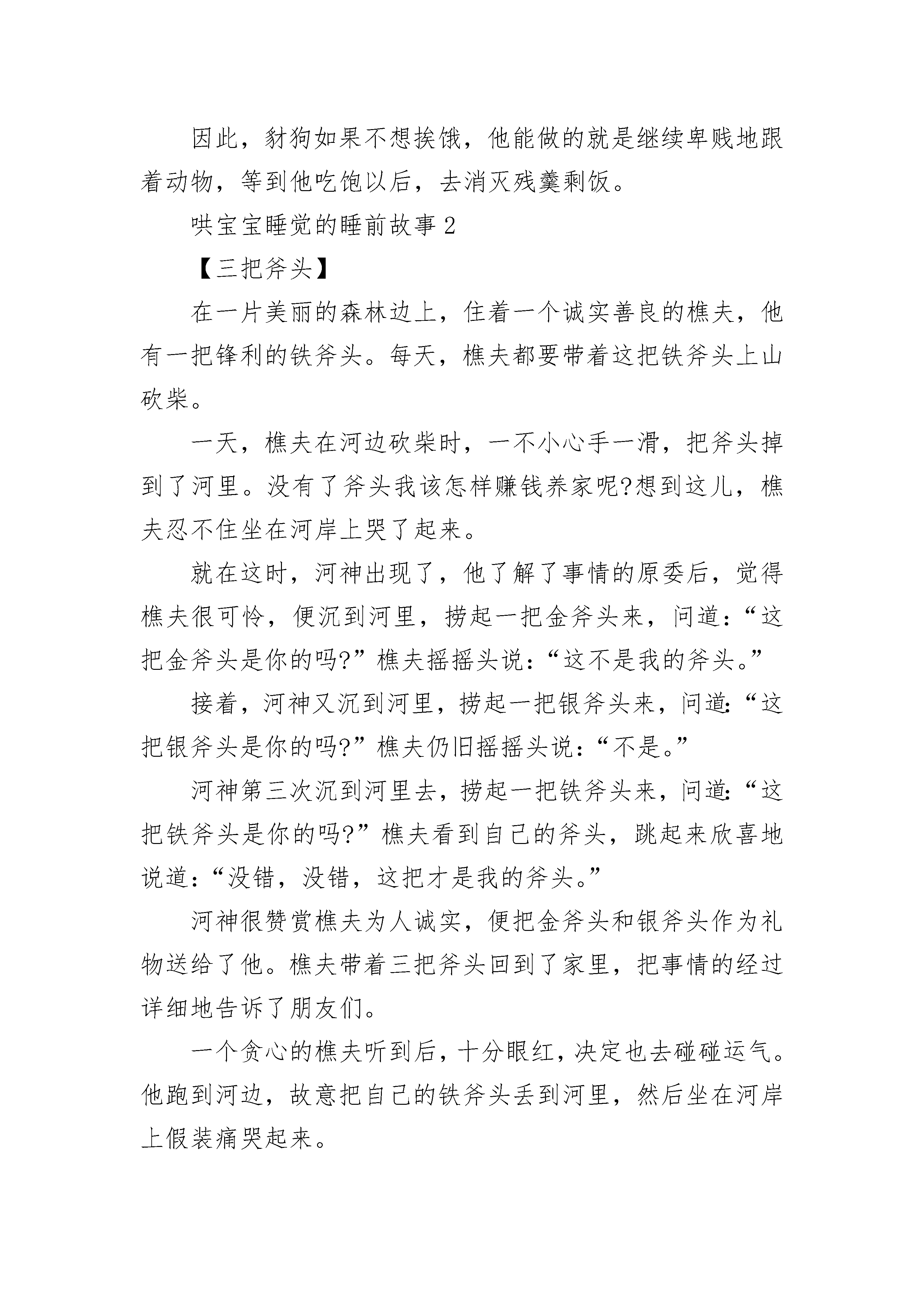 哄宝宝睡觉的睡前故事五篇想模仿狮子的豺狗这篇豺狗的故事,讲的是这种可厌的动物徒然地想“学好”、“进步”,以便摆脱目前吃残羹剩饭的状况。从前有一只狮子,他不无道理地认为自己是动物,因为他十分强壮有力。他住在树林深处的一个洞里。每天早晨,他走出洞来巡视周围,三次以后,就怒吼一声。然后他威严地向前走去,发现了小动物,杀死便吃,直到吃饱。他一吃完饭,就转过身子,走回树林。有一只胆小的豺狗,每天偷偷地跟着兽王,随在他的后面,保持一定的距离,饥饿而贪心地等着狮子扔掉食物,转回树林。然后,他便扑到残余的食物上,拼命大嚼。有一天,狮子剩下了那么多猎杀的食物,豺狗吃得几乎撑破了肚皮,差点没法吞下最后的一口。豺狗吃得饱饱的,觉得气粗胆壮了。“树林里的这只狮子以为自己是什么了?他难道跟我一样强壮聪明吗?当然不是!从此以后,我要来统治这树林。每天早晨我要走出洞穴,巡视四周,然后连吼三声。我就这样大模大样地前去寻觅我的食物来吃!”心里这样想着,他在洞里蜷着身子开始睡觉。第二天早晨,他走出洞外,巡视了一下四周,想怒吼三声。可是他的嘴尽管张得很大,发出来的声音却仍然是豺狗可怜的吠叫,哪个动物听了都不害怕。因此,豺狗如果不想挨饿,他能做的就是继续卑贱地跟着动物,等到他吃饱以后,去消灭残羹剩饭。哄宝宝睡觉的睡前故事2【三把斧头】在一片美丽的森林边上,住着一个诚实善良的樵夫,他有一把锋利的铁斧头。每天,樵夫都要带着这把铁斧头上山砍柴。一天,樵夫在河边砍柴时,一不小心手一滑,把斧头掉到了河里。没有了斧头我该怎样赚钱养家呢?想到这儿,樵夫忍不住坐在河岸上哭了起来。就在这时,河神出现了,他了解了事情的原委后,觉得樵夫很可怜,便沉到河里,捞起一把金斧头来,问道:“这把金斧头是你的吗?”樵夫摇摇头说:“这不是我的斧头。”接着,河神又沉到河里,捞起一把银斧头来,问道:“这把银斧头是你的吗?”樵夫仍旧摇摇头说:“不是。”河神第三次沉到河里去,捞起一把铁斧头来,问道:“这把铁斧头是你的吗?”樵夫看到自己的斧头,跳起来欣喜地说道:“没错,没错,这把才是我的斧头。”河神很赞赏樵夫为人诚实,便把金斧头和银斧头作为礼物送给了他。樵夫带着三把斧头回到了家里,把事情的经过详细地告诉了朋友们。一个贪心的樵夫听到后,十分眼红,决定也去碰碰运气。他跑到河边,故意把自己的铁斧头丢到河里,然后坐在河岸上假装痛哭起来。河神果然从河里冒了出来,来到他面前。得知了事情的原委后,河神沉到河底捞起一把金斧头来,问道:“这把金斧头是你的吗?”贪心的樵夫高兴地叫道:“是的,是的,这正是我丢失的斧头!”他那贪婪和不诚实的样子遭到了河神的痛恨,河神没说话,拿着金斧头沉入了河底,再也没有出来。贪婪的樵夫不但没有得到那把金斧头,就连他自己的铁斧头也拿不回来了。哄宝宝睡觉的睡前故事3一大清早森林里小熊猫家的院子里响起了快乐的歌声,是小熊猫一边唱歌一边做木匠活呢!熊猫爷爷抽着烟斗,笑眯眯的来到了院子里,他看了看小熊猫做的木匠活,不禁皱起了眉头,原来呀,小熊猫锯的木板,曲里拐弯的。再看一看他刨的木板,坑坑洼洼,中间高两边低,就像是弯弯的小桥。熊猫爷爷摇了摇头:“哎!这孩子呀,干活可太不认真了!”小熊猫才不管这些呢,他连忙跑到屋里叮叮咚咚地又敲上了。“爷爷爷爷,您看!”不一会儿功夫,小熊猫把一个小板凳摆在了爷爷面前。“嗯~看着模样倒还像!”小熊猫高兴地拍了拍手说:“哦!我是木匠啦,我已经学成了,能出去干活儿啦!”“不行,不行!”爷爷拉住了小熊猫,“干我们这行啊,基本功必须要扎实,哪样活儿都不能马虎!”熊猫爷爷说着说着,推了推小熊猫刚做的小椅子,小椅子咯吱咯吱乱响了起来。可是小熊猫趁爷爷不注意一溜烟地跑了出去,骑上了摩托车。“小熊猫你别走!”爷爷追了出来。小熊猫回头喊了一句:“爷爷放心吧!”他早已经等不及了,想去看看究竟谁家需要做木匠活儿。森林里长颈鹿一家要吃早餐了,长颈鹿哥哥名字叫做长长,妹妹名字叫做圆圆,他们都坐在餐桌旁等着吃早餐。长颈鹿妈妈端出了一盆汤,往桌子上一放,长长和圆圆伸手去喝汤,一碰这个碗,哗啦哗啦桌子左右晃了起来,汤洒了出来。长颈鹿妈妈责备地说:“哎呀,你们两个真是太不小心了!”他们委屈地说:“啊,不是我们啊!”长颈鹿妈妈把勺子往桌上一放,哗啦哗啦桌子又晃了起来,汤洒了出来。长长和圆圆都捂着嘴笑了起来。“咦?怎么回事呢?”长颈鹿妈妈趴到桌子底下一看,原来四条腿的桌子有一条腿瘸了。“哎呀,早饭是没法吃了,你们快去找熊猫爷爷来修一修桌子吧!”长长的嘴一撇,“那么远,我可不去!”圆圆的嘴一噘:“哼,我也不去!”谁都不想去,长颈鹿妈妈生气了。就在这个时候小熊猫骑车路过,一边骑还一边唱着:“我是快乐的小木匠,样样都能干~”三只长颈鹿一起从窗户伸出了脑袋,“什么都能做吗?”小熊猫回答:“当然啦!”“那瘸腿的桌子你能修吗?