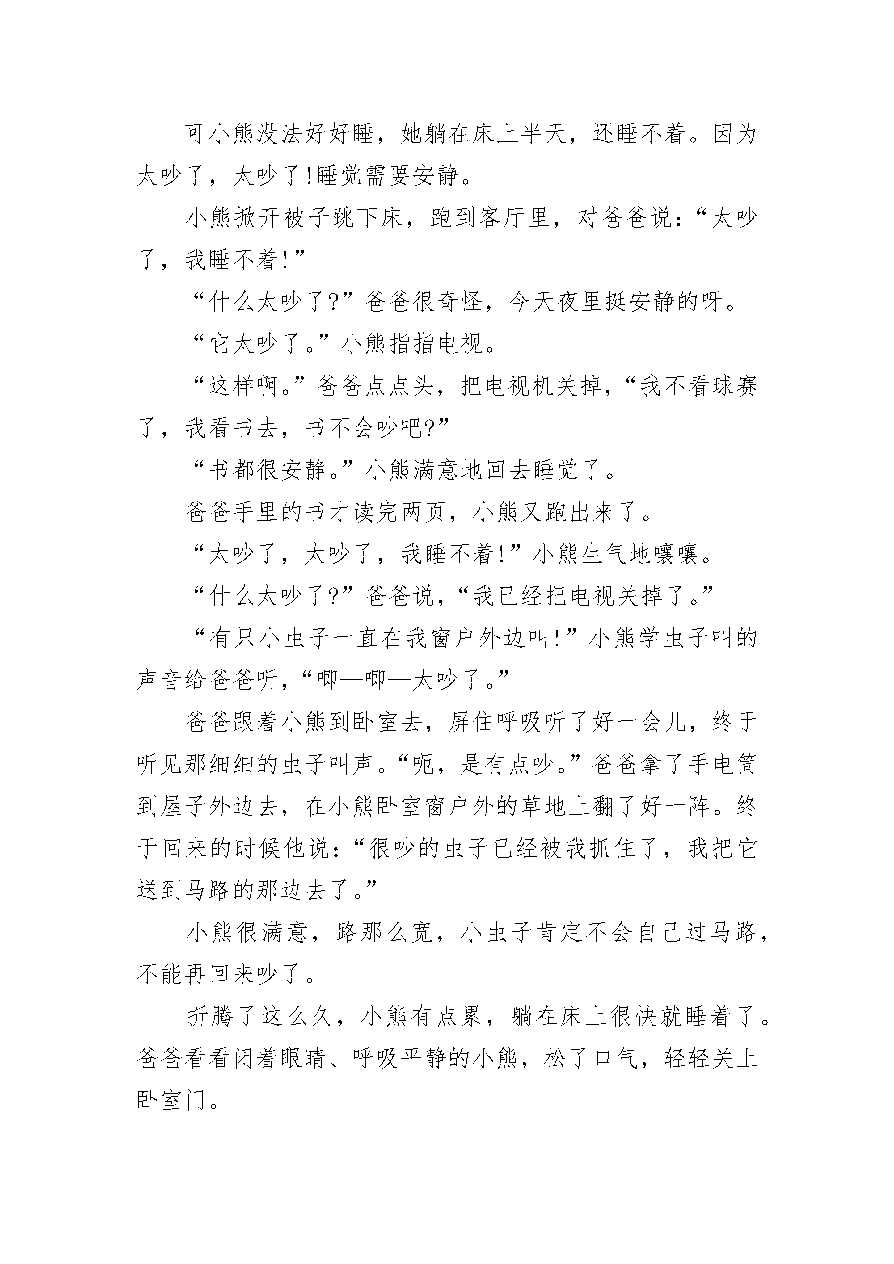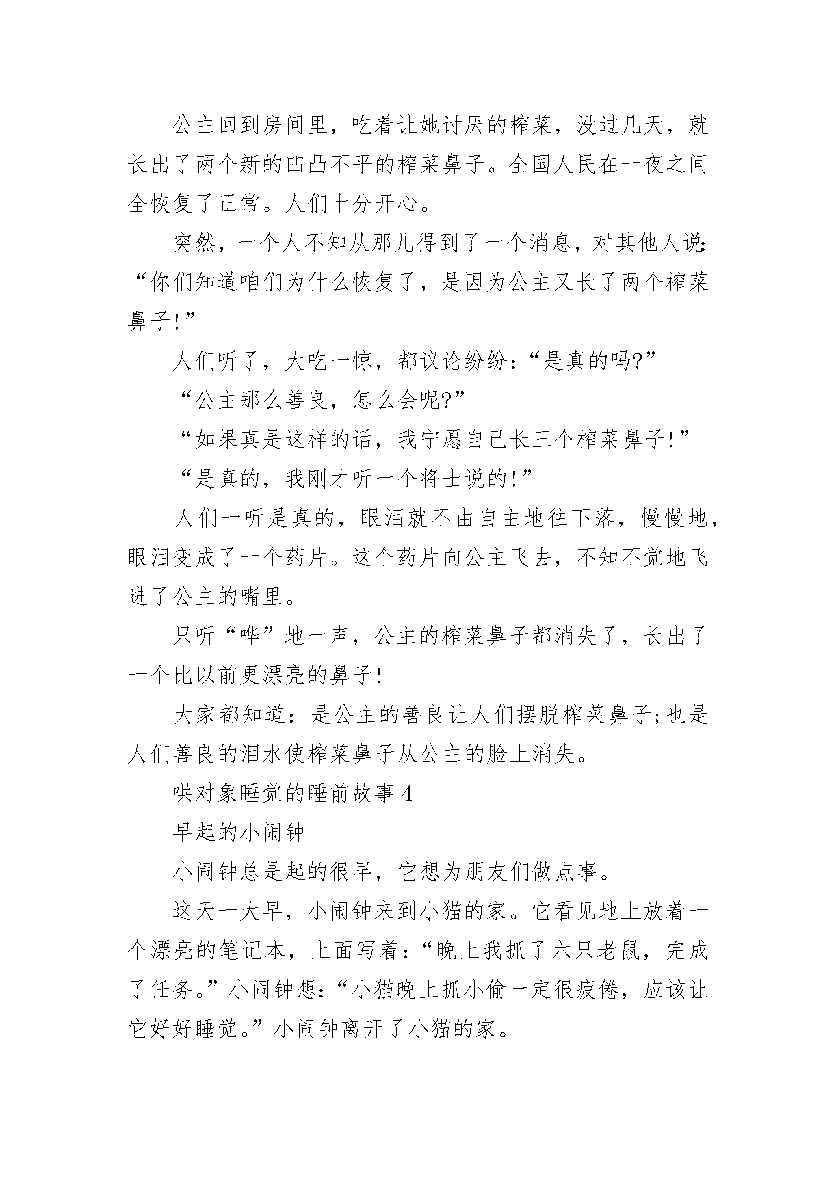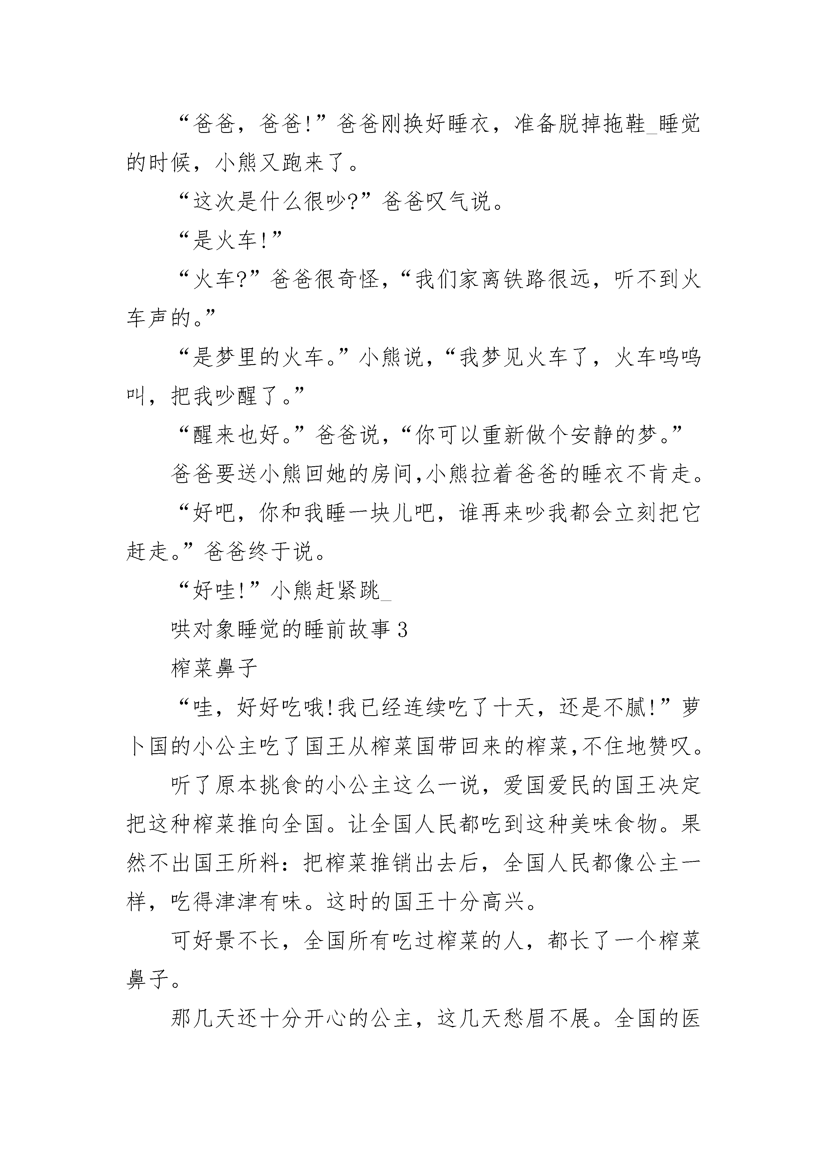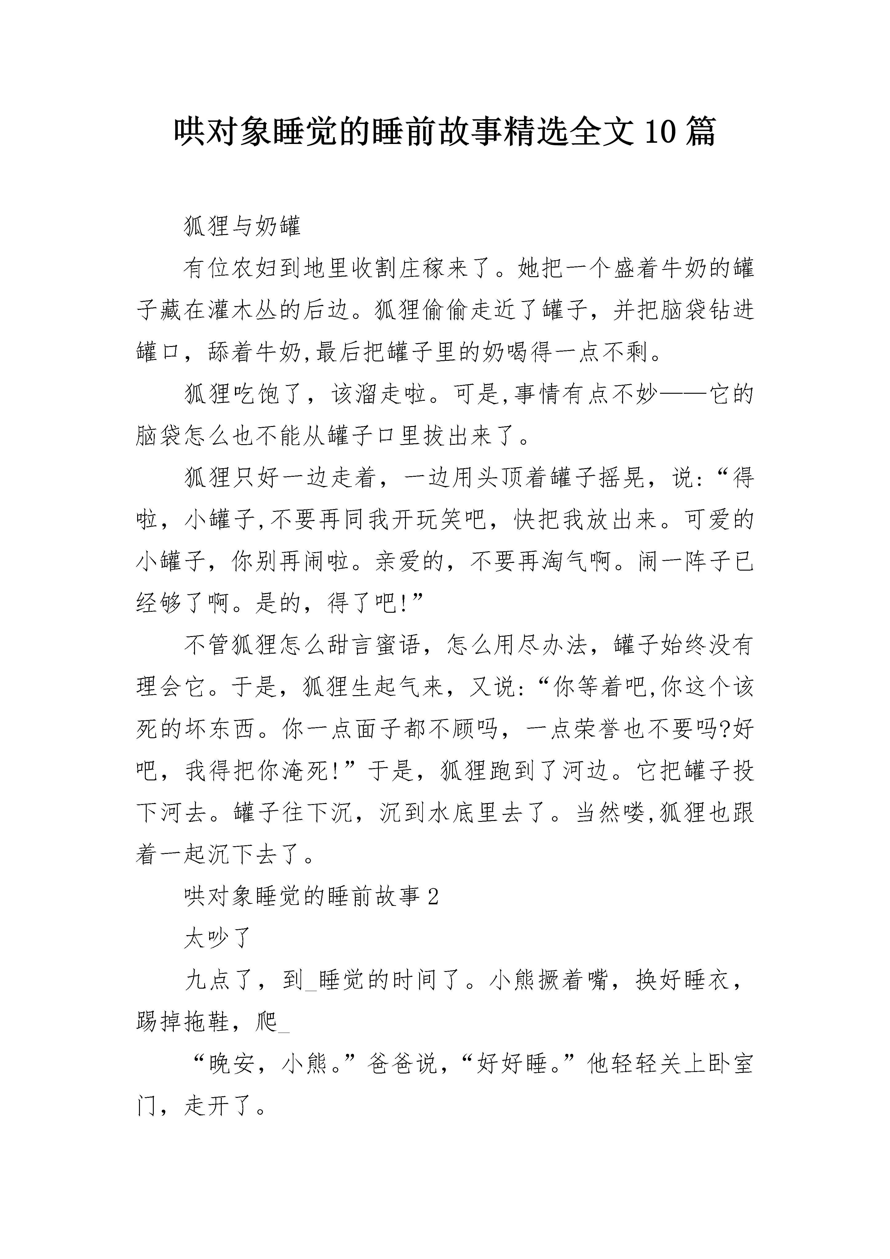 哄对象睡觉的睡前故事精选全文10篇狐狸与奶罐有位农妇到地里收割庄稼来了。她把一个盛着牛奶的罐子藏在灌木丛的后边。狐狸偷偷走近了罐子,并把脑袋钻进罐口,舔着牛奶,最后把罐子里的奶喝得一点不剩。狐狸吃饱了,该溜走啦。可是,事情有点不妙——它的脑袋怎么也不能从罐子口里拔出来了。狐狸只好一边走着,一边用头顶着罐子摇晃,说:“得啦,小罐子,不要再同我开玩笑吧,快把我放出来。可爱的小罐子,你别再闹啦。亲爱的,不要再淘气啊。闹一阵子已经够了啊。是的,得了吧!”不管狐狸怎么甜言蜜语,怎么用尽办法,罐子始终没有理会它。于是,狐狸生起气来,又说:“你等着吧,你这个该死的坏东西。你一点面子都不顾吗,一点荣誉也不要吗?好吧,我得把你淹死!”于是,狐狸跑到了河边。它把罐子投下河去。罐子往下沉,沉到水底里去了。当然喽,狐狸也跟着一起沉下去了。哄对象睡觉的睡前故事2太吵了九点了,到_睡觉的时间了。小熊撅着嘴,换好睡衣,踢掉拖鞋,爬_“晚安,小熊。”爸爸说,“好好睡。”他轻轻关上卧室门,走开了。可小熊没法好好睡,她躺在床上半天,还睡不着。因为太吵了,太吵了!睡觉需要安静。小熊掀开被子跳下床,跑到客厅里,对爸爸说:“太吵了,我睡不着!”“什么太吵了?”爸爸很奇怪,今天夜里挺安静的呀。“它太吵了。”小熊指指电视。“这样啊。”爸爸点点头,把电视机关掉,“我不看球赛了,我看书去,书不会吵吧?”“书都很安静。”小熊满意地回去睡觉了。爸爸手里的书才读完两页,小熊又跑出来了。“太吵了,太吵了,我睡不着!”小熊生气地嚷嚷。“什么太吵了?”爸爸说,“我已经把电视关掉了。”“有只小虫子一直在我窗户外边叫!”小熊学虫子叫的声音给爸爸听,“唧—唧—太吵了。”爸爸跟着小熊到卧室去,屏住呼吸听了好一会儿,终于听见那细细的虫子叫声。“呃,是有点吵。”爸爸拿了手电筒到屋子外边去,在小熊卧室窗户外的草地上翻了好一阵。终于回来的时候他说:“很吵的虫子已经被我抓住了,我把它送到马路的那边去了。”小熊很满意,路那么宽,小虫子肯定不会自己过马路,不能再回来吵了。折腾了这么久,小熊有点累,躺在床上很快就睡着了。爸爸看看闭着眼睛、呼吸平静的小熊,松了口气,轻轻关上卧室门。“爸爸,爸爸!”爸爸刚换好睡衣,准备脱掉拖鞋_睡觉的时候,小熊又跑来了。“这次是什么很吵?”爸爸叹气说。“是火车!”“火车?”爸爸很奇怪,“我们家离铁路很远,听不到火车声的。”“是梦里的火车。”小熊说,“我梦见火车了,火车呜呜叫,把我吵醒了。”“醒来也好。”爸爸说,“你可以重新做个安静的梦。”爸爸要送小熊回她的房间,小熊拉着爸爸的睡衣不肯走。“好吧,你和我睡一块儿吧,谁再来吵我都会立刻把它赶走。”爸爸终于说。“好哇!”小熊赶紧跳_哄对象睡觉的睡前故事3榨菜鼻子“哇,好好吃哦!我已经连续吃了十天,还是不腻!”萝卜国的小公主吃了国王从榨菜国带回来的榨菜,不住地赞叹。听了原本挑食的小公主这么一说,爱国爱民的国王决定把这种榨菜推向全国。让全国人民都吃到这种美味食物。果然不出国王所料:把榨菜推销出去后,全国人民都像公主一样,吃得津津有味。这时的国王十分高兴。可好景不长,全国所有吃过榨菜的人,都长了一个榨菜鼻子。那几天还十分开心的公主,这几天愁眉不展。全国的医生都无能为力。国王非常着急,头上的皱纹都“生”出“小宝宝”了!原来亭亭玉立的公主现在变得十分丑陋,每天都哭哭啼啼的。有一个偶然的机会,从医学国来了一位大名鼎鼎的医生。国王知道后,急忙召见了他。医生说,他一定能治好这种病。不过,他要见一下公主。本来不愿意见人的小公主,见有了希望,顾不上自己的形象,召见了医生。医生见了公主,在公主的耳朵边,悄悄地说:“公主,长榨菜鼻子是因为你们一下子吃得太多,而且吃得太急,的药方就是——”“是什么?”公主急切地问。医生吞吞吐吐地说“是......是让您再长......再长两个凹凸不平的榨菜鼻子,才能让全国人民摆脱讨厌的榨菜鼻子。”公主听了,心里难受极了,自己长一个榨菜鼻子已经够难看。再长两个凹凸不平的榨菜鼻子,自己不就成了世界上最丑的女孩子了吗?但是,公主转念一想,自己丑点没什么,让全国人民摆脱榨菜鼻子才是最重要的。她想到这里,咬了咬牙,答应了。医生对国王说了这个计划,国王死活不答应。这时,公主出来了,说“父王,女儿丑点没什么,让大家恢复了,那才是最重要的!”听了公主的话,国王只好答应了。公主回到房间里,吃着让她讨厌的榨菜,没过几天,就长出了两个新的凹凸不平的榨菜鼻子。全国人民在一夜之间全恢复了正常。人们十分开心。突然,一个人不知从那儿得到了一个消息,对其他人说:“你们知道咱们为什么恢复了,是因为公主又长了两个榨菜鼻子!”人们听了,大吃一惊,都议论纷纷:“是真的吗?”“公主那么善良,怎么会呢?”“如果真是这样的话,我宁愿自己长三个榨菜鼻子!”“是真的,我刚才听