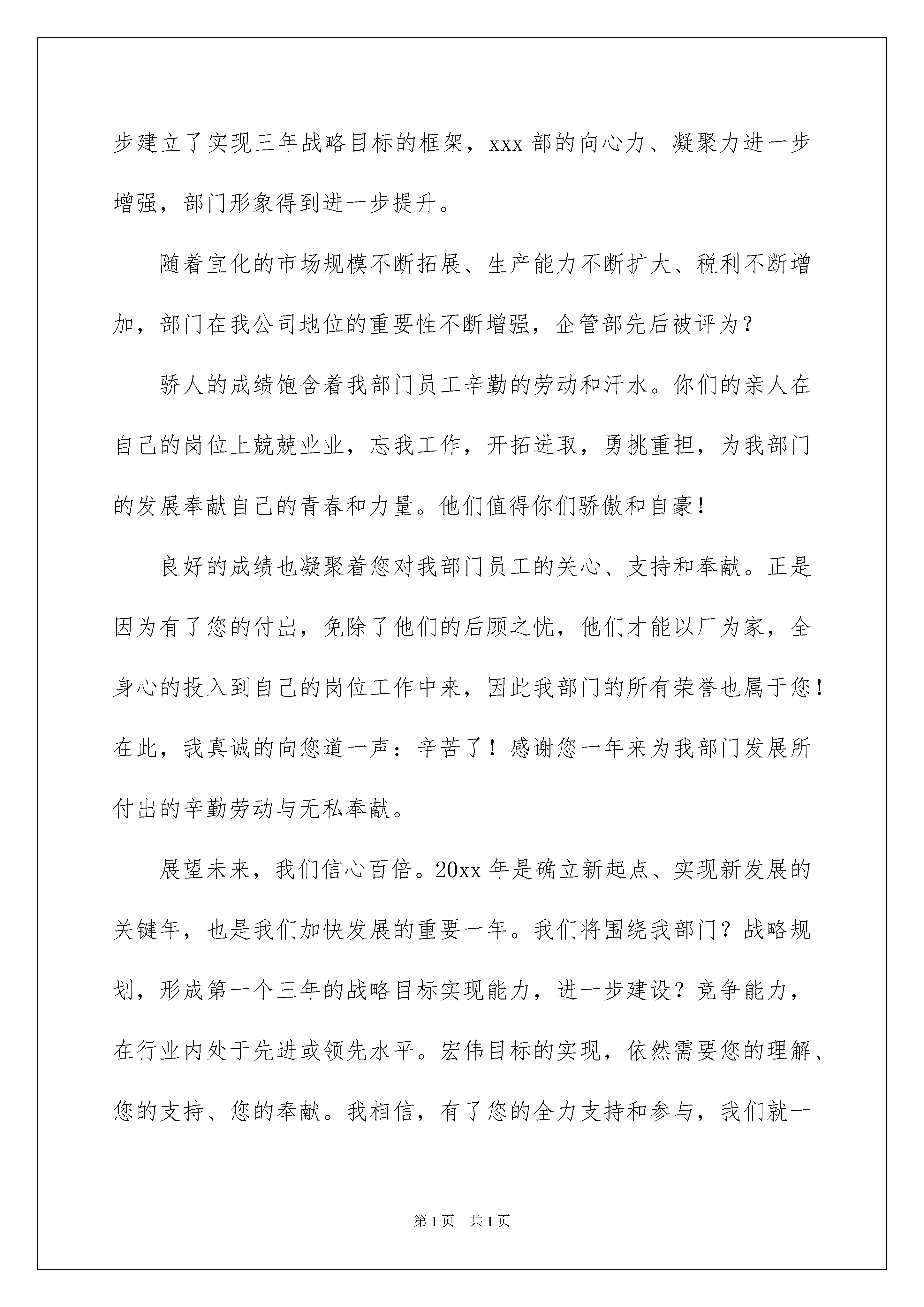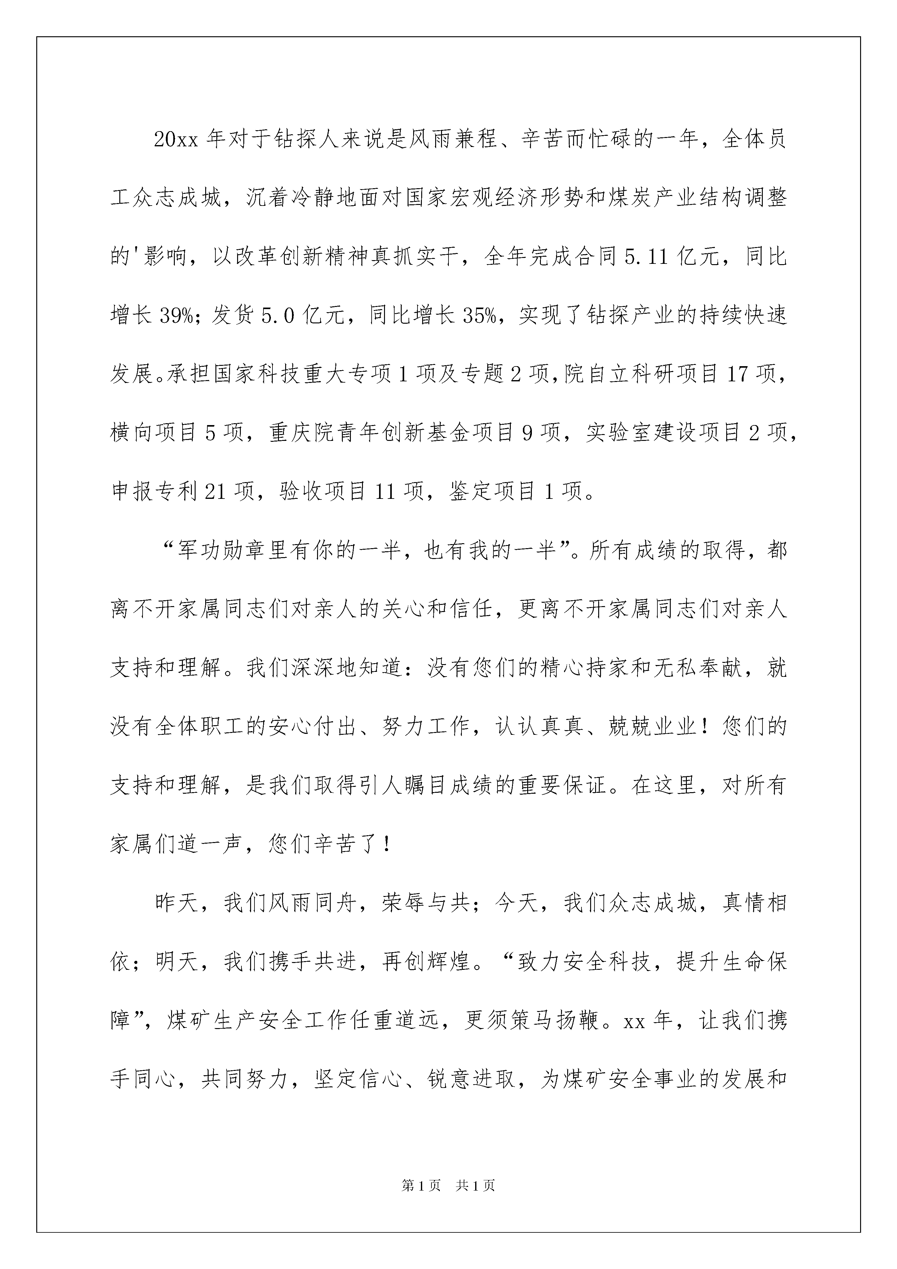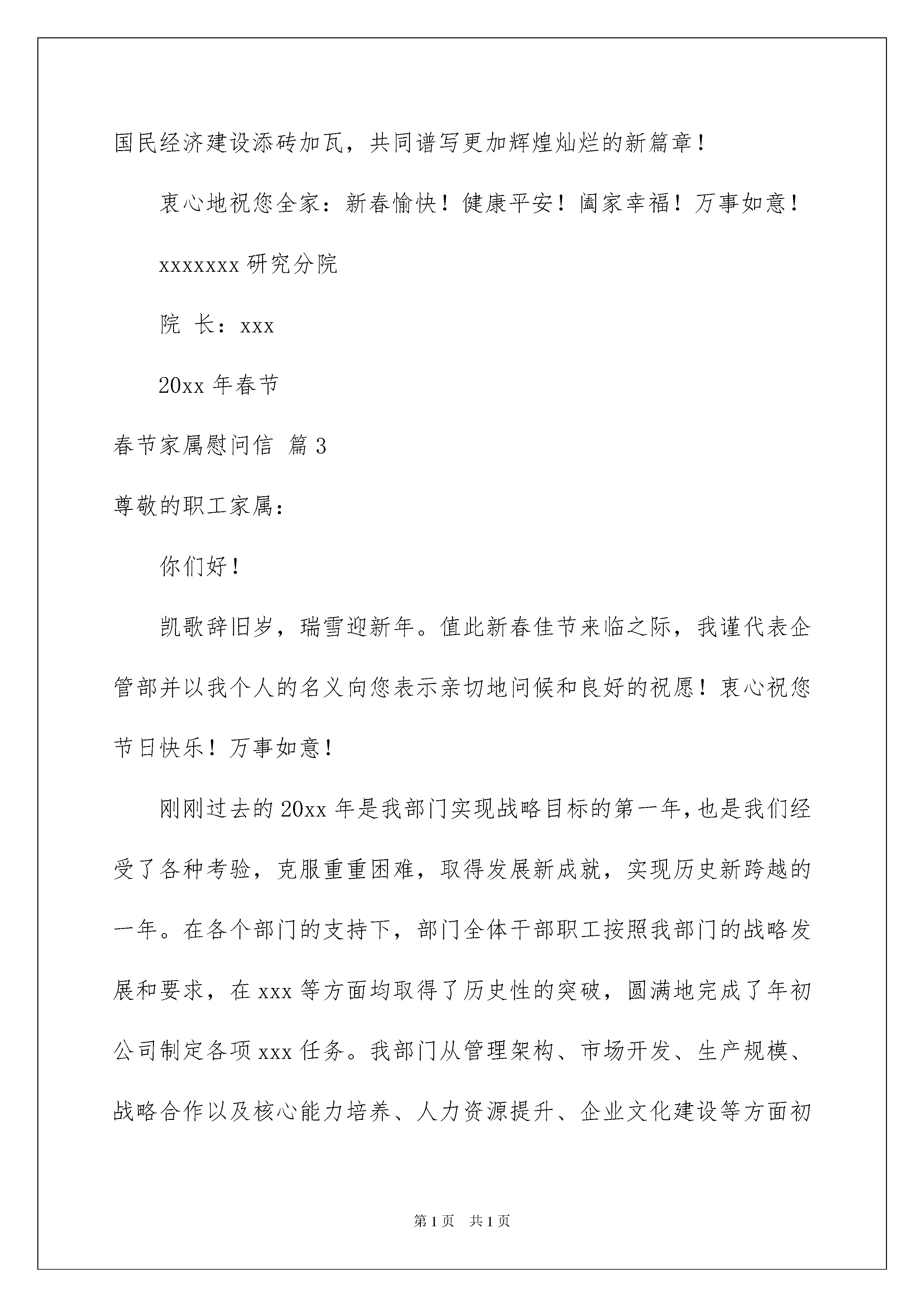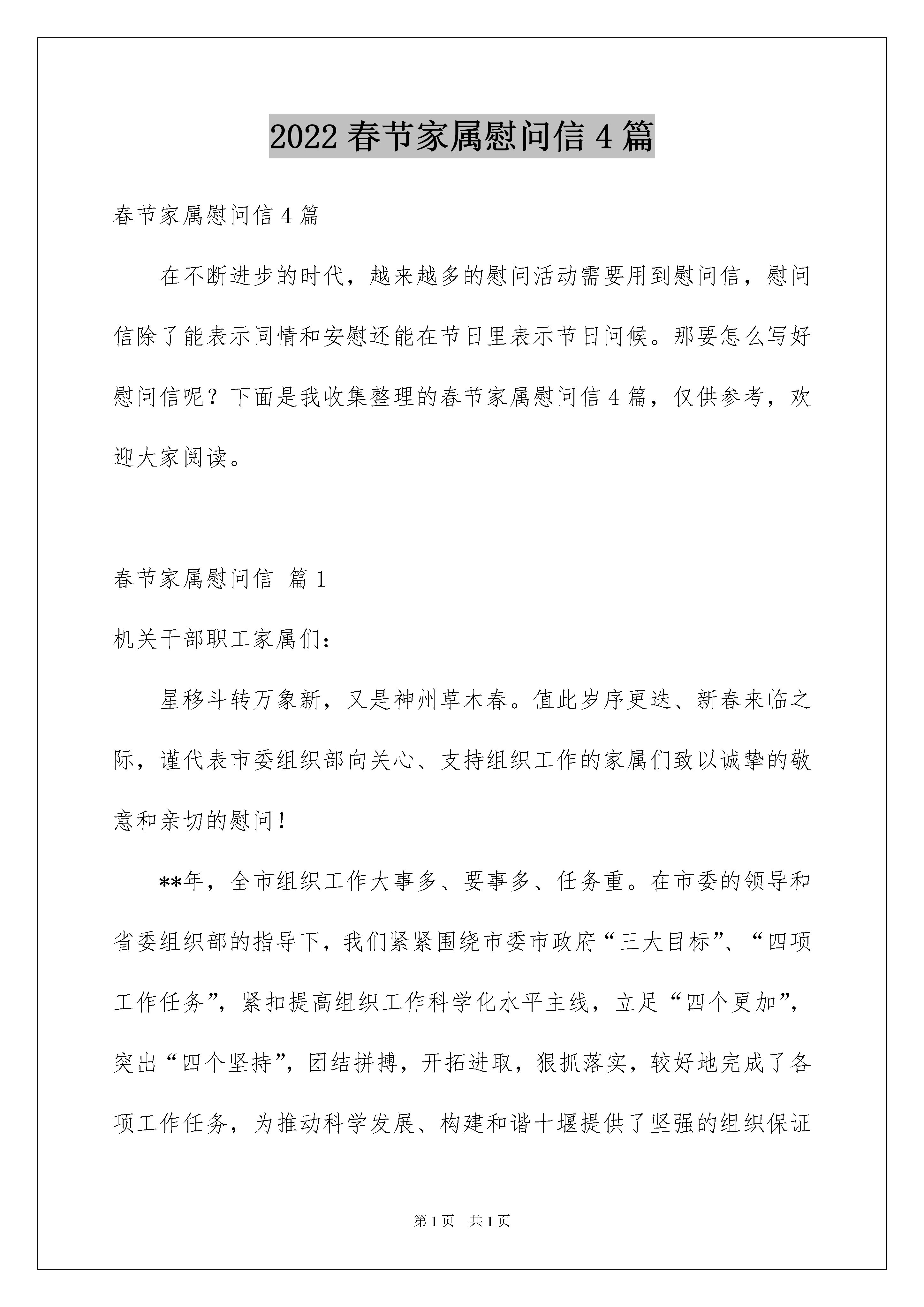 2022春节家属慰问信4篇春节家属慰问信4篇在不断进步的时代,越来越多的慰问活动需要用到慰问信,慰问信除了能表示同情和安慰还能在节日里表示节日问候。那要怎么写好慰问信呢?下面是我收集整理的春节家属慰问信4篇,仅供参考,欢迎大家阅读。春节家属慰问信篇1机关干部职工家属们:星移斗转万象新,又是神州草木春。值此岁序更迭、新春来临之际,谨代表市委组织部向关心、支持组织工作的家属们致以诚挚的敬意和亲切的慰问!**年,全市组织工作大事多、要事多、任务重。在市委的领导和省委组织部的指导下,我们紧紧围绕市委市政府“三大目标”、“四项工作任务”,紧扣提高组织工作科学化水平主线,立足“四个更加”,突出“四个坚持”,团结拼搏,开拓进取,狠抓落实,较好地完成了各项工作任务,为推动科学发展、构建和谐十堰提供了坚强的组织保证和人才支持。这些成绩饱含着全市组工干部辛勤的劳动和汗水,更凝聚着你们的理解、关心和支持,在这里真诚地道一声:“谢谢你们!”展望未来,催人奋进。**年是**的开局之年,也是推进十堰市跨越式发展的开局之年,我们的任务更艰巨、责任更重大。我们的工作,依然需要你们的充分理解和大力支持。我们相信,有你们的全力支持和参与,一定能够进一步振奋精神、团结协作、扎实工作、再接再厉、乘势而上,为推动全市经济社会又好又快发展再立新功,为实施“一城两带”战略再作新贡献!最后,衷心祝愿你们春节快乐、身体健康、工作顺利、阖家幸福!xxxx**年春节**年月日春节家属慰问信篇2尊敬的员工家属:神州呈瑞彩满天捷报迎旭日,大地迎鼠年一路凯歌壮春风。值此辞旧迎新的美好时刻,xxxxxxxx研究分院向长期以来关心和支持分院工作的员工家属致以新春的问候和美好的祝愿!20xx年对于钻探人来说是风雨兼程、辛苦而忙碌的一年,全体员工众志成城,沉着冷静地面对国家宏观经济形势和煤炭产业结构调整的'影响,以改革创新精神真抓实干,全年完成合同5.11亿元,同比增长39%;发货5.0亿元,同比增长35%,实现了钻探产业的持续快速发展。承担国家科技重大专项1项及专题2项,院自立科研项目17项,横向项目5项,重庆院青年创新基金项目9项,实验室建设项目2项,申报专利21项,验收项目11项,鉴定项目1项。“军功勋章里有你的一半,也有我的一半”。所有成绩的取得,都离不开家属同志们对亲人的关心和信任,更离不开家属同志们对亲人支持和理解。我们深深地知道:没有您们的精心持家和无私奉献,就没有全体职工的安心付出、努力工作,认认真真、兢兢业业!您们的支持和理解,是我们取得引人瞩目成绩的重要保证。在这里,对所有家属们道一声,您们辛苦了!昨天,我们风雨同舟,荣辱与共;今天,我们众志成城,真情相依;明天,我们携手共进,再创辉煌。“致力安全科技,提升生命保障”,煤矿生产安全工作任重道远,更须策马扬鞭。xx年,让我们携手同心,共同努力,坚定信心、锐意进取,为煤矿安全事业的发展和国民经济建设添砖加瓦,共同谱写更加辉煌灿烂的新篇章!衷心地祝您全家:新春愉快!健康平安!阖家幸福!万事如意!xxxxxxx研究分院院长:xxx20xx年春节春节家属慰问信篇3尊敬的职工家属:你们好!凯歌辞旧岁,瑞雪迎新年。值此新春佳节来临之际,我谨代表企管部并以我个人的名义向您表示亲切地问候和良好的祝愿!衷心祝您节日快乐!万事如意!刚刚过去的20xx年是我部门实现战略目标的第一年,也是我们经受了各种考验,克服重重困难,取得发展新成就,实现历史新跨越的一年。在各个部门的支持下,部门全体干部职工按照我部门的战略发展和要求,在xxx等方面均取得了历史性的突破,圆满地完成了年初公司制定各项xxx任务。我部门从管理架构、市场开发、生产规模、战略合作以及核心能力培养、人力资源提升、企业文化建设等方面初步建立了实现三年战略目标的框架,xxx部的向心力、凝聚力进一步增强,部门形象得到进一步提升。随着宜化的市场规模不断拓展、生产能力不断扩大、税利不断增加,部门在我公司地位的重要性不断增强,企管部先后被评为?骄人的成绩饱含着我部门员工辛勤的劳动和汗水。你们的亲人在自己的岗位上兢兢业业,忘我工作,开拓进取,勇挑重担,为我部门的发展奉献自己的青春和力量。他们值得你们骄傲和自豪!良好的成绩也凝聚着您对我部门员工的关心、支持和奉献。正是因为有了您的付出,免除了他们的后顾之忧,他们才能以厂为家,全身心的投入到自己的岗位工作中来,因此我部门的所有荣誉也属于您!在此,我真诚的向您道一声:辛苦了!感谢您一年来为我部门发展所付出的辛勤劳动与无私奉献。展望未来,我们信心百倍。20xx年是确立新起点、实现新发展的关键年,也是我们加快