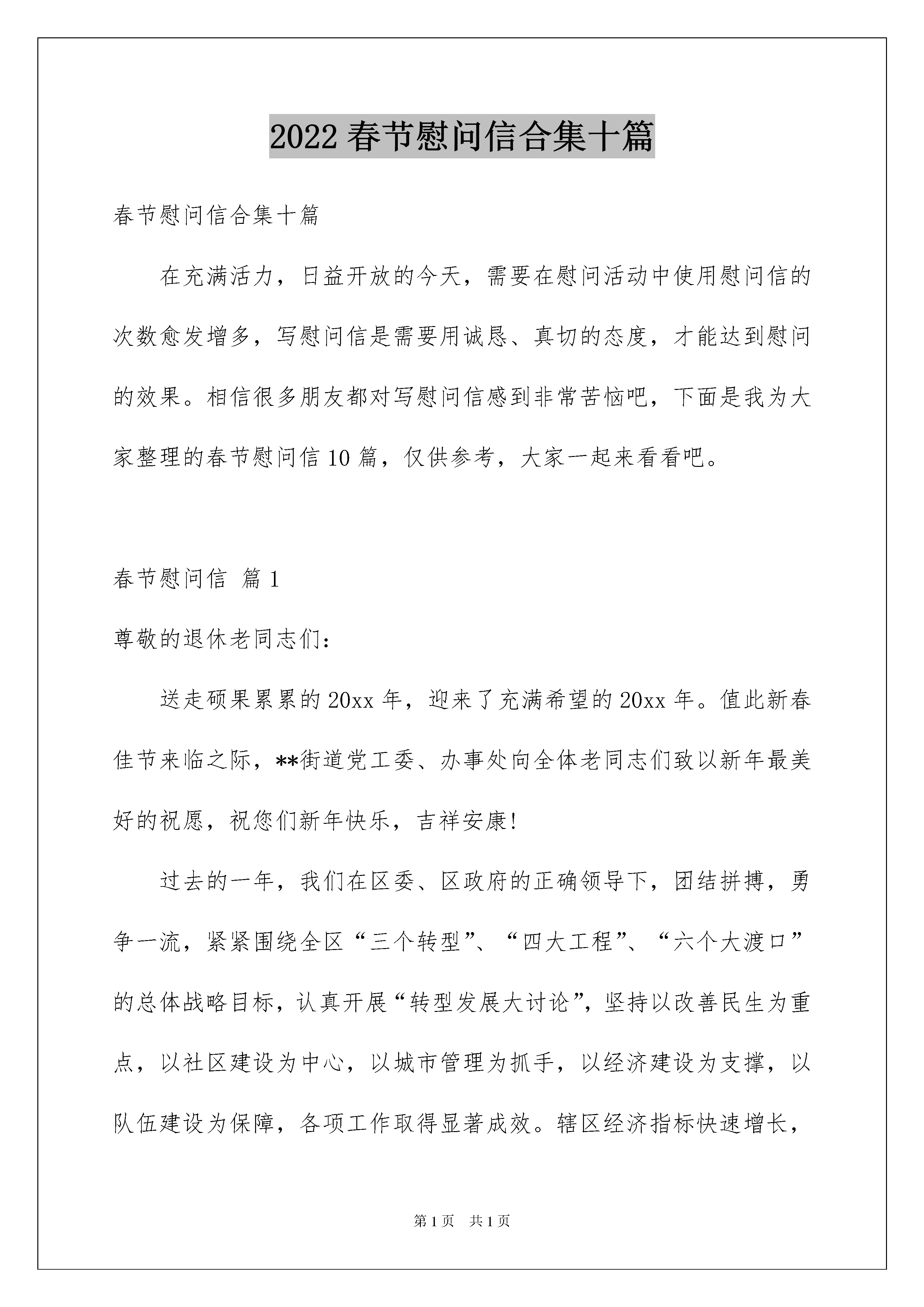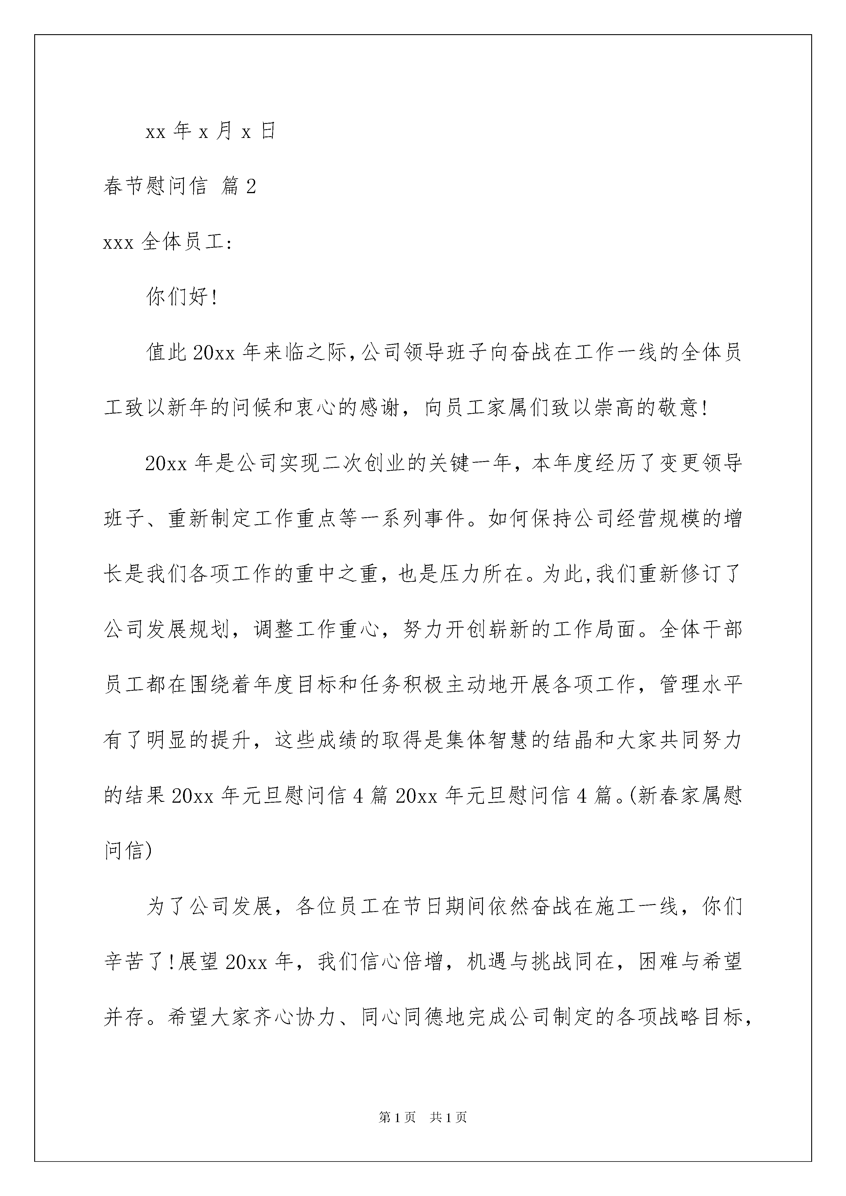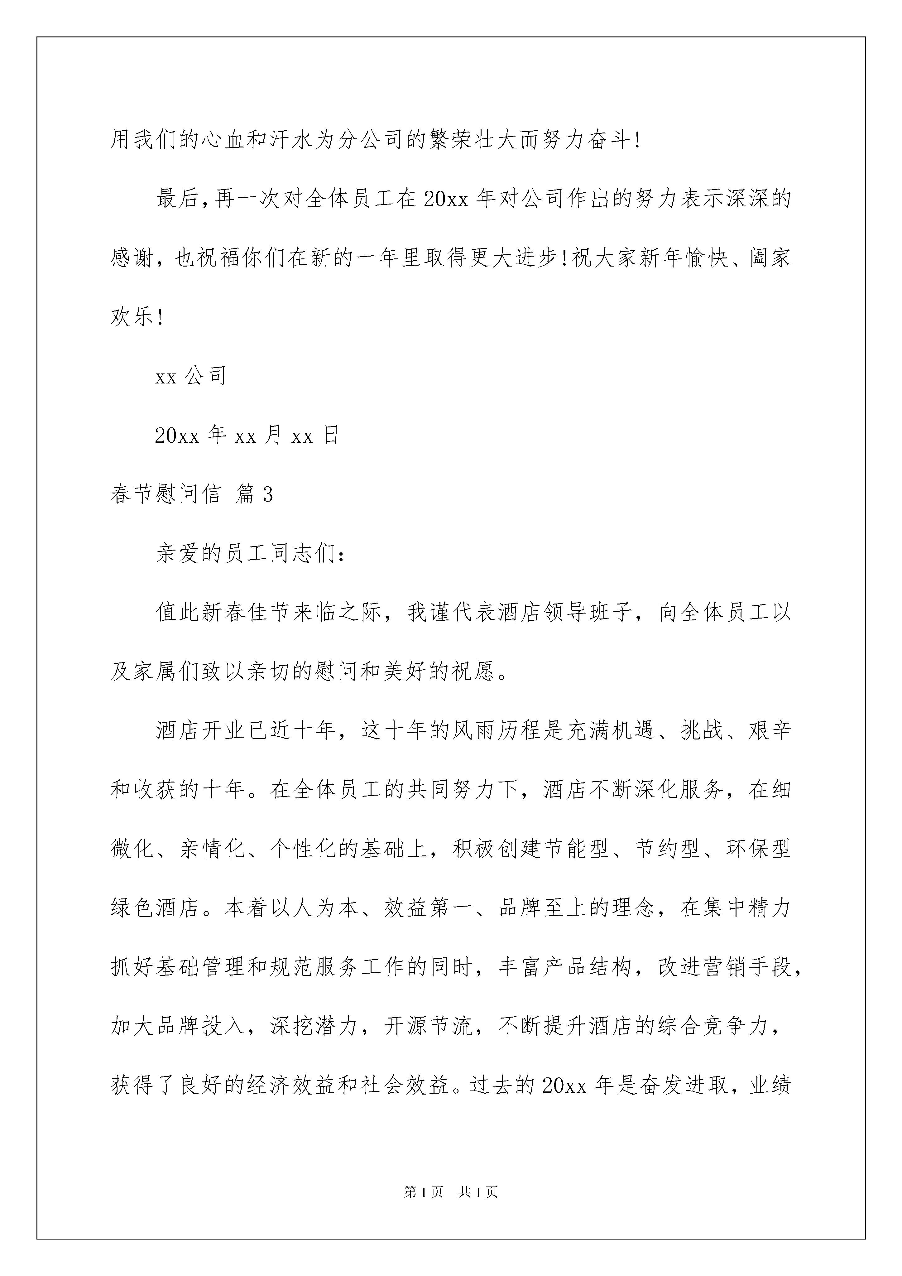 2022春节慰问信合集十篇春节慰问信合集十篇在充满活力,日益开放的今天,需要在慰问活动中使用慰问信的次数愈发增多,写慰问信是需要用诚恳、真切的态度,才能达到慰问的效果。相信很多朋友都对写慰问信感到非常苦恼吧,下面是我为大家整理的春节慰问信10篇,仅供参考,大家一起来看看吧。春节慰问信篇1尊敬的退休老同志们:送走硕果累累的20xx年,迎来了充满希望的20xx年。值此新春佳节来临之际,**街道党工委、办事处向全体老同志们致以新年最美好的祝愿,祝您们新年快乐,吉祥安康!过去的一年,我们在区委、区政府的正确领导下,团结拼搏,勇争一流,紧紧围绕全区“三个转型”、“四大工程”、“六个大渡口”的总体战略目标,认真开展“转型发展大讨论”,坚持以改善民生为重点,以社区建设为中心,以城市管理为抓手,以经济建设为支撑,以队伍建设为保障,各项工作取得显著成效。辖区经济指标快速增长,社会民生持续改善,市容整治成绩斐然,危改工作再续新篇,基层党建亮点纷呈。街道荣获“全国计划生育基层群众自治示范社区”等18项市级以上荣誉。这些成绩的取得,都凝结着您们的大力支持和无私的付出。在此,**街道党工委、办事处向您们表示衷心的感谢和崇高的敬意!回首过去,我们满怀喜悦;展望未来,我们信心满怀!20xx年,是我们抢抓新机遇,谋求新发展,实现新跨越的关键之年。我们将以只争朝夕的姿态、奋斗必胜的信心、敢为人先的精神和一往无前的勇气,坚持“民生导向”的发展道路,依托钓鱼嘴半岛开发建设的历史机遇,力求在新起点、新阶段为全区“转型发展”谱写出新篇章,全力打造“财智乐园,休闲之都”,迎接独具特色的生态、宜居、和谐、幸福“新茄街”的华丽蝶变。时至新年,诚挚祝愿各位退休老同志:新年快乐、身体健康、万事如意、阖家幸福!此致敬礼xxxxx年x月x日春节慰问信篇2xxx全体员工:你们好!值此20xx年来临之际,公司领导班子向奋战在工作一线的全体员工致以新年的问候和衷心的感谢,向员工家属们致以崇高的敬意!20xx年是公司实现二次创业的关键一年,本年度经历了变更领导班子、重新制定工作重点等一系列事件。如何保持公司经营规模的增长是我们各项工作的重中之重,也是压力所在。为此,我们重新修订了公司发展规划,调整工作重心,努力开创崭新的工作局面。全体干部员工都在围绕着年度目标和任务积极主动地开展各项工作,管理水平有了明显的提升,这些成绩的取得是集体智慧的结晶和大家共同努力的结果20xx年元旦慰问信4篇20xx年元旦慰问信4篇。(新春家属慰问信)为了公司发展,各位员工在节日期间依然奋战在施工一线,你们辛苦了!展望20xx年,我们信心倍增,机遇与挑战同在,困难与希望并存。希望大家齐心协力、同心同德地完成公司制定的各项战略目标,用我们的心血和汗水为分公司的繁荣壮大而努力奋斗!最后,再一次对全体员工在20xx年对公司作出的努力表示深深的感谢,也祝福你们在新的一年里取得更大进步!祝大家新年愉快、阖家欢乐!xx公司20xx年xx月xx日春节慰问信篇3亲爱的员工同志们:值此新春佳节来临之际,我谨代表酒店领导班子,向全体员工以及家属们致以亲切的慰问和美好的祝愿。酒店开业已近十年,这十年的风雨历程是充满机遇、挑战、艰辛和收获的十年。在全体员工的共同努力下,酒店不断深化服务,在细微化、亲情化、个性化的基础上,积极创建节能型、节约型、环保型绿色酒店。本着以人为本、效益第一、品牌至上的理念,在集中精力抓好基础管理和规范服务工作的同时,丰富产品结构,改进营销手段,加大品牌投入,深挖潜力,开源节流,不断提升酒店的综合竞争力,获得了良好的经济效益和社会效益。过去的20xx年是奋发进取,业绩辉煌的一年,全体员工在上级公司的正确领导下,求真务实,开拓创新,扎实工作,在激烈的市场竞争中,克服各种困难,超额完成了各项目标和工作任务,取得了辉煌的业绩。获得国家旅游局银叶级绿色饭店荣誉称号,以高分值通过海南省旅游局星评小组对酒店四星级饭店的复核,并第三次被湖北省评为省级文明单位,丽景海湾酒店是湖北省酒店业唯一连续三次获得此项殊荣的单位。在此,谨向全体员工以及家属致以诚挚的祝贺和崇高的敬意!衷心感谢你们长期以来的支持和关注!一年来,酒店的经济效益和社会效益十分显著,为了回报全体员工的辛勤付出和努力,在新春佳节即将来临之际,经酒店经营班子研究决定,将与往年一样,酒店为每位在岗员工(工作满一年以上)奖励4个月的全额工资,并在28日年夜饭上以红包方式发给大家,以示酒店对每位员工春节的慰问。希望大家在新春佳节之际,勤勤恳恳,爱岗敬业,以更加优质的态度做好本职工作,让广大宾客满意,让酒店领导满意,也让自