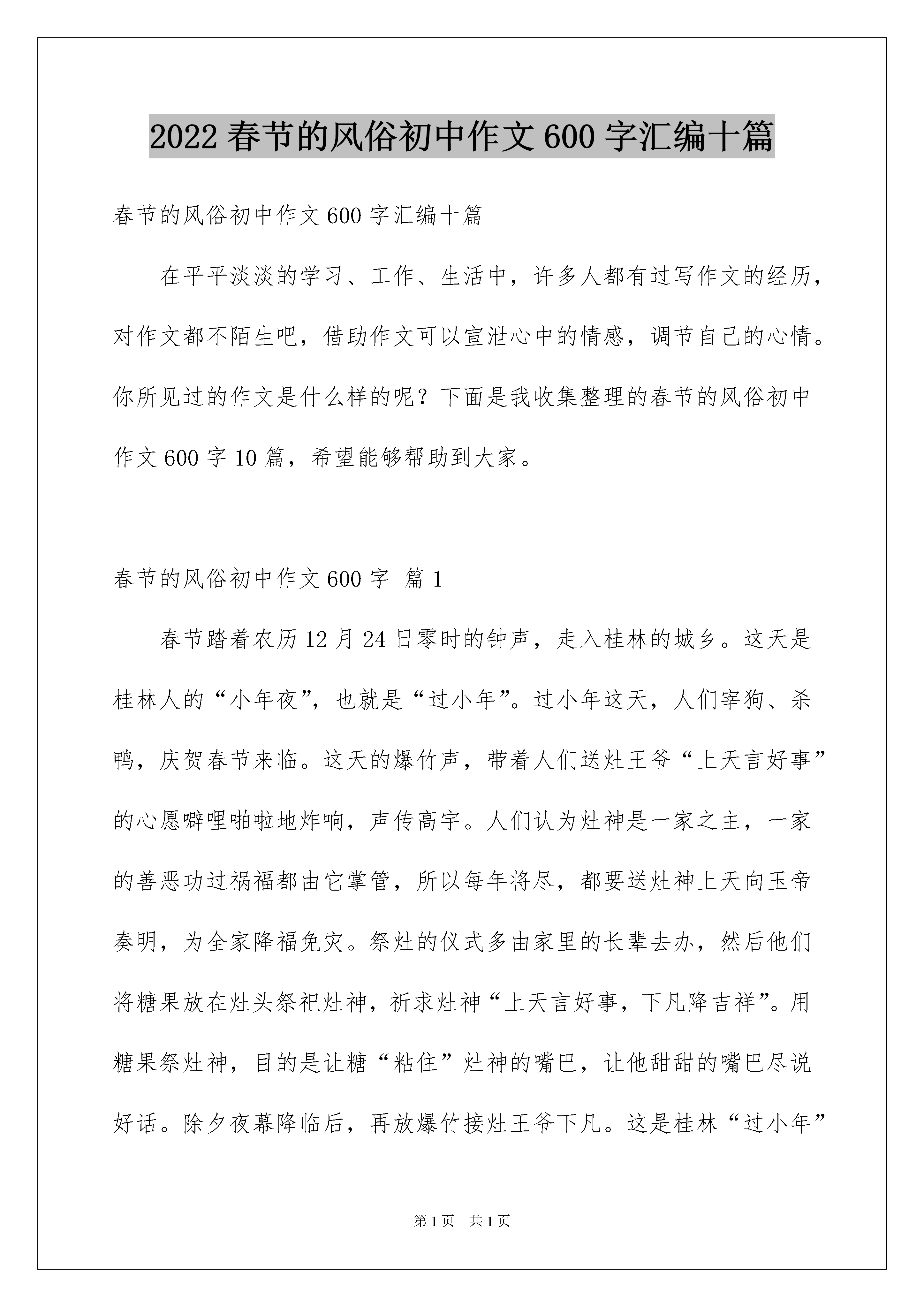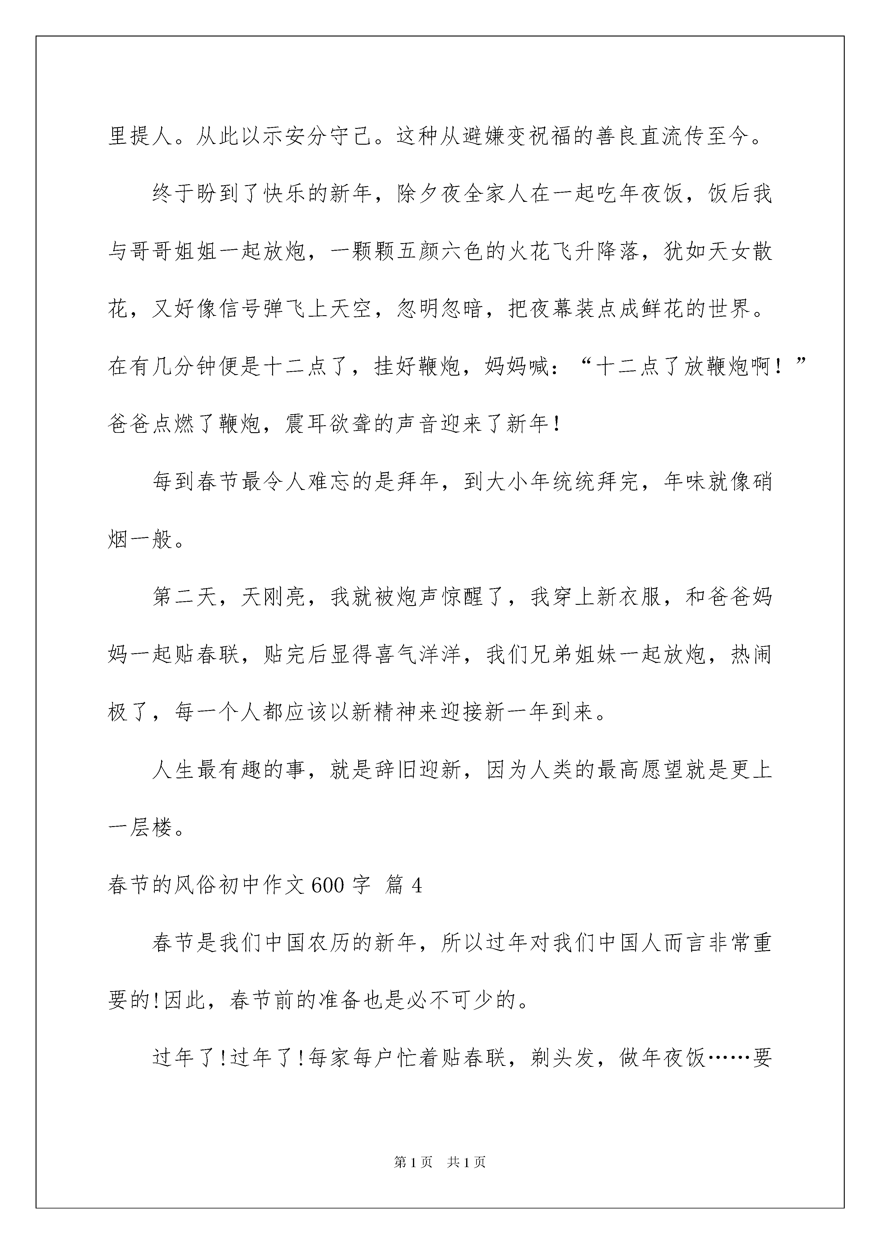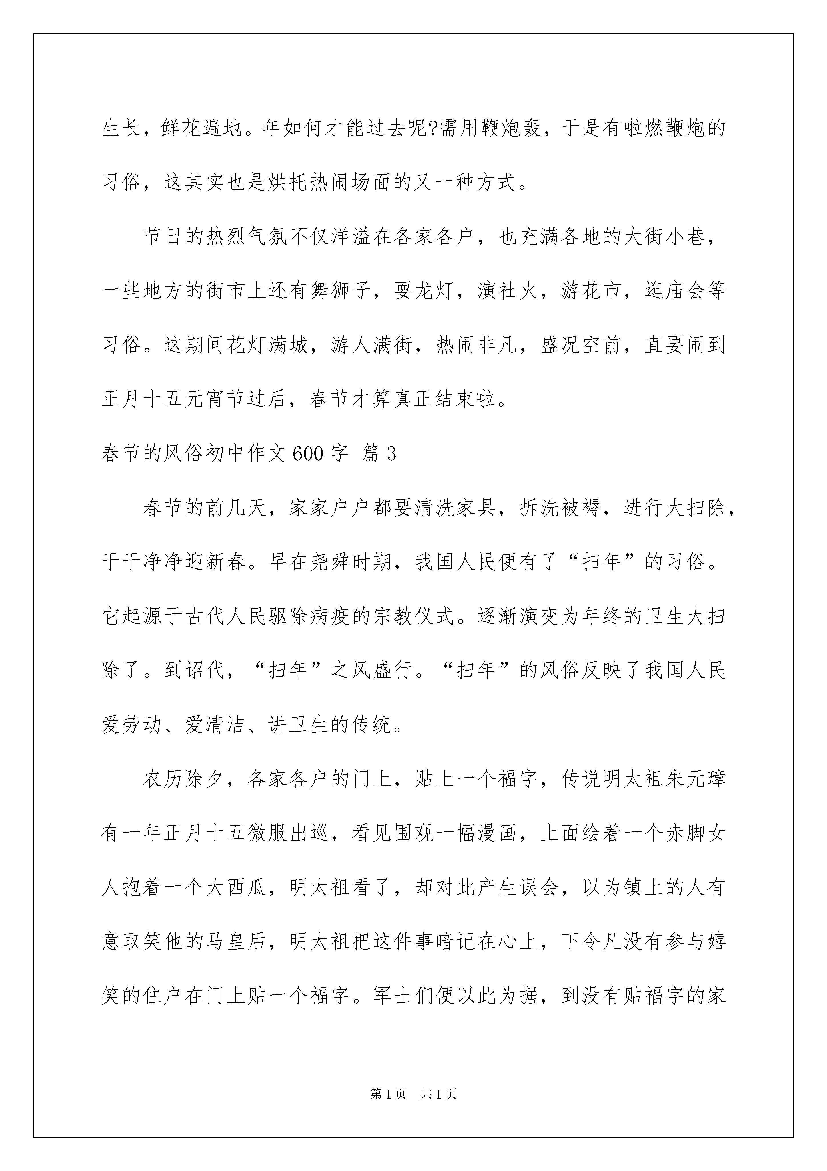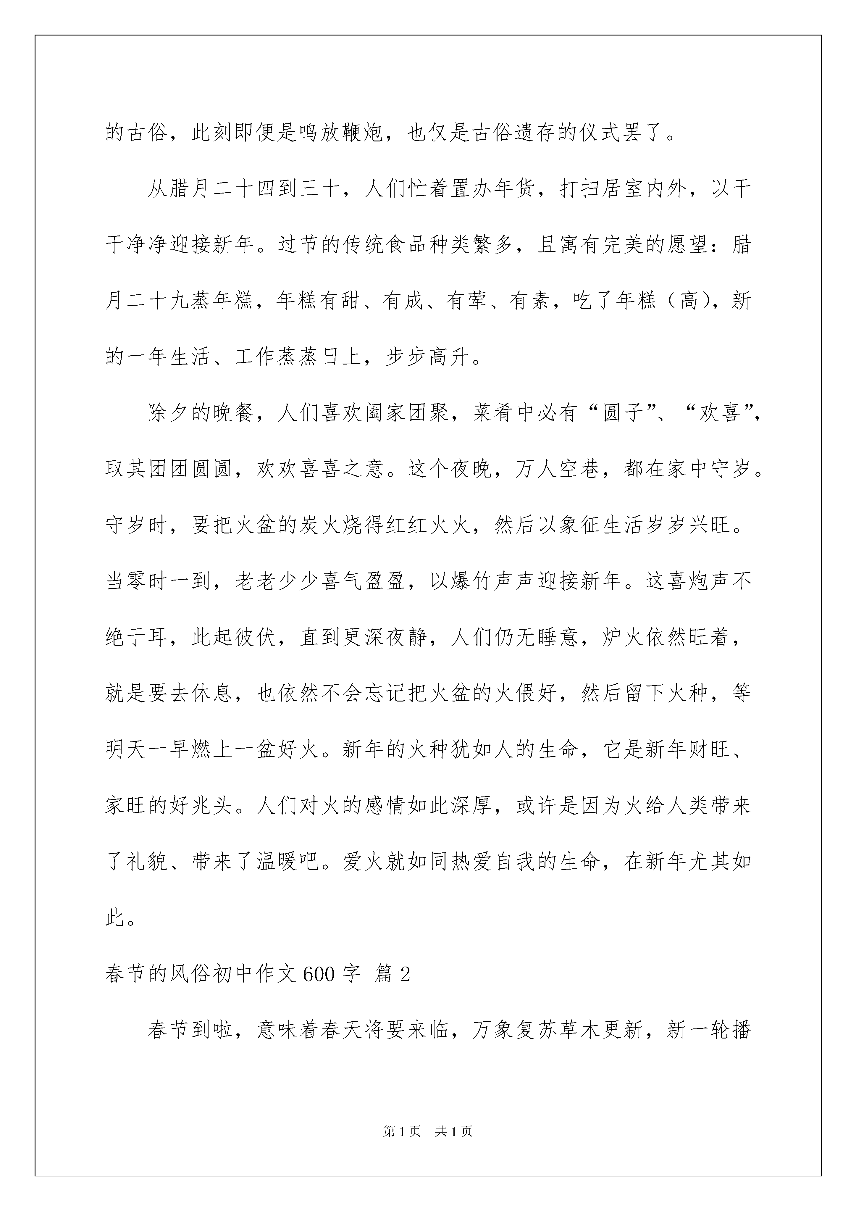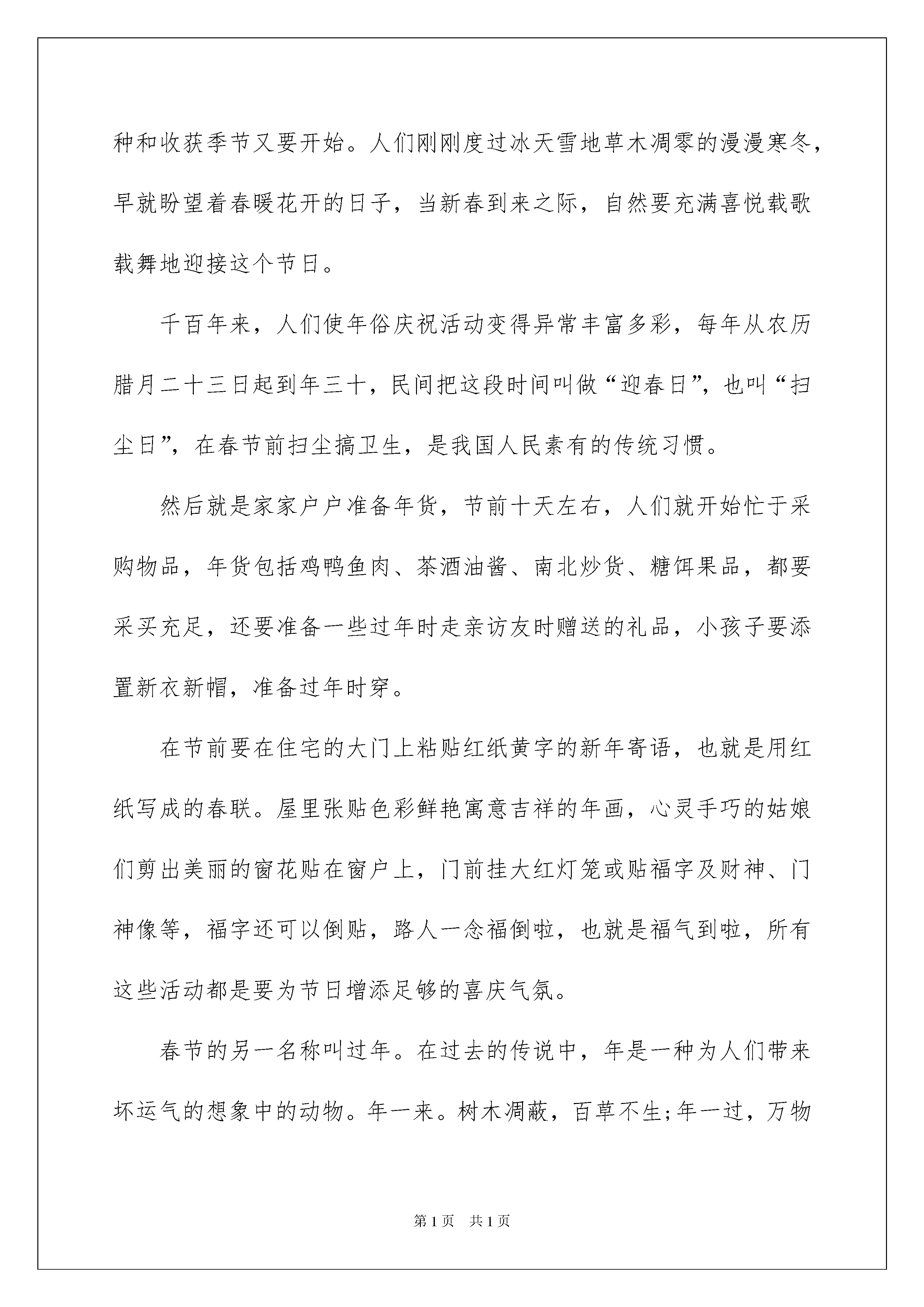 2022春节的风俗初中作文600字汇编十篇春节的风俗初中作文600字汇编十篇在平平淡淡的学习、工作、生活中,许多人都有过写作文的经历,对作文都不陌生吧,借助作文可以宣泄心中的情感,调节自己的心情。你所见过的作文是什么样的呢?下面是我收集整理的春节的风俗初中作文600字10篇,希望能够帮助到大家。春节的风俗初中作文600字篇1春节踏着农历12月24日零时的钟声,走入桂林的城乡。这天是桂林人的“小年夜”,也就是“过小年”。过小年这天,人们宰狗、杀鸭,庆贺春节来临。这天的爆竹声,带着人们送灶王爷“上天言好事”的心愿噼哩啪啦地炸响,声传高宇。人们认为灶神是一家之主,一家的善恶功过祸福都由它掌管,所以每年将尽,都要送灶神上天向玉帝奏明,为全家降福免灾。祭灶的仪式多由家里的长辈去办,然后他们将糖果放在灶头祭祀灶神,祈求灶神“上天言好事,下凡降吉祥”。用糖果祭灶神,目的是让糖“粘住”灶神的嘴巴,让他甜甜的嘴巴尽说好话。除夕夜幕降临后,再放爆竹接灶王爷下凡。这是桂林“过小年”的古俗,此刻即便是鸣放鞭炮,也仅是古俗遗存的仪式罢了。从腊月二十四到三十,人们忙着置办年货,打扫居室内外,以干干净净迎接新年。过节的传统食品种类繁多,且寓有完美的愿望:腊月二十九蒸年糕,年糕有甜、有成、有荤、有素,吃了年糕(高),新的一年生活、工作蒸蒸日上,步步高升。除夕的晚餐,人们喜欢阖家团聚,菜肴中必有“圆子”、“欢喜”,取其团团圆圆,欢欢喜喜之意。这个夜晚,万人空巷,都在家中守岁。守岁时,要把火盆的炭火烧得红红火火,然后以象征生活岁岁兴旺。当零时一到,老老少少喜气盈盈,以爆竹声声迎接新年。这喜炮声不绝于耳,此起彼伏,直到更深夜静,人们仍无睡意,炉火依然旺着,就是要去休息,也依然不会忘记把火盆的火偎好,然后留下火种,等明天一早燃上一盆好火。新年的火种犹如人的生命,它是新年财旺、家旺的好兆头。人们对火的感情如此深厚,或许是因为火给人类带来了礼貌、带来了温暖吧。爱火就如同热爱自我的生命,在新年尤其如此。春节的风俗初中作文600字篇2春节到啦,意味着春天将要来临,万象复苏草木更新,新一轮播种和收获季节又要开始。人们刚刚度过冰天雪地草木凋零的漫漫寒冬,早就盼望着春暖花开的日子,当新春到来之际,自然要充满喜悦载歌载舞地迎接这个节日。千百年来,人们使年俗庆祝活动变得异常丰富多彩,每年从农历腊月二十三日起到年三十,民间把这段时间叫做“迎春日”,也叫“扫尘日”,在春节前扫尘搞卫生,是我国人民素有的传统习惯。然后就是家家户户准备年货,节前十天左右,人们就开始忙于采购物品,年货包括鸡鸭鱼肉、茶酒油酱、南北炒货、糖饵果品,都要采买充足,还要准备一些过年时走亲访友时赠送的礼品,小孩子要添置新衣新帽,准备过年时穿。在节前要在住宅的大门上粘贴红纸黄字的新年寄语,也就是用红纸写成的春联。屋里张贴色彩鲜艳寓意吉祥的年画,心灵手巧的姑娘们剪出美丽的窗花贴在窗户上,门前挂大红灯笼或贴福字及财神、门神像等,福字还可以倒贴,路人一念福倒啦,也就是福气到啦,所有这些活动都是要为节日增添足够的喜庆气氛。春节的另一名称叫过年。在过去的传说中,年是一种为人们带来坏运气的想象中的动物。年一来。树木凋蔽,百草不生;年一过,万物生长,鲜花遍地。年如何才能过去呢?需用鞭炮轰,于是有啦燃鞭炮的习俗,这其实也是烘托热闹场面的又一种方式。节日的热烈气氛不仅洋溢在各家各户,也充满各地的大街小巷,一些地方的街市上还有舞狮子,耍龙灯,演社火,游花市,逛庙会等习俗。这期间花灯满城,游人满街,热闹非凡,盛况空前,直要闹到正月十五元宵节过后,春节才算真正结束啦。春节的风俗初中作文600字篇3春节的前几天,家家户户都要清洗家具,拆洗被褥,进行大扫除,干干净净迎新春。早在尧舜时期,我国人民便有了“扫年”的习俗。它起源于古代人民驱除病疫的宗教仪式。逐渐演变为年终的卫生大扫除了。到诏代,“扫年”之风盛行。“扫年”的风俗反映了我国人民爱劳动、爱清洁、讲卫生的传统。农历除夕,各家各户的门上,贴上一个福字,传说明太祖朱元璋有一年正月十五微服出巡,看见围观一幅漫画,上面绘着一个赤脚女人抱着一个大西瓜,明太祖看了,却对此产生误会,以为镇上的人有意取笑他的马皇后,明太祖把这件事暗记在心上,下令凡没有参与嬉笑的住户在门上贴一个福字。军士们便以此为据,到没有贴福字的家里提人。从此以示安分守己。这种从避嫌变祝福的善良直流传至今。终于盼到了快乐的新年,除夕夜全家人在一起吃年夜饭,饭后我与哥哥姐姐一起放炮,一颗颗五颜六色的火花飞升降落,犹如天女散花,又好像信号弹飞上天空,忽明忽暗,把夜幕装点成鲜花的世界。在有几分钟