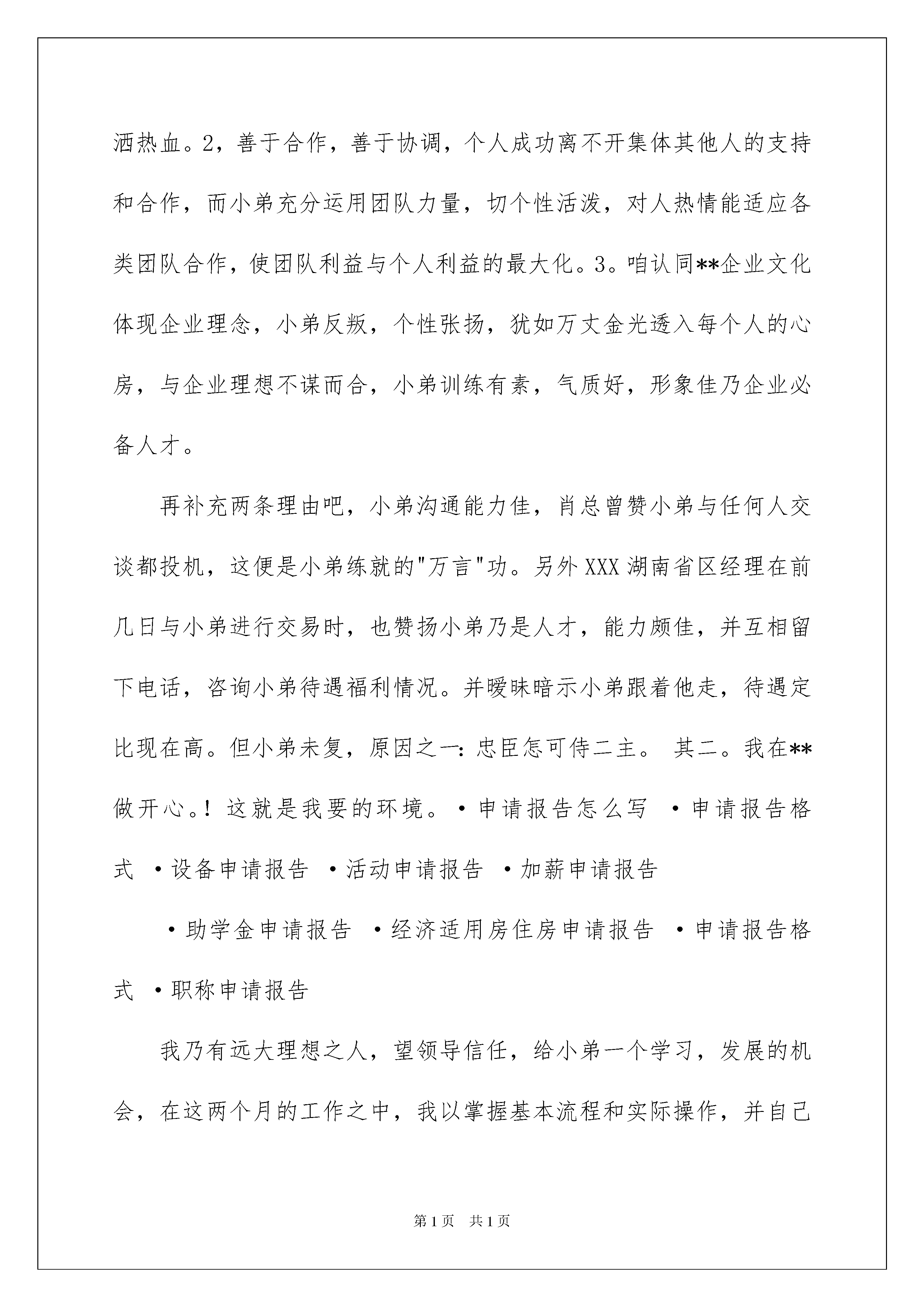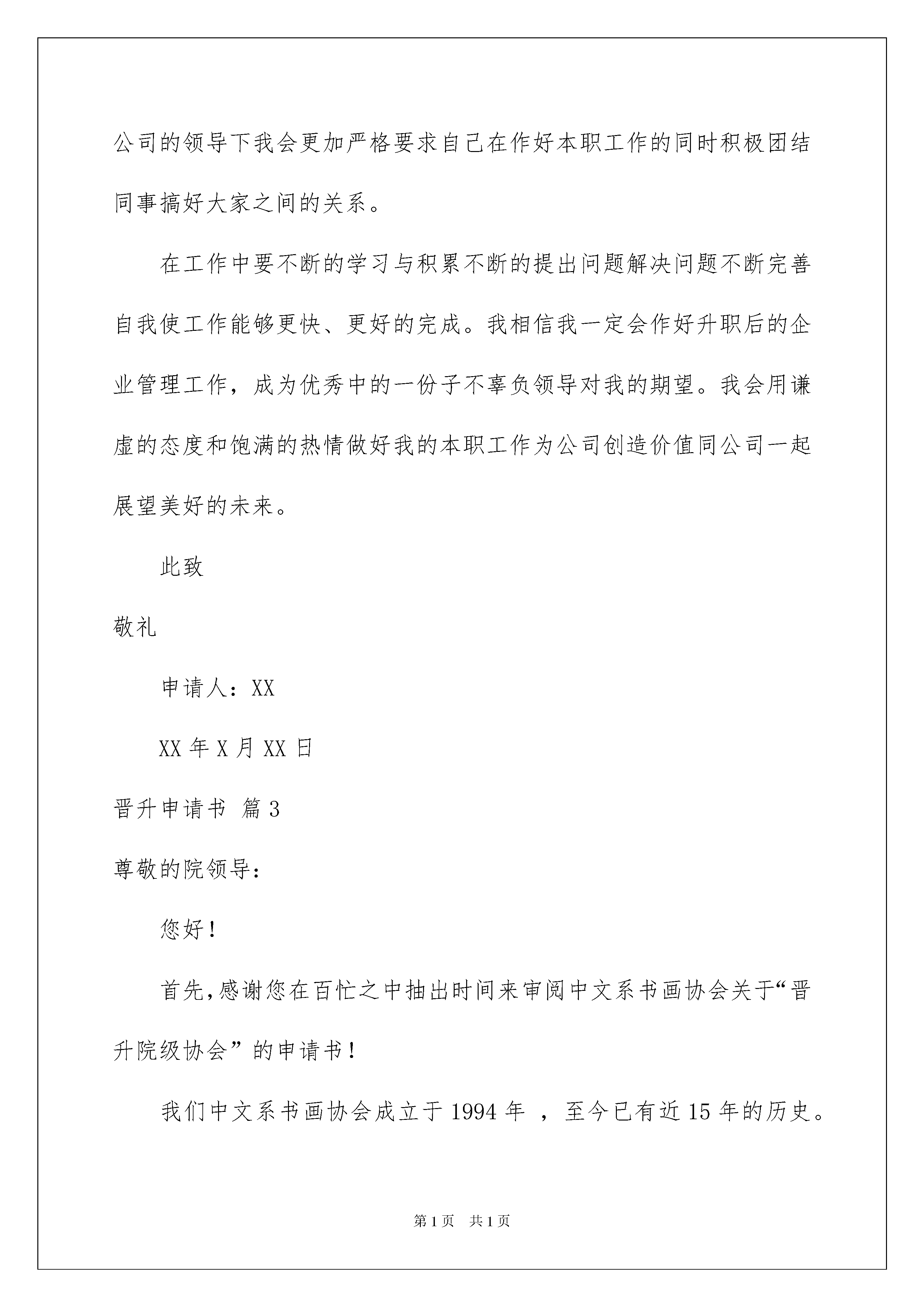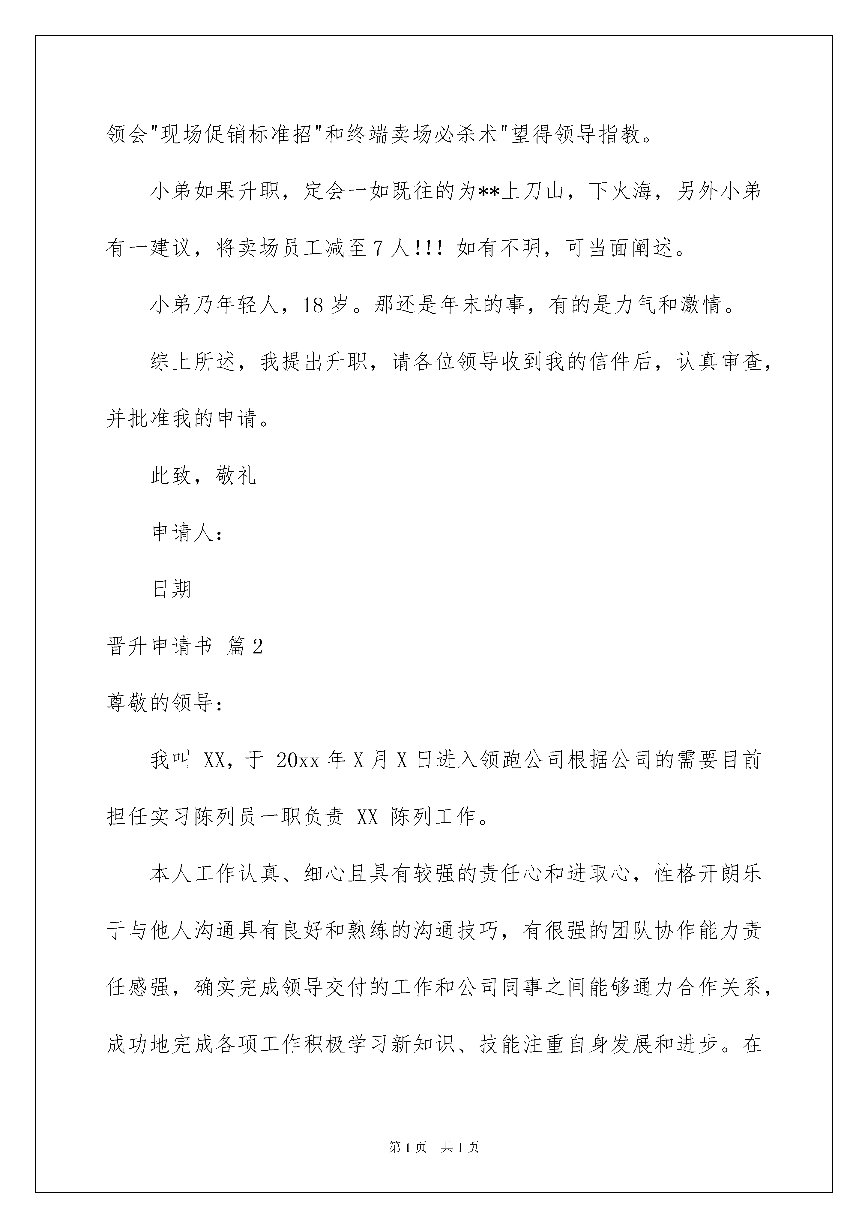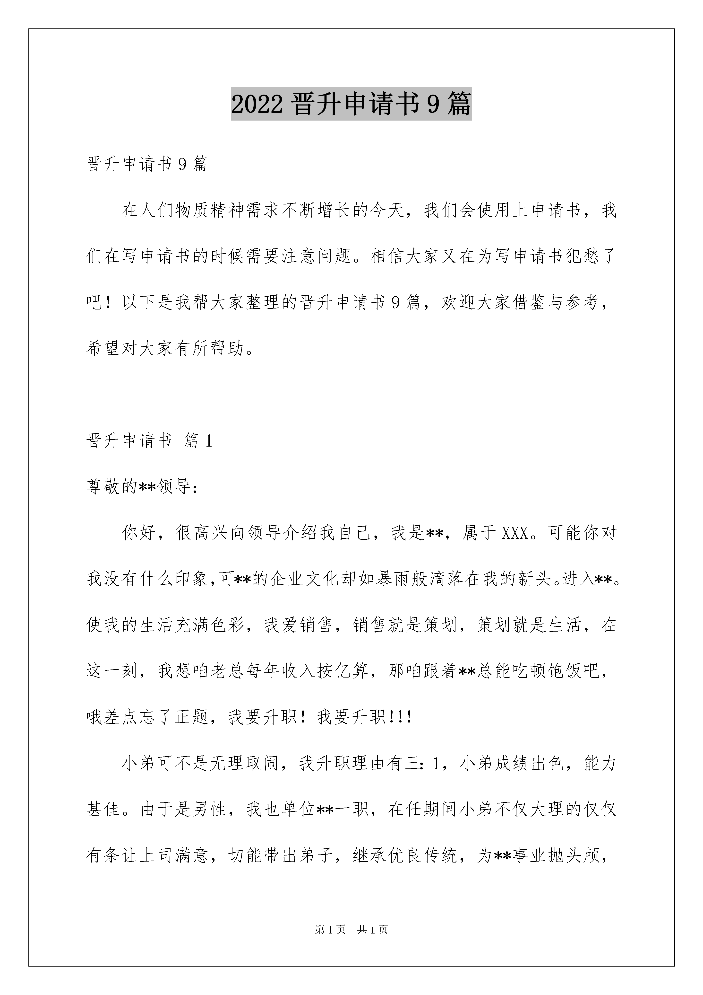 2022晋升申请书9篇晋升申请书9篇在人们物质精神需求不断增长的今天,我们会使用上申请书,我们在写申请书的时候需要注意问题。相信大家又在为写申请书犯愁了吧!以下是我帮大家整理的晋升申请书9篇,欢迎大家借鉴与参考,希望对大家有所帮助。晋升申请书篇1尊敬的**领导:你好,很高兴向领导介绍我自己,我是**,属于XXX。可能你对我没有什么印象,可**的企业文化却如暴雨般滴落在我的新头。进入**。使我的生活充满色彩,我爱销售,销售就是策划,策划就是生活,在这一刻,我想咱老总每年收入按亿算,那咱跟着**总能吃顿饱饭吧,哦差点忘了正题,我要升职!我要升职!!!小弟可不是无理取闹,我升职理由有三:1,小弟成绩出色,能力甚佳。由于是男性,我也单位**一职,在任期间小弟不仅大理的仅仅有条让上司满意,切能带出弟子,继承优良传统,为**事业抛头颅,洒热血。2,善于合作,善于协调,个人成功离不开集体其他人的支持和合作,而小弟充分运用团队力量,切个性活泼,对人热情能适应各类团队合作,使团队利益与个人利益的最大化。3。咱认同**企业文化体现企业理念,小弟反叛,个性张扬,犹如万丈金光透入每个人的心房,与企业理想不谋而合,小弟训练有素,气质好,形象佳乃企业必备人才。再补充两条理由吧,小弟沟通能力佳,肖总曾赞小弟与任何人交谈都投机,这便是小弟练就的"万言"功。另外XXX湖南省区经理在前几日与小弟进行交易时,也赞扬小弟乃是人才,能力颇佳,并互相留下电话,咨询小弟待遇福利情况。并暧昧暗示小弟跟着他走,待遇定比现在高。但小弟未复,原因之一:忠臣怎可侍二主。其二。我在**做开心。!这就是我要的环境。·申请报告怎么写·申请报告格式·设备申请报告·活动申请报告·加薪申请报告·助学金申请报告·经济适用房住房申请报告·申请报告格式·职称申请报告我乃有远大理想之人,望领导信任,给小弟一个学习,发展的机会,在这两个月的工作之中,我以掌握基本流程和实际操作,并自己领会"现场促销标准招"和终端卖场必杀术"望得领导指教。小弟如果升职,定会一如既往的为**上刀山,下火海,另外小弟有一建议,将卖场员工减至7人!!!如有不明,可当面阐述。小弟乃年轻人,18岁。那还是年末的事,有的是力气和激情。综上所述,我提出升职,请各位领导收到我的信件后,认真审查,并批准我的申请。此致,敬礼申请人:日期晋升申请书篇2尊敬的领导:我叫XX,于20xx年X月X日进入领跑公司根据公司的需要目前担任实习陈列员一职负责XX陈列工作。本人工作认真、细心且具有较强的责任心和进取心,性格开朗乐于与他人沟通具有良好和熟练的沟通技巧,有很强的团队协作能力责任感强,确实完成领导交付的工作和公司同事之间能够通力合作关系,成功地完成各项工作积极学习新知识、技能注重自身发展和进步。在公司的领导下我会更加严格要求自己在作好本职工作的同时积极团结同事搞好大家之间的关系。在工作中要不断的学习与积累不断的提出问题解决问题不断完善自我使工作能够更快、更好的完成。我相信我一定会作好升职后的企业管理工作,成为优秀中的一份子不辜负领导对我的期望。我会用谦虚的态度和饱满的热情做好我的本职工作为公司创造价值同公司一起展望美好的未来。此致敬礼申请人:XXXX年X月XX日晋升申请书篇3尊敬的院领导:您好!首先,感谢您在百忙之中抽出时间来审阅中文系书画协会关于“晋升院级协会”的申请书!我们中文系书画协会成立于1994年,至今已有近15年的历史。在这15年不断地探索与创新的历程中,这个原本只有十几人的书画协会,现在已经逐步发展壮大起来了,我系会员已经达到31人。与此同时,随着书画协会的活动越办越精彩,吸引了不少外系同学的加盟,现美术系4人,政史系2人,教科院2人,财经系1人,化学系17人。这样,中文系的书画协会已在全院范围内拥有了自己的会员,累计达57人之多。书画协会的宗旨是“挥毫泼墨,于点画间妙趣横生;奇芳异草,尽展书画学子的风采”,正是这一办会宗旨将来自全院的书画爱好者们凝聚到了一起。“书画协会”隶属于中文系社团部,本会的组织机构完备。设有会长和副会长,并实行会长负责制;下设国画部、软笔部、硬笔部、粉笔部和宣传部五大部门。各个部门各司其职、团结协作,推动了我们中文系的“书画文明”建设,也联系了我系与兄弟系的互动共赢。近几年,书画协会成功举办了“墨海扬帆”书画大赛(20xx年)、“墨香画影”书画大赛(20xx年)和“吾爱吾校”书画大赛(20xx年)等一系列的书画大赛。同学们在参加各项活动的同时,不仅体会到了书画的乐趣,更增加了相关方面的书画知识,真的是活动与知识的双丰收!此外,书画协会还举办了与书画知识有关