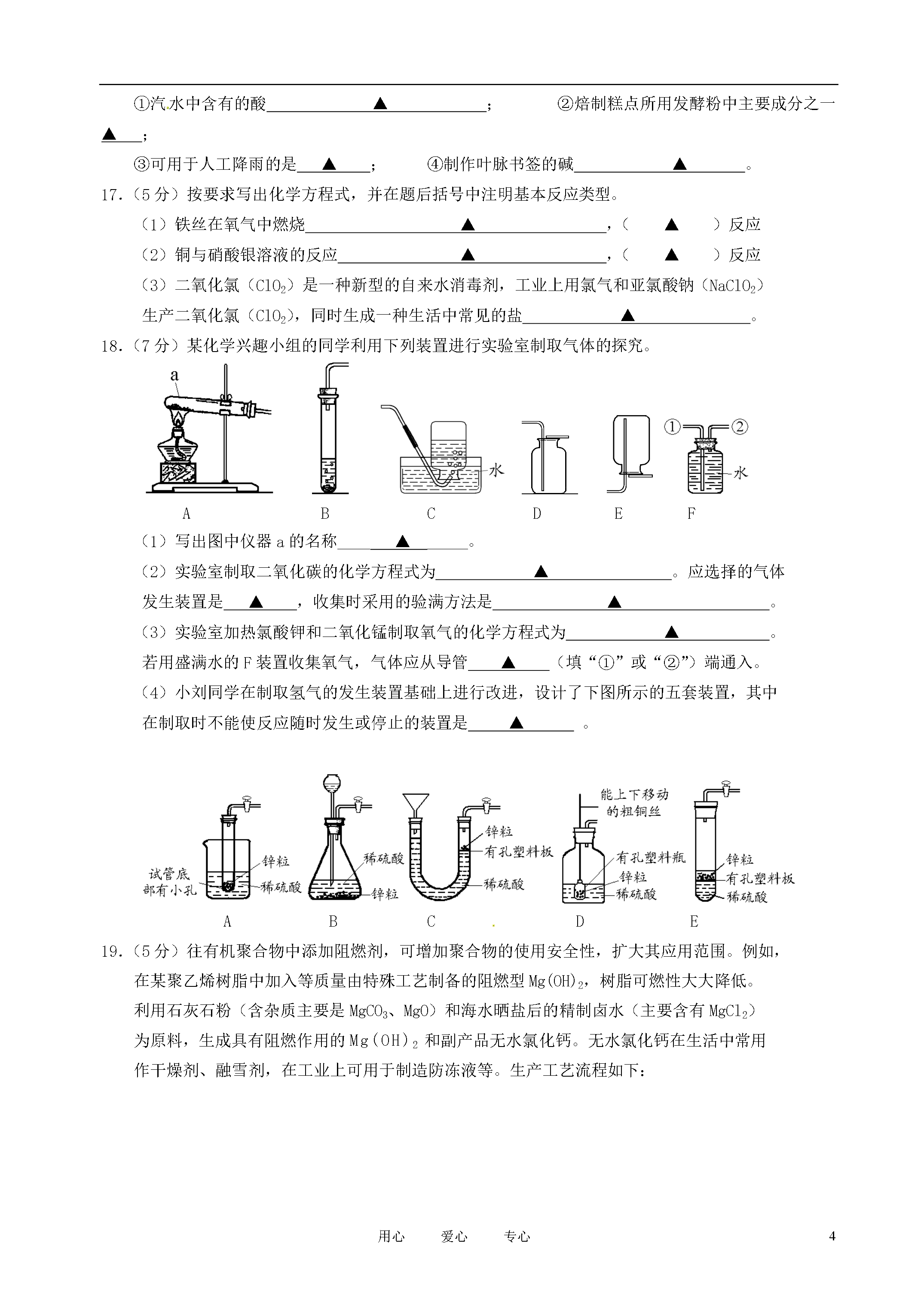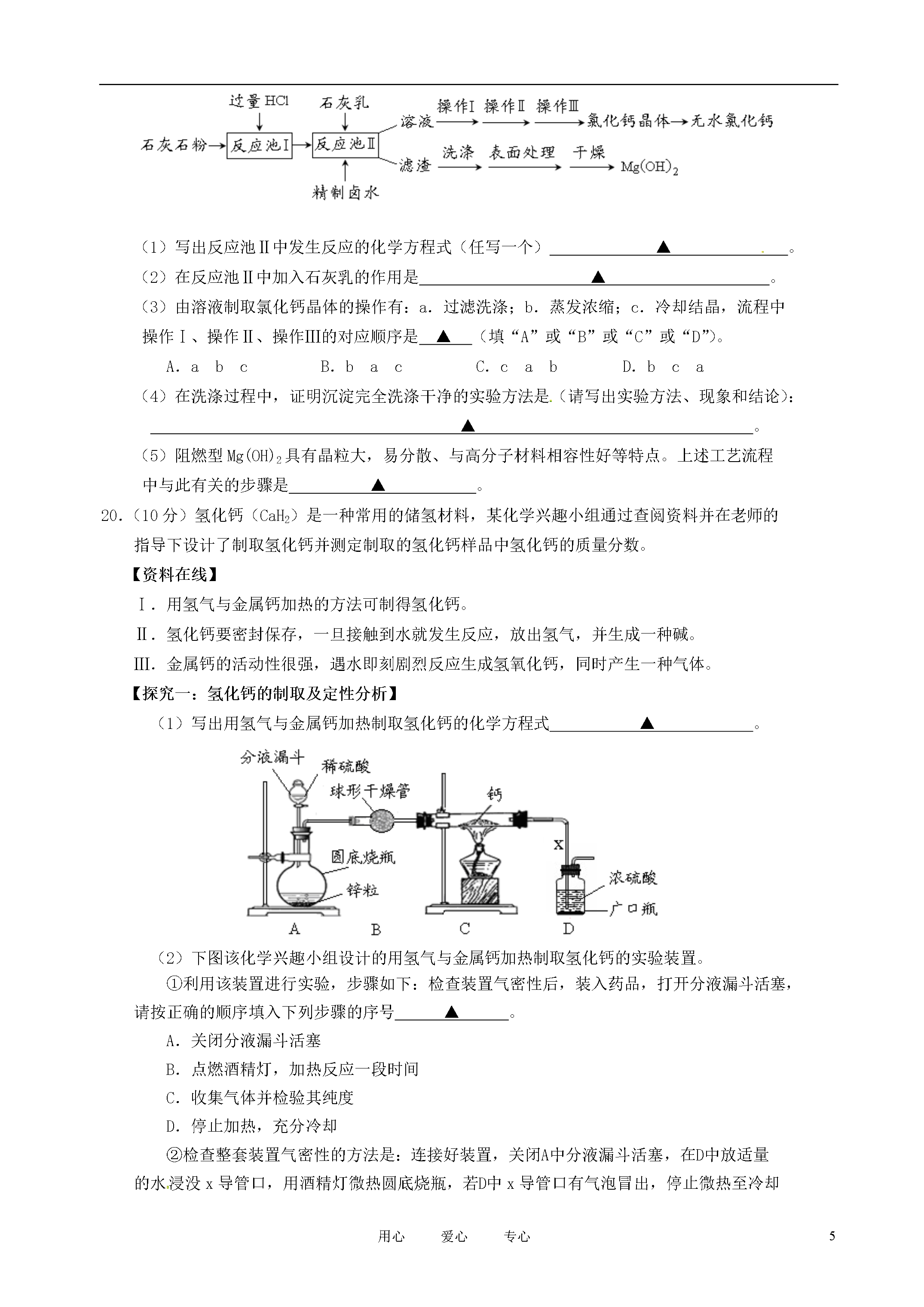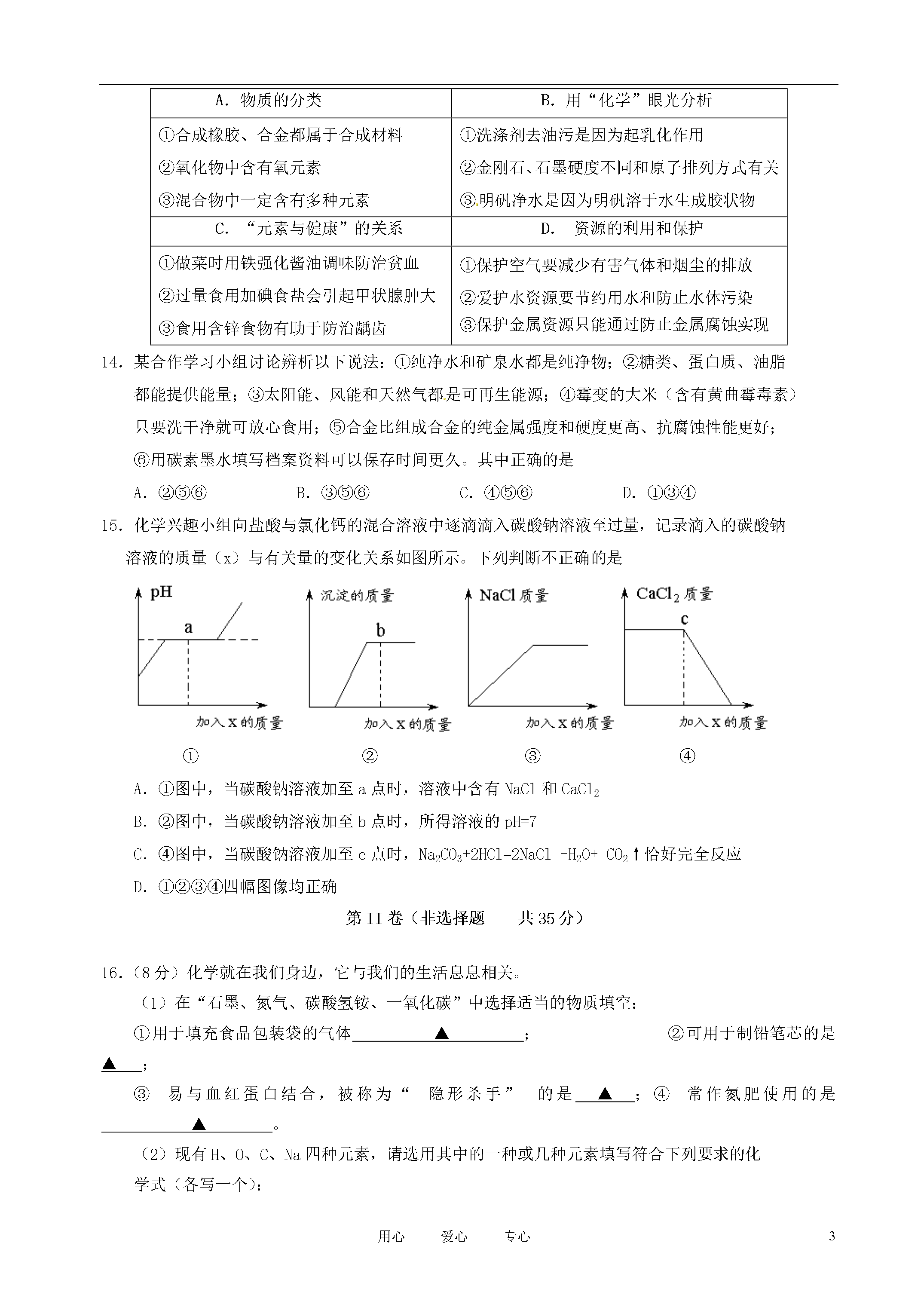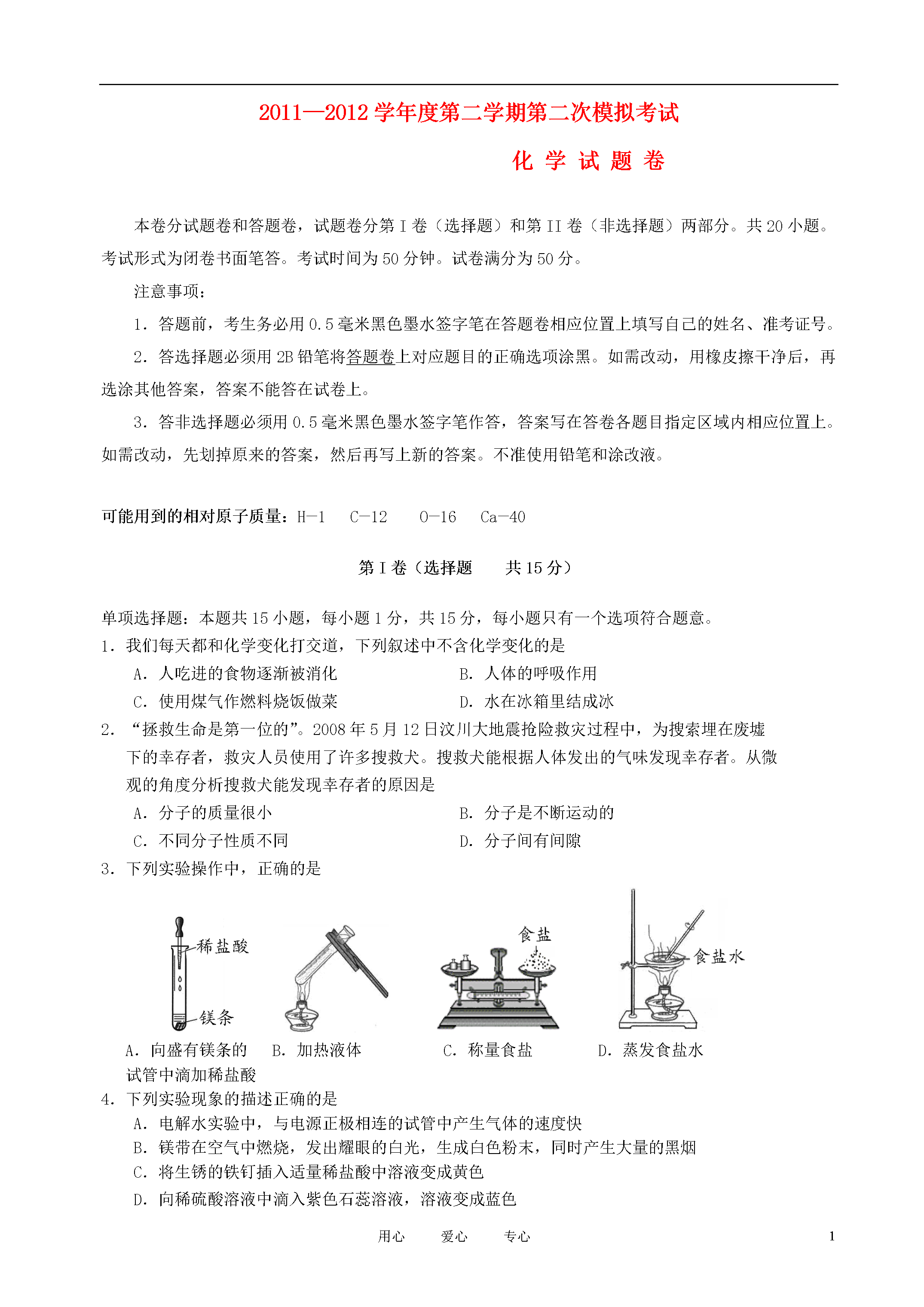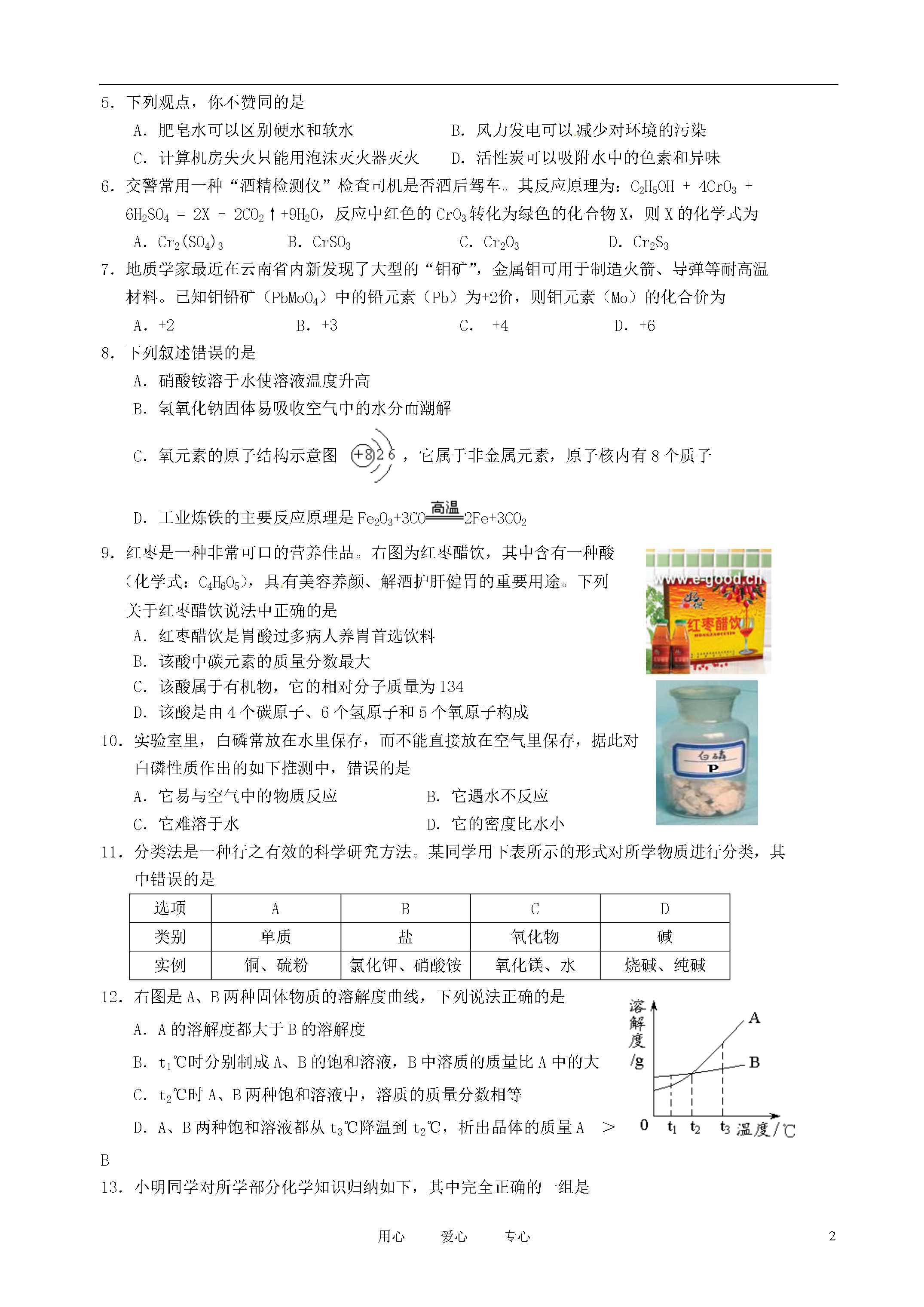 7用心爱心专心2011—2012学年度第二学期第二次模拟考试化学试题卷本卷分试题卷和答题卷,试题卷分第I卷(选择题)和第II卷(非选择题)两部分。共20小题。考试形式为闭卷书面笔答。考试时间为50分钟。试卷满分为50分。注意事项:1.答题前,考生务必用0.5毫米黑色墨水签字笔在答题卷相应位置上填写自己的姓名、准考证号。2.答选择题必须用2B铅笔将答题卷上对应题目的正确选项涂黑。如需改动,用橡皮擦干净后,再选涂其他答案,答案不能答在试卷上。3.答非选择题必须用0.5毫米黑色墨水签字笔作答,答案写在答卷各题目指定区域内相应位置上。如需改动,先划掉原来的答案,然后再写上新的答案。不准使用铅笔和涂改液。可能用到的相对原子质量:H-1C-12O-16Ca-40第I卷(选择题共15分)单项选择题:本题共15小题,每小题1分,共15分,每小题只有一个选项符合题意。1.我们每天都和化学变化打交道,下列叙述中不含化学变化的是A.人吃进的食物逐渐被消化B.人体的呼吸作用C.使用煤气作燃料烧饭做菜D.水在冰箱里结成冰2.“拯救生命是第一位的”。2008年5月12日汶川大地震抢险救灾过程中,为搜索埋在废墟下的幸存者,救灾人员使用了许多搜救犬。搜救犬能根据人体发出的气味发现幸存者。从微观的角度分析搜救犬能发现幸存者的原因是A.分子的质量很小B.分子是不断运动的C.不同分子性质不同D.分子间有间隙3.下列实验操作中,正确的是A.向盛有镁条的B.加热液体C.称量食盐D.蒸发食盐水试管中滴加稀盐酸4.下列实验现象的描述正确的是A.电解水实验中,与电源正极相连的试管中产生气体的速度快B.镁带在空气中燃烧,发出耀眼的白光,生成白色粉末,同时产生大量的黑烟C.将生锈的铁钉插入适量稀盐酸中溶液变成黄色D.向稀硫酸溶液中滴入紫色石蕊溶液,溶液变成蓝色5.下列观点,你不赞同的是A.肥皂水可以区别硬水和软水B.风力发电可以减少对环境的污染C.计算机房失火只能用泡沫灭火器灭火D.活性炭可以吸附水中的色素和异味6.交警常用一种“酒精检测仪”检查司机是否酒后驾车。其反应原理为:C2H5OH+4CrO3+6H2SO4=2X+2CO2↑+9H2O,反应中红色的CrO3转化为绿色的化合物X,则X的化学式为A.Cr2(SO4)3B.CrSO3C.Cr2O3D.Cr2S37.地质学家最近在云南省内新发现了大型的“钼矿”,金属钼可用于制造火箭、导弹等耐高温材料。已知钼铅矿(PbMoO4)中的铅元素(Pb)为+2价,则钼元素(Mo)的化合价为A.+2B.+3C.+4D.+68.下列叙述错误的是A.硝酸铵溶于水使溶液温度升高B.氢氧化钠固体易吸收空气中的水分而潮解C.氧元素的原子结构示意图,它属于非金属元素,原子核内有8个质子D.工业炼铁的主要反应原理是Fe2O3+3CO2Fe+3CO29.红枣是一种非常可口的营养佳品。右图为红枣醋饮,其中含有一种酸(化学式:C4H6O5),具有美容养颜、解酒护肝健胃的重要用途。下列关于红枣醋饮说法中正确的是A.红枣醋饮是胃酸过多病人养胃首选饮料B.该酸中碳元素的质量分数最大C.该酸属于有机物,它的相对分子质量为134D.该酸是由4个碳原子、6个氢原子和5个氧原子构成10.实验室里,白磷常放在水里保存,而不能直接放在空气里保存,据此对白磷性质作出的如下推测中,错误的是A.它易与空气中的物质反应B.它遇水不反应C.它难溶于水D.它的密度比水小11.分类法是一种行之有效的科学研究方法。某同学用下表所示的形式对所学物质进行分类,其中错误的是选项ABCD类别单质盐氧化物碱实例铜、硫粉氯化钾、硝酸铵氧化镁、水烧碱、纯碱12.右图是A、B两种固体物质的溶解度曲线,下列说法正确的是A.A的溶解度都大于B的溶解度B.t1℃时分别制成A、B的饱和溶液,B中溶质的质量比A中的大C.t2℃时A、B两种饱和溶液中,溶质的质量分数相等D.A、B两种饱和溶液都从t3℃降温到t2℃,析出晶体的质量A>B13.小明同学对所学部分化学知识归纳如下,其中完全正确的一组是A.物质的分类B.用“化学”眼光分析①合成橡胶、合金都属于合成材料②氧化物中含有氧元素③混合物中一定含有多种元素①洗涤剂去油污是因为起乳化作用②金刚石、石墨硬度不同和原子排列方式有关③明矾净水是因为明矾溶于水生成胶状物C.“元素与健康”的关系D.资源的利用和保护①做菜时用铁强化酱油调味防治贫血②过量食用加碘食盐会引起甲状腺肿大③食用含锌食物有助于防治龋齿①保护空气要减少有害气体和烟尘的排放②爱护水资源要节约用水和防止水体污染③保护金属资源只能通过防止金属腐蚀实现14.某合作学习小组讨论辨析以下说法:①纯净水和矿泉水都是纯净物;②糖类、蛋白质、油脂都能提供能量;③太阳能、风能和天然气都是可再生能源;④霉变的大米(含有黄