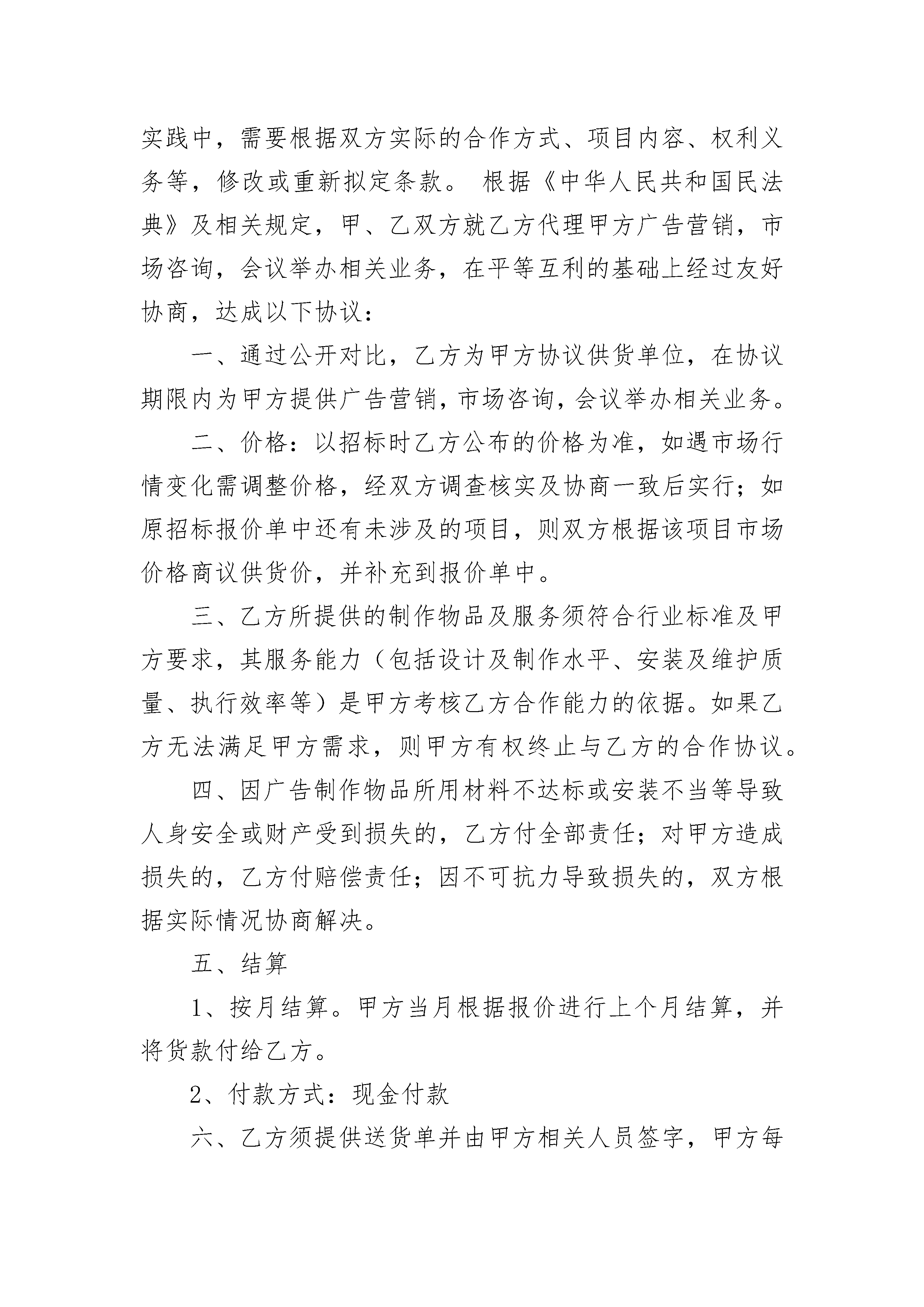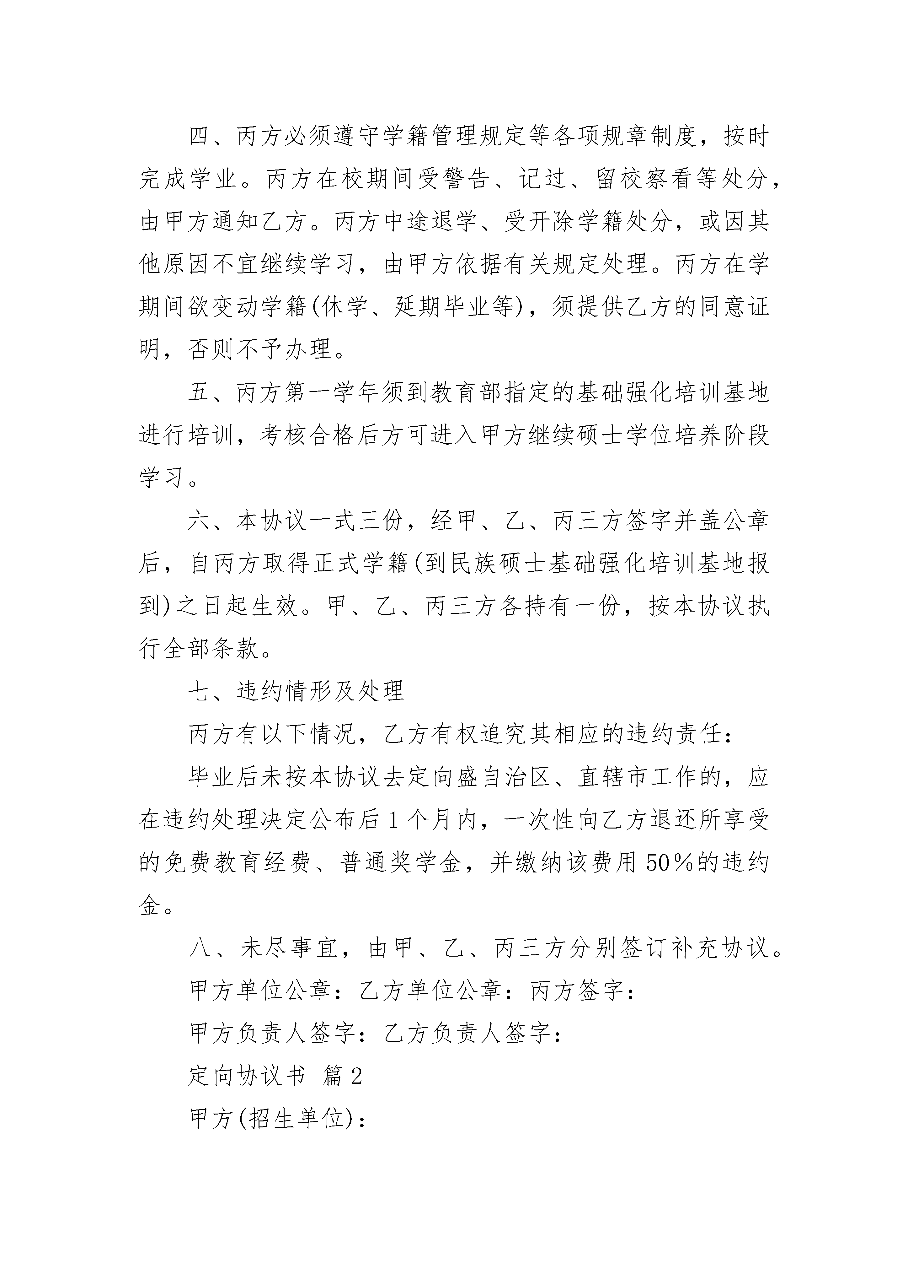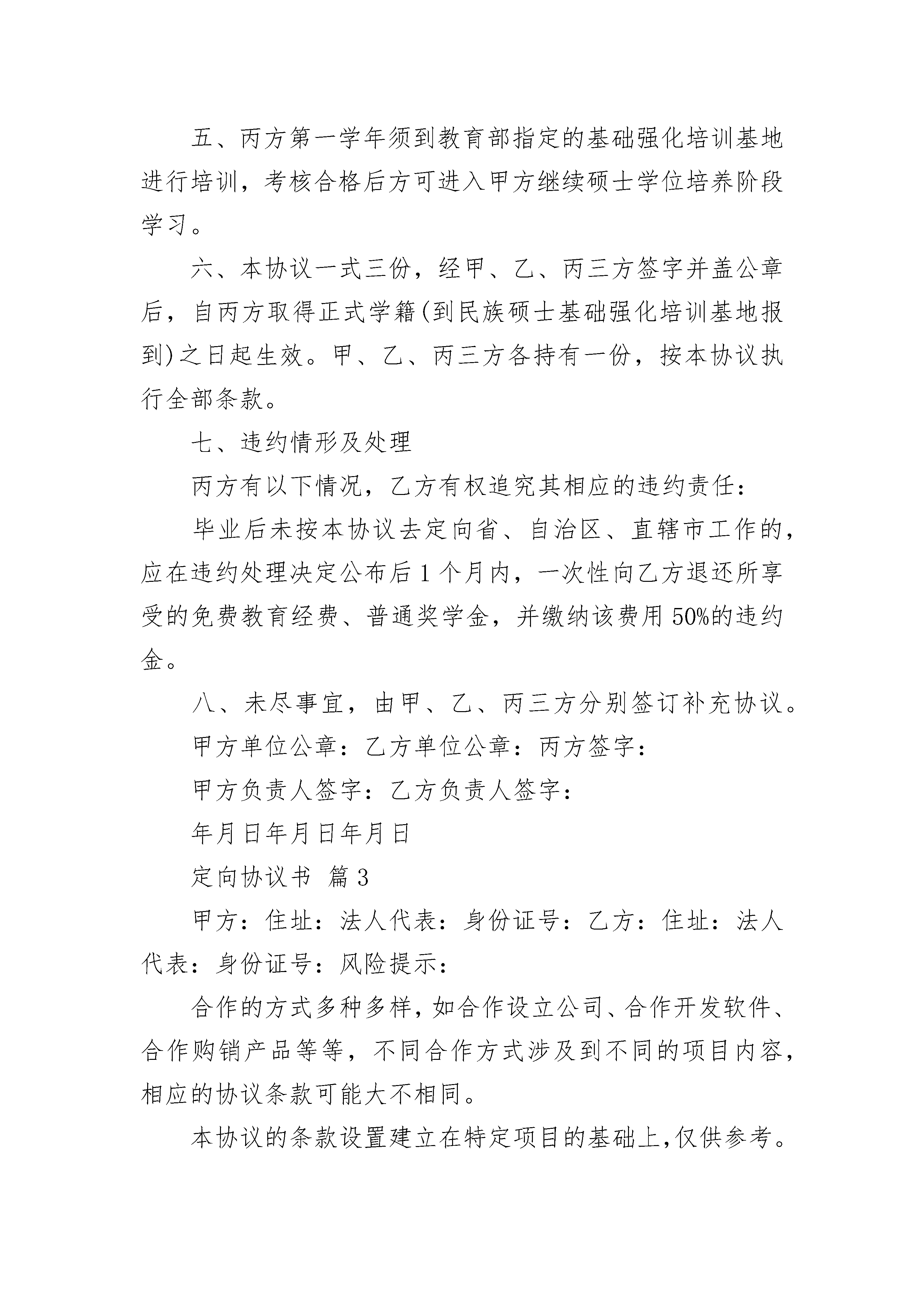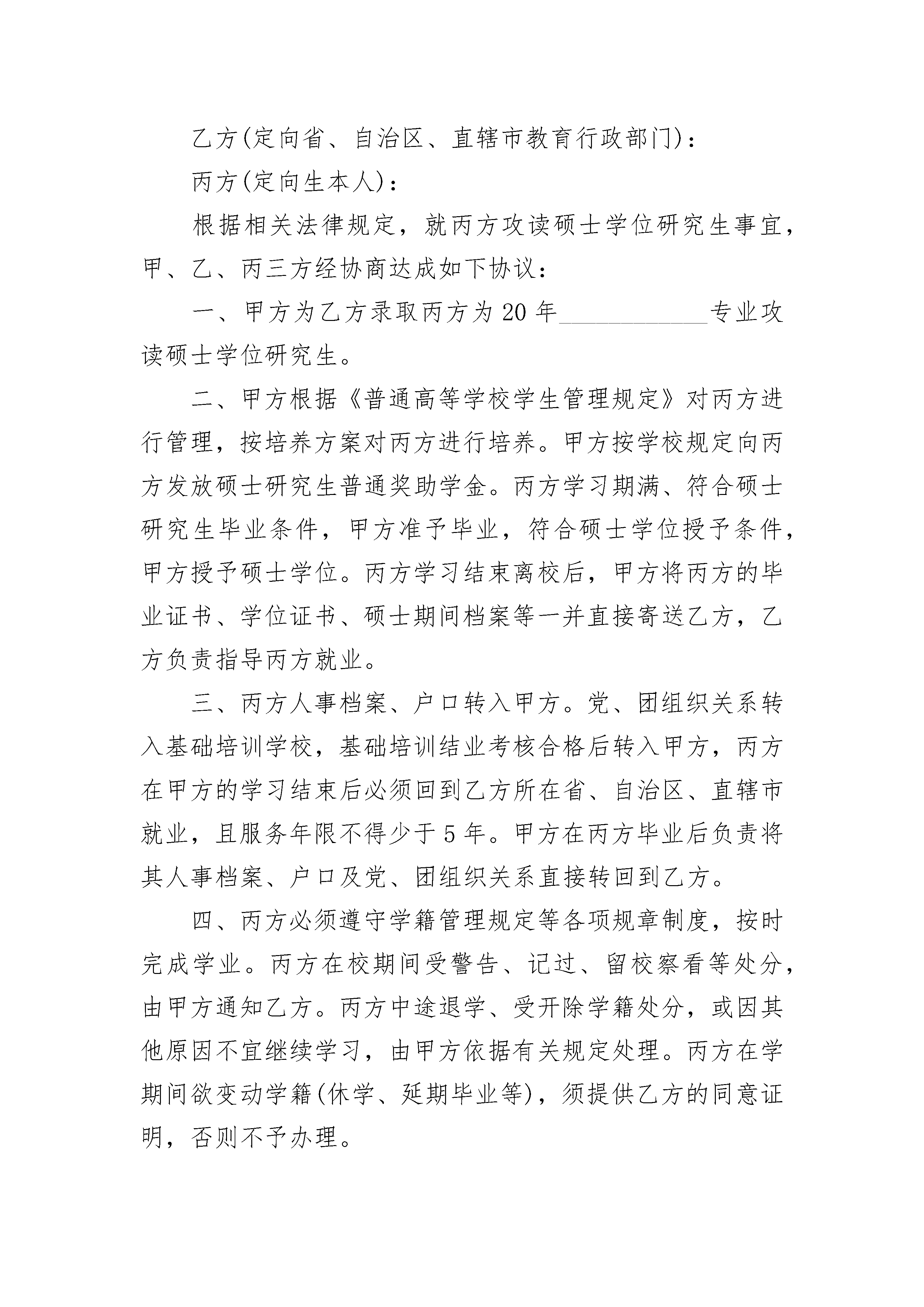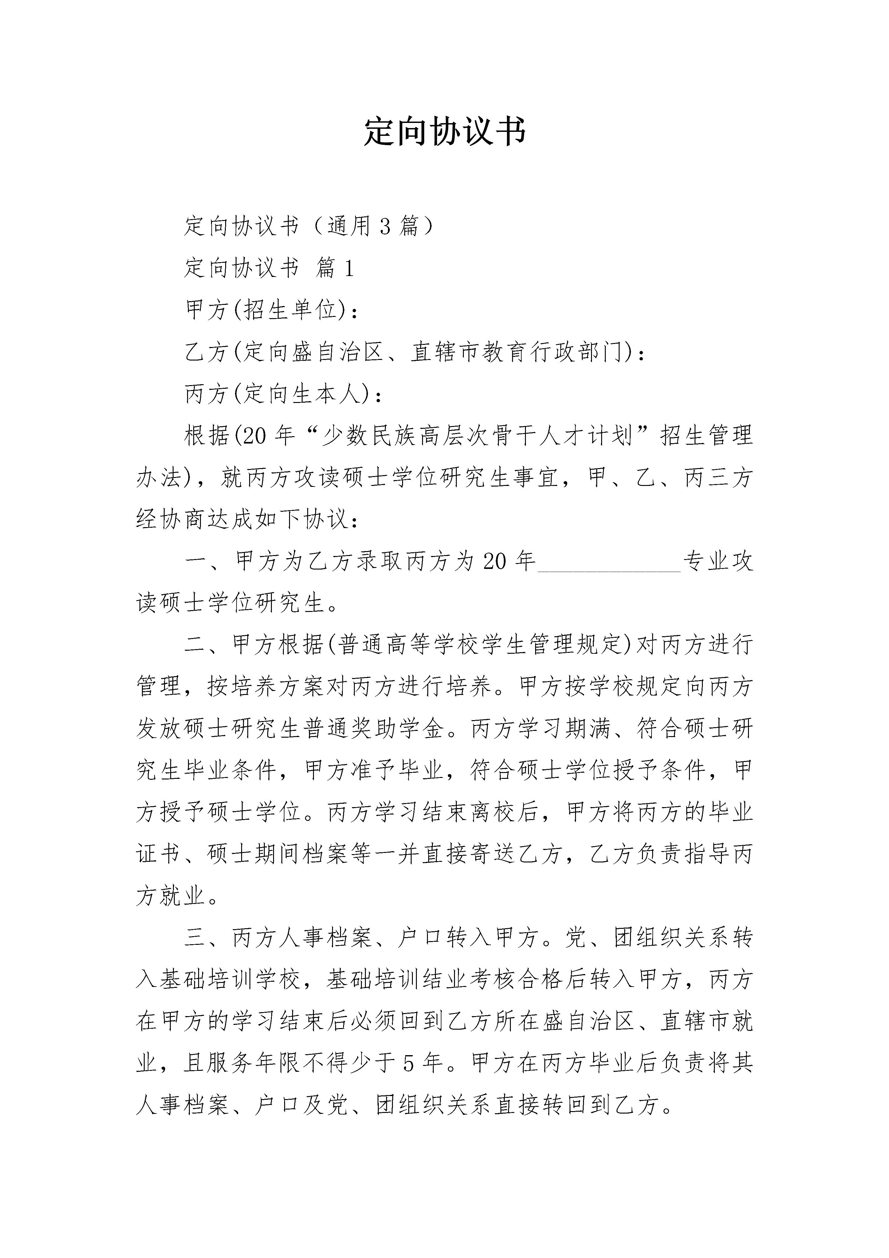 定向协议书定向协议书(通用3篇)定向协议书篇1甲方(招生单位):乙方(定向盛自治区、直辖市教育行政部门):丙方(定向生本人):根据(20年“少数民族高层次骨干人才计划”招生管理办法),就丙方攻读硕士学位研究生事宜,甲、乙、丙三方经协商达成如下协议:一、甲方为乙方录取丙方为20年____________专业攻读硕士学位研究生。二、甲方根据(普通高等学校学生管理规定)对丙方进行管理,按培养方案对丙方进行培养。甲方按学校规定向丙方发放硕士研究生普通奖助学金。丙方学习期满、符合硕士研究生毕业条件,甲方准予毕业,符合硕士学位授予条件,甲方授予硕士学位。丙方学习结束离校后,甲方将丙方的毕业证书、硕士期间档案等一并直接寄送乙方,乙方负责指导丙方就业。三、丙方人事档案、户口转入甲方。党、团组织关系转入基础培训学校,基础培训结业考核合格后转入甲方,丙方在甲方的学习结束后必须回到乙方所在盛自治区、直辖市就业,且服务年限不得少于5年。甲方在丙方毕业后负责将其人事档案、户口及党、团组织关系直接转回到乙方。四、丙方必须遵守学籍管理规定等各项规章制度,按时完成学业。丙方在校期间受警告、记过、留校察看等处分,由甲方通知乙方。丙方中途退学、受开除学籍处分,或因其他原因不宜继续学习,由甲方依据有关规定处理。丙方在学期间欲变动学籍(休学、延期毕业等),须提供乙方的同意证明,否则不予办理。五、丙方第一学年须到教育部指定的基础强化培训基地进行培训,考核合格后方可进入甲方继续硕士学位培养阶段学习。六、本协议一式三份,经甲、乙、丙三方签字并盖公章后,自丙方取得正式学籍(到民族硕士基础强化培训基地报到)之日起生效。甲、乙、丙三方各持有一份,按本协议执行全部条款。七、违约情形及处理丙方有以下情况,乙方有权追究其相应的违约责任:毕业后未按本协议去定向盛自治区、直辖市工作的,应在违约处理决定公布后1个月内,一次性向乙方退还所享受的免费教育经费、普通奖学金,并缴纳该费用50%的违约金。八、未尽事宜,由甲、乙、丙三方分别签订补充协议。甲方单位公章:乙方单位公章:丙方签字:甲方负责人签字:乙方负责人签字:定向协议书篇2甲方(招生单位):乙方(定向省、自治区、直辖市教育行政部门):丙方(定向生本人):根据相关法律规定,就丙方攻读硕士学位研究生事宜,甲、乙、丙三方经协商达成如下协议:一、甲方为乙方录取丙方为20年____________专业攻读硕士学位研究生。二、甲方根据《普通高等学校学生管理规定》对丙方进行管理,按培养方案对丙方进行培养。甲方按学校规定向丙方发放硕士研究生普通奖助学金。丙方学习期满、符合硕士研究生毕业条件,甲方准予毕业,符合硕士学位授予条件,甲方授予硕士学位。丙方学习结束离校后,甲方将丙方的毕业证书、学位证书、硕士期间档案等一并直接寄送乙方,乙方负责指导丙方就业。三、丙方人事档案、户口转入甲方。党、团组织关系转入基础培训学校,基础培训结业考核合格后转入甲方,丙方在甲方的学习结束后必须回到乙方所在省、自治区、直辖市就业,且服务年限不得少于5年。甲方在丙方毕业后负责将其人事档案、户口及党、团组织关系直接转回到乙方。四、丙方必须遵守学籍管理规定等各项规章制度,按时完成学业。丙方在校期间受警告、记过、留校察看等处分,由甲方通知乙方。丙方中途退学、受开除学籍处分,或因其他原因不宜继续学习,由甲方依据有关规定处理。丙方在学期间欲变动学籍(休学、延期毕业等),须提供乙方的同意证明,否则不予办理。五、丙方第一学年须到教育部指定的基础强化培训基地进行培训,考核合格后方可进入甲方继续硕士学位培养阶段学习。六、本协议一式三份,经甲、乙、丙三方签字并盖公章后,自丙方取得正式学籍(到民族硕士基础强化培训基地报到)之日起生效。甲、乙、丙三方各持有一份,按本协议执行全部条款。七、违约情形及处理丙方有以下情况,乙方有权追究其相应的违约责任:毕业后未按本协议去定向省、自治区、直辖市工作的,应在违约处理决定公布后1个月内,一次性向乙方退还所享受的免费教育经费、普通奖学金,并缴纳该费用50%的违约金。八、未尽事宜,由甲、乙、丙三方分别签订补充协议。甲方单位公章:乙方单位公章:丙方签字:甲方负责人签字:乙方负责人签字:年月日年月日年月日定向协议书篇3甲方:住址:法人代表:身份证号:乙方:住址:法人代表:身份证号:风险提示:合作的方式多种多样,如合作设立公司、合作开发软件、合作购销产品等等,不同合作方式涉及到不同的项目内容,相应的协议条款可能大不相同。本协议的条款设置建立在特定项目的基础上,仅供参考。实践中,需要根据双方实际的合作方式、项目内容、权利义务等,修改或重新拟定条款。根据《中华人民共和国民法典》及相关规定,甲、乙双方就乙方代理甲方广告营销,市场咨询,会议举办相关业务,在平等互利的基础上经过友好协商