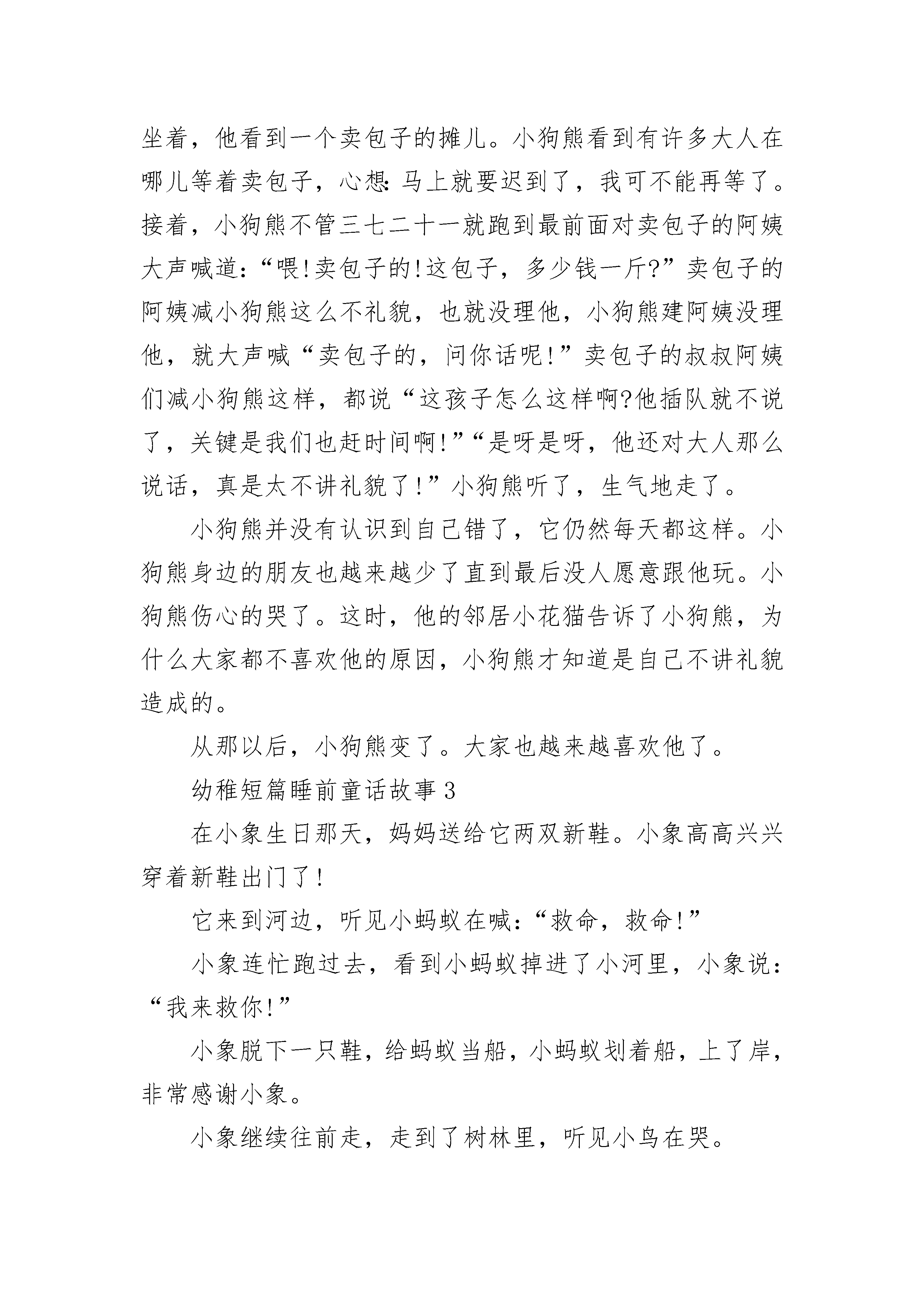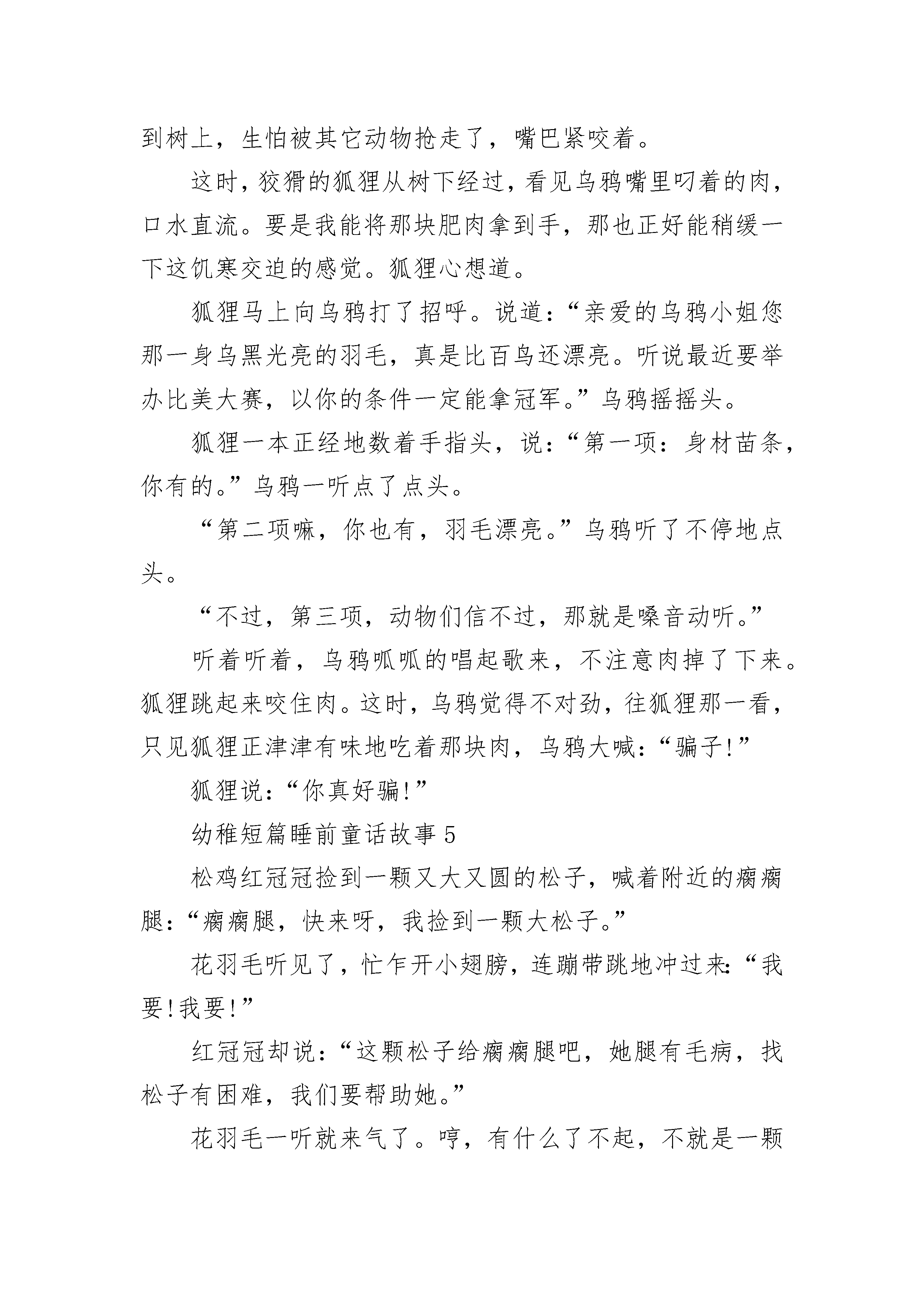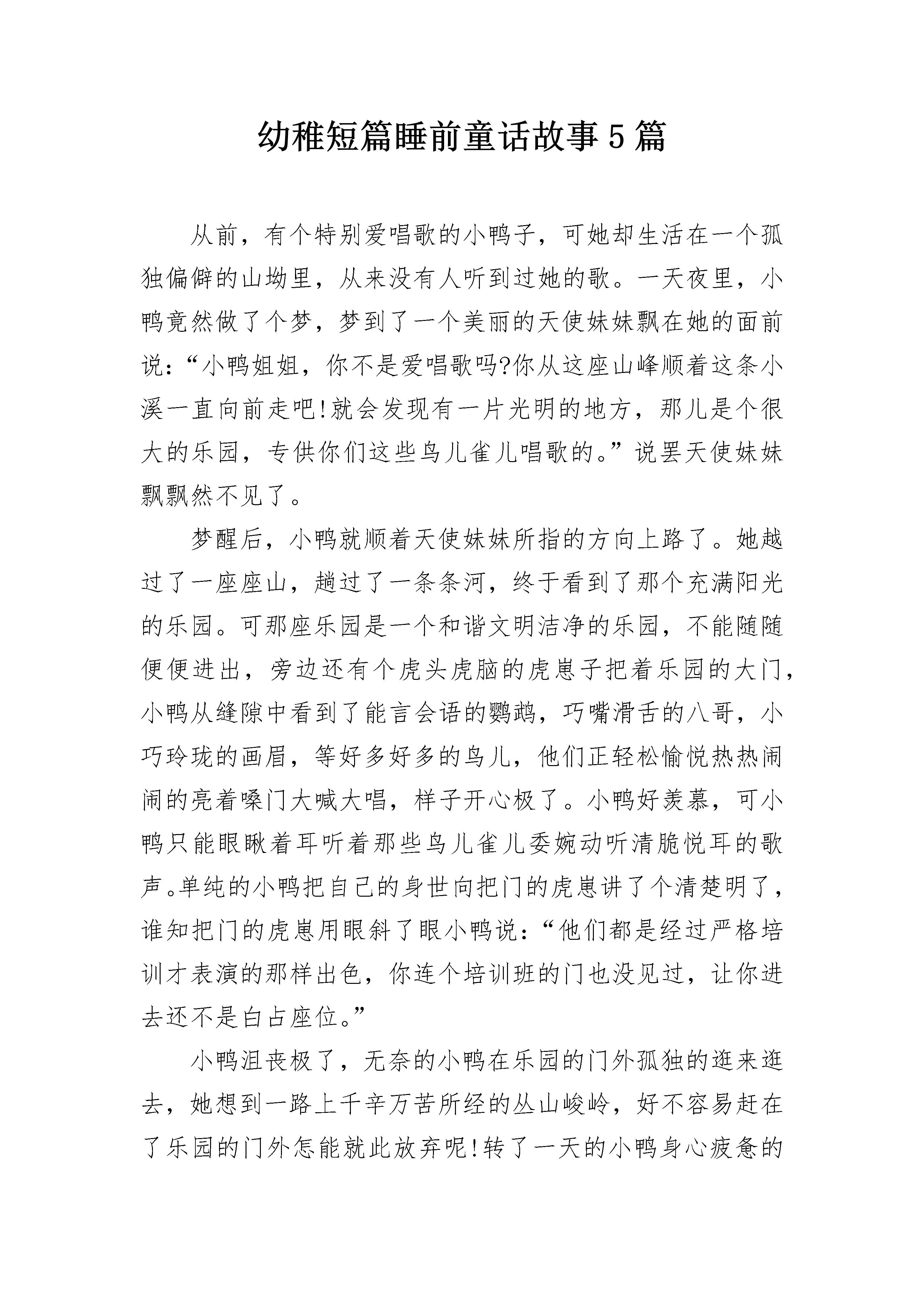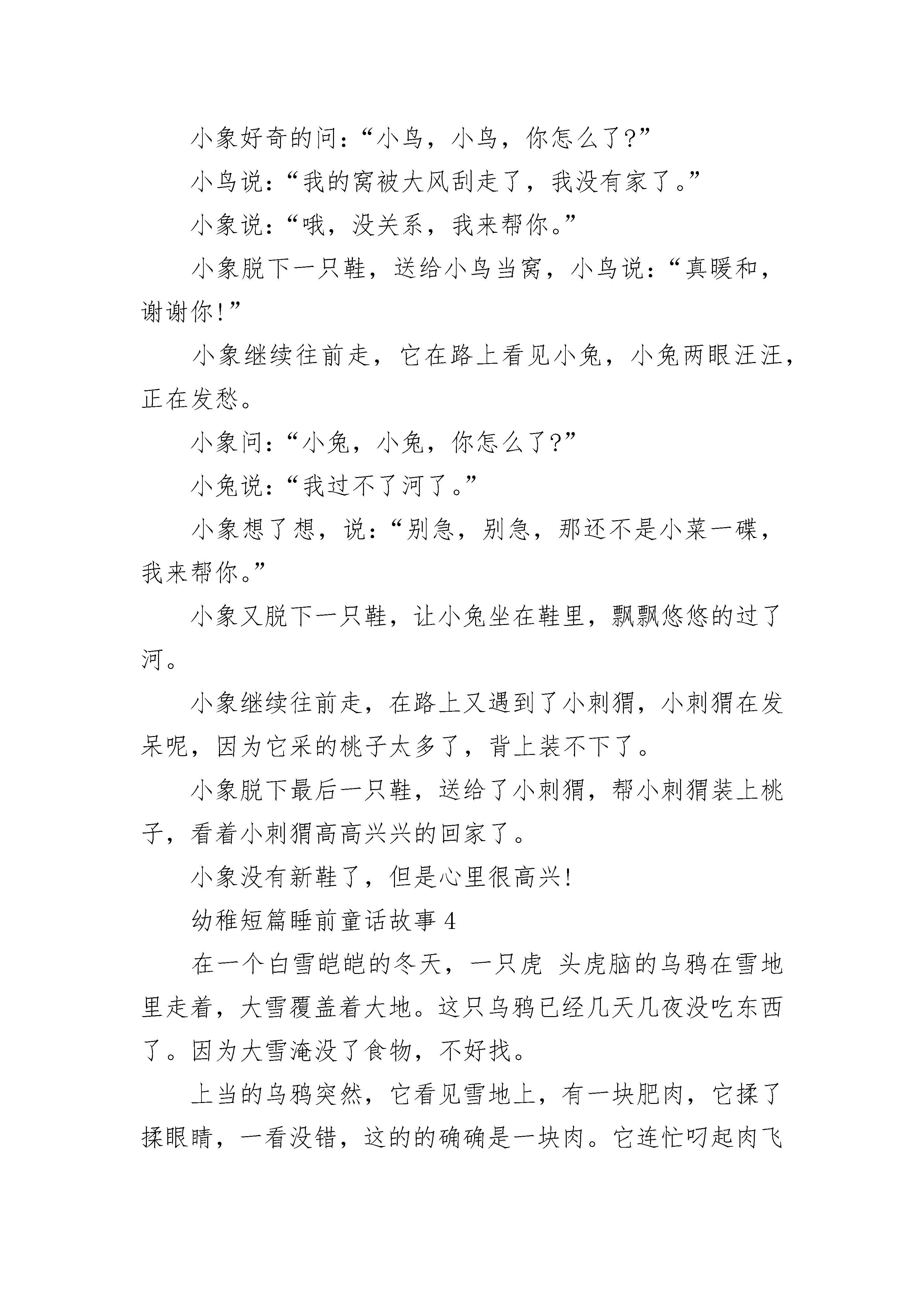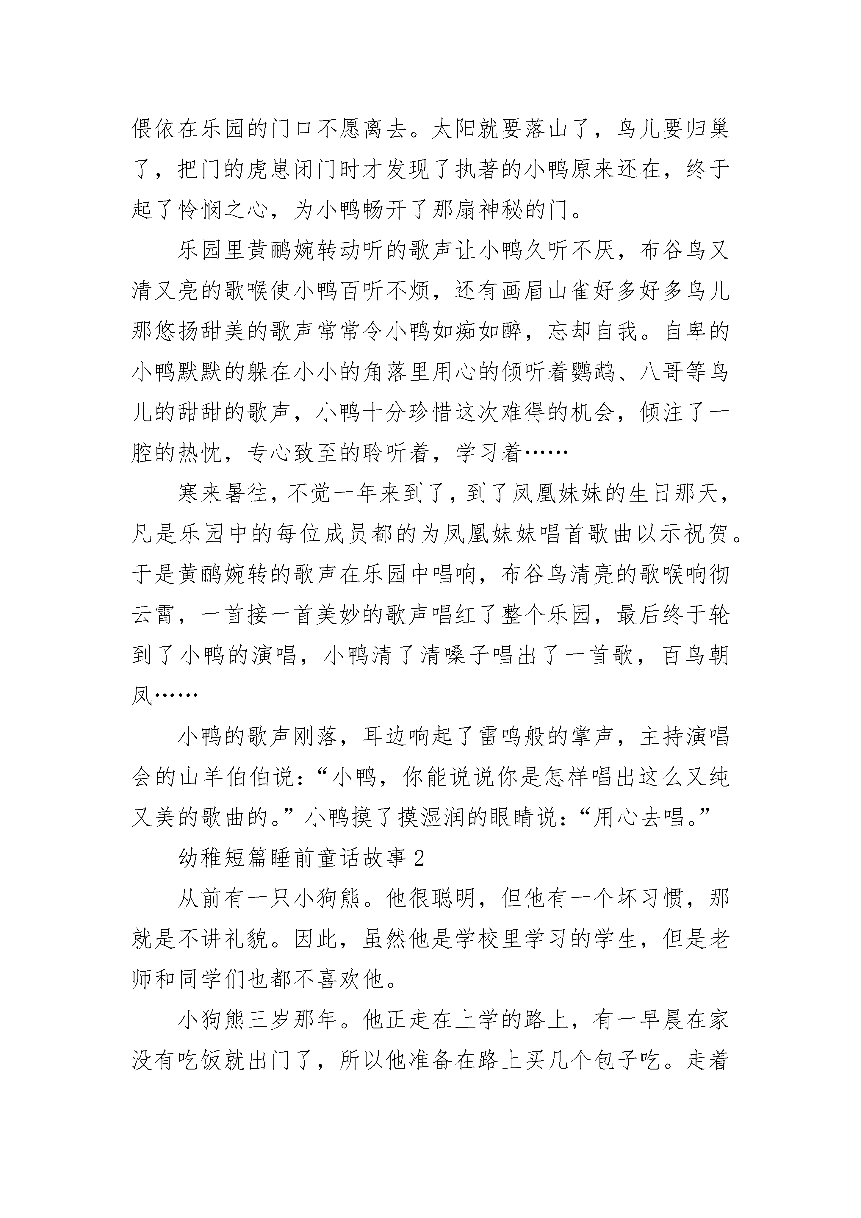 幼稚短篇睡前童话故事5篇从前,有个特别爱唱歌的小鸭子,可她却生活在一个孤独偏僻的山坳里,从来没有人听到过她的歌。一天夜里,小鸭竟然做了个梦,梦到了一个美丽的天使妹妹飘在她的面前说:“小鸭姐姐,你不是爱唱歌吗?你从这座山峰顺着这条小溪一直向前走吧!就会发现有一片光明的地方,那儿是个很大的乐园,专供你们这些鸟儿雀儿唱歌的。”说罢天使妹妹飘飘然不见了。梦醒后,小鸭就顺着天使妹妹所指的方向上路了。她越过了一座座山,趟过了一条条河,终于看到了那个充满阳光的乐园。可那座乐园是一个和谐文明洁净的乐园,不能随随便便进出,旁边还有个虎头虎脑的虎崽子把着乐园的大门,小鸭从缝隙中看到了能言会语的鹦鹉,巧嘴滑舌的八哥,小巧玲珑的画眉,等好多好多的鸟儿,他们正轻松愉悦热热闹闹的亮着嗓门大喊大唱,样子开心极了。小鸭好羡慕,可小鸭只能眼瞅着耳听着那些鸟儿雀儿委婉动听清脆悦耳的歌声。单纯的小鸭把自己的身世向把门的虎崽讲了个清楚明了,谁知把门的虎崽用眼斜了眼小鸭说:“他们都是经过严格培训才表演的那样出色,你连个培训班的门也没见过,让你进去还不是白占座位。”小鸭沮丧极了,无奈的小鸭在乐园的门外孤独的逛来逛去,她想到一路上千辛万苦所经的丛山峻岭,好不容易赶在了乐园的门外怎能就此放弃呢!转了一天的小鸭身心疲惫的偎依在乐园的门口不愿离去。太阳就要落山了,鸟儿要归巢了,把门的虎崽闭门时才发现了执著的小鸭原来还在,终于起了怜悯之心,为小鸭畅开了那扇神秘的门。乐园里黄鹂婉转动听的歌声让小鸭久听不厌,布谷鸟又清又亮的歌喉使小鸭百听不烦,还有画眉山雀好多好多鸟儿那悠扬甜美的歌声常常令小鸭如痴如醉,忘却自我。自卑的小鸭默默的躲在小小的角落里用心的倾听着鹦鹉、八哥等鸟儿的甜甜的歌声,小鸭十分珍惜这次难得的机会,倾注了一腔的热忱,专心致至的聆听着,学习着……寒来暑往,不觉一年来到了,到了凤凰妹妹的生日那天,凡是乐园中的每位成员都的为凤凰妹妹唱首歌曲以示祝贺。于是黄鹂婉转的歌声在乐园中唱响,布谷鸟清亮的歌喉响彻云霄,一首接一首美妙的歌声唱红了整个乐园,最后终于轮到了小鸭的演唱,小鸭清了清嗓子唱出了一首歌,百鸟朝凤……小鸭的歌声刚落,耳边响起了雷鸣般的掌声,主持演唱会的山羊伯伯说:“小鸭,你能说说你是怎样唱出这么又纯又美的歌曲的。”小鸭摸了摸湿润的眼睛说:“用心去唱。”幼稚短篇睡前童话故事2从前有一只小狗熊。他很聪明,但他有一个坏习惯,那就是不讲礼貌。因此,虽然他是学校里学习的学生,但是老师和同学们也都不喜欢他。小狗熊三岁那年。他正走在上学的路上,有一早晨在家没有吃饭就出门了,所以他准备在路上买几个包子吃。走着坐着,他看到一个卖包子的摊儿。小狗熊看到有许多大人在哪儿等着卖包子,心想:马上就要迟到了,我可不能再等了。接着,小狗熊不管三七二十一就跑到最前面对卖包子的阿姨大声喊道:“喂!卖包子的!这包子,多少钱一斤?”卖包子的阿姨减小狗熊这么不礼貌,也就没理他,小狗熊建阿姨没理他,就大声喊“卖包子的,问你话呢!”卖包子的叔叔阿姨们减小狗熊这样,都说“这孩子怎么这样啊?他插队就不说了,关键是我们也赶时间啊!”“是呀是呀,他还对大人那么说话,真是太不讲礼貌了!”小狗熊听了,生气地走了。小狗熊并没有认识到自己错了,它仍然每天都这样。小狗熊身边的朋友也越来越少了直到最后没人愿意跟他玩。小狗熊伤心的哭了。这时,他的邻居小花猫告诉了小狗熊,为什么大家都不喜欢他的原因,小狗熊才知道是自己不讲礼貌造成的。从那以后,小狗熊变了。大家也越来越喜欢他了。幼稚短篇睡前童话故事3在小象生日那天,妈妈送给它两双新鞋。小象高高兴兴穿着新鞋出门了!它来到河边,听见小蚂蚁在喊:“救命,救命!”小象连忙跑过去,看到小蚂蚁掉进了小河里,小象说:“我来救你!”小象脱下一只鞋,给蚂蚁当船,小蚂蚁划着船,上了岸,非常感谢小象。小象继续往前走,走到了树林里,听见小鸟在哭。小象好奇的问:“小鸟,小鸟,你怎么了?”小鸟说:“我的窝被大风刮走了,我没有家了。”小象说:“哦,没关系,我来帮你。”小象脱下一只鞋,送给小鸟当窝,小鸟说:“真暖和,谢谢你!”小象继续往前走,它在路上看见小兔,小兔两眼汪汪,正在发愁。小象问:“小兔,小兔,你怎么了?”小兔说:“我过不了河了。”小象想了想,说:“别急,别急,那还不是小菜一碟,我来帮你。”小象又脱下一只鞋,让小兔坐在鞋里,飘飘悠悠的过了河。小象继续往前走,在路上又遇到了小刺猬,小刺猬在发呆呢,因为它采的桃子太多了,背上装不下了。小象脱下最后一只鞋,送给了小刺猬,帮小刺猬装上桃子,看着小刺猬高高兴兴的回家了。小象没有新鞋了,但是心里很高兴!幼稚短篇睡前童话故事4在一个白雪皑皑的冬天,一只虎头虎脑的乌鸦在雪地里走着,大雪覆盖着大地。这只乌鸦已经几天几夜没吃东西了。因为大雪淹没了食物,不好找。上当的乌鸦突然,它