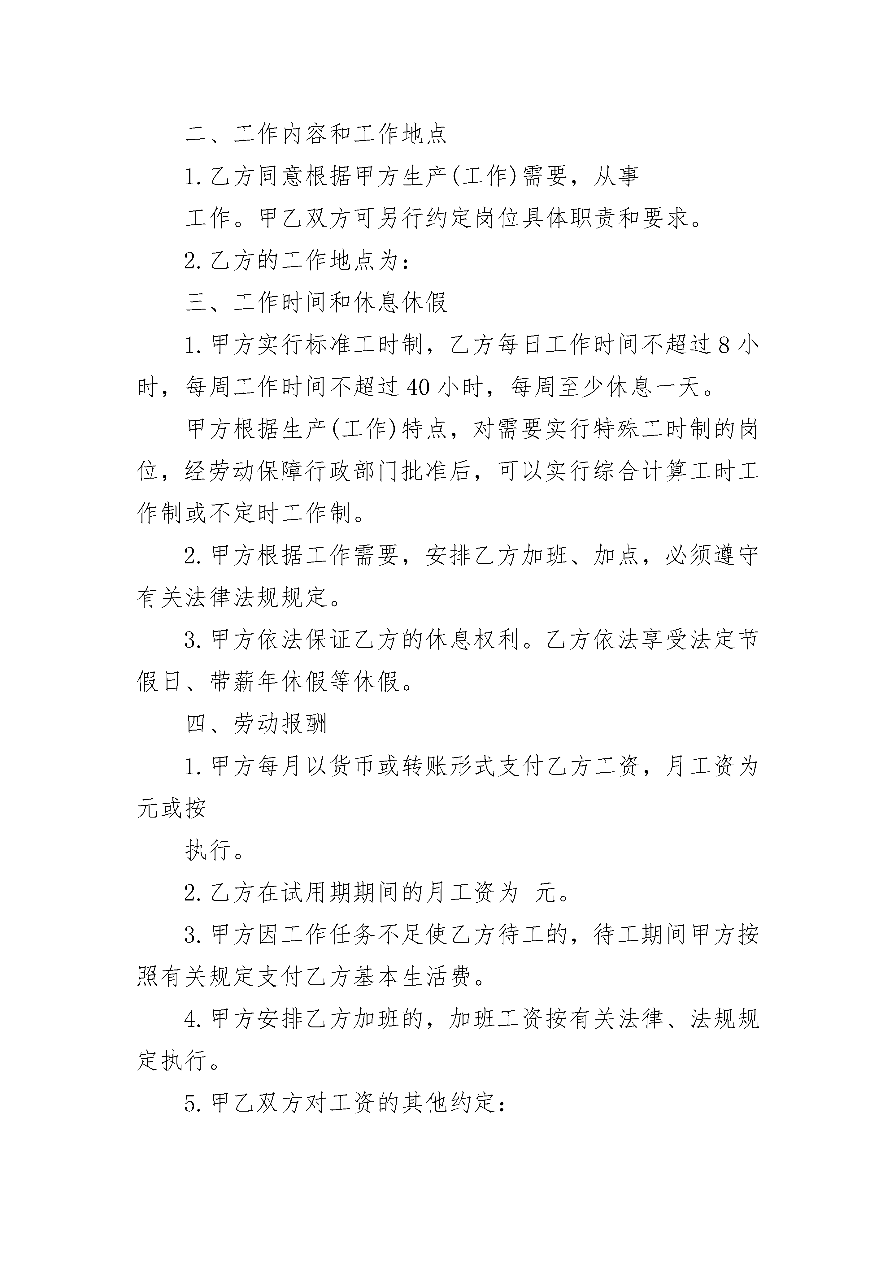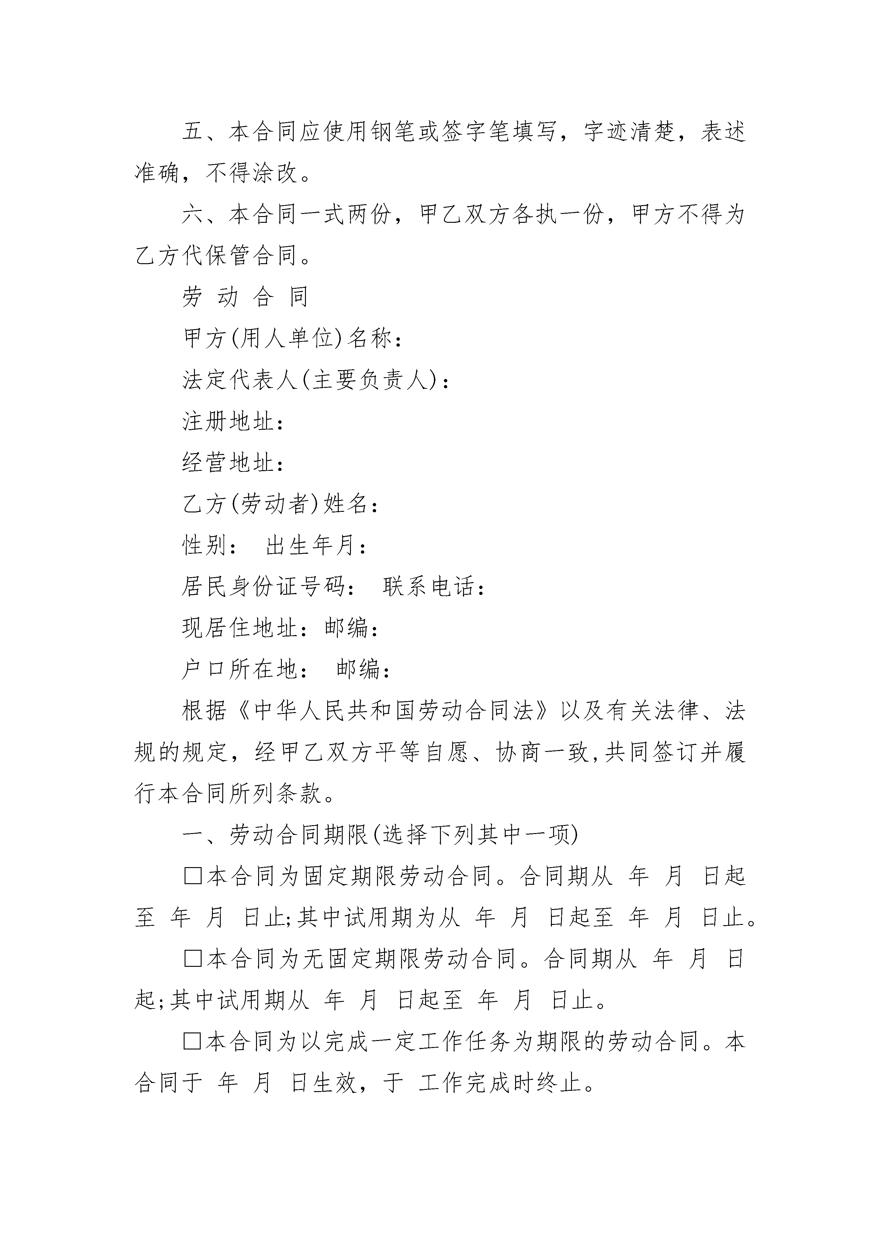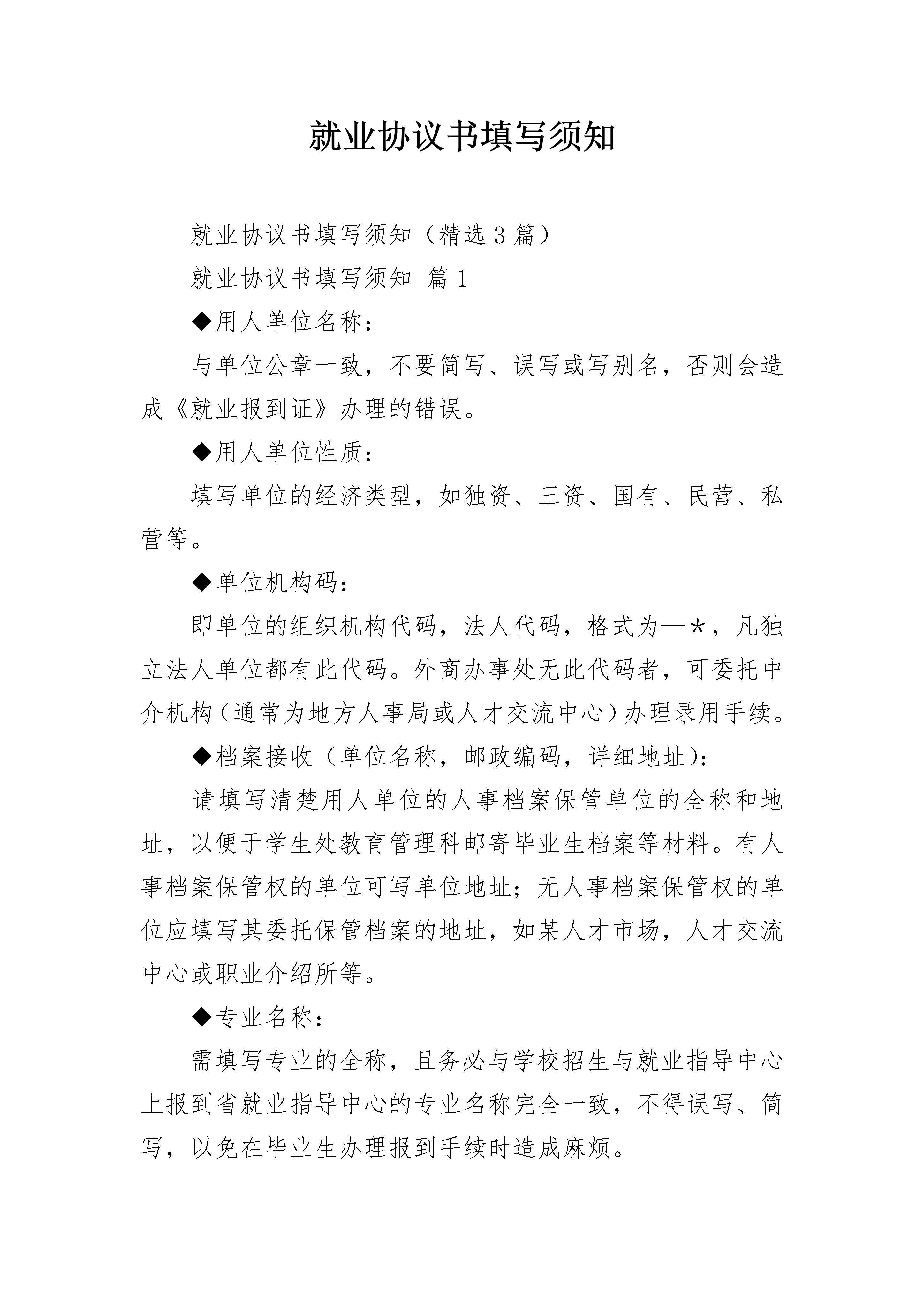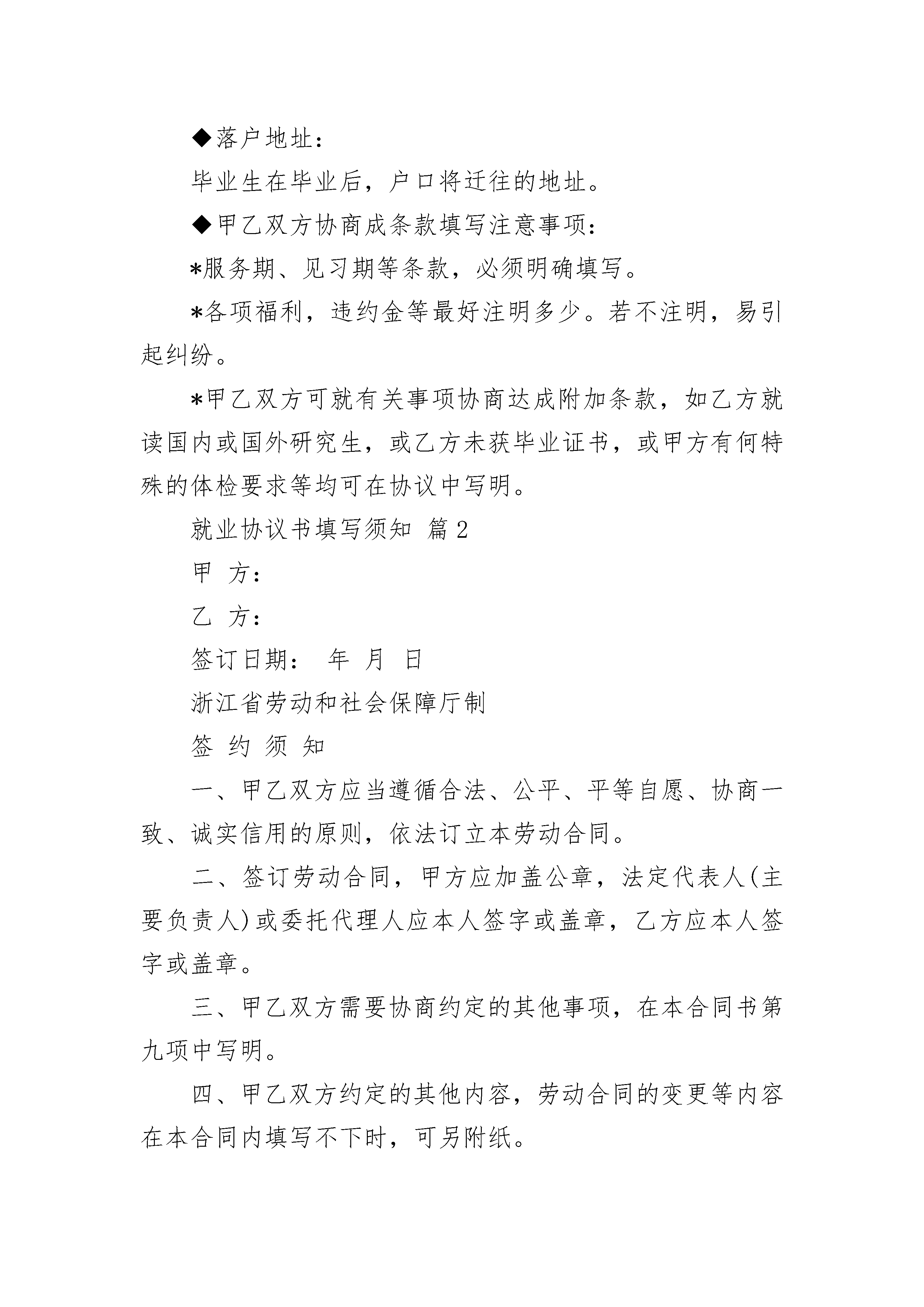 就业协议书填写须知就业协议书填写须知(精选3篇)就业协议书填写须知篇1◆用人单位名称:与单位公章一致,不要简写、误写或写别名,否则会造成《就业报到证》办理的错误。◆用人单位性质:填写单位的经济类型,如独资、三资、国有、民营、私营等。◆单位机构码:即单位的组织机构代码,法人代码,格式为—*,凡独立法人单位都有此代码。外商办事处无此代码者,可委托中介机构(通常为地方人事局或人才交流中心)办理录用手续。◆档案接收(单位名称,邮政编码,详细地址):请填写清楚用人单位的人事档案保管单位的全称和地址,以便于学生处教育管理科邮寄毕业生档案等材料。有人事档案保管权的单位可写单位地址;无人事档案保管权的单位应填写其委托保管档案的地址,如某人才市场,人才交流中心或职业介绍所等。◆专业名称:需填写专业的全称,且务必与学校招生与就业指导中心上报到省就业指导中心的专业名称完全一致,不得误写、简写,以免在毕业生办理报到手续时造成麻烦。◆落户地址:毕业生在毕业后,户口将迁往的地址。◆甲乙双方协商成条款填写注意事项:*服务期、见习期等条款,必须明确填写。*各项福利,违约金等最好注明多少。若不注明,易引起纠纷。*甲乙双方可就有关事项协商达成附加条款,如乙方就读国内或国外研究生,或乙方未获毕业证书,或甲方有何特殊的体检要求等均可在协议中写明。就业协议书填写须知篇2甲方:乙方:签订日期:年月日浙江省劳动和社会保障厅制签约须知一、甲乙双方应当遵循合法、公平、平等自愿、协商一致、诚实信用的原则,依法订立本劳动合同。二、签订劳动合同,甲方应加盖公章,法定代表人(主要负责人)或委托代理人应本人签字或盖章,乙方应本人签字或盖章。三、甲乙双方需要协商约定的其他事项,在本合同书第九项中写明。四、甲乙双方约定的其他内容,劳动合同的变更等内容在本合同内填写不下时,可另附纸。五、本合同应使用钢笔或签字笔填写,字迹清楚,表述准确,不得涂改。六、本合同一式两份,甲乙双方各执一份,甲方不得为乙方代保管合同。劳动合同甲方(用人单位)名称:法定代表人(主要负责人):注册地址:经营地址:乙方(劳动者)姓名:性别:出生年月:居民身份证号码:联系电话:现居住地址:邮编:户口所在地:邮编:根据《中华人民共和国劳动合同法》以及有关法律、法规的规定,经甲乙双方平等自愿、协商一致,共同签订并履行本合同所列条款。一、劳动合同期限(选择下列其中一项)□本合同为固定期限劳动合同。合同期从年月日起至年月日止;其中试用期为从年月日起至年月日止。□本合同为无固定期限劳动合同。合同期从年月日起;其中试用期从年月日起至年月日止。□本合同为以完成一定工作任务为期限的劳动合同。本合同于年月日生效,于工作完成时终止。二、工作内容和工作地点1.乙方同意根据甲方生产(工作)需要,从事工作。甲乙双方可另行约定岗位具体职责和要求。2.乙方的工作地点为:三、工作时间和休息休假1.甲方实行标准工时制,乙方每日工作时间不超过8小时,每周工作时间不超过40小时,每周至少休息一天。甲方根据生产(工作)特点,对需要实行特殊工时制的岗位,经劳动保障行政部门批准后,可以实行综合计算工时工作制或不定时工作制。2.甲方根据工作需要,安排乙方加班、加点,必须遵守有关法律法规规定。3.甲方依法保证乙方的休息权利。乙方依法享受法定节假日、带薪年休假等休假。四、劳动报酬1.甲方每月以货币或转账形式支付乙方工资,月工资为元或按执行。2.乙方在试用期期间的月工资为元。3.甲方因工作任务不足使乙方待工的,待工期间甲方按照有关规定支付乙方基本生活费。4.甲方安排乙方加班的,加班工资按有关法律、法规规定执行。5.甲乙双方对工资的其他约定:五、社会保险及福利1.甲乙双方依法参加社会保险,缴纳社会保险费。甲方为乙方办理有关社会保险手续,乙方负担的部分由甲方负责代扣代缴。2.乙方患病或非因工负伤的医疗待遇按有关规定执行。3.乙方患职业病或因工负伤的待遇按有关规定执行。4.甲方可根据其实际情况为乙方提供其他保险和福利待遇。六、劳动保护、劳动条件和职业危害防护1.甲方根据国家有关法律、法规,建立安全生产制度。乙方严格遵守甲方的劳动安全制度。双方严禁违章作业,防止劳动过程中的事故发生,减少职业危害。2.甲方建立、健全职业病防治责任制度,制定并落实职业病防范措施。对工作过程中可能产生的职业病危害及其后果等,甲方应向乙方如实告知,不得隐瞒或者欺骗。3.甲方根据生产岗位的需要,按照国家有关劳动安全卫生的规定为乙方配置和完善必要的安全防护措施,发放必要的劳动保护用品。4.乙方在炎夏季节高温条件下进行劳动生产的,甲方可根据生产(工作)特点,适当调整夏季高温条件下劳动和休息制度,增加休息和减轻劳动强度,减少高温时段作业,确保乙方身体健康和生命安全,并按政府有关规定向乙方发放夏季清凉饮料费。七、