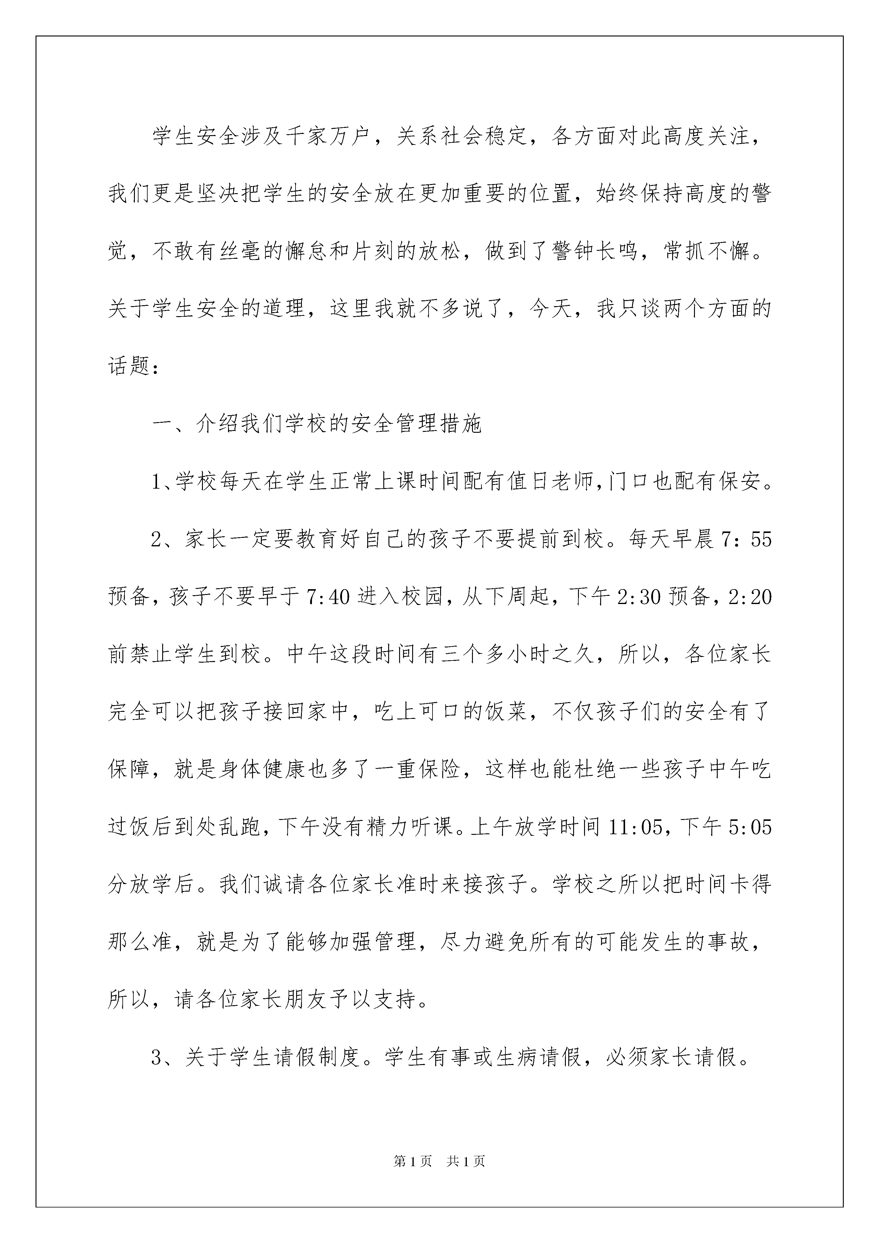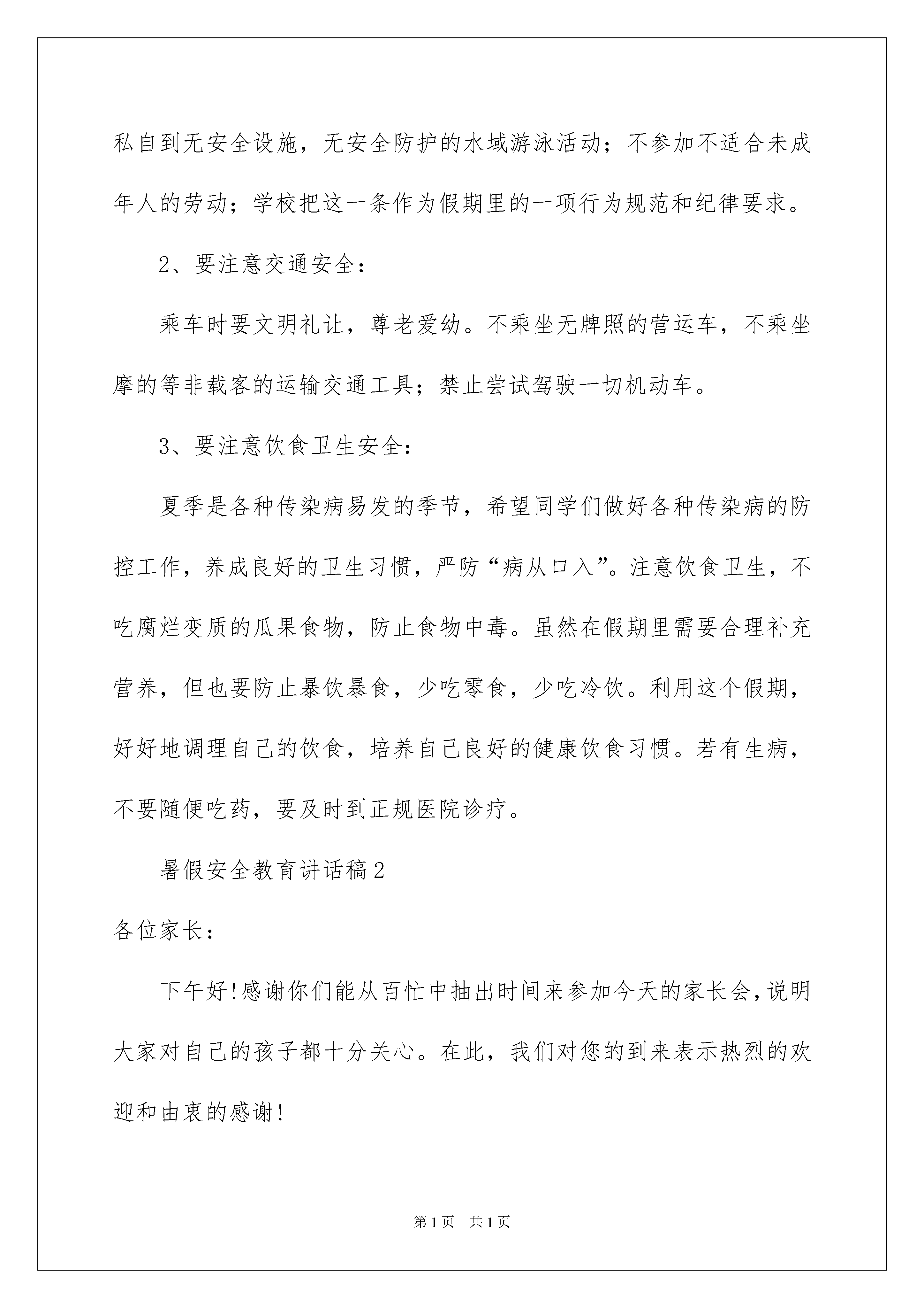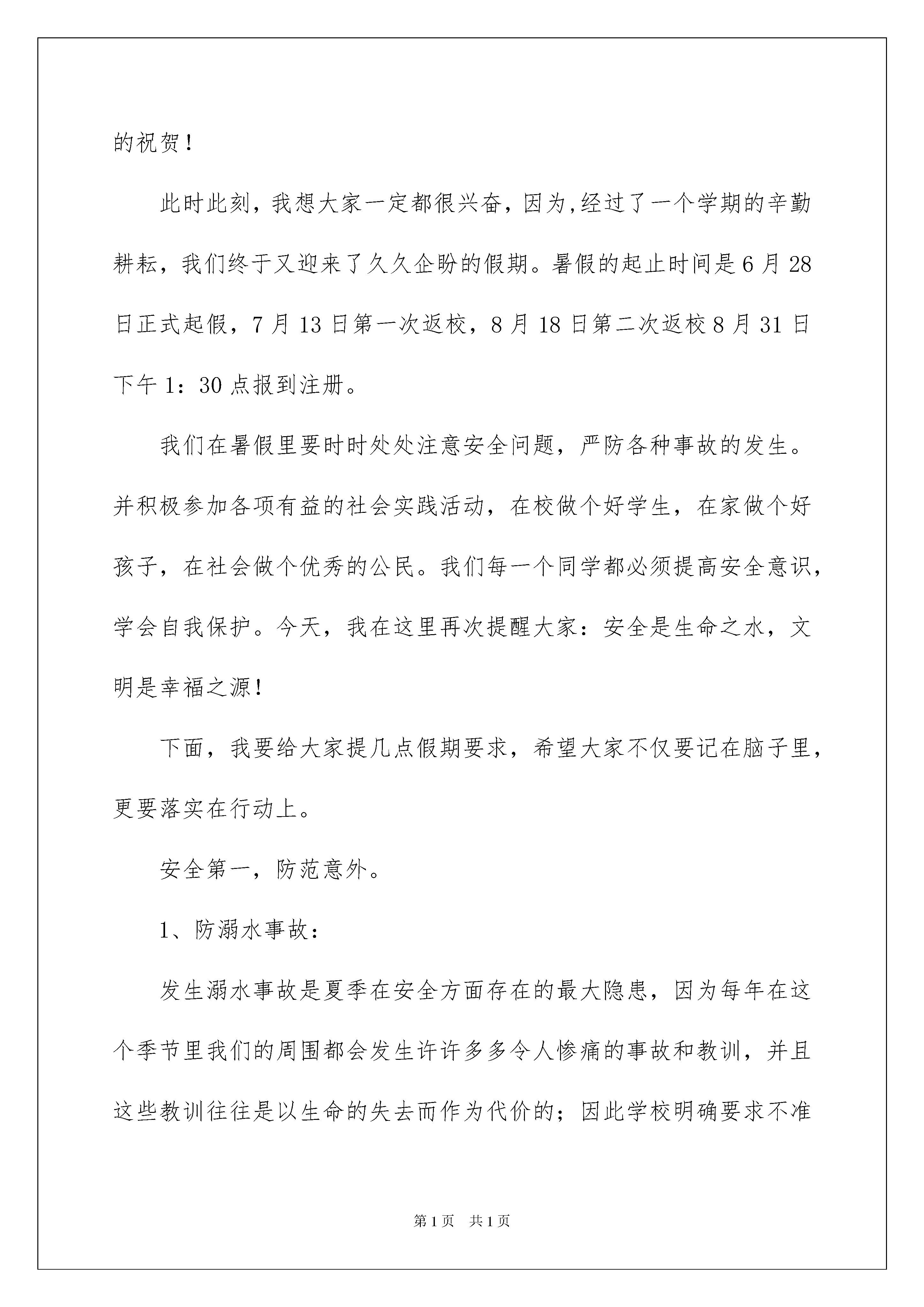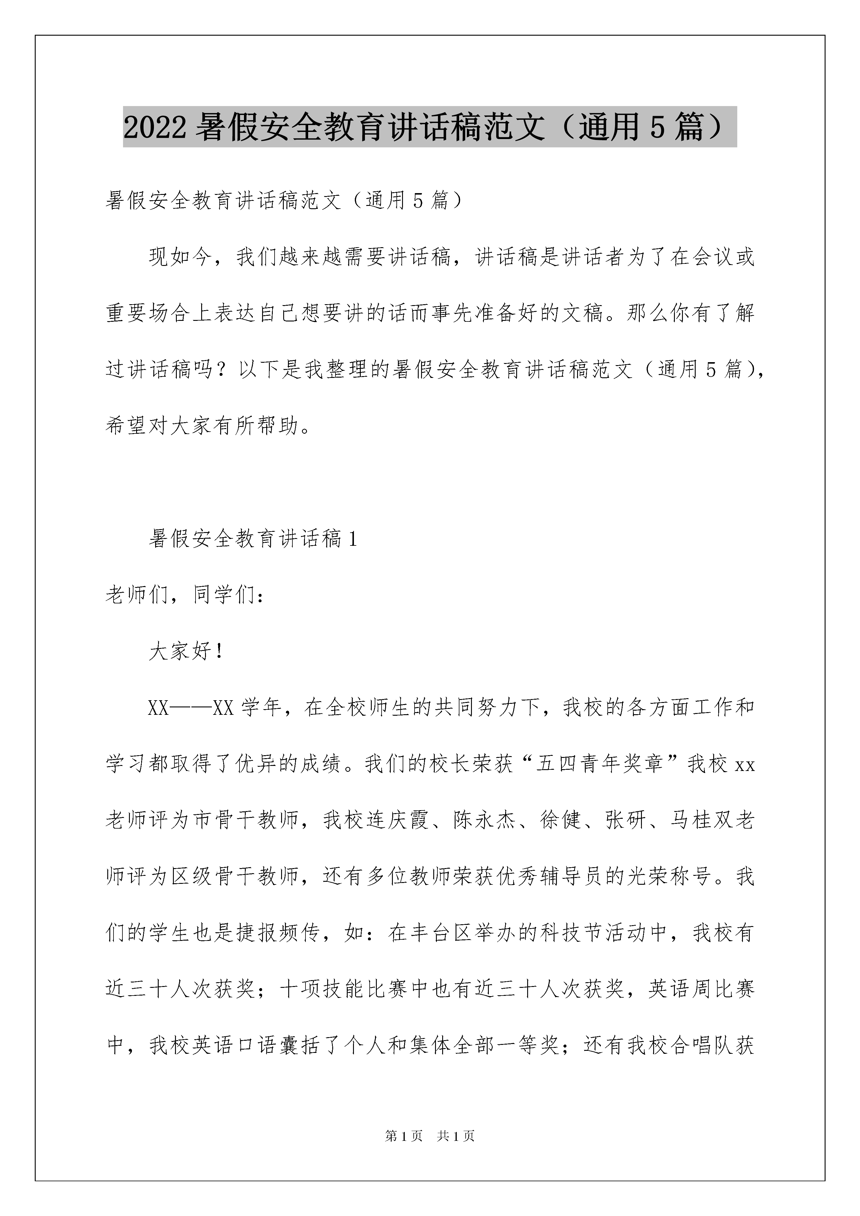 2022暑假安全教育讲话稿范文(通用5篇)暑假安全教育讲话稿范文(通用5篇)现如今,我们越来越需要讲话稿,讲话稿是讲话者为了在会议或重要场合上表达自己想要讲的话而事先准备好的文稿。那么你有了解过讲话稿吗?以下是我整理的暑假安全教育讲话稿范文(通用5篇),希望对大家有所帮助。暑假安全教育讲话稿1老师们,同学们:大家好!XX——XX学年,在全校师生的共同努力下,我校的各方面工作和学习都取得了优异的成绩。我们的校长荣获“五四青年奖章”我校xx老师评为市骨干教师,我校连庆霞、陈永杰、徐健、张研、马桂双老师评为区级骨干教师,还有多位教师荣获优秀辅导员的光荣称号。我们的学生也是捷报频传,如:在丰台区举办的科技节活动中,我校有近三十人次获奖;十项技能比赛中也有近三十人次获奖,英语周比赛中,我校英语口语囊括了个人和集体全部一等奖;还有我校合唱队获得市级一等奖,小合唱获市二等奖,这些荣誉和成绩是我们全体师生能力和态度的象征,学校衷心的象他们表示祝贺。同时,本学期我校举办了一年一度的校园艺术节,在整个活动中,我们有几十位教师参与组织和服务,有几百位同学参与了比赛和表演活动,充分展示了我校师生的才华和风采,用我们的赤子之心表达了对我们的学校的赞美和热爱之情。下学期,我们还将开展争创四优中学生等各项活动,希望全校同学继续加油,争取在各方面突出自己的优势,争创四优中学生的称号。本学期的各项评比中有以下班集体荣获了校优秀班集体的称号,他们是:初一、2班,初一、4班,初二、1班,初二、4班,初三、1班,初三、2班,初三、5班。荣获校文明班集体称号,初一、1班,初一、3班,初二、2班,初二,3班,初三、3班,初三,4班,我们向以上班集体表示祝贺,同时号召全校同学争取在下学期再创佳绩。在这里,我谨代表学校,对辛勤劳动、无私奉献的全体教师致以衷心的感谢!对奋发向上、积极进取,获得优异成绩的学生表示热烈的祝贺!此时此刻,我想大家一定都很兴奋,因为,经过了一个学期的辛勤耕耘,我们终于又迎来了久久企盼的假期。暑假的起止时间是6月28日正式起假,7月13日第一次返校,8月18日第二次返校8月31日下午1:30点报到注册。我们在暑假里要时时处处注意安全问题,严防各种事故的发生。并积极参加各项有益的社会实践活动,在校做个好学生,在家做个好孩子,在社会做个优秀的公民。我们每一个同学都必须提高安全意识,学会自我保护。今天,我在这里再次提醒大家:安全是生命之水,文明是幸福之源!下面,我要给大家提几点假期要求,希望大家不仅要记在脑子里,更要落实在行动上。安全第一,防范意外。1、防溺水事故:发生溺水事故是夏季在安全方面存在的最大隐患,因为每年在这个季节里我们的周围都会发生许许多多令人惨痛的事故和教训,并且这些教训往往是以生命的失去而作为代价的;因此学校明确要求不准私自到无安全设施,无安全防护的水域游泳活动;不参加不适合未成年人的劳动;学校把这一条作为假期里的一项行为规范和纪律要求。2、要注意交通安全:乘车时要文明礼让,尊老爱幼。不乘坐无牌照的营运车,不乘坐摩的等非载客的运输交通工具;禁止尝试驾驶一切机动车。3、要注意饮食卫生安全:夏季是各种传染病易发的季节,希望同学们做好各种传染病的防控工作,养成良好的卫生习惯,严防“病从口入”。注意饮食卫生,不吃腐烂变质的瓜果食物,防止食物中毒。虽然在假期里需要合理补充营养,但也要防止暴饮暴食,少吃零食,少吃冷饮。利用这个假期,好好地调理自己的饮食,培养自己良好的健康饮食习惯。若有生病,不要随便吃药,要及时到正规医院诊疗。暑假安全教育讲话稿2各位家长:下午好!感谢你们能从百忙中抽出时间来参加今天的家长会,说明大家对自己的孩子都十分关心。在此,我们对您的到来表示热烈的欢迎和由衷的感谢!学生安全涉及千家万户,关系社会稳定,各方面对此高度关注,我们更是坚决把学生的安全放在更加重要的位置,始终保持高度的警觉,不敢有丝毫的懈怠和片刻的放松,做到了警钟长鸣,常抓不懈。关于学生安全的道理,这里我就不多说了,今天,我只谈两个方面的话题:一、介绍我们学校的安全管理措施1、学校每天在学生正常上课时间配有值日老师,门口也配有保安。2、家长一定要教育好自己的孩子不要提前到校。每天早晨7:55预备,孩子不要早于7:40进入校园,从下周起,下午2:30预备,2:20前禁止学生到校。中午这段时间有三个多小时之久,所以,各位家长完全可以把孩子接回家中,吃上可口的饭菜,不仅孩子们的安全有了保障,就是身体健康也多了一重保险,这样也能杜绝一些孩子中午吃过饭后到处乱跑,下午没有精力听课。上午放学时间11:05,下午5:05分放学后。