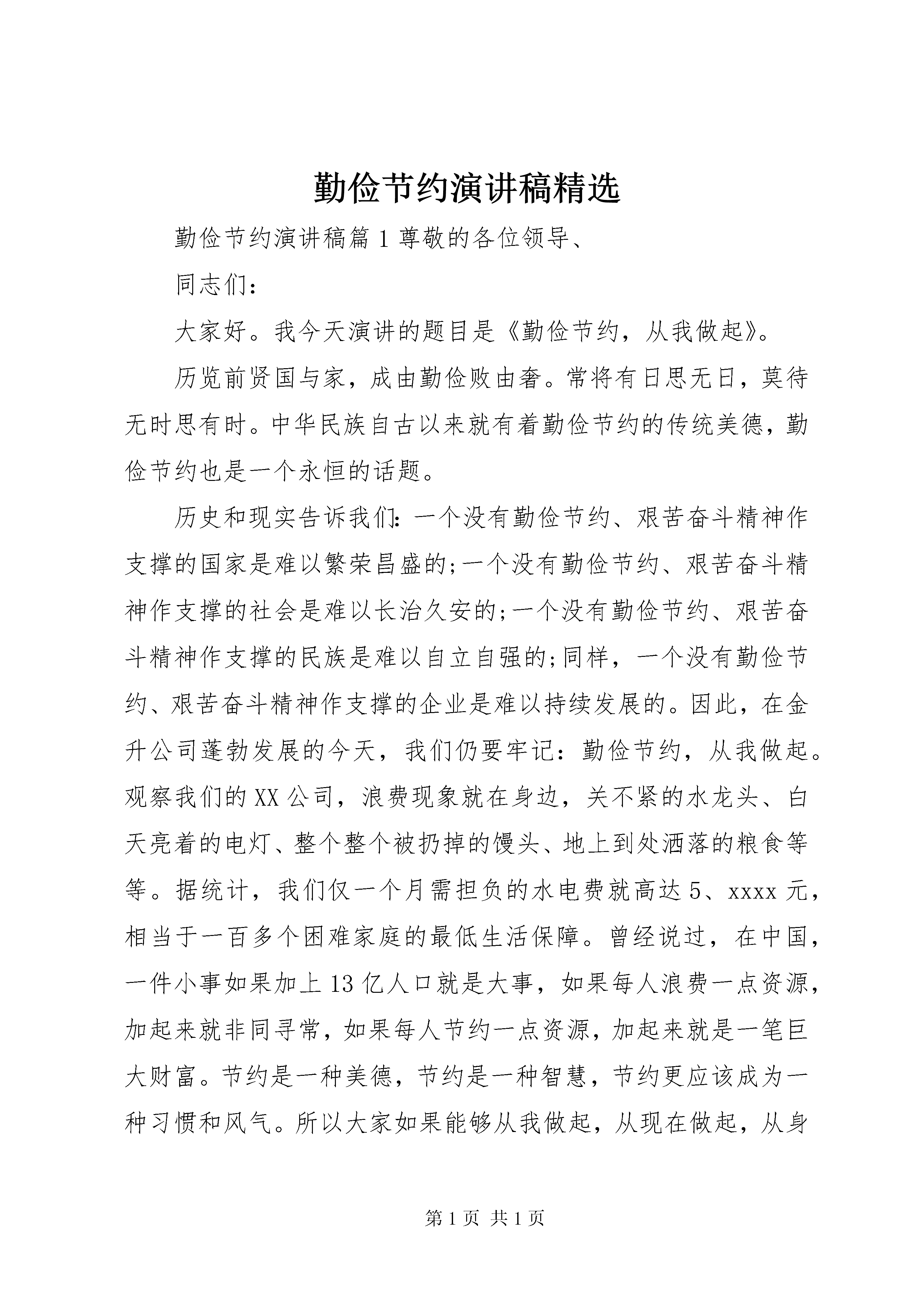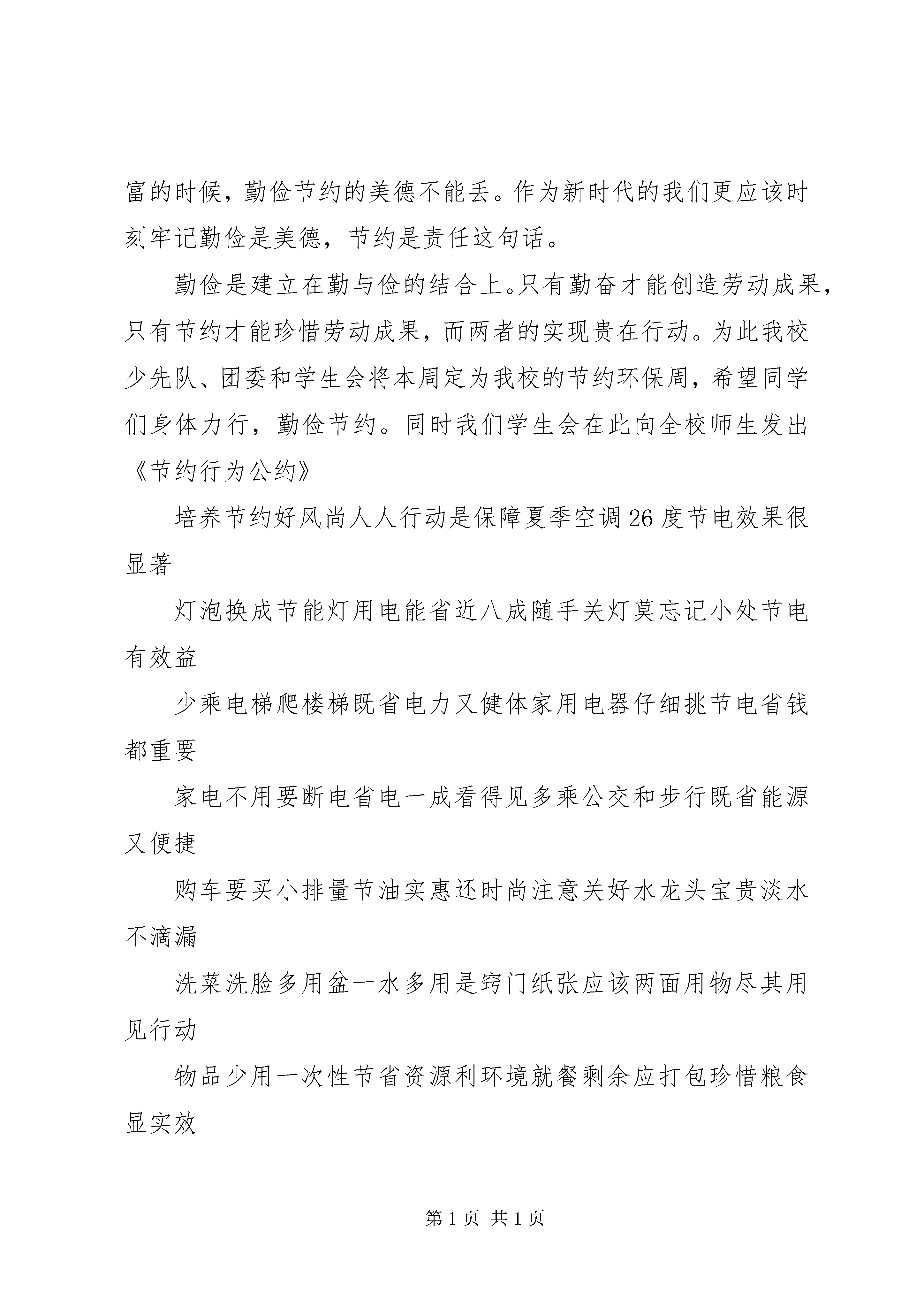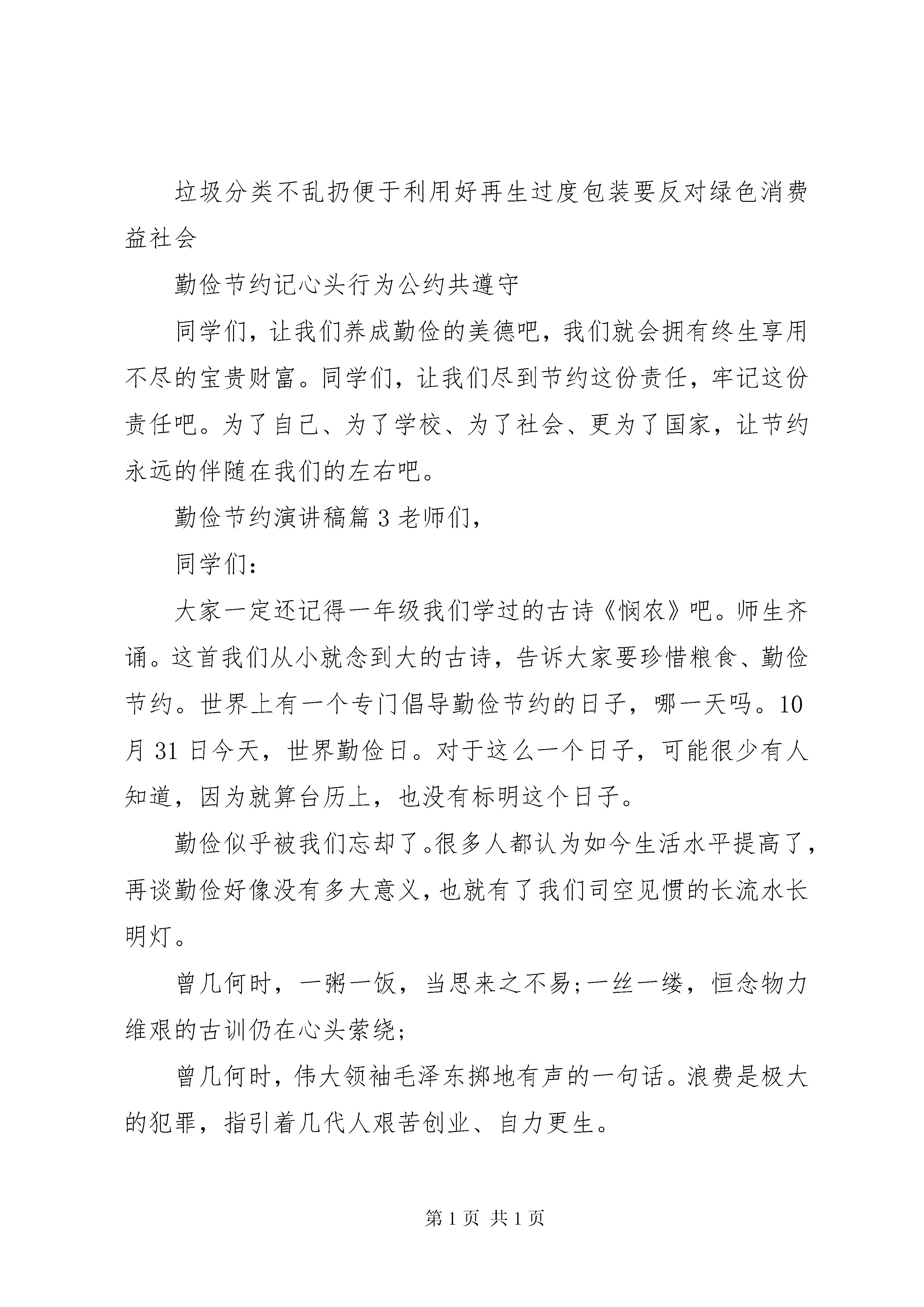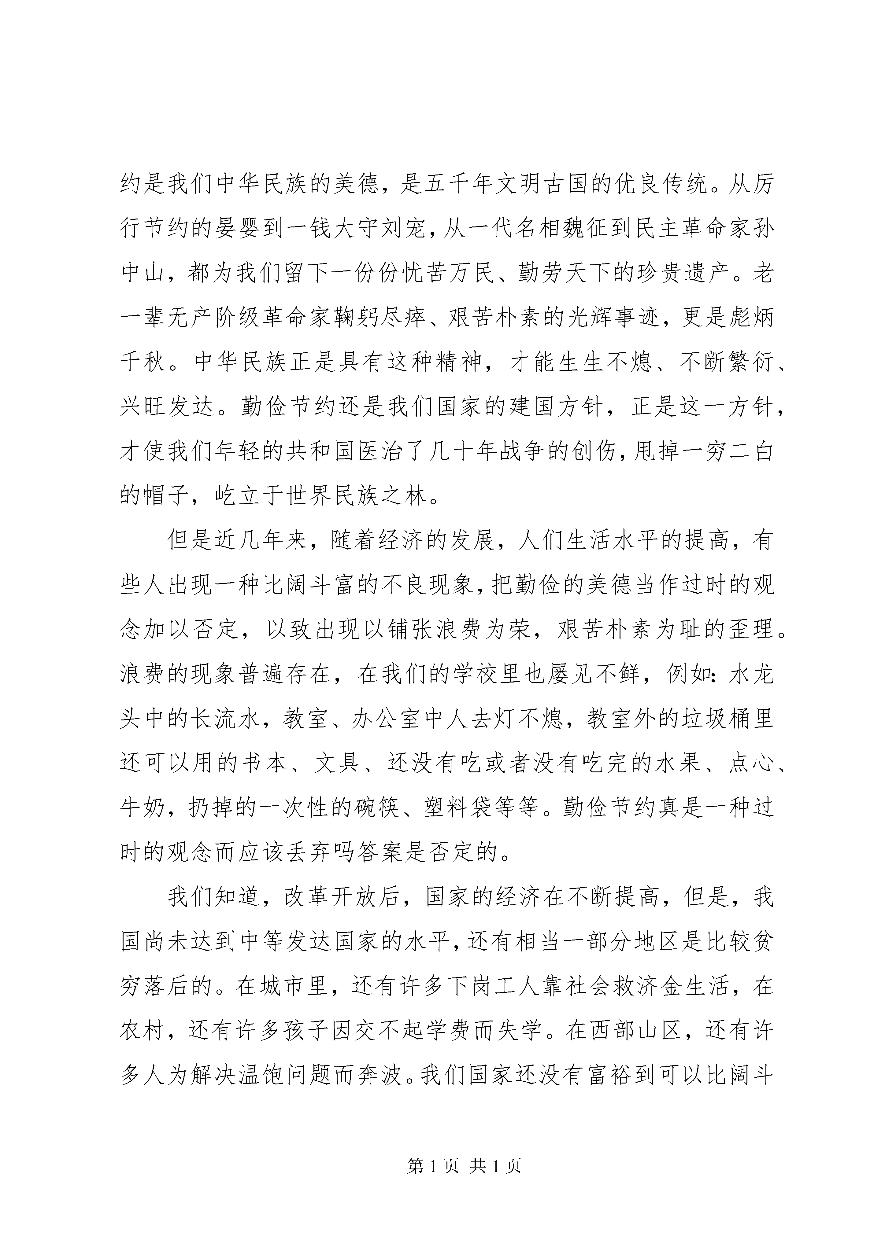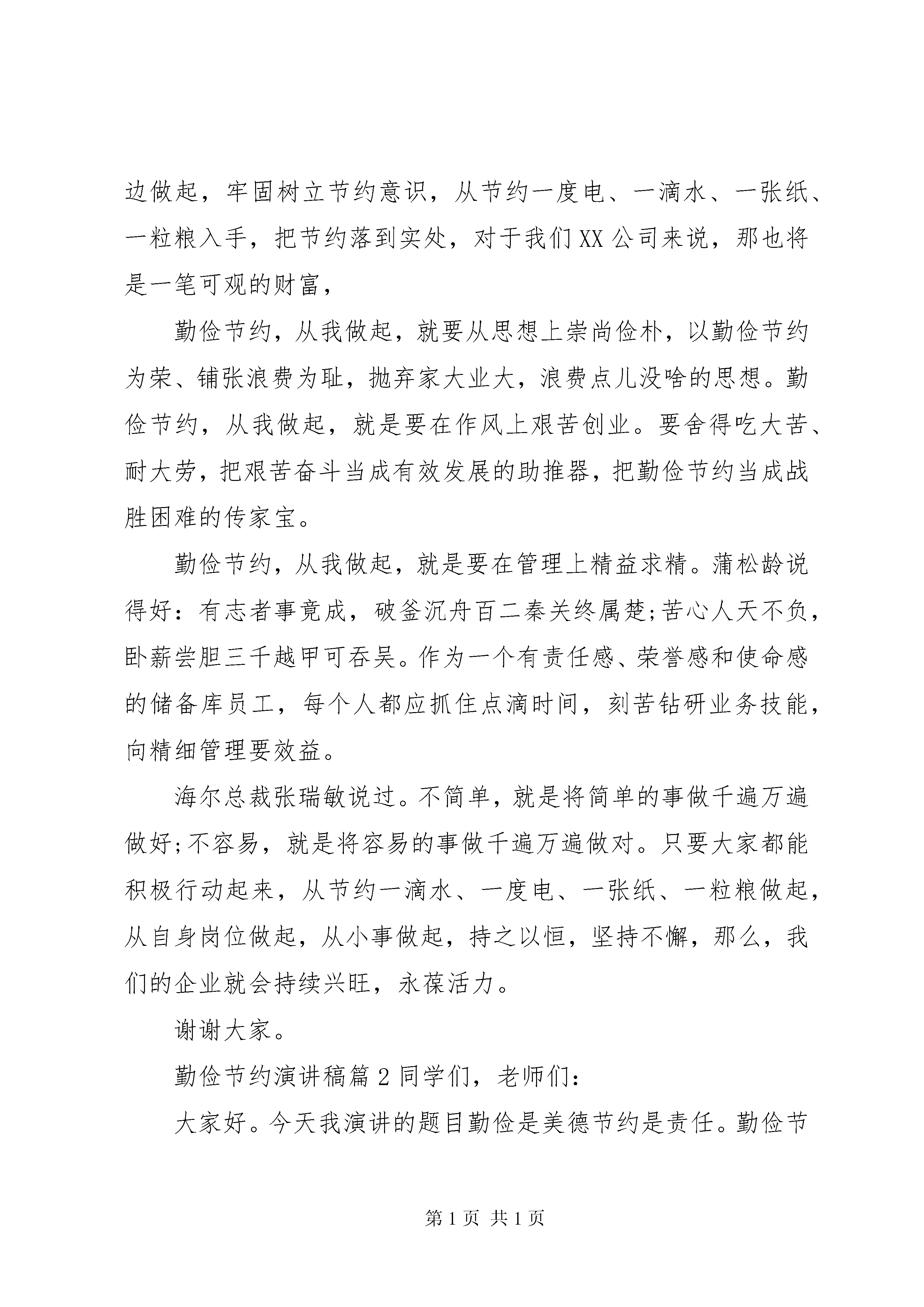 勤俭节约演讲稿精选勤俭节约演讲稿篇1尊敬的各位领导、同志们:大家好。我今天演讲的题目是《勤俭节约,从我做起》。历览前贤国与家,成由勤俭败由奢。常将有日思无日,莫待无时思有时。中华民族自古以来就有着勤俭节约的传统美德,勤俭节约也是一个永恒的话题。历史和现实告诉我们:一个没有勤俭节约、艰苦奋斗精神作支撑的国家是难以繁荣昌盛的;一个没有勤俭节约、艰苦奋斗精神作支撑的社会是难以长治久安的;一个没有勤俭节约、艰苦奋斗精神作支撑的民族是难以自立自强的;同样,一个没有勤俭节约、艰苦奋斗精神作支撑的企业是难以持续发展的。因此,在金升公司蓬勃发展的今天,我们仍要牢记:勤俭节约,从我做起。观察我们的XX公司,浪费现象就在身边,关不紧的水龙头、白天亮着的电灯、整个整个被扔掉的馒头、地上到处洒落的粮食等等。据统计,我们仅一个月需担负的水电费就高达5、xxxx元,相当于一百多个困难家庭的最低生活保障。曾经说过,在中国,一件小事如果加上13亿人口就是大事,如果每人浪费一点资源,加起来就非同寻常,如果每人节约一点资源,加起来就是一笔巨大财富。节约是一种美德,节约是一种智慧,节约更应该成为一种习惯和风气。所以大家如果能够从我做起,从现在做起,从身边做起,牢固树立节约意识,从节约一度电、一滴水、一张纸、一粒粮入手,把节约落到实处,对于我们XX公司来说,那也将是一笔可观的财富,勤俭节约,从我做起,就要从思想上崇尚俭朴,以勤俭节约为荣、铺张浪费为耻,抛弃家大业大,浪费点儿没啥的思想。勤俭节约,从我做起,就是要在作风上艰苦创业。要舍得吃大苦、耐大劳,把艰苦奋斗当成有效发展的助推器,把勤俭节约当成战胜困难的传家宝。勤俭节约,从我做起,就是要在管理上精益求精。蒲松龄说得好:有志者事竟成,破釜沉舟百二秦关终属楚;苦心人天不负,卧薪尝胆三千越甲可吞吴。作为一个有责任感、荣誉感和使命感的储备库员工,每个人都应抓住点滴时间,刻苦钻研业务技能,向精细管理要效益。海尔总裁张瑞敏说过。不简单,就是将简单的事做千遍万遍做好;不容易,就是将容易的事做千遍万遍做对。只要大家都能积极行动起来,从节约一滴水、一度电、一张纸、一粒粮做起,从自身岗位做起,从小事做起,持之以恒,坚持不懈,那么,我们的企业就会持续兴旺,永葆活力。谢谢大家。勤俭节约演讲稿篇2同学们,老师们:大家好。今天我演讲的题目勤俭是美德节约是责任。勤俭节约是我们中华民族的美德,是五千年文明古国的优良传统。从厉行节约的晏婴到一钱大守刘宠,从一代名相魏征到民主革命家孙中山,都为我们留下一份份忧苦万民、勤劳天下的珍贵遗产。老一辈无产阶级革命家鞠躬尽瘁、艰苦朴素的光辉事迹,更是彪炳千秋。中华民族正是具有这种精神,才能生生不熄、不断繁衍、兴旺发达。勤俭节约还是我们国家的建国方针,正是这一方针,才使我们年轻的共和国医治了几十年战争的创伤,甩掉一穷二白的帽子,屹立于世界民族之林。但是近几年来,随着经济的发展,人们生活水平的提高,有些人出现一种比阔斗富的不良现象,把勤俭的美德当作过时的观念加以否定,以致出现以铺张浪费为荣,艰苦朴素为耻的歪理。浪费的现象普遍存在,在我们的学校里也屡见不鲜,例如:水龙头中的长流水,教室、办公室中人去灯不熄,教室外的垃圾桶里还可以用的书本、文具、还没有吃或者没有吃完的水果、点心、牛奶,扔掉的一次性的碗筷、塑料袋等等。勤俭节约真是一种过时的观念而应该丢弃吗答案是否定的。我们知道,改革开放后,国家的经济在不断提高,但是,我国尚未达到中等发达国家的水平,还有相当一部分地区是比较贫穷落后的。在城市里,还有许多下岗工人靠社会救济金生活,在农村,还有许多孩子因交不起学费而失学。在西部山区,还有许多人为解决温饱问题而奔波。我们国家还没有富裕到可以比阔斗富的时候,勤俭节约的美德不能丢。作为新时代的我们更应该时刻牢记勤俭是美德,节约是责任这句话。勤俭是建立在勤与俭的结合上。只有勤奋才能创造劳动成果,只有节约才能珍惜劳动成果,而两者的实现贵在行动。为此我校少先队、团委和学生会将本周定为我校的节约环保周,希望同学们身体力行,勤俭节约。同时我们学生会在此向全校师生发出《节约行为公约》培养节约好风尚人人行动是保障夏季空调26度节电效果很显著灯泡换成节能灯用电能省近八成随手关灯莫忘记小处节电有效益少乘电梯爬楼梯既省电力又健体家用电器仔细挑节电省钱都重要家电不用要断电省电一成看得见多乘公交和步行既省能源又便捷购车要买小排量节油实惠还时尚注意关好水龙头宝贵淡水不滴漏洗菜洗脸多用盆一水多用是窍门纸张应该两面用物尽其用见行动物品少用一次性节省资源利环境就餐剩余应打包珍惜粮食显实效垃圾分类不乱扔便于利用好再生过度包装要反对绿色消费益社会勤俭节约记心头行为公约共遵守同学们,让我们养成勤俭的美德吧,我们就会拥有终生享用不尽的宝贵财富。
