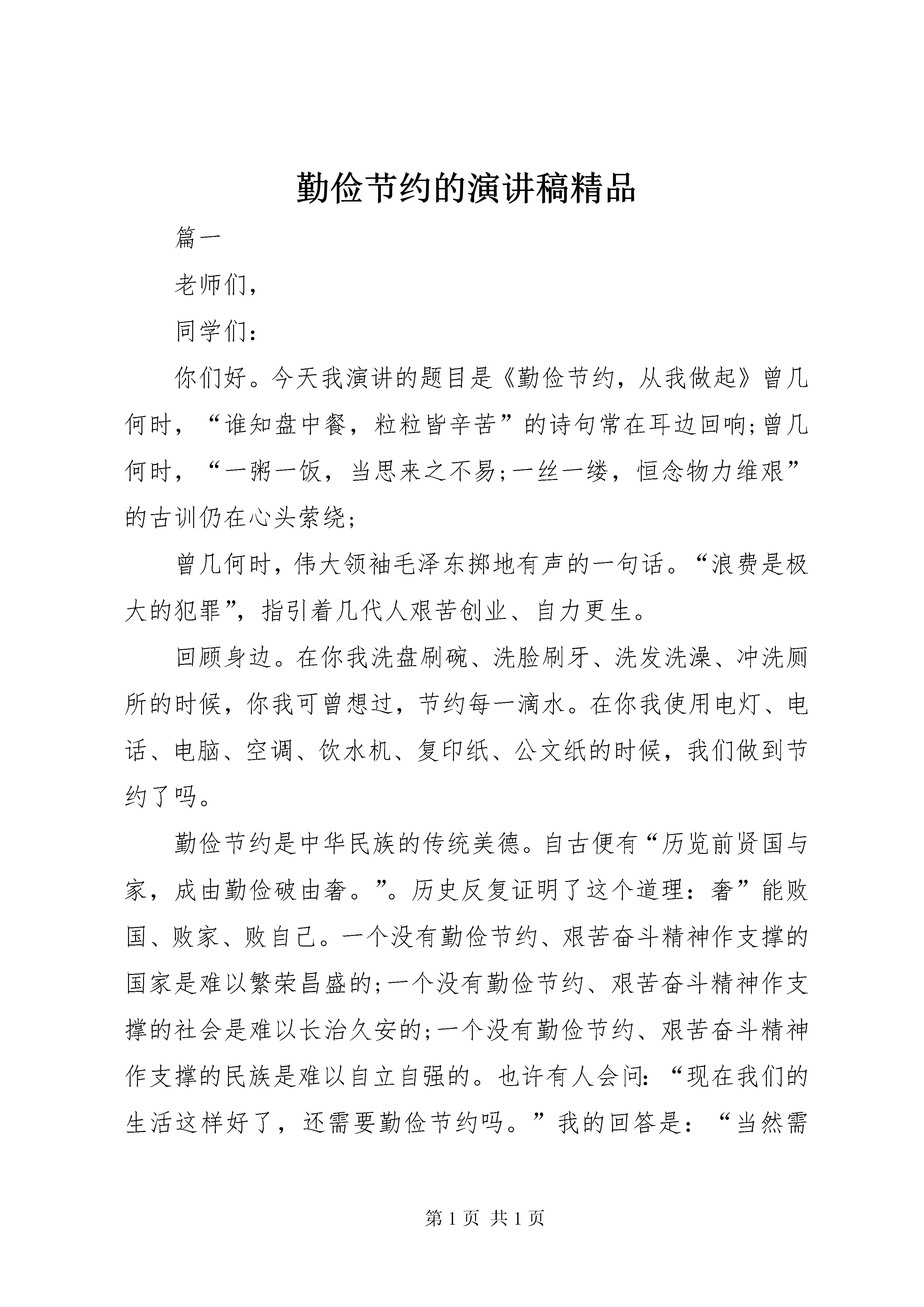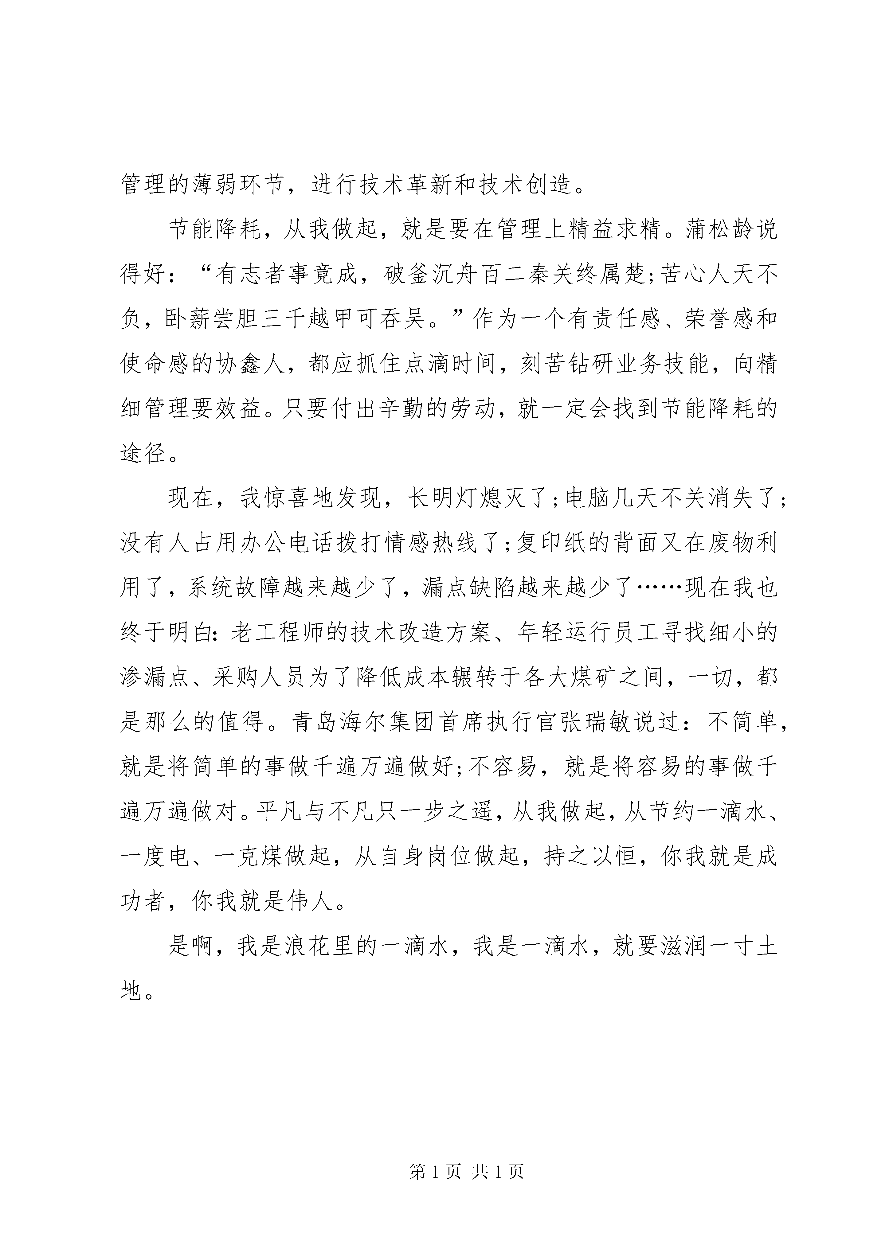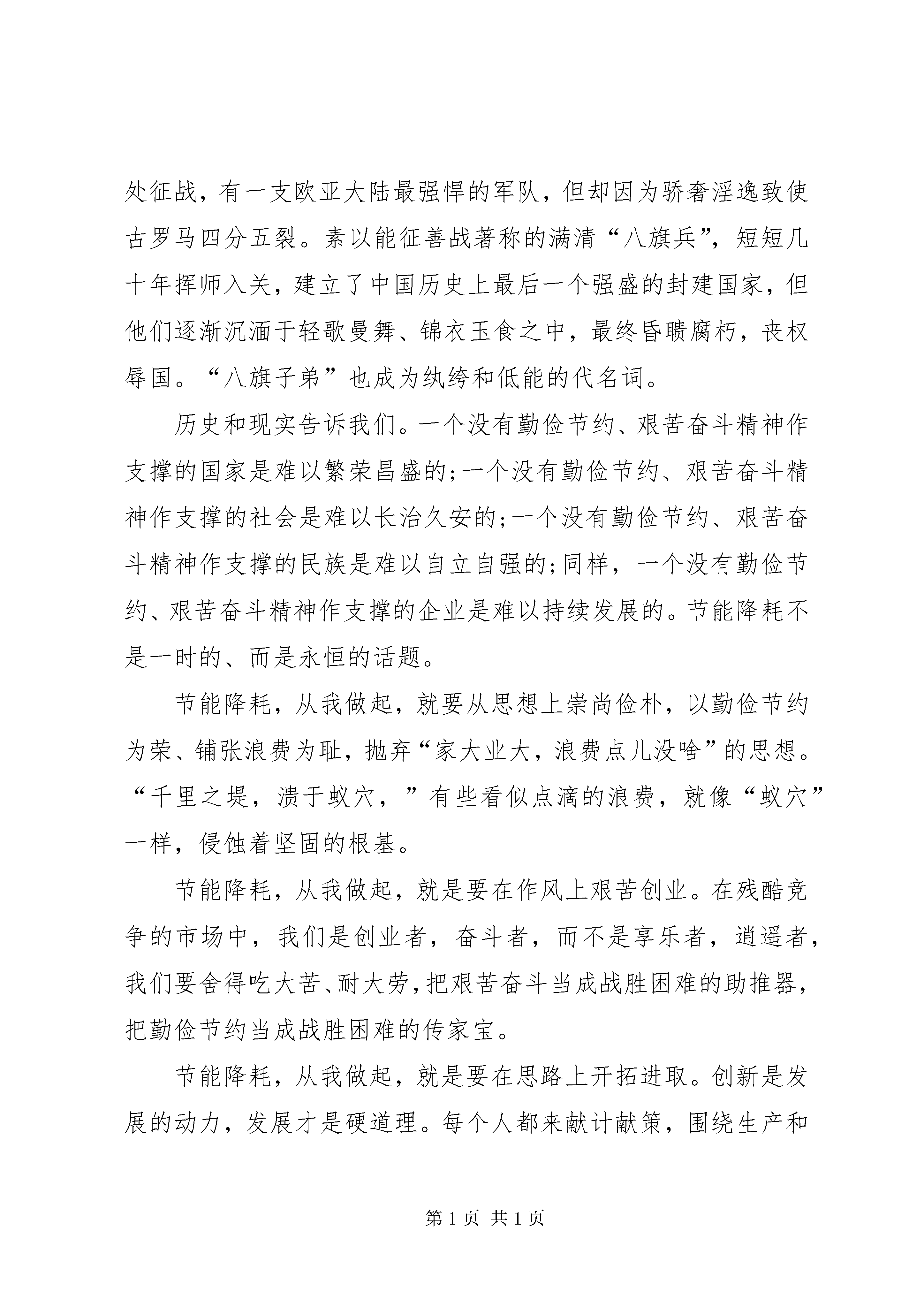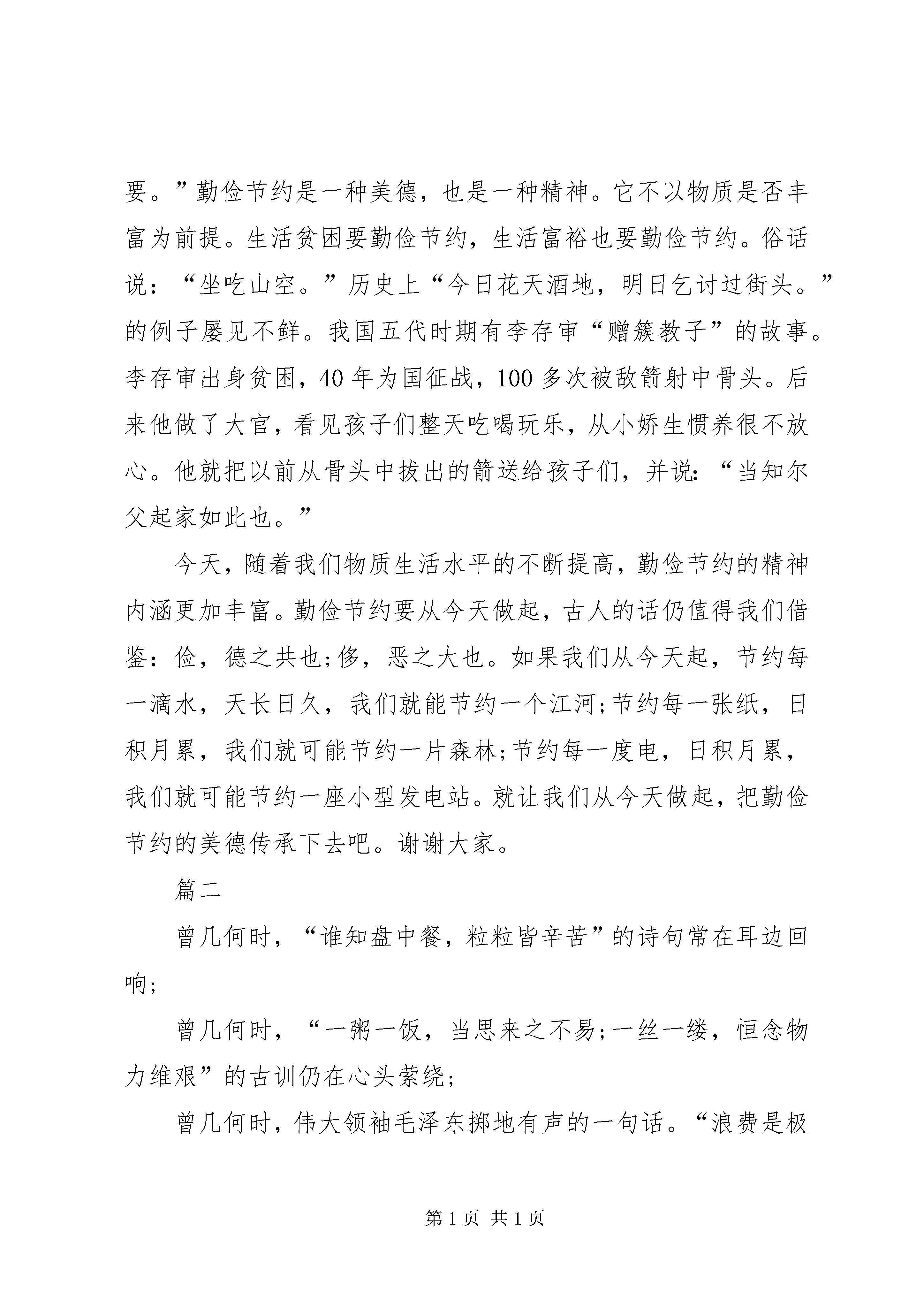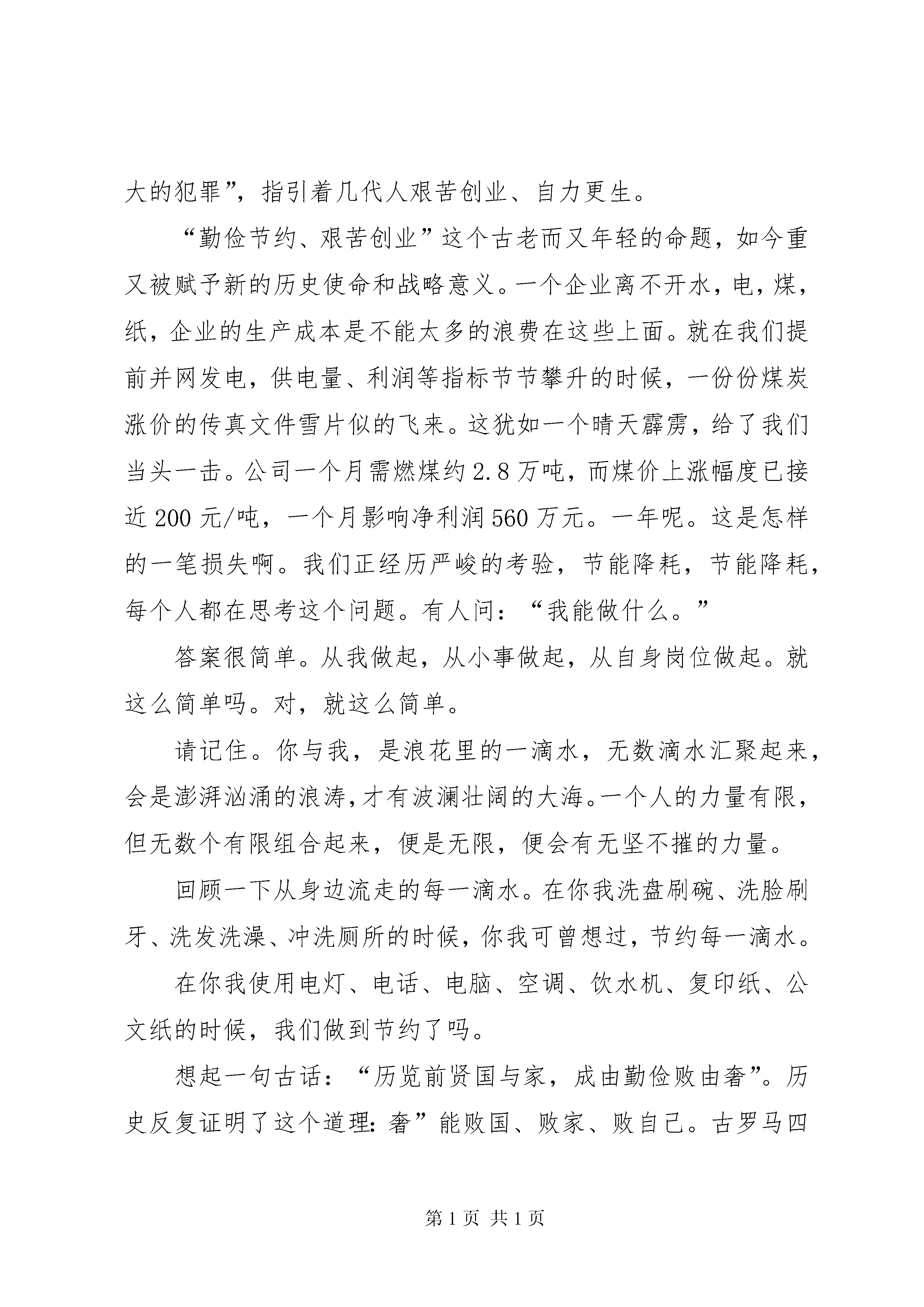 勤俭节约的演讲稿精品篇一老师们,同学们:你们好。今天我演讲的题目是《勤俭节约,从我做起》曾几何时,“谁知盘中餐,粒粒皆辛苦”的诗句常在耳边回响;曾几何时,“一粥一饭,当思来之不易;一丝一缕,恒念物力维艰”的古训仍在心头萦绕;曾几何时,伟大领袖毛泽东掷地有声的一句话。“浪费是极大的犯罪”,指引着几代人艰苦创业、自力更生。回顾身边。在你我洗盘刷碗、洗脸刷牙、洗发洗澡、冲洗厕所的时候,你我可曾想过,节约每一滴水。在你我使用电灯、电话、电脑、空调、饮水机、复印纸、公文纸的时候,我们做到节约了吗。勤俭节约是中华民族的传统美德。自古便有“历览前贤国与家,成由勤俭破由奢。”。历史反复证明了这个道理:奢”能败国、败家、败自己。一个没有勤俭节约、艰苦奋斗精神作支撑的国家是难以繁荣昌盛的;一个没有勤俭节约、艰苦奋斗精神作支撑的社会是难以长治久安的;一个没有勤俭节约、艰苦奋斗精神作支撑的民族是难以自立自强的。也许有人会问:“现在我们的生活这样好了,还需要勤俭节约吗。”我的回答是:“当然需要。”勤俭节约是一种美德,也是一种精神。它不以物质是否丰富为前提。生活贫困要勤俭节约,生活富裕也要勤俭节约。俗话说:“坐吃山空。”历史上“今日花天酒地,明日乞讨过街头。”的例子屡见不鲜。我国五代时期有李存审“赠簇教子”的故事。李存审出身贫困,40年为国征战,100多次被敌箭射中骨头。后来他做了大官,看见孩子们整天吃喝玩乐,从小娇生惯养很不放心。他就把以前从骨头中拔出的箭送给孩子们,并说:“当知尔父起家如此也。”今天,随着我们物质生活水平的不断提高,勤俭节约的精神内涵更加丰富。勤俭节约要从今天做起,古人的话仍值得我们借鉴:俭,德之共也;侈,恶之大也。如果我们从今天起,节约每一滴水,天长日久,我们就能节约一个江河;节约每一张纸,日积月累,我们就可能节约一片森林;节约每一度电,日积月累,我们就可能节约一座小型发电站。就让我们从今天做起,把勤俭节约的美德传承下去吧。谢谢大家。篇二曾几何时,“谁知盘中餐,粒粒皆辛苦”的诗句常在耳边回响;曾几何时,“一粥一饭,当思来之不易;一丝一缕,恒念物力维艰”的古训仍在心头萦绕;曾几何时,伟大领袖毛泽东掷地有声的一句话。“浪费是极大的犯罪”,指引着几代人艰苦创业、自力更生。“勤俭节约、艰苦创业”这个古老而又年轻的命题,如今重又被赋予新的历史使命和战略意义。一个企业离不开水,电,煤,纸,企业的生产成本是不能太多的浪费在这些上面。就在我们提前并网发电,供电量、利润等指标节节攀升的时候,一份份煤炭涨价的传真文件雪片似的飞来。这犹如一个晴天霹雳,给了我们当头一击。公司一个月需燃煤约2.8万吨,而煤价上涨幅度已接近200元/吨,一个月影响净利润560万元。一年呢。这是怎样的一笔损失啊。我们正经历严峻的考验,节能降耗,节能降耗,每个人都在思考这个问题。有人问:“我能做什么。”答案很简单。从我做起,从小事做起,从自身岗位做起。就这么简单吗。对,就这么简单。请记住。你与我,是浪花里的一滴水,无数滴水汇聚起来,会是澎湃汹涌的浪涛,才有波澜壮阔的大海。一个人的力量有限,但无数个有限组合起来,便是无限,便会有无坚不摧的力量。回顾一下从身边流走的每一滴水。在你我洗盘刷碗、洗脸刷牙、洗发洗澡、冲洗厕所的时候,你我可曾想过,节约每一滴水。在你我使用电灯、电话、电脑、空调、饮水机、复印纸、公文纸的时候,我们做到节约了吗。想起一句古话:“历览前贤国与家,成由勤俭败由奢”。历史反复证明了这个道理:奢”能败国、败家、败自己。古罗马四处征战,有一支欧亚大陆最强悍的军队,但却因为骄奢淫逸致使古罗马四分五裂。素以能征善战著称的满清“八旗兵”,短短几十年挥师入关,建立了中国历史上最后一个强盛的封建国家,但他们逐渐沉湎于轻歌曼舞、锦衣玉食之中,最终昏聩腐朽,丧权辱国。“八旗子弟”也成为纨绔和低能的代名词。历史和现实告诉我们。一个没有勤俭节约、艰苦奋斗精神作支撑的国家是难以繁荣昌盛的;一个没有勤俭节约、艰苦奋斗精神作支撑的社会是难以长治久安的;一个没有勤俭节约、艰苦奋斗精神作支撑的民族是难以自立自强的;同样,一个没有勤俭节约、艰苦奋斗精神作支撑的企业是难以持续发展的。节能降耗不是一时的、而是永恒的话题。节能降耗,从我做起,就要从思想上崇尚俭朴,以勤俭节约为荣、铺张浪费为耻,抛弃“家大业大,浪费点儿没啥”的思想。“千里之堤,溃于蚁穴,”有些看似点滴的浪费,就像“蚁穴”一样,侵蚀着坚固的根基。节能降耗,从我做起,就是要在作风上艰苦创业。在残酷竞争的市场中,我们是创业者,奋斗者,而不是享乐者,逍遥者,我们要舍得吃大苦、耐大劳,把艰苦奋斗当成战胜困难的助推器,把勤俭节约当成战胜困难的传家宝。节能降耗,从我做起,就是要在思路上开拓进取。创新是发展的动力,发展才是硬道理。每