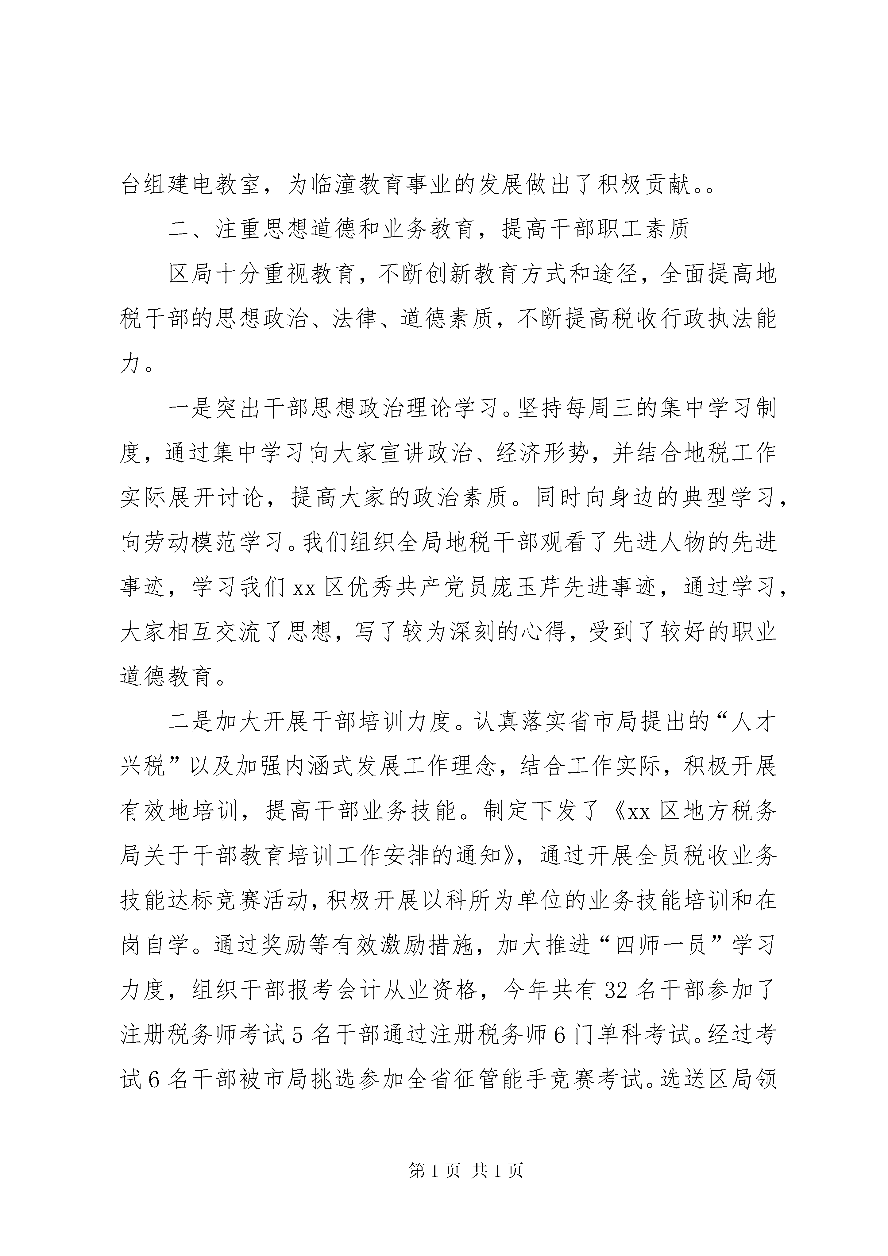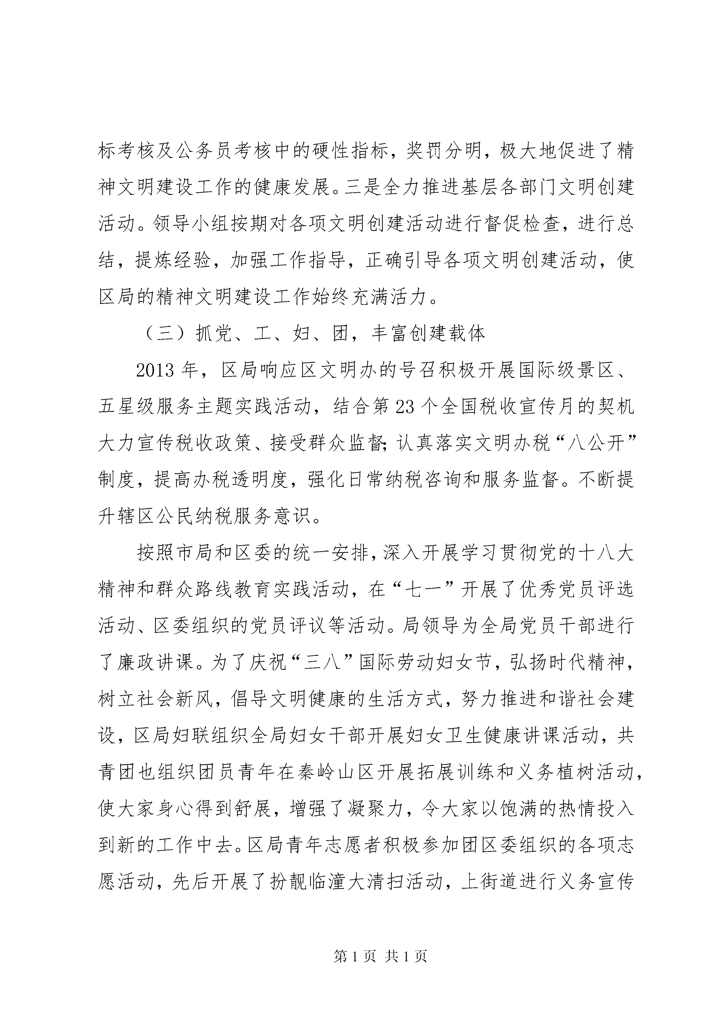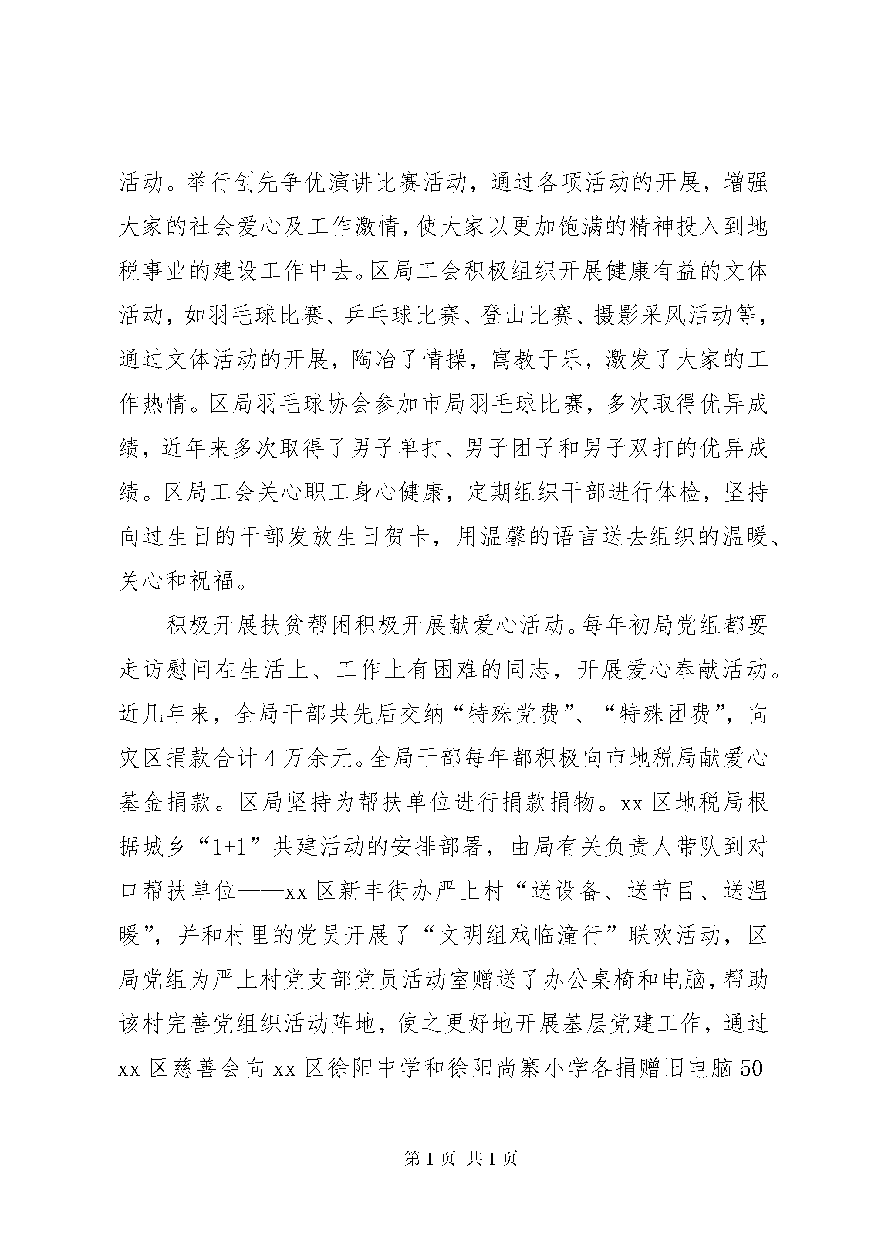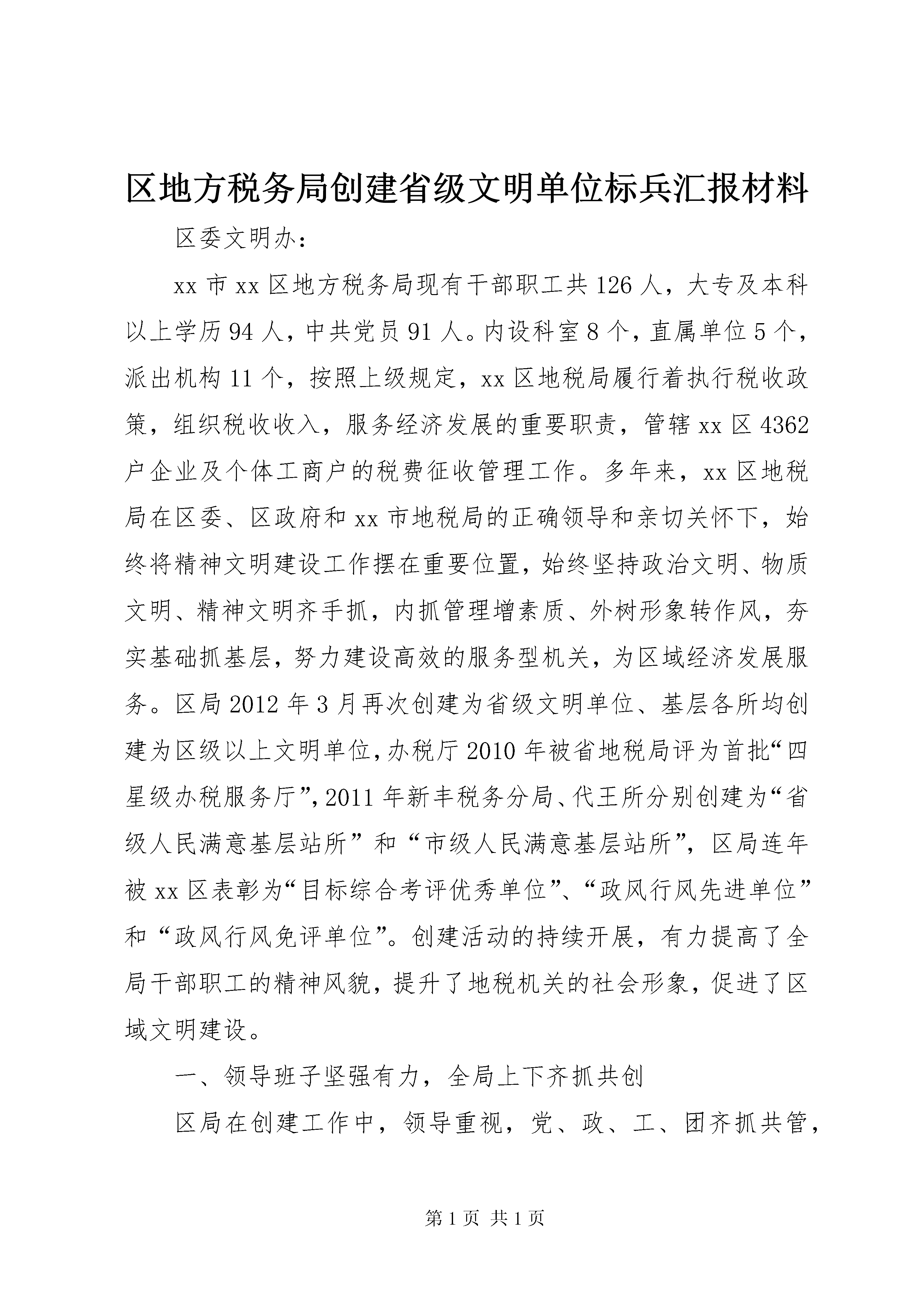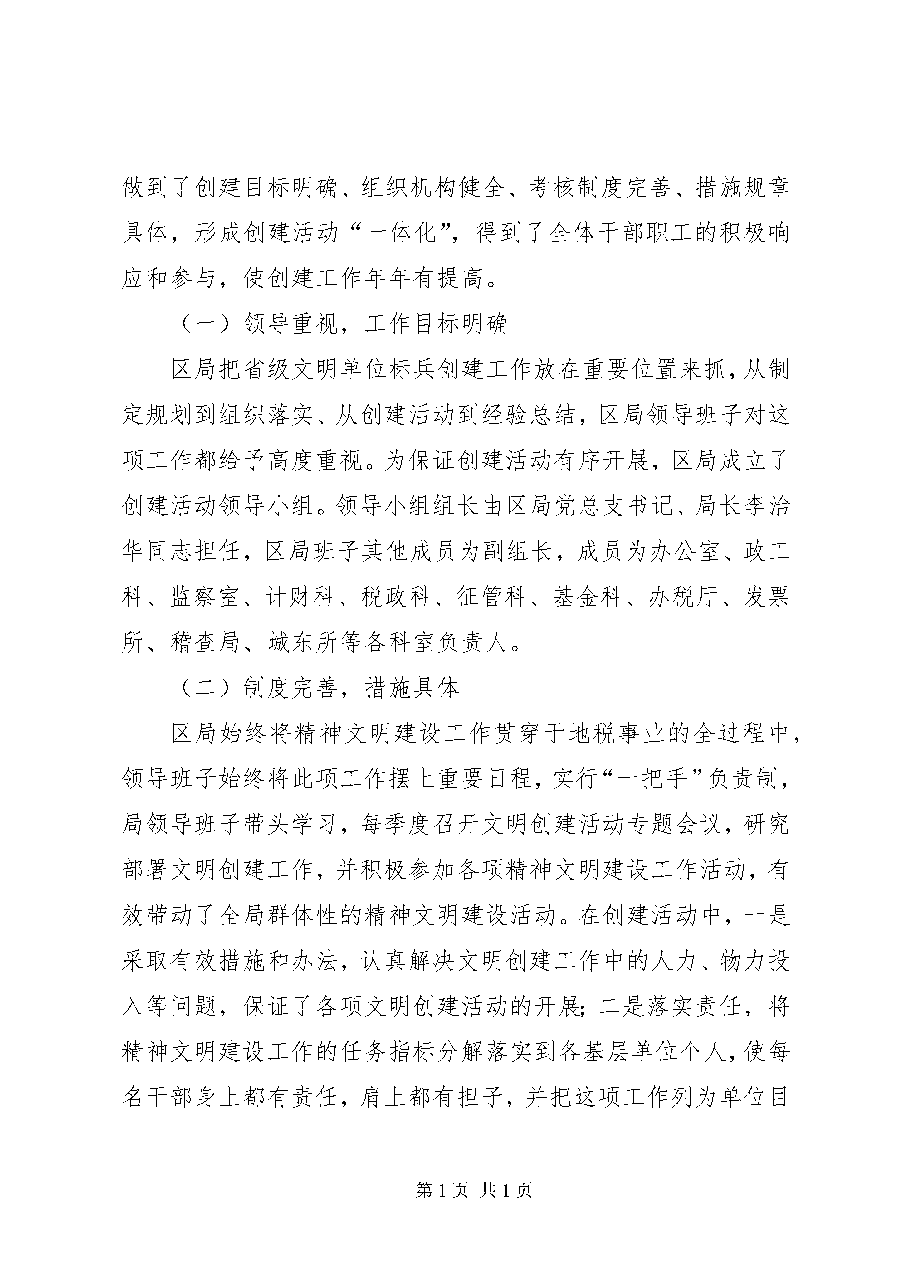 区地方税务局创建省级文明单位标兵汇报材料区委文明办:xx市xx区地方税务局现有干部职工共126人,大专及本科以上学历94人,中共党员91人。内设科室8个,直属单位5个,派出机构11个,按照上级规定,xx区地税局履行着执行税收政策,组织税收收入,服务经济发展的重要职责,管辖xx区4362户企业及个体工商户的税费征收管理工作。多年来,xx区地税局在区委、区政府和xx市地税局的正确领导和亲切关怀下,始终将精神文明建设工作摆在重要位置,始终坚持政治文明、物质文明、精神文明齐手抓,内抓管理增素质、外树形象转作风,夯实基础抓基层,努力建设高效的服务型机关,为区域经济发展服务。区局2012年3月再次创建为省级文明单位、基层各所均创建为区级以上文明单位,办税厅2010年被省地税局评为首批“四星级办税服务厅”,2011年新丰税务分局、代王所分别创建为“省级人民满意基层站所”和“市级人民满意基层站所”,区局连年被xx区表彰为“目标综合考评优秀单位”、“政风行风先进单位”和“政风行风免评单位”。创建活动的持续开展,有力提高了全局干部职工的精神风貌,提升了地税机关的社会形象,促进了区域文明建设。一、领导班子坚强有力,全局上下齐抓共创区局在创建工作中,领导重视,党、政、工、团齐抓共管,做到了创建目标明确、组织机构健全、考核制度完善、措施规章具体,形成创建活动“一体化”,得到了全体干部职工的积极响应和参与,使创建工作年年有提高。(一)领导重视,工作目标明确区局把省级文明单位标兵创建工作放在重要位置来抓,从制定规划到组织落实、从创建活动到经验总结,区局领导班子对这项工作都给予高度重视。为保证创建活动有序开展,区局成立了创建活动领导小组。领导小组组长由区局党总支书记、局长李治华同志担任,区局班子其他成员为副组长,成员为办公室、政工科、监察室、计财科、税政科、征管科、基金科、办税厅、发票所、稽查局、城东所等各科室负责人。(二)制度完善,措施具体区局始终将精神文明建设工作贯穿于地税事业的全过程中,领导班子始终将此项工作摆上重要日程,实行“一把手”负责制,局领导班子带头学习,每季度召开文明创建活动专题会议,研究部署文明创建工作,并积极参加各项精神文明建设工作活动,有效带动了全局群体性的精神文明建设活动。在创建活动中,一是采取有效措施和办法,认真解决文明创建工作中的人力、物力投入等问题,保证了各项文明创建活动的开展;二是落实责任,将精神文明建设工作的任务指标分解落实到各基层单位个人,使每名干部身上都有责任,肩上都有担子,并把这项工作列为单位目标考核及公务员考核中的硬性指标,奖罚分明,极大地促进了精神文明建设工作的健康发展。三是全力推进基层各部门文明创建活动。领导小组按期对各项文明创建活动进行督促检查,进行总结,提炼经验,加强工作指导,正确引导各项文明创建活动,使区局的精神文明建设工作始终充满活力。(三)抓党、工、妇、团,丰富创建载体2013年,区局响应区文明办的号召积极开展国际级景区、五星级服务主题实践活动,结合第23个全国税收宣传月的契机大力宣传税收政策、接受群众监督;认真落实文明办税“八公开”制度,提高办税透明度,强化日常纳税咨询和服务监督。不断提升辖区公民纳税服务意识。按照市局和区委的统一安排,深入开展学习贯彻党的十八大精神和群众路线教育实践活动,在“七一”开展了优秀党员评选活动、区委组织的党员评议等活动。局领导为全局党员干部进行了廉政讲课。为了庆祝“三八”国际劳动妇女节,弘扬时代精神,树立社会新风,倡导文明健康的生活方式,努力推进和谐社会建设,区局妇联组织全局妇女干部开展妇女卫生健康讲课活动,共青团也组织团员青年在秦岭山区开展拓展训练和义务植树活动,使大家身心得到舒展,增强了凝聚力,令大家以饱满的热情投入到新的工作中去。区局青年志愿者积极参加团区委组织的各项志愿活动,先后开展了扮靓临潼大清扫活动,上街道进行义务宣传活动。举行创先争优演讲比赛活动,通过各项活动的开展,增强大家的社会爱心及工作激情,使大家以更加饱满的精神投入到地税事业的建设工作中去。区局工会积极组织开展健康有益的文体活动,如羽毛球比赛、乒乓球比赛、登山比赛、摄影采风活动等,通过文体活动的开展,陶冶了情操,寓教于乐,激发了大家的工作热情。区局羽毛球协会参加市局羽毛球比赛,多次取得优异成绩,近年来多次取得了男子单打、男子团子和男子双打的优异成绩。区局工会关心职工身心健康,定期组织干部进行体检,坚持向过生日的干部发放生日贺卡,用温馨的语言送去组织的温暖、关心和祝福。积极开展扶贫帮困积极开展献爱心活动。每年初局党组都要走访慰问在生活上、工作上有困难的同志,开展爱心奉献活动。近几年来,全局干部共先后交纳“特殊党费”、“特殊团费”,向灾区捐款合计4万余元。全局干部每年都积极向市地税