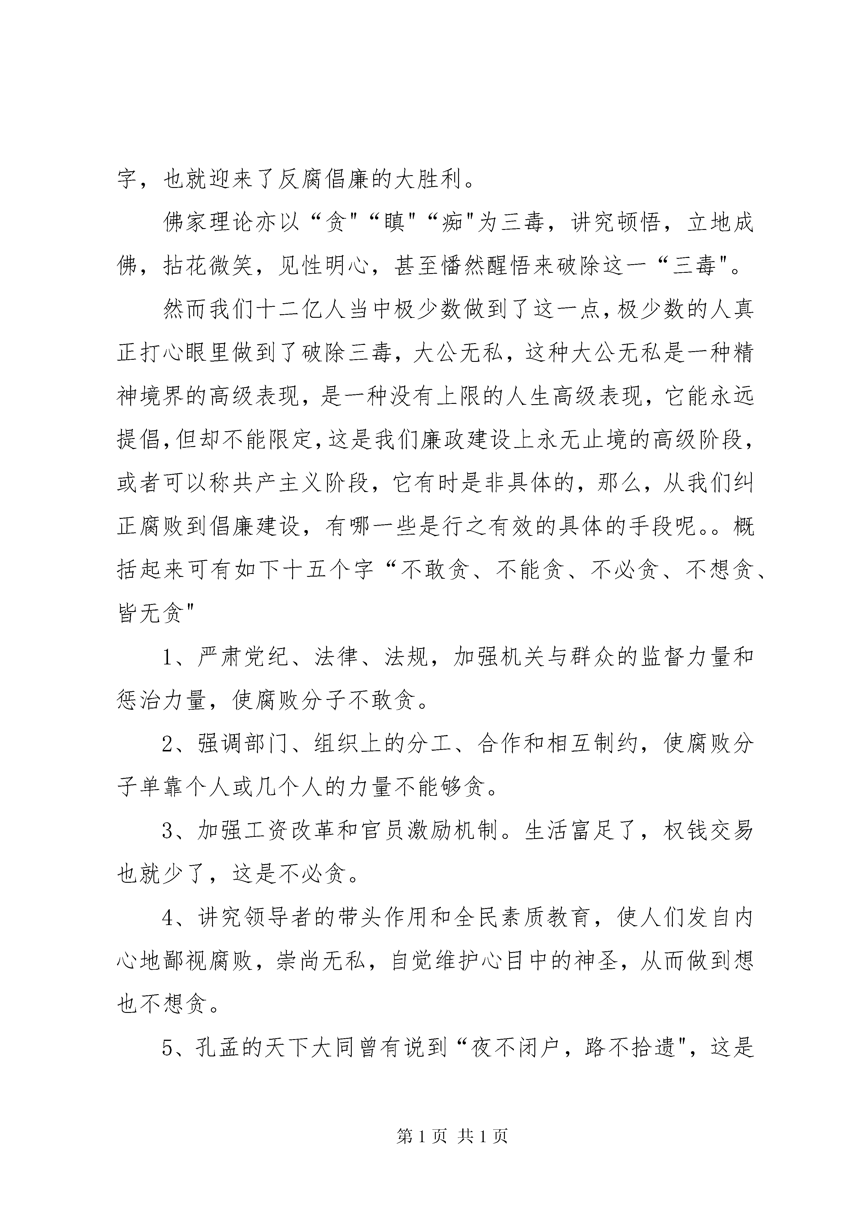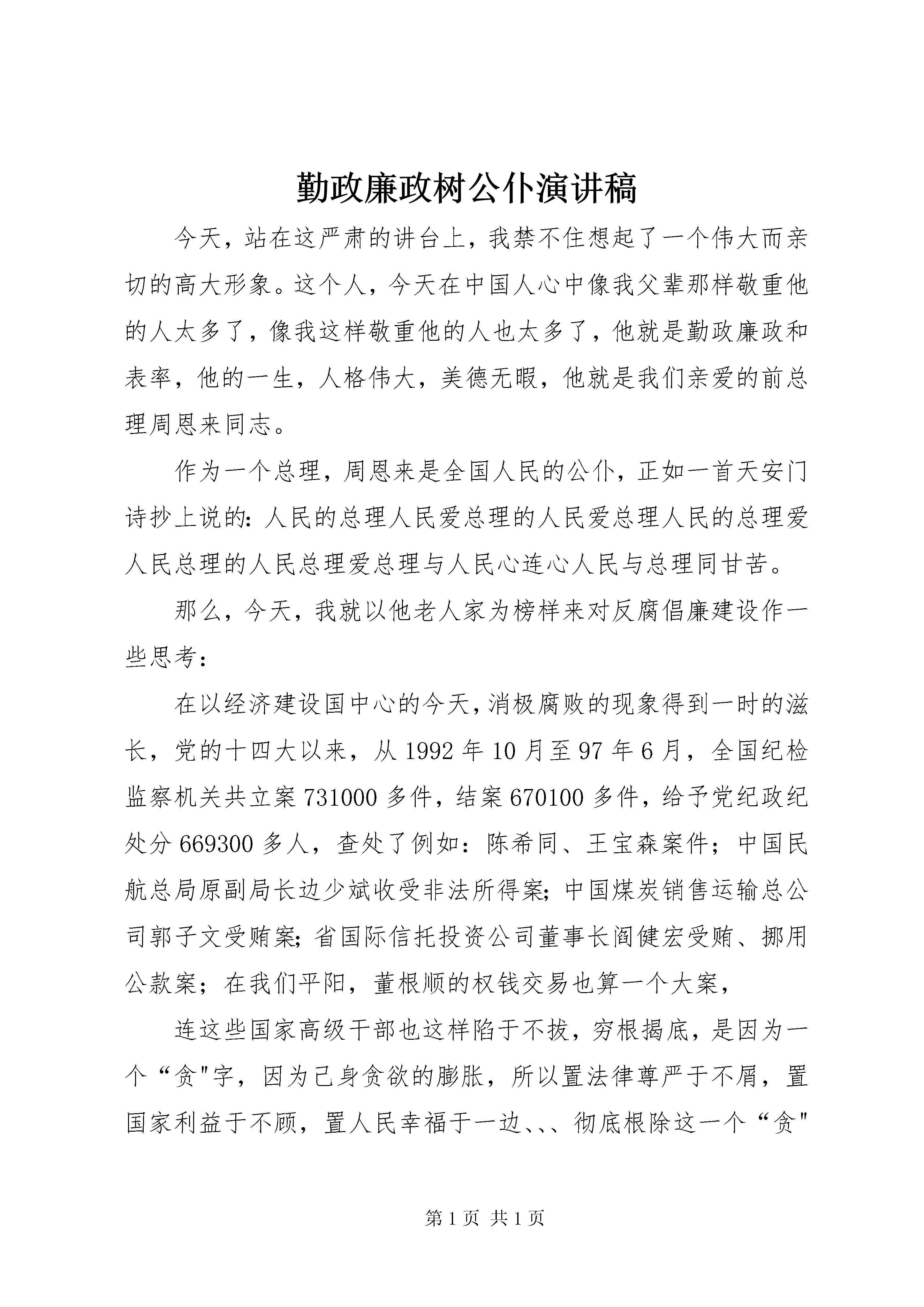 勤政廉政树公仆演讲稿今天,站在这严肃的讲台上,我禁不住想起了一个伟大而亲切的高大形象。这个人,今天在中国人心中像我父辈那样敬重他的人太多了,像我这样敬重他的人也太多了,他就是勤政廉政和表率,他的一生,人格伟大,美德无暇,他就是我们亲爱的前总理周恩来同志。作为一个总理,周恩来是全国人民的公仆,正如一首天安门诗抄上说的:人民的总理人民爱总理的人民爱总理人民的总理爱人民总理的人民总理爱总理与人民心连心人民与总理同甘苦。那么,今天,我就以他老人家为榜样来对反腐倡廉建设作一些思考:在以经济建设国中心的今天,消极腐败的现象得到一时的滋长,党的十四大以来,从1992年10月至97年6月,全国纪检监察机关共立案731000多件,结案670100多件,给予党纪政纪处分669300多人,查处了例如:陈希同、王宝森案件;中国民航总局原副局长边少斌收受非法所得案;中国煤炭销售运输总公司郭子文受贿案;省国际信托投资公司董事长阎健宏受贿、挪用公款案;在我们平阳,董根顺的权钱交易也算一个大案,连这些国家高级干部也这样陷于不拔,穷根揭底,是因为一个“贪"字,因为己身贪欲的膨胀,所以置法律尊严于不屑,置国家利益于不顾,置人民幸福于一边、、、彻底根除这一个“贪"字,也就迎来了反腐倡廉的大胜利。佛家理论亦以“贪"“瞋"“痴"为三毒,讲究顿悟,立地成佛,拈花微笑,见性明心,甚至憣然醒悟来破除这一“三毒"。然而我们十二亿人当中极少数做到了这一点,极少数的人真正打心眼里做到了破除三毒,大公无私,这种大公无私是一种精神境界的高级表现,是一种没有上限的人生高级表现,它能永远提倡,但却不能限定,这是我们廉政建设上永无止境的高级阶段,或者可以称共产主义阶段,它有时是非具体的,那么,从我们纠正腐败到倡廉建设,有哪一些是行之有效的具体的手段呢。。概括起来可有如下十五个字“不敢贪、不能贪、不必贪、不想贪、皆无贪"1、严肃党纪、法律、法规,加强机关与群众的监督力量和惩治力量,使腐败分子不敢贪。2、强调部门、组织上的分工、合作和相互制约,使腐败分子单靠个人或几个人的力量不能够贪。3、加强工资改革和官员激励机制。生活富足了,权钱交易也就少了,这是不必贪。4、讲究领导者的带头作用和全民素质教育,使人们发自内心地鄙视腐败,崇尚无私,自觉维护心目中的神圣,从而做到想也不想贪。5、孔孟的天下大同曾有说到“夜不闭户,路不拾遗",这是一个理想的模型,却正是反腐倡廉的最高境界。我们敬爱的周总理以他的一生树立了一个“廉洁奉公"的新形象,以他的一生给了我们许多警示,展示了一种高级境界的酒脱。十二亿人民是一家,同志们,从现在做起,向榜样学习,神州大地于是心雷轰鸣:这就是皆无贪。