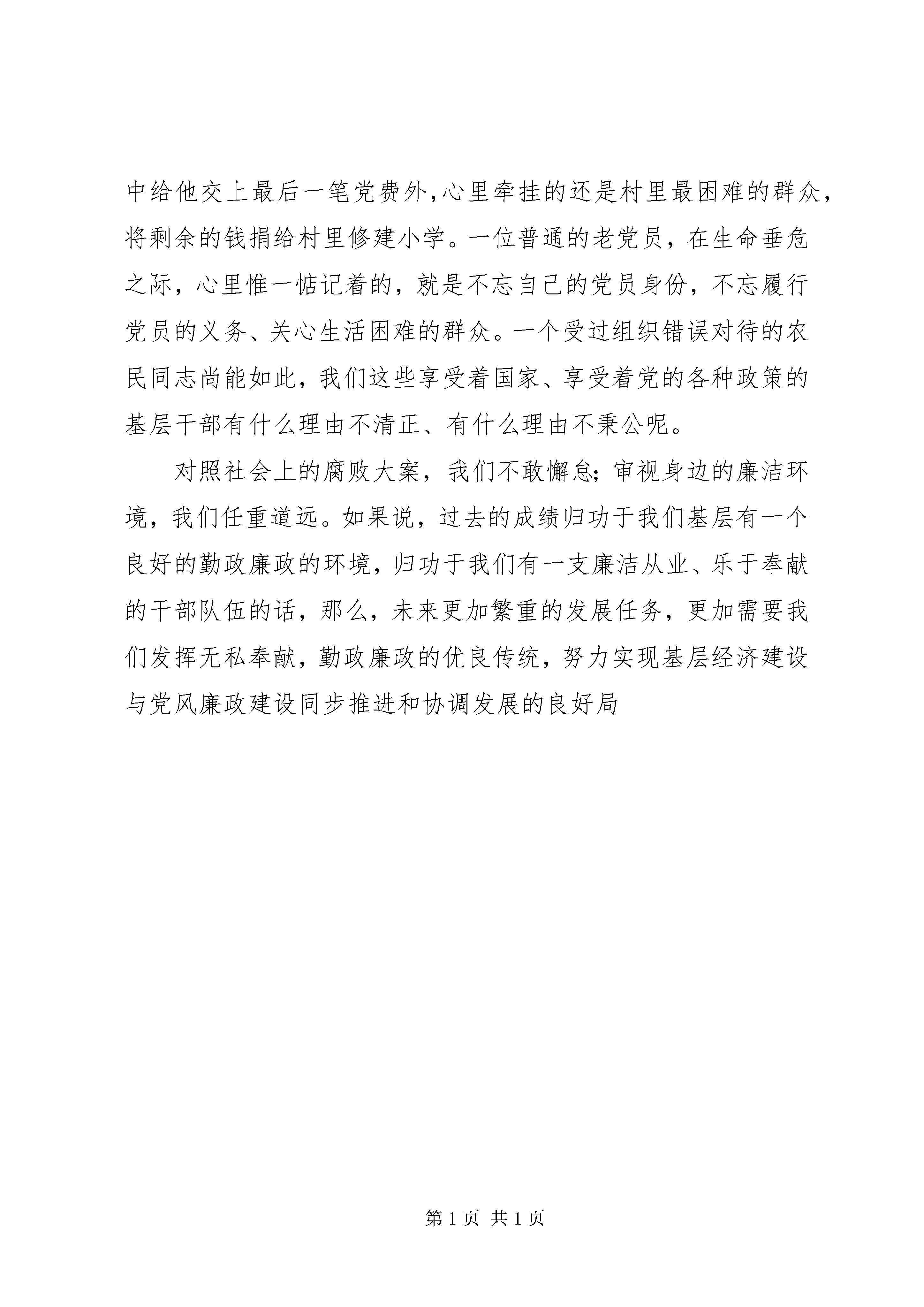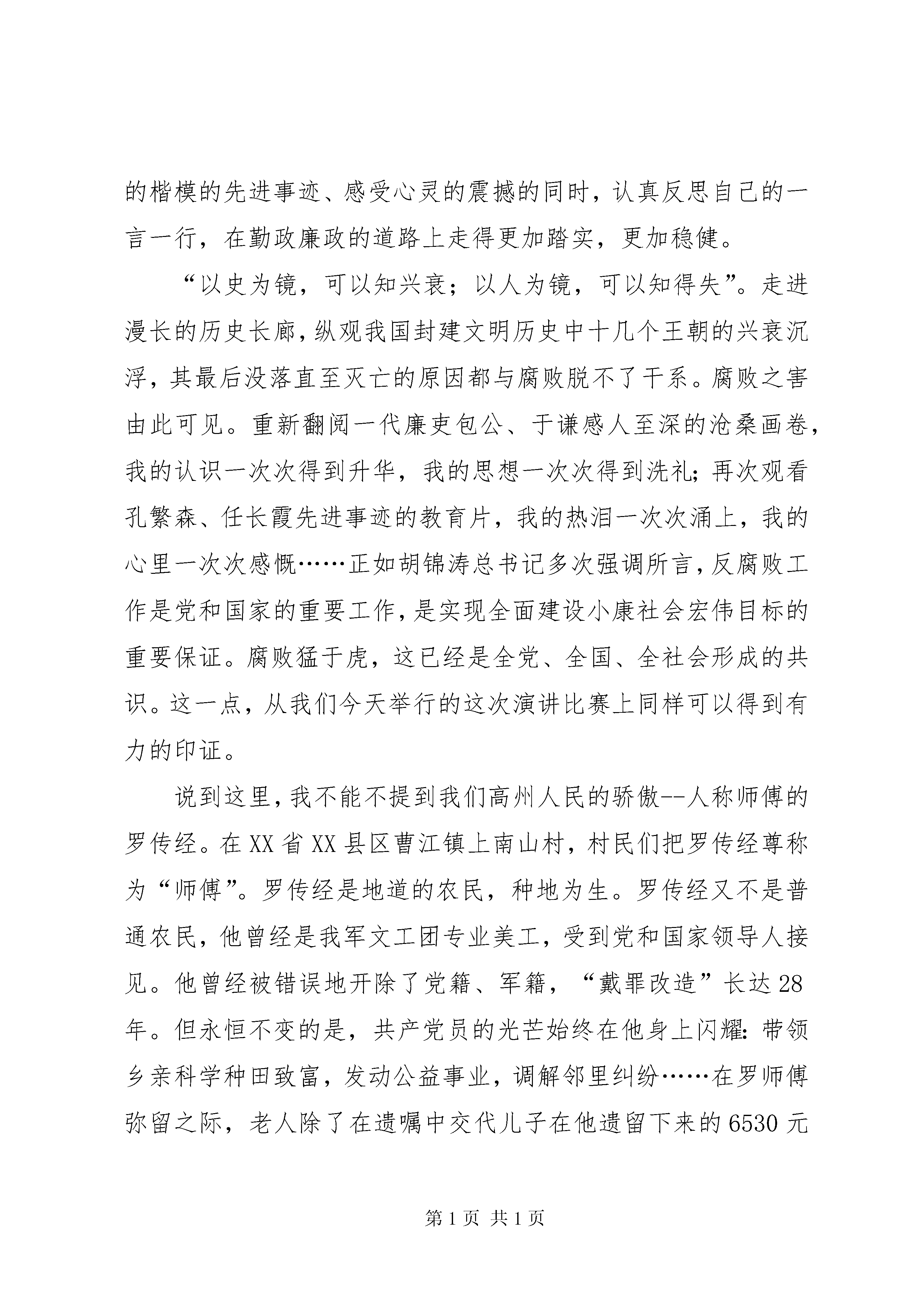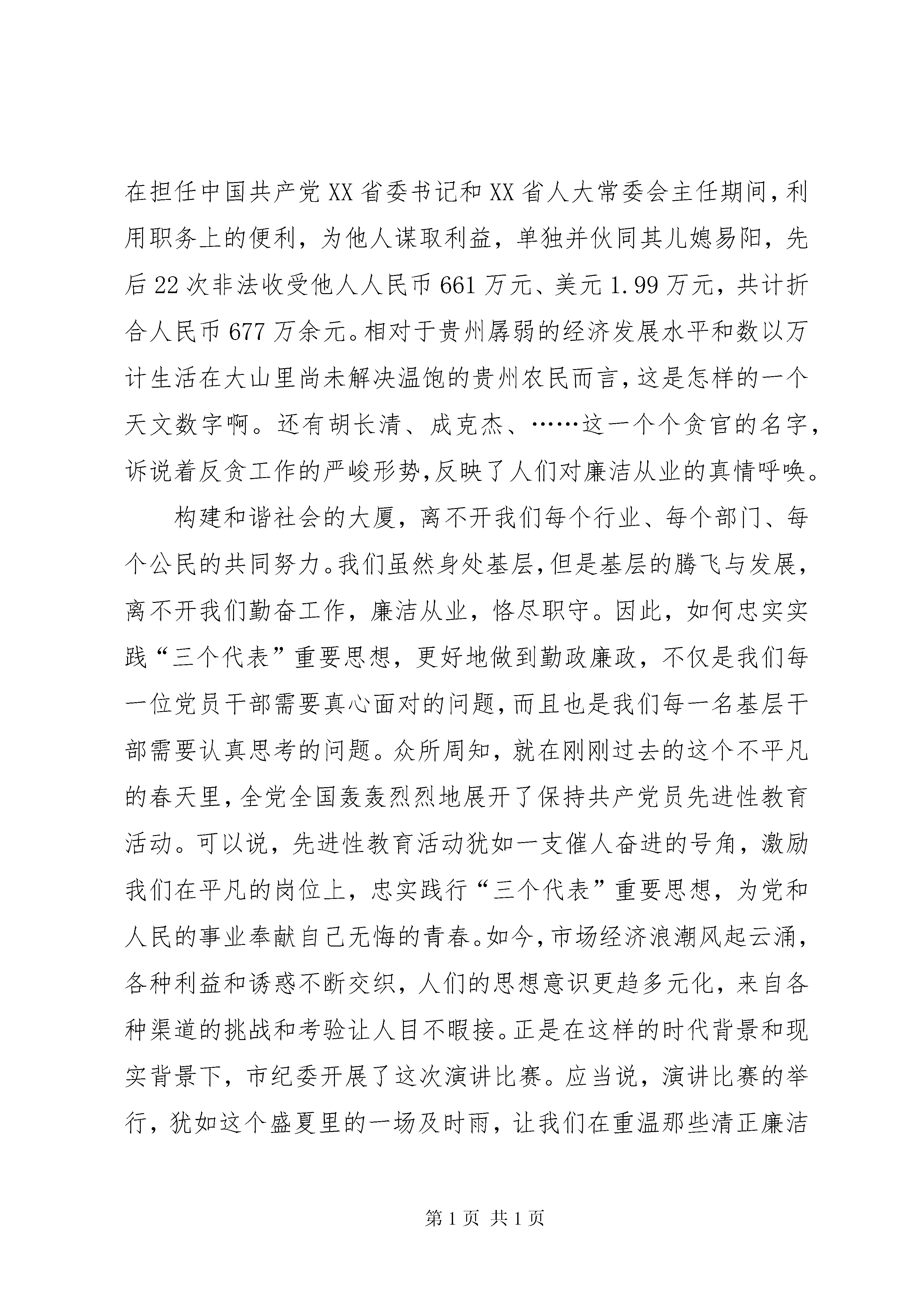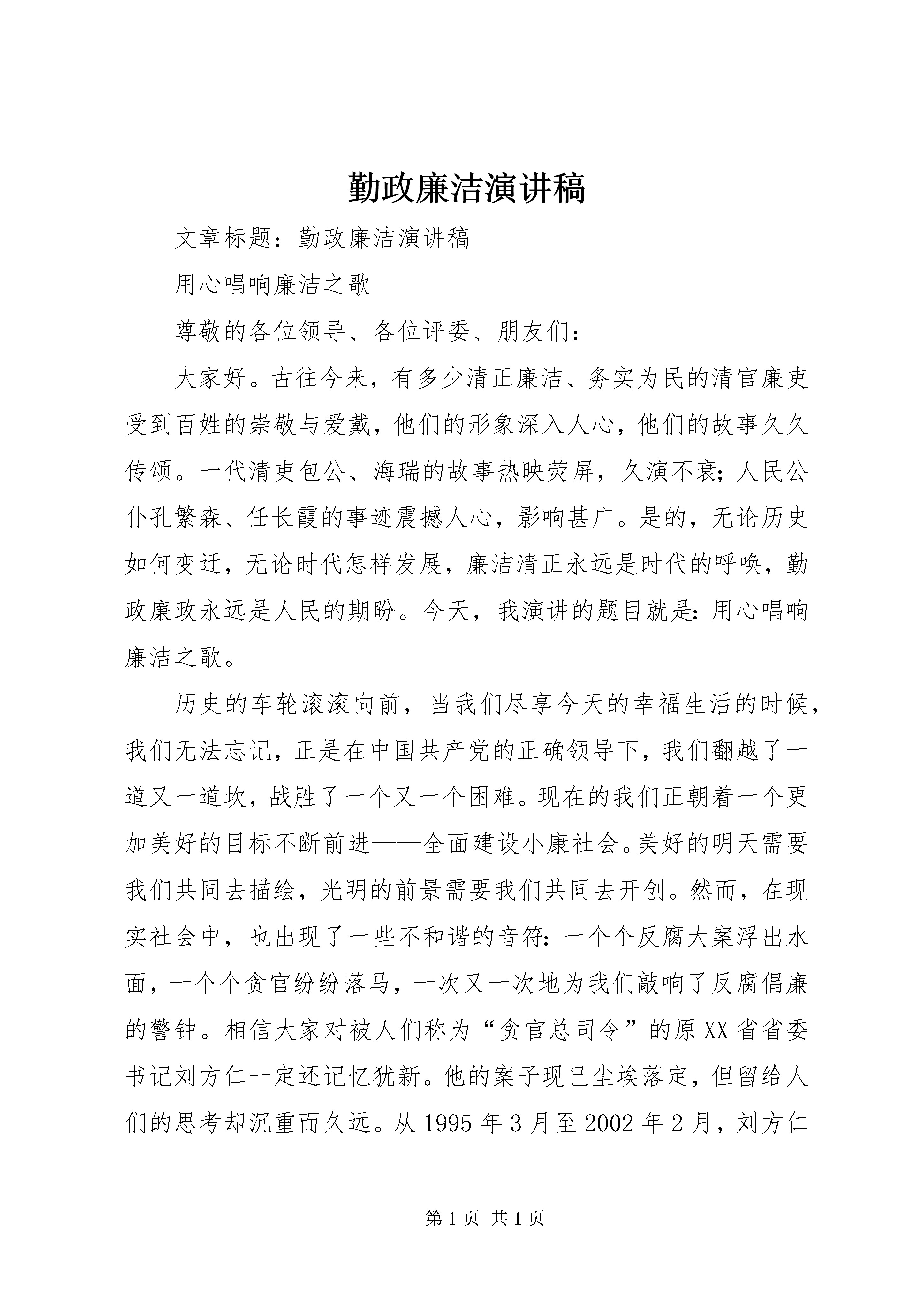 勤政廉洁演讲稿文章标题:勤政廉洁演讲稿用心唱响廉洁之歌尊敬的各位领导、各位评委、朋友们:大家好。古往今来,有多少清正廉洁、务实为民的清官廉吏受到百姓的崇敬与爱戴,他们的形象深入人心,他们的故事久久传颂。一代清吏包公、海瑞的故事热映荧屏,久演不衰;人民公仆孔繁森、任长霞的事迹震撼人心,影响甚广。是的,无论历史如何变迁,无论时代怎样发展,廉洁清正永远是时代的呼唤,勤政廉政永远是人民的期盼。今天,我演讲的题目就是:用心唱响廉洁之歌。历史的车轮滚滚向前,当我们尽享今天的幸福生活的时候,我们无法忘记,正是在中国共产党的正确领导下,我们翻越了一道又一道坎,战胜了一个又一个困难。现在的我们正朝着一个更加美好的目标不断前进——全面建设小康社会。美好的明天需要我们共同去描绘,光明的前景需要我们共同去开创。然而,在现实社会中,也出现了一些不和谐的音符:一个个反腐大案浮出水面,一个个贪官纷纷落马,一次又一次地为我们敲响了反腐倡廉的警钟。相信大家对被人们称为“贪官总司令”的原XX省省委书记刘方仁一定还记忆犹新。他的案子现已尘埃落定,但留给人们的思考却沉重而久远。从1995年3月至2002年2月,刘方仁在担任中国共产党XX省委书记和XX省人大常委会主任期间,利用职务上的便利,为他人谋取利益,单独并伙同其儿媳易阳,先后22次非法收受他人人民币661万元、美元1.99万元,共计折合人民币677万余元。相对于贵州孱弱的经济发展水平和数以万计生活在大山里尚未解决温饱的贵州农民而言,这是怎样的一个天文数字啊。还有胡长清、成克杰、……这一个个贪官的名字,诉说着反贪工作的严峻形势,反映了人们对廉洁从业的真情呼唤。构建和谐社会的大厦,离不开我们每个行业、每个部门、每个公民的共同努力。我们虽然身处基层,但是基层的腾飞与发展,离不开我们勤奋工作,廉洁从业,恪尽职守。因此,如何忠实实践“三个代表”重要思想,更好地做到勤政廉政,不仅是我们每一位党员干部需要真心面对的问题,而且也是我们每一名基层干部需要认真思考的问题。众所周知,就在刚刚过去的这个不平凡的春天里,全党全国轰轰烈烈地展开了保持共产党员先进性教育活动。可以说,先进性教育活动犹如一支催人奋进的号角,激励我们在平凡的岗位上,忠实践行“三个代表”重要思想,为党和人民的事业奉献自己无悔的青春。如今,市场经济浪潮风起云涌,各种利益和诱惑不断交织,人们的思想意识更趋多元化,来自各种渠道的挑战和考验让人目不暇接。正是在这样的时代背景和现实背景下,市纪委开展了这次演讲比赛。应当说,演讲比赛的举行,犹如这个盛夏里的一场及时雨,让我们在重温那些清正廉洁的楷模的先进事迹、感受心灵的震撼的同时,认真反思自己的一言一行,在勤政廉政的道路上走得更加踏实,更加稳健。“以史为镜,可以知兴衰;以人为镜,可以知得失”。走进漫长的历史长廊,纵观我国封建文明历史中十几个王朝的兴衰沉浮,其最后没落直至灭亡的原因都与腐败脱不了干系。腐败之害由此可见。重新翻阅一代廉吏包公、于谦感人至深的沧桑画卷,我的认识一次次得到升华,我的思想一次次得到洗礼;再次观看孔繁森、任长霞先进事迹的教育片,我的热泪一次次涌上,我的心里一次次感慨……正如胡锦涛总书记多次强调所言,反腐败工作是党和国家的重要工作,是实现全面建设小康社会宏伟目标的重要保证。腐败猛于虎,这已经是全党、全国、全社会形成的共识。这一点,从我们今天举行的这次演讲比赛上同样可以得到有力的印证。说到这里,我不能不提到我们高州人民的骄傲--人称师傅的罗传经。在XX省XX县区曹江镇上南山村,村民们把罗传经尊称为“师傅”。罗传经是地道的农民,种地为生。罗传经又不是普通农民,他曾经是我军文工团专业美工,受到党和国家领导人接见。他曾经被错误地开除了党籍、军籍,“戴罪改造”长达28年。但永恒不变的是,共产党员的光芒始终在他身上闪耀:带领乡亲科学种田致富,发动公益事业,调解邻里纠纷……在罗师傅弥留之际,老人除了在遗嘱中交代儿子在他遗留下来的6530元中给他交上最后一笔党费外,心里牵挂的还是村里最困难的群众,将剩余的钱捐给村里修建小学。一位普通的老党员,在生命垂危之际,心里惟一惦记着的,就是不忘自己的党员身份,不忘履行党员的义务、关心生活困难的群众。一个受过组织错误对待的农民同志尚能如此,我们这些享受着国家、享受着党的各种政策的基层干部有什么理由不清正、有什么理由不秉公呢。对照社会上的腐败大案,我们不敢懈怠;审视身边的廉洁环境,我们任重道远。如果说,过去的成绩归功于我们基层有一个良好的勤政廉政的环境,归功于我们有一支廉洁从业、乐于奉献的干部队伍的话,那么,未来更加繁重的发展任务,更加需要我们发挥无私奉献,勤政廉政的优良传统,努力实现基层经济建设与党风廉政建设同步推进和协调发展的良好局