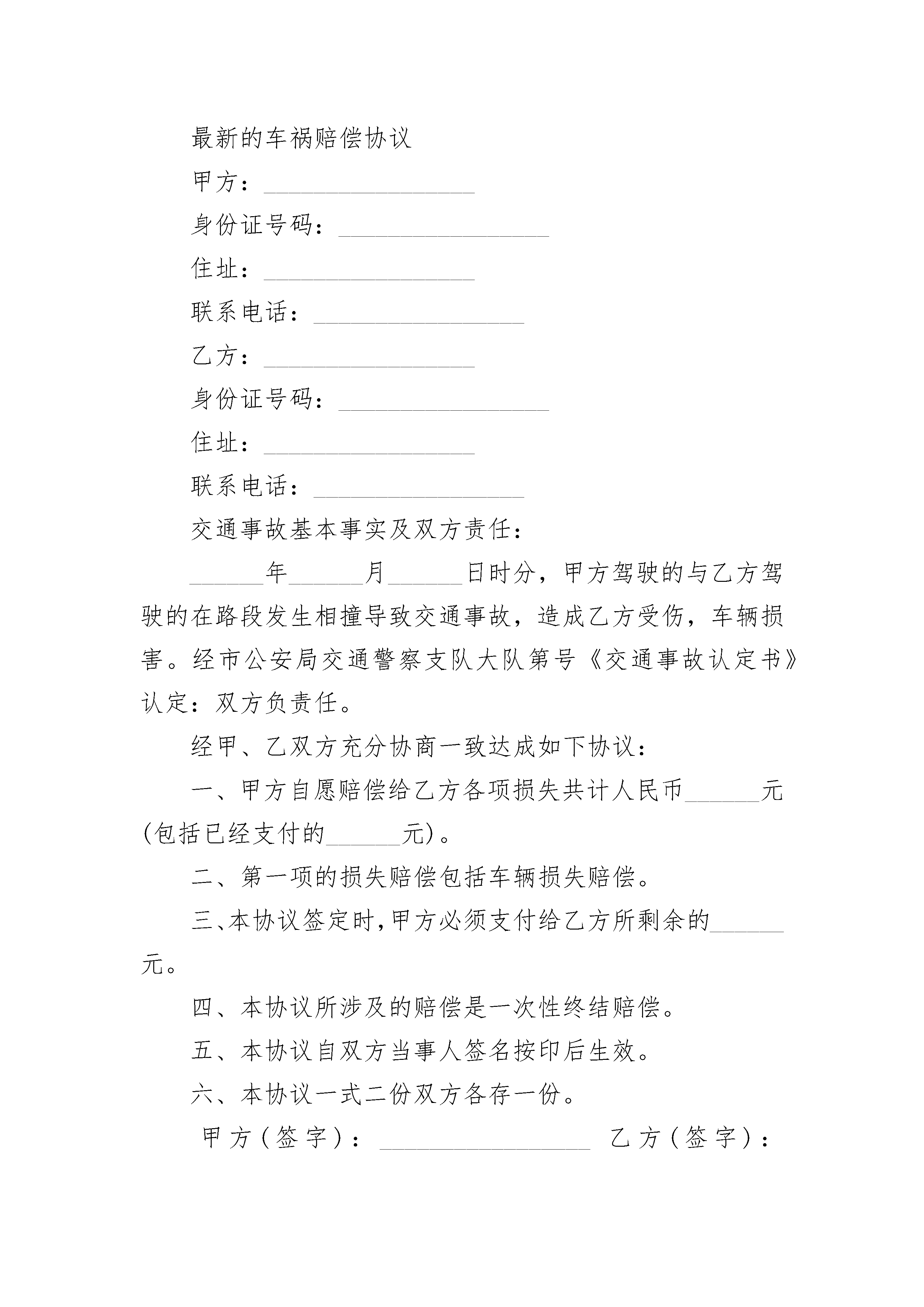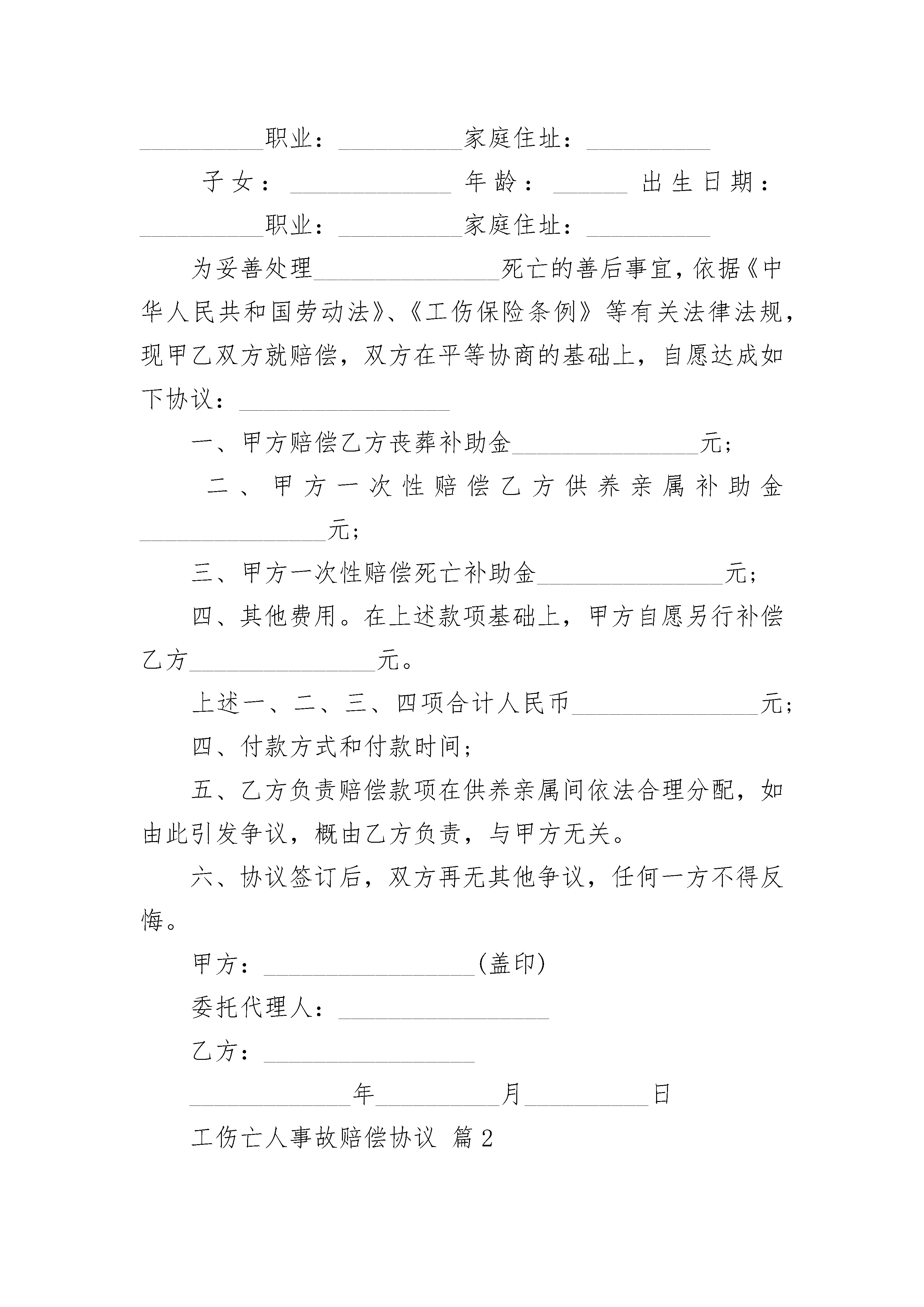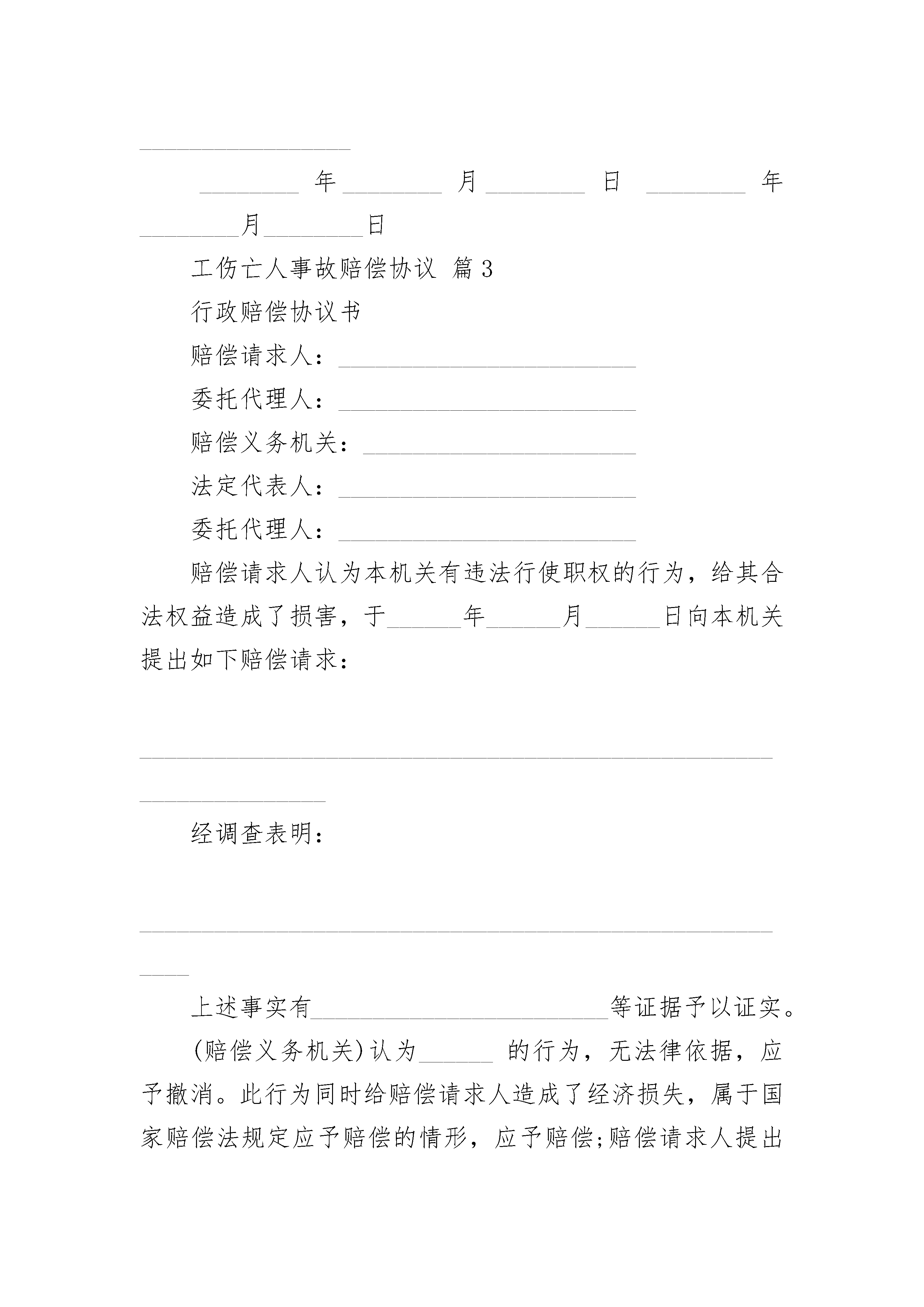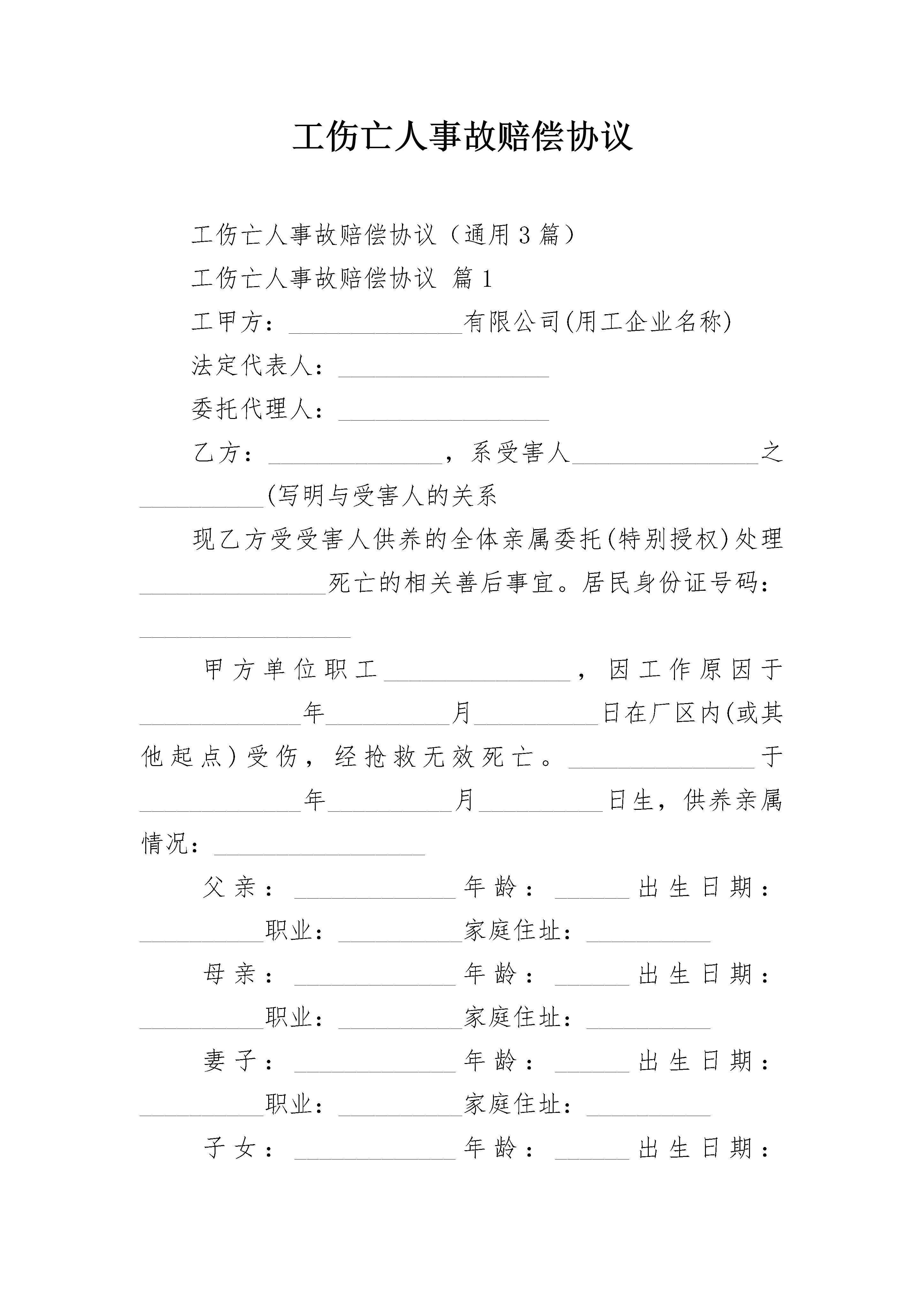 工伤亡人事故赔偿协议工伤亡人事故赔偿协议(通用3篇)工伤亡人事故赔偿协议篇1工甲方:______________有限公司(用工企业名称)法定代表人:_________________委托代理人:_________________乙方:______________,系受害人_______________之__________(写明与受害人的关系现乙方受受害人供养的全体亲属委托(特别授权)处理_______________死亡的相关善后事宜。居民身份证号码:_________________甲方单位职工_______________,因工作原因于_____________年__________月__________日在厂区内(或其他起点)受伤,经抢救无效死亡。_______________于_____________年__________月__________日生,供养亲属情况:_________________父亲:_____________年龄:______出生日期:__________职业:__________家庭住址:__________母亲:_____________年龄:______出生日期:__________职业:__________家庭住址:__________妻子:_____________年龄:______出生日期:__________职业:__________家庭住址:__________子女:_____________年龄:______出生日期:__________职业:__________家庭住址:__________子女:_____________年龄:______出生日期:__________职业:__________家庭住址:__________为妥善处理_______________死亡的善后事宜,依据《中华人民共和国劳动法》、《工伤保险条例》等有关法律法规,现甲乙双方就赔偿,双方在平等协商的基础上,自愿达成如下协议:_________________一、甲方赔偿乙方丧葬补助金_______________元;二、甲方一次性赔偿乙方供养亲属补助金_______________元;三、甲方一次性赔偿死亡补助金_______________元;四、其他费用。在上述款项基础上,甲方自愿另行补偿乙方_______________元。上述一、二、三、四项合计人民币_______________元;四、付款方式和付款时间;五、乙方负责赔偿款项在供养亲属间依法合理分配,如由此引发争议,概由乙方负责,与甲方无关。六、协议签订后,双方再无其他争议,任何一方不得反悔。甲方:_________________(盖印)委托代理人:_________________乙方:______________________________年__________月__________日工伤亡人事故赔偿协议篇2最新的车祸赔偿协议甲方:_________________身份证号码:_________________住址:_________________联系电话:_________________乙方:_________________身份证号码:_________________住址:_________________联系电话:_________________交通事故基本事实及双方责任:______年______月______日时分,甲方驾驶的与乙方驾驶的在路段发生相撞导致交通事故,造成乙方受伤,车辆损害。经市公安局交通警察支队大队第号《交通事故认定书》认定:双方负责任。经甲、乙双方充分协商一致达成如下协议:一、甲方自愿赔偿给乙方各项损失共计人民币______元(包括已经支付的______元)。二、第一项的损失赔偿包括车辆损失赔偿。三、本协议签定时,甲方必须支付给乙方所剩余的______元。四、本协议所涉及的赔偿是一次性终结赔偿。五、本协议自双方当事人签名按印后生效。六、本协议一式二份双方各存一份。甲方(签字):_________________乙方(签字):_________________________年________月________日________年________月________日工伤亡人事故赔偿协议篇3行政赔偿协议书赔偿请求人:________________________委托代理人:________________________赔偿义务机关:______________________法定代表人:________________________委托代理人:________________________赔偿请求人认为本机关有违法行使职权的行为,给其合法权益造成了损害,于______年______月__