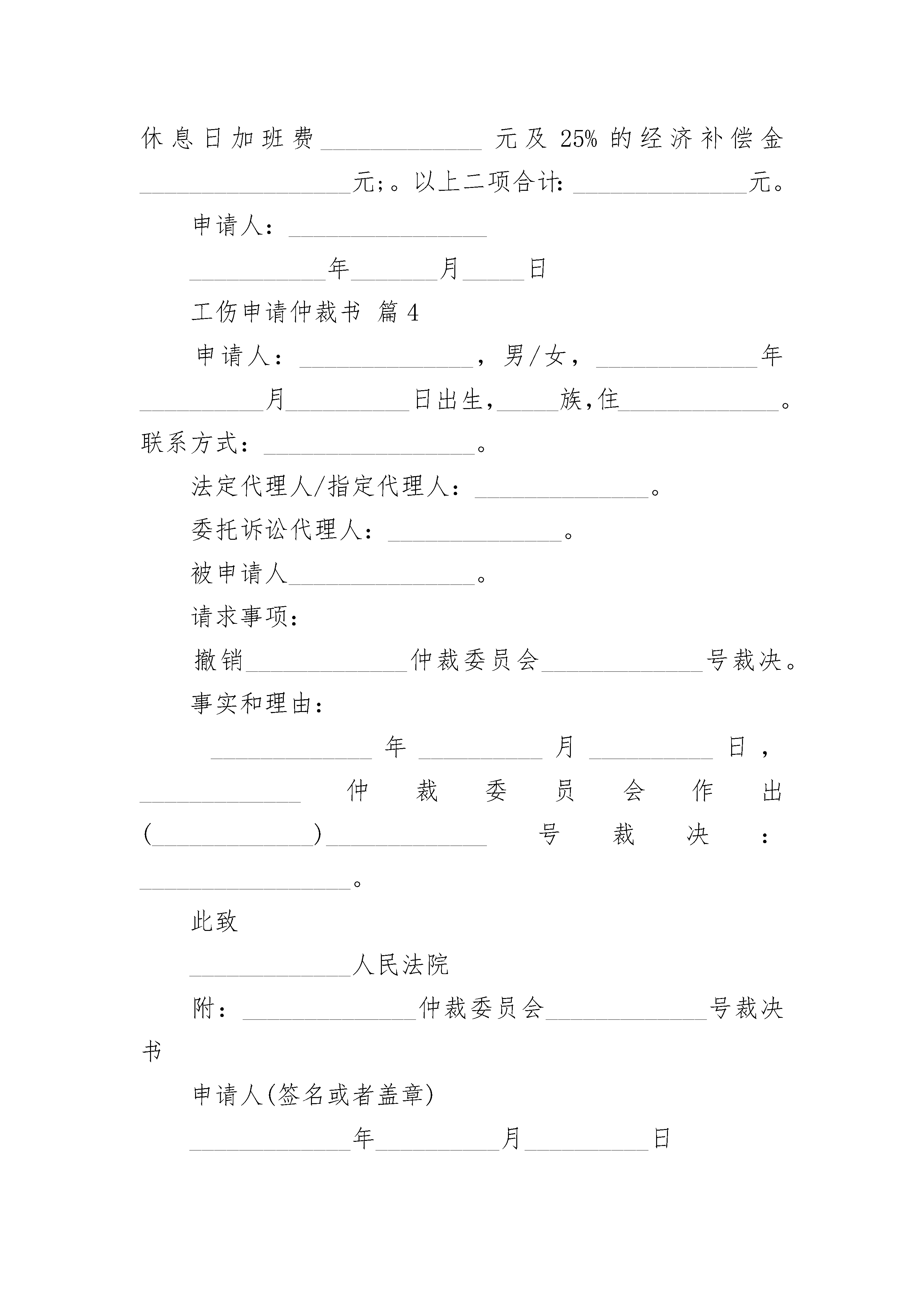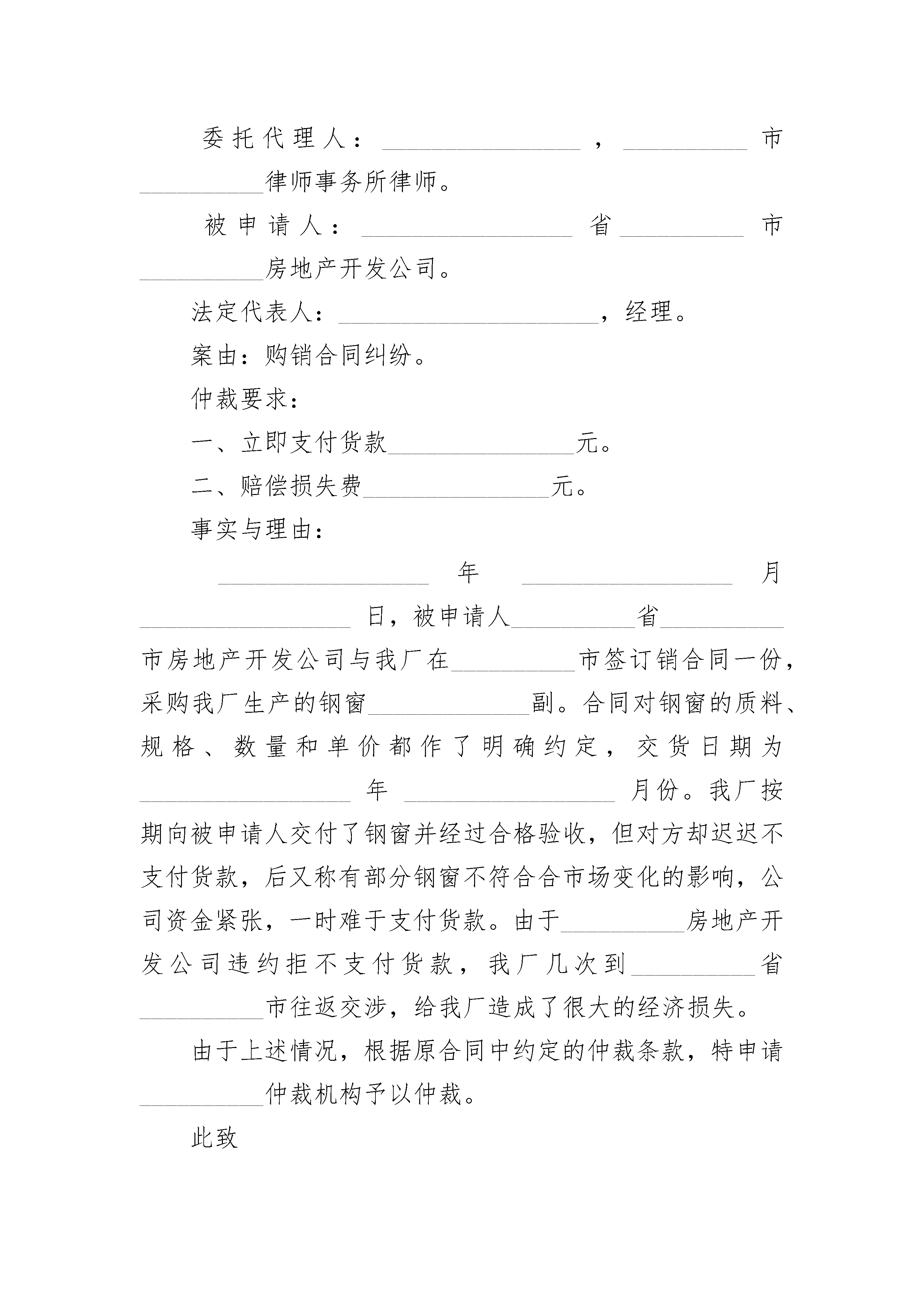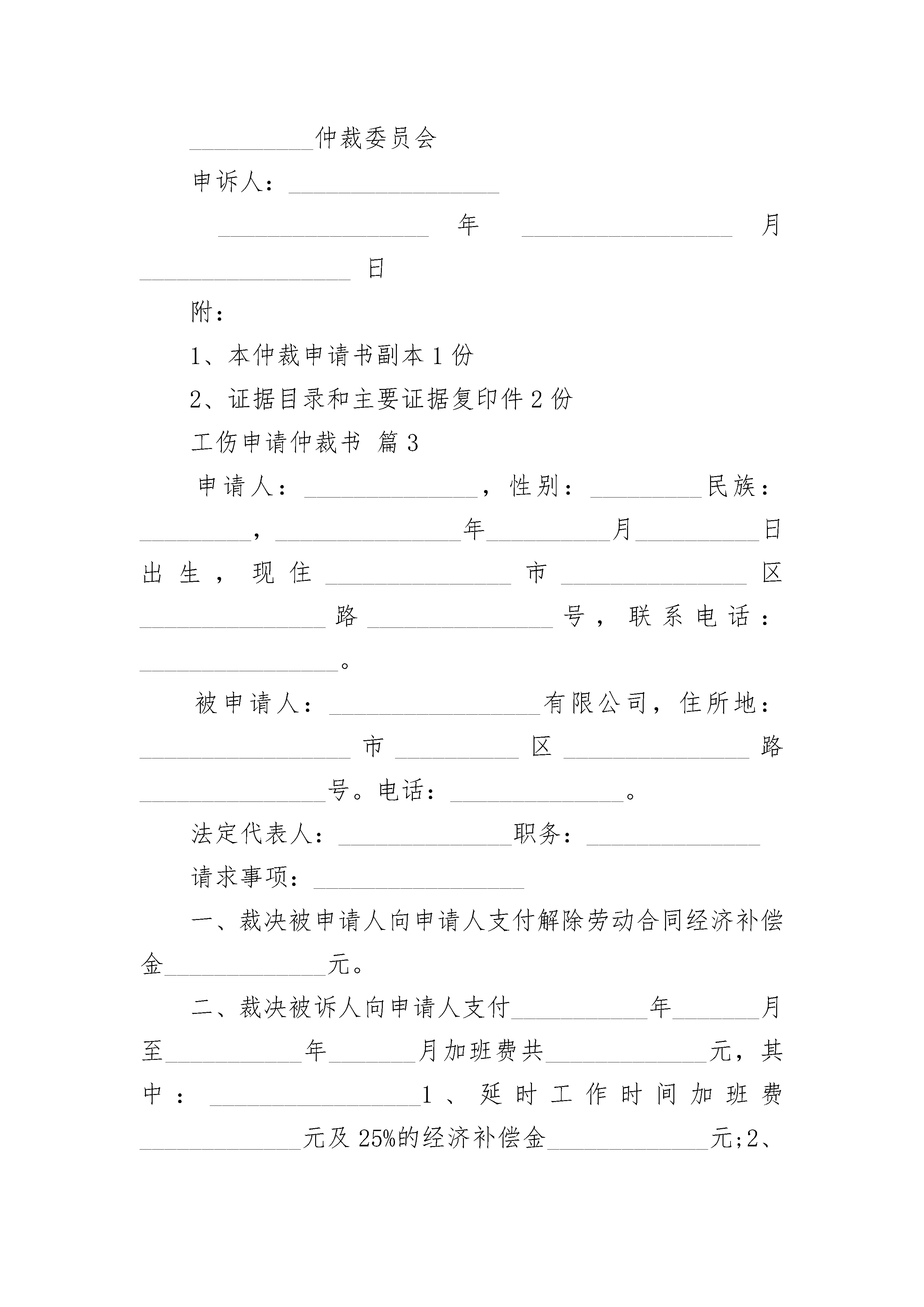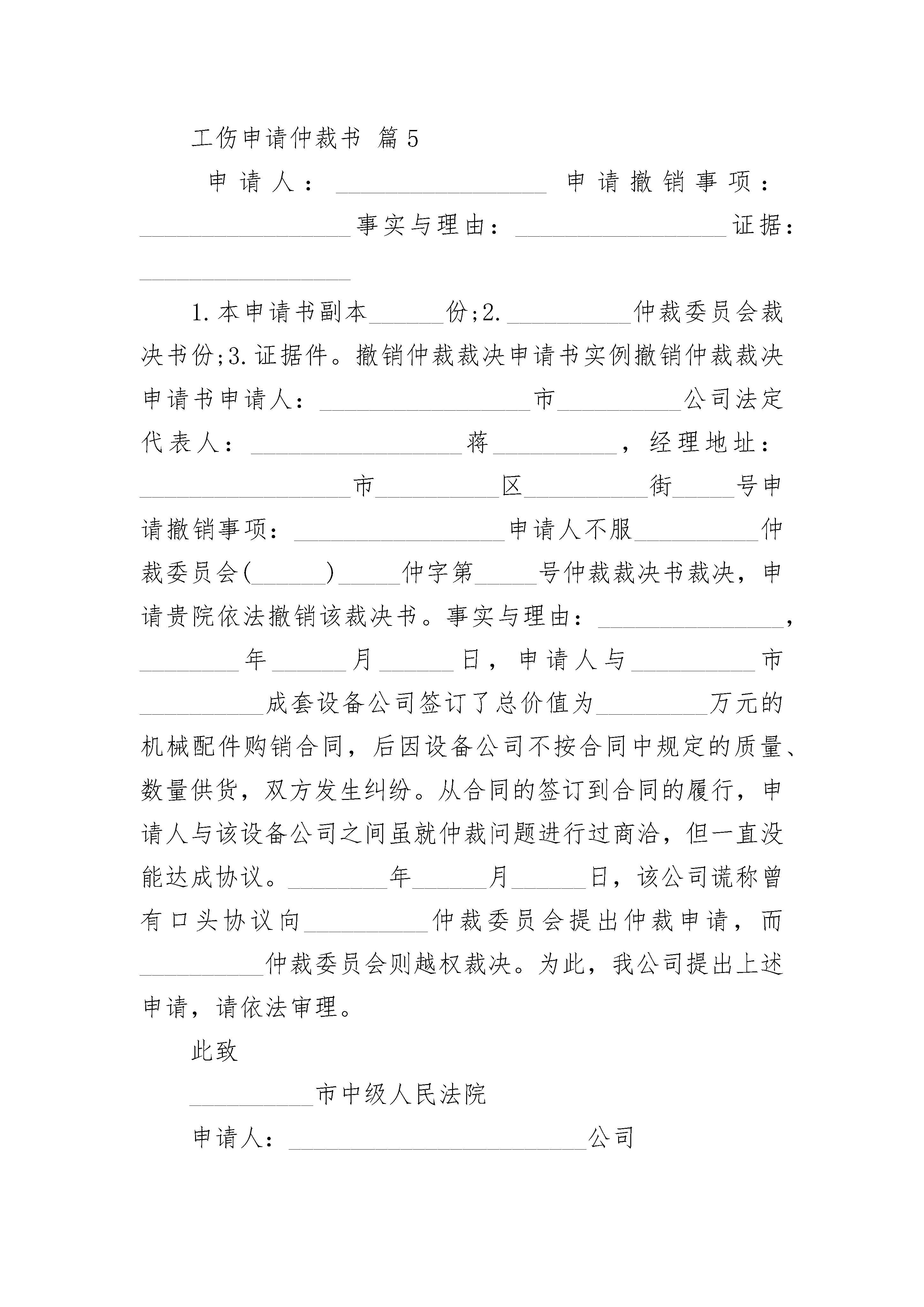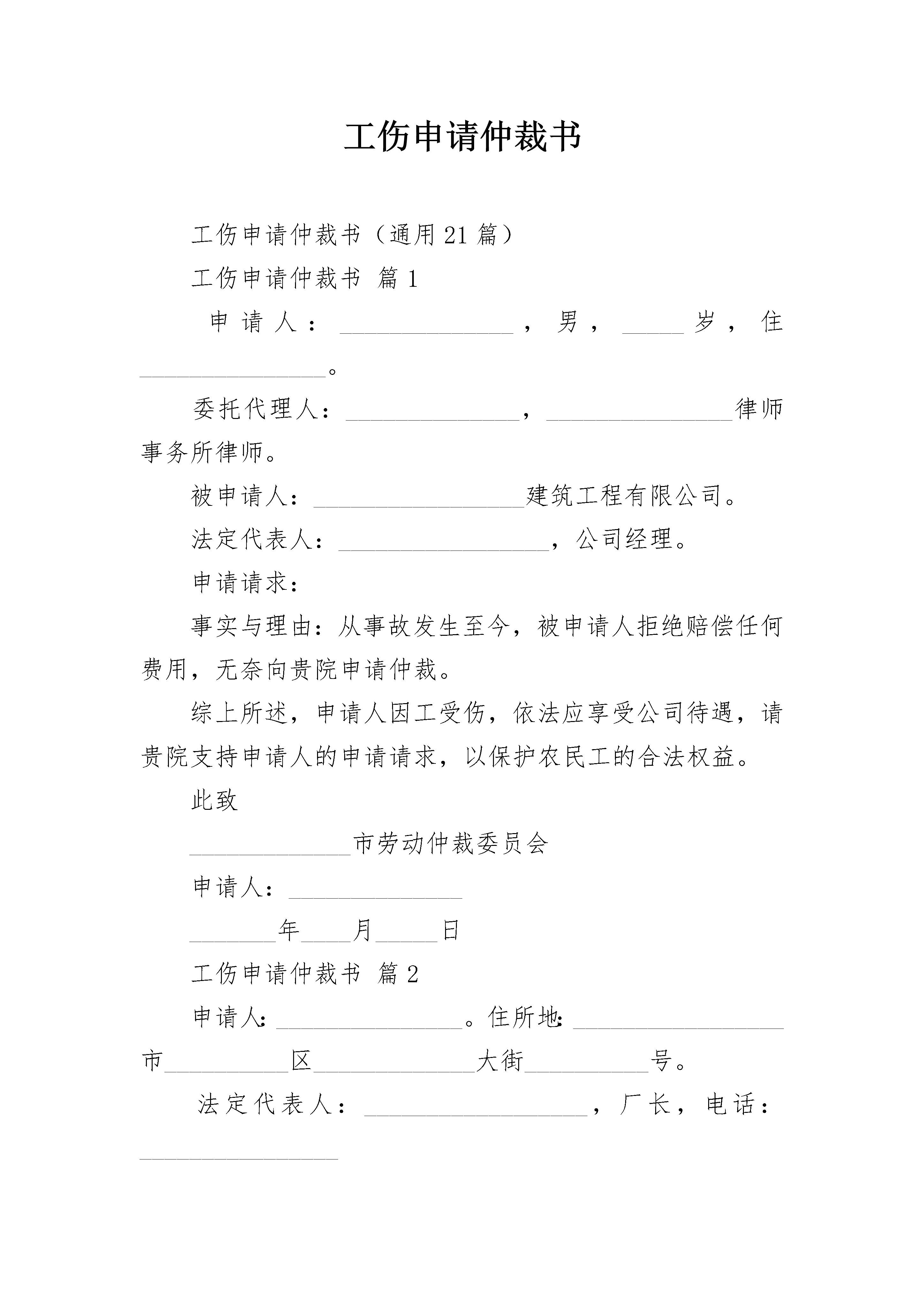 工伤申请仲裁书工伤申请仲裁书(通用21篇)工伤申请仲裁书篇1申请人:______________,男,_____岁,住_______________。委托代理人:______________,_______________律师事务所律师。被申请人:_________________建筑工程有限公司。法定代表人:_________________,公司经理。申请请求:事实与理由:从事故发生至今,被申请人拒绝赔偿任何费用,无奈向贵院申请仲裁。综上所述,申请人因工受伤,依法应享受公司待遇,请贵院支持申请人的申请请求,以保护农民工的合法权益。此致_____________市劳动仲裁委员会申请人:_____________________年____月_____日工伤申请仲裁书篇2申请人:_______________。住所地:_________________市__________区_____________大街__________号。法定代表人:__________________,厂长,电话:________________委托代理人:________________,__________市__________律师事务所律师。被申请人:_________________省__________市__________房地产开发公司。法定代表人:_____________________,经理。案由:购销合同纠纷。仲裁要求:一、立即支付货款_______________元。二、赔偿损失费_______________元。事实与理由:_________________年_________________月_________________日,被申请人__________省__________市房地产开发公司与我厂在__________市签订销合同一份,采购我厂生产的钢窗_____________副。合同对钢窗的质料、规格、数量和单价都作了明确约定,交货日期为_________________年_________________月份。我厂按期向被申请人交付了钢窗并经过合格验收,但对方却迟迟不支付货款,后又称有部分钢窗不符合合市场变化的影响,公司资金紧张,一时难于支付货款。由于__________房地产开发公司违约拒不支付货款,我厂几次到__________省__________市往返交涉,给我厂造成了很大的经济损失。由于上述情况,根据原合同中约定的仲裁条款,特申请__________仲裁机构予以仲裁。此致__________仲裁委员会申诉人:__________________________________年_________________月_________________日附:1、本仲裁申请书副本1份2、证据目录和主要证据复印件2份工伤申请仲裁书篇3申请人:______________,性别:_________民族:_________,_______________年__________月__________日出生,现住_______________市_______________区_______________路_______________号,联系电话:________________。被申请人:_________________有限公司,住所地:_________________市__________区_______________路_______________号。电话:______________。法定代表人:______________职务:______________请求事项:_________________一、裁决被申请人向申请人支付解除劳动合同经济补偿金_____________元。二、裁决被诉人向申请人支付___________年_______月至___________年_______月加班费共_____________元,其中:_________________1、延时工作时间加班费_____________元及25%的经济补偿金_____________元;2、休息日加班费_____________元及25%的经济补偿金_________________元;。以上二项合计:______________元。申请人:___________________________年_______月_____日工伤申请仲裁书篇4申请人:______________,男/女,_____________年__________月__________日出生,_____族,住_____________。联系方式:_________________。法定代理人/指定代理人:______________。委托诉讼代理人:_______