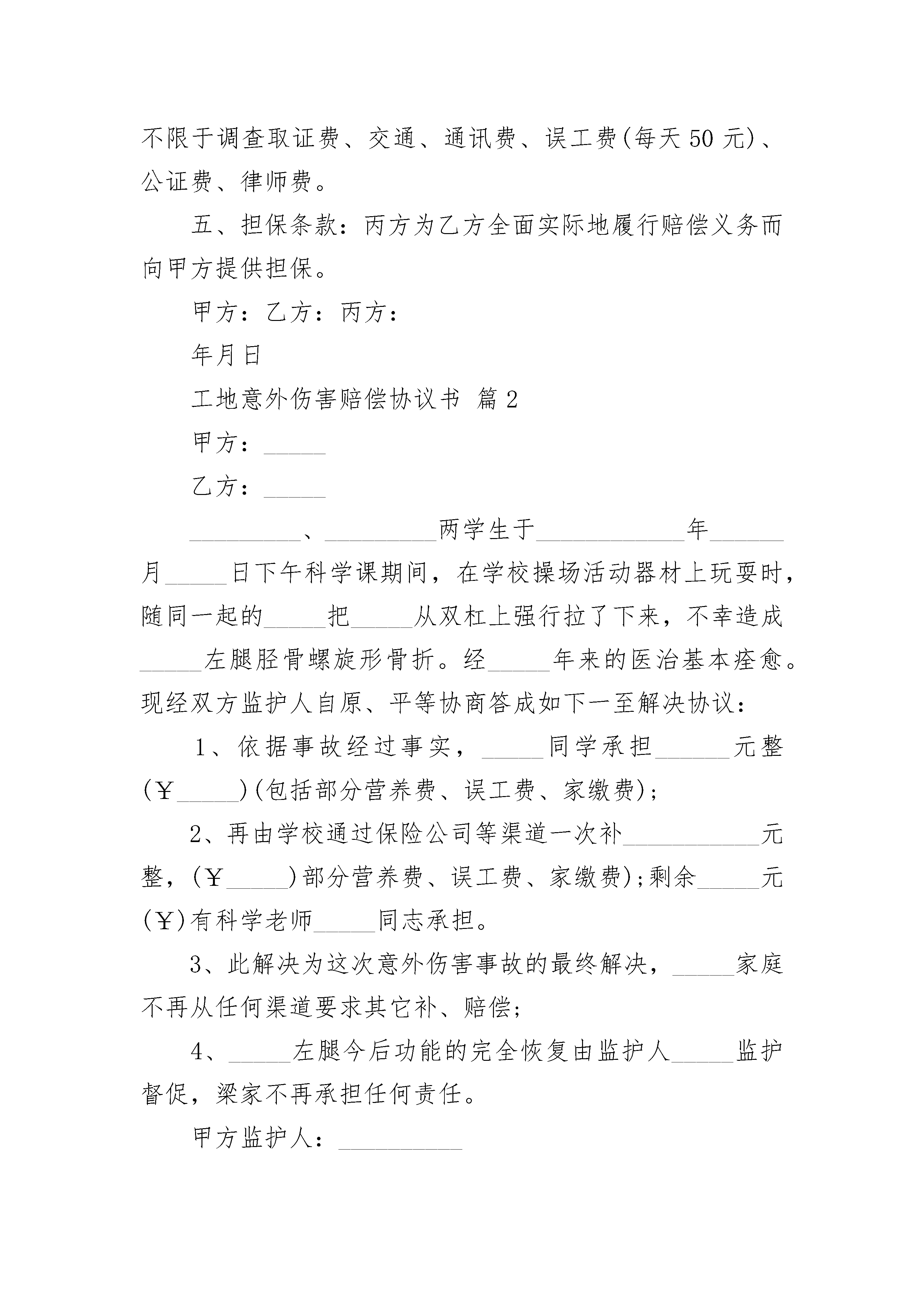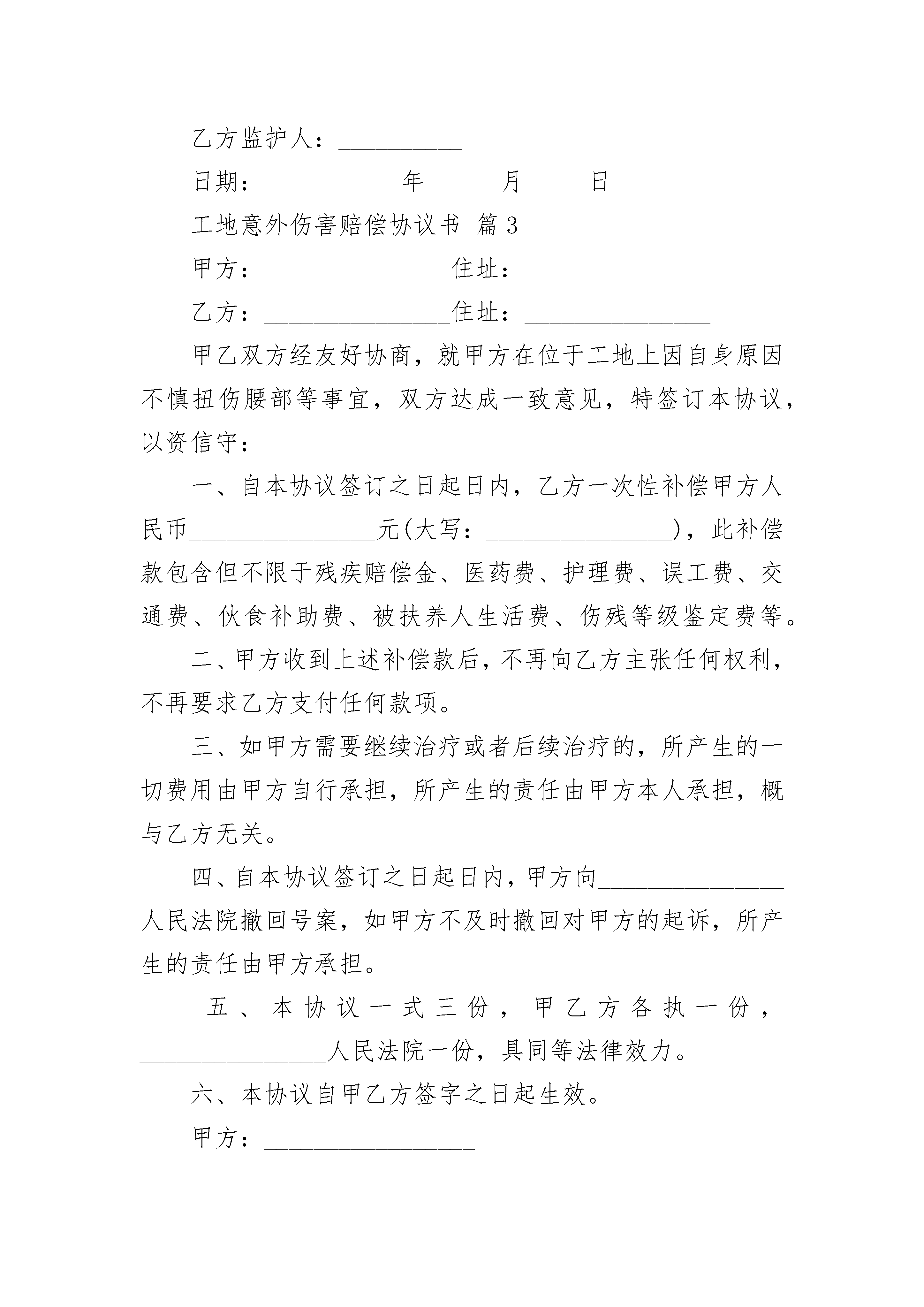 工地意外伤害赔偿协议书工地意外伤害赔偿协议书(精选3篇)工地意外伤害赔偿协议书篇1甲方:1、。2、。3、,身份证号码:。乙方:有限责任公司法定代表人:,职务:。丙方:,身份证号码:。甲方系乙方工人,因工作原因于年月日发生工伤事故,因医治无效于年月日死亡。为妥善解决死亡善后事宜,甲、乙、丙三方本着平等协商、互谅互让的原则,经协商达成协议如下:一、丧葬事宜:甲、乙、丙三方共同配合,及时处理死者丧葬事宜。所需丧葬费用由乙方支付。(全部救治费用已由乙方支付。)二、赔偿金额:乙方向甲方之支付赔偿金壹万元;向甲方之支付赔偿金元。除承担上述费用外,甲方不得再向乙方主张任何费用。三、付款期限:年月日前支付张全部赔偿金元,支付李、李部分赔偿金元;年月日前支付、剩余全部赔偿金元。四、违约责任:1、乙方迟延付款的,甲方有权要求乙方一次性支付余款,并有权要求乙方按照银行同期贷款利息的两倍支付利息。2、因任何一方违约而导致诉讼、仲裁或申请强制执行的,应当向对方支付实现债权的费用,包括但不限于调查取证费、交通、通讯费、误工费(每天50元)、公证费、律师费。五、担保条款:丙方为乙方全面实际地履行赔偿义务而向甲方提供担保。甲方:乙方:丙方:年月日工地意外伤害赔偿协议书篇2甲方:_____乙方:______________、_________两学生于____________年______月_____日下午科学课期间,在学校操场活动器材上玩耍时,随同一起的_____把_____从双杠上强行拉了下来,不幸造成_____左腿胫骨螺旋形骨折。经_____年来的医治基本痊愈。现经双方监护人自原、平等协商答成如下一至解决协议:1、依据事故经过事实,_____同学承担______元整(¥_____)(包括部分营养费、误工费、家缴费);2、再由学校通过保险公司等渠道一次补___________元整,(¥_____)部分营养费、误工费、家缴费);剩余_____元(¥)有科学老师_____同志承担。3、此解决为这次意外伤害事故的最终解决,_____家庭不再从任何渠道要求其它补、赔偿;4、_____左腿今后功能的完全恢复由监护人_____监护督促,梁家不再承担任何责任。甲方监护人:__________乙方监护人:__________日期:___________年______月_____日工地意外伤害赔偿协议书篇3甲方:_______________住址:_______________乙方:_______________住址:_______________甲乙双方经友好协商,就甲方在位于工地上因自身原因不慎扭伤腰部等事宜,双方达成一致意见,特签订本协议,以资信守:一、自本协议签订之日起日内,乙方一次性补偿甲方人民币_______________元(大写:_______________),此补偿款包含但不限于残疾赔偿金、医药费、护理费、误工费、交通费、伙食补助费、被扶养人生活费、伤残等级鉴定费等。二、甲方收到上述补偿款后,不再向乙方主张任何权利,不再要求乙方支付任何款项。三、如甲方需要继续治疗或者后续治疗的,所产生的一切费用由甲方自行承担,所产生的责任由甲方本人承担,概与乙方无关。四、自本协议签订之日起日内,甲方向_______________人民法院撤回号案,如甲方不及时撤回对甲方的起诉,所产生的责任由甲方承担。五、本协议一式三份,甲乙方各执一份,_______________人民法院一份,具同等法律效力。六、本协议自甲乙方签字之日起生效。甲方:________________________年_______月_____日乙方:________________________年_______月_____日