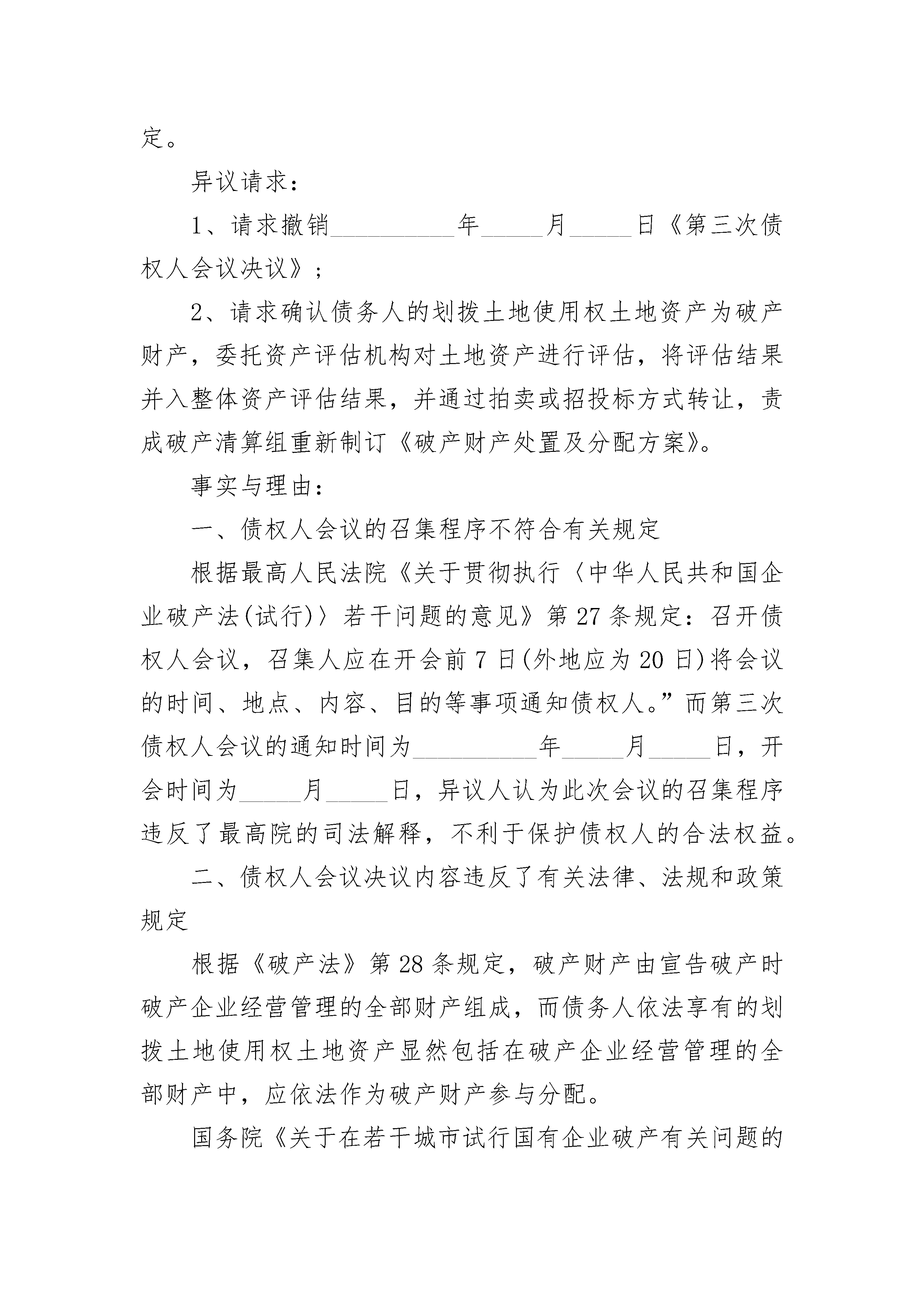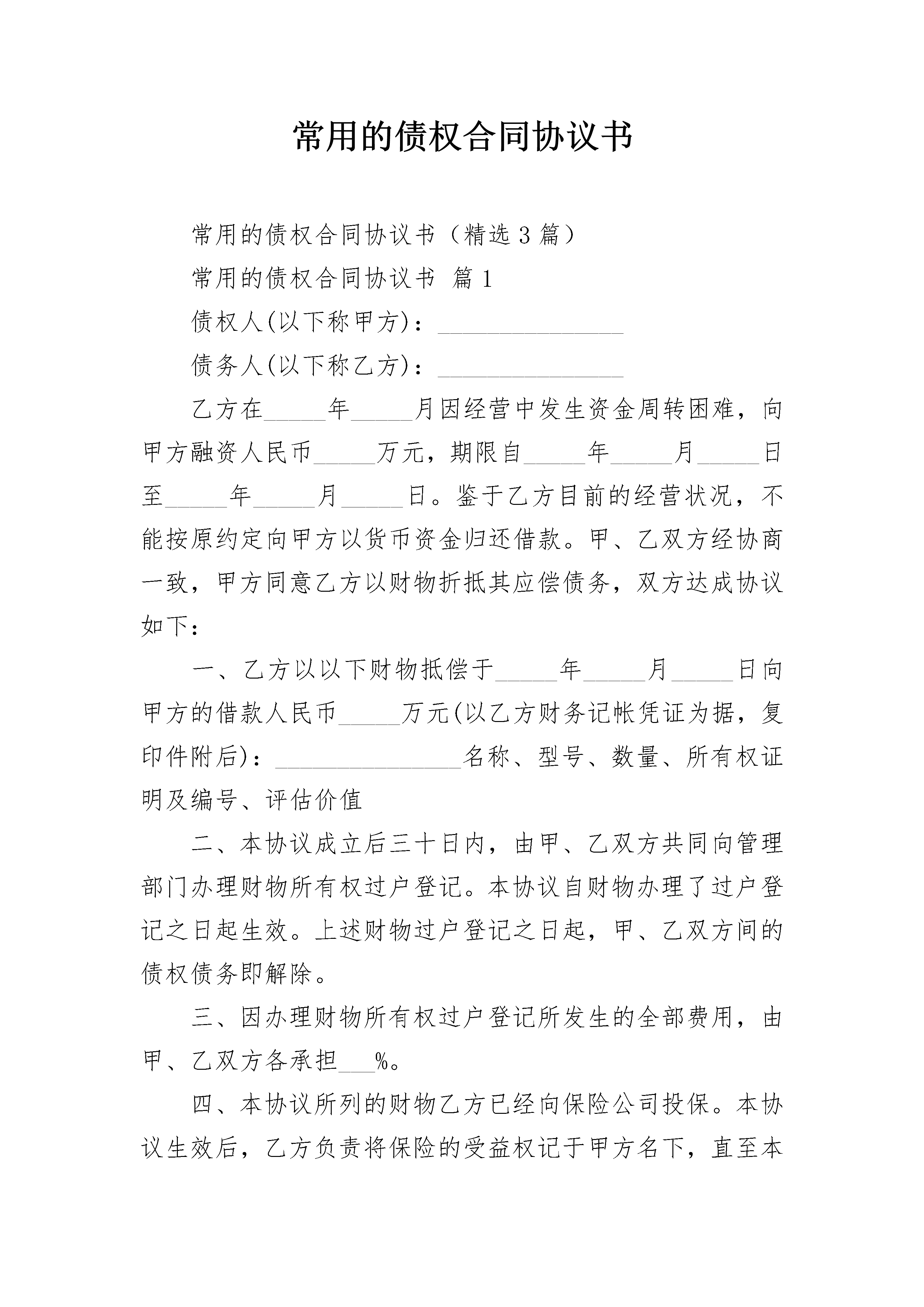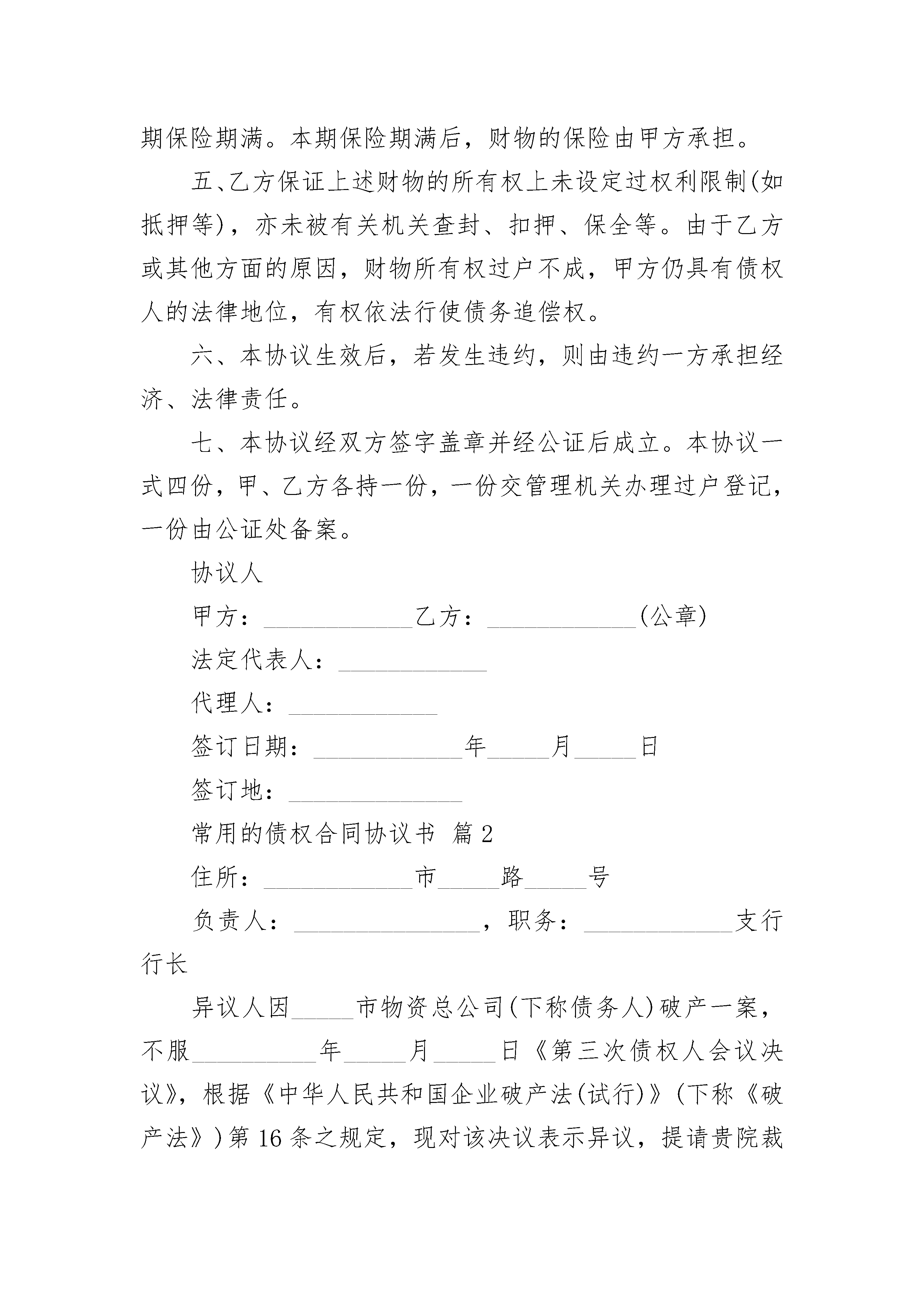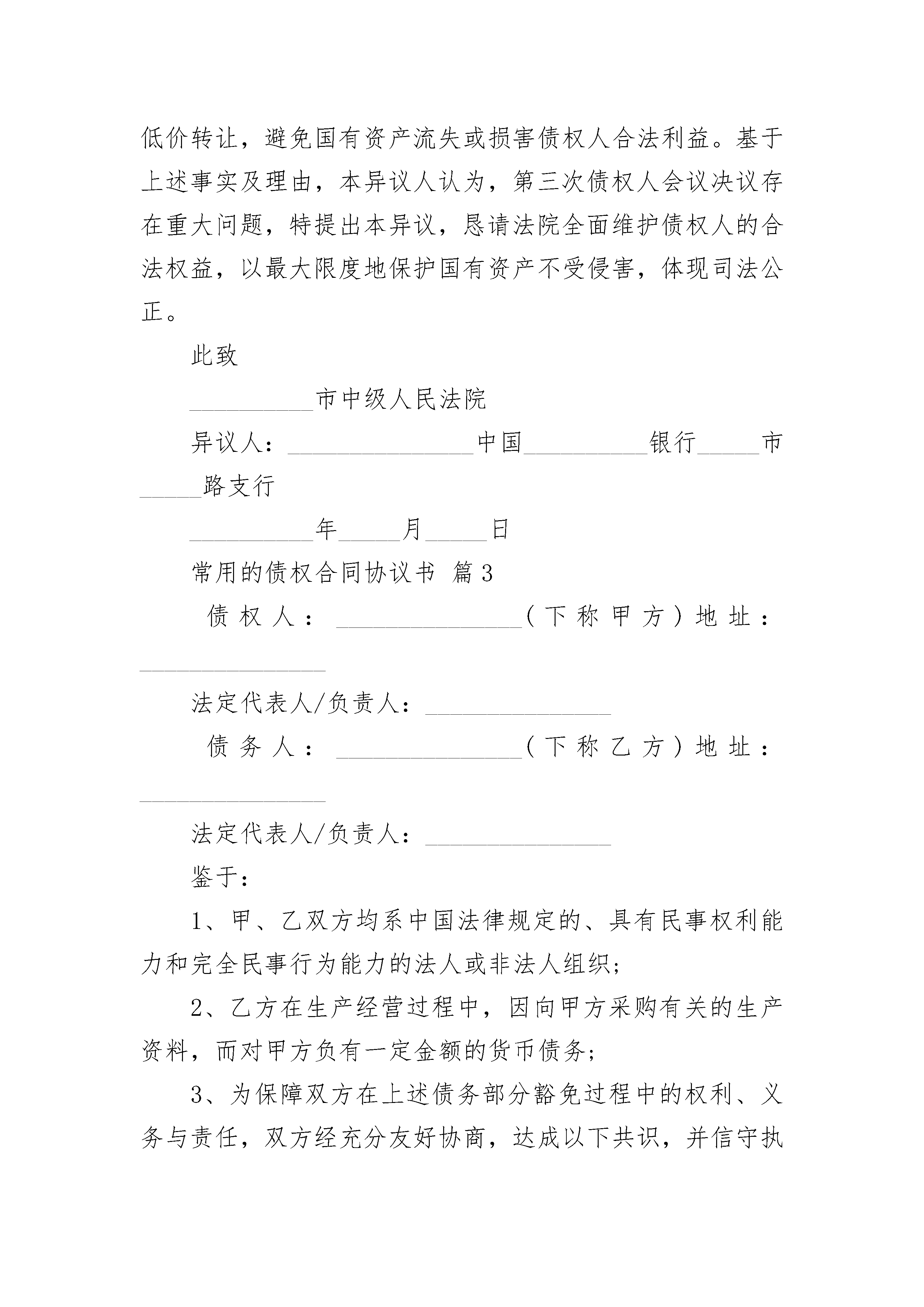 常用的债权合同协议书常用的债权合同协议书(精选3篇)常用的债权合同协议书篇1债权人(以下称甲方):_______________债务人(以下称乙方):_______________乙方在_____年_____月因经营中发生资金周转困难,向甲方融资人民币_____万元,期限自_____年_____月_____日至_____年_____月_____日。鉴于乙方目前的经营状况,不能按原约定向甲方以货币资金归还借款。甲、乙双方经协商一致,甲方同意乙方以财物折抵其应偿债务,双方达成协议如下:一、乙方以以下财物抵偿于_____年_____月_____日向甲方的借款人民币_____万元(以乙方财务记帐凭证为据,复印件附后):_______________名称、型号、数量、所有权证明及编号、评估价值二、本协议成立后三十日内,由甲、乙双方共同向管理部门办理财物所有权过户登记。本协议自财物办理了过户登记之日起生效。上述财物过户登记之日起,甲、乙双方间的债权债务即解除。三、因办理财物所有权过户登记所发生的全部费用,由甲、乙双方各承担___%。四、本协议所列的财物乙方已经向保险公司投保。本协议生效后,乙方负责将保险的受益权记于甲方名下,直至本期保险期满。本期保险期满后,财物的保险由甲方承担。五、乙方保证上述财物的所有权上未设定过权利限制(如抵押等),亦未被有关机关查封、扣押、保全等。由于乙方或其他方面的原因,财物所有权过户不成,甲方仍具有债权人的法律地位,有权依法行使债务追偿权。六、本协议生效后,若发生违约,则由违约一方承担经济、法律责任。七、本协议经双方签字盖章并经公证后成立。本协议一式四份,甲、乙方各持一份,一份交管理机关办理过户登记,一份由公证处备案。协议人甲方:____________乙方:____________(公章)法定代表人:____________代理人:____________签订日期:____________年_____月_____日签订地:______________常用的债权合同协议书篇2住所:____________市_____路_____号负责人:_______________,职务:____________支行行长异议人因_____市物资总公司(下称债务人)破产一案,不服__________年_____月_____日《第三次债权人会议决议》,根据《中华人民共和国企业破产法(试行)》(下称《破产法》)第16条之规定,现对该决议表示异议,提请贵院裁定。异议请求:1、请求撤销__________年_____月_____日《第三次债权人会议决议》;2、请求确认债务人的划拨土地使用权土地资产为破产财产,委托资产评估机构对土地资产进行评估,将评估结果并入整体资产评估结果,并通过拍卖或招投标方式转让,责成破产清算组重新制订《破产财产处置及分配方案》。事实与理由:一、债权人会议的召集程序不符合有关规定根据最高人民法院《关于贯彻执行〈中华人民共和国企业破产法(试行)〉若干问题的意见》第27条规定:召开债权人会议,召集人应在开会前7日(外地应为20日)将会议的时间、地点、内容、目的等事项通知债权人。”而第三次债权人会议的通知时间为__________年_____月_____日,开会时间为_____月_____日,异议人认为此次会议的召集程序违反了最高院的司法解释,不利于保护债权人的合法权益。二、债权人会议决议内容违反了有关法律、法规和政策规定根据《破产法》第28条规定,破产财产由宣告破产时破产企业经营管理的全部财产组成,而债务人依法享有的划拨土地使用权土地资产显然包括在破产企业经营管理的全部财产中,应依法作为破产财产参与分配。国务院《关于在若干城市试行国有企业破产有关问题的通知》(国发[1994]59号)(下称《通知》)第2条规定:企业破产时,企业依法取得的土地使用权,应当以拍卖或者招标方式为主依法转让。”以及国务院《关于在若干城市试行国有企业兼并破产和职工再就业有关问题的补充通知》(国发[1997]10号)(下称《补充通知》)第4条规定:涉及以划拨方式取得的土地使用权或涉及改变出让合同条件的土地使用权价格评估的,须由具有土地估价能力的资产评估机构进行评估,并由土地行政主管部门确认评估结果后,并入整体资产评估结果。”“企业破产财产应以评估确认的价格为依据。按国家有关规定确定底价,以拍卖方式为主,依照有关法律、法规转让。转让价格由市场确定。”第8条规定:“只有破产企业真正做到停产关闭(取消法人资格)、土地使用权及企业财产被拍卖变现、职工得到妥善安置的,其银行贷款本金和利息损失,方可按照国发[1994]59号文件及本通知的有关规定,从银行提取的呆、坏帐准备金中核销。”由上述规定可见,国务院三令五申企业破产时对依法取得的划拨土地使用权采取拍