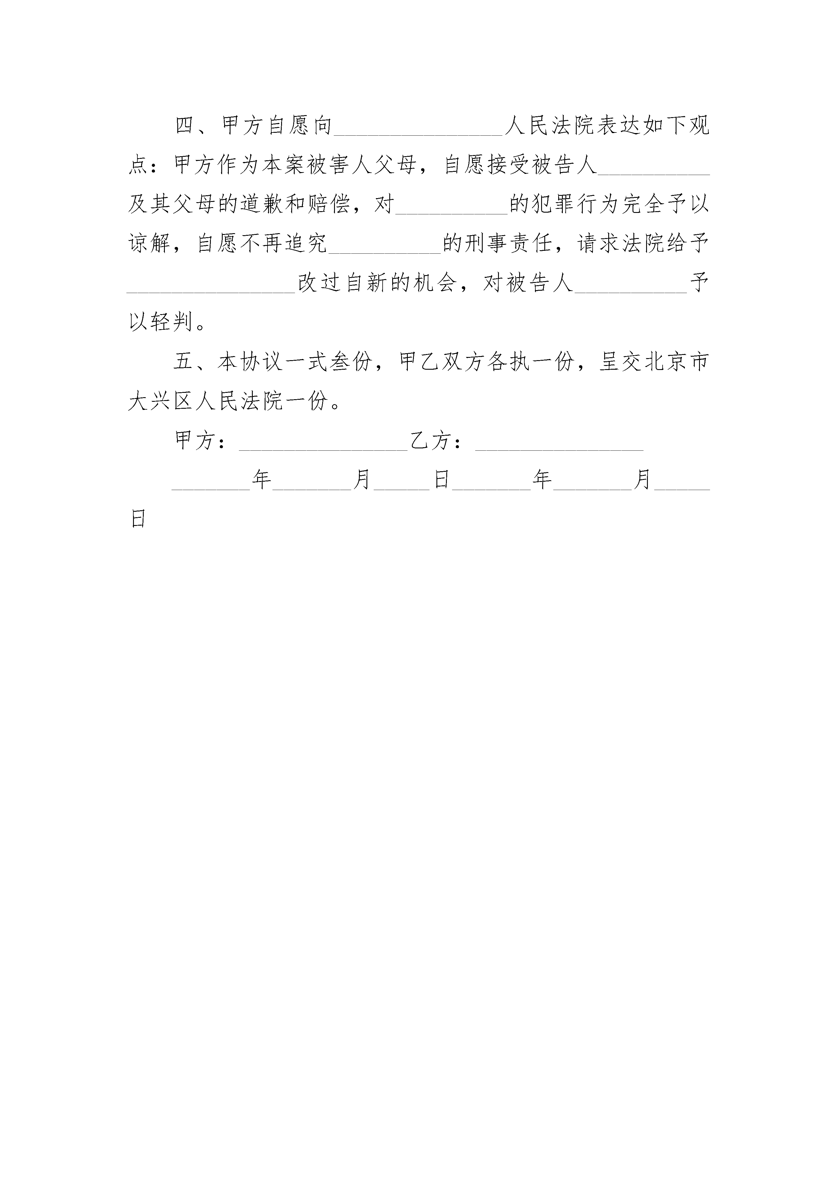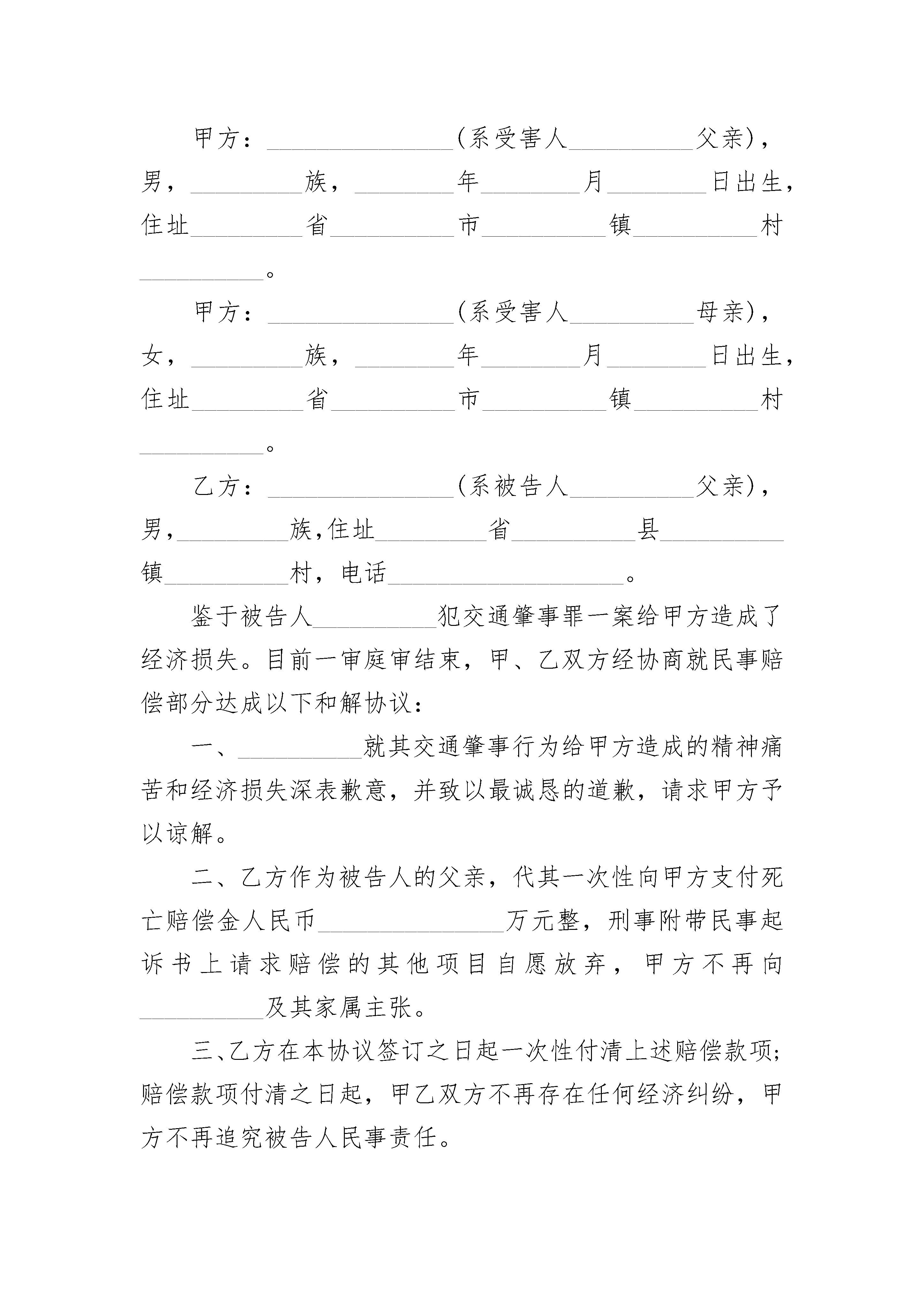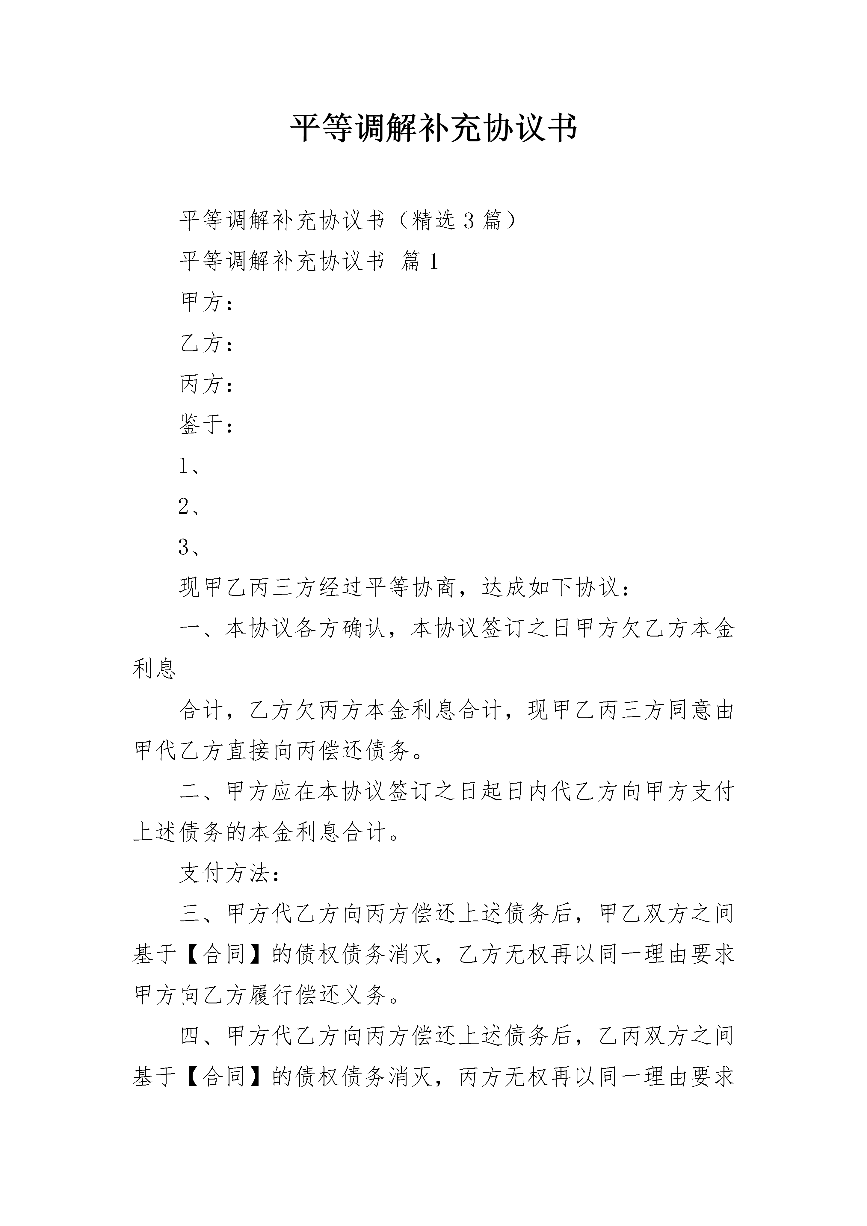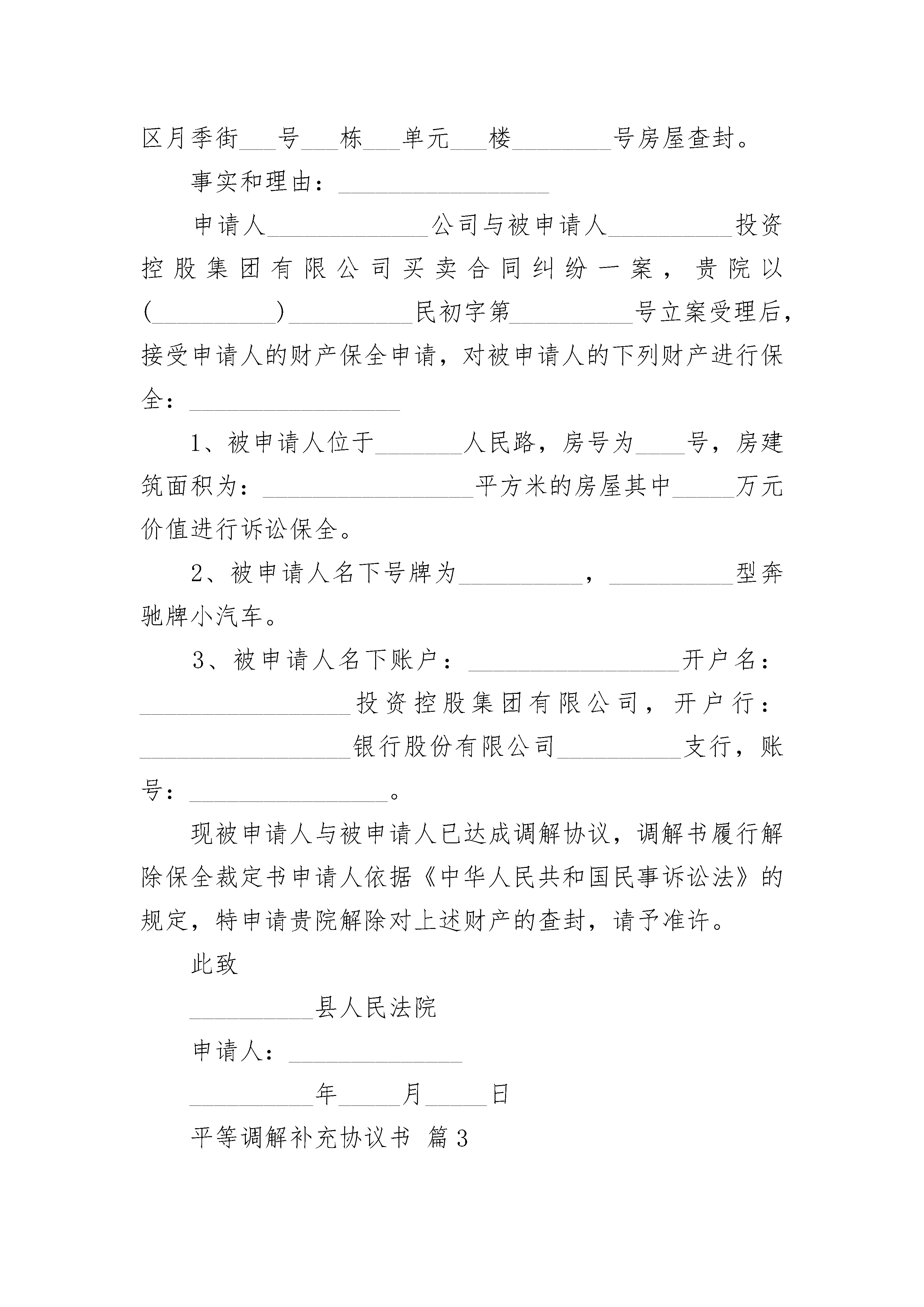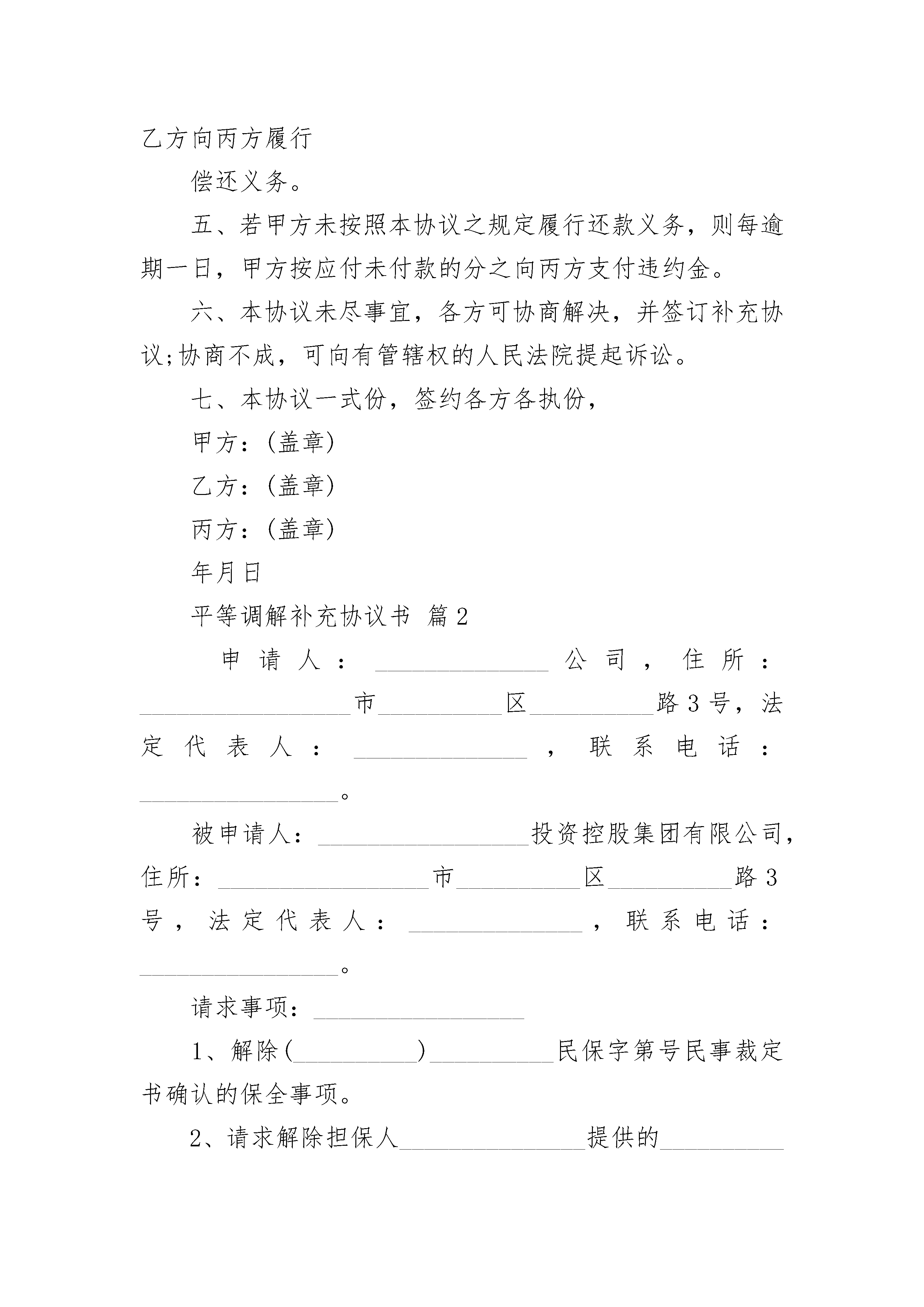 平等调解补充协议书平等调解补充协议书(精选3篇)平等调解补充协议书篇1甲方:乙方:丙方:鉴于:1、2、3、现甲乙丙三方经过平等协商,达成如下协议:一、本协议各方确认,本协议签订之日甲方欠乙方本金利息合计,乙方欠丙方本金利息合计,现甲乙丙三方同意由甲代乙方直接向丙偿还债务。二、甲方应在本协议签订之日起日内代乙方向甲方支付上述债务的本金利息合计。支付方法:三、甲方代乙方向丙方偿还上述债务后,甲乙双方之间基于【合同】的债权债务消灭,乙方无权再以同一理由要求甲方向乙方履行偿还义务。四、甲方代乙方向丙方偿还上述债务后,乙丙双方之间基于【合同】的债权债务消灭,丙方无权再以同一理由要求乙方向丙方履行偿还义务。五、若甲方未按照本协议之规定履行还款义务,则每逾期一日,甲方按应付未付款的分之向丙方支付违约金。六、本协议未尽事宜,各方可协商解决,并签订补充协议;协商不成,可向有管辖权的人民法院提起诉讼。七、本协议一式份,签约各方各执份,甲方:(盖章)乙方:(盖章)丙方:(盖章)年月日平等调解补充协议书篇2申请人:______________公司,住所:_________________市__________区__________路3号,法定代表人:______________,联系电话:________________。被申请人:_________________投资控股集团有限公司,住所:_________________市__________区__________路3号,法定代表人:______________,联系电话:________________。请求事项:_________________1、解除(__________)__________民保字第号民事裁定书确认的保全事项。2、请求解除担保人_______________提供的__________区月季街___号___栋___单元___楼________号房屋查封。事实和理由:_________________申请人_____________公司与被申请人__________投资控股集团有限公司买卖合同纠纷一案,贵院以(__________)__________民初字第__________号立案受理后,接受申请人的财产保全申请,对被申请人的下列财产进行保全:_________________1、被申请人位于_______人民路,房号为____号,房建筑面积为:_________________平方米的房屋其中_____万元价值进行诉讼保全。2、被申请人名下号牌为__________,__________型奔驰牌小汽车。3、被申请人名下账户:_________________开户名:_________________投资控股集团有限公司,开户行:_________________银行股份有限公司__________支行,账号:________________。现被申请人与被申请人已达成调解协议,调解书履行解除保全裁定书申请人依据《中华人民共和国民事诉讼法》的规定,特申请贵院解除对上述财产的查封,请予准许。此致__________县人民法院申请人:________________________年_____月_____日平等调解补充协议书篇3甲方:_______________(系受害人__________父亲),男,_________族,________年________月________日出生,住址_________省__________市__________镇__________村__________。甲方:_______________(系受害人__________母亲),女,_________族,________年________月________日出生,住址_________省__________市__________镇__________村__________。乙方:_______________(系被告人__________父亲),男,_________族,住址_________省__________县__________镇__________村,电话___________________。鉴于被告人__________犯交通肇事罪一案给甲方造成了经济损失。目前一审庭审结束,甲、乙双方经协商就民事赔偿部分达成以下和解协议:一、__________就其交通肇事行为给甲方造成的精神痛苦和经济损失深表歉意,并致以最诚恳的道歉,请求甲方予以谅解。二、乙方作为被告人的父亲,代其一次性向甲方支付死亡赔偿金人民币_______________万元整,刑事附带民事起诉书上请求赔偿的其他项目自愿放弃,甲方不再向__________及其家属主张。三、乙方在本协议签订之日起一次性付清上述赔