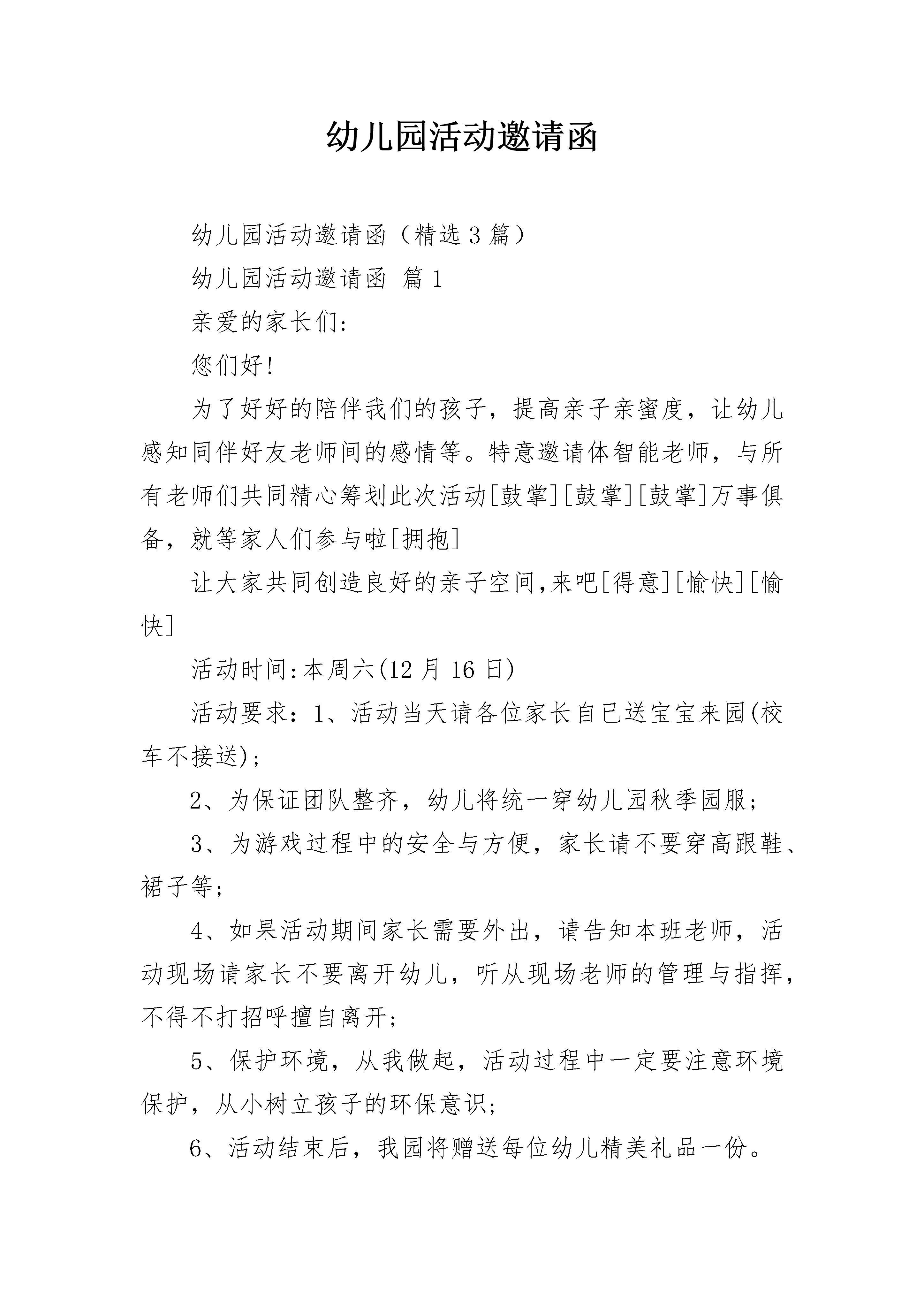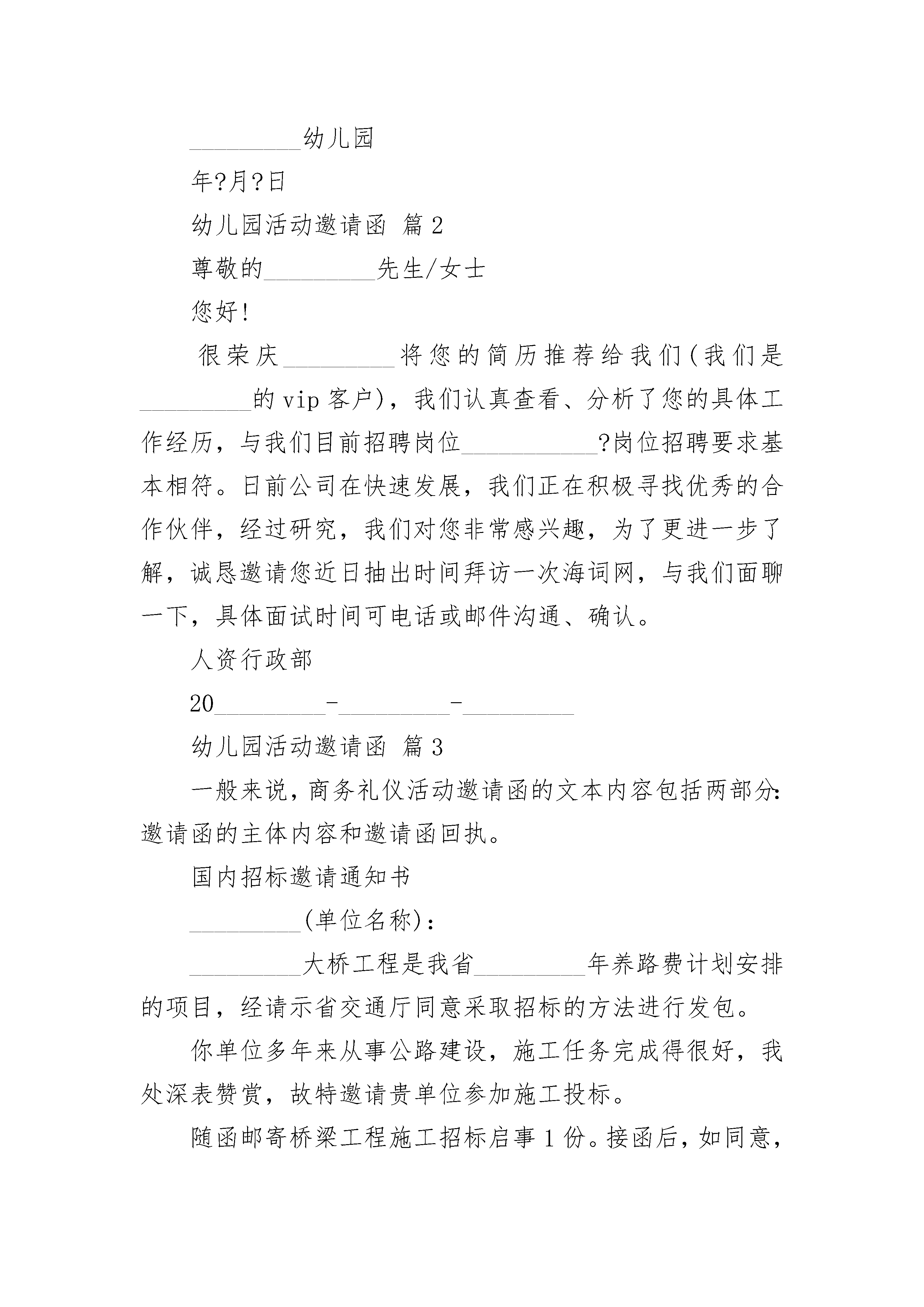 幼儿园活动邀请函幼儿园活动邀请函(精选3篇)幼儿园活动邀请函篇1亲爱的家长们:您们好!为了好好的陪伴我们的孩子,提高亲子亲蜜度,让幼儿感知同伴好友老师间的感情等。特意邀请体智能老师,与所有老师们共同精心筹划此次活动[鼓掌][鼓掌][鼓掌]万事俱备,就等家人们参与啦[拥抱]让大家共同创造良好的亲子空间,来吧[得意][愉快][愉快]活动时间:本周六(12月16日)活动要求:1、活动当天请各位家长自已送宝宝来园(校车不接送);2、为保证团队整齐,幼儿将统一穿幼儿园秋季园服;3、为游戏过程中的安全与方便,家长请不要穿高跟鞋、裙子等;4、如果活动期间家长需要外出,请告知本班老师,活动现场请家长不要离开幼儿,听从现场老师的管理与指挥,不得不打招呼擅自离开;5、保护环境,从我做起,活动过程中一定要注意环境保护,从小树立孩子的环保意识;6、活动结束后,我园将赠送每位幼儿精美礼品一份。_________幼儿园年?月?日幼儿园活动邀请函篇2尊敬的_________先生/女士您好!很荣庆_________将您的简历推荐给我们(我们是_________的vip客户),我们认真查看、分析了您的具体工作经历,与我们目前招聘岗位___________?岗位招聘要求基本相符。日前公司在快速发展,我们正在积极寻找优秀的合作伙伴,经过研究,我们对您非常感兴趣,为了更进一步了解,诚恳邀请您近日抽出时间拜访一次海词网,与我们面聊一下,具体面试时间可电话或邮件沟通、确认。人资行政部20_________-_________-_________幼儿园活动邀请函篇3一般来说,商务礼仪活动邀请函的文本内容包括两部分:邀请函的主体内容和邀请函回执。国内招标邀请通知书_________(单位名称):_________大桥工程是我省_________年养路费计划安排的项目,经请示省交通厅同意采取招标的方法进行发包。你单位多年来从事公路建设,施工任务完成得很好,我处深表赞赏,故特邀请贵单位参加施工投标。随函邮寄桥梁工程施工招标启事1份。接函后,如同意,望于_________年_________月_________日上午_________时到省交通厅食宿站(建筑街副1号,火车站前)领取投标文件(包括施工图设计),并请按规定日期参加工程投标。招标单位:_________省交通厅生产综合处地址:省交通厅二楼209号联系人:_________电话:__________________年_________月_________日