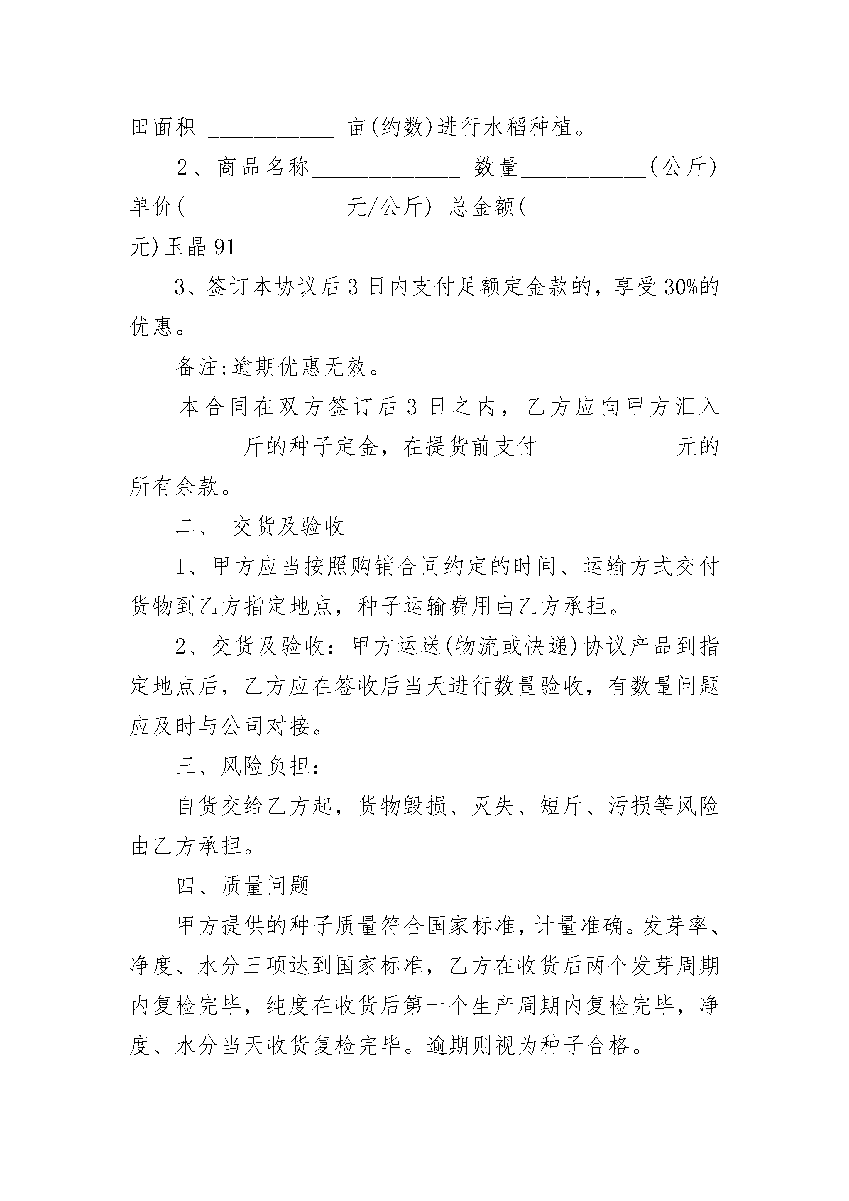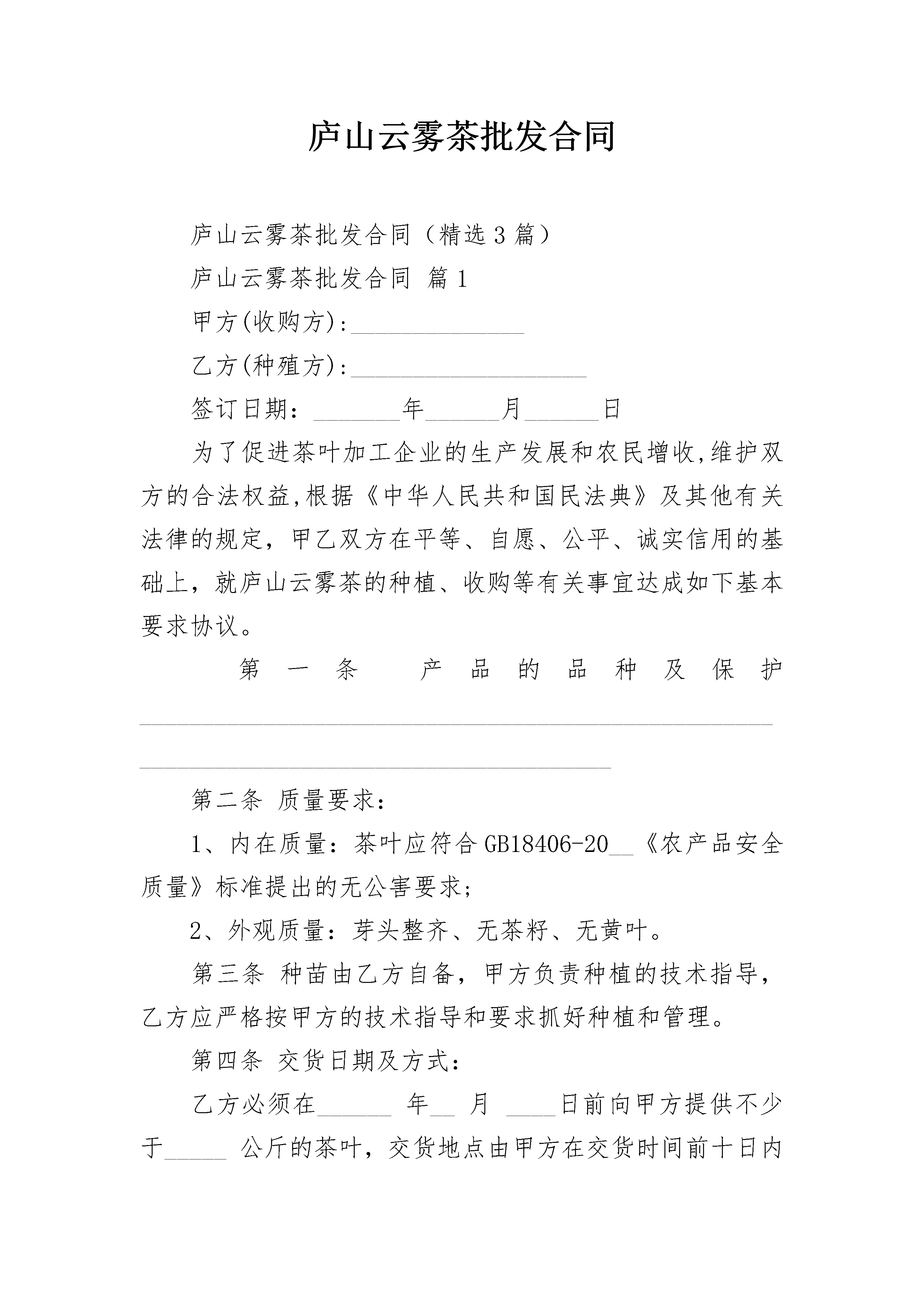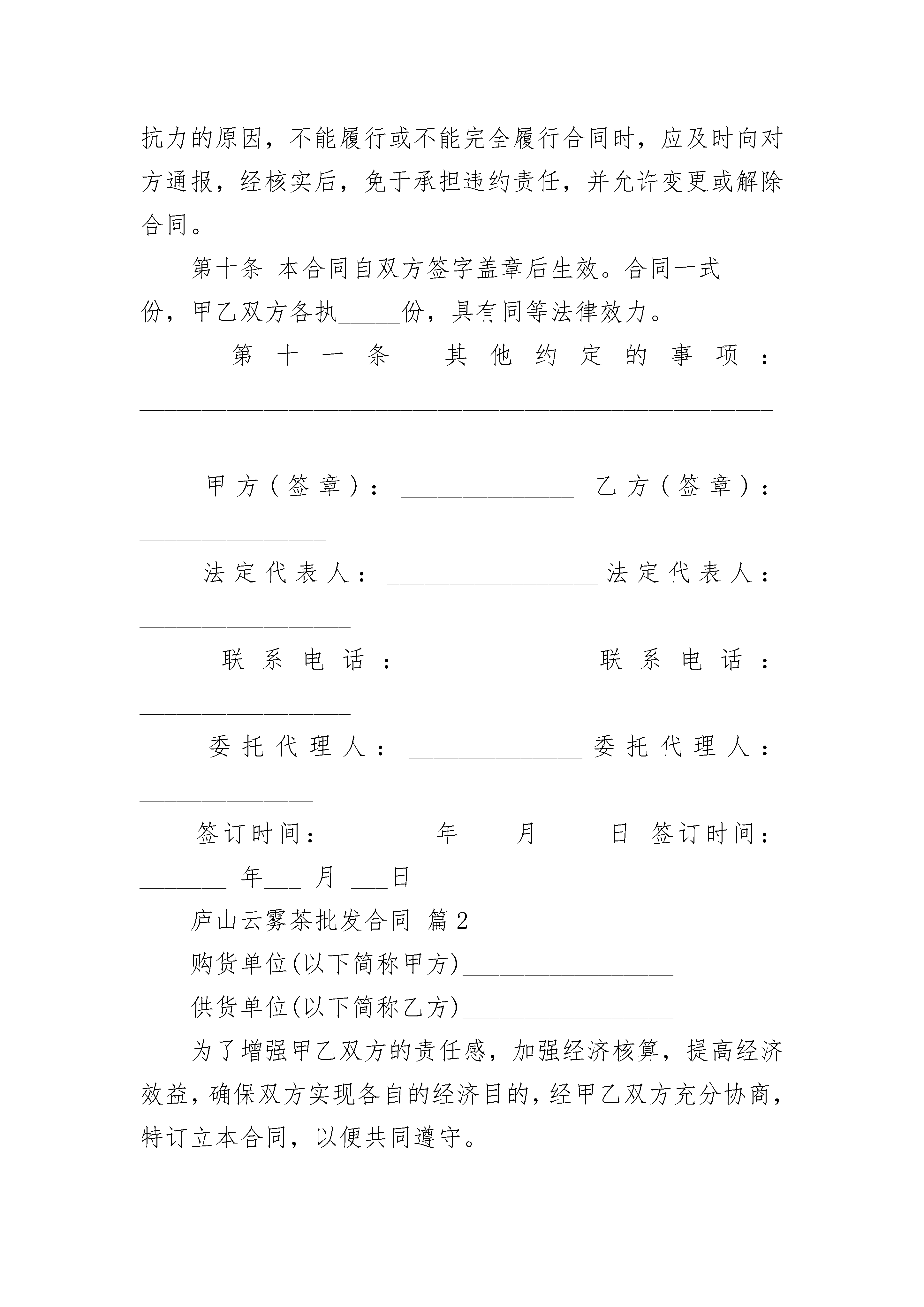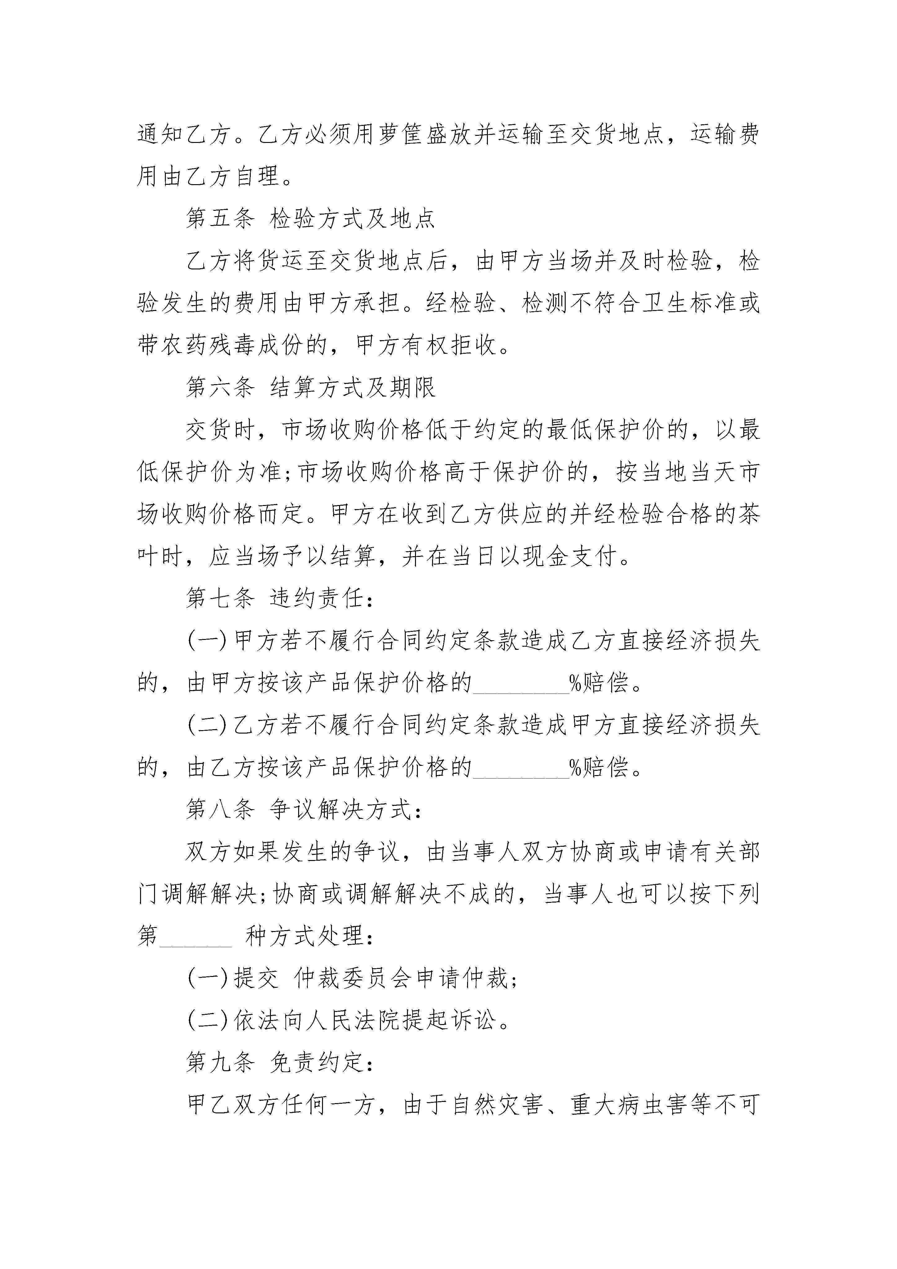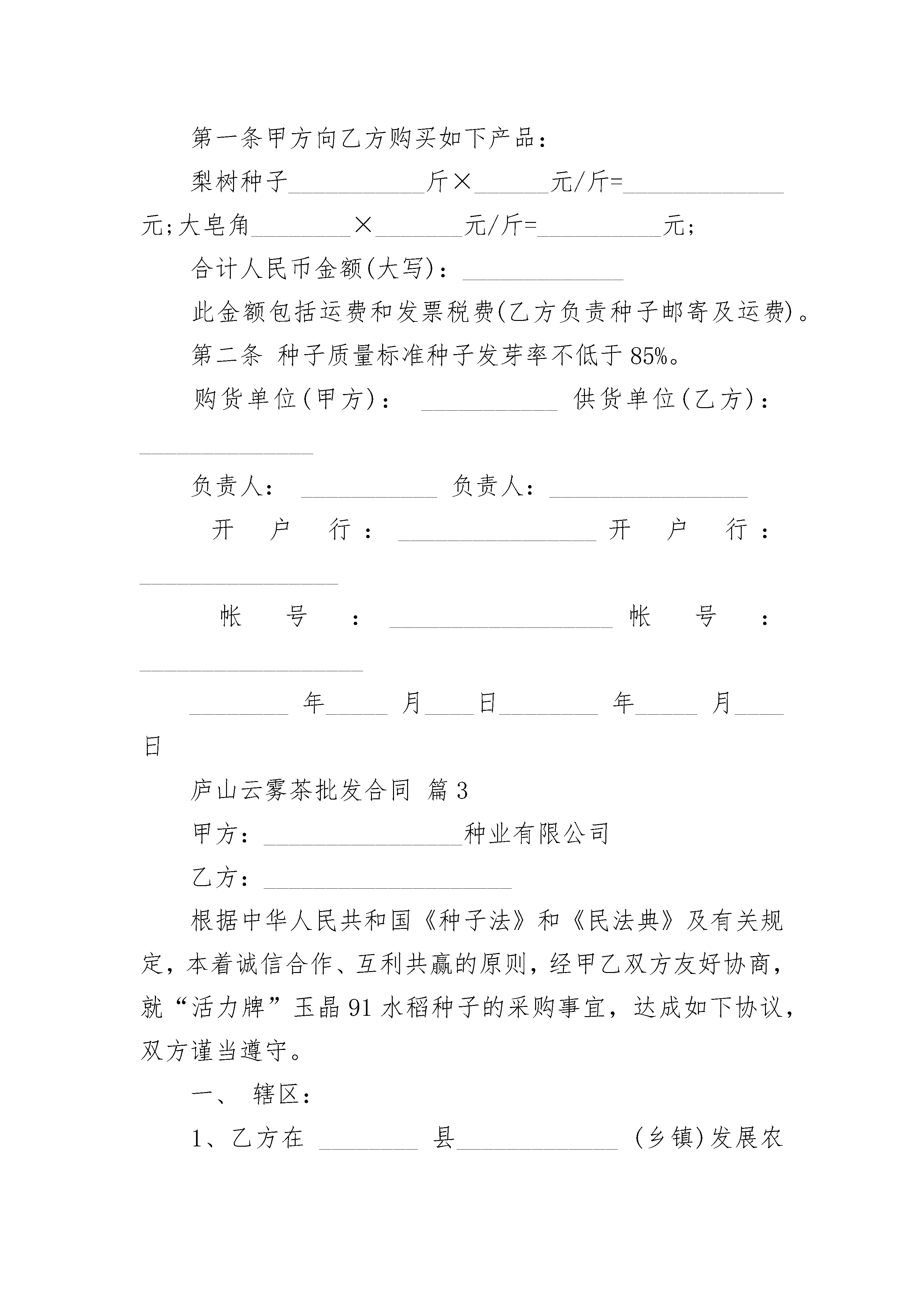 庐山云雾茶批发合同庐山云雾茶批发合同(精选3篇)庐山云雾茶批发合同篇1甲方(收购方):______________乙方(种殖方):___________________签订日期:_______年______月______日为了促进茶叶加工企业的生产发展和农民增收,维护双方的合法权益,根据《中华人民共和国民法典》及其他有关法律的规定,甲乙双方在平等、自愿、公平、诚实信用的基础上,就庐山云雾茶的种植、收购等有关事宜达成如下基本要求协议。第一条产品的品种及保护_________________________________________________________________________________________第二条质量要求:1、内在质量:茶叶应符合GB18406-20__《农产品安全质量》标准提出的无公害要求;2、外观质量:芽头整齐、无茶籽、无黄叶。第三条种苗由乙方自备,甲方负责种植的技术指导,乙方应严格按甲方的技术指导和要求抓好种植和管理。第四条交货日期及方式:乙方必须在______年__月____日前向甲方提供不少于_____公斤的茶叶,交货地点由甲方在交货时间前十日内通知乙方。乙方必须用萝筐盛放并运输至交货地点,运输费用由乙方自理。第五条检验方式及地点乙方将货运至交货地点后,由甲方当场并及时检验,检验发生的费用由甲方承担。经检验、检测不符合卫生标准或带农药残毒成份的,甲方有权拒收。第六条结算方式及期限交货时,市场收购价格低于约定的最低保护价的,以最低保护价为准;市场收购价格高于保护价的,按当地当天市场收购价格而定。甲方在收到乙方供应的并经检验合格的茶叶时,应当场予以结算,并在当日以现金支付。第七条违约责任:(一)甲方若不履行合同约定条款造成乙方直接经济损失的,由甲方按该产品保护价格的________%赔偿。(二)乙方若不履行合同约定条款造成甲方直接经济损失的,由乙方按该产品保护价格的________%赔偿。第八条争议解决方式:双方如果发生的争议,由当事人双方协商或申请有关部门调解解决;协商或调解解决不成的,当事人也可以按下列第______种方式处理:(一)提交仲裁委员会申请仲裁;(二)依法向人民法院提起诉讼。第九条免责约定:甲乙双方任何一方,由于自然灾害、重大病虫害等不可抗力的原因,不能履行或不能完全履行合同时,应及时向对方通报,经核实后,免于承担违约责任,并允许变更或解除合同。第十条本合同自双方签字盖章后生效。合同一式_____份,甲乙双方各执_____份,具有同等法律效力。第十一条其他约定的事项:________________________________________________________________________________________甲方(签章):______________乙方(签章):_______________法定代表人:_________________法定代表人:_________________联系电话:____________联系电话:_________________委托代理人:______________委托代理人:______________签订时间:_______年___月____日签订时间:_______年___月___日庐山云雾茶批发合同篇2购货单位(以下简称甲方)_________________供货单位(以下简称乙方)_________________为了增强甲乙双方的责任感,加强经济核算,提高经济效益,确保双方实现各自的经济目的,经甲乙双方充分协商,特订立本合同,以便共同遵守。第一条甲方向乙方购买如下产品:梨树种子___________斤×______元/斤=_____________元;大皂角________×_______元/斤=__________元;合计人民币金额(大写):_____________此金额包括运费和发票税费(乙方负责种子邮寄及运费)。第二条种子质量标准种子发芽率不低于85%。购货单位(甲方):___________供货单位(乙方):______________负责人:___________负责人:________________开户行:________________开户行:________________帐号:__________________帐号:__________________________年_____月____日________年_____月____日庐山云雾茶批发合同篇3甲方:________________种业有限公司乙方:____________________根据中华人民共和国《种子法》和《民法典》及有关规定,本着诚信合作、互利共赢的原则,经甲乙双方友好协商,就“活力牌”玉晶9