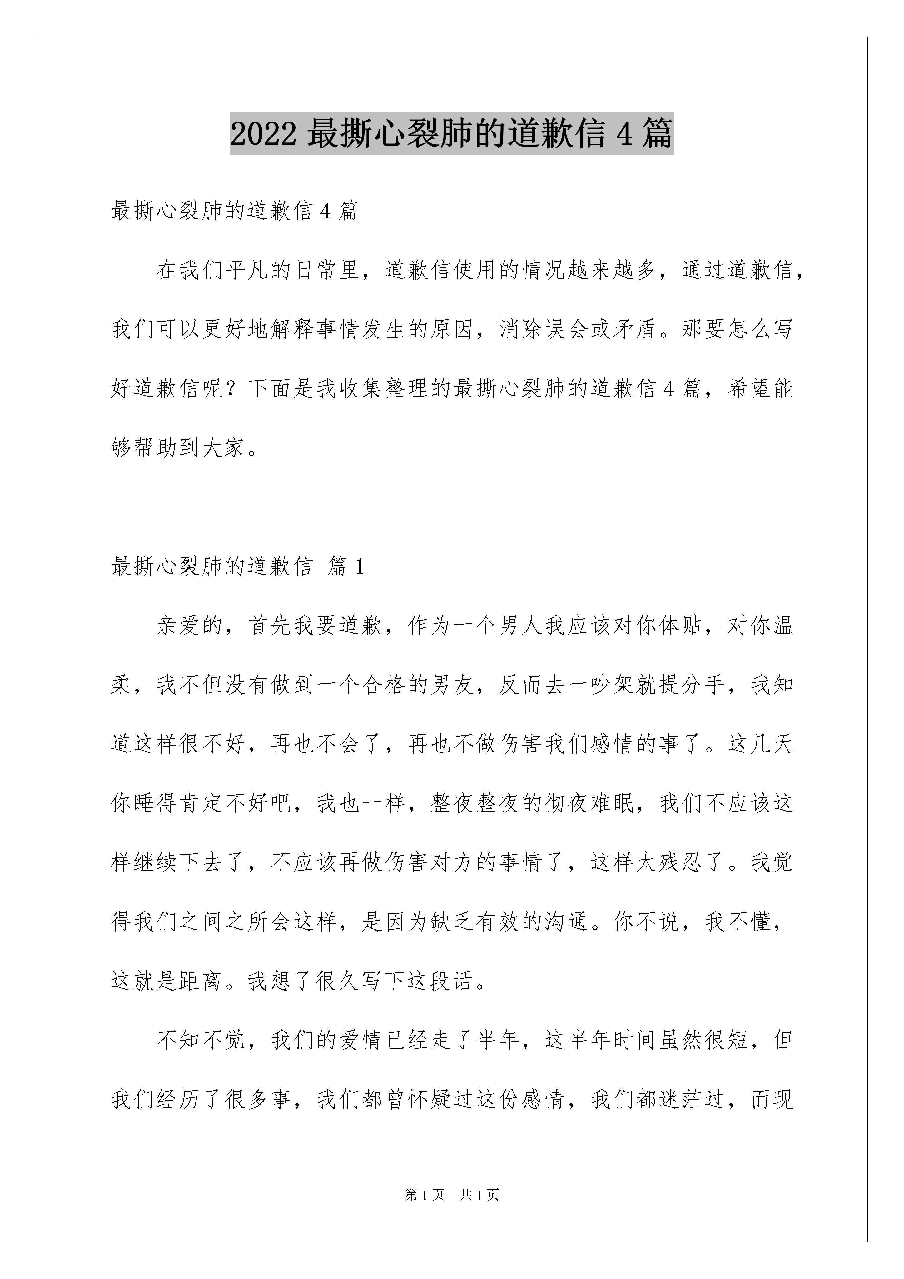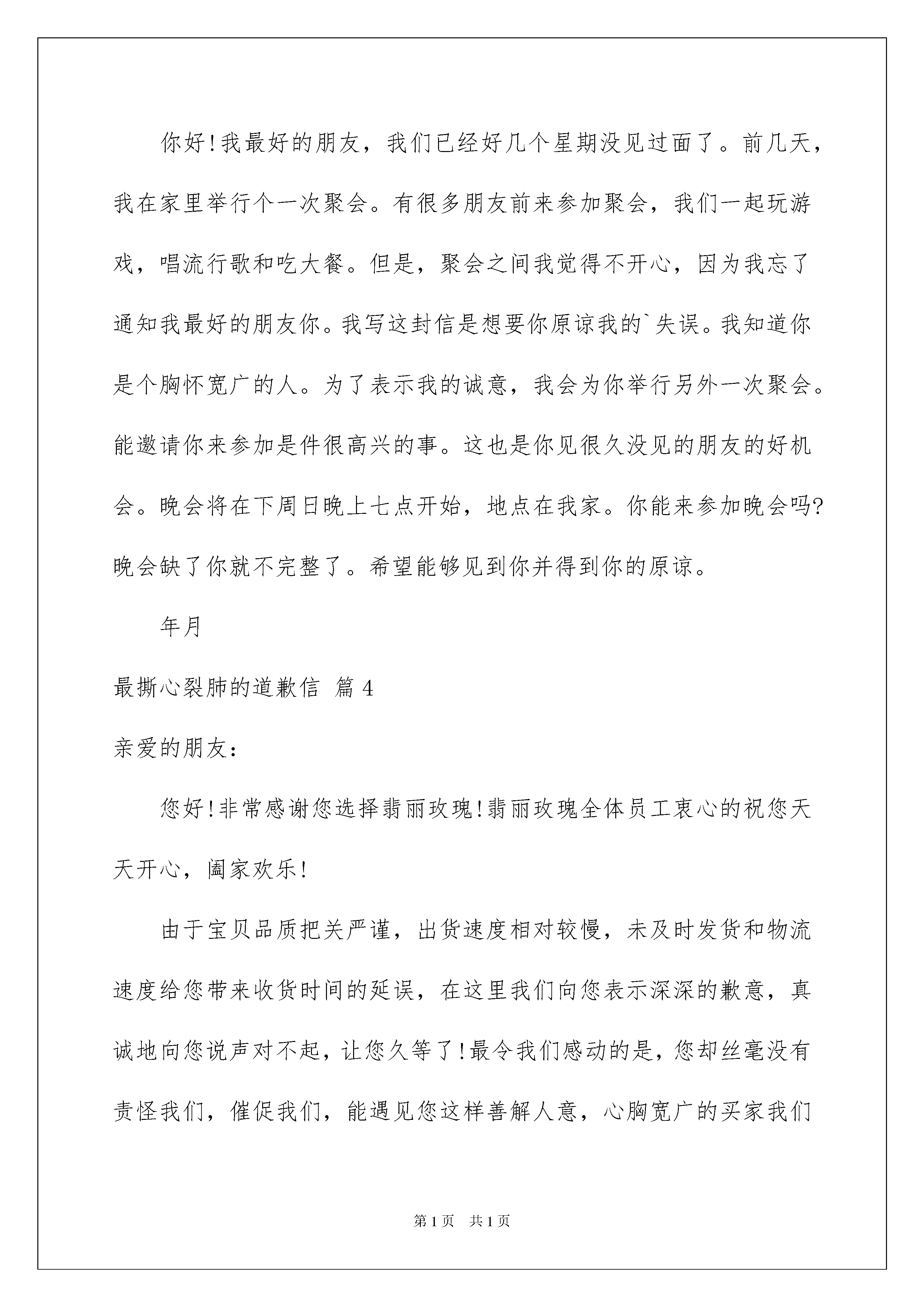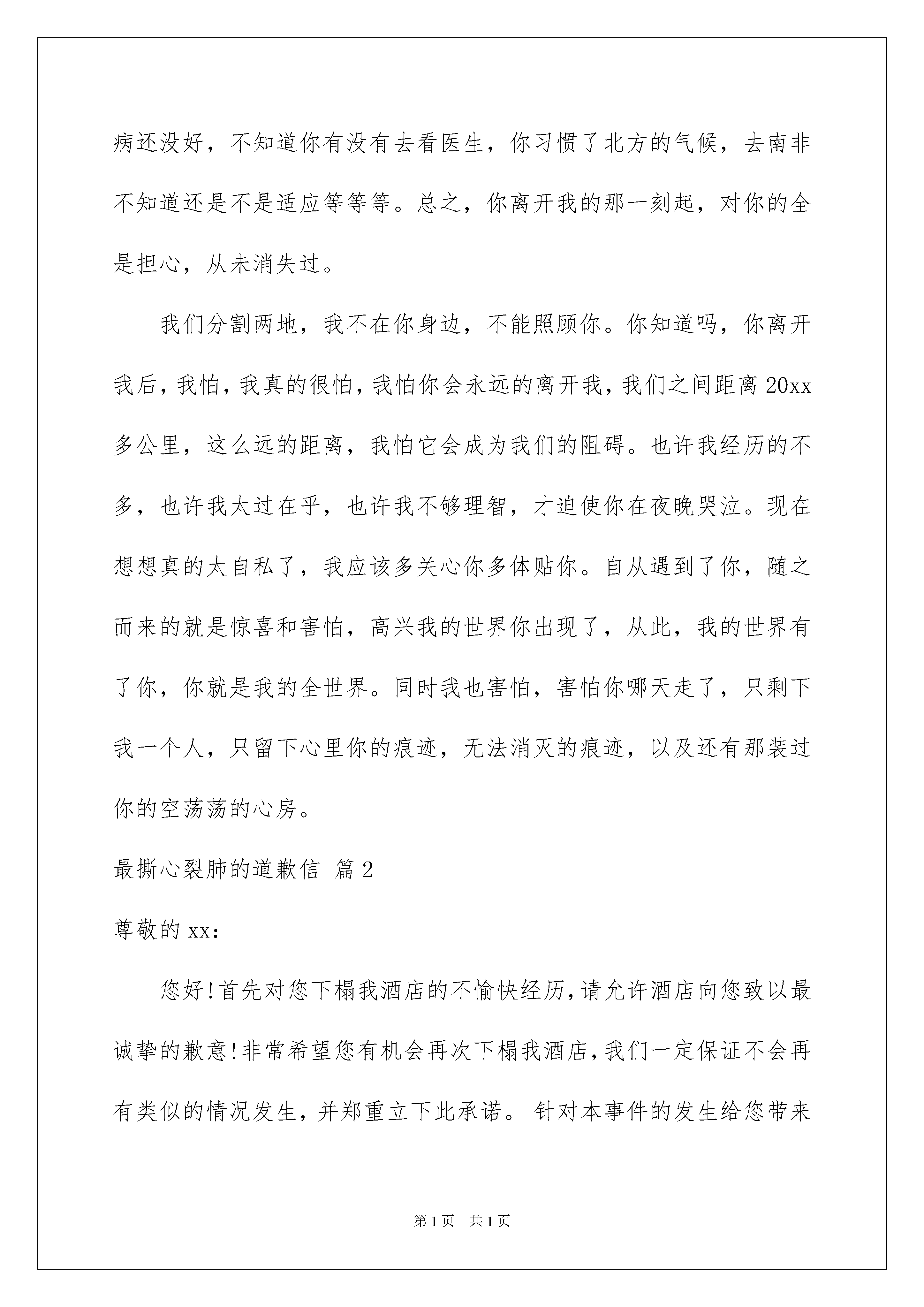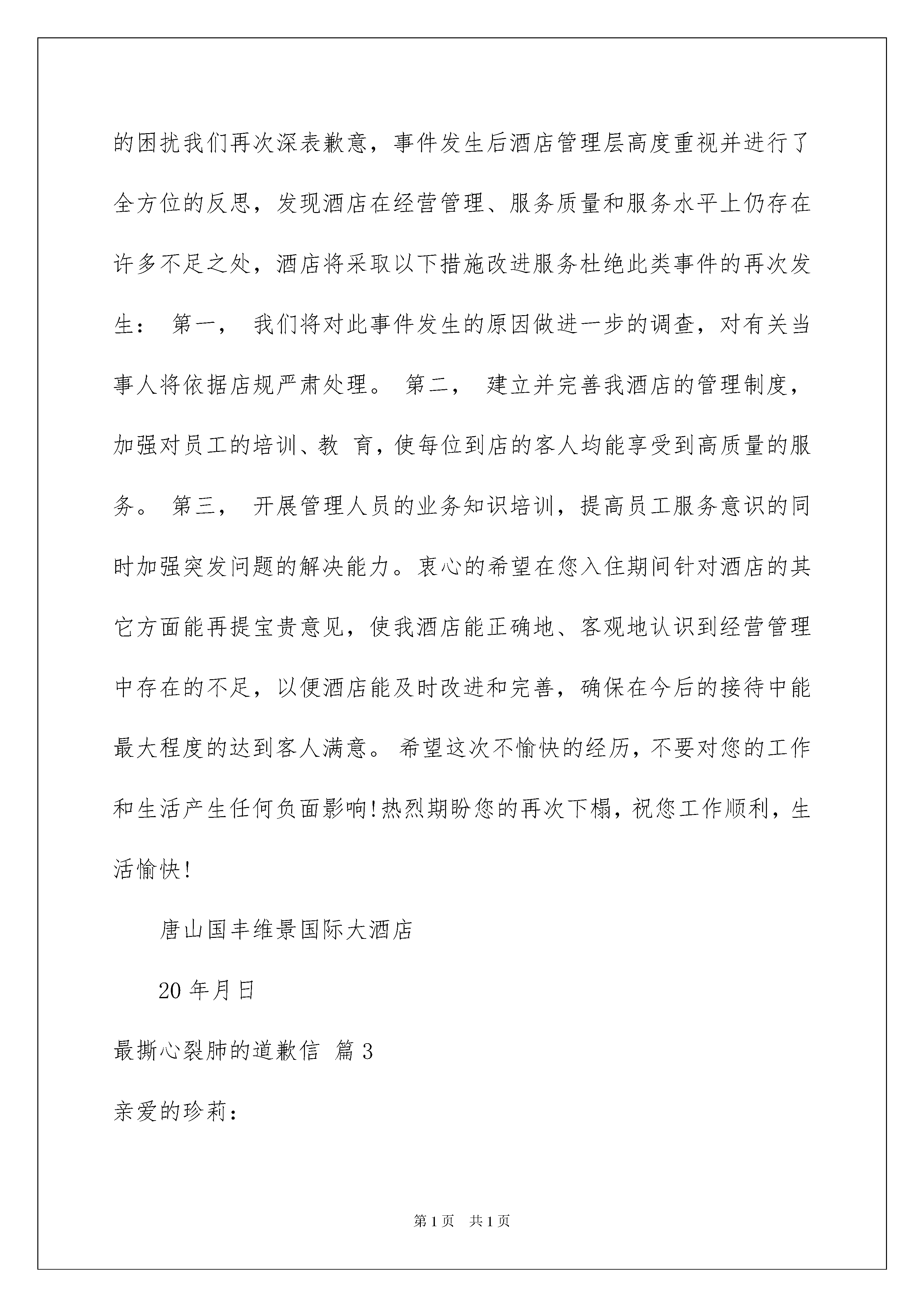 2022最撕心裂肺的道歉信4篇最撕心裂肺的道歉信4篇在我们平凡的日常里,道歉信使用的情况越来越多,通过道歉信,我们可以更好地解释事情发生的原因,消除误会或矛盾。那要怎么写好道歉信呢?下面是我收集整理的最撕心裂肺的道歉信4篇,希望能够帮助到大家。最撕心裂肺的道歉信篇1亲爱的,首先我要道歉,作为一个男人我应该对你体贴,对你温柔,我不但没有做到一个合格的男友,反而去一吵架就提分手,我知道这样很不好,再也不会了,再也不做伤害我们感情的事了。这几天你睡得肯定不好吧,我也一样,整夜整夜的彻夜难眠,我们不应该这样继续下去了,不应该再做伤害对方的事情了,这样太残忍了。我觉得我们之间之所会这样,是因为缺乏有效的沟通。你不说,我不懂,这就是距离。我想了很久写下这段话。不知不觉,我们的爱情已经走了半年,这半年时间虽然很短,但我们经历了很多事,我们都曾怀疑过这份感情,我们都迷茫过,而现在我们由不得不面对相似的痛苦。我们在一起还没分开这么久,分开这么远,这对我们来说都是考验,如果我们经历住了,我相信我们会更懂得珍惜对方,会更懂得怎样去爱对方。以前和你的点点滴滴我一人历历在目,还记得第一次抱着你,你的不知所措,你的惶恐不安,离别时都不舍得对方,都要对方先离去,那一夜,注定我们将要有一首美丽动人的乐章要去谱写。记忆最深刻的是,那一夜和你一起散步,你穿高跟鞋脚疼,我把我的人字拖给你穿,我穿你的高跟鞋,那一刻,我在心里想,这个女人我要一辈子对她好,我要保护她。给你搓背、洗脚、按摩,你的一个微笑,一句我想你,一个拥抱,一个吻,无论什么,都是我们之间的爱。我伤害过你,作为男人不应该出现那件事,我应该保护你,可是我没做到一个男人应有责任。我不应该让自己最心的同时也最爱自己的女人为自己哭泣,我不是一个好男人。你走了,只剩下我在着一座既熟悉又陌生的城市,一回到家,又像那样寂静,虽然我们住一起的时间不长,但我已经习惯有你,一回到家就能吃到你做的饭。你走了,每天对你的都是思念,不知道你一人在陌生的城市做的怎样,对你的全是担心,担心你一个女孩遇到坏人怎样办。你身上的病还没好,不知道你有没有去看医生,你习惯了北方的气候,去南非不知道还是不是适应等等等。总之,你离开我的那一刻起,对你的全是担心,从未消失过。我们分割两地,我不在你身边,不能照顾你。你知道吗,你离开我后,我怕,我真的很怕,我怕你会永远的离开我,我们之间距离20xx多公里,这么远的距离,我怕它会成为我们的阻碍。也许我经历的不多,也许我太过在乎,也许我不够理智,才迫使你在夜晚哭泣。现在想想真的太自私了,我应该多关心你多体贴你。自从遇到了你,随之而来的就是惊喜和害怕,高兴我的世界你出现了,从此,我的世界有了你,你就是我的全世界。同时我也害怕,害怕你哪天走了,只剩下我一个人,只留下心里你的痕迹,无法消灭的痕迹,以及还有那装过你的空荡荡的心房。最撕心裂肺的道歉信篇2尊敬的xx:您好!首先对您下榻我酒店的不愉快经历,请允许酒店向您致以最诚挚的歉意!非常希望您有机会再次下榻我酒店,我们一定保证不会再有类似的情况发生,并郑重立下此承诺。针对本事件的发生给您带来的困扰我们再次深表歉意,事件发生后酒店管理层高度重视并进行了全方位的反思,发现酒店在经营管理、服务质量和服务水平上仍存在许多不足之处,酒店将采取以下措施改进服务杜绝此类事件的再次发生:第一,我们将对此事件发生的原因做进一步的调查,对有关当事人将依据店规严肃处理。第二,建立并完善我酒店的管理制度,加强对员工的培训、教育,使每位到店的客人均能享受到高质量的服务。第三,开展管理人员的业务知识培训,提高员工服务意识的同时加强突发问题的解决能力。衷心的希望在您入住期间针对酒店的其它方面能再提宝贵意见,使我酒店能正确地、客观地认识到经营管理中存在的不足,以便酒店能及时改进和完善,确保在今后的接待中能最大程度的达到客人满意。希望这次不愉快的经历,不要对您的工作和生活产生任何负面影响!热烈期盼您的再次下榻,祝您工作顺利,生活愉快!唐山国丰维景国际大酒店20年月日最撕心裂肺的道歉信篇3亲爱的珍莉:你好!我最好的朋友,我们已经好几个星期没见过面了。前几天,我在家里举行个一次聚会。有很多朋友前来参加聚会,我们一起玩游戏,唱流行歌和吃大餐。但是,聚会之间我觉得不开心,因为我忘了通知我最好的朋友你。我写这封信是想要你原谅我的`失误。我知道你是个胸怀宽广的人。为了表示我的诚意,我会为你举行另外一次聚会。能邀请你来参加是件很高兴的事。这也是你见很久没见的朋友的好机会。晚会将在下周日晚上七点开始,地点在我家。你能来参加晚会吗?晚会缺了你就不完整了。希望能